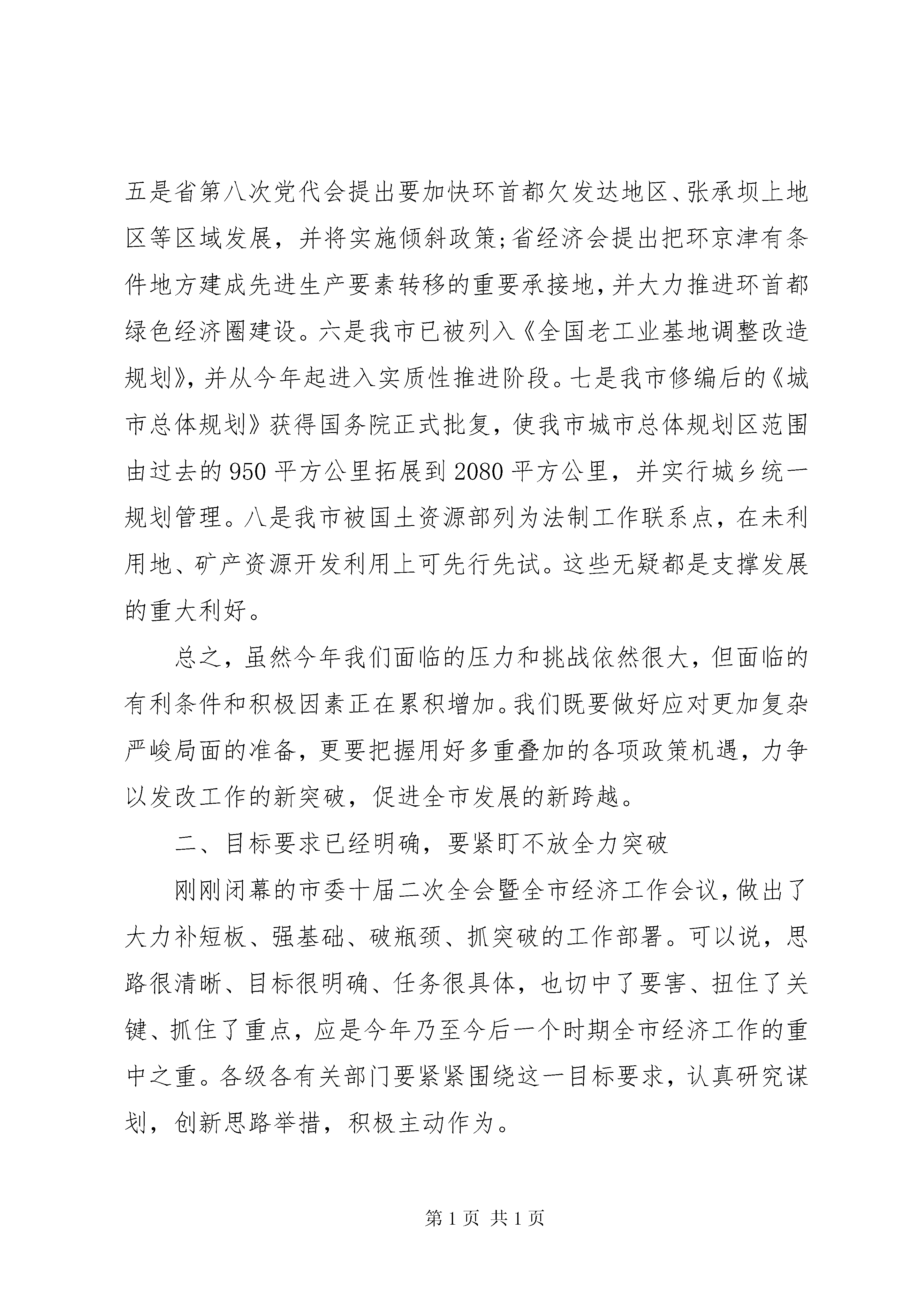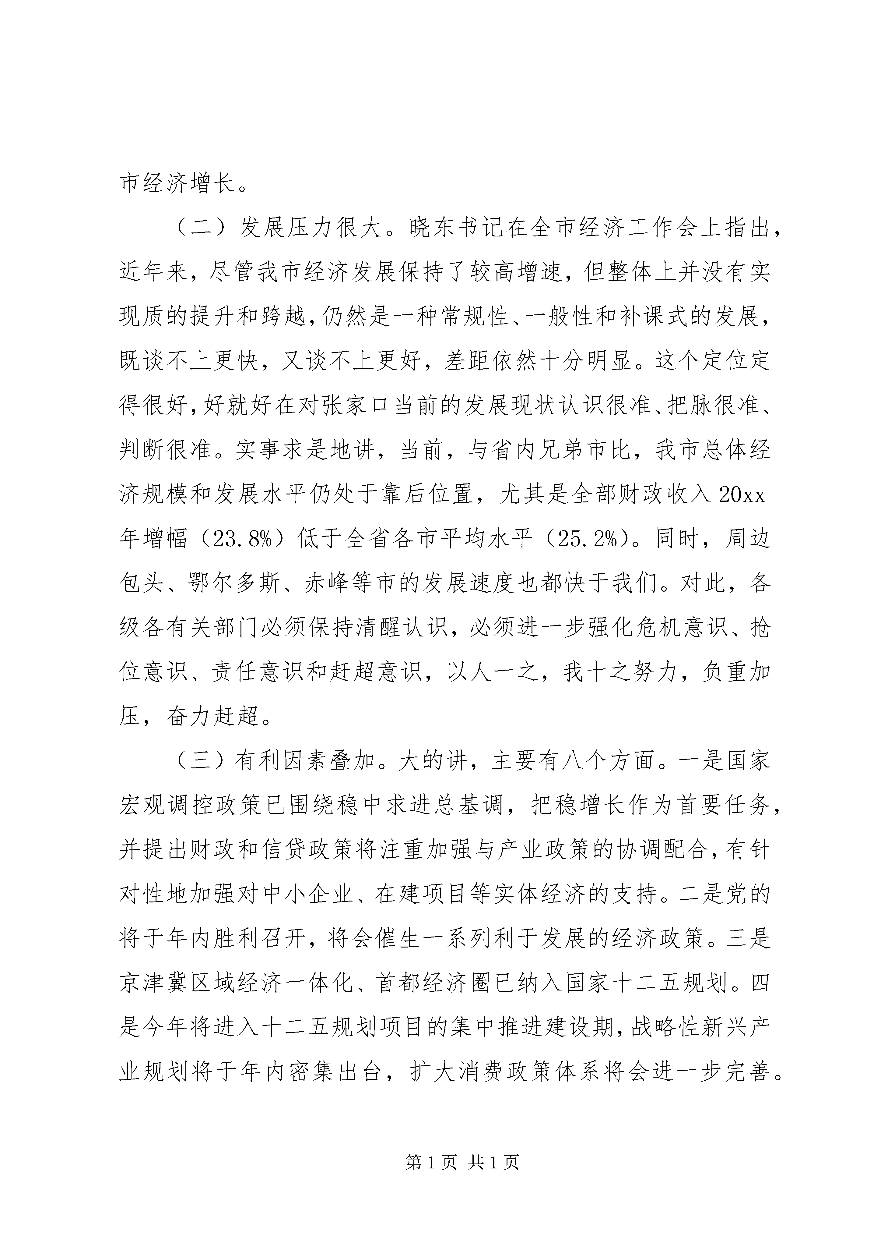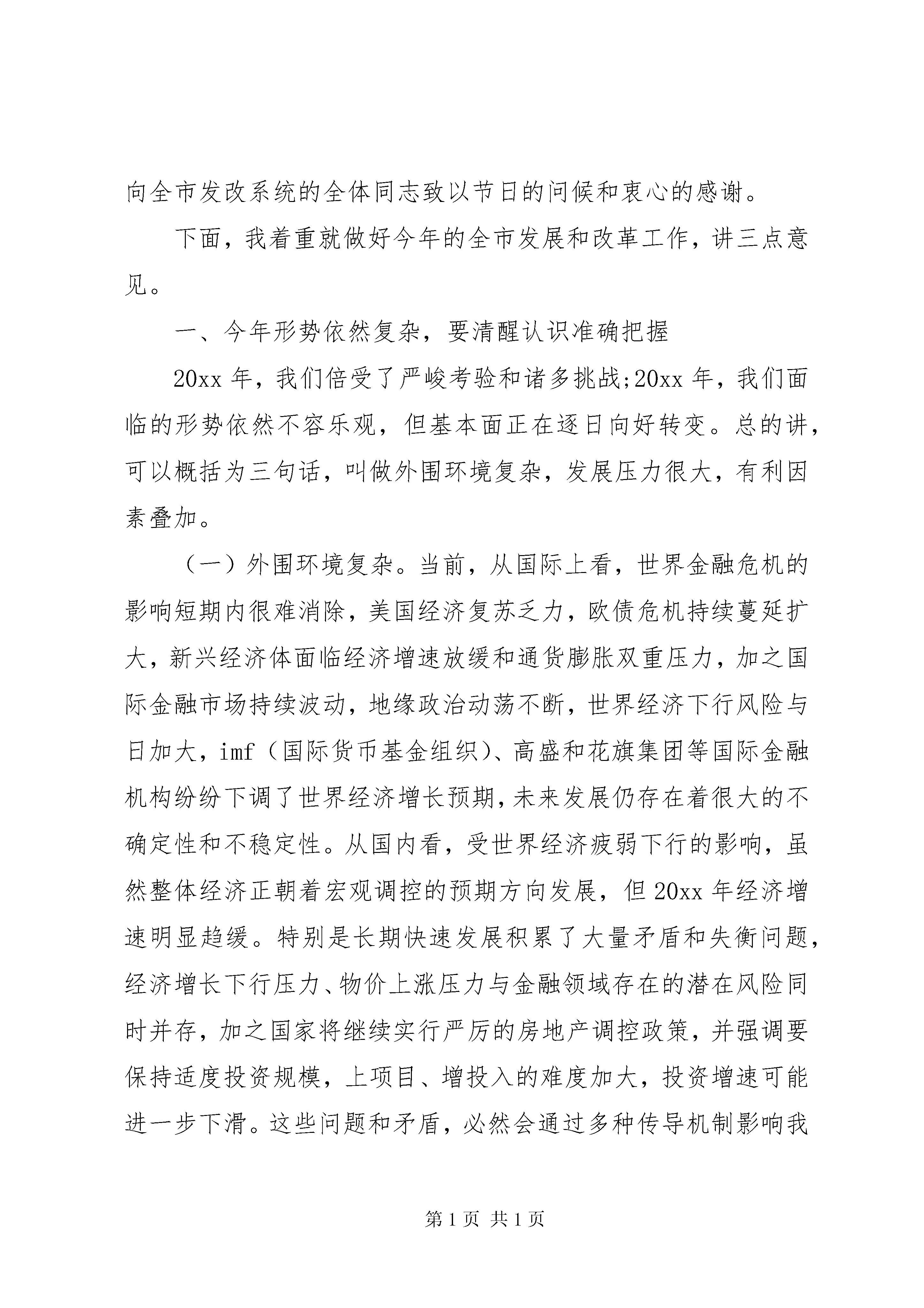 发改委发展改革工作会议讲话(3)发改委发展改革工作会议讲话(三):同志们:在全省两会刚刚胜利闭幕和举国上下喜迎新春之际,市政府今天专题召开这次全市发展和改革工作会议,足见市委、市政府对发展和改革工作的高度重视。会议的主要任务是,贯彻落实全省发展和改革工作会、市委十届二次全会暨全市经济工作会议精神,总结并部署全市发展和改革工作。可以说,既是一次总结会,又是一次部署会,更是一次动员会。刚才,世光主任总结了20xx年全市发展改革工作,并就今年工作进行了安排部署,我完全同意,请认真抓好落实。刚刚过去的20xx年,是实施十二五规划的开局之年,也是经济社会发展倍受考验和挑战的一年。一年来,面对复杂的经济形势和繁重的发展任务,全市发改系统的同志们,在市委、市政府的坚强正确领导下,积极贯彻落实市委、市政府的一系列决策部署,着力在战略规划、项目建设、调节运行、改革开放、节能降耗、价格调控、改善民生等方面,做了大量艰苦细致和卓有成效的工作,很好地发挥了规划、参谋、调控、服务等职能作用,为促进全市经济平稳较快增长、加快经济发展方式转变、实现十二五良好开局作出了重要贡献。在此,我首先代表市委、市政府,向全市发改系统的全体同志致以节日的问候和衷心的感谢。下面,我着重就做好今年的全市发展和改革工作,讲三点意见。一、今年形势依然复杂,要清醒认识准确把握20xx年,我们倍受了严峻考验和诸多挑战;20xx年,我们面临的形势依然不容乐观,但基本面正在逐日向好转变。总的讲,可以概括为三句话,叫做外围环境复杂,发展压力很大,有利因素叠加。(一)外围环境复杂。当前,从国际上看,世界金融危机的影响短期内很难消除,美国经济复苏乏力,欧债危机持续蔓延扩大,新兴经济体面临经济增速放缓和通货膨胀双重压力,加之国际金融市场持续波动,地缘政治动荡不断,世界经济下行风险与日加大,imf(国际货币基金组织)、高盛和花旗集团等国际金融机构纷纷下调了世界经济增长预期,未来发展仍存在着很大的不确定性和不稳定性。从国内看,受世界经济疲弱下行的影响,虽然整体经济正朝着宏观调控的预期方向发展,但20xx年经济增速明显趋缓。特别是长期快速发展积累了大量矛盾和失衡问题,经济增长下行压力、物价上涨压力与金融领域存在的潜在风险同时并存,加之国家将继续实行严厉的房地产调控政策,并强调要保持适度投资规模,上项目、增投入的难度加大,投资增速可能进一步下滑。这些问题和矛盾,必然会通过多种传导机制影响我市经济增长。(二)发展压力很大。晓东书记在全市经济工作会上指出,近年来,尽管我市经济发展保持了较高增速,但整体上并没有实现质的提升和跨越,仍然是一种常规性、一般性和补课式的发展,既谈不上更快,又谈不上更好,差距依然十分明显。这个定位定得很好,好就好在对张家口当前的发展现状认识很准、把脉很准、判断很准。实事求是地讲,当前,与省内兄弟市比,我市总体经济规模和发展水平仍处于靠后位置,尤其是全部财政收入20xx年增幅(23.8%)低于全省各市平均水平(25.2%)。同时,周边包头、鄂尔多斯、赤峰等市的发展速度也都快于我们。对此,各级各有关部门必须保持清醒认识,必须进一步强化危机意识、抢位意识、责任意识和赶超意识,以人一之,我十之努力,负重加压,奋力赶超。(三)有利因素叠加。大的讲,主要有八个方面。一是国家宏观调控政策已围绕稳中求进总基调,把稳增长作为首要任务,并提出财政和信贷政策将注重加强与产业政策的协调配合,有针对性地加强对中小企业、在建项目等实体经济的支持。二是党的将于年内胜利召开,将会催生一系列利于发展的经济政策。三是京津冀区域经济一体化、首都经济圈已纳入国家十二五规划。四是今年将进入十二五规划项目的集中推进建设期,战略性新兴产业规划将于年内密集出台,扩大消费政策体系将会进一步完善。五是省第八次党代会提出要加快环首都欠发达地区、张承坝上地区等区域发展,并将实施倾斜政策;省经济会提出把环京津有条件地方建成先进生产要素转移的重要承接地,并大力推进环首都绿色经济圈建设。六是我市已被列入《全国老工业基地调整改造规划》,并从今年起进入实质性推进阶段。七是我市修编后的《城市总体规划》获得国务院正式批复,使我市城市总体规划区范围由过去的950平方公里拓展到2080平方公里,并实行城乡统一规划管理。八是我市被国土资源部列为法制工作联系点,在未利用地、矿产资源开发利用上可先行先试。这些无疑都是支撑发展的重大利好。总之,虽然今年我们面临的压力和挑战依然很大,但面临的有利条件和积极因素正在累积增加。我们既要做好应对更加复杂严峻局面的准备,更要把握用好多重叠加的各项政策机遇,力争以发改工作的新突破,促进全市发展的新跨越。二、目标要求已经明确,要紧盯不放全力突破刚刚闭幕的市委十届二次全会暨全市经济工作会议,做出了大力补