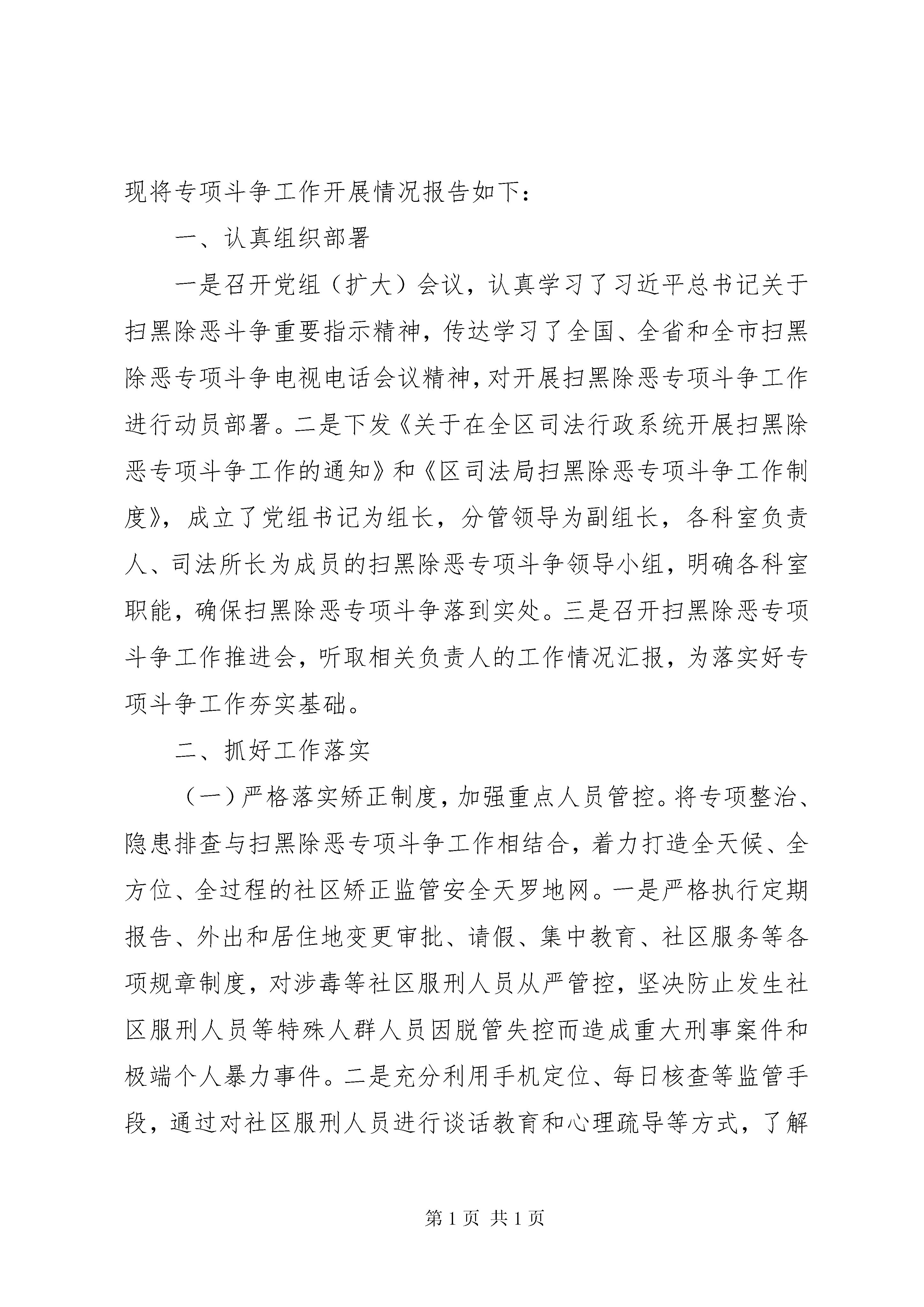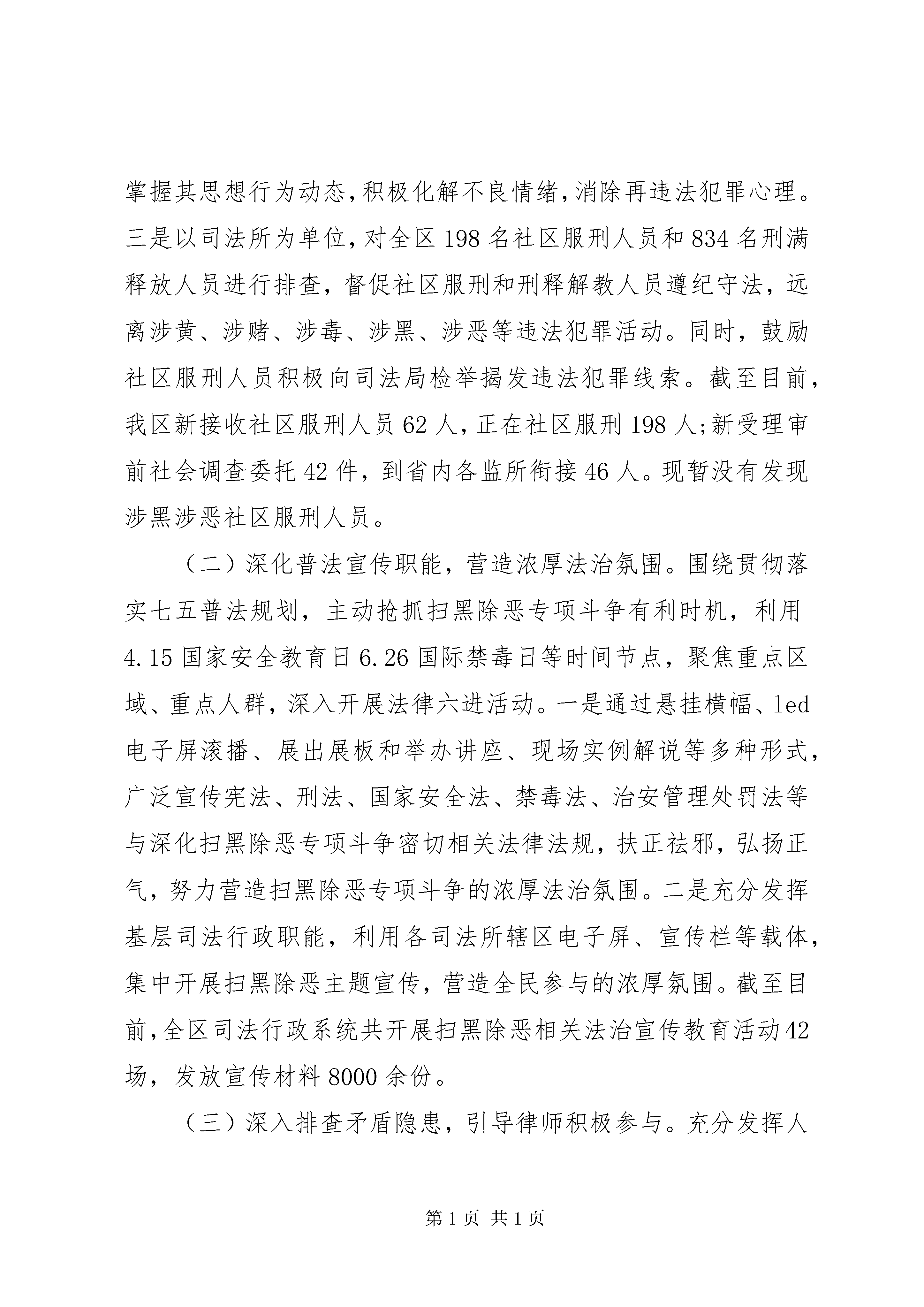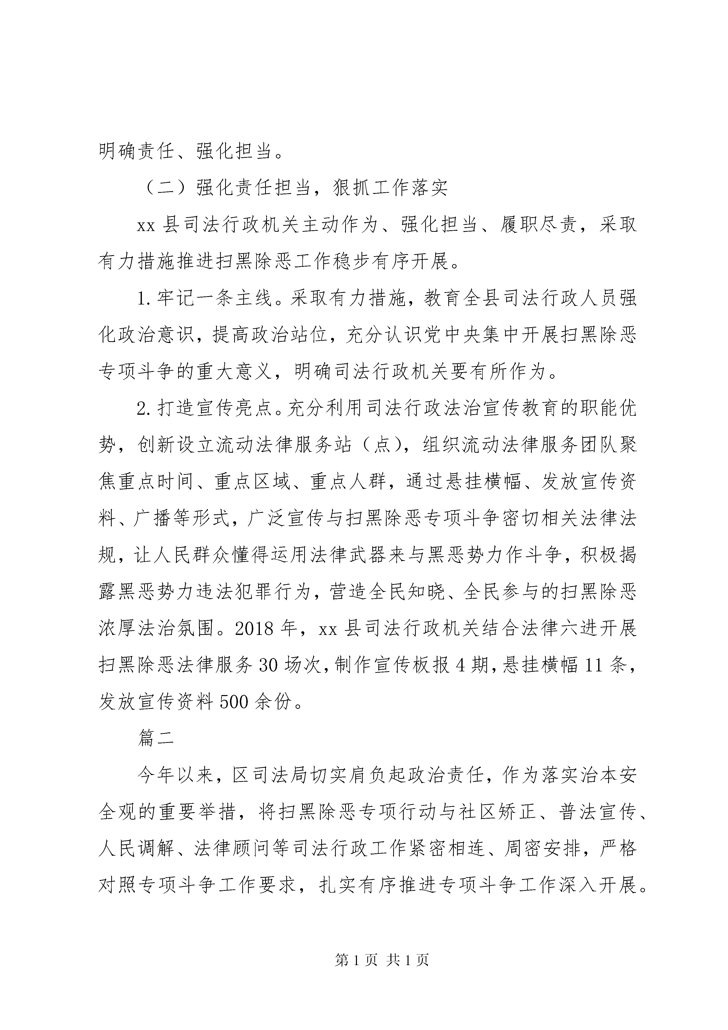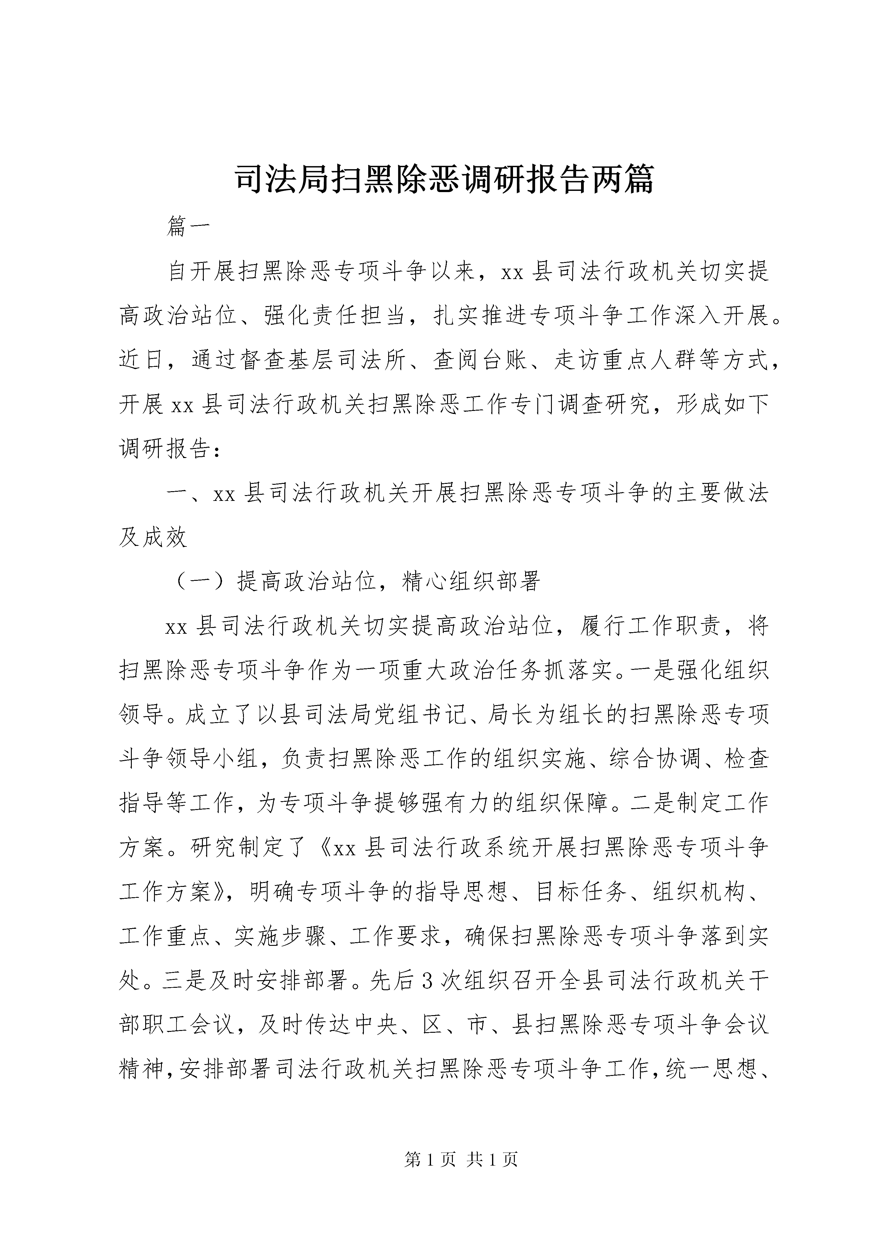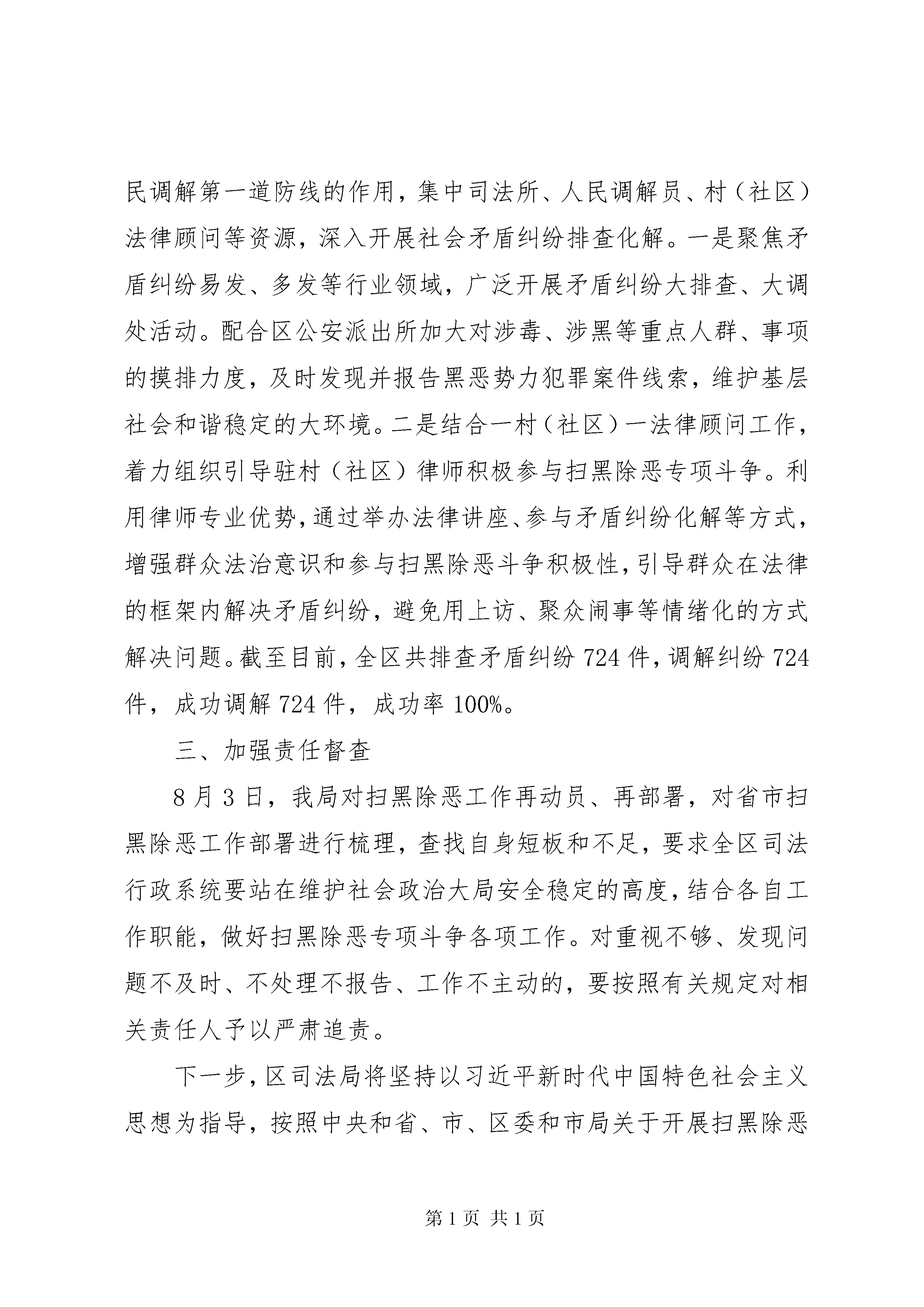 司法局扫黑除恶调研报告两篇篇一自开展扫黑除恶专项斗争以来,xx县司法行政机关切实提高政治站位、强化责任担当,扎实推进专项斗争工作深入开展。近日,通过督查基层司法所、查阅台账、走访重点人群等方式,开展xx县司法行政机关扫黑除恶工作专门调查研究,形成如下调研报告:一、xx县司法行政机关开展扫黑除恶专项斗争的主要做法及成效(一)提高政治站位,精心组织部署xx县司法行政机关切实提高政治站位,履行工作职责,将扫黑除恶专项斗争作为一项重大政治任务抓落实。一是强化组织领导。成立了以县司法局党组书记、局长为组长的扫黑除恶专项斗争领导小组,负责扫黑除恶工作的组织实施、综合协调、检查指导等工作,为专项斗争提够强有力的组织保障。二是制定工作方案。研究制定了《xx县司法行政系统开展扫黑除恶专项斗争工作方案》,明确专项斗争的指导思想、目标任务、组织机构、工作重点、实施步骤、工作要求,确保扫黑除恶专项斗争落到实处。三是及时安排部署。先后3次组织召开全县司法行政机关干部职工会议,及时传达中央、区、市、县扫黑除恶专项斗争会议精神,安排部署司法行政机关扫黑除恶专项斗争工作,统一思想、明确责任、强化担当。(二)强化责任担当,狠抓工作落实xx县司法行政机关主动作为、强化担当、履职尽责,采取有力措施推进扫黑除恶工作稳步有序开展。1.牢记一条主线。采取有力措施,教育全县司法行政人员强化政治意识,提高政治站位,充分认识党中央集中开展扫黑除恶专项斗争的重大意义,明确司法行政机关要有所作为。2.打造宣传亮点。充分利用司法行政法治宣传教育的职能优势,创新设立流动法律服务站(点),组织流动法律服务团队聚焦重点时间、重点区域、重点人群,通过悬挂横幅、发放宣传资料、广播等形式,广泛宣传与扫黑除恶专项斗争密切相关法律法规,让人民群众懂得运用法律武器来与黑恶势力作斗争,积极揭露黑恶势力违法犯罪行为,营造全民知晓、全民参与的扫黑除恶浓厚法治氛围。2018年,xx县司法行政机关结合法律六进开展扫黑除恶法律服务30场次,制作宣传板报4期,悬挂横幅11条,发放宣传资料500余份。篇二今年以来,区司法局切实肩负起政治责任,作为落实治本安全观的重要举措,将扫黑除恶专项行动与社区矫正、普法宣传、人民调解、法律顾问等司法行政工作紧密相连、周密安排,严格对照专项斗争工作要求,扎实有序推进专项斗争工作深入开展。现将专项斗争工作开展情况报告如下:一、认真组织部署一是召开党组(扩大)会议,认真学习了习近平总书记关于扫黑除恶斗争重要指示精神,传达学习了全国、全省和全市扫黑除恶专项斗争电视电话会议精神,对开展扫黑除恶专项斗争工作进行动员部署。二是下发《关于在全区司法行政系统开展扫黑除恶专项斗争工作的通知》和《区司法局扫黑除恶专项斗争工作制度》,成立了党组书记为组长,分管领导为副组长,各科室负责人、司法所长为成员的扫黑除恶专项斗争领导小组,明确各科室职能,确保扫黑除恶专项斗争落到实处。三是召开扫黑除恶专项斗争工作推进会,听取相关负责人的工作情况汇报,为落实好专项斗争工作夯实基础。二、抓好工作落实(一)严格落实矫正制度,加强重点人员管控。将专项整治、隐患排查与扫黑除恶专项斗争工作相结合,着力打造全天候、全方位、全过程的社区矫正监管安全天罗地网。一是严格执行定期报告、外出和居住地变更审批、请假、集中教育、社区服务等各项规章制度,对涉毒等社区服刑人员从严管控,坚决防止发生社区服刑人员等特殊人群人员因脱管失控而造成重大刑事案件和极端个人暴力事件。二是充分利用手机定位、每日核查等监管手段,通过对社区服刑人员进行谈话教育和心理疏导等方式,了解掌握其思想行为动态,积极化解不良情绪,消除再违法犯罪心理。三是以司法所为单位,对全区198名社区服刑人员和834名刑满释放人员进行排查,督促社区服刑和刑释解教人员遵纪守法,远离涉黄、涉赌、涉毒、涉黑、涉恶等违法犯罪活动。同时,鼓励社区服刑人员积极向司法局检举揭发违法犯罪线索。截至目前,我区新接收社区服刑人员62人,正在社区服刑198人;新受理审前社会调查委托42件,到省内各监所衔接46人。现暂没有发现涉黑涉恶社区服刑人员。(二)深化普法宣传职能,营造浓厚法治氛围。围绕贯彻落实七五普法规划,主动抢抓扫黑除恶专项斗争有利时机,利用4.15国家安全教育日6.26国际禁毒日等时间节点,聚焦重点区域、重点人群,深入开展法律六进活动。一是通过悬挂横幅、led电子屏滚播、展出展板和举办讲座、现场实例解说等多种形式,广泛宣传宪法、刑法、国家安全法、禁毒法、治安管理处罚法等与深化扫黑除恶专项斗争密切相关法律法规,扶正祛邪,弘扬正气,努力营造扫黑除恶专项斗争的浓厚法治氛围。二是充分发挥基层司法行政职能,利用各司法所辖区电子屏、宣传栏等载体,集中开展扫黑除恶主题宣传,营造全民参与的浓厚