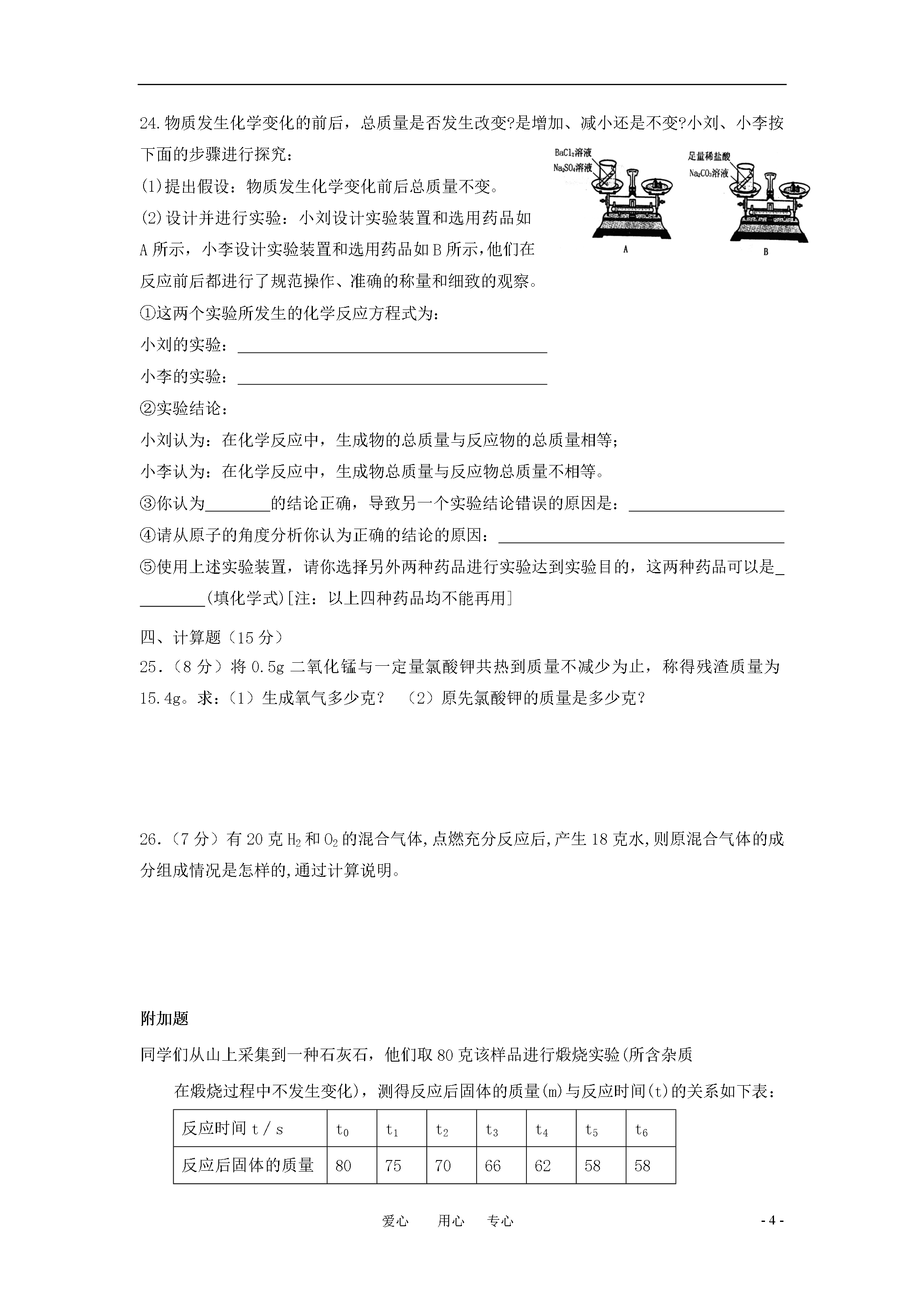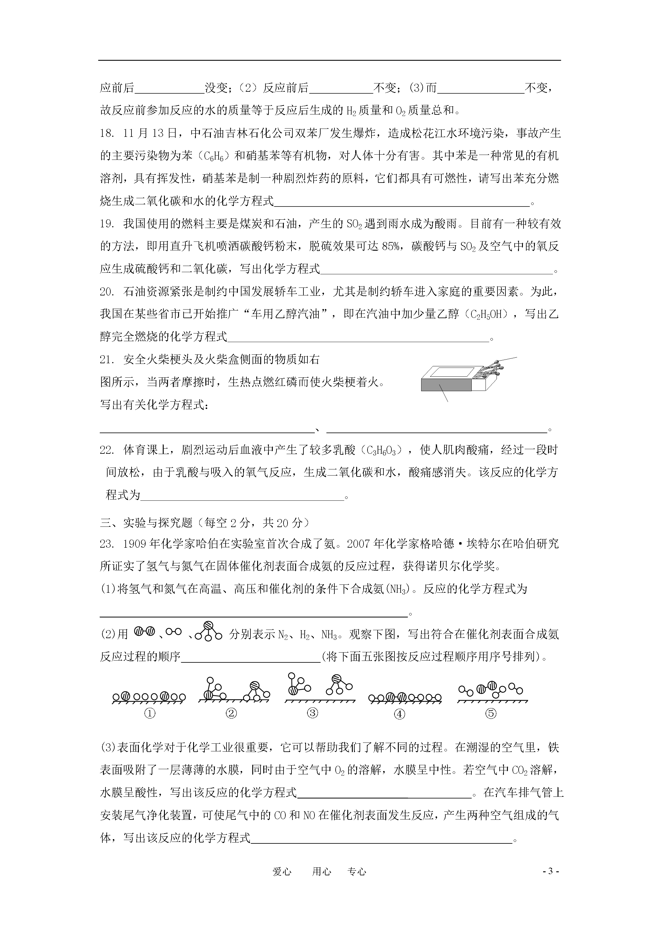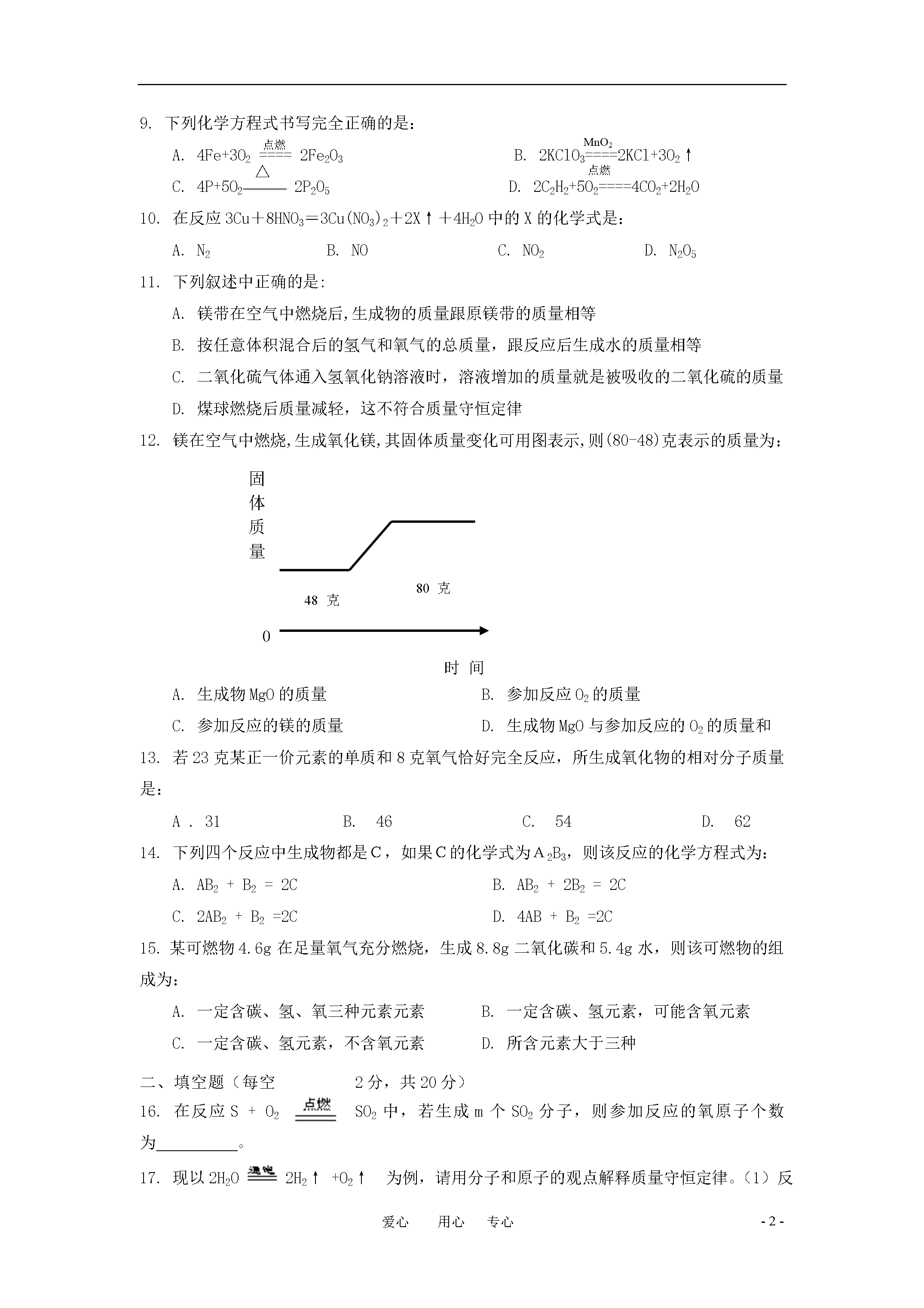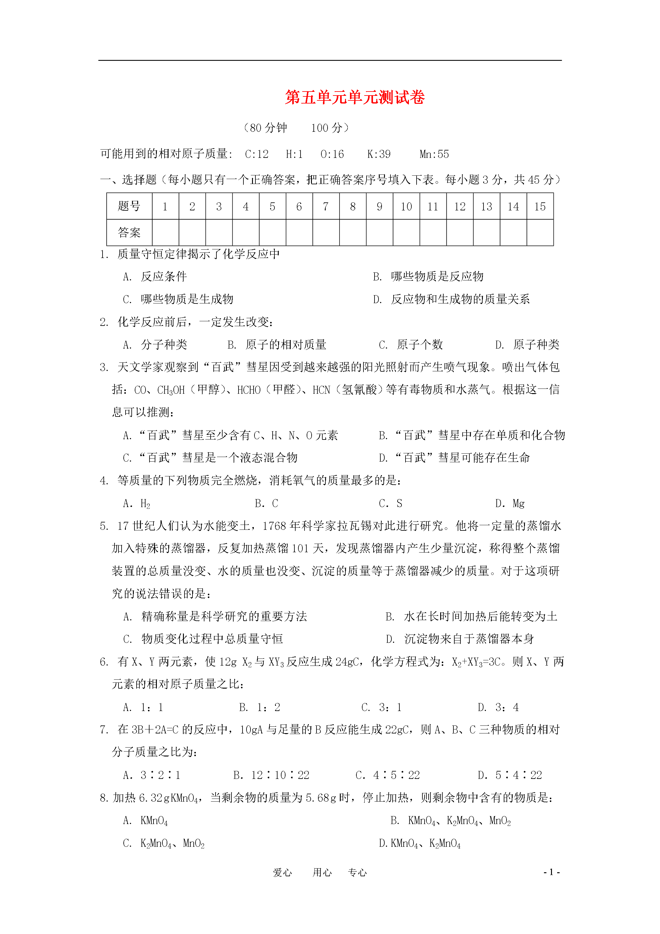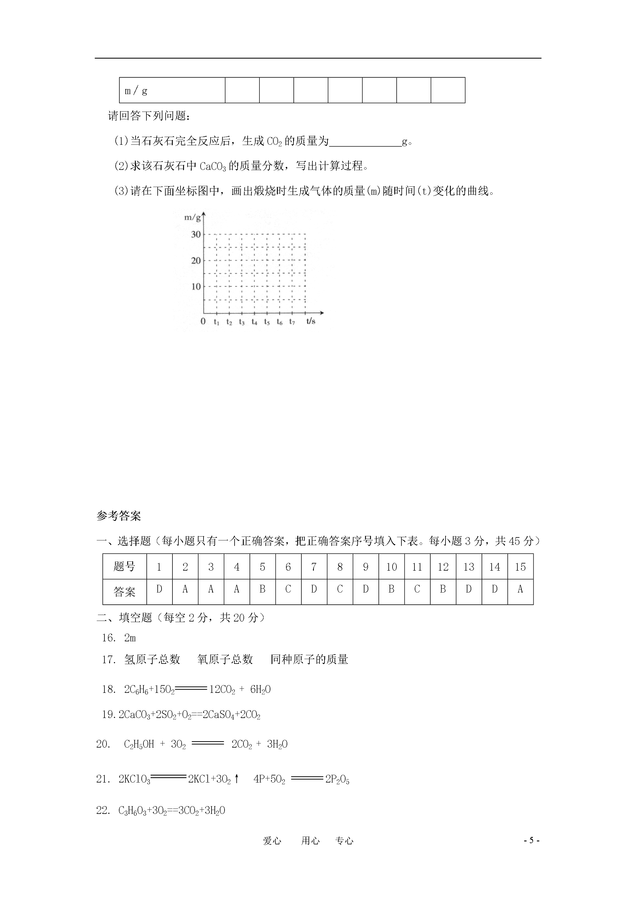 -7-爱心用心专心第五单元单元测试卷(80分钟100分)可能用到的相对原子质量:C:12H:1O:16K:39Mn:55一、选择题(每小题只有一个正确答案,把正确答案序号填入下表。每小题3分,共45分)题号123456789101112131415答案1.质量守恒定律揭示了化学反应中A.反应条件B.哪些物质是反应物C.哪些物质是生成物D.反应物和生成物的质量关系2.化学反应前后,一定发生改变:A.分子种类B.原子的相对质量C.原子个数D.原子种类3.天文学家观察到“百武”彗星因受到越来越强的阳光照射而产生喷气现象。喷出气体包括:CO、CH3OH(甲醇)、HCHO(甲醛)、HCN(氢氰酸)等有毒物质和水蒸气。根据这一信息可以推测:A.“百武”彗星至少含有C、H、N、O元素B.“百武”彗星中存在单质和化合物C.“百武”彗星是一个液态混合物D.“百武”彗星可能存在生命4.等质量的下列物质完全燃烧,消耗氧气的质量最多的是:A.H2B.CC.SD.Mg5.17世纪人们认为水能变土,1768年科学家拉瓦锡对此进行研究。他将一定量的蒸馏水加入特殊的蒸馏器,反复加热蒸馏101天,发现蒸馏器内产生少量沉淀,称得整个蒸馏装置的总质量没变、水的质量也没变、沉淀的质量等于蒸馏器减少的质量。对于这项研究的说法错误的是:A.精确称量是科学研究的重要方法B.水在长时间加热后能转变为土C.物质变化过程中总质量守恒D.沉淀物来自于蒸馏器本身6.有X、Y两元素,使12gX2与XY3反应生成24gC,化学方程式为:X2+XY3=3C。则X、Y两元素的相对原子质量之比:A.1:1B.1:2C.3:1D.3:47.在3B+2A=C的反应中,10gA与足量的B反应能生成22gC,则A、B、C三种物质的相对分子质量之比为:A.3∶2∶1B.12∶10∶22C.4∶5∶22D.5∶4∶228.加热6.32gKMnO4,当剩余物的质量为5.68g时,停止加热,则剩余物中含有的物质是:A.KMnO4B.KMnO4、K2MnO4、MnO2C.K2MnO4、MnO2D.KMnO4、K2MnO49.下列化学方程式书写完全正确的是:点燃点燃MnO2△A.4Fe+3O2====2Fe2O3B.2KClO3====2KCl+3O2↑C.4P+5O22P2O5D.2C2H2+5O2====4CO2+2H2O10.在反应3Cu+8HNO3=3Cu(NO3)2+2X↑+4H2O中的X的化学式是:A.N2B.NOC.NO2D.N2O511.下列叙述中正确的是:A.镁带在空气中燃烧后,生成物的质量跟原镁带的质量相等B.按任意体积混合后的氢气和氧气的总质量,跟反应后生成水的质量相等C.二氧化硫气体通入氢氧化钠溶液时,溶液增加的质量就是被吸收的二氧化硫的质量D.煤球燃烧后质量减轻,这不符合质量守恒定律12.镁在空气中燃烧,生成氧化镁,其固体质量变化可用图表示,则(80-48)克表示的质量为:固体质量080克48克时间A.生成物MgO的质量B.参加反应O2的质量C.参加反应的镁的质量D.生成物MgO与参加反应的O2的质量和13.若23克某正一价元素的单质和8克氧气恰好完全反应,所生成氧化物的相对分子质量是:A.31B.46C.54D.6214.下列四个反应中生成物都是C,如果C的化学式为A2B3,则该反应的化学方程式为:A.AB2+B2=2CB.AB2+2B2=2CC.2AB2+B2=2CD.4AB+B2=2C15.某可燃物4.6g在足量氧气充分燃烧,生成8.8g二氧化碳和5.4g水,则该可燃物的组成为:A.一定含碳、氢、氧三种元素元素B.一定含碳、氢元素,可能含氧元素C.一定含碳、氢元素,不含氧元素D.所含元素大于三种二、填空题(每空2分,共20分)16.在反应S+O2SO2中,若生成m个SO2分子,则参加反应的氧原子个数为。17.现以2H2O2H2↑+O2↑为例,请用分子和原子的观点解释质量守恒定律。(1)反应前后没变;(2)反应前后不变;(3)而不变,故反应前参加反应的水的质量等于反应后生成的H2质量和O2质量总和。18.11月13日,中石油吉林石化公司双苯厂发生爆炸,造成松花江水环境污染,事故产生的主要污染物为苯(C6H6)和硝基苯等有机物,对人体十分有害。其中苯是一种常见的有机溶剂,具有挥发性,硝基苯是制一种剧烈炸药的原料,它们都具有可燃性,请写出苯充分燃烧生成二氧化碳和水的化学方程式。19.我国使用的燃料主要是煤炭和石油,产生的SO2遇到雨水成为酸雨。目前有一种较有效的方法,即用直升飞机喷洒碳酸钙粉末,脱硫效果可达85%,碳酸钙与SO2及空气中的氧反应生成硫酸钙和二氧化碳,写出化学方程式________________________________________。20.石油资源紧张是制约中