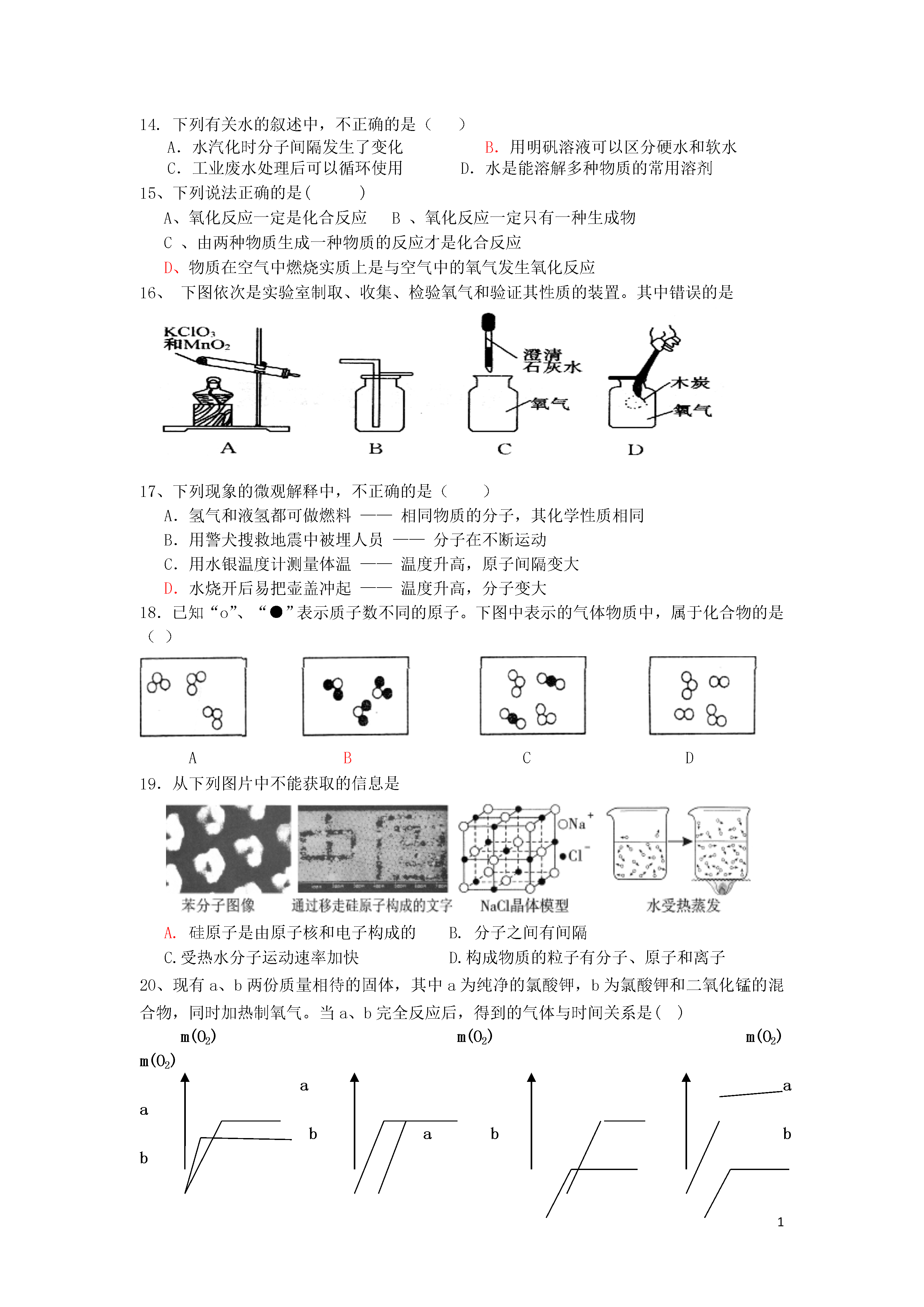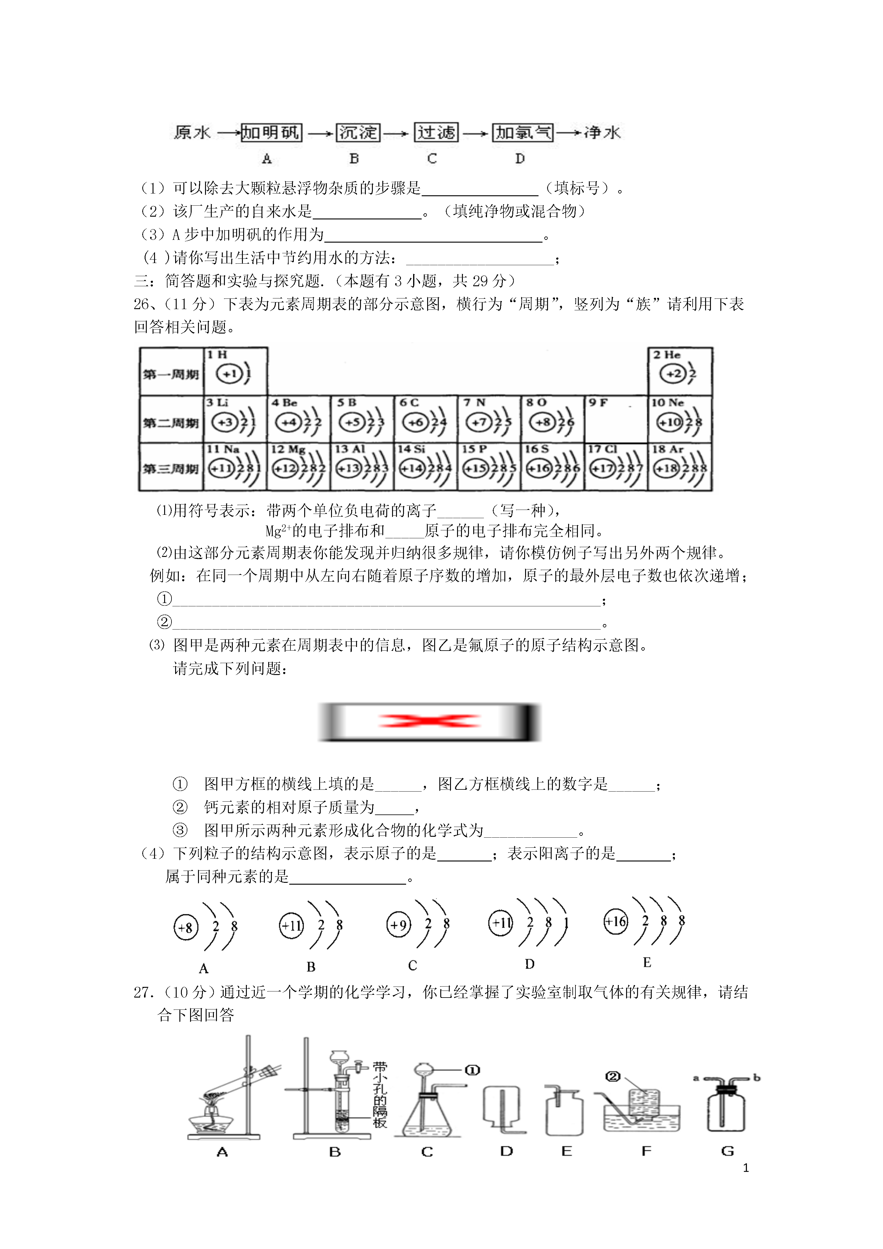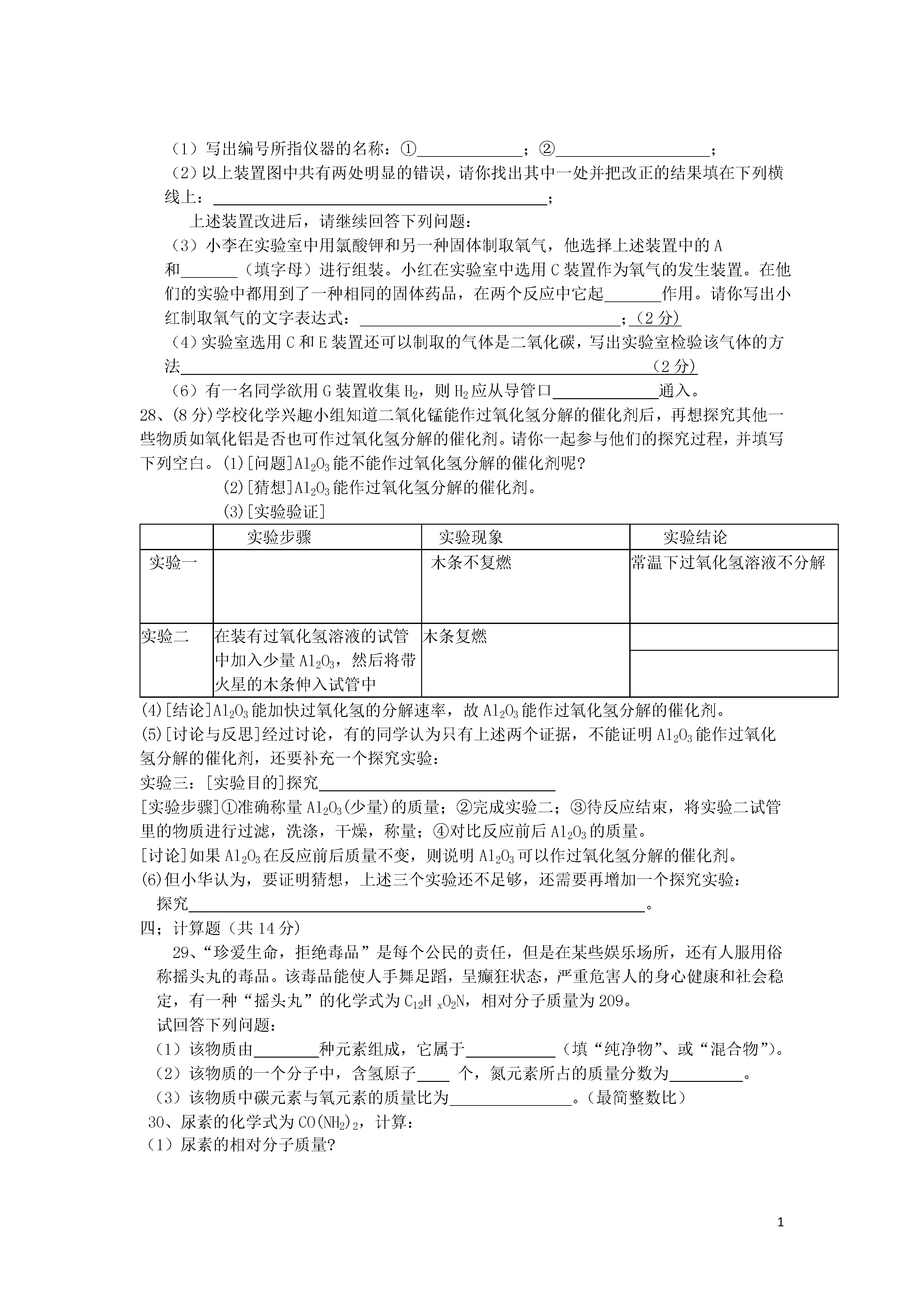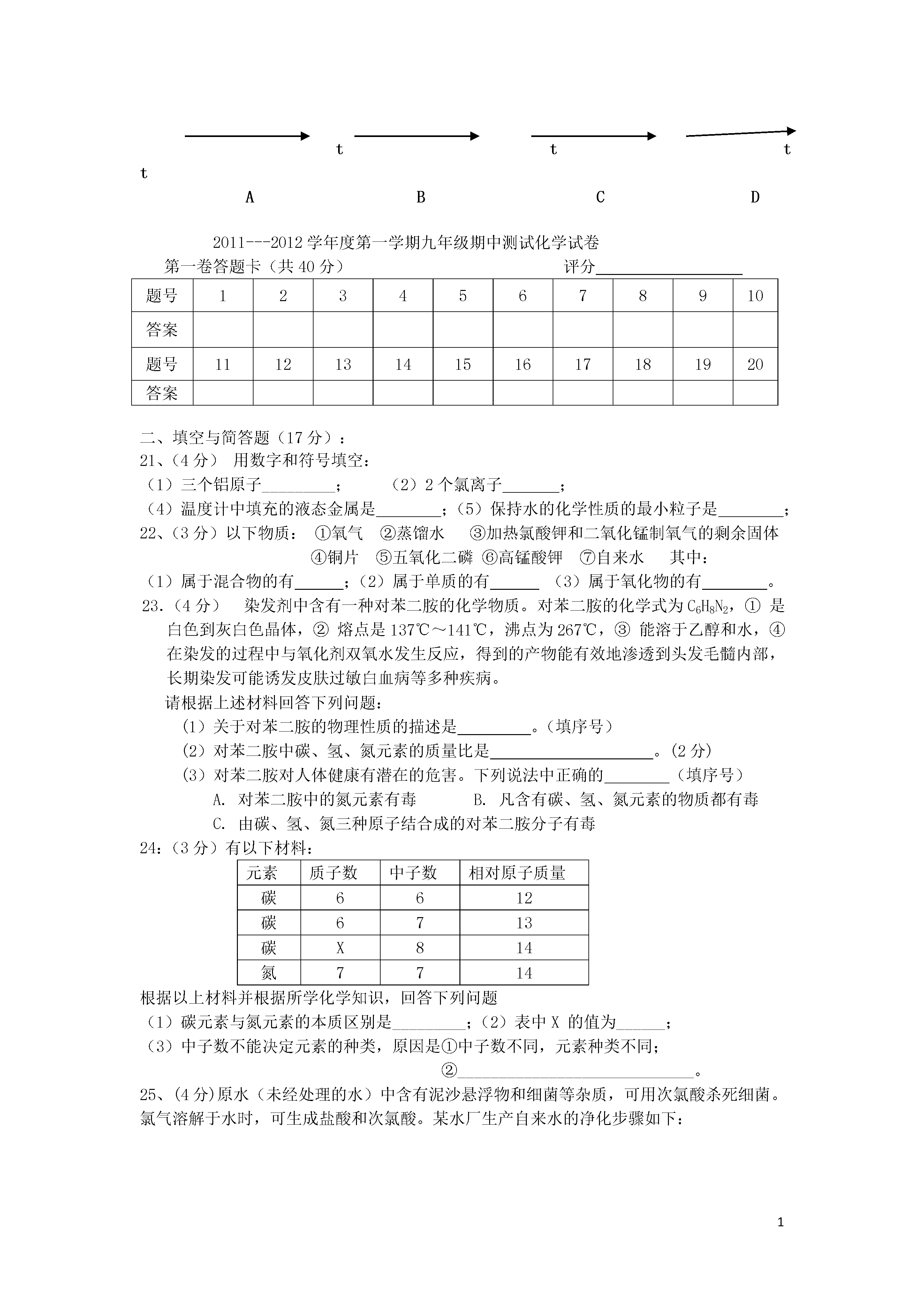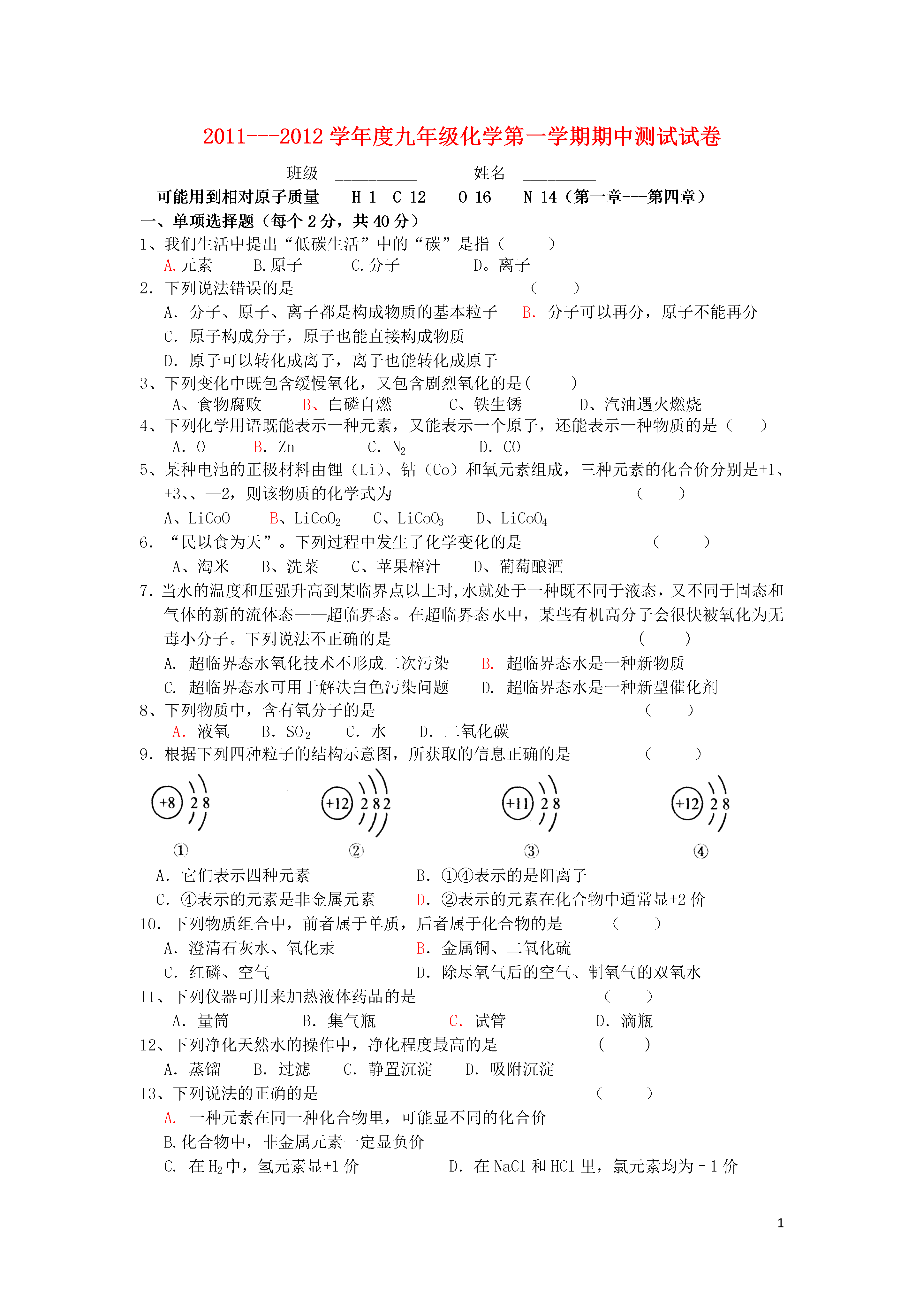 12011---2012学年度九年级化学第一学期期中测试试卷班级__________姓名_________可能用到相对原子质量H1C12O16N14(第一章---第四章)一、单项选择题(每个2分,共40分)1、我们生活中提出“低碳生活”中的“碳”是指()A.元素B.原子C.分子D。离子2.下列说法错误的是()A.分子、原子、离子都是构成物质的基本粒子B.分子可以再分,原子不能再分C.原子构成分子,原子也能直接构成物质D.原子可以转化成离子,离子也能转化成原子3、下列变化中既包含缓慢氧化,又包含剧烈氧化的是()A、食物腐败B、白磷自燃C、铁生锈D、汽油遇火燃烧4、下列化学用语既能表示一种元素,又能表示一个原子,还能表示一种物质的是()A.OB.ZnC.N2D.CO5、某种电池的正极材料由锂(Li)、钴(Co)和氧元素组成,三种元素的化合价分别是+1、+3、、—2,则该物质的化学式为()A、LiCoOB、LiCoO2C、LiCoO3D、LiCoO46.“民以食为天”。下列过程中发生了化学变化的是()A、淘米B、洗菜C、苹果榨汁D、葡萄酿酒7.当水的温度和压强升高到某临界点以上时,水就处于一种既不同于液态,又不同于固态和气体的新的流体态——超临界态。在超临界态水中,某些有机高分子会很快被氧化为无毒小分子。下列说法不正确的是()A.超临界态水氧化技术不形成二次污染B.超临界态水是一种新物质C.超临界态水可用于解决白色污染问题D.超临界态水是一种新型催化剂8、下列物质中,含有氧分子的是()A.液氧B.SO2C.水D.二氧化碳9.根据下列四种粒子的结构示意图,所获取的信息正确的是()A.它们表示四种元素B.①④表示的是阳离子C.④表示的元素是非金属元素D.②表示的元素在化合物中通常显+2价10.下列物质组合中,前者属于单质,后者属于化合物的是()A.澄清石灰水、氧化汞B.金属铜、二氧化硫C.红磷、空气D.除尽氧气后的空气、制氧气的双氧水11、下列仪器可用来加热液体药品的是()A.量筒B.集气瓶C.试管D.滴瓶12、下列净化天然水的操作中,净化程度最高的是()A.蒸馏B.过滤C.静置沉淀D.吸附沉淀13、下列说法的正确的是()A.一种元素在同一种化合物里,可能显不同的化合价B.化合物中,非金属元素一定显负价C.在H2中,氢元素显+1价D.在NaCl和HCl里,氯元素均为–1价14.下列有关水的叙述中,不正确的是()A.水汽化时分子间隔发生了变化B.用明矾溶液可以区分硬水和软水C.工业废水处理后可以循环使用D.水是能溶解多种物质的常用溶剂15、下列说法正确的是()A、氧化反应一定是化合反应B、氧化反应一定只有一种生成物C、由两种物质生成一种物质的反应才是化合反应D、物质在空气中燃烧实质上是与空气中的氧气发生氧化反应16、下图依次是实验室制取、收集、检验氧气和验证其性质的装置。其中错误的是17、下列现象的微观解释中,不正确的是()A.氢气和液氢都可做燃料——相同物质的分子,其化学性质相同B.用警犬搜救地震中被埋人员——分子在不断运动C.用水银温度计测量体温——温度升高,原子间隔变大D.水烧开后易把壶盖冲起——温度升高,分子变大18.已知“o”、“●”表示质子数不同的原子。下图中表示的气体物质中,属于化合物的是()ABCD19.从下列图片中不能获取的信息是A.硅原子是由原子核和电子构成的B.分子之间有间隔C.受热水分子运动速率加快D.构成物质的粒子有分子、原子和离子20、现有a、b两份质量相待的固体,其中a为纯净的氯酸钾,b为氯酸钾和二氧化锰的混合物,同时加热制氧气。当a、b完全反应后,得到的气体与时间关系是()m(O2)m(O2)m(O2)m(O2)aaababbbttttABCD2011---2012学年度第一学期九年级期中测试化学试卷第一卷答题卡(共40分)评分题号12345678910答案题号11121314151617181920答案二、填空与简答题(17分):21、(4分)用数字和符号填空:(1)三个铝原子_________;(2)2个氯离子;(4)温度计中填充的液态金属是;(5)保持水的化学性质的最小粒子是;22、(3分)以下物质:①氧气②蒸馏水③加热氯酸钾和二氧化锰制氧气的剩余固体④铜片⑤五氧化二磷⑥高锰酸钾⑦自来水其中:(1)属于混合物的有;(2)属于单质的有(3)属于氧化物的有。23.(4分)染发剂中含有一种对苯二胺的化学物质。对苯二胺的化学式为C6H8N2,①是白色到灰白色晶体,②熔点是137℃~141℃,沸点为267℃,③能溶于乙醇和水,④在染发