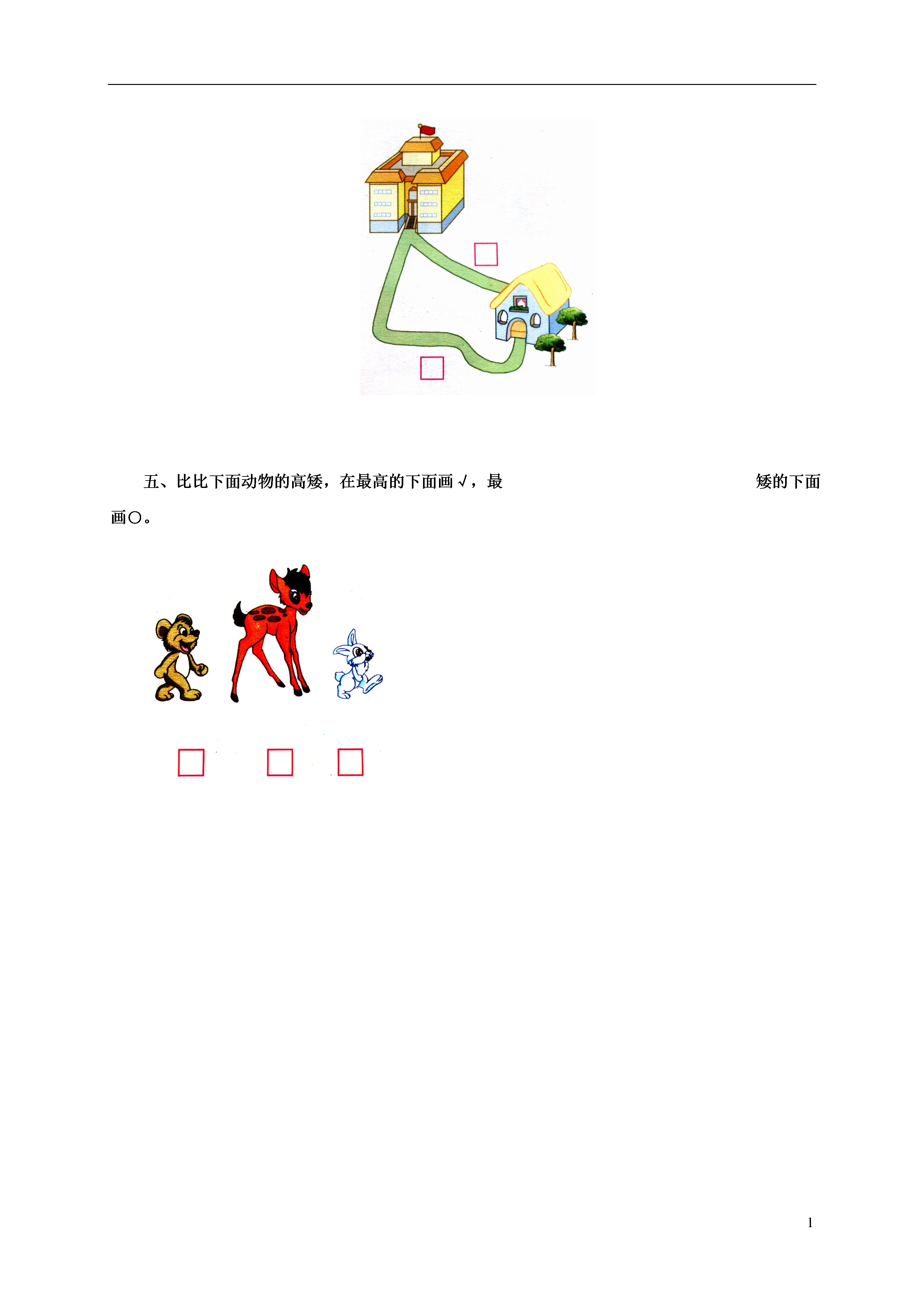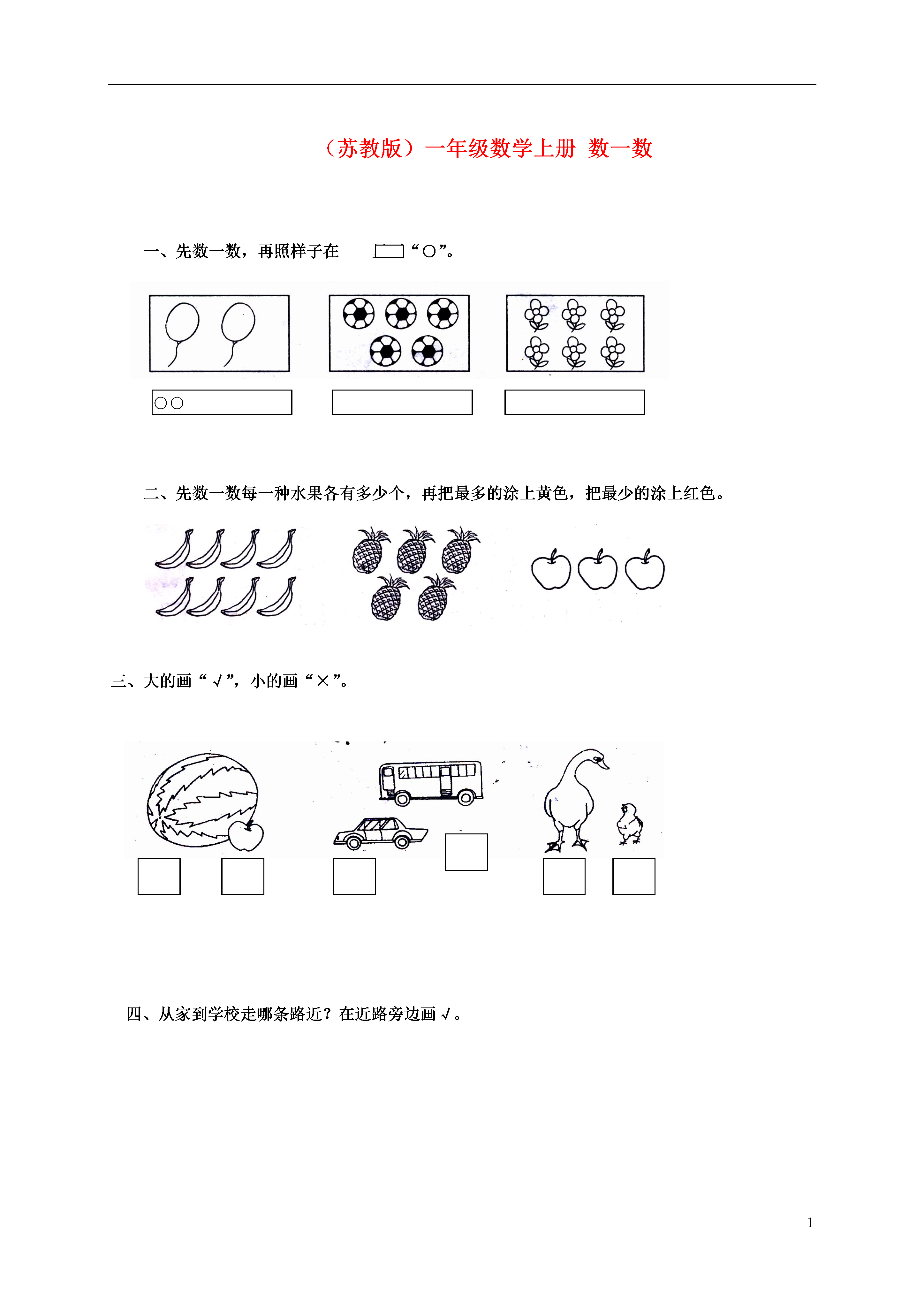 1(苏教版)一年级数学上册数一数一、先数一数,再照样子在里画“○”。○○二、先数一数每一种水果各有多少个,再把最多的涂上黄色,把最少的涂上红色。三、大的画“√”,小的画“×”。四、从家到学校走哪条路近?在近路旁边画√。五、比比下面动物的高矮,在最高的下面画√,最矮的下面画○。
