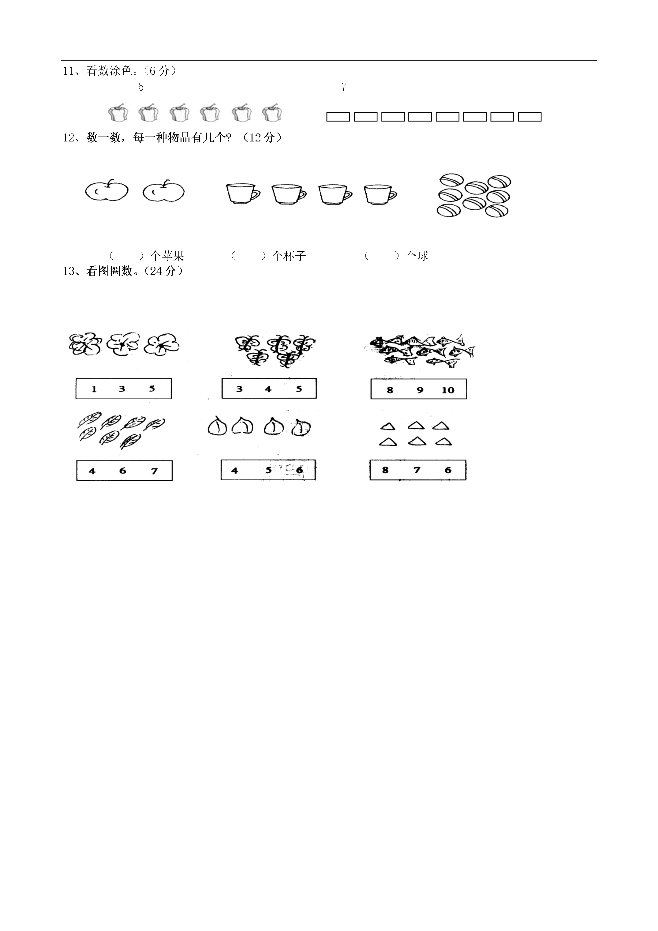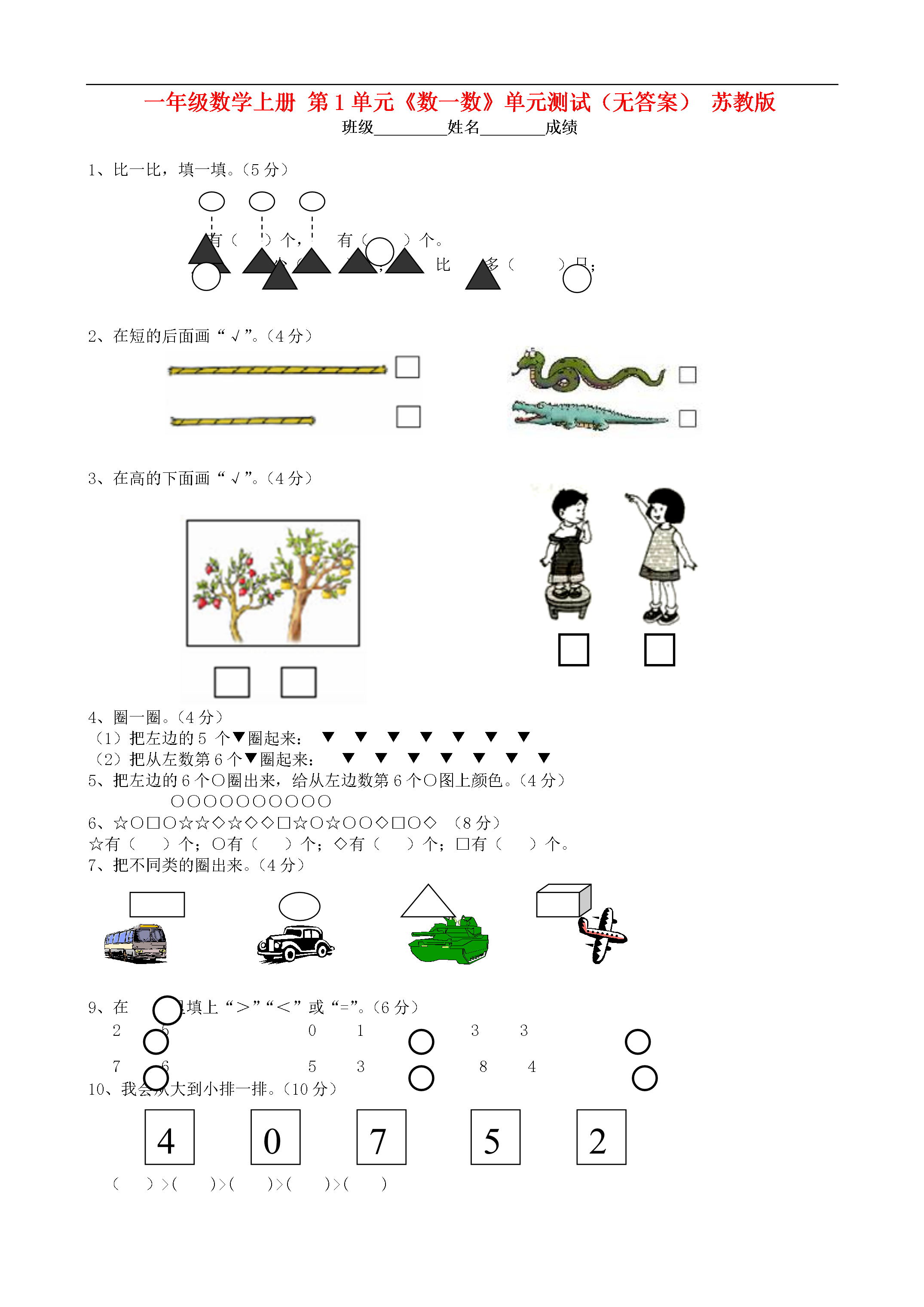 一年级数学上册第1单元《数一数》单元测试(无答案)苏教版班级姓名成绩1、比一比,填一填。(5分)有()个,有()个。比少()个;比多()只;2、在短的后面画“√”。(4分)3、在高的下面画“√”。(4分)4、圈一圈。(4分)(1)把左边的5个▼圈起来:▼▼▼▼▼▼▼(2)把从左数第6个▼圈起来:▼▼▼▼▼▼▼5、把左边的6个○圈出来,给从左边数第6个○图上颜色。(4分)○○○○○○○○○○6、☆○□○☆☆◇☆◇◇□☆○☆○○◇□○◇(8分)☆有()个;○有()个;◇有()个;□有()个。7、把不同类的圈出来。(4分)9、在里填上“>”“<”或“=”。(6分)25013376538410、我会从大到小排一排。(10分)57204()>()>()>()>()11、看数涂色。(6分)5712、数一数,每一种物品有几个?(12分)()个苹果()个杯子()个球13、看图圈数。(24分)