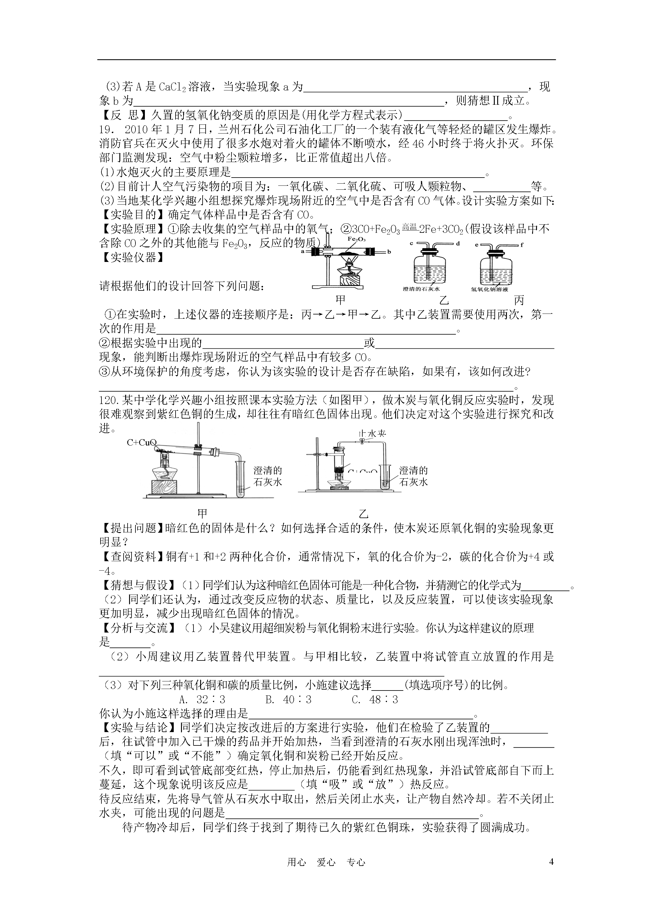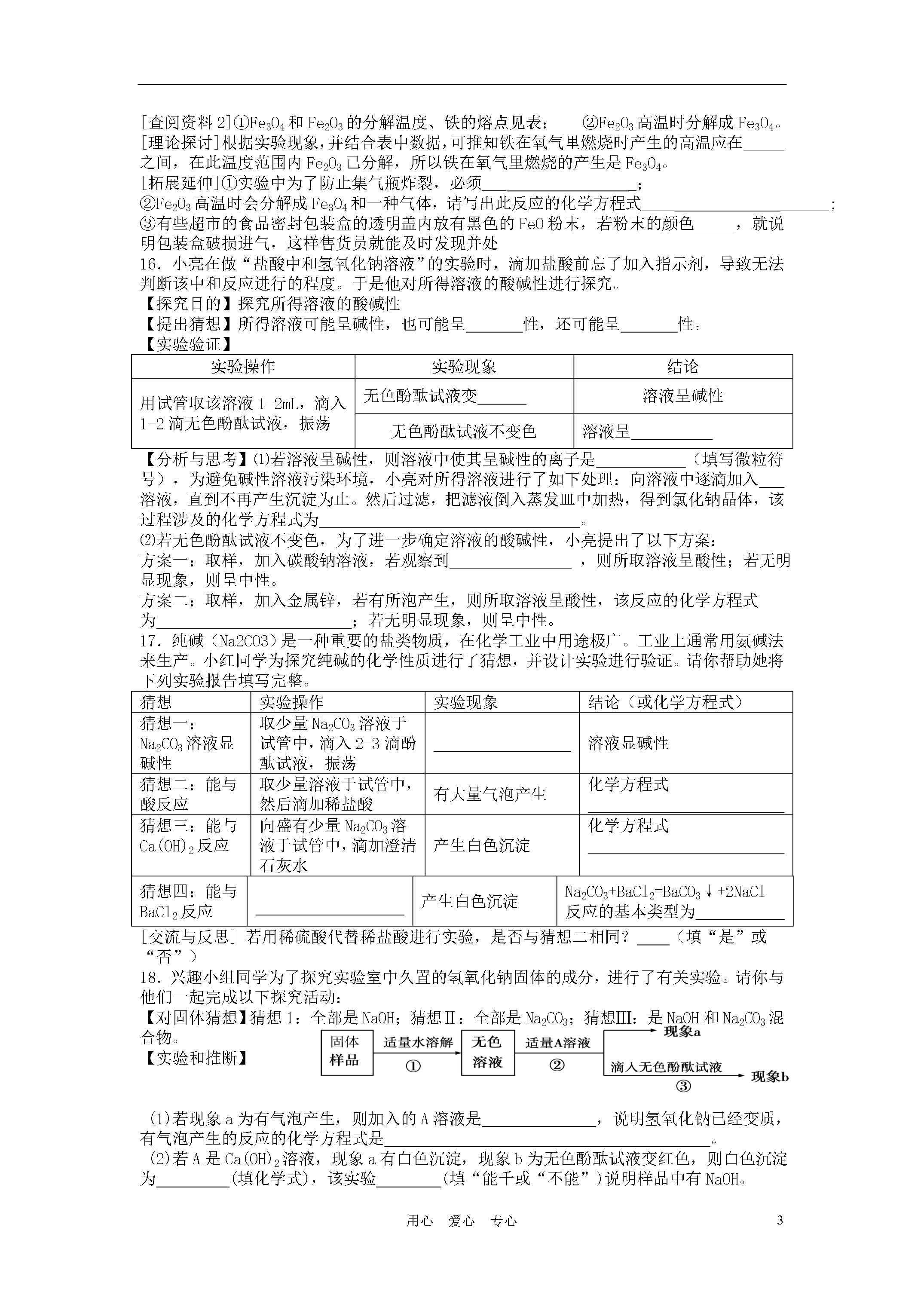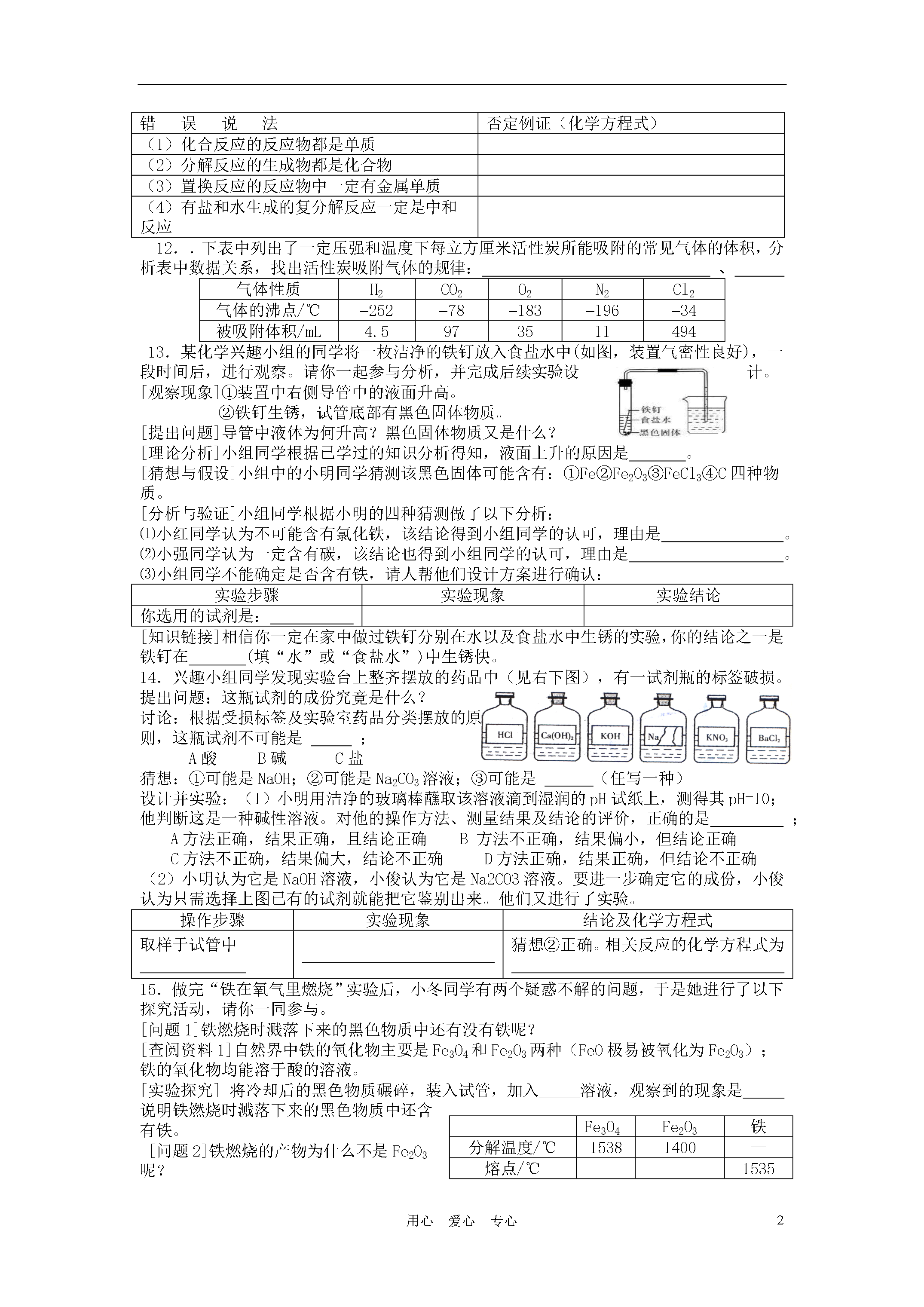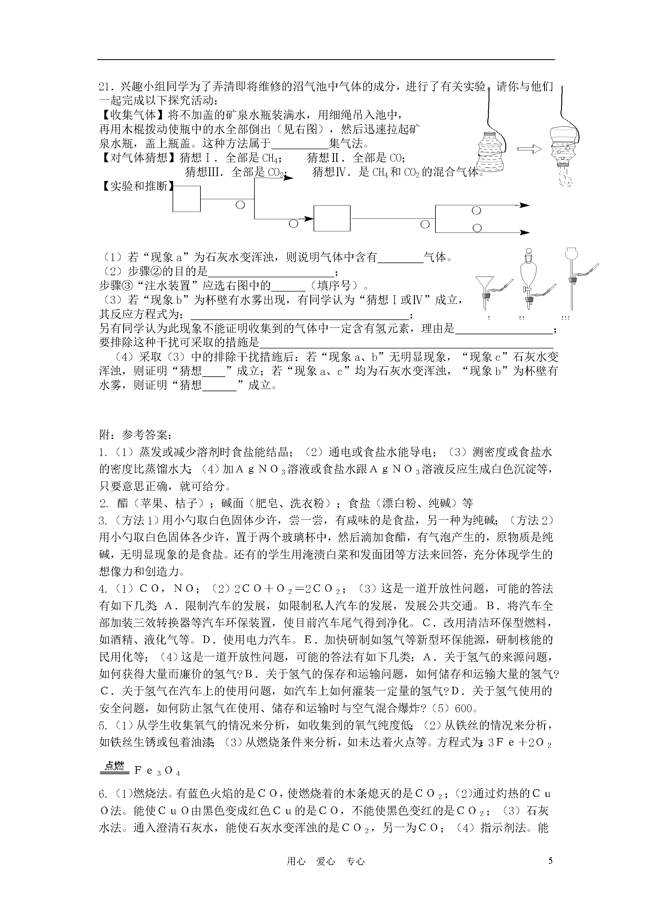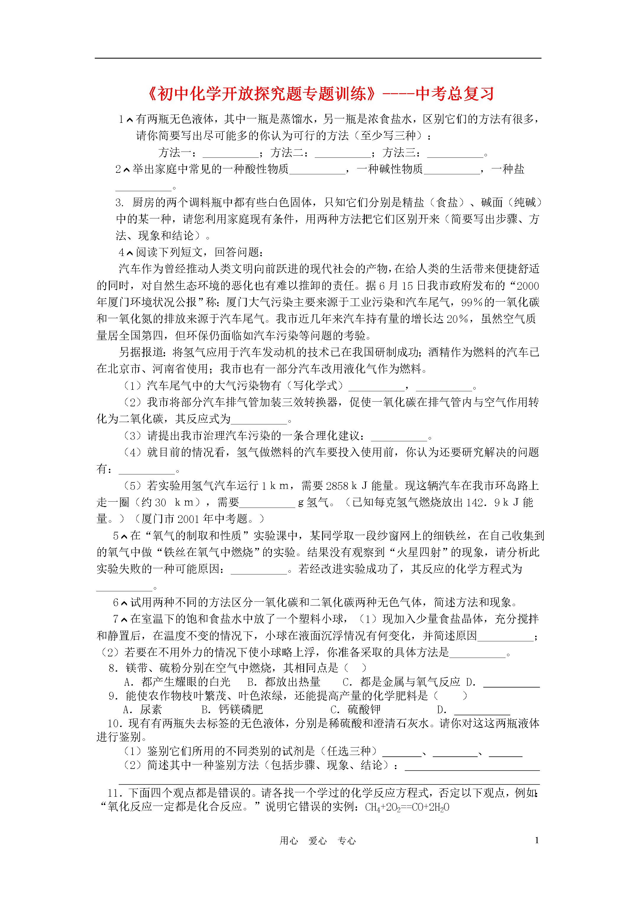 7用心爱心专心《初中化学开放探究题专题训练》----中考总复习1有两瓶无色液体,其中一瓶是蒸馏水,另一瓶是浓食盐水,区别它们的方法有很多,请你简要写出尽可能多的你认为可行的方法(至少写三种):方法一:__________;方法二:__________;方法三:__________。2举出家庭中常见的一种酸性物质__________,一种碱性物质__________,一种盐__________。3.厨房的两个调料瓶中都有些白色固体,只知它们分别是精盐(食盐)、碱面(纯碱)中的某一种,请您利用家庭现有条件,用两种方法把它们区别开来(简要写出步骤、方法、现象和结论)。4阅读下列短文,回答问题:汽车作为曾经推动人类文明向前跃进的现代社会的产物,在给人类的生活带来便捷舒适的同时,对自然生态环境的恶化也有难以推卸的责任。据6月15日我市政府发布的“2000年厦门环境状况公报”称:厦门大气污染主要来源于工业污染和汽车尾气,99%的一氧化碳和一氧化氮的排放来源于汽车尾气。我市近几年来汽车持有量的增长达20%,虽然空气质量居全国第四,但环保仍面临如汽车污染等问题的考验。另据报道:将氢气应用于汽车发动机的技术已在我国研制成功;酒精作为燃料的汽车已在北京市、河南省使用;我市也有一部分汽车改用液化气作为燃料。(1)汽车尾气中的大气污染物有(写化学式)__________,__________。(2)我市将部分汽车排气管加装三效转换器,促使一氧化碳在排气管内与空气作用转化为二氧化碳,其反应式为__________。(3)请提出我市治理汽车污染的一条合理化建议:__________。(4)就目前的情况看,氢气做燃料的汽车要投入使用前,你认为还要研究解决的问题有:__________。(5)若实验用氢气汽车运行1km,需要2858kJ能量。现这辆汽车在我市环岛路上走一圈(约30km),需要__________g氢气。(已知每克氢气燃烧放出142.9kJ能量。)(厦门市2001年中考题。)5在“氧气的制取和性质”实验课中,某同学取一段纱窗网上的细铁丝,在自己收集到的氧气中做“铁丝在氧气中燃烧”的实验。结果没有观察到“火星四射”的现象,请分析此实验失败的一种可能原因:__________。若经改进实验成功了,其反应的化学方程式为__________。6试用两种不同的方法区分一氧化碳和二氧化碳两种无色气体,简述方法和现象。7在室温下的饱和食盐水中放了一个塑料小球,(1)现加入少量食盐晶体,充分搅拌和静置后,在温度不变的情况下,小球在液面沉浮情况有何变化,并简述原因__________;(2)若要在不用外力的情况下使小球略上浮,你准备采取的具体方法是__________。8.镁带、硫粉分别在空气中燃烧,其相同点是()A.都产生耀眼的白光B.都放出热量C.都是金属与氧气反应D.9.能使农作物枝叶繁茂、叶色浓绿,还能提高产量的化学肥料是()A.尿素B.钙镁磷肥C.硫酸钾D.10.现有有两瓶失去标签的无色液体,分别是稀硫酸和澄清石灰水。请你对这这两瓶液体进行鉴别。(1)鉴别它们所用的不同类别的试剂是(任选三种)、、(2)简述其中一种鉴别方法(包括步骤、现象、结论):11.下面四个观点都是错误的。请各找一个学过的化学反应方程式,否定以下观点,例如:“氧化反应一定都是化合反应。”说明它错误的实例:CH4+2O2==CO+2H2O错误说法否定例证(化学方程式)(1)化合反应的反应物都是单质(2)分解反应的生成物都是化合物(3)置换反应的反应物中一定有金属单质(4)有盐和水生成的复分解反应一定是中和反应12..下表中列出了一定压强和温度下每立方厘米活性炭所能吸附的常见气体的体积,分析表中数据关系,找出活性炭吸附气体的规律:、气体性质H2CO2O2N2Cl2气体的沸点/℃2527818319634被吸附体积/mL4.597351149413.某化学兴趣小组的同学将一枚洁净的铁钉放入食盐水中(如图,装置气密性良好),一段时间后,进行观察。请你一起参与分析,并完成后续实验设计。[观察现象]①装置中右侧导管中的液面升高。②铁钉生锈,试管底部有黑色固体物质。[提出问题]导管中液体为何升高?黑色固体物质又是什么?[理论分析]小组同学根据已学过的知识分析得知,液面上升的原因是。[猜想与假设]小组中的小明同学猜测该黑色固体可能含有:①Fe②Fe2O3③FeCl3④C四种物质。[分析与验证]小组同学根据小明的四种猜测做了以下分析:⑴小红同学认为不可能含有氯化铁,该结论得到小组同学的认可,理由是。⑵小强同学认为一定含有碳,该结论也得到小组同学的认可,理由是。⑶小组同学不能确定是否含有铁,请人帮他们设计方案进行确认:实验步骤实验现象实验结论你选用的试剂是:[知识链接]相信你一定