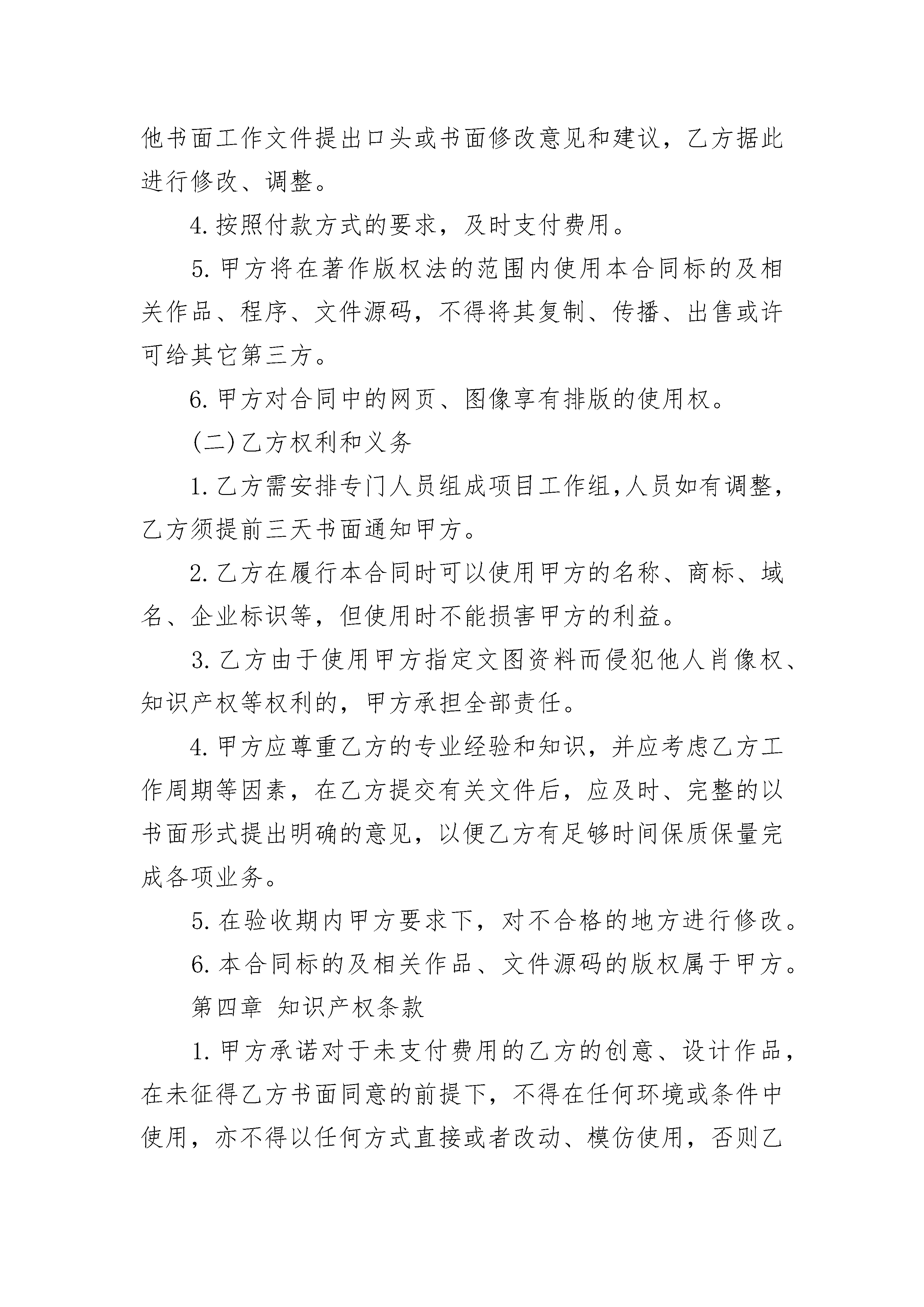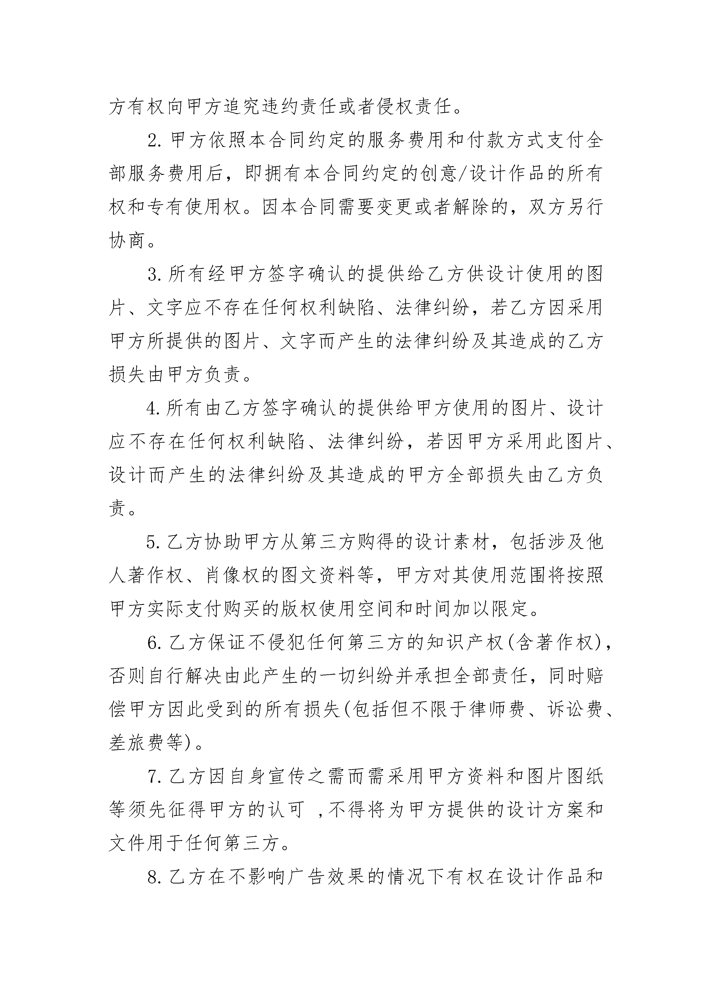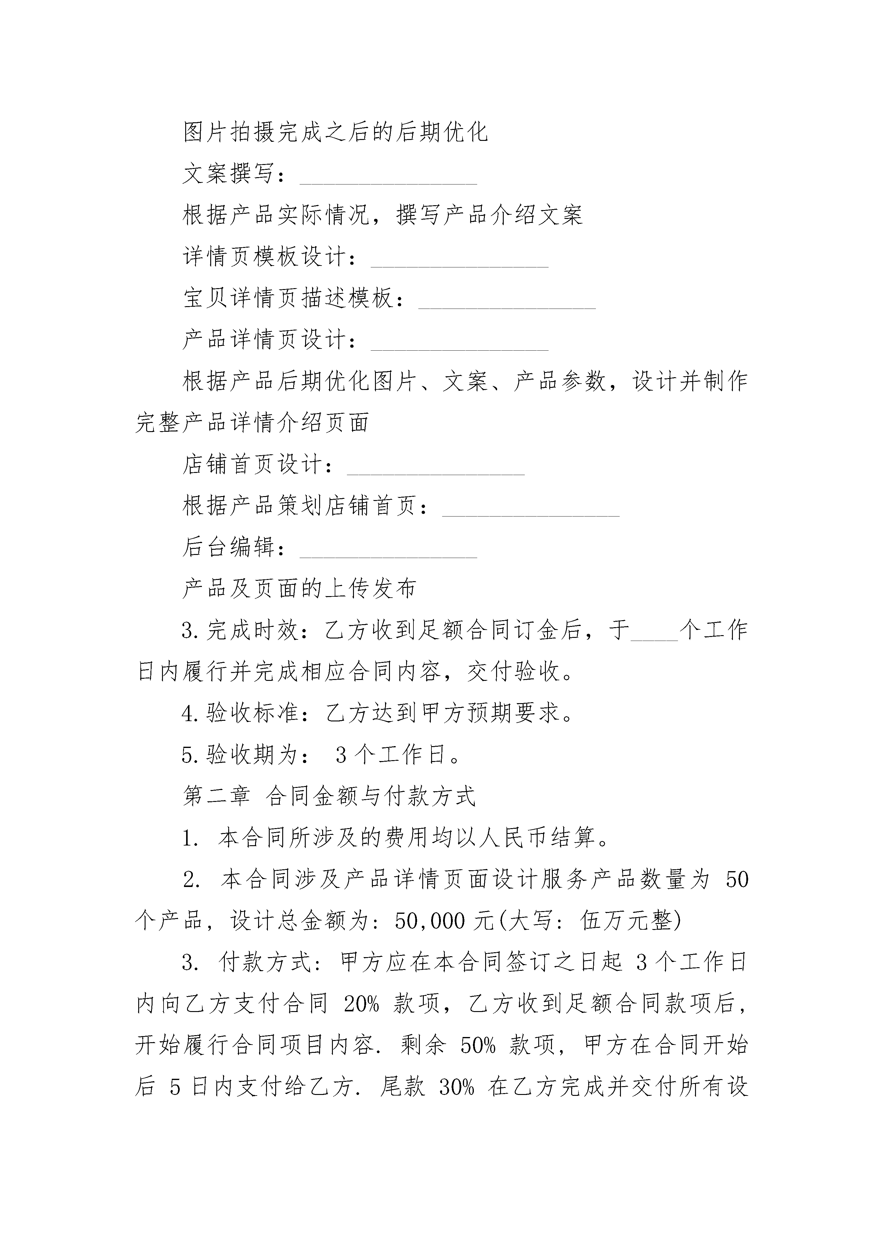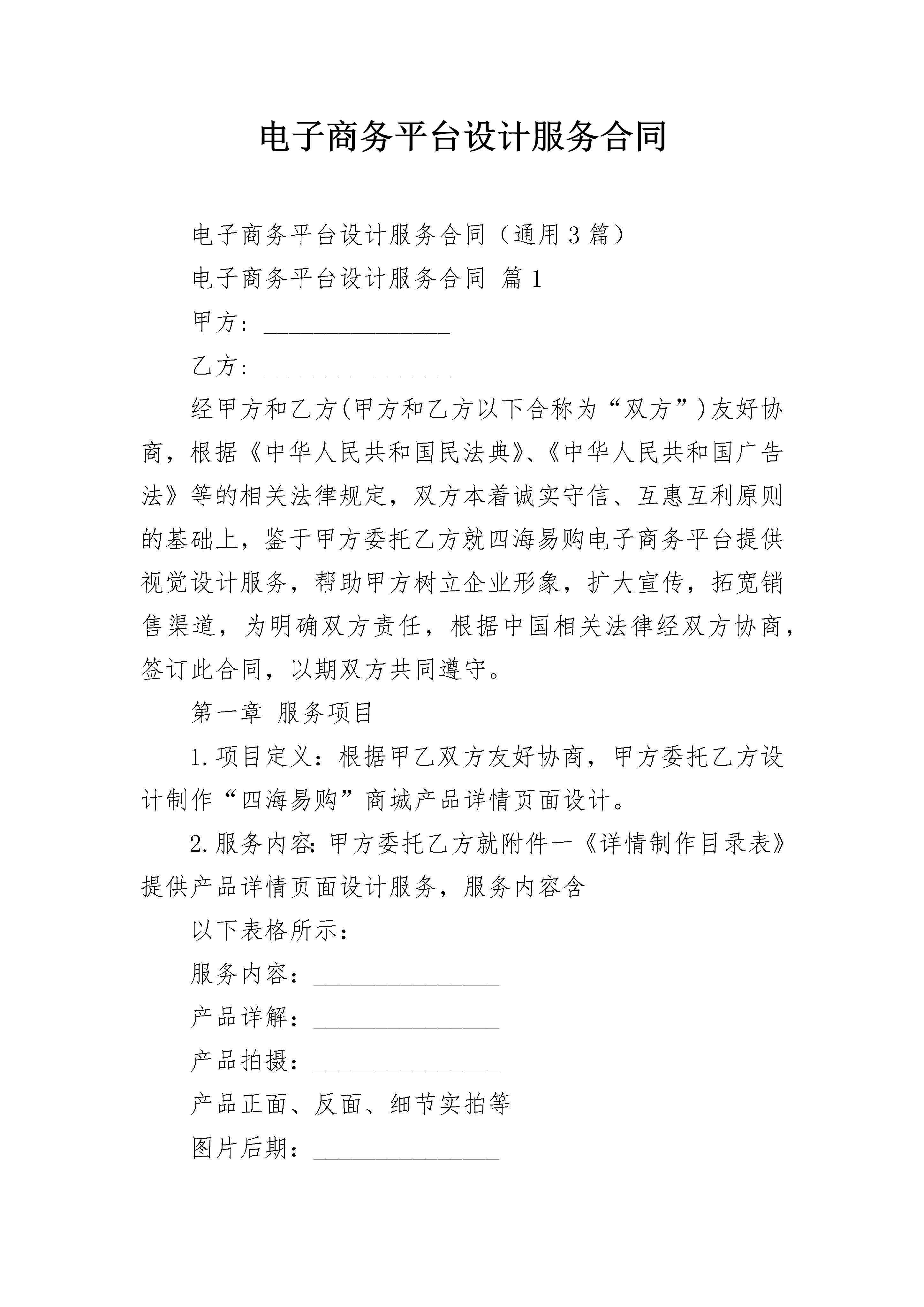 电子商务平台设计服务合同电子商务平台设计服务合同(通用3篇)电子商务平台设计服务合同篇1甲方:_______________乙方:_______________经甲方和乙方(甲方和乙方以下合称为“双方”)友好协商,根据《中华人民共和国民法典》、《中华人民共和国广告法》等的相关法律规定,双方本着诚实守信、互惠互利原则的基础上,鉴于甲方委托乙方就四海易购电子商务平台提供视觉设计服务,帮助甲方树立企业形象,扩大宣传,拓宽销售渠道,为明确双方责任,根据中国相关法律经双方协商,签订此合同,以期双方共同遵守。第一章服务项目1.项目定义:根据甲乙双方友好协商,甲方委托乙方设计制作“四海易购”商城产品详情页面设计。2.服务内容:甲方委托乙方就附件一《详情制作目录表》提供产品详情页面设计服务,服务内容含以下表格所示:服务内容:_______________产品详解:_______________产品拍摄:_______________产品正面、反面、细节实拍等图片后期:_______________图片拍摄完成之后的后期优化文案撰写:_______________根据产品实际情况,撰写产品介绍文案详情页模板设计:_______________宝贝详情页描述模板:_______________产品详情页设计:_______________根据产品后期优化图片、文案、产品参数,设计并制作完整产品详情介绍页面店铺首页设计:_______________根据产品策划店铺首页:_______________后台编辑:_______________产品及页面的上传发布3.完成时效:乙方收到足额合同订金后,于____个工作日内履行并完成相应合同内容,交付验收。4.验收标准:乙方达到甲方预期要求。5.验收期为:3个工作日。第二章合同金额与付款方式1.本合同所涉及的费用均以人民币结算。2.本合同涉及产品详情页面设计服务产品数量为50个产品,设计总金额为:50,000元(大写:伍万元整)3.付款方式:甲方应在本合同签订之日起3个工作日内向乙方支付合同20%款项,乙方收到足额合同款项后,开始履行合同项目内容.剩余50%款项,甲方在合同开始后5日内支付给乙方.尾款30%在乙方完成并交付所有设计文件,甲方验收合格后3日内支付给乙方.4.乙方收到所有款项后10日内给甲方开具发票.5.收款账号:_______________开户名称:_______________法定代表人:_______________公司地址:_______________开户银行:_______________公司账号:_______________6.交付标准:乙方移交于甲方的设计文件包含但不限于产品拍摄原图、产品后期优化图片、产品文案文档资料、产品详情页面设计PSD源文件等相关资料,并以单个产品独立文件夹形式执行交付。第三章甲乙双方权利和义务(一)甲方权利和义务1.甲方应出具授权委托书确定甲方的对口衔接人,全权代表甲方对委托项目的总体设计风格及功能要求进行控制负责,并有对所有稿件签字确认的权利和义务。2.甲方应积极配合乙方工作,按双方约定的项目进度计划及时提供乙方服务所需的各种图片、文字原形资料和相关信息,并对以上资料的合法性、真实性负责,如因使用甲方提供的资料而引起乙方的任何法律纠纷和违规行为,一切责任均由甲方承担,乙方不承担由此产生的直接责任或者间接责任。3.甲方有权及时对乙方所提交的设计方案、设计稿和其他书面工作文件提出口头或书面修改意见和建议,乙方据此进行修改、调整。4.按照付款方式的要求,及时支付费用。5.甲方将在著作版权法的范围内使用本合同标的及相关作品、程序、文件源码,不得将其复制、传播、出售或许可给其它第三方。6.甲方对合同中的网页、图像享有排版的使用权。(二)乙方权利和义务1.乙方需安排专门人员组成项目工作组,人员如有调整,乙方须提前三天书面通知甲方。2.乙方在履行本合同时可以使用甲方的名称、商标、域名、企业标识等,但使用时不能损害甲方的利益。3.乙方由于使用甲方指定文图资料而侵犯他人肖像权、知识产权等权利的,甲方承担全部责任。4.甲方应尊重乙方的专业经验和知识,并应考虑乙方工作周期等因素,在乙方提交有关文件后,应及时、完整的以书面形式提出明确的意见,以便乙方有足够时间保质保量完成各项业务。5.在验收期内甲方要求下,对不合格的地方进行修改。6.本合同标的及相关作品、文件源码的版权属于甲方。第四章知识产权条款1.甲方承诺对于未支付费用的乙方的创意、设计作品,在未征得乙方书面同意的前提下,不得在任何环境或条件中使用,亦不得以任何方式直接或者改动、模仿使用,否则乙方有权向甲方追究违约责任或者侵权责任。2.甲方依照本合同约定的服务费用和付款方式支付全部服务费用后,即拥有本合同约定的创