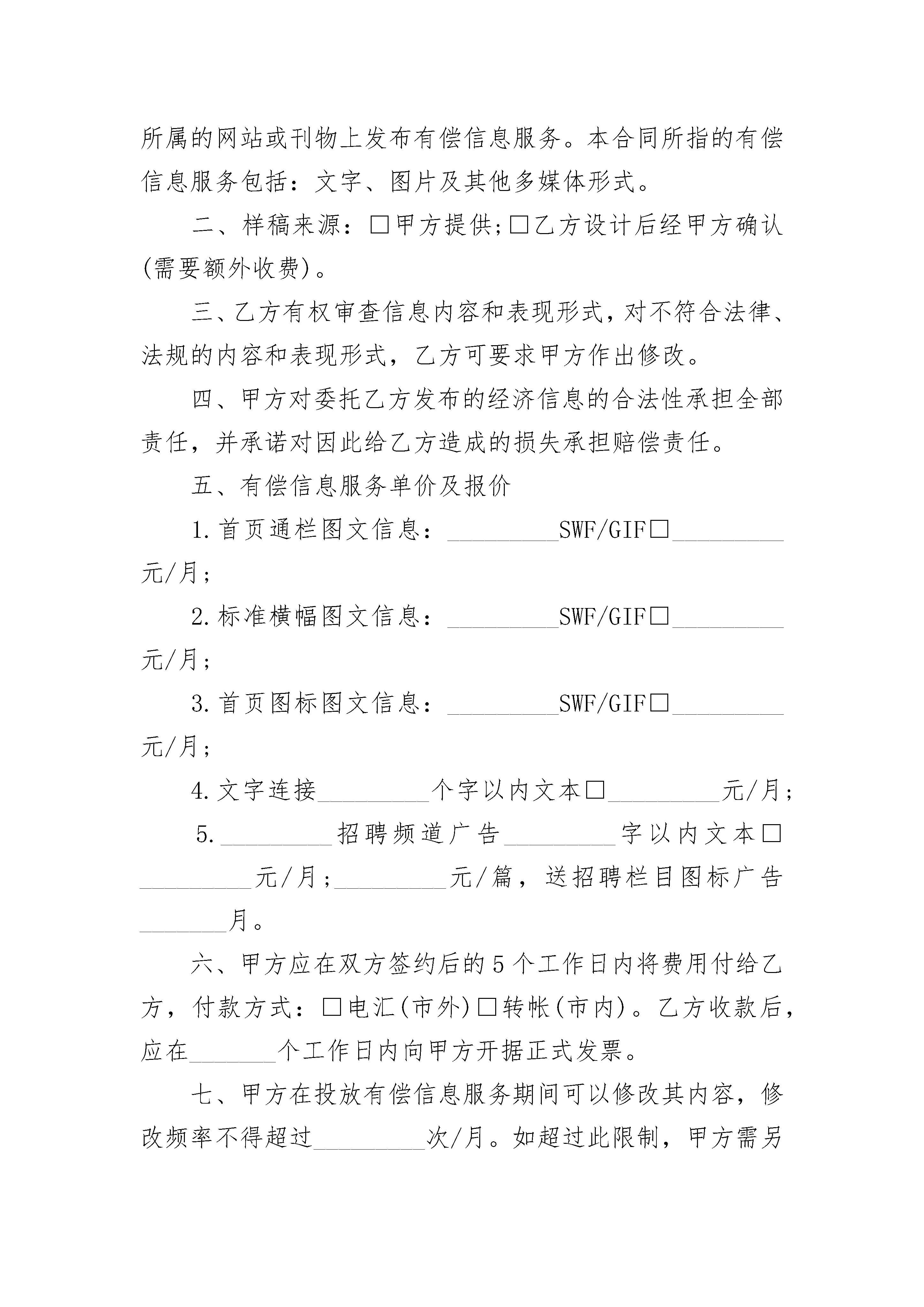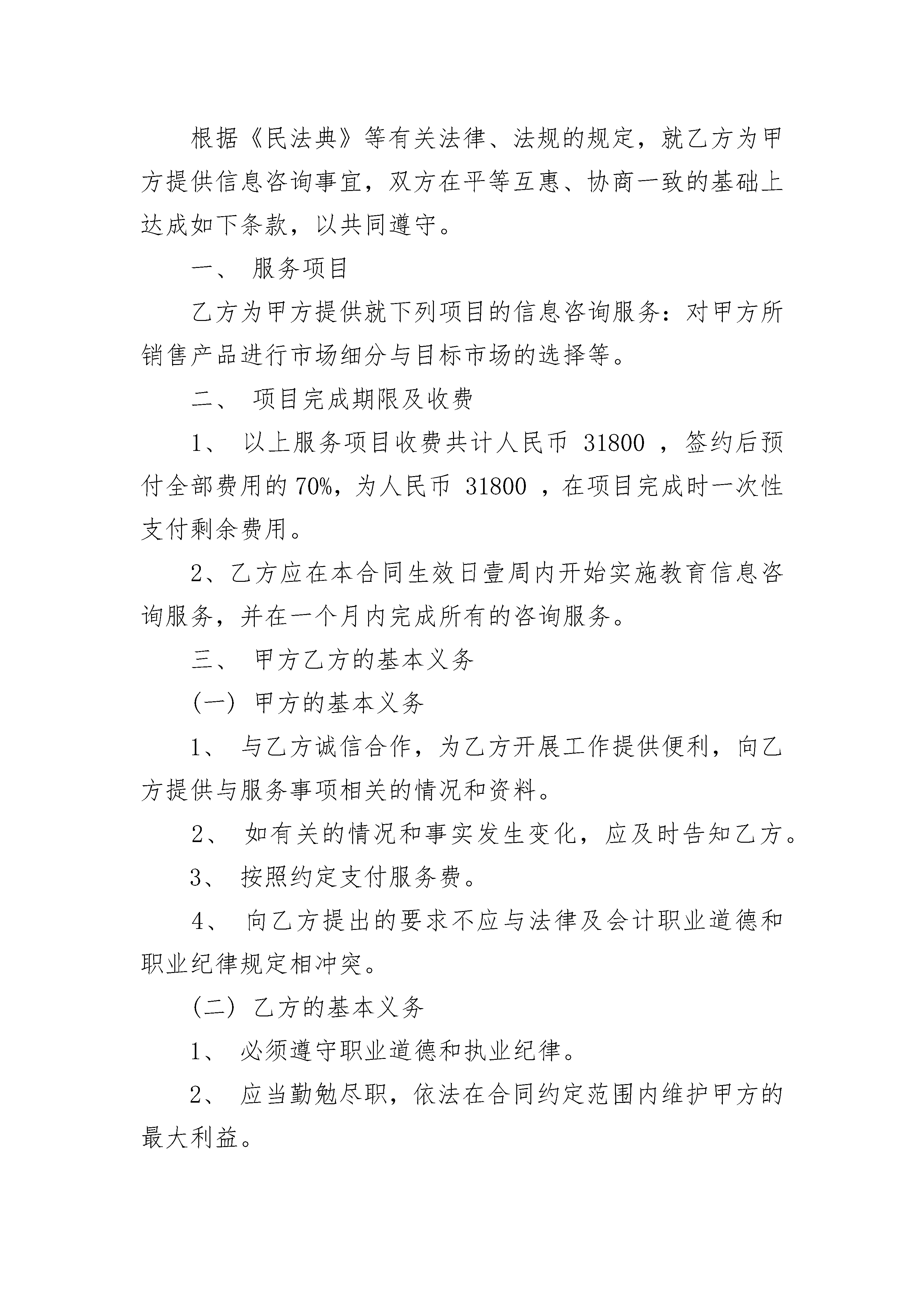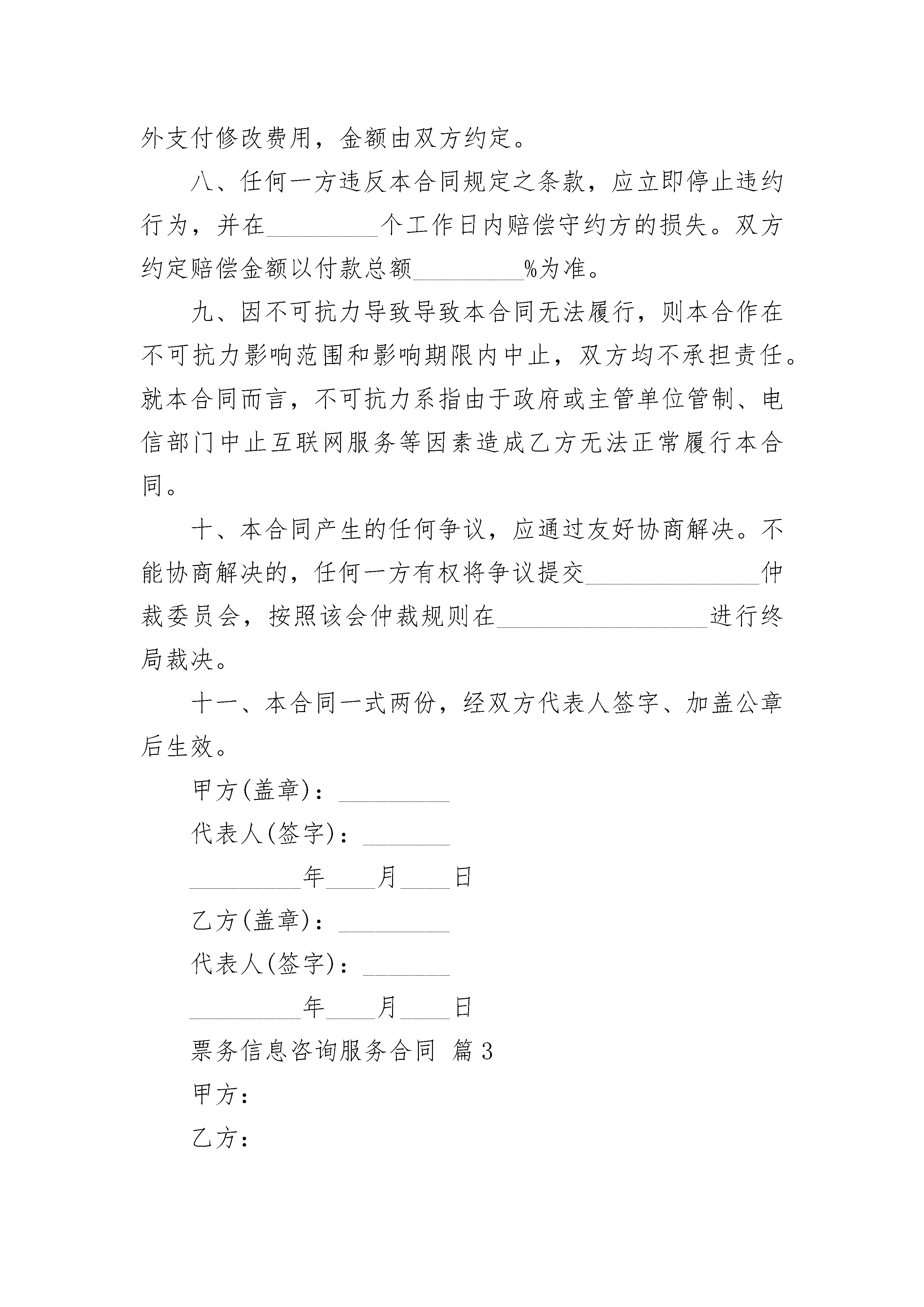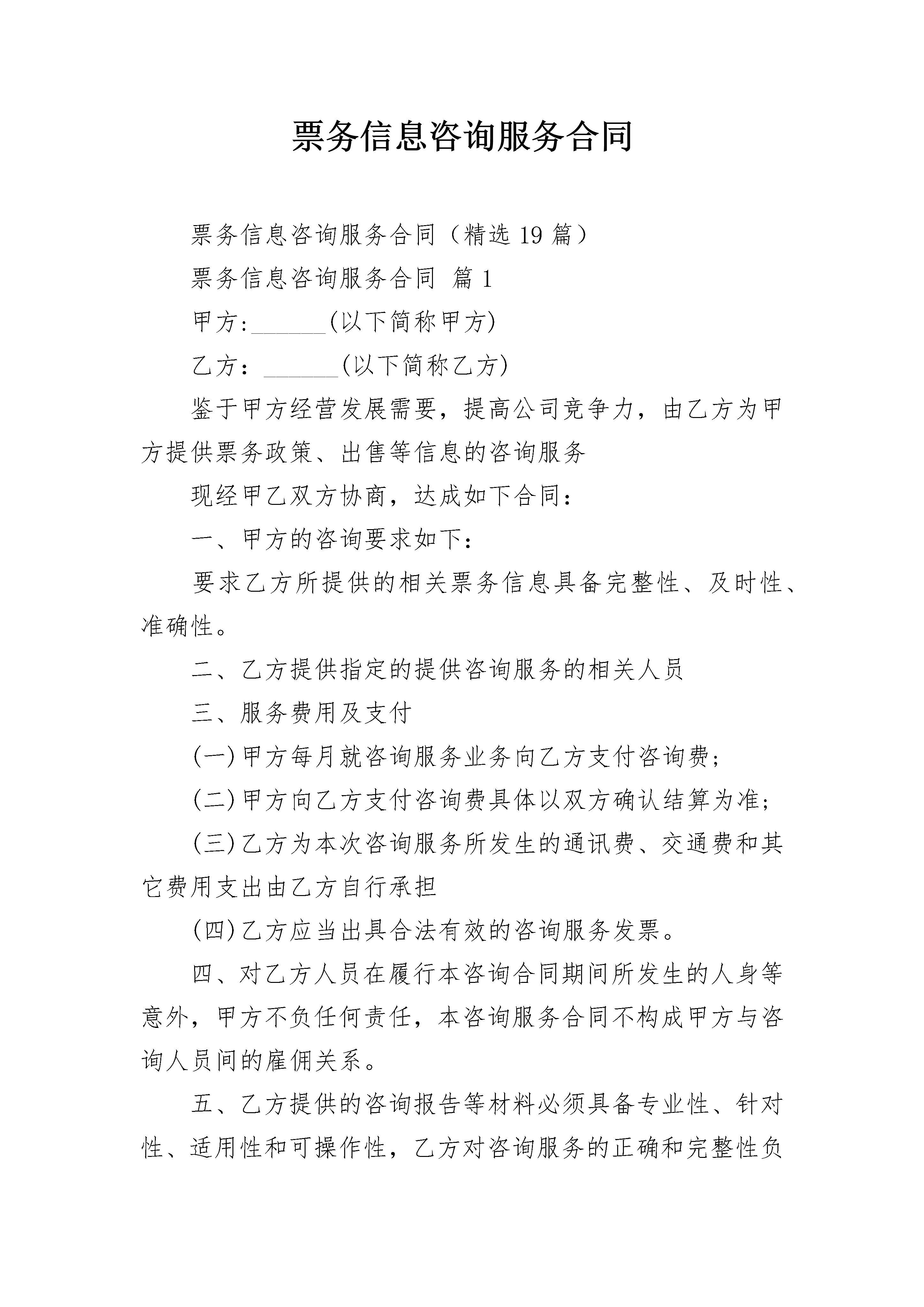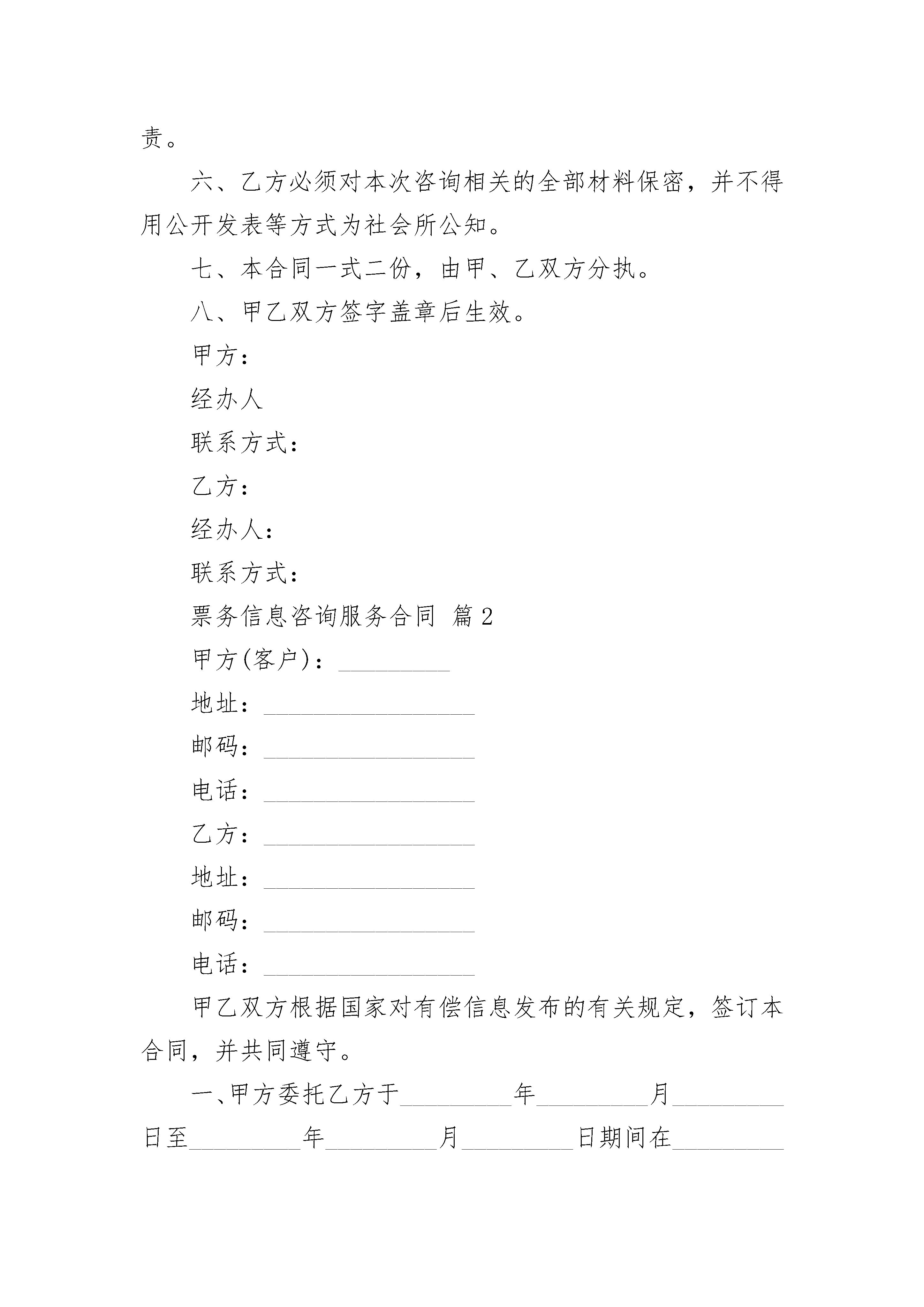 票务信息咨询服务合同票务信息咨询服务合同(精选19篇)票务信息咨询服务合同篇1甲方:______(以下简称甲方)乙方:______(以下简称乙方)鉴于甲方经营发展需要,提高公司竞争力,由乙方为甲方提供票务政策、出售等信息的咨询服务现经甲乙双方协商,达成如下合同:一、甲方的咨询要求如下:要求乙方所提供的相关票务信息具备完整性、及时性、准确性。二、乙方提供指定的提供咨询服务的相关人员三、服务费用及支付(一)甲方每月就咨询服务业务向乙方支付咨询费;(二)甲方向乙方支付咨询费具体以双方确认结算为准;(三)乙方为本次咨询服务所发生的通讯费、交通费和其它费用支出由乙方自行承担(四)乙方应当出具合法有效的咨询服务发票。四、对乙方人员在履行本咨询合同期间所发生的人身等意外,甲方不负任何责任,本咨询服务合同不构成甲方与咨询人员间的雇佣关系。五、乙方提供的咨询报告等材料必须具备专业性、针对性、适用性和可操作性,乙方对咨询服务的正确和完整性负责。六、乙方必须对本次咨询相关的全部材料保密,并不得用公开发表等方式为社会所公知。七、本合同一式二份,由甲、乙双方分执。八、甲乙双方签字盖章后生效。甲方:经办人联系方式:乙方:经办人:联系方式:票务信息咨询服务合同篇2甲方(客户):_________地址:_________________邮码:_________________电话:_________________乙方:_________________地址:_________________邮码:_________________电话:_________________甲乙双方根据国家对有偿信息发布的有关规定,签订本合同,并共同遵守。一、甲方委托乙方于_________年_________月_________日至_________年_________月_________日期间在_________所属的网站或刊物上发布有偿信息服务。本合同所指的有偿信息服务包括:文字、图片及其他多媒体形式。二、样稿来源:□甲方提供;□乙方设计后经甲方确认(需要额外收费)。三、乙方有权审查信息内容和表现形式,对不符合法律、法规的内容和表现形式,乙方可要求甲方作出修改。四、甲方对委托乙方发布的经济信息的合法性承担全部责任,并承诺对因此给乙方造成的损失承担赔偿责任。五、有偿信息服务单价及报价1.首页通栏图文信息:_________SWF/GIF□_________元/月;2.标准横幅图文信息:_________SWF/GIF□_________元/月;3.首页图标图文信息:_________SWF/GIF□_________元/月;4.文字连接_________个字以内文本□_________元/月;5._________招聘频道广告_________字以内文本□_________元/月;_________元/篇,送招聘栏目图标广告_______月。六、甲方应在双方签约后的5个工作日内将费用付给乙方,付款方式:□电汇(市外)□转帐(市内)。乙方收款后,应在_______个工作日内向甲方开据正式发票。七、甲方在投放有偿信息服务期间可以修改其内容,修改频率不得超过_________次/月。如超过此限制,甲方需另外支付修改费用,金额由双方约定。八、任何一方违反本合同规定之条款,应立即停止违约行为,并在_________个工作日内赔偿守约方的损失。双方约定赔偿金额以付款总额_________%为准。九、因不可抗力导致导致本合同无法履行,则本合作在不可抗力影响范围和影响期限内中止,双方均不承担责任。就本合同而言,不可抗力系指由于政府或主管单位管制、电信部门中止互联网服务等因素造成乙方无法正常履行本合同。十、本合同产生的任何争议,应通过友好协商解决。不能协商解决的,任何一方有权将争议提交______________仲裁委员会,按照该会仲裁规则在_________________进行终局裁决。十一、本合同一式两份,经双方代表人签字、加盖公章后生效。甲方(盖章):_________代表人(签字):________________年____月____日乙方(盖章):_________代表人(签字):________________年____月____日票务信息咨询服务合同篇3甲方:乙方:根据《民法典》等有关法律、法规的规定,就乙方为甲方提供信息咨询事宜,双方在平等互惠、协商一致的基础上达成如下条款,以共同遵守。一、服务项目乙方为甲方提供就下列项目的信息咨询服务:对甲方所销售产品进行市场细分与目标市场的选择等。二、项目完成期限及收费1、以上服务项目收费共计人民币31800,签约后预付全部费用的70%,为人民币31800,在项目完成时一次性支付剩余费用。2、乙方应在本合同生效日壹周内开始实施教育信息
