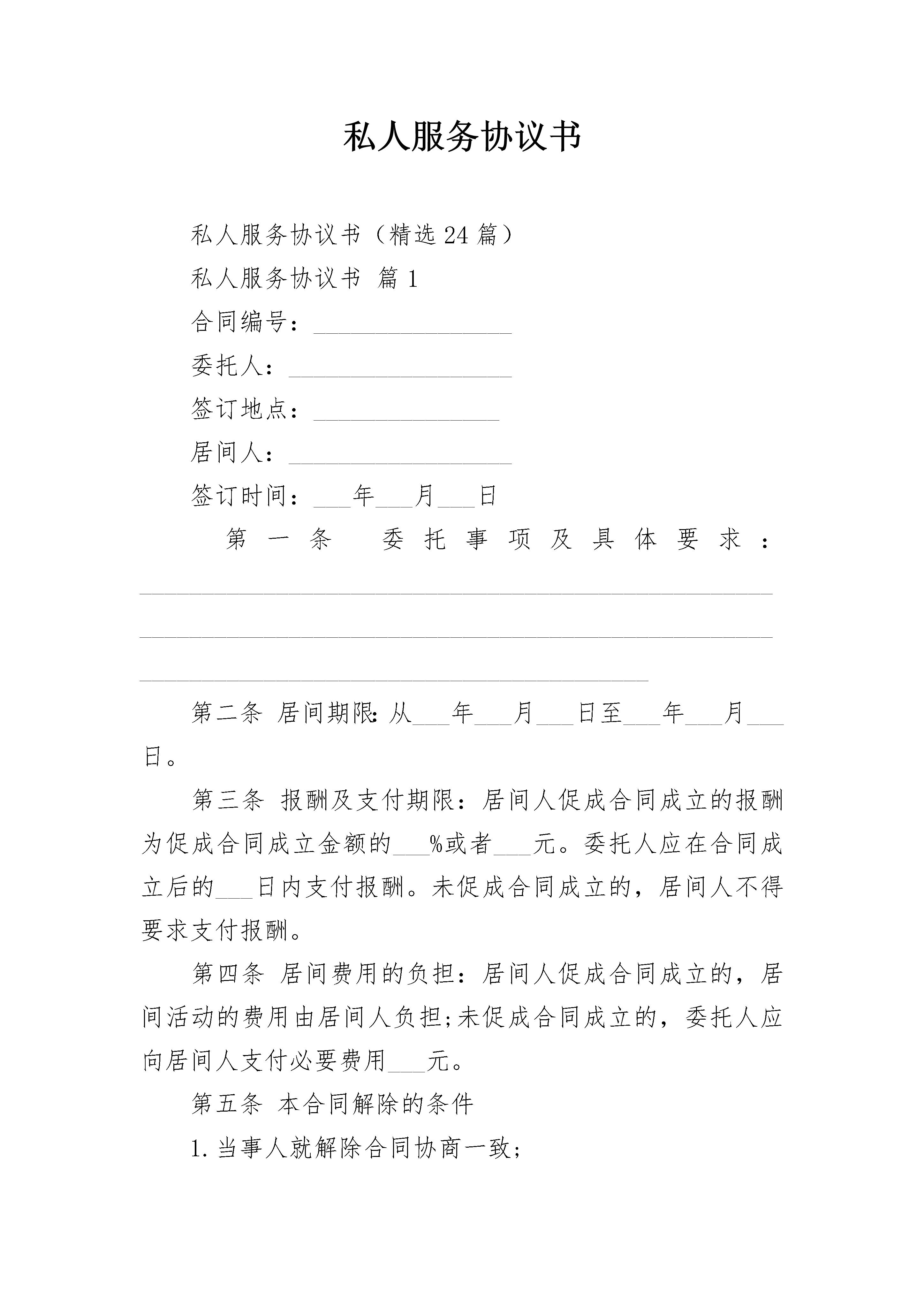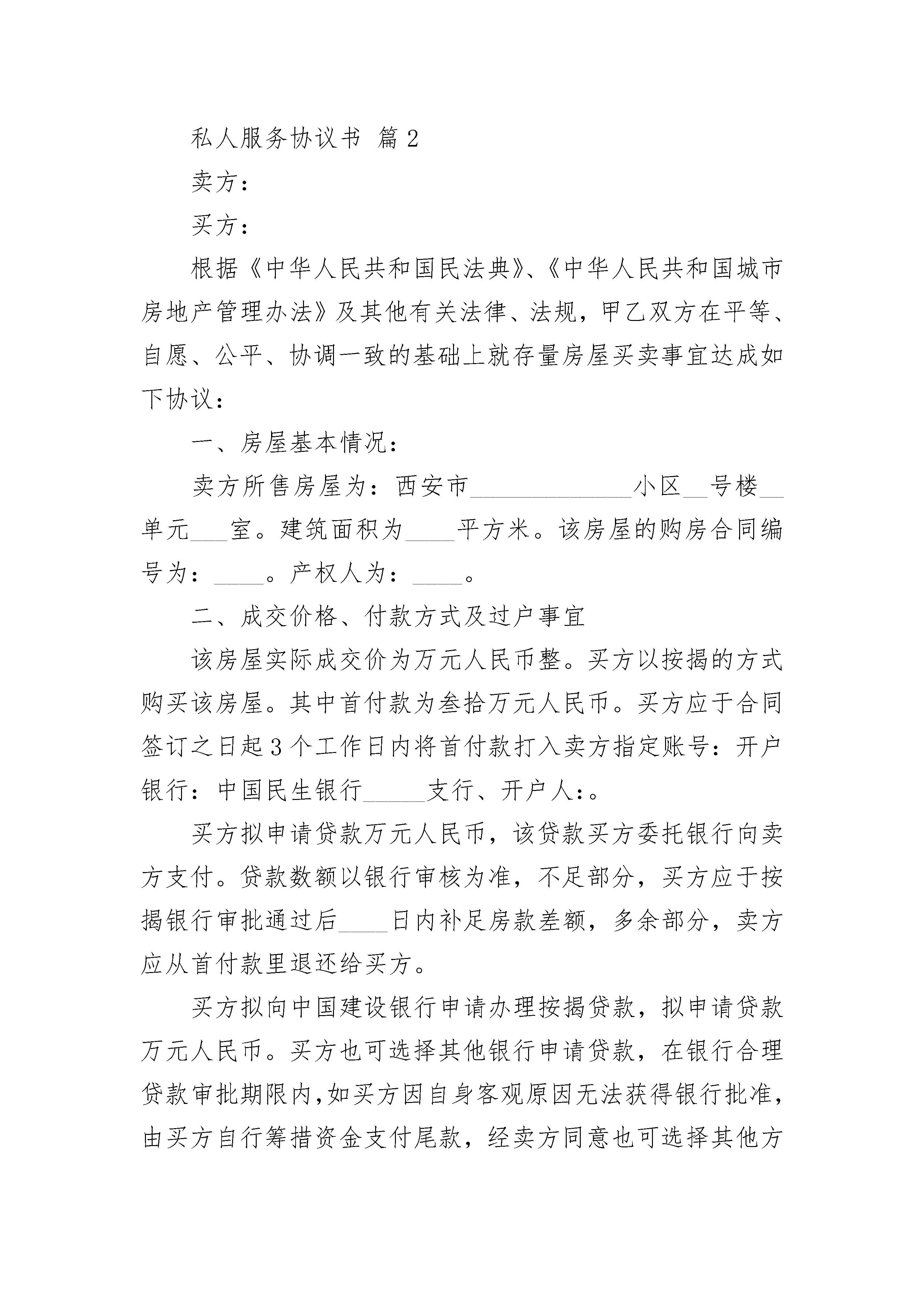 私人服务协议书私人服务协议书(精选24篇)私人服务协议书篇1合同编号:________________委托人:__________________签订地点:_______________居间人:__________________签订时间:___年___月___日第一条委托事项及具体要求:_______________________________________________________________________________________________________________________________________________第二条居间期限:从___年___月___日至___年___月___日。第三条报酬及支付期限:居间人促成合同成立的报酬为促成合同成立金额的___%或者___元。委托人应在合同成立后的___日内支付报酬。未促成合同成立的,居间人不得要求支付报酬。第四条居间费用的负担:居间人促成合同成立的,居间活动的费用由居间人负担;未促成合同成立的,委托人应向居间人支付必要费用___元。第五条本合同解除的条件1.当事人就解除合同协商一致;2.因不可抗力致使不能实现合同目的;3.在委托期限届满之前,当事人一方明确表示或者以自己的行为表明不履行主要义务;4.当事人一方迟延履行主要义务,经催告后在合理期限内仍未履行;5.当事人一方迟延履行义务或者有其他违约行为致使不能实现合同目的。第六条委托人的违约责任:____________________________________________________________________________________第七条居间人的违约责任:_____________________________________________________________________________________________第八条合同争议的解决方式:本合同在履行过程中发生的争议,由双方当事人协商解决;也可由当地工商行政管理部门调解;协商或调解不成的,按下列第___种方式解决:提交____________仲裁委员会仲裁;依法向人民法院起诉。第九条其他约定事项:___________________________________________________________________________第十条本合同未作规定的,按《中华人民共和国民法典》的规定执行。甲方:_____联系地址:_____联系电话:_____乙方:_____联系地址:_____联系电话:_____私人服务协议书篇2卖方:买方:根据《中华人民共和国民法典》、《中华人民共和国城市房地产管理办法》及其他有关法律、法规,甲乙双方在平等、自愿、公平、协调一致的基础上就存量房屋买卖事宜达成如下协议:一、房屋基本情况:卖方所售房屋为:西安市_____________小区__号楼__单元___室。建筑面积为____平方米。该房屋的购房合同编号为:____。产权人为:____。二、成交价格、付款方式及过户事宜该房屋实际成交价为万元人民币整。买方以按揭的方式购买该房屋。其中首付款为叁拾万元人民币。买方应于合同签订之日起3个工作日内将首付款打入卖方指定账号:开户银行:中国民生银行_____支行、开户人:。买方拟申请贷款万元人民币,该贷款买方委托银行向卖方支付。贷款数额以银行审核为准,不足部分,买方应于按揭银行审批通过后____日内补足房款差额,多余部分,卖方应从首付款里退还给买方。买方拟向中国建设银行申请办理按揭贷款,拟申请贷款万元人民币。买方也可选择其他银行申请贷款,在银行合理贷款审批期限内,如买方因自身客观原因无法获得银行批准,由买方自行筹措资金支付尾款,经卖方同意也可选择其他方式支付余款。卖方应密切跟踪房屋产权证办理进程,自产证办理后____日内偿还完毕银行贷款并取得完整产权证,完整产权证下发之日起5个工作日内交付乙方开始办理过户各项手续,逾期未交付导致产生的国家政策性收费时,原则上由卖方承担。三、房屋产权及具体状况的承诺卖方应当保证该房屋没有产权纠纷,因卖方原因造成该房屋不能办理产权登记或发生债权债务纠纷的,由卖方承担相关责任。卖方应当保证已如实陈述该房屋权属状况、附属设施设备、装饰装修情况和相关关系,买方对卖方出售的该房屋具体状况充分了解,自愿购买该房屋。卖方应当保证自本合同签订之日起至该房屋验收交接完成,对各项房屋附属设施设备及装饰装修保持良好的状况。在房屋交付日以前发生的物业管理费、供暖、水、电、燃气、有线电视、电信等其它费用由卖方承担,交付日以后发生的费用由买方承担。卖方同意将其缴纳的该房屋专项维修资金的业主信息更名至买方名下。卖方承诺无条件配合买房办理房屋过