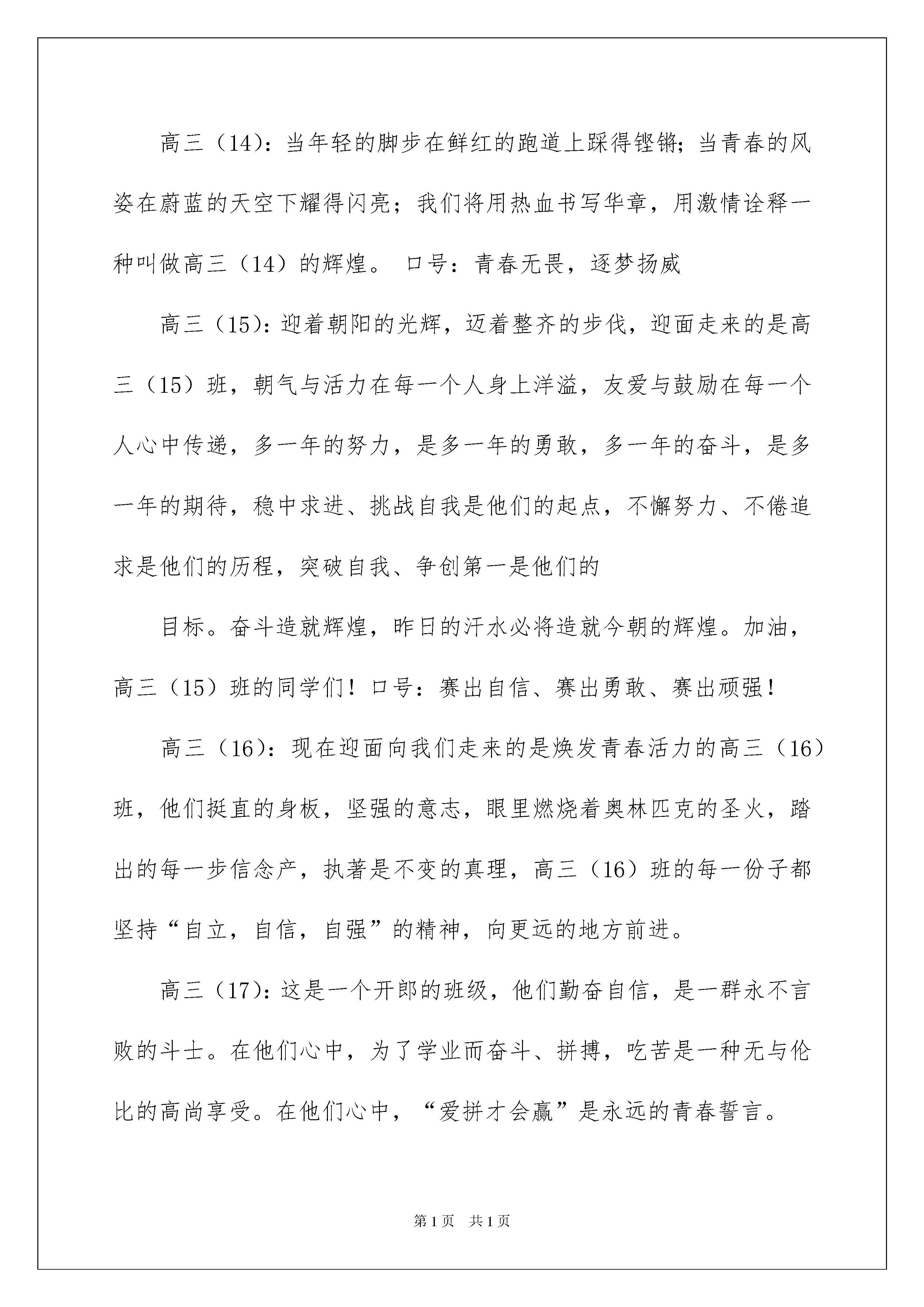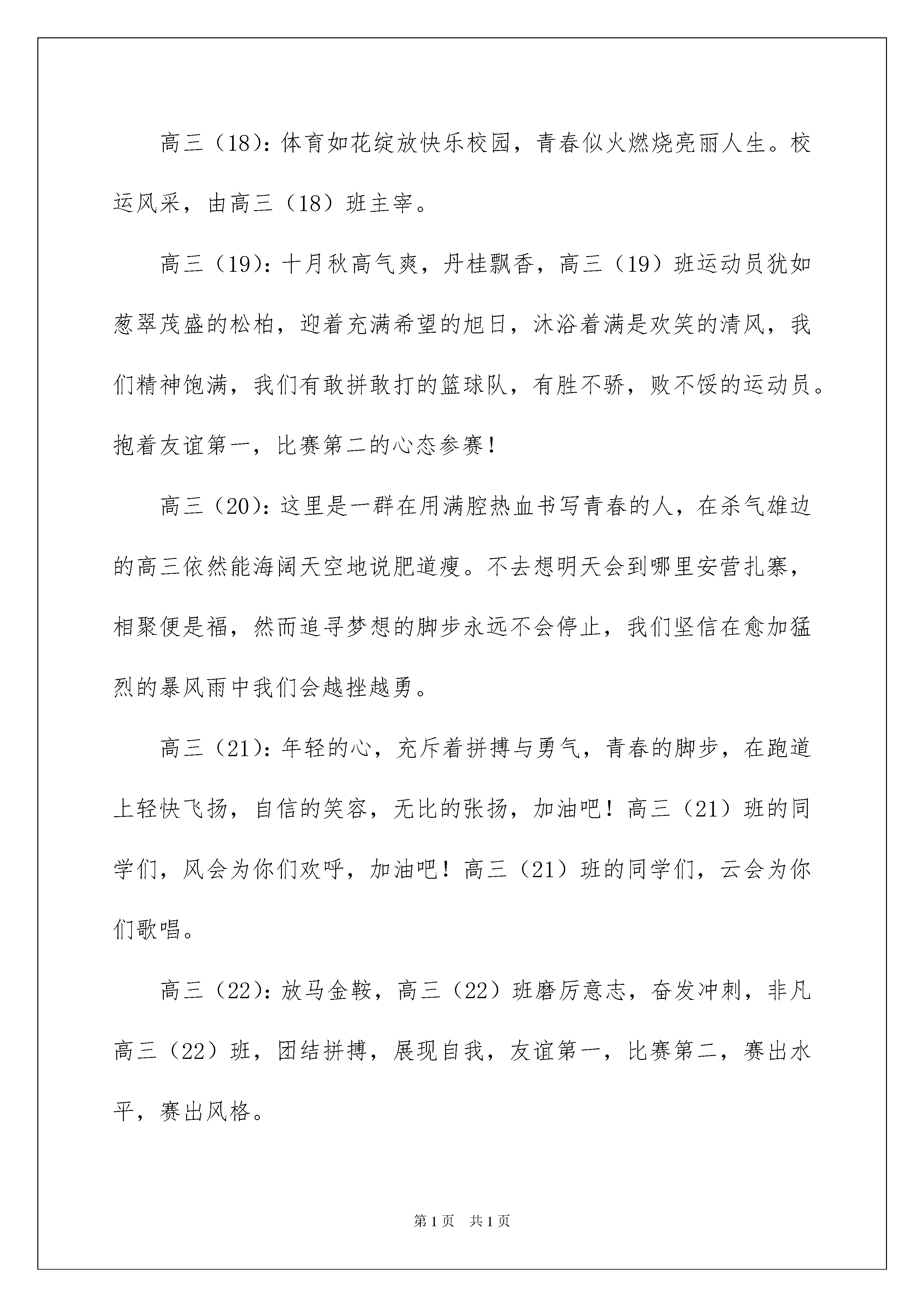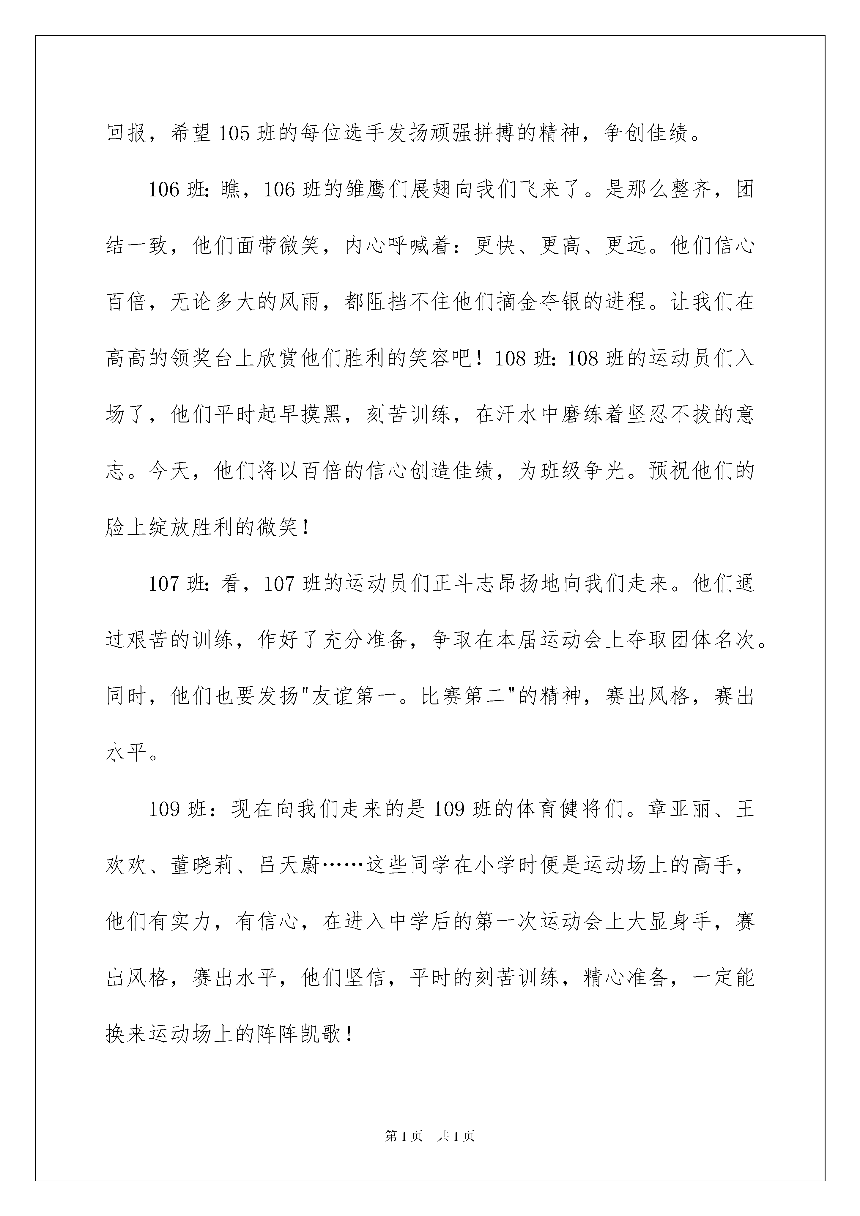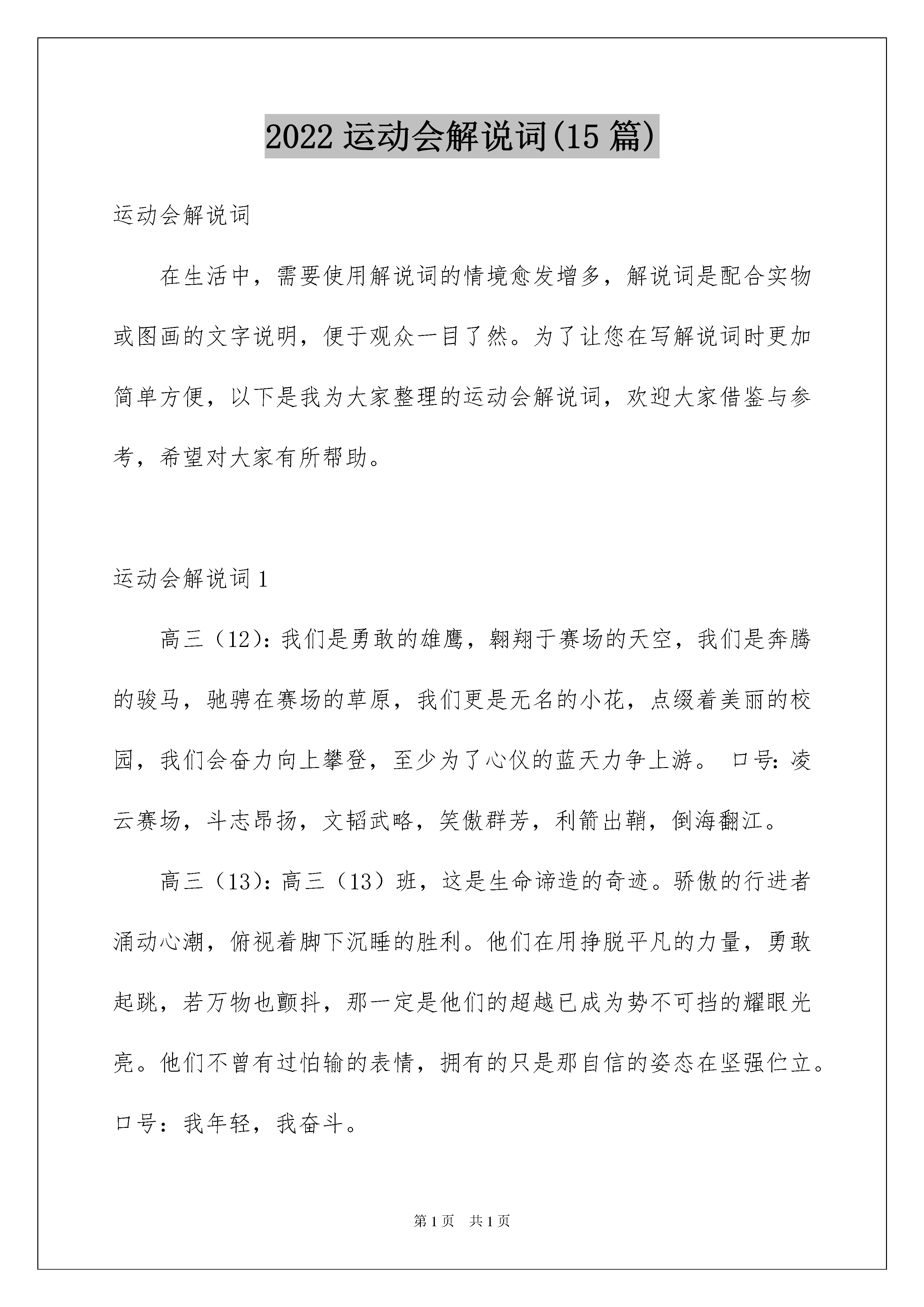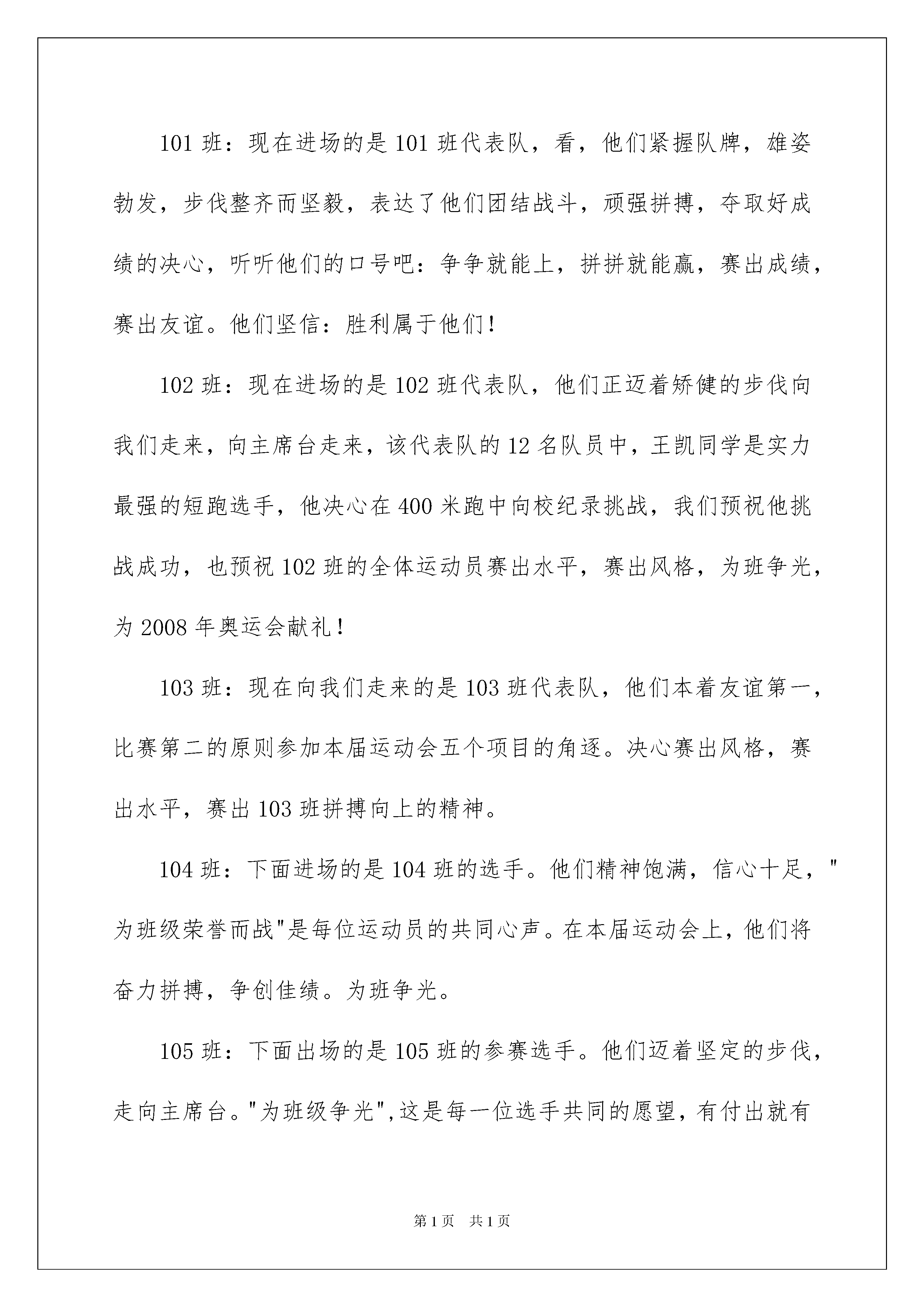 2022运动会解说词(15篇)运动会解说词在生活中,需要使用解说词的情境愈发增多,解说词是配合实物或图画的文字说明,便于观众一目了然。为了让您在写解说词时更加简单方便,以下是我为大家整理的运动会解说词,欢迎大家借鉴与参考,希望对大家有所帮助。运动会解说词1高三(12):我们是勇敢的雄鹰,翱翔于赛场的天空,我们是奔腾的骏马,驰骋在赛场的草原,我们更是无名的小花,点缀着美丽的校园,我们会奋力向上攀登,至少为了心仪的蓝天力争上游。口号:凌云赛场,斗志昂扬,文韬武略,笑傲群芳,利箭出鞘,倒海翻江。高三(13):高三(13)班,这是生命谛造的奇迹。骄傲的行进者涌动心潮,俯视着脚下沉睡的胜利。他们在用挣脱平凡的力量,勇敢起跳,若万物也颤抖,那一定是他们的超越已成为势不可挡的耀眼光亮。他们不曾有过怕输的表情,拥有的只是那自信的姿态在坚强伫立。口号:我年轻,我奋斗。高三(14):当年轻的脚步在鲜红的跑道上踩得铿锵;当青春的风姿在蔚蓝的天空下耀得闪亮;我们将用热血书写华章,用激情诠释一种叫做高三(14)的辉煌。口号:青春无畏,逐梦扬威高三(15):迎着朝阳的光辉,迈着整齐的步伐,迎面走来的是高三(15)班,朝气与活力在每一个人身上洋溢,友爱与鼓励在每一个人心中传递,多一年的努力,是多一年的勇敢,多一年的奋斗,是多一年的期待,稳中求进、挑战自我是他们的起点,不懈努力、不倦追求是他们的历程,突破自我、争创第一是他们的目标。奋斗造就辉煌,昨日的汗水必将造就今朝的辉煌。加油,高三(15)班的同学们!口号:赛出自信、赛出勇敢、赛出顽强!高三(16):现在迎面向我们走来的是焕发青春活力的高三(16)班,他们挺直的身板,坚强的意志,眼里燃烧着奥林匹克的圣火,踏出的每一步信念产,执著是不变的真理,高三(16)班的每一份子都坚持“自立,自信,自强”的精神,向更远的地方前进。高三(17):这是一个开郎的班级,他们勤奋自信,是一群永不言败的斗士。在他们心中,为了学业而奋斗、拼搏,吃苦是一种无与伦比的高尚享受。在他们心中,“爱拼才会赢”是永远的青春誓言。高三(18):体育如花绽放快乐校园,青春似火燃烧亮丽人生。校运风采,由高三(18)班主宰。高三(19):十月秋高气爽,丹桂飘香,高三(19)班运动员犹如葱翠茂盛的松柏,迎着充满希望的旭日,沐浴着满是欢笑的清风,我们精神饱满,我们有敢拼敢打的篮球队,有胜不骄,败不馁的运动员。抱着友谊第一,比赛第二的心态参赛!高三(20):这里是一群在用满腔热血书写青春的人,在杀气雄边的高三依然能海阔天空地说肥道瘦。不去想明天会到哪里安营扎寨,相聚便是福,然而追寻梦想的脚步永远不会停止,我们坚信在愈加猛烈的暴风雨中我们会越挫越勇。高三(21):年轻的心,充斥着拼搏与勇气,青春的脚步,在跑道上轻快飞扬,自信的笑容,无比的张扬,加油吧!高三(21)班的同学们,风会为你们欢呼,加油吧!高三(21)班的同学们,云会为你们歌唱。高三(22):放马金鞍,高三(22)班磨厉意志,奋发冲刺,非凡高三(22)班,团结拼搏,展现自我,友谊第一,比赛第二,赛出水平,赛出风格。101班:现在进场的是101班代表队,看,他们紧握队牌,雄姿勃发,步伐整齐而坚毅,表达了他们团结战斗,顽强拼搏,夺取好成绩的决心,听听他们的口号吧:争争就能上,拼拼就能赢,赛出成绩,赛出友谊。他们坚信:胜利属于他们!102班:现在进场的是102班代表队,他们正迈着矫健的步伐向我们走来,向主席台走来,该代表队的12名队员中,王凯同学是实力最强的短跑选手,他决心在400米跑中向校纪录挑战,我们预祝他挑战成功,也预祝102班的全体运动员赛出水平,赛出风格,为班争光,为2008年奥运会献礼!103班:现在向我们走来的是103班代表队,他们本着友谊第一,比赛第二的原则参加本届运动会五个项目的角逐。决心赛出风格,赛出水平,赛出103班拼搏向上的精神。104班:下面进场的是104班的选手。他们精神饱满,信心十足,"为班级荣誉而战"是每位运动员的共同心声。在本届运动会上,他们将奋力拼搏,争创佳绩。为班争光。105班:下面出场的是105班的参赛选手。他们迈着坚定的步伐,走向主席台。"为班级争光",这是每一位选手共同的愿望,有付出就有回报,希望105班的每位选手发扬顽强拼搏的精神,争创佳绩。106班:瞧,106班的雏鹰们展翅向我们飞来了。是那么整齐,团结一致,他们面带微笑,内心呼喊着:更快、更高、更远。他们信心百倍,无论多大的风雨,都阻挡不住他们摘金夺银的进程。让我们在高高的领奖台上欣赏他们胜利的笑容吧!108班:108班的运动员们入场了,他们平时起早摸