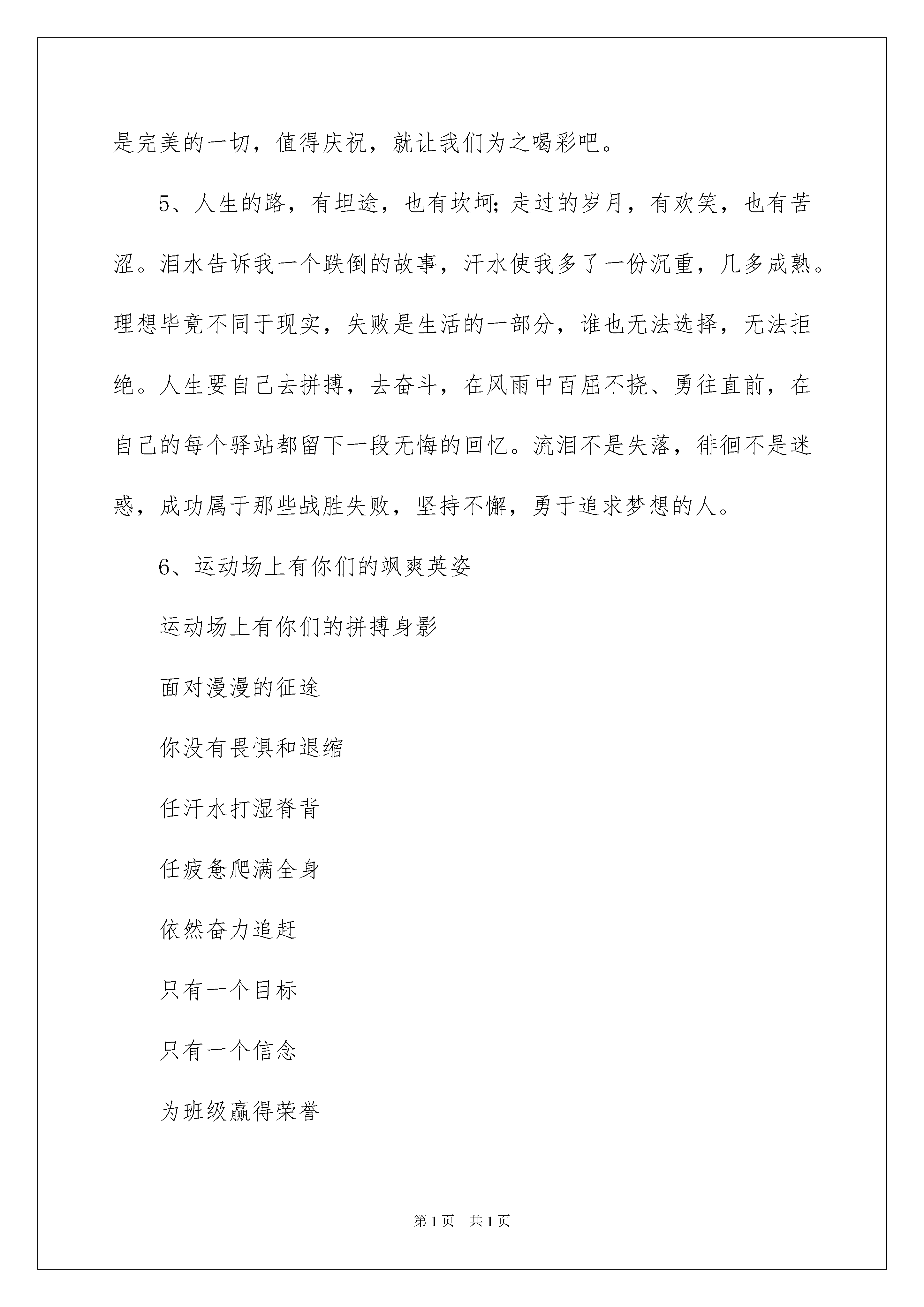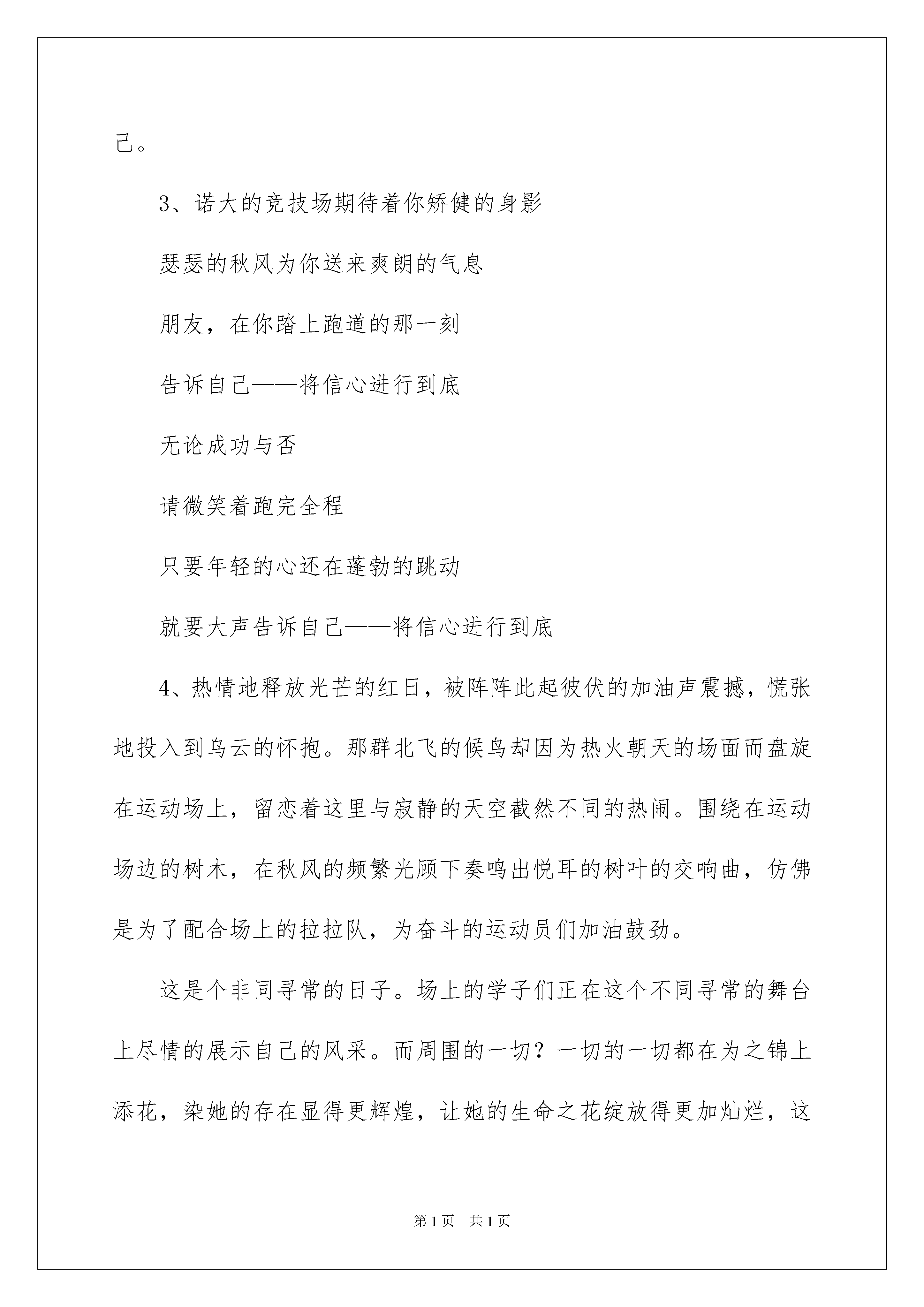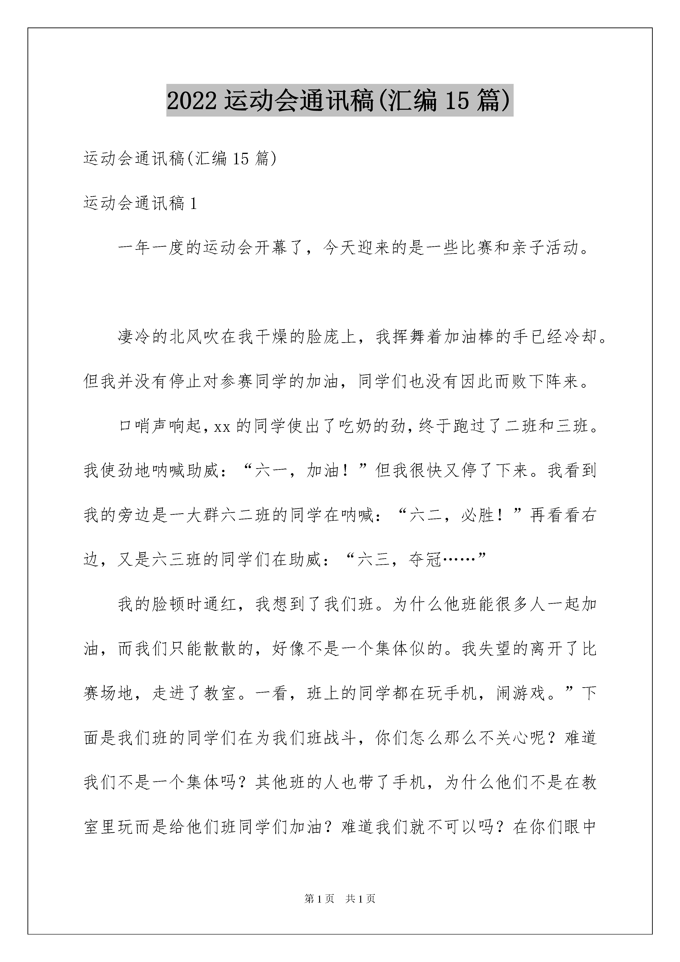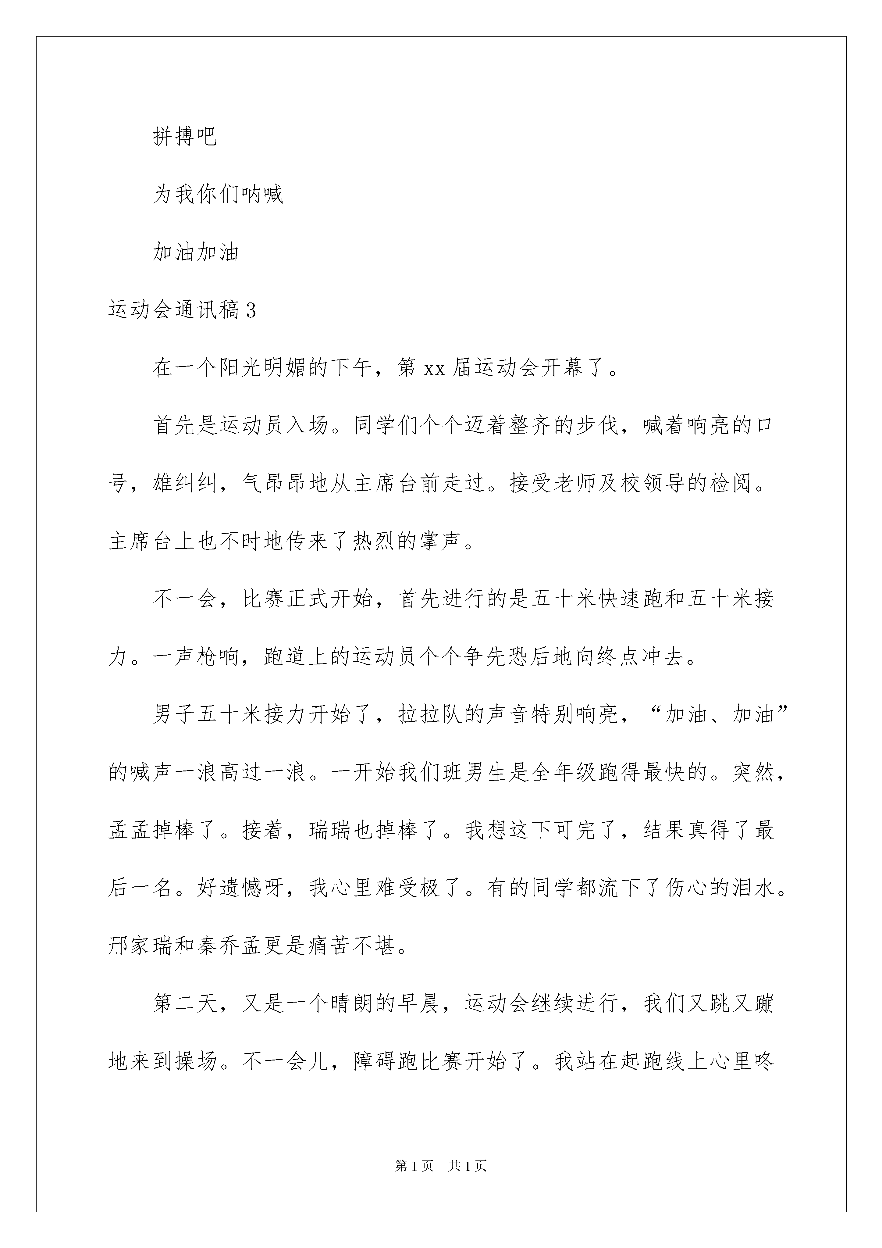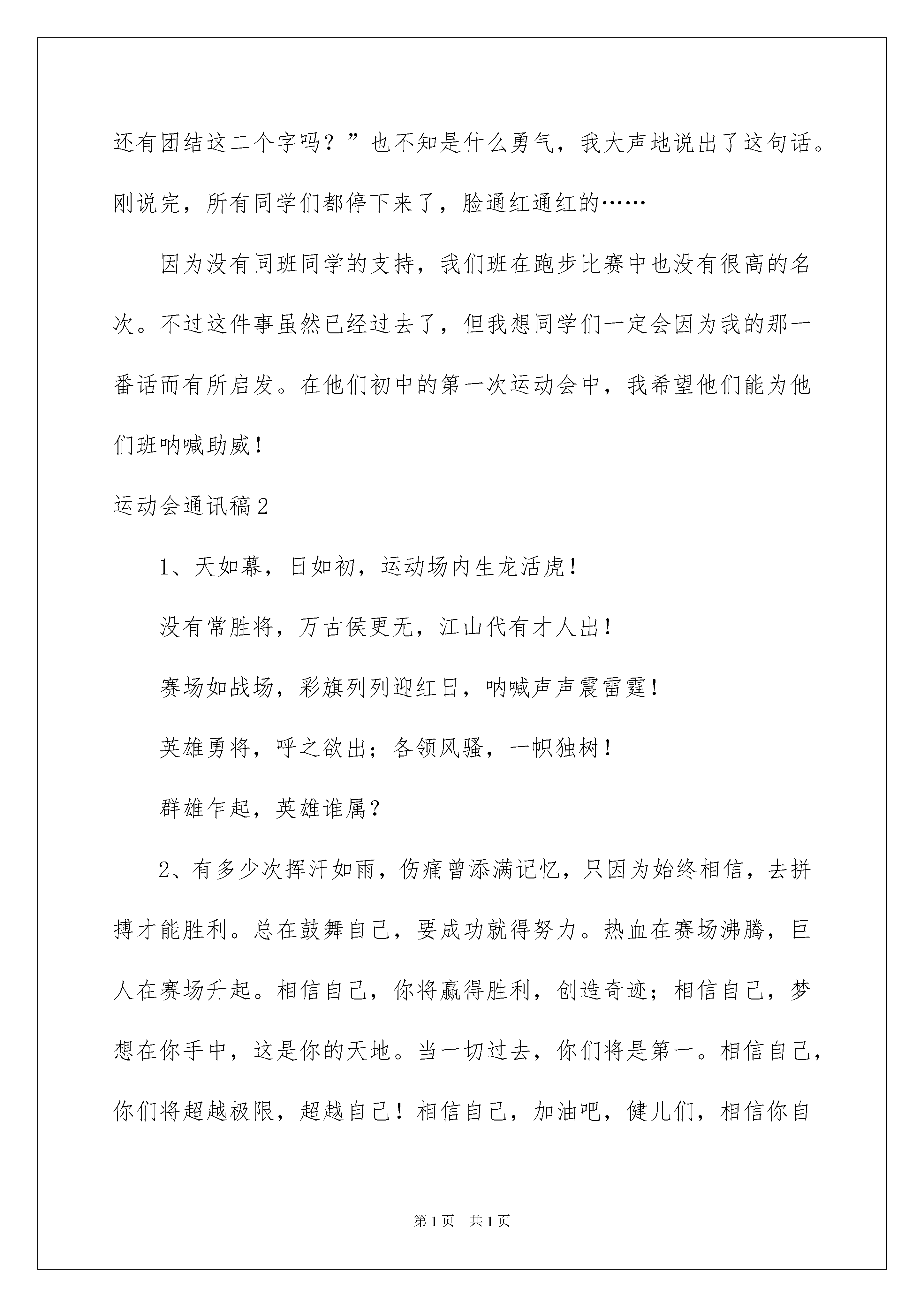 2022运动会通讯稿(汇编15篇)运动会通讯稿(汇编15篇)运动会通讯稿1一年一度的运动会开幕了,今天迎来的是一些比赛和亲子活动。凄冷的北风吹在我干燥的脸庞上,我挥舞着加油棒的手已经冷却。但我并没有停止对参赛同学的加油,同学们也没有因此而败下阵来。口哨声响起,xx的同学使出了吃奶的劲,终于跑过了二班和三班。我使劲地呐喊助威:“六一,加油!”但我很快又停了下来。我看到我的旁边是一大群六二班的同学在呐喊:“六二,必胜!”再看看右边,又是六三班的同学们在助威:“六三,夺冠……”我的脸顿时通红,我想到了我们班。为什么他班能很多人一起加油,而我们只能散散的,好像不是一个集体似的。我失望的离开了比赛场地,走进了教室。一看,班上的同学都在玩手机,闹游戏。”下面是我们班的同学们在为我们班战斗,你们怎么那么不关心呢?难道我们不是一个集体吗?其他班的人也带了手机,为什么他们不是在教室里玩而是给他们班同学们加油?难道我们就不可以吗?在你们眼中还有团结这二个字吗?”也不知是什么勇气,我大声地说出了这句话。刚说完,所有同学们都停下来了,脸通红通红的……因为没有同班同学的支持,我们班在跑步比赛中也没有很高的名次。不过这件事虽然已经过去了,但我想同学们一定会因为我的那一番话而有所启发。在他们初中的第一次运动会中,我希望他们能为他们班呐喊助威!运动会通讯稿21、天如幕,日如初,运动场内生龙活虎!没有常胜将,万古侯更无,江山代有才人出!赛场如战场,彩旗列列迎红日,呐喊声声震雷霆!英雄勇将,呼之欲出;各领风骚,一帜独树!群雄乍起,英雄谁属?2、有多少次挥汗如雨,伤痛曾添满记忆,只因为始终相信,去拼搏才能胜利。总在鼓舞自己,要成功就得努力。热血在赛场沸腾,巨人在赛场升起。相信自己,你将赢得胜利,创造奇迹;相信自己,梦想在你手中,这是你的天地。当一切过去,你们将是第一。相信自己,你们将超越极限,超越自己!相信自己,加油吧,健儿们,相信你自己。3、诺大的竞技场期待着你矫健的身影瑟瑟的秋风为你送来爽朗的气息朋友,在你踏上跑道的那一刻告诉自己——将信心进行到底无论成功与否请微笑着跑完全程只要年轻的心还在蓬勃的跳动就要大声告诉自己——将信心进行到底4、热情地释放光芒的红日,被阵阵此起彼伏的加油声震撼,慌张地投入到乌云的怀抱。那群北飞的候鸟却因为热火朝天的场面而盘旋在运动场上,留恋着这里与寂静的天空截然不同的热闹。围绕在运动场边的树木,在秋风的频繁光顾下奏鸣出悦耳的树叶的交响曲,仿佛是为了配合场上的拉拉队,为奋斗的运动员们加油鼓劲。这是个非同寻常的日子。场上的学子们正在这个不同寻常的舞台上尽情的展示自己的风采。而周围的一切?一切的一切都在为之锦上添花,染她的存在显得更辉煌,让她的生命之花绽放得更加灿烂,这是完美的一切,值得庆祝,就让我们为之喝彩吧。5、人生的路,有坦途,也有坎坷;走过的岁月,有欢笑,也有苦涩。泪水告诉我一个跌倒的故事,汗水使我多了一份沉重,几多成熟。理想毕竟不同于现实,失败是生活的一部分,谁也无法选择,无法拒绝。人生要自己去拼搏,去奋斗,在风雨中百屈不挠、勇往直前,在自己的每个驿站都留下一段无悔的回忆。流泪不是失落,徘徊不是迷惑,成功属于那些战胜失败,坚持不懈,勇于追求梦想的人。6、运动场上有你们的飒爽英姿运动场上有你们的拼搏身影面对漫漫的征途你没有畏惧和退缩任汗水打湿脊背任疲惫爬满全身依然奋力追赶只有一个目标只有一个信念为班级赢得荣誉拼搏吧为我你们呐喊加油加油运动会通讯稿3在一个阳光明媚的下午,第xx届运动会开幕了。首先是运动员入场。同学们个个迈着整齐的步伐,喊着响亮的口号,雄纠纠,气昂昂地从主席台前走过。接受老师及校领导的检阅。主席台上也不时地传来了热烈的掌声。不一会,比赛正式开始,首先进行的是五十米快速跑和五十米接力。一声枪响,跑道上的运动员个个争先恐后地向终点冲去。男子五十米接力开始了,拉拉队的声音特别响亮,“加油、加油”的喊声一浪高过一浪。一开始我们班男生是全年级跑得最快的。突然,孟孟掉棒了。接着,瑞瑞也掉棒了。我想这下可完了,结果真得了最后一名。好遗憾呀,我心里难受极了。有的同学都流下了伤心的泪水。邢家瑞和秦乔孟更是痛苦不堪。第二天,又是一个晴朗的早晨,运动会继续进行,我们又跳又蹦地来到操场。不一会儿,障碍跑比赛开始了。我站在起跑线上心里咚咚直跳。第一次参加比赛,挺紧张的。只听见发令枪“砰”的一响,我赶快在垫子上翻一个跟头,钻过跨栏又跨过垫子,红线就在眼前,我咬紧牙关,憋足气,奋力向终点冲去。我想我肯定会得第一名,结果得了最后一名。真是遗憾。看来我和其他同学差距太大了,以后要多多锻炼。运动会在
