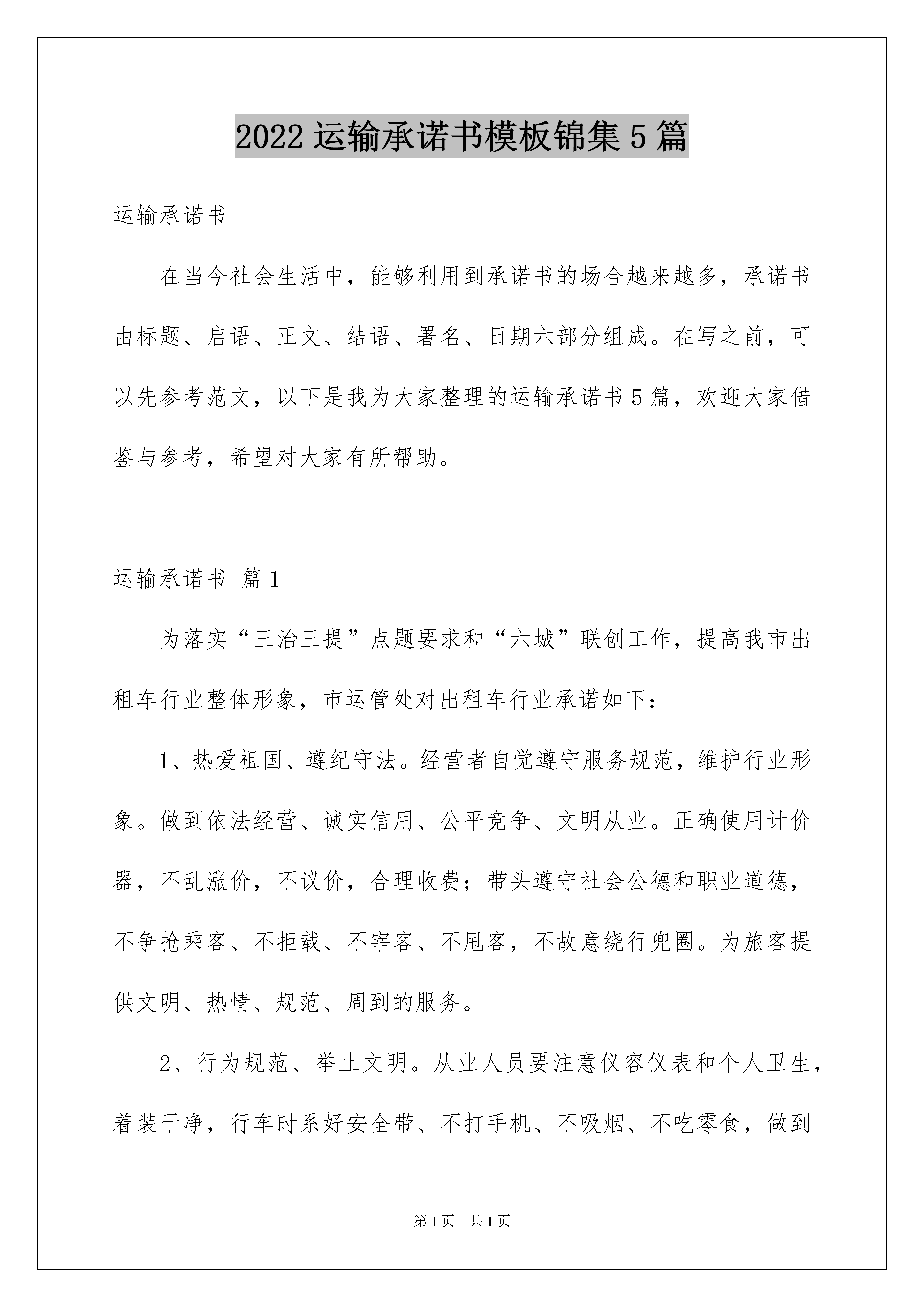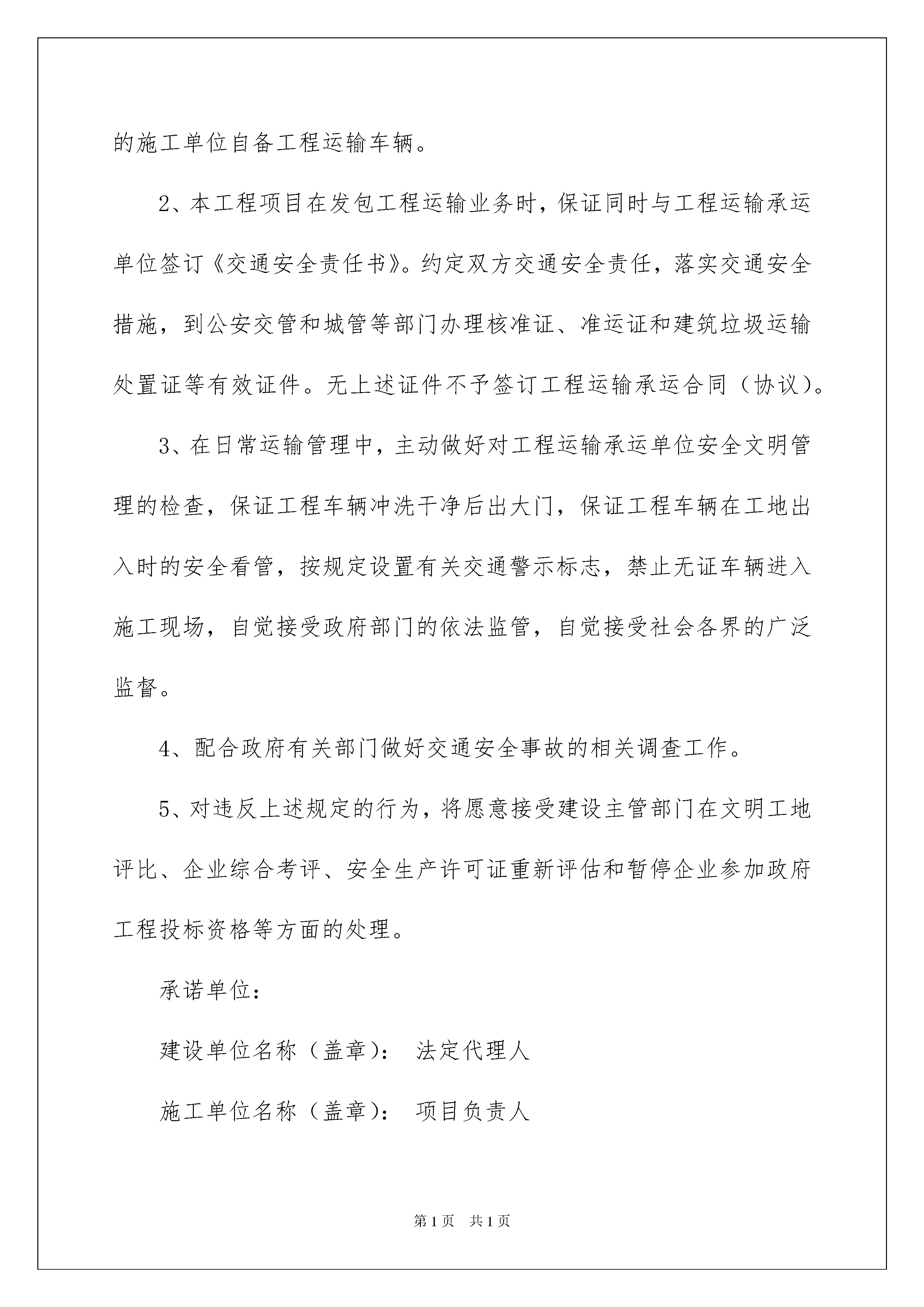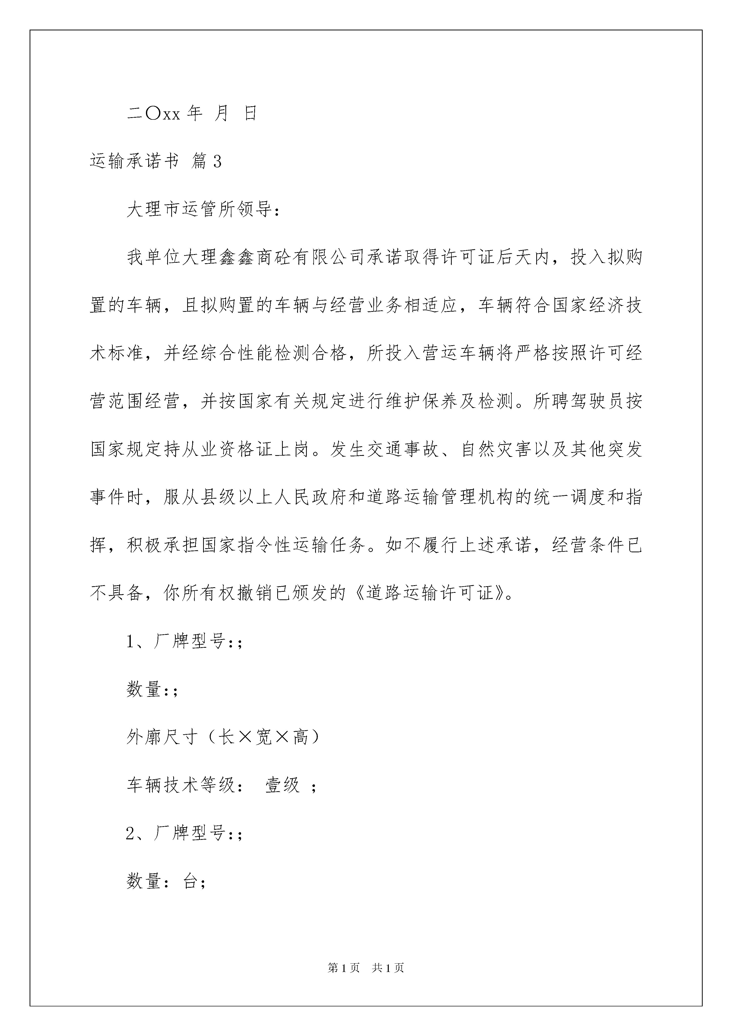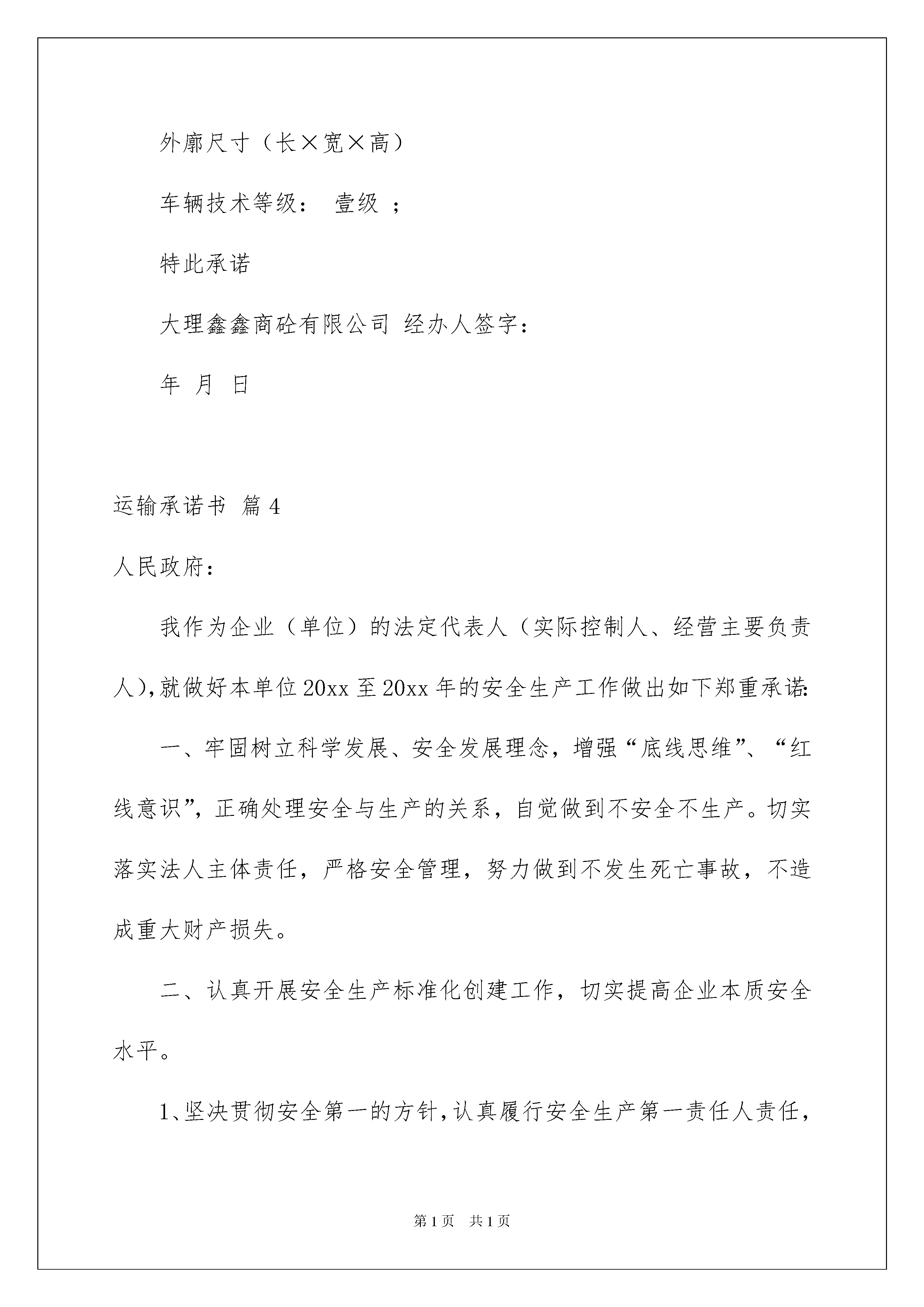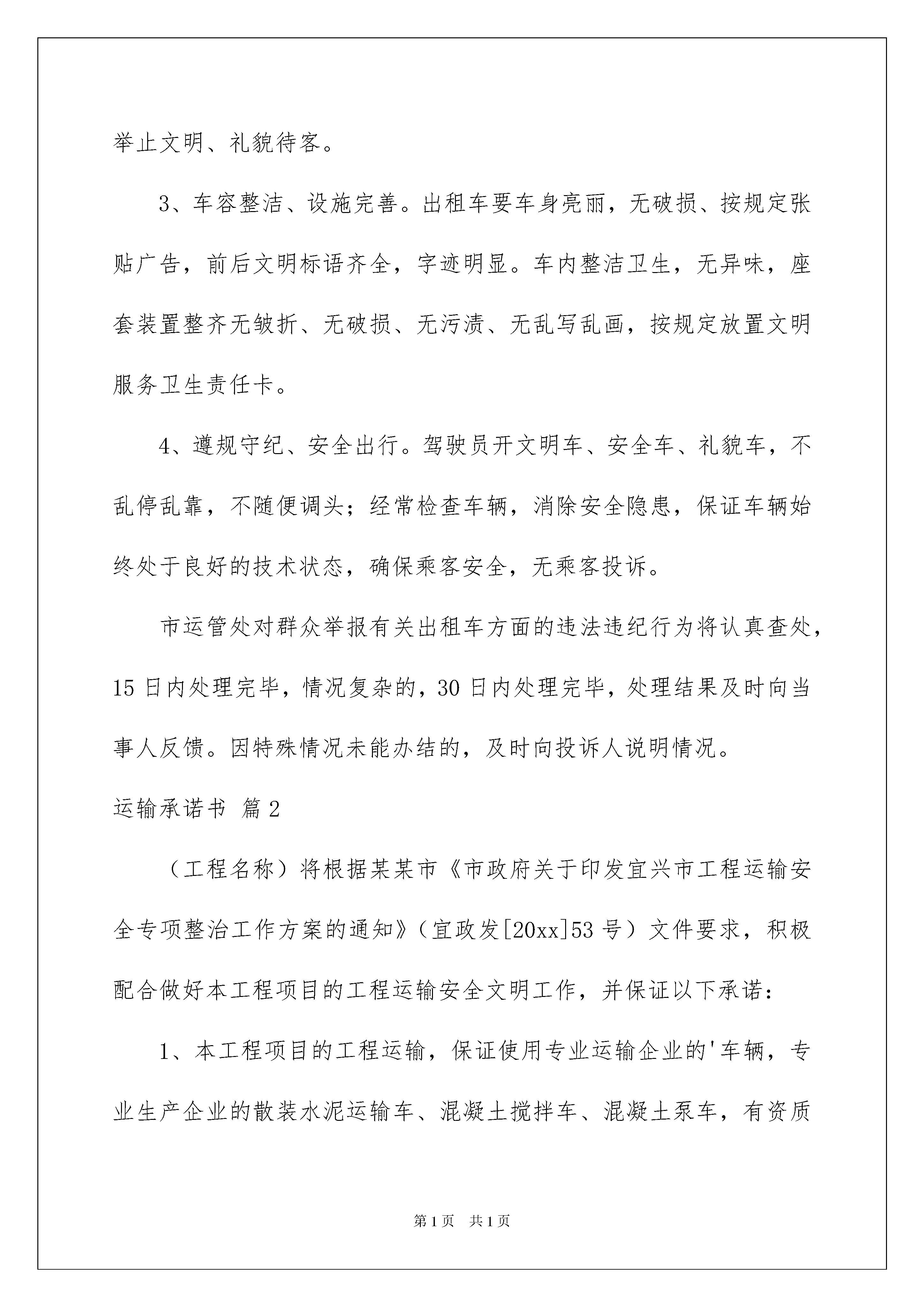 2022运输承诺书模板锦集5篇运输承诺书在当今社会生活中,能够利用到承诺书的场合越来越多,承诺书由标题、启语、正文、结语、署名、日期六部分组成。在写之前,可以先参考范文,以下是我为大家整理的运输承诺书5篇,欢迎大家借鉴与参考,希望对大家有所帮助。运输承诺书篇1为落实“三治三提”点题要求和“六城”联创工作,提高我市出租车行业整体形象,市运管处对出租车行业承诺如下:1、热爱祖国、遵纪守法。经营者自觉遵守服务规范,维护行业形象。做到依法经营、诚实信用、公平竞争、文明从业。正确使用计价器,不乱涨价,不议价,合理收费;带头遵守社会公德和职业道德,不争抢乘客、不拒载、不宰客、不甩客,不故意绕行兜圈。为旅客提供文明、热情、规范、周到的服务。2、行为规范、举止文明。从业人员要注意仪容仪表和个人卫生,着装干净,行车时系好安全带、不打手机、不吸烟、不吃零食,做到举止文明、礼貌待客。3、车容整洁、设施完善。出租车要车身亮丽,无破损、按规定张贴广告,前后文明标语齐全,字迹明显。车内整洁卫生,无异味,座套装置整齐无皱折、无破损、无污渍、无乱写乱画,按规定放置文明服务卫生责任卡。4、遵规守纪、安全出行。驾驶员开文明车、安全车、礼貌车,不乱停乱靠,不随便调头;经常检查车辆,消除安全隐患,保证车辆始终处于良好的技术状态,确保乘客安全,无乘客投诉。市运管处对群众举报有关出租车方面的违法违纪行为将认真查处,15日内处理完毕,情况复杂的,30日内处理完毕,处理结果及时向当事人反馈。因特殊情况未能办结的,及时向投诉人说明情况。运输承诺书篇2(工程名称)将根据某某市《市政府关于印发宜兴市工程运输安全专项整治工作方案的通知》(宜政发[20xx]53号)文件要求,积极配合做好本工程项目的工程运输安全文明工作,并保证以下承诺:1、本工程项目的工程运输,保证使用专业运输企业的'车辆,专业生产企业的散装水泥运输车、混凝土搅拌车、混凝土泵车,有资质的施工单位自备工程运输车辆。2、本工程项目在发包工程运输业务时,保证同时与工程运输承运单位签订《交通安全责任书》。约定双方交通安全责任,落实交通安全措施,到公安交管和城管等部门办理核准证、准运证和建筑垃圾运输处置证等有效证件。无上述证件不予签订工程运输承运合同(协议)。3、在日常运输管理中,主动做好对工程运输承运单位安全文明管理的检查,保证工程车辆冲洗干净后出大门,保证工程车辆在工地出入时的安全看管,按规定设置有关交通警示标志,禁止无证车辆进入施工现场,自觉接受政府部门的依法监管,自觉接受社会各界的广泛监督。4、配合政府有关部门做好交通安全事故的相关调查工作。5、对违反上述规定的行为,将愿意接受建设主管部门在文明工地评比、企业综合考评、安全生产许可证重新评估和暂停企业参加政府工程投标资格等方面的处理。承诺单位:建设单位名称(盖章):法定代理人施工单位名称(盖章):项目负责人二〇xx年月日运输承诺书篇3大理市运管所领导:我单位大理鑫鑫商砼有限公司承诺取得许可证后天内,投入拟购置的车辆,且拟购置的车辆与经营业务相适应,车辆符合国家经济技术标准,并经综合性能检测合格,所投入营运车辆将严格按照许可经营范围经营,并按国家有关规定进行维护保养及检测。所聘驾驶员按国家规定持从业资格证上岗。发生交通事故、自然灾害以及其他突发事件时,服从县级以上人民政府和道路运输管理机构的统一调度和指挥,积极承担国家指令性运输任务。如不履行上述承诺,经营条件已不具备,你所有权撤销已颁发的《道路运输许可证》。1、厂牌型号:;数量:;外廓尺寸(长×宽×高)车辆技术等级:壹级;2、厂牌型号:;数量:台;外廓尺寸(长×宽×高)车辆技术等级:壹级;特此承诺大理鑫鑫商砼有限公司经办人签字:年月日运输承诺书篇4人民政府:我作为企业(单位)的法定代表人(实际控制人、经营主要负责人),就做好本单位20xx至20xx年的安全生产工作做出如下郑重承诺:一、牢固树立科学发展、安全发展理念,增强“底线思维”、“红线意识”,正确处理安全与生产的关系,自觉做到不安全不生产。切实落实法人主体责任,严格安全管理,努力做到不发生死亡事故,不造成重大财产损失。二、认真开展安全生产标准化创建工作,切实提高企业本质安全水平。1、坚决贯彻安全第一的方针,认真履行安全生产第一责任人责任,按规定设立安全生产管理机构,配备名专职管理人员;每月至少主持召开一次安全生产专题会议,及时研究和解决本企业安全生产重要问题。2、严格遵守安全生产法律法规,深化“三项制度”,不违法组织生产,不违章指挥,不强令工人违章冒险作业。3、强化重大危险源监管,按规定设置必要的防护设施,落实