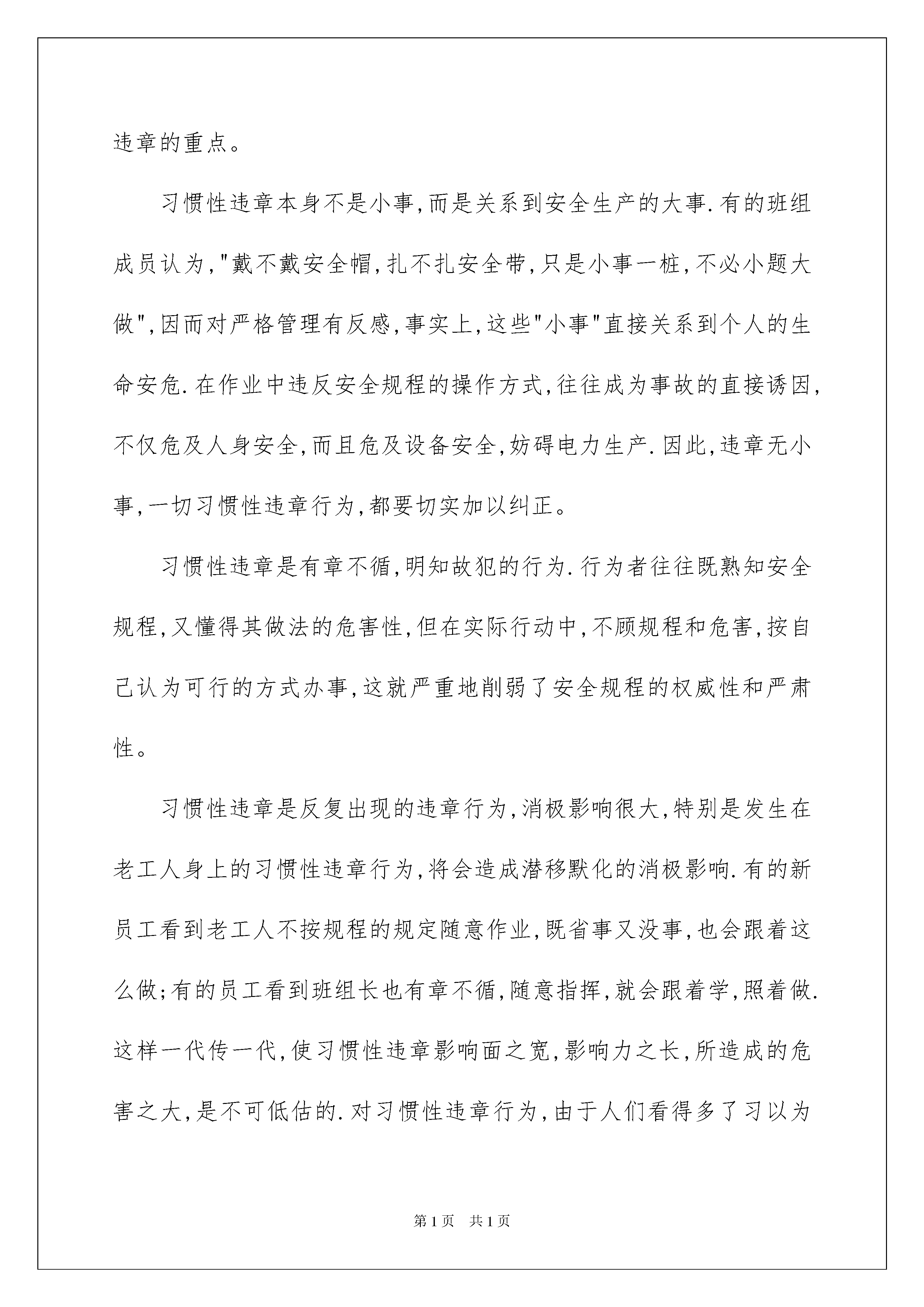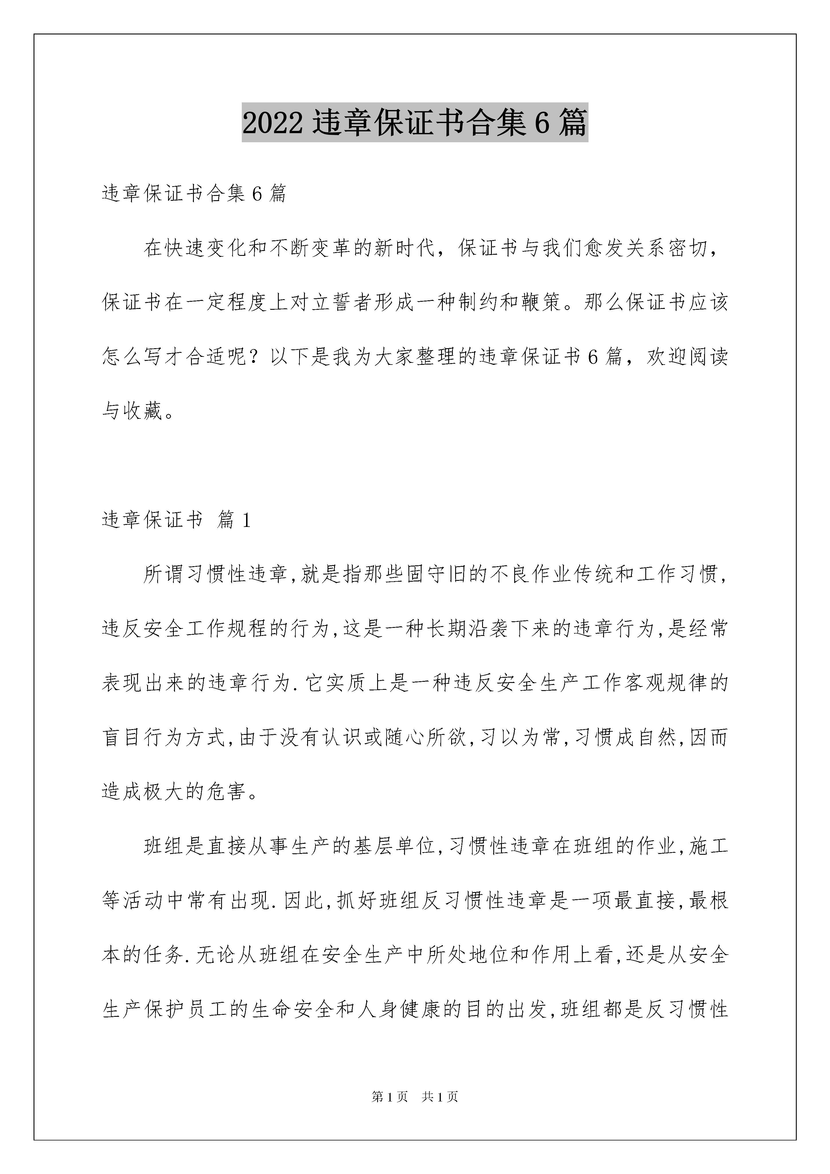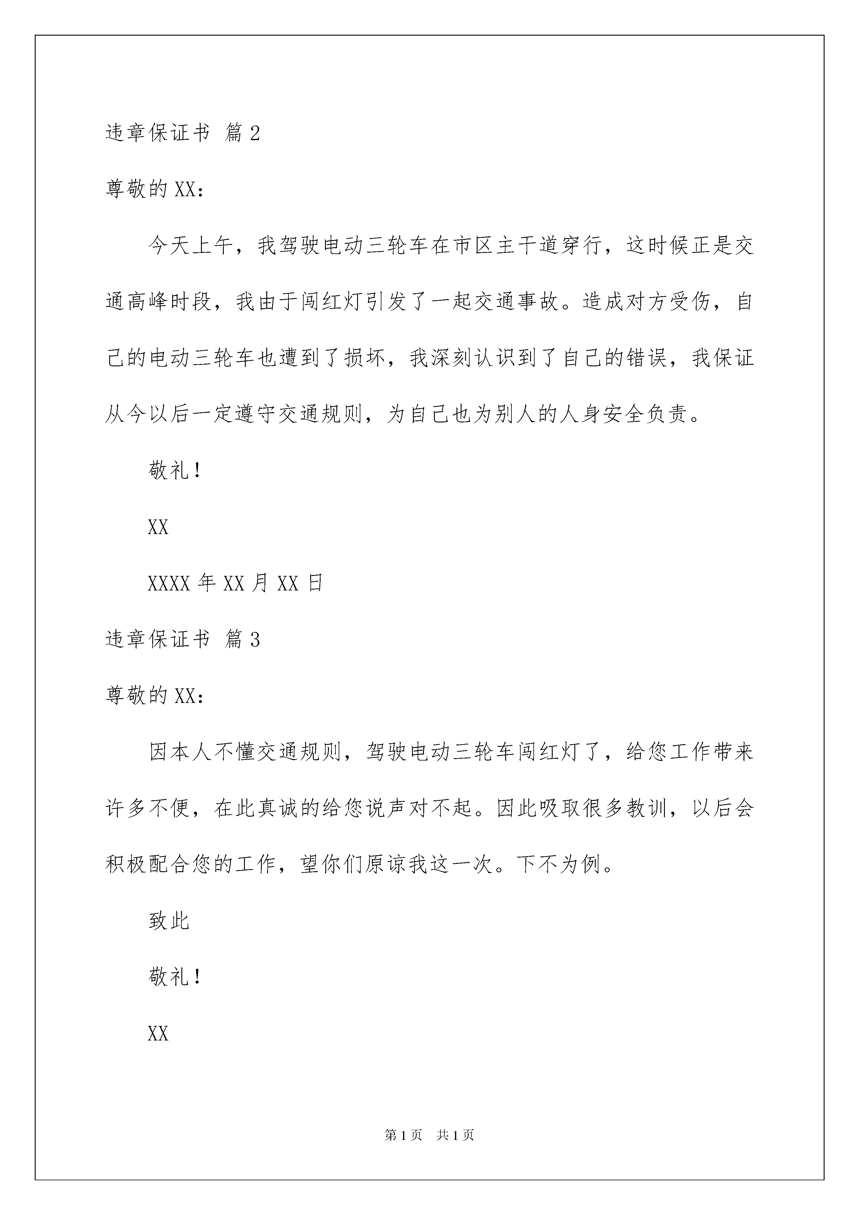 2022违章保证书合集6篇违章保证书合集6篇在快速变化和不断变革的新时代,保证书与我们愈发关系密切,保证书在一定程度上对立誓者形成一种制约和鞭策。那么保证书应该怎么写才合适呢?以下是我为大家整理的违章保证书6篇,欢迎阅读与收藏。违章保证书篇1所谓习惯性违章,就是指那些固守旧的不良作业传统和工作习惯,违反安全工作规程的行为,这是一种长期沿袭下来的违章行为,是经常表现出来的违章行为.它实质上是一种违反安全生产工作客观规律的盲目行为方式,由于没有认识或随心所欲,习以为常,习惯成自然,因而造成极大的危害。班组是直接从事生产的基层单位,习惯性违章在班组的作业,施工等活动中常有出现.因此,抓好班组反习惯性违章是一项最直接,最根本的任务.无论从班组在安全生产中所处地位和作用上看,还是从安全生产保护员工的生命安全和人身健康的目的出发,班组都是反习惯性违章的重点。习惯性违章本身不是小事,而是关系到安全生产的大事.有的班组成员认为,"戴不戴安全帽,扎不扎安全带,只是小事一桩,不必小题大做",因而对严格管理有反感,事实上,这些"小事"直接关系到个人的生命安危.在作业中违反安全规程的操作方式,往往成为事故的直接诱因,不仅危及人身安全,而且危及设备安全,妨碍电力生产.因此,违章无小事,一切习惯性违章行为,都要切实加以纠正。习惯性违章是有章不循,明知故犯的行为.行为者往往既熟知安全规程,又懂得其做法的危害性,但在实际行动中,不顾规程和危害,按自己认为可行的方式办事,这就严重地削弱了安全规程的权威性和严肃性。习惯性违章是反复出现的违章行为,消极影响很大,特别是发生在老工人身上的习惯性违章行为,将会造成潜移默化的消极影响.有的新员工看到老工人不按规程的规定随意作业,既省事又没事,也会跟着这么做;有的员工看到班组长也有章不循,随意指挥,就会跟着学,照着做.这样一代传一代,使习惯性违章影响面之宽,影响力之长,所造成的危害之大,是不可低估的.对习惯性违章行为,由于人们看得多了习以为常了,根本没把它当回事,久而久之,习惯了那些不正确的行为。纠正,制止习惯性违章应采取四项措施:1,深化安全教育,树立全程安全意识.开展全员安全教育,把安全教育摆到工作首位,贯彻工作始终,树立起每一个工作人员的全程安全意识,做到安全规程人人会,处处讲,时时想,事事用.2,强化技术培训,提高人员素质.强化岗位技术培训,开展安全规程技术竞赛活动,提高全员素质,达到人人熟知,熟练安全操作.3,设立"违章警示牌",杜绝作业现场的习惯性违章.在习惯性违章发生频率较高的场所,设立黄色"习惯性违章警示牌",将习惯性违章操作和正确操作在警示牌上写清楚,提醒作业人员规范操作.4,明确"安全责任人",签订无违章作业保证书,建立"安全责任人"制度,专(兼)职安全员,班组长明确为"安全责任人",作业前由"安全责任人"签订无违章作业保证书,同时设立无违章作业监督人,签订无违章监督责任书,与"安全责任人"连带处罚.违章保证书篇2尊敬的XX:今天上午,我驾驶电动三轮车在市区主干道穿行,这时候正是交通高峰时段,我由于闯红灯引发了一起交通事故。造成对方受伤,自己的电动三轮车也遭到了损坏,我深刻认识到了自己的错误,我保证从今以后一定遵守交通规则,为自己也为别人的人身安全负责。敬礼!XXXXXX年XX月XX日违章保证书篇3尊敬的XX:因本人不懂交通规则,驾驶电动三轮车闯红灯了,给您工作带来许多不便,在此真诚的给您说声对不起。因此吸取很多教训,以后会积极配合您的工作,望你们原谅我这一次。下不为例。致此敬礼!XXXXXX年XX月XX日违章保证书篇4车间主任:1、在半年之内再发生1次违章作业,车间只发给我基本工资持续2个月。2、在半年内再发生2次违章作业,请车间给末岗工资4个月,请车间主任及全体同事在今后的工作中给予监督!班长意见:班长签字:保证人:xxxxxxx年xx月xx日违章保证书篇5尊敬的XX:本人因驾驶电动三轮车在机动车道上行驶,被交警扣罚,本人已经认识到自己的错误,在此保证,今后一定遵守交通规则,如果再出现违章情况,愿意接受一切处罚。致此违章敬礼!XXXXXX年XX月XX日违章保证书篇6检讨书尊敬的交警同志:由于本人驾车(贵E75736)于20xx年3月26号下午在县交警队门口处违章停车卸货。之后来了两名巡警让我立刻开走,我给说让他们给我一分钟时间就好了。随后我就去关车门,于是他们就过来说不行,必须马上走。看他们态度如此恳切,于是我们发生了个小小的误会。当然,我知道此举违反了《中华人民共和国道路交通安全法第九十三条第二款》之规定。给正常行驶的车辆及行人造成不便,虽然