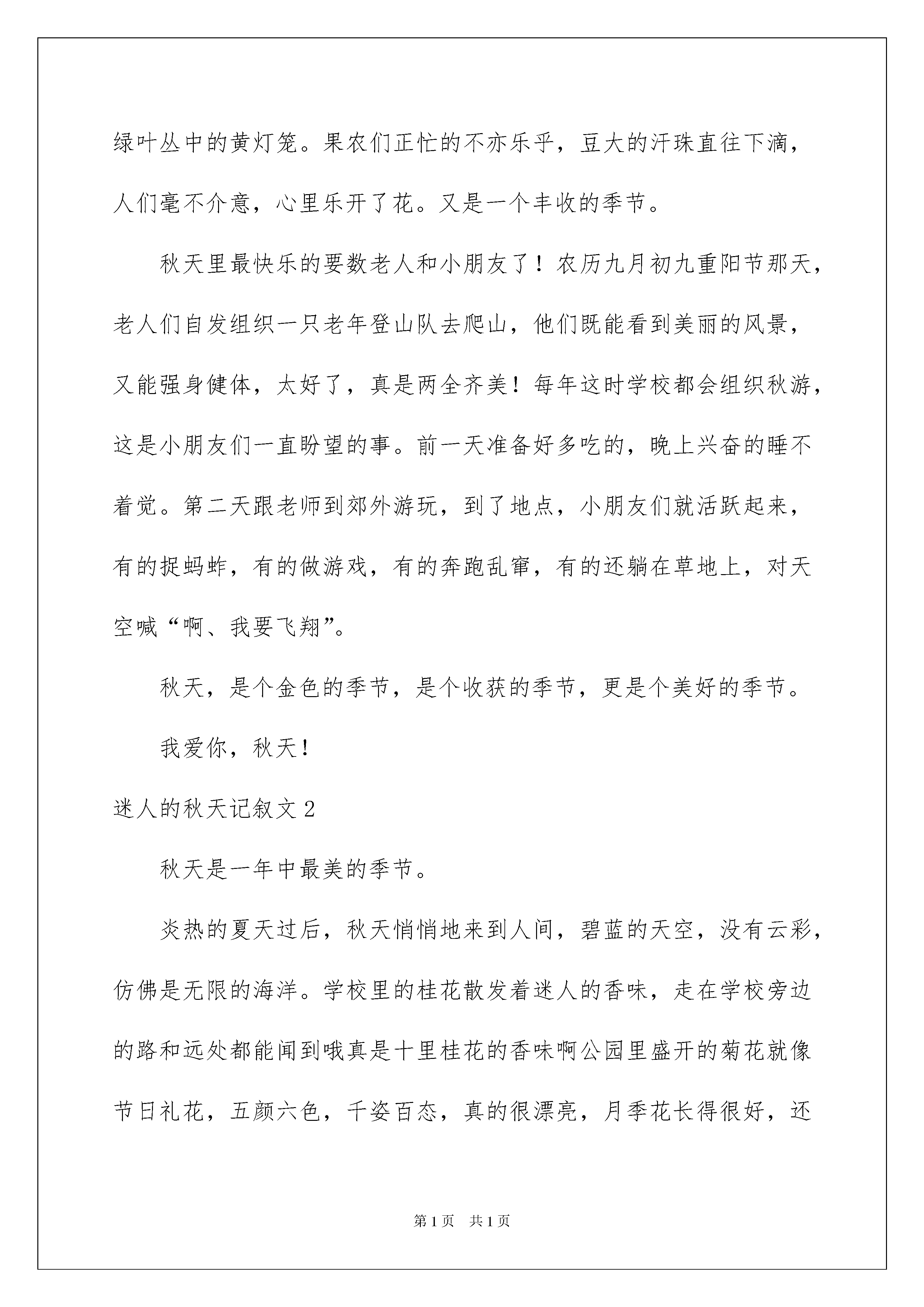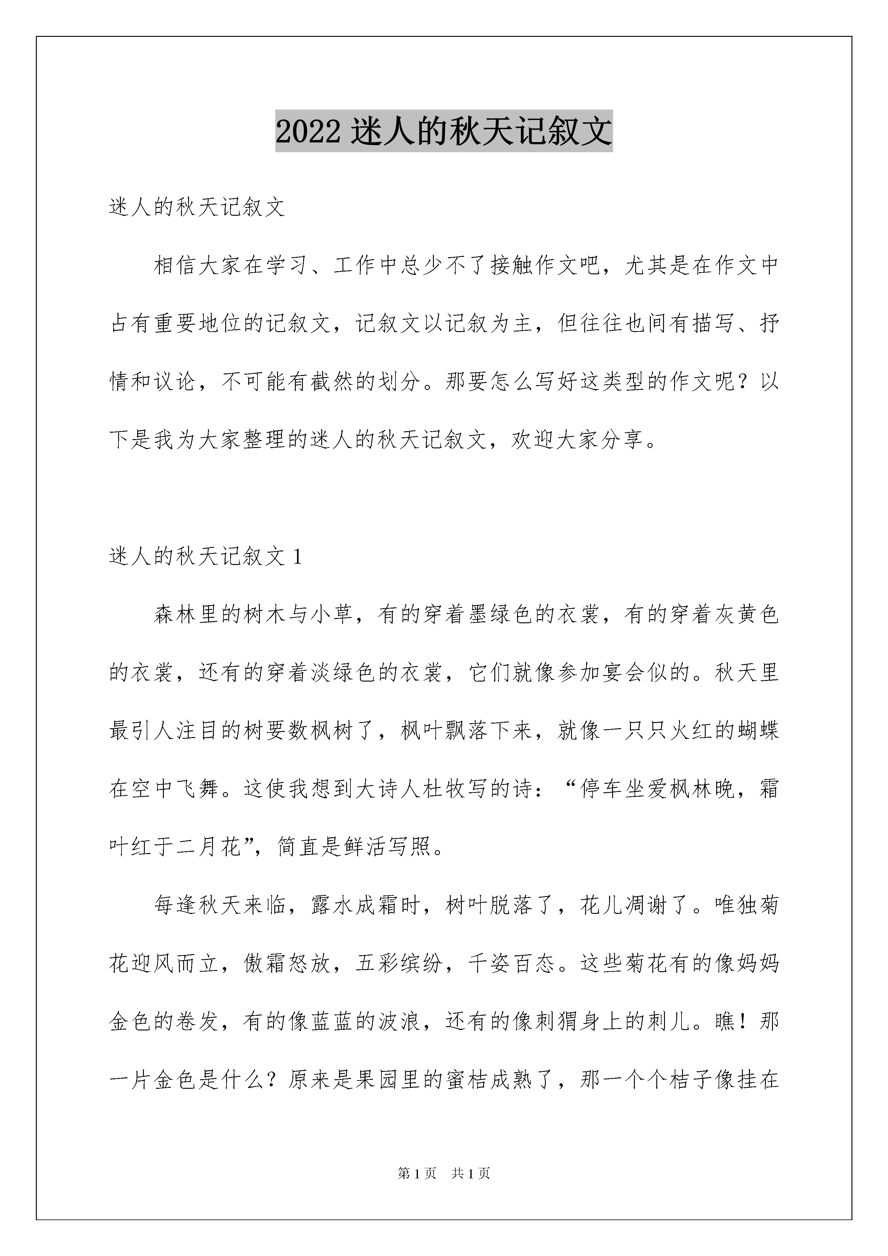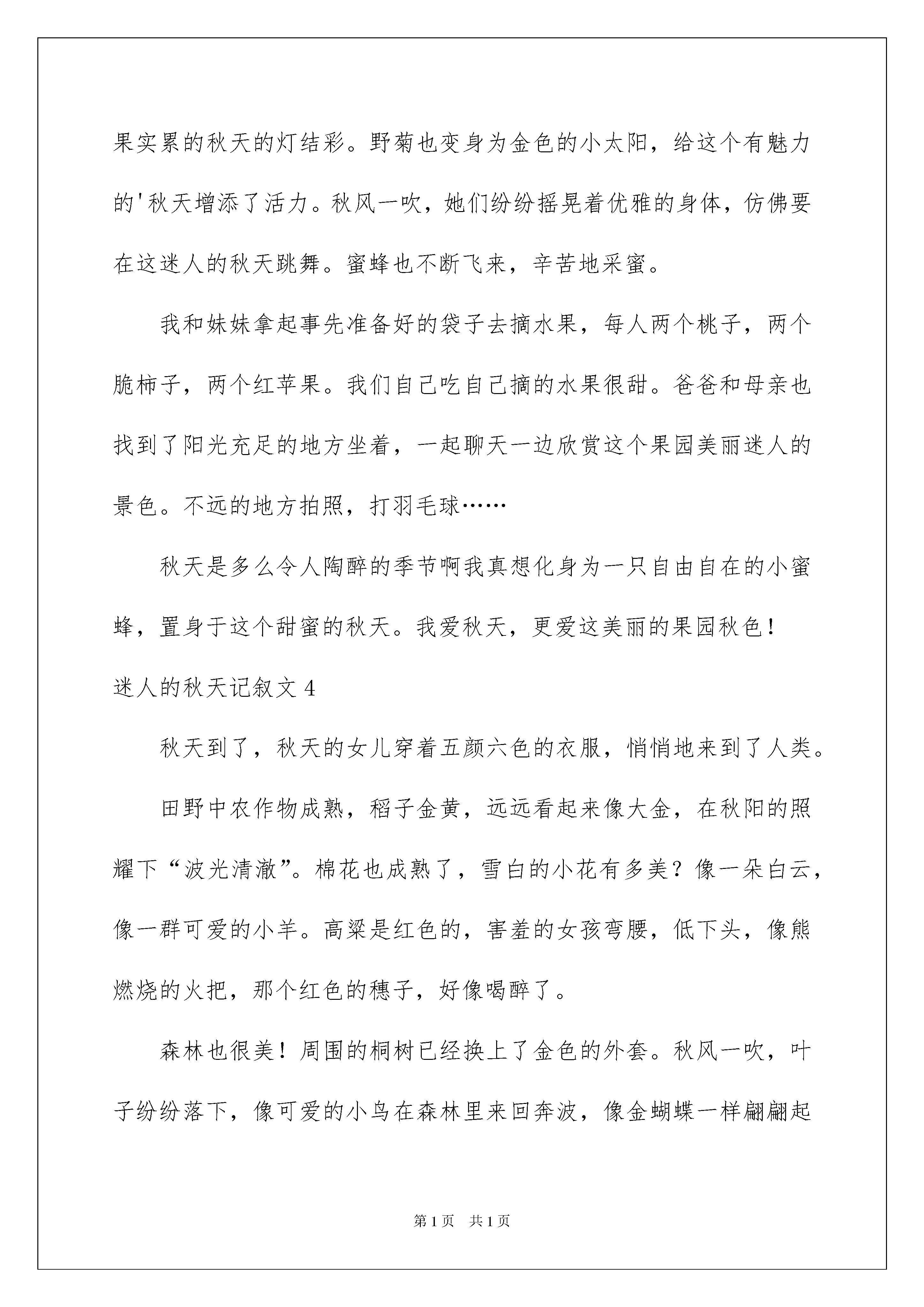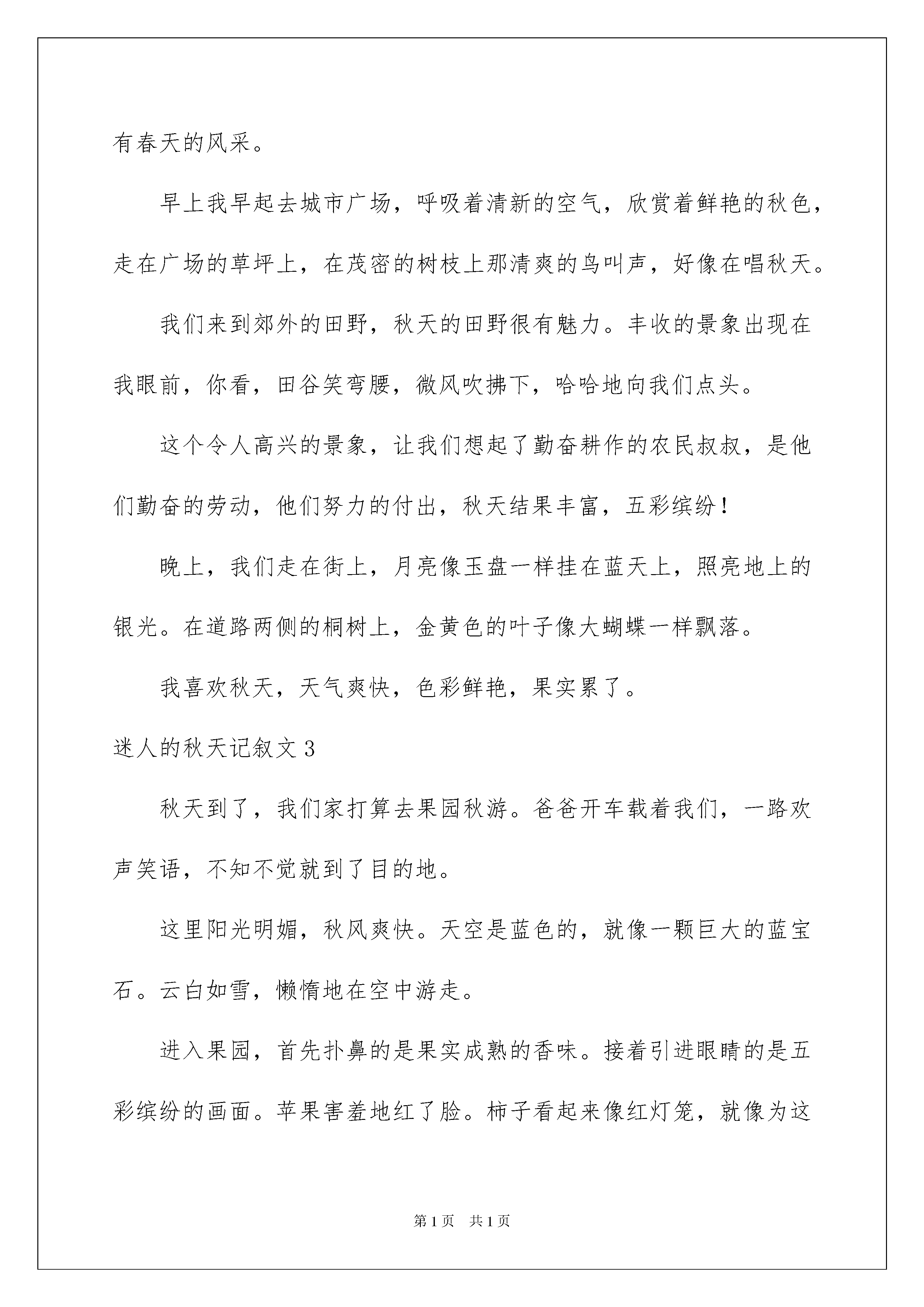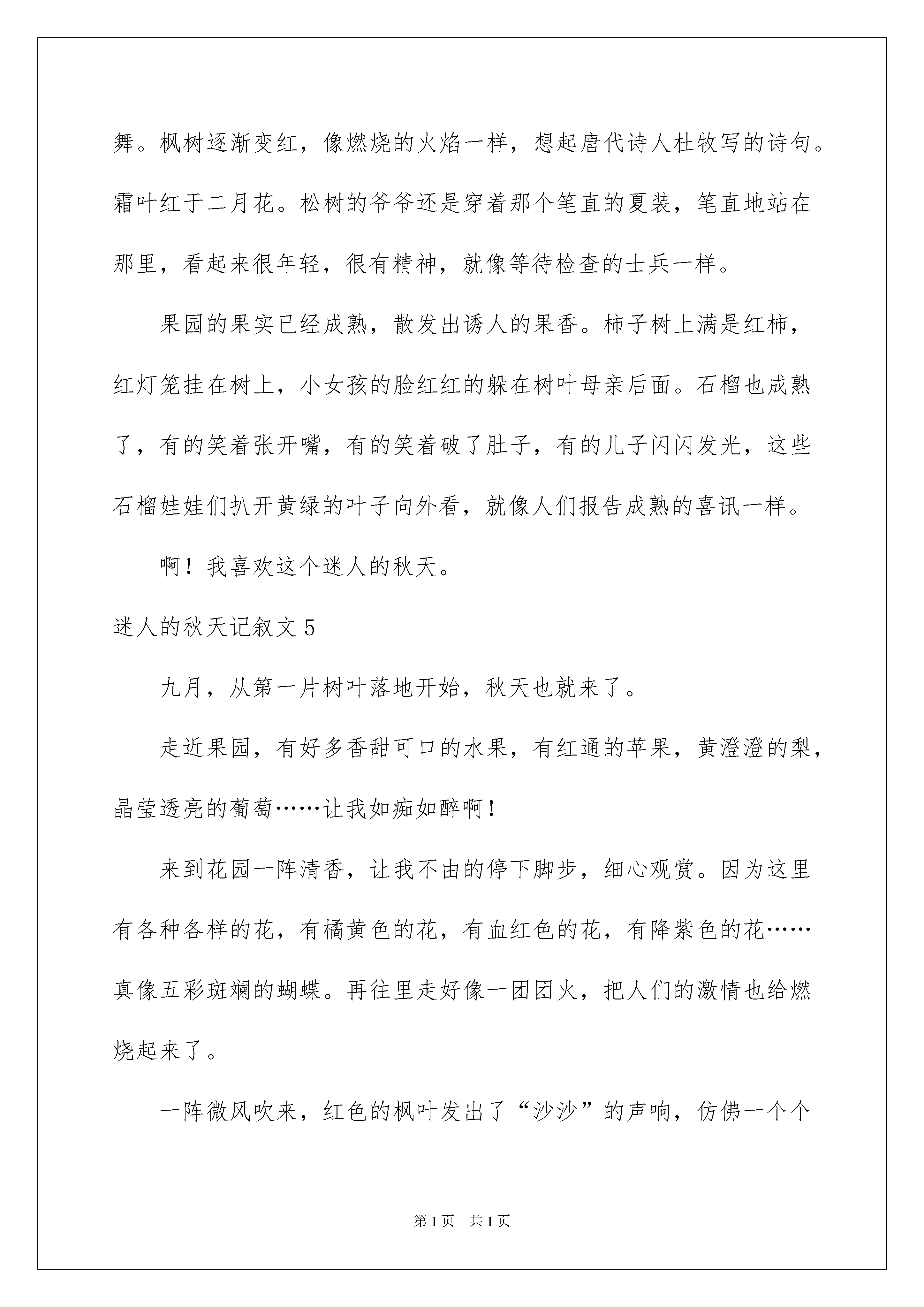 2022迷人的秋天记叙文迷人的秋天记叙文相信大家在学习、工作中总少不了接触作文吧,尤其是在作文中占有重要地位的记叙文,记叙文以记叙为主,但往往也间有描写、抒情和议论,不可能有截然的划分。那要怎么写好这类型的作文呢?以下是我为大家整理的迷人的秋天记叙文,欢迎大家分享。迷人的秋天记叙文1森林里的树木与小草,有的穿着墨绿色的衣裳,有的穿着灰黄色的衣裳,还有的穿着淡绿色的衣裳,它们就像参加宴会似的。秋天里最引人注目的树要数枫树了,枫叶飘落下来,就像一只只火红的蝴蝶在空中飞舞。这使我想到大诗人杜牧写的诗:“停车坐爱枫林晚,霜叶红于二月花”,简直是鲜活写照。每逢秋天来临,露水成霜时,树叶脱落了,花儿凋谢了。唯独菊花迎风而立,傲霜怒放,五彩缤纷,千姿百态。这些菊花有的像妈妈金色的卷发,有的像蓝蓝的波浪,还有的像刺猬身上的刺儿。瞧!那一片金色是什么?原来是果园里的蜜桔成熟了,那一个个桔子像挂在绿叶丛中的黄灯笼。果农们正忙的不亦乐乎,豆大的汗珠直往下滴,人们毫不介意,心里乐开了花。又是一个丰收的季节。秋天里最快乐的要数老人和小朋友了!农历九月初九重阳节那天,老人们自发组织一只老年登山队去爬山,他们既能看到美丽的风景,又能强身健体,太好了,真是两全齐美!每年这时学校都会组织秋游,这是小朋友们一直盼望的事。前一天准备好多吃的,晚上兴奋的睡不着觉。第二天跟老师到郊外游玩,到了地点,小朋友们就活跃起来,有的捉蚂蚱,有的做游戏,有的奔跑乱窜,有的还躺在草地上,对天空喊“啊、我要飞翔”。秋天,是个金色的季节,是个收获的季节,更是个美好的季节。我爱你,秋天!迷人的秋天记叙文2秋天是一年中最美的季节。炎热的夏天过后,秋天悄悄地来到人间,碧蓝的天空,没有云彩,仿佛是无限的海洋。学校里的桂花散发着迷人的香味,走在学校旁边的路和远处都能闻到哦真是十里桂花的香味啊公园里盛开的菊花就像节日礼花,五颜六色,千姿百态,真的很漂亮,月季花长得很好,还有春天的风采。早上我早起去城市广场,呼吸着清新的空气,欣赏着鲜艳的秋色,走在广场的草坪上,在茂密的树枝上那清爽的鸟叫声,好像在唱秋天。我们来到郊外的田野,秋天的田野很有魅力。丰收的景象出现在我眼前,你看,田谷笑弯腰,微风吹拂下,哈哈地向我们点头。这个令人高兴的景象,让我们想起了勤奋耕作的农民叔叔,是他们勤奋的劳动,他们努力的付出,秋天结果丰富,五彩缤纷!晚上,我们走在街上,月亮像玉盘一样挂在蓝天上,照亮地上的银光。在道路两侧的桐树上,金黄色的叶子像大蝴蝶一样飘落。我喜欢秋天,天气爽快,色彩鲜艳,果实累了。迷人的秋天记叙文3秋天到了,我们家打算去果园秋游。爸爸开车载着我们,一路欢声笑语,不知不觉就到了目的地。这里阳光明媚,秋风爽快。天空是蓝色的,就像一颗巨大的蓝宝石。云白如雪,懒惰地在空中游走。进入果园,首先扑鼻的是果实成熟的香味。接着引进眼睛的是五彩缤纷的画面。苹果害羞地红了脸。柿子看起来像红灯笼,就像为这果实累的秋天的灯结彩。野菊也变身为金色的小太阳,给这个有魅力的'秋天增添了活力。秋风一吹,她们纷纷摇晃着优雅的身体,仿佛要在这迷人的秋天跳舞。蜜蜂也不断飞来,辛苦地采蜜。我和妹妹拿起事先准备好的袋子去摘水果,每人两个桃子,两个脆柿子,两个红苹果。我们自己吃自己摘的水果很甜。爸爸和母亲也找到了阳光充足的地方坐着,一起聊天一边欣赏这个果园美丽迷人的景色。不远的地方拍照,打羽毛球……秋天是多么令人陶醉的季节啊我真想化身为一只自由自在的小蜜蜂,置身于这个甜蜜的秋天。我爱秋天,更爱这美丽的果园秋色!迷人的秋天记叙文4秋天到了,秋天的女儿穿着五颜六色的衣服,悄悄地来到了人类。田野中农作物成熟,稻子金黄,远远看起来像大金,在秋阳的照耀下“波光清澈”。棉花也成熟了,雪白的小花有多美?像一朵白云,像一群可爱的小羊。高粱是红色的,害羞的女孩弯腰,低下头,像熊燃烧的火把,那个红色的穗子,好像喝醉了。森林也很美!周围的桐树已经换上了金色的外套。秋风一吹,叶子纷纷落下,像可爱的小鸟在森林里来回奔波,像金蝴蝶一样翩翩起舞。枫树逐渐变红,像燃烧的火焰一样,想起唐代诗人杜牧写的诗句。霜叶红于二月花。松树的爷爷还是穿着那个笔直的夏装,笔直地站在那里,看起来很年轻,很有精神,就像等待检查的士兵一样。果园的果实已经成熟,散发出诱人的果香。柿子树上满是红柿,红灯笼挂在树上,小女孩的脸红红的躲在树叶母亲后面。石榴也成熟了,有的笑着张开嘴,有的笑着破了肚子,有的儿子闪闪发光,这些石榴娃娃们扒开黄绿的叶子向外看,就像人们报告成熟的喜讯一样。啊!我喜欢这个迷人的秋天。迷人的秋天记叙文5九月,从第一片树叶落地开始,秋天也就