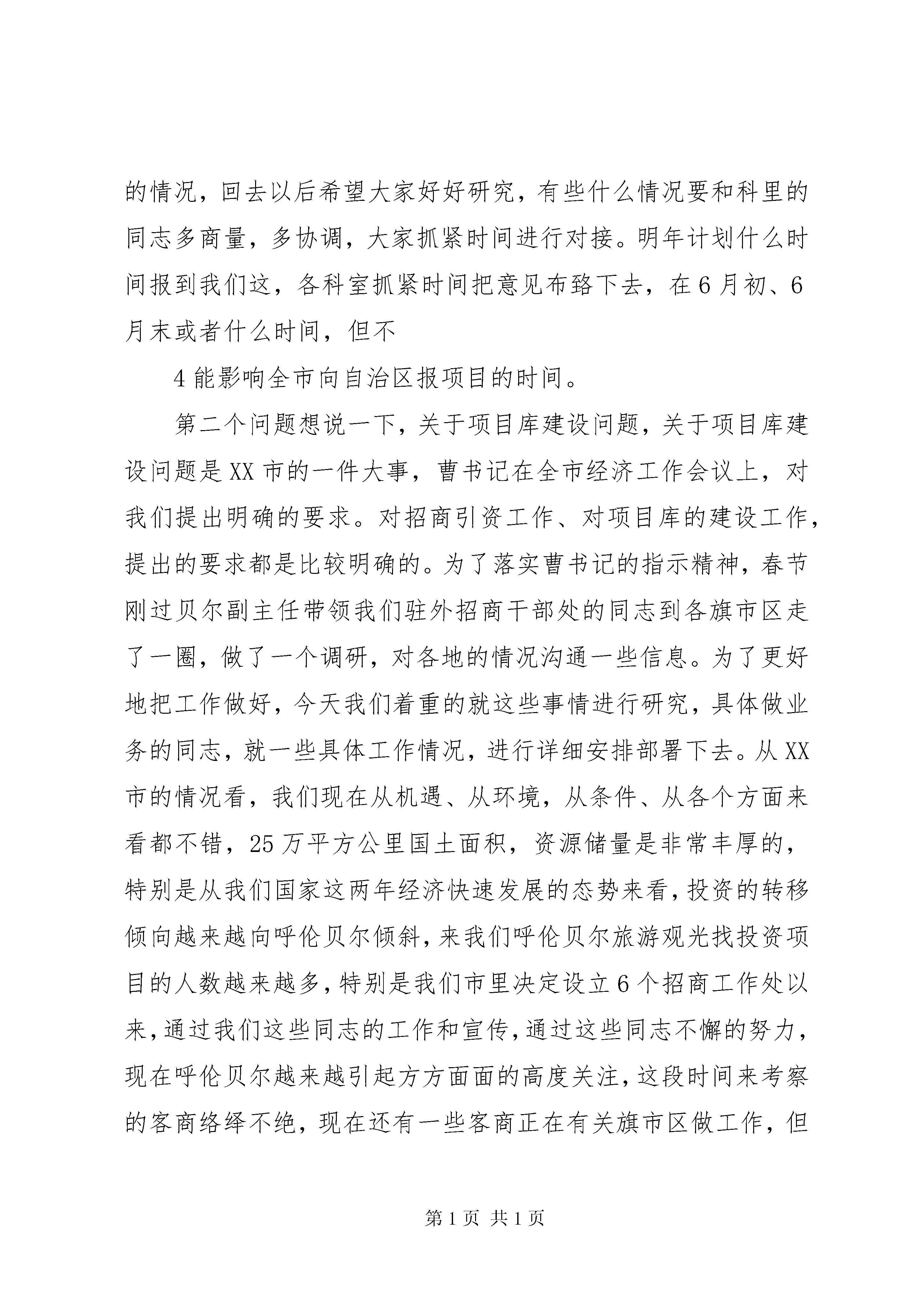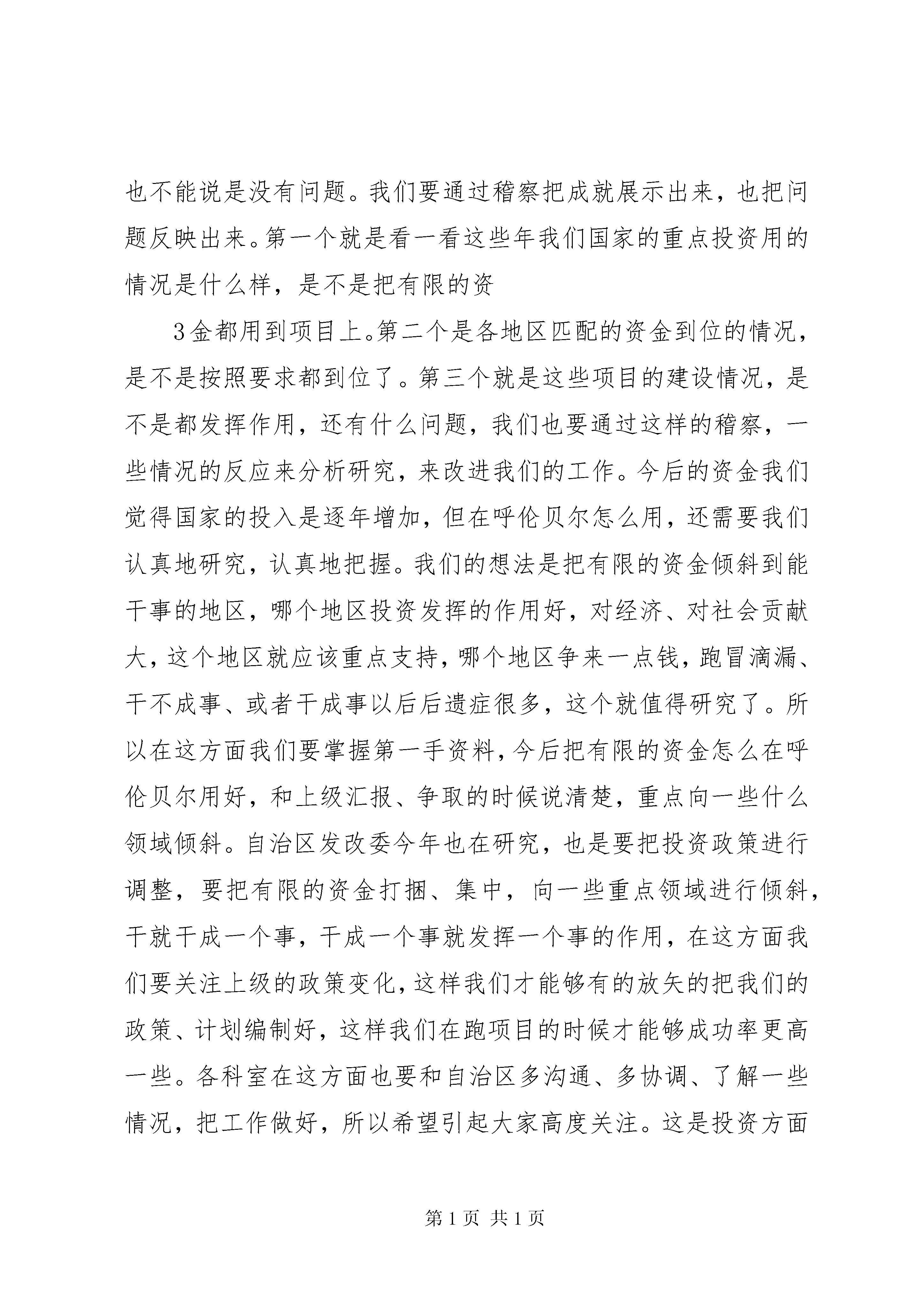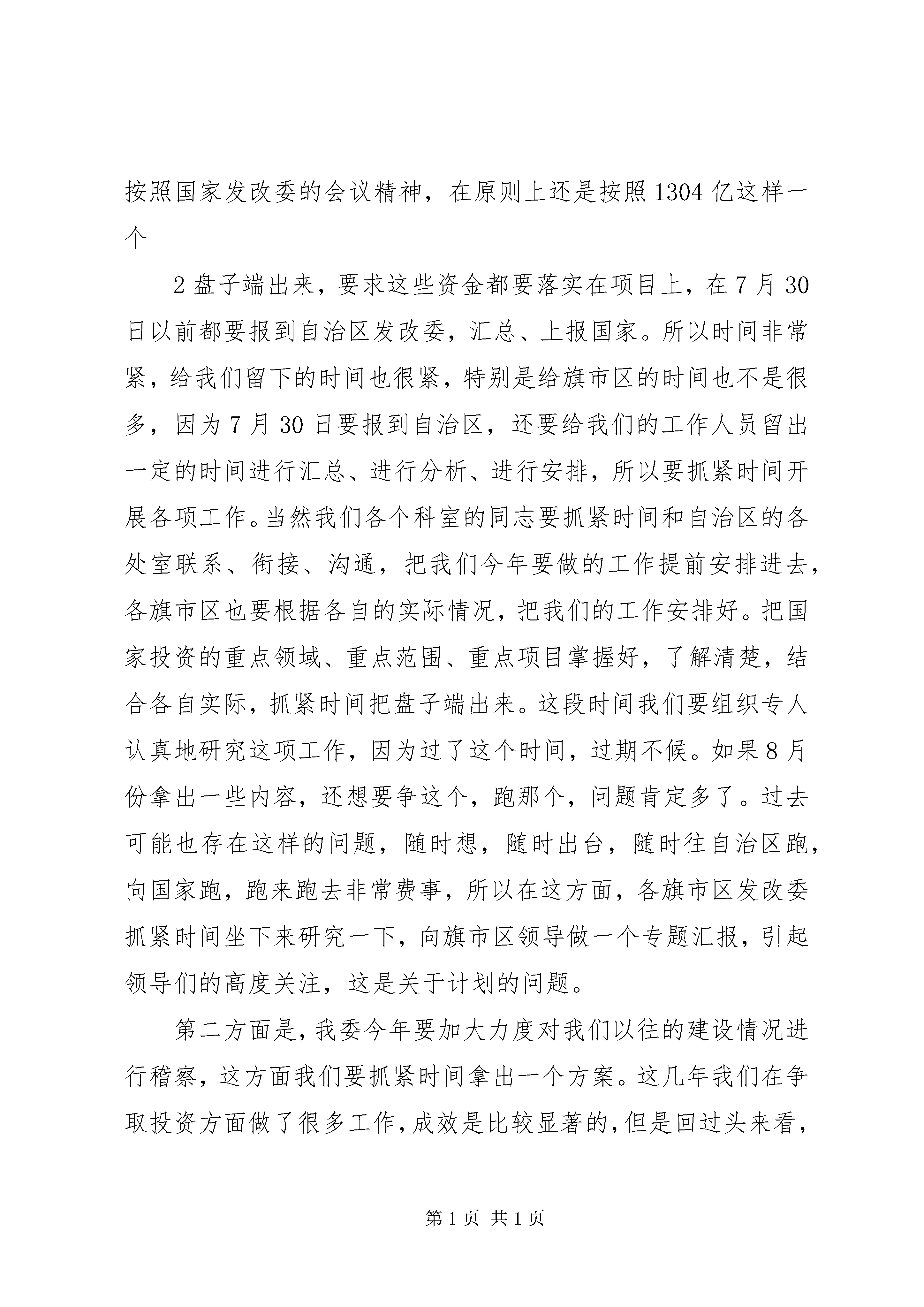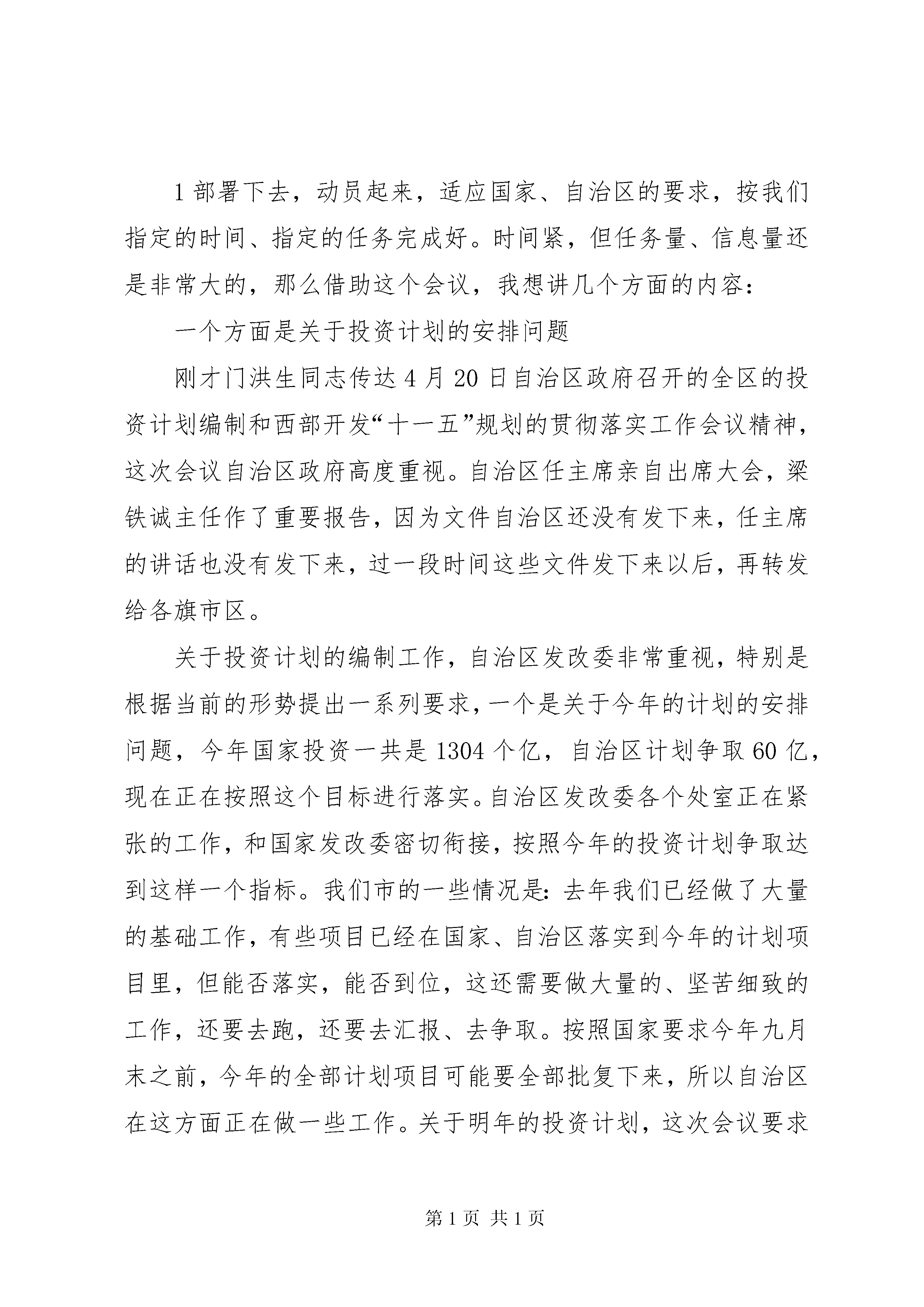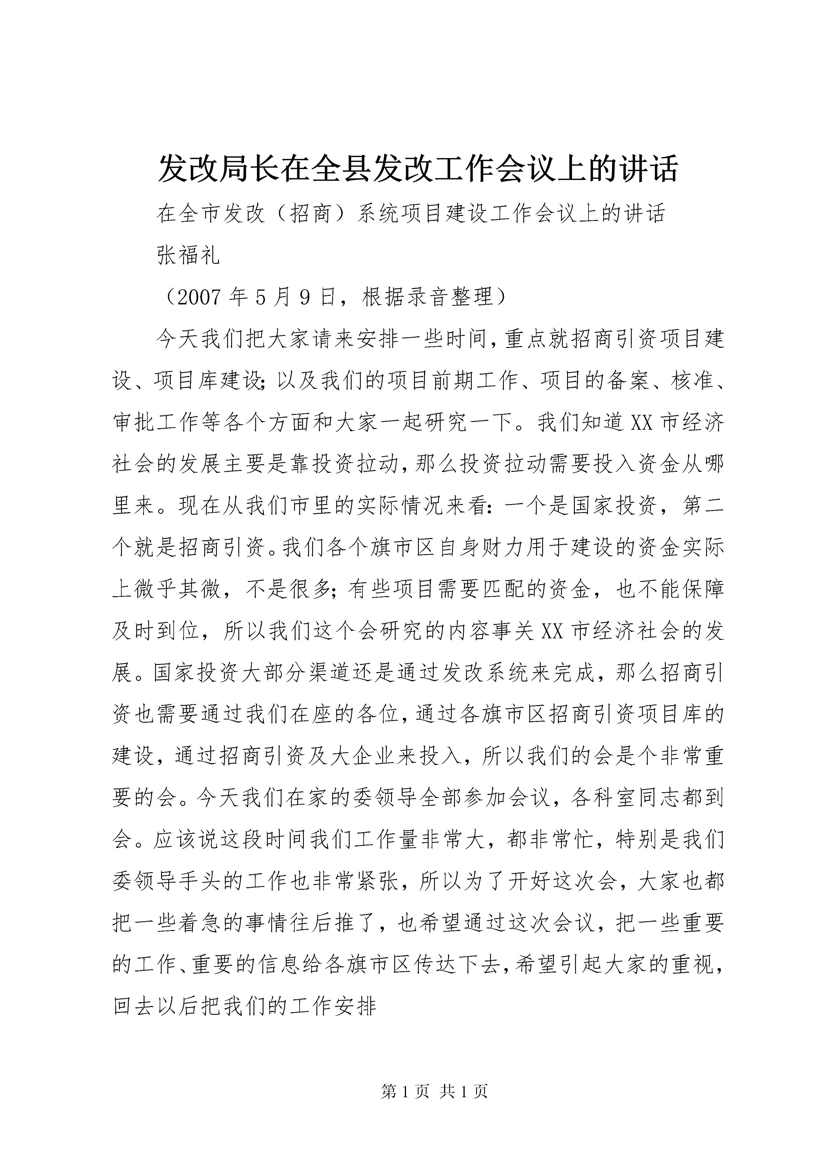 发改局长在全县发改工作会议上的讲话在全市发改(招商)系统项目建设工作会议上的讲话张福礼(2007年5月9日,根据录音整理)今天我们把大家请来安排一些时间,重点就招商引资项目建设、项目库建设;以及我们的项目前期工作、项目的备案、核准、审批工作等各个方面和大家一起研究一下。我们知道XX市经济社会的发展主要是靠投资拉动,那么投资拉动需要投入资金从哪里来。现在从我们市里的实际情况来看:一个是国家投资,第二个就是招商引资。我们各个旗市区自身财力用于建设的资金实际上微乎其微,不是很多;有些项目需要匹配的资金,也不能保障及时到位,所以我们这个会研究的内容事关XX市经济社会的发展。国家投资大部分渠道还是通过发改系统来完成,那么招商引资也需要通过我们在座的各位,通过各旗市区招商引资项目库的建设,通过招商引资及大企业来投入,所以我们的会是个非常重要的会。今天我们在家的委领导全部参加会议,各科室同志都到会。应该说这段时间我们工作量非常大,都非常忙,特别是我们委领导手头的工作也非常紧张,所以为了开好这次会,大家也都把一些着急的事情往后推了,也希望通过这次会议,把一些重要的工作、重要的信息给各旗市区传达下去,希望引起大家的重视,回去以后把我们的工作安排1部署下去,动员起来,适应国家、自治区的要求,按我们指定的时间、指定的任务完成好。时间紧,但任务量、信息量还是非常大的,那么借助这个会议,我想讲几个方面的内容:一个方面是关于投资计划的安排问题刚才门洪生同志传达4月20日自治区政府召开的全区的投资计划编制和西部开发“十一五”规划的贯彻落实工作会议精神,这次会议自治区政府高度重视。自治区任主席亲自出席大会,梁铁诚主任作了重要报告,因为文件自治区还没有发下来,任主席的讲话也没有发下来,过一段时间这些文件发下来以后,再转发给各旗市区。关于投资计划的编制工作,自治区发改委非常重视,特别是根据当前的形势提出一系列要求,一个是关于今年的计划的安排问题,今年国家投资一共是1304个亿,自治区计划争取60亿,现在正在按照这个目标进行落实。自治区发改委各个处室正在紧张的工作,和国家发改委密切衔接,按照今年的投资计划争取达到这样一个指标。我们市的一些情况是:去年我们已经做了大量的基础工作,有些项目已经在国家、自治区落实到今年的计划项目里,但能否落实,能否到位,这还需要做大量的、坚苦细致的工作,还要去跑,还要去汇报、去争取。按照国家要求今年九月末之前,今年的全部计划项目可能要全部批复下来,所以自治区在这方面正在做一些工作。关于明年的投资计划,这次会议要求按照国家发改委的会议精神,在原则上还是按照1304亿这样一个2盘子端出来,要求这些资金都要落实在项目上,在7月30日以前都要报到自治区发改委,汇总、上报国家。所以时间非常紧,给我们留下的时间也很紧,特别是给旗市区的时间也不是很多,因为7月30日要报到自治区,还要给我们的工作人员留出一定的时间进行汇总、进行分析、进行安排,所以要抓紧时间开展各项工作。当然我们各个科室的同志要抓紧时间和自治区的各处室联系、衔接、沟通,把我们今年要做的工作提前安排进去,各旗市区也要根据各自的实际情况,把我们的工作安排好。把国家投资的重点领域、重点范围、重点项目掌握好,了解清楚,结合各自实际,抓紧时间把盘子端出来。这段时间我们要组织专人认真地研究这项工作,因为过了这个时间,过期不候。如果8月份拿出一些内容,还想要争这个,跑那个,问题肯定多了。过去可能也存在这样的问题,随时想,随时出台,随时往自治区跑,向国家跑,跑来跑去非常费事,所以在这方面,各旗市区发改委抓紧时间坐下来研究一下,向旗市区领导做一个专题汇报,引起领导们的高度关注,这是关于计划的问题。第二方面是,我委今年要加大力度对我们以往的建设情况进行稽察,这方面我们要抓紧时间拿出一个方案。这几年我们在争取投资方面做了很多工作,成效是比较显著的,但是回过头来看,也不能说是没有问题。我们要通过稽察把成就展示出来,也把问题反映出来。第一个就是看一看这些年我们国家的重点投资用的情况是什么样,是不是把有限的资3金都用到项目上。第二个是各地区匹配的资金到位的情况,是不是按照要求都到位了。第三个就是这些项目的建设情况,是不是都发挥作用,还有什么问题,我们也要通过这样的稽察,一些情况的反应来分析研究,来改进我们的工作。今后的资金我们觉得国家的投入是逐年增加,但在呼伦贝尔怎么用,还需要我们认真地研究,认真地把握。我们的想法是把有限的资金倾斜到能干事的地区,哪个地区投资发挥的作用好,对经济、对社会贡献大,这个地区就应该重点支持,哪个地区争来一点钱,跑冒滴漏、干不成事、或者干成事以后后遗症很多,这个就值得研究了。所以在这方面我们要掌握第一手资料,今后把有限的资金怎么在呼伦贝尔用好,和上级汇报、争取的