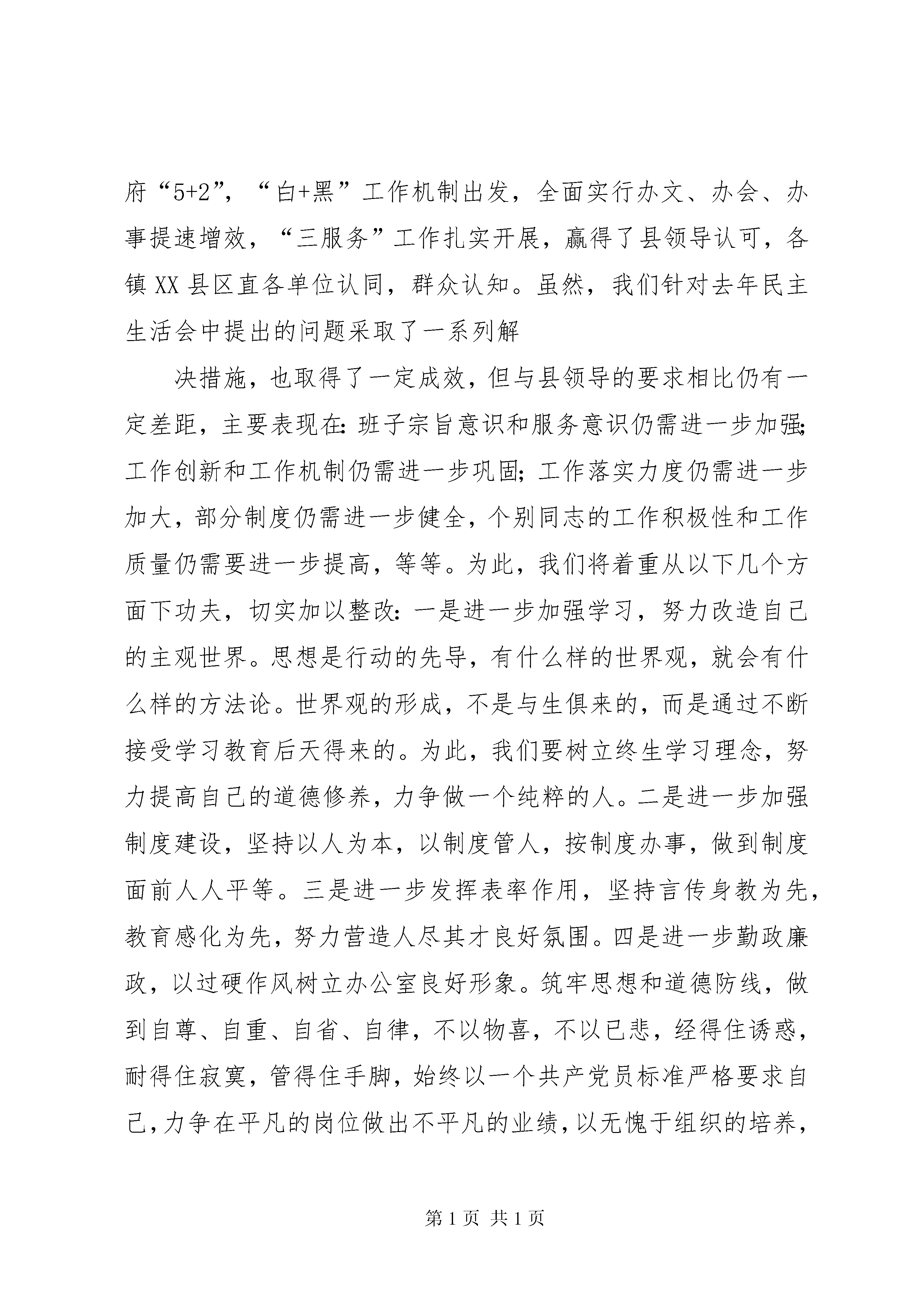 发言提纲(陈虞亮)民主生活会发言提纲(2010年9月)根据县委组织部、县纪委和组字12号文件要求以及县直机关工委15号文件规定,办公室党组今天下午召开党员领导干部民主生活会。为开好这次民主生活会,会前,我们进行了认真准备。一是组织党员领导干部学习了党的十七大和十七届四中全会精神,胡锦涛总书记在全党深入开展学习实践科学发展观活动总结大会上讲话以及在中纪委第四、五次全会上讲话,《廉政准则》以及《党政领导干部选拔任用工作四项监督制度》;二是召开办公室中层以上干部会议,通报2009年民主生活会整改措施落实情况;三是向各镇、县直各单位发放征求意见表,召开办公室工作人员会议,进一步征求对办公室工作意见;四是利用不同形式,广泛开展谈心活动,沟通思想,交换意见;五是班子各成员结合学习心得、个人实际和征求到的意见,认真撰写发言提纲;六是按要求,向县委组织部、纪委、县直机关工委报告会议准备情况以及召开的具体时间。首先,我来通报一下办公室班子去年民主生活会整改落实情况以及今年以来执行《廉政准则》、干部选拔任用四项监督制度情况。《廉政准则》用8个“禁止”,52个“不准”,对领导干部从事人、财、物管理以及工作作风作了全面规定,约束之1多,规定之细,前所未有,这是新时期加强党的自身建设需要。针对去年民主生活会上提出的四个方面八个问题,办公室党组进行了认真梳理,深刻反思,并采取有效措施切实加以解决。一、以争先创优为契机,牢固树立宗旨意识。2009年,办公室多项工作在省市县评比中获得好名次,但凭心而论,成绩背后仍存在一些薄弱环节,要想各项工作稳步发展,就必须在思想上牢固树立争先创优意识,思想上不懈怠,工作上不放松,制度上不欠缺。办公室党组始终认为,思想问题是第一位问题,思想滑坡是最大滑坡。为此,办公室党组始终将思想教育工作放在首位,教育大家认真思考“我到办公室工作为了什么。”引导大家树立正确的世界观、人生观、价值观,正确对待名誉和利益,不做好高骛远之人,不做浅薄浮躁之人,不做低级趣味之人,而是要坚定信念,苦练内功。对班子成员和中层干部,办公室党组始终要求他们讲党性,重品行,做表率,既要做好本职工作,也要带好队伍。在日常工作中,班子成员注重思想政治工作运用,注意将思想政治工作融入到管理中的每个环节,努力营造团结共事,积极向上的良好氛围。二、以“全市争上游,县内创一流”为目标,扎实做好本职工作。围绕中心,服务大局是办公室工作最大任务,针对去年民主生活会上提出的部分制度有待完善,少数同志工作积极性不高,个别同志工作进步不大等问题,今年办公室着力从完善制度入手,先后建立健全了信息、应急、公文处理等方面制度,收到了较好效果。公文处理方面,本着安全、规范、高效原则,加快电子政务和纸质公文流转速度,做到急事急办,特事特办。同时,加强档案等基础工作,很好地发挥了“看不见”战线作用;应急信息方面,2010年,我县被省政府列为应急信息直报点,为进一步加强应急队伍网络化建设和应急制度建设,办公室出台了《关于加强和规范应急信息上报工作的通知》,一些重大突发事件信息上报工作做到了及时准确规范,受到了县领导充分肯定;政府法制方面,克服人少事多矛盾,及时办理人大代表建议和政协委员提案,认真办理行政复议案件,审查向县人大常委会专项报告,协调执法矛盾和纠纷,为政府依法行政积极献言献策;综合调研方面,认真组织省市领导来和调研工作,积极开展外宣、综合调研、信息等工作,在保证政府高效运转方面发挥了主力军作用;信息方面,坚持全员办信息,定期通报等制度。1-8月份,全县政务信息综合得分位居全市第一。其他如招商引资、社会治安综合治理等工作也都扎实开展。三、以“两问两整治”活动为抓手,狠抓办公室作风建设。针对去年办公室个别人被市纪委暗访发现在网上购物等现象,结合县“两问两整治”活动动员会精神,办公室党组进一步严明纪律,明确各部门职责分工,强化责任意识,任务观念,从适应政府“5+2”,“白+黑”工作机制出发,全面实行办文、办会、办事提速增效,“三服务”工作扎实开展,赢得了县领导认可,各镇XX县区直各单位认同,群众认知。虽然,我们针对去年民主生活会中提出的问题采取了一系列解决措施,也取得了一定成效,但与县领导的要求相比仍有一定差距,主要表现在:班子宗旨意识和服务意识仍需进一步加强;工作创新和工作机制仍需进一步巩固;工作落实力度仍需进一步加大,部分制度仍需进一步健全,个别同志的工作积极性和工作质量仍需要进一步提高,等等。为此,我们将着重从以下几个方面下功夫,切实加以整改:一是进一步加强学习,努力改造自己的主观世界。思想是行动的先导,有什么样的世界观,就会有什么样的方法论。世界观的形成,不是与生俱来的,而是通过不断接受学习教育后天得来的。为此,我们要树立终生学习理念,努力提高自己的道德修