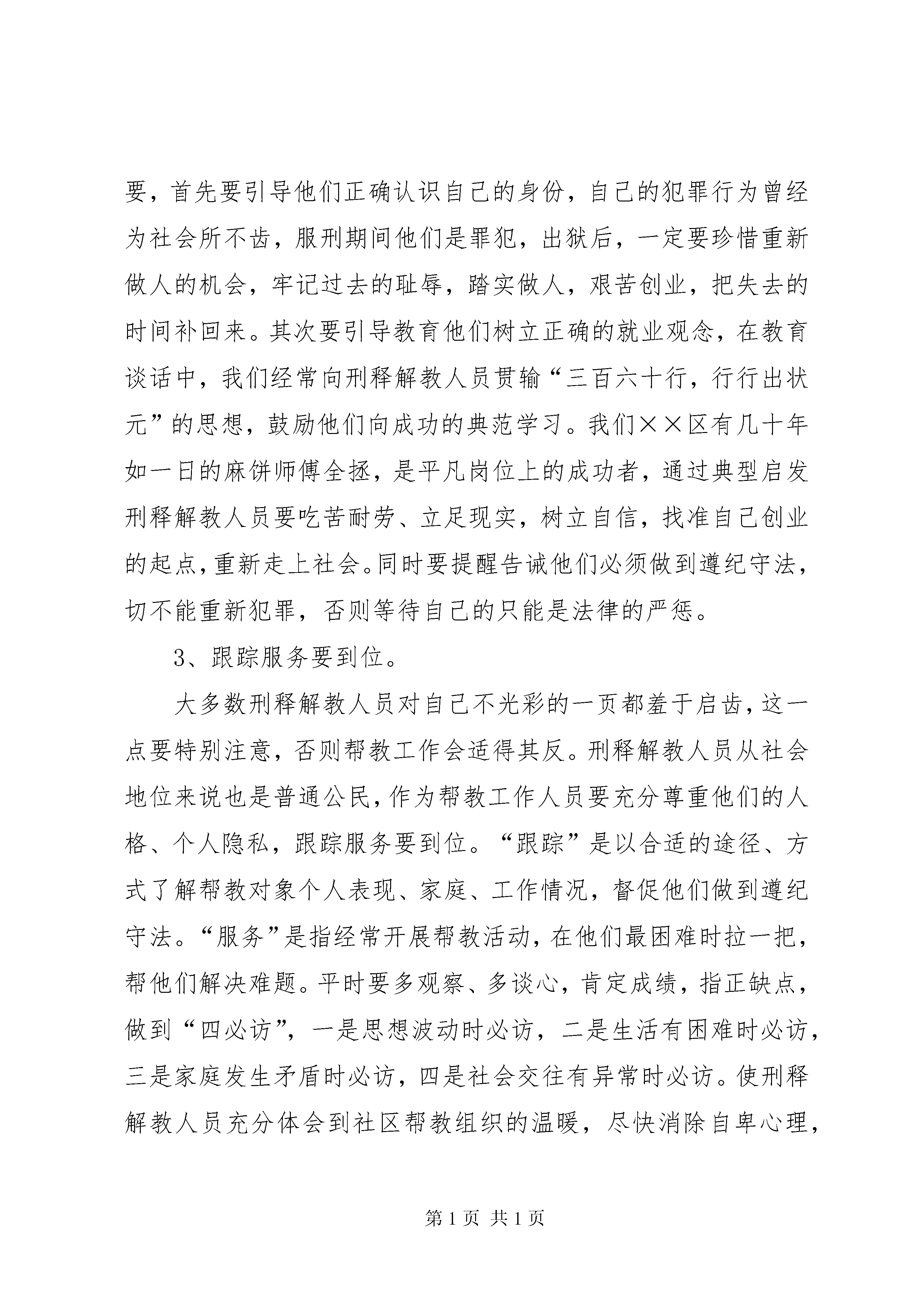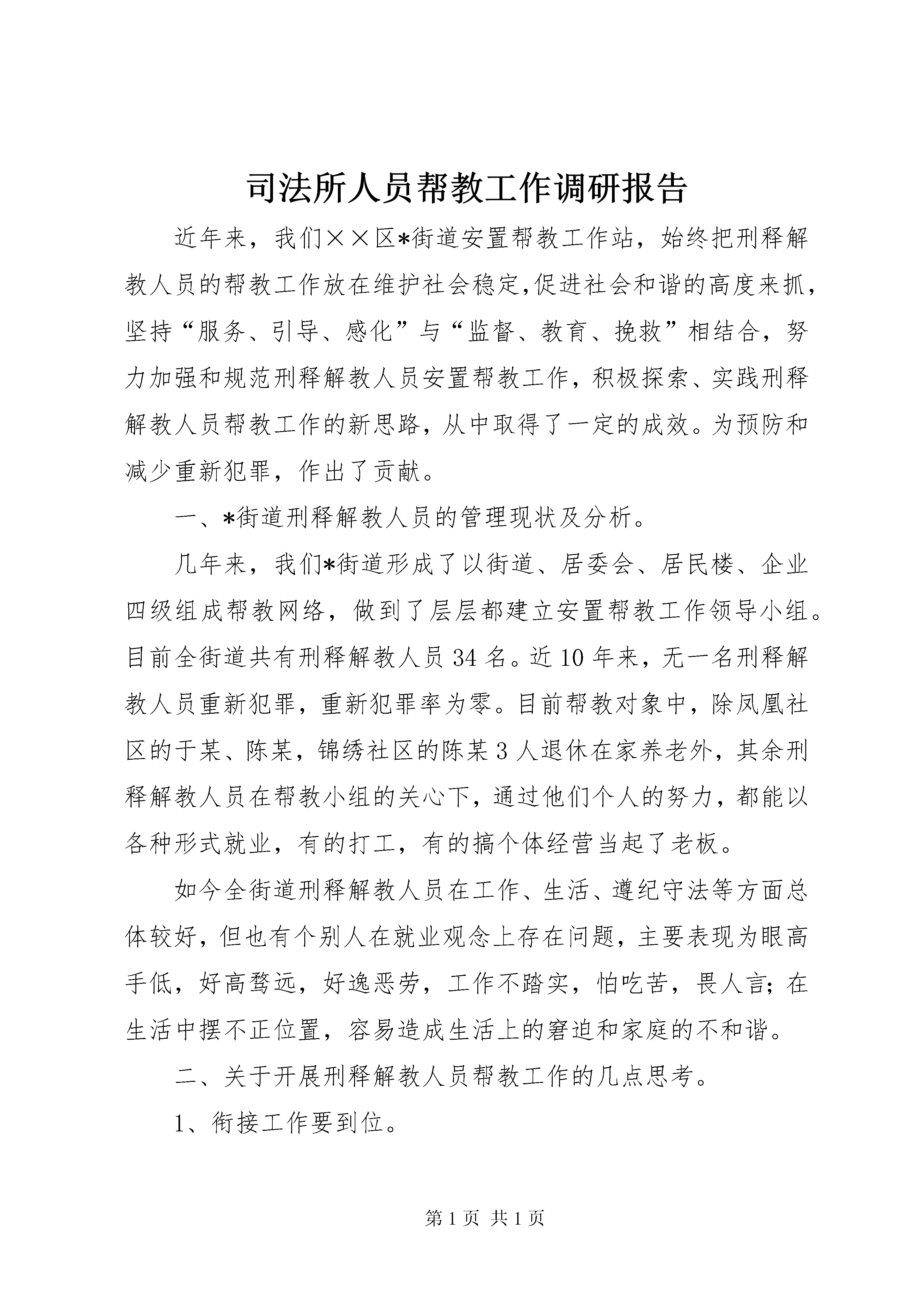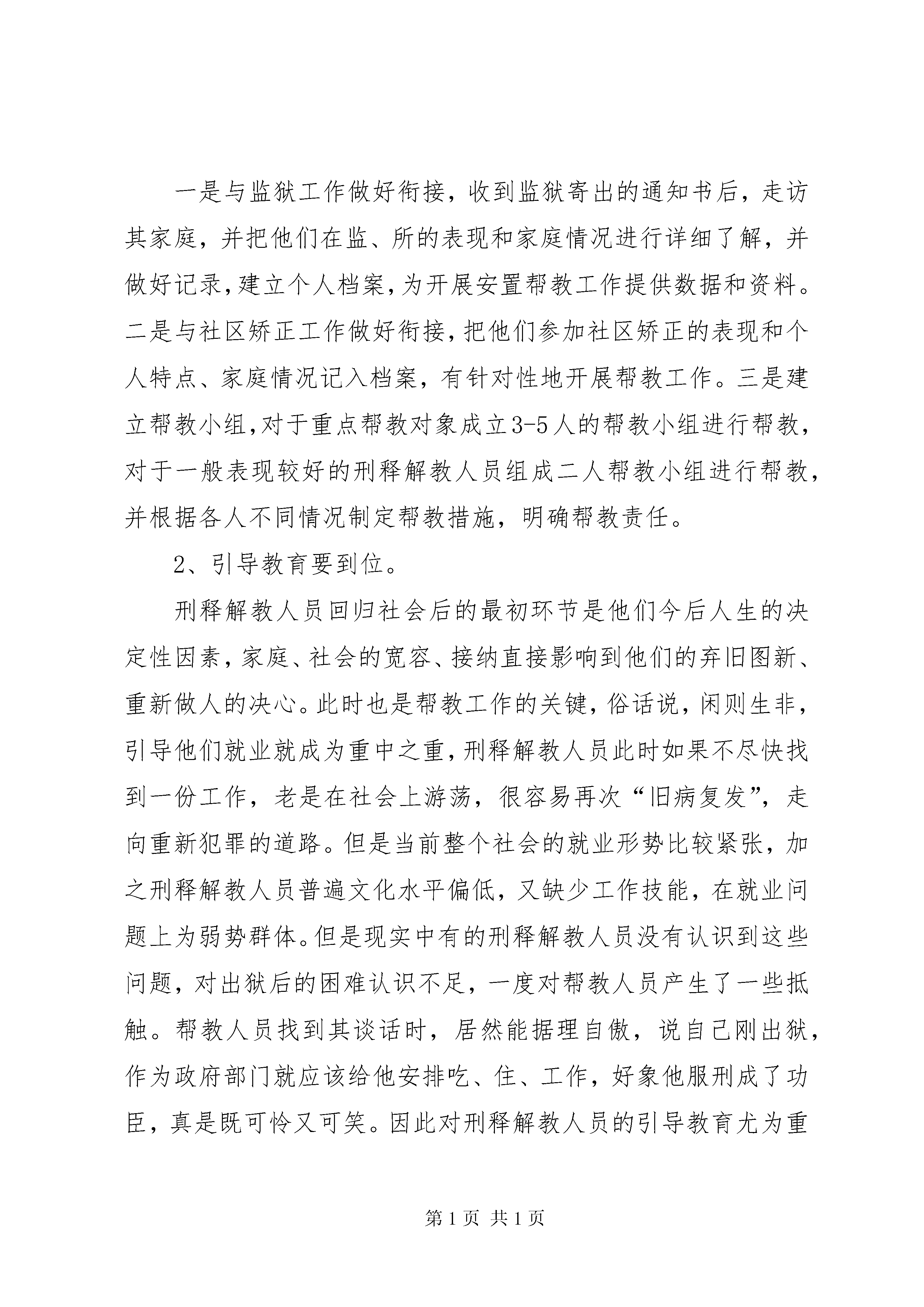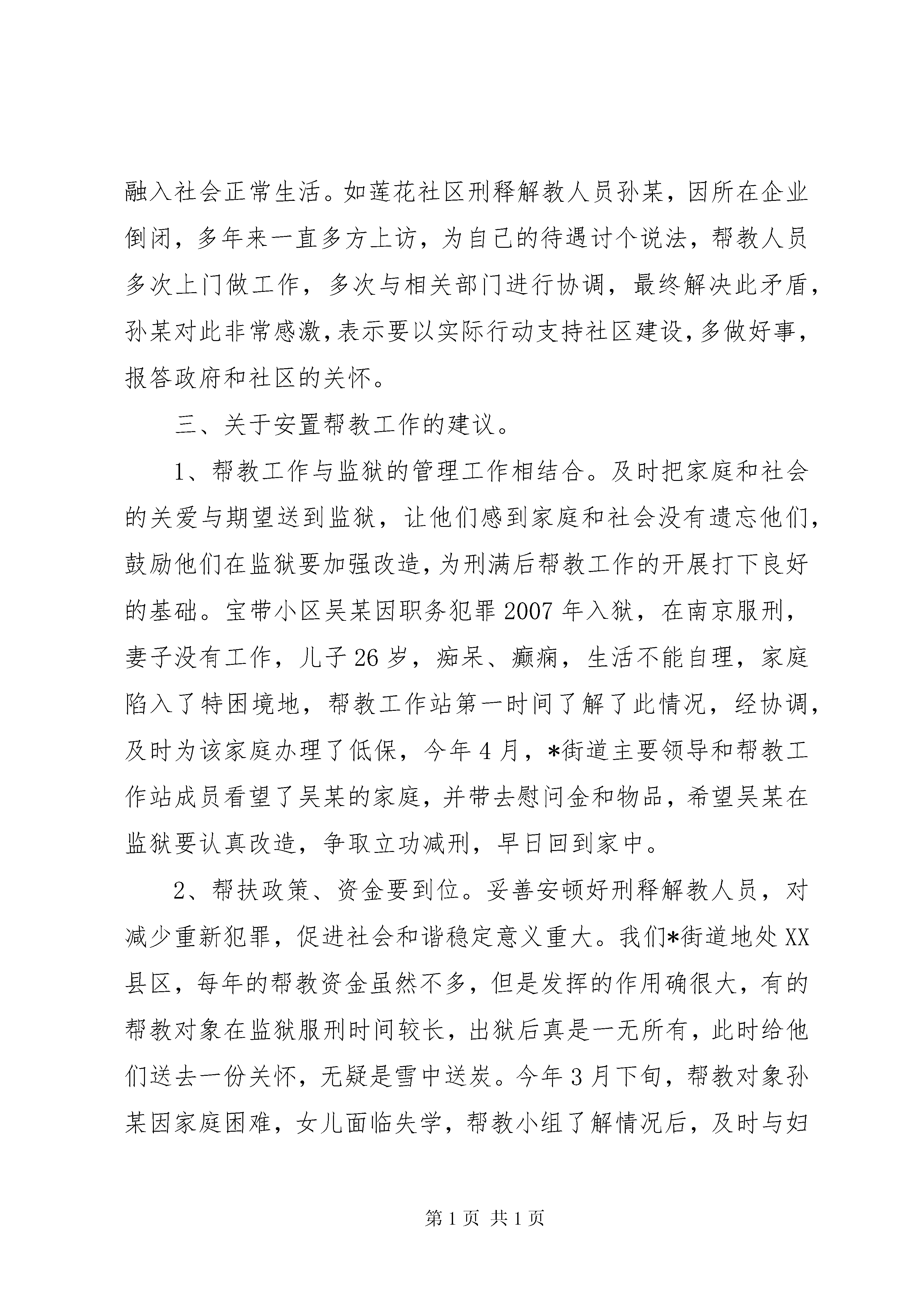 司法所人员帮教工作调研报告近年来,我们××区*街道安置帮教工作站,始终把刑释解教人员的帮教工作放在维护社会稳定,促进社会和谐的高度来抓,坚持“服务、引导、感化”与“监督、教育、挽救”相结合,努力加强和规范刑释解教人员安置帮教工作,积极探索、实践刑释解教人员帮教工作的新思路,从中取得了一定的成效。为预防和减少重新犯罪,作出了贡献。一、*街道刑释解教人员的管理现状及分析。几年来,我们*街道形成了以街道、居委会、居民楼、企业四级组成帮教网络,做到了层层都建立安置帮教工作领导小组。目前全街道共有刑释解教人员34名。近10年来,无一名刑释解教人员重新犯罪,重新犯罪率为零。目前帮教对象中,除凤凰社区的于某、陈某,锦绣社区的陈某3人退休在家养老外,其余刑释解教人员在帮教小组的关心下,通过他们个人的努力,都能以各种形式就业,有的打工,有的搞个体经营当起了老板。如今全街道刑释解教人员在工作、生活、遵纪守法等方面总体较好,但也有个别人在就业观念上存在问题,主要表现为眼高手低,好高骛远,好逸恶劳,工作不踏实,怕吃苦,畏人言;在生活中摆不正位置,容易造成生活上的窘迫和家庭的不和谐。二、关于开展刑释解教人员帮教工作的几点思考。1、衔接工作要到位。一是与监狱工作做好衔接,收到监狱寄出的通知书后,走访其家庭,并把他们在监、所的表现和家庭情况进行详细了解,并做好记录,建立个人档案,为开展安置帮教工作提供数据和资料。二是与社区矫正工作做好衔接,把他们参加社区矫正的表现和个人特点、家庭情况记入档案,有针对性地开展帮教工作。三是建立帮教小组,对于重点帮教对象成立3-5人的帮教小组进行帮教,对于一般表现较好的刑释解教人员组成二人帮教小组进行帮教,并根据各人不同情况制定帮教措施,明确帮教责任。2、引导教育要到位。刑释解教人员回归社会后的最初环节是他们今后人生的决定性因素,家庭、社会的宽容、接纳直接影响到他们的弃旧图新、重新做人的决心。此时也是帮教工作的关键,俗话说,闲则生非,引导他们就业就成为重中之重,刑释解教人员此时如果不尽快找到一份工作,老是在社会上游荡,很容易再次“旧病复发”,走向重新犯罪的道路。但是当前整个社会的就业形势比较紧张,加之刑释解教人员普遍文化水平偏低,又缺少工作技能,在就业问题上为弱势群体。但是现实中有的刑释解教人员没有认识到这些问题,对出狱后的困难认识不足,一度对帮教人员产生了一些抵触。帮教人员找到其谈话时,居然能据理自傲,说自己刚出狱,作为政府部门就应该给他安排吃、住、工作,好象他服刑成了功臣,真是既可怜又可笑。因此对刑释解教人员的引导教育尤为重要,首先要引导他们正确认识自己的身份,自己的犯罪行为曾经为社会所不齿,服刑期间他们是罪犯,出狱后,一定要珍惜重新做人的机会,牢记过去的耻辱,踏实做人,艰苦创业,把失去的时间补回来。其次要引导教育他们树立正确的就业观念,在教育谈话中,我们经常向刑释解教人员贯输“三百六十行,行行出状元”的思想,鼓励他们向成功的典范学习。我们××区有几十年如一日的麻饼师傅全拯,是平凡岗位上的成功者,通过典型启发刑释解教人员要吃苦耐劳、立足现实,树立自信,找准自己创业的起点,重新走上社会。同时要提醒告诫他们必须做到遵纪守法,切不能重新犯罪,否则等待自己的只能是法律的严惩。3、跟踪服务要到位。大多数刑释解教人员对自己不光彩的一页都羞于启齿,这一点要特别注意,否则帮教工作会适得其反。刑释解教人员从社会地位来说也是普通公民,作为帮教工作人员要充分尊重他们的人格、个人隐私,跟踪服务要到位。“跟踪”是以合适的途径、方式了解帮教对象个人表现、家庭、工作情况,督促他们做到遵纪守法。“服务”是指经常开展帮教活动,在他们最困难时拉一把,帮他们解决难题。平时要多观察、多谈心,肯定成绩,指正缺点,做到“四必访”,一是思想波动时必访,二是生活有困难时必访,三是家庭发生矛盾时必访,四是社会交往有异常时必访。使刑释解教人员充分体会到社区帮教组织的温暖,尽快消除自卑心理,融入社会正常生活。如莲花社区刑释解教人员孙某,因所在企业倒闭,多年来一直多方上访,为自己的待遇讨个说法,帮教人员多次上门做工作,多次与相关部门进行协调,最终解决此矛盾,孙某对此非常感激,表示要以实际行动支持社区建设,多做好事,报答政府和社区的关怀。三、关于安置帮教工作的建议。1、帮教工作与监狱的管理工作相结合。及时把家庭和社会的关爱与期望送到监狱,让他们感到家庭和社会没有遗忘他们,鼓励他们在监狱要加强改造,为刑满后帮教工作的开展打下良好的基础。宝带小区吴某因职务犯罪2007年入狱,在南京服刑,妻子没有工作,儿子26岁,痴呆、癫痫,生活不能自理,家庭陷入了特困境地,帮教工作站第一时间了解了此情况,经协调,及时为该家庭办理了低保,今年4月,*街道主要领导和帮教工作站成