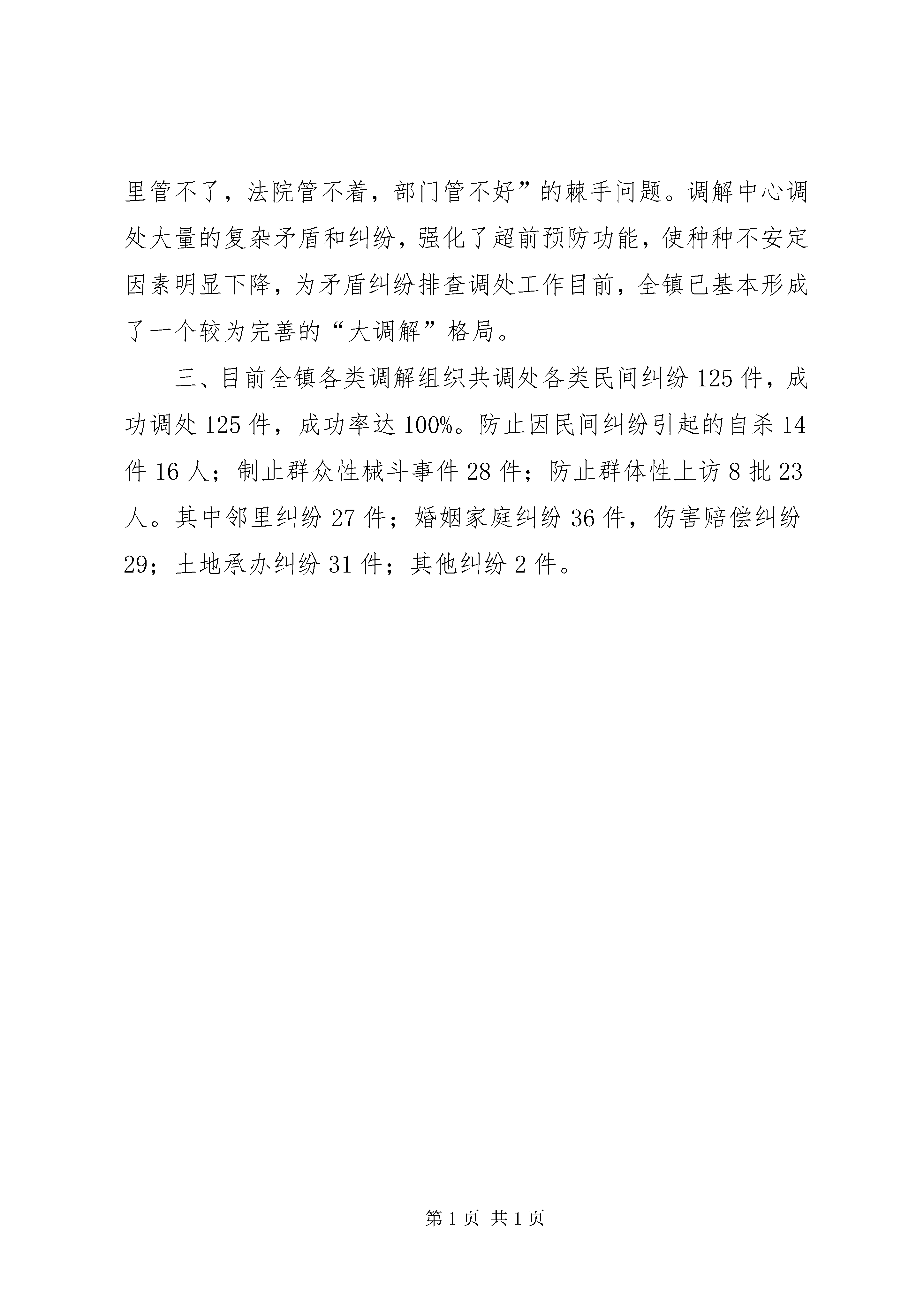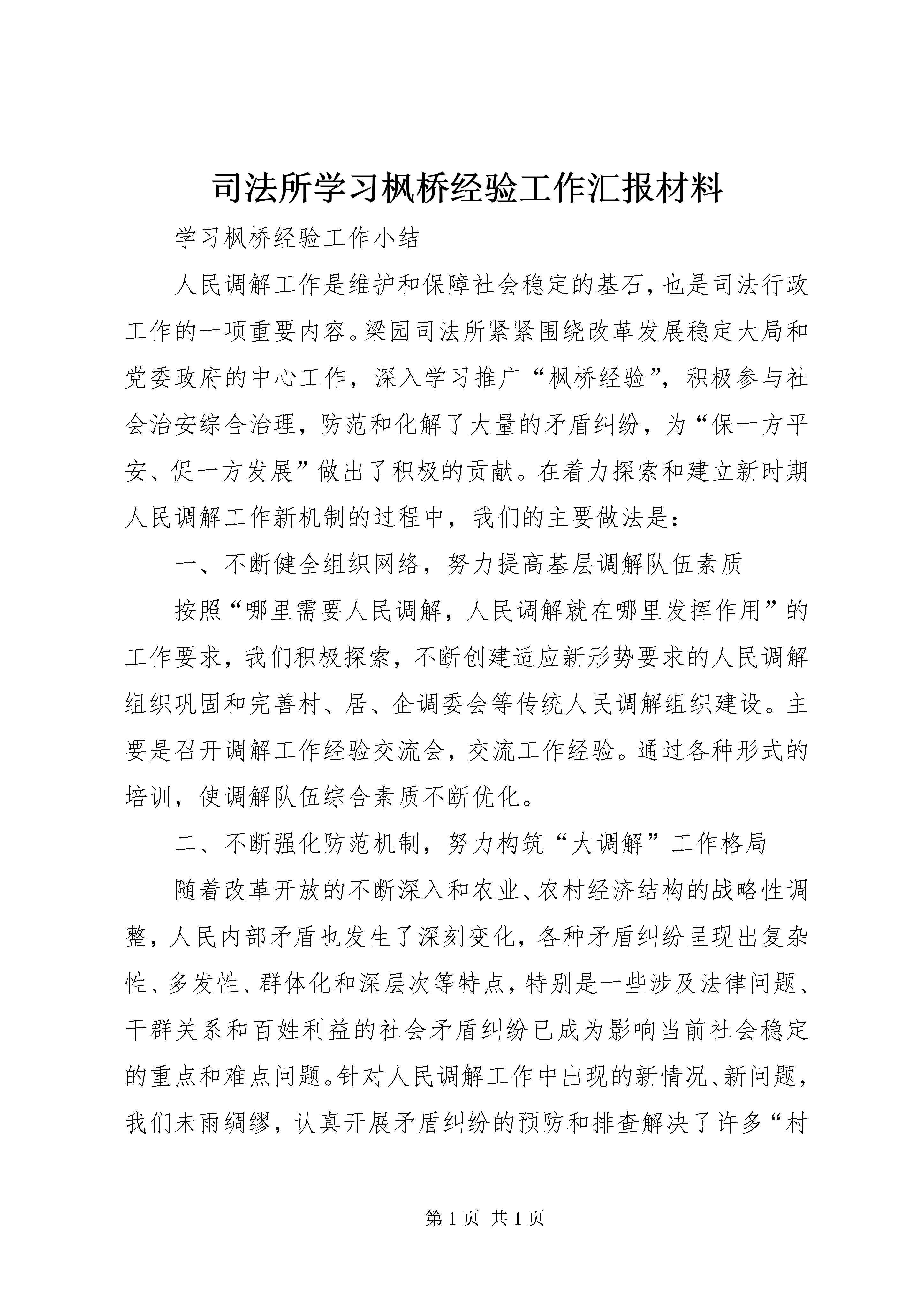 司法所学习枫桥经验工作汇报材料学习枫桥经验工作小结人民调解工作是维护和保障社会稳定的基石,也是司法行政工作的一项重要内容。梁园司法所紧紧围绕改革发展稳定大局和党委政府的中心工作,深入学习推广“枫桥经验”,积极参与社会治安综合治理,防范和化解了大量的矛盾纠纷,为“保一方平安、促一方发展”做出了积极的贡献。在着力探索和建立新时期人民调解工作新机制的过程中,我们的主要做法是:一、不断健全组织网络,努力提高基层调解队伍素质按照“哪里需要人民调解,人民调解就在哪里发挥作用”的工作要求,我们积极探索,不断创建适应新形势要求的人民调解组织巩固和完善村、居、企调委会等传统人民调解组织建设。主要是召开调解工作经验交流会,交流工作经验。通过各种形式的培训,使调解队伍综合素质不断优化。二、不断强化防范机制,努力构筑“大调解”工作格局随着改革开放的不断深入和农业、农村经济结构的战略性调整,人民内部矛盾也发生了深刻变化,各种矛盾纠纷呈现出复杂性、多发性、群体化和深层次等特点,特别是一些涉及法律问题、干群关系和百姓利益的社会矛盾纠纷已成为影响当前社会稳定的重点和难点问题。针对人民调解工作中出现的新情况、新问题,我们未雨绸缪,认真开展矛盾纠纷的预防和排查解决了许多“村里管不了,法院管不着,部门管不好”的棘手问题。调解中心调处大量的复杂矛盾和纠纷,强化了超前预防功能,使种种不安定因素明显下降,为矛盾纠纷排查调处工作目前,全镇已基本形成了一个较为完善的“大调解”格局。三、目前全镇各类调解组织共调处各类民间纠纷125件,成功调处125件,成功率达100%。防止因民间纠纷引起的自杀14件16人;制止群众性械斗事件28件;防止群体性上访8批23人。其中邻里纠纷27件;婚姻家庭纠纷36件,伤害赔偿纠纷29;土地承办纠纷31件;其他纠纷2件。