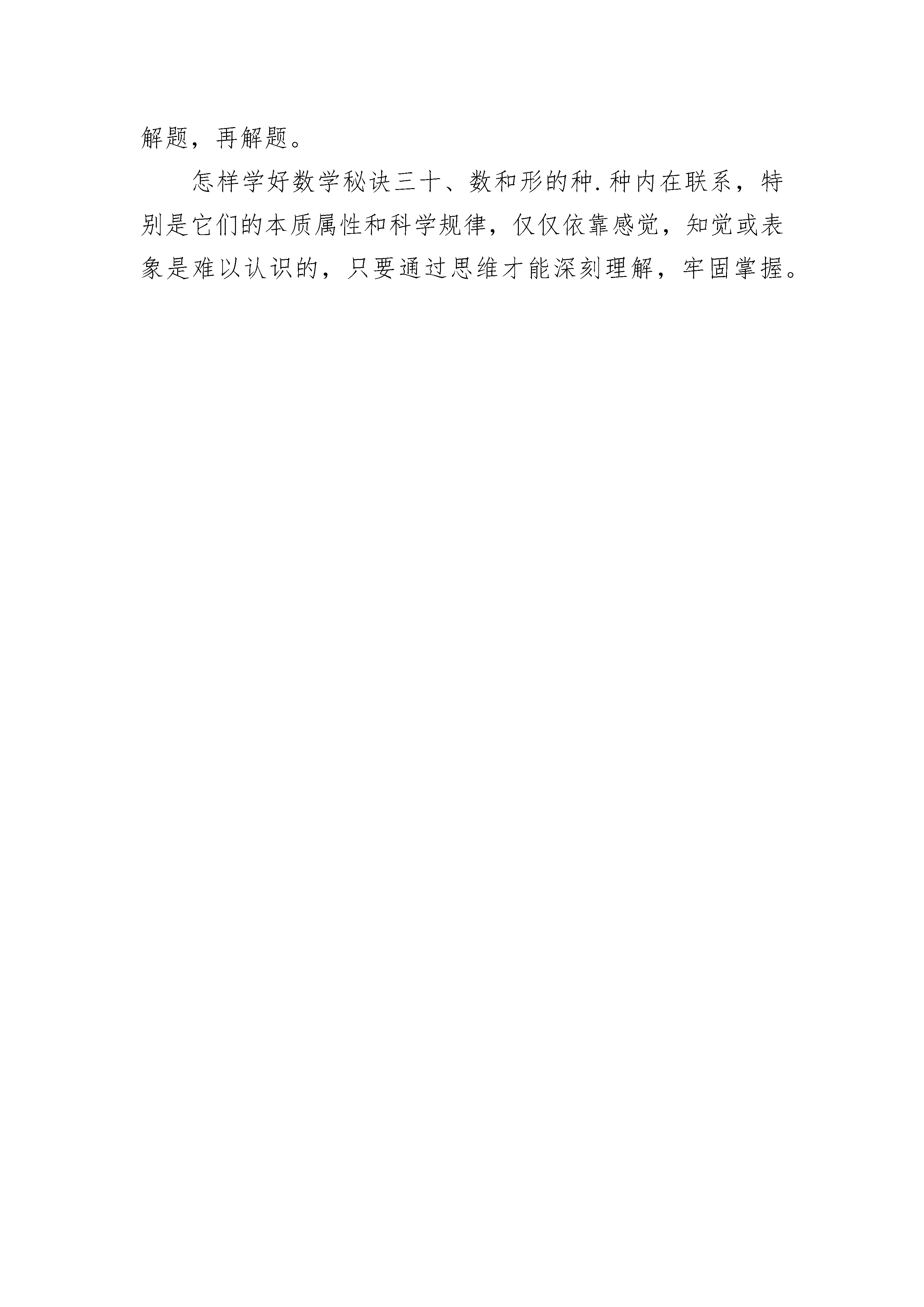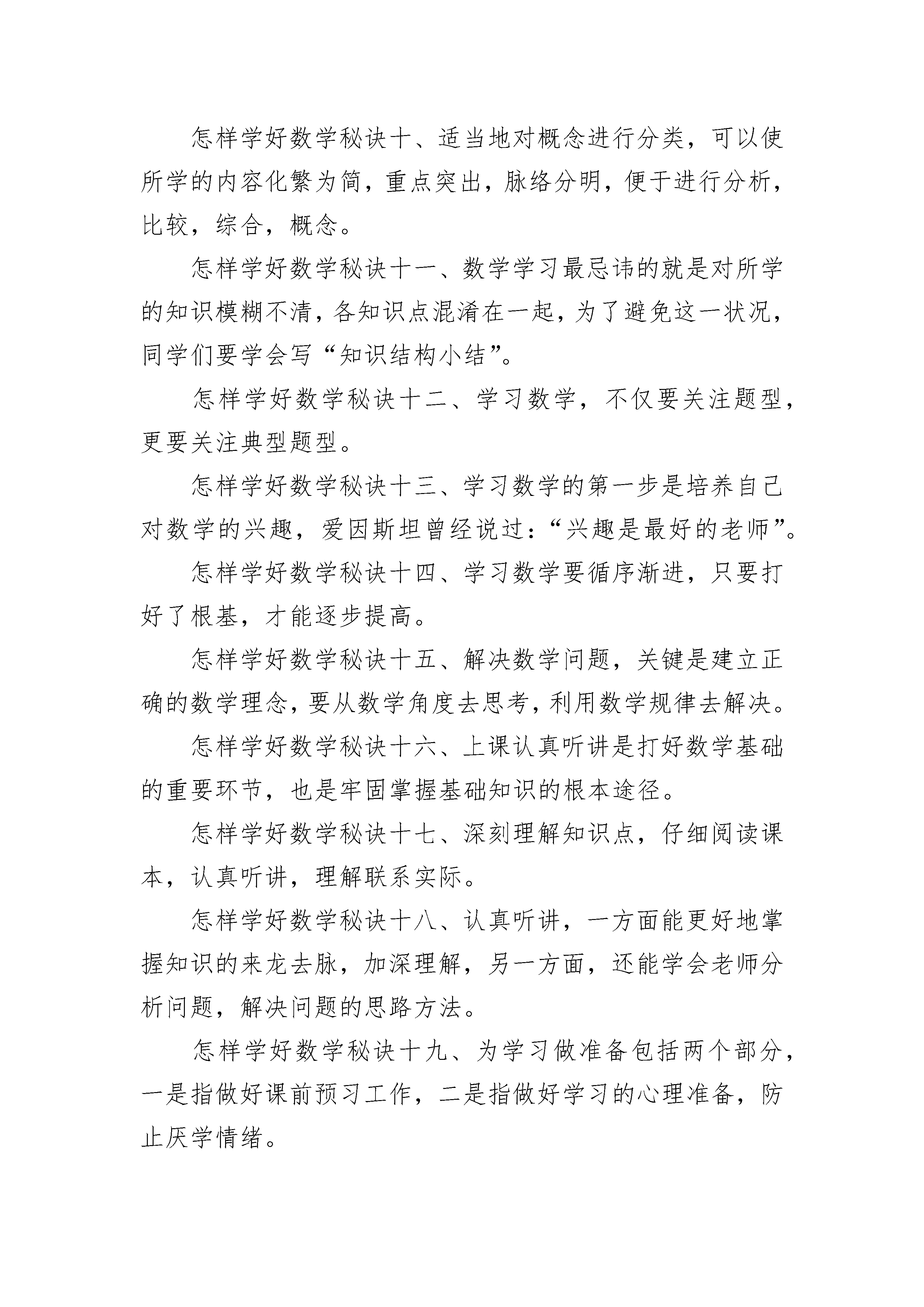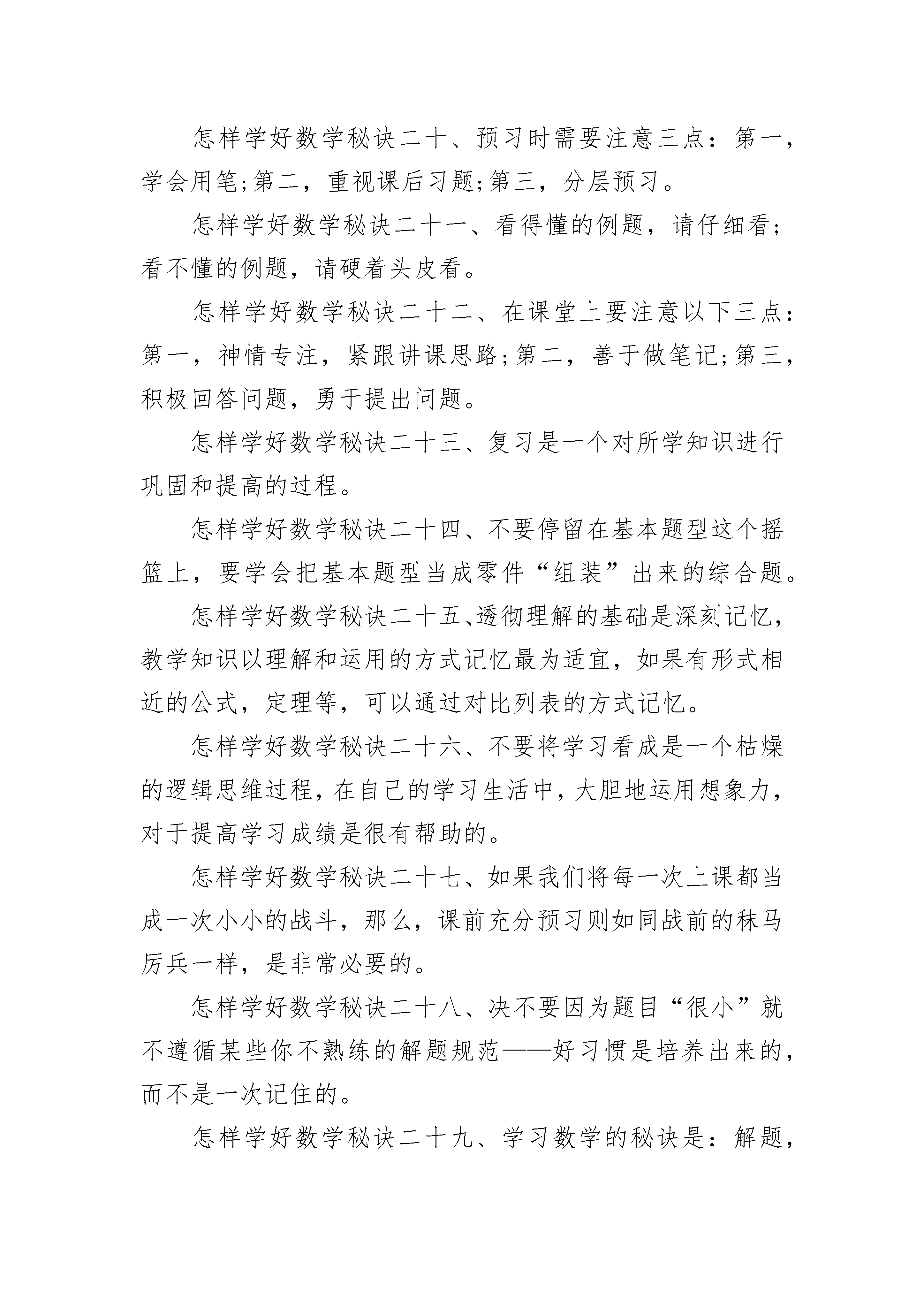 怎样学好数学的秘诀怎样学好数学秘诀一、学好数学要抓住三个“基本”:基本的概念要清楚,基本的规律要熟悉,基本的方法要熟练。怎样学好数学秘诀二、做完题目后一定要认真总结,做到举一反三,这样,以后遇到同一类的问题是就不会花费太多的时间和精力了。怎样学好数学秘诀三、学习概念的最终目的是能运用概念来解决具体问题,因此,要主动运用所学的数学概念来分析,解决有关的数学问题。怎样学好数学秘诀四、要掌握各种题型的解题方法,在练习中有意识的地去总结,慢慢地培养适合自己的分析习惯。怎样学好数学秘诀五、要主动提高综合分析问题的能力,借助文字阅读去分析理解。怎样学好数学秘诀六、将各章节中的内容互相联系,不同章节之间互相类比,真正将前后知识融会贯通,连为一体,这样能帮助我们系统深刻地理解知识体系和内容。怎样学好数学秘诀七、弄清数学知识间的相互联系,透彻理解概念,知道其推导过程,使知识条理化,系统化。怎样学好数学秘诀八、对于数学学科中的某些原理,定理,公式,不仅要记住它的结论,而且要了解这个结论是如何得出的。怎样学好数学秘诀九、在学习中要注意理解,开拓思路,变抽象为具体,逐渐培养自己学习数学的兴趣。怎样学好数学秘诀十、适当地对概念进行分类,可以使所学的内容化繁为简,重点突出,脉络分明,便于进行分析,比较,综合,概念。怎样学好数学秘诀十一、数学学习最忌讳的就是对所学的知识模糊不清,各知识点混淆在一起,为了避免这一状况,同学们要学会写“知识结构小结”。怎样学好数学秘诀十二、学习数学,不仅要关注题型,更要关注典型题型。怎样学好数学秘诀十三、学习数学的第一步是培养自己对数学的兴趣,爱因斯坦曾经说过:“兴趣是最好的老师”。怎样学好数学秘诀十四、学习数学要循序渐进,只要打好了根基,才能逐步提高。怎样学好数学秘诀十五、解决数学问题,关键是建立正确的数学理念,要从数学角度去思考,利用数学规律去解决。怎样学好数学秘诀十六、上课认真听讲是打好数学基础的重要环节,也是牢固掌握基础知识的根本途径。怎样学好数学秘诀十七、深刻理解知识点,仔细阅读课本,认真听讲,理解联系实际。怎样学好数学秘诀十八、认真听讲,一方面能更好地掌握知识的来龙去脉,加深理解,另一方面,还能学会老师分析问题,解决问题的思路方法。怎样学好数学秘诀十九、为学习做准备包括两个部分,一是指做好课前预习工作,二是指做好学习的心理准备,防止厌学情绪。怎样学好数学秘诀二十、预习时需要注意三点:第一,学会用笔;第二,重视课后习题;第三,分层预习。怎样学好数学秘诀二十一、看得懂的例题,请仔细看;看不懂的例题,请硬着头皮看。怎样学好数学秘诀二十二、在课堂上要注意以下三点:第一,神情专注,紧跟讲课思路;第二,善于做笔记;第三,积极回答问题,勇于提出问题。怎样学好数学秘诀二十三、复习是一个对所学知识进行巩固和提高的过程。怎样学好数学秘诀二十四、不要停留在基本题型这个摇篮上,要学会把基本题型当成零件“组装”出来的综合题。怎样学好数学秘诀二十五、透彻理解的基础是深刻记忆,教学知识以理解和运用的方式记忆最为适宜,如果有形式相近的公式,定理等,可以通过对比列表的方式记忆。怎样学好数学秘诀二十六、不要将学习看成是一个枯燥的逻辑思维过程,在自己的学习生活中,大胆地运用想象力,对于提高学习成绩是很有帮助的。怎样学好数学秘诀二十七、如果我们将每一次上课都当成一次小小的战斗,那么,课前充分预习则如同战前的秣马厉兵一样,是非常必要的。怎样学好数学秘诀二十八、决不要因为题目“很小”就不遵循某些你不熟练的解题规范——好习惯是培养出来的,而不是一次记住的。怎样学好数学秘诀二十九、学习数学的秘诀是:解题,解题,再解题。怎样学好数学秘诀三十、数和形的种.种内在联系,特别是它们的本质属性和科学规律,仅仅依靠感觉,知觉或表象是难以认识的,只要通过思维才能深刻理解,牢固掌握。