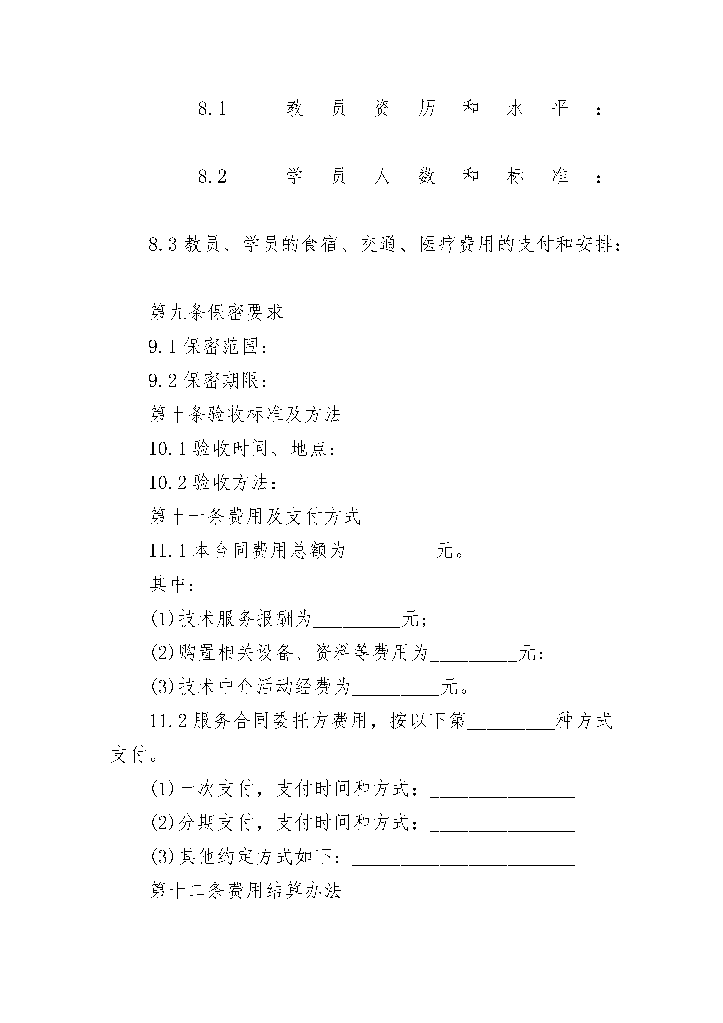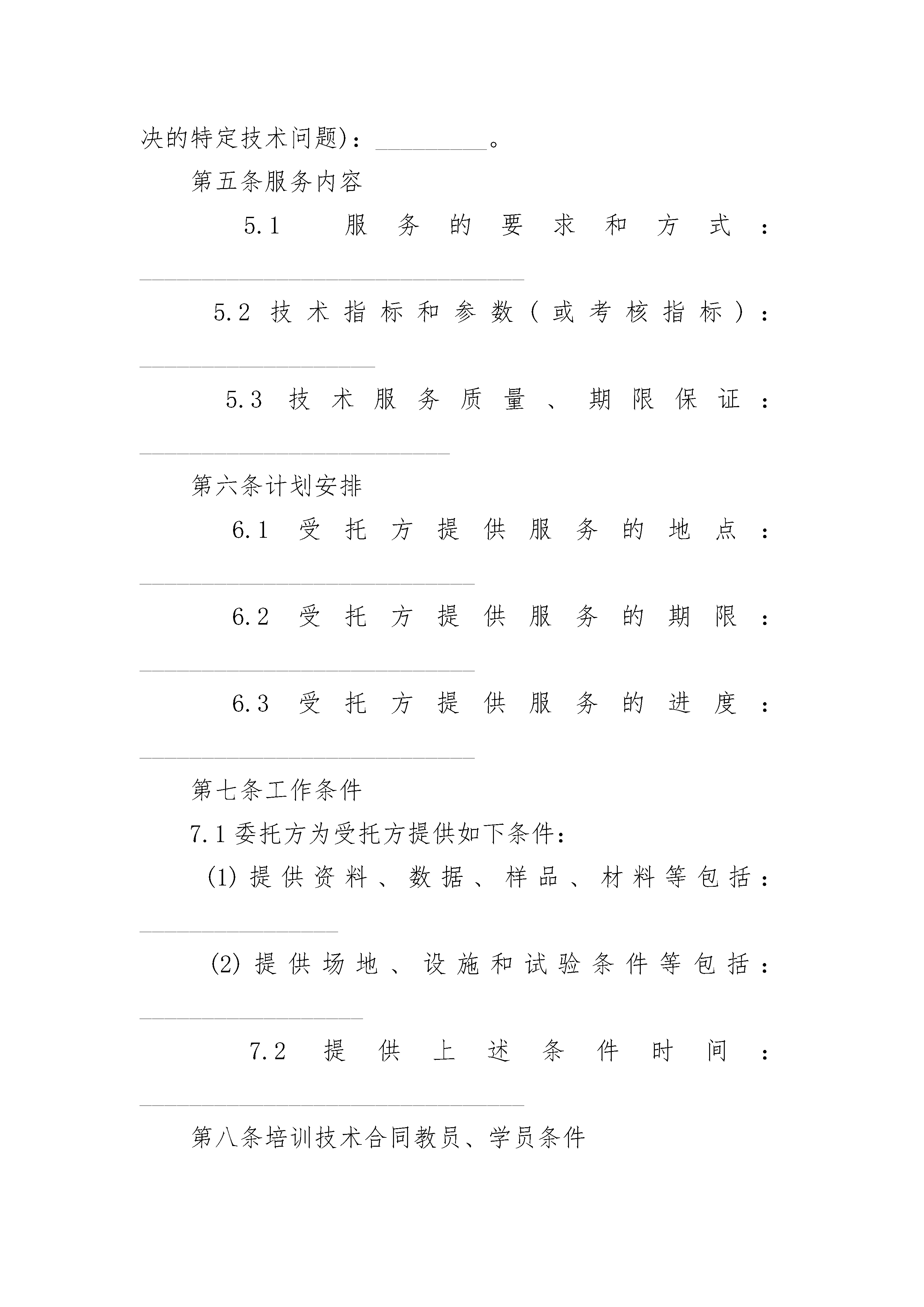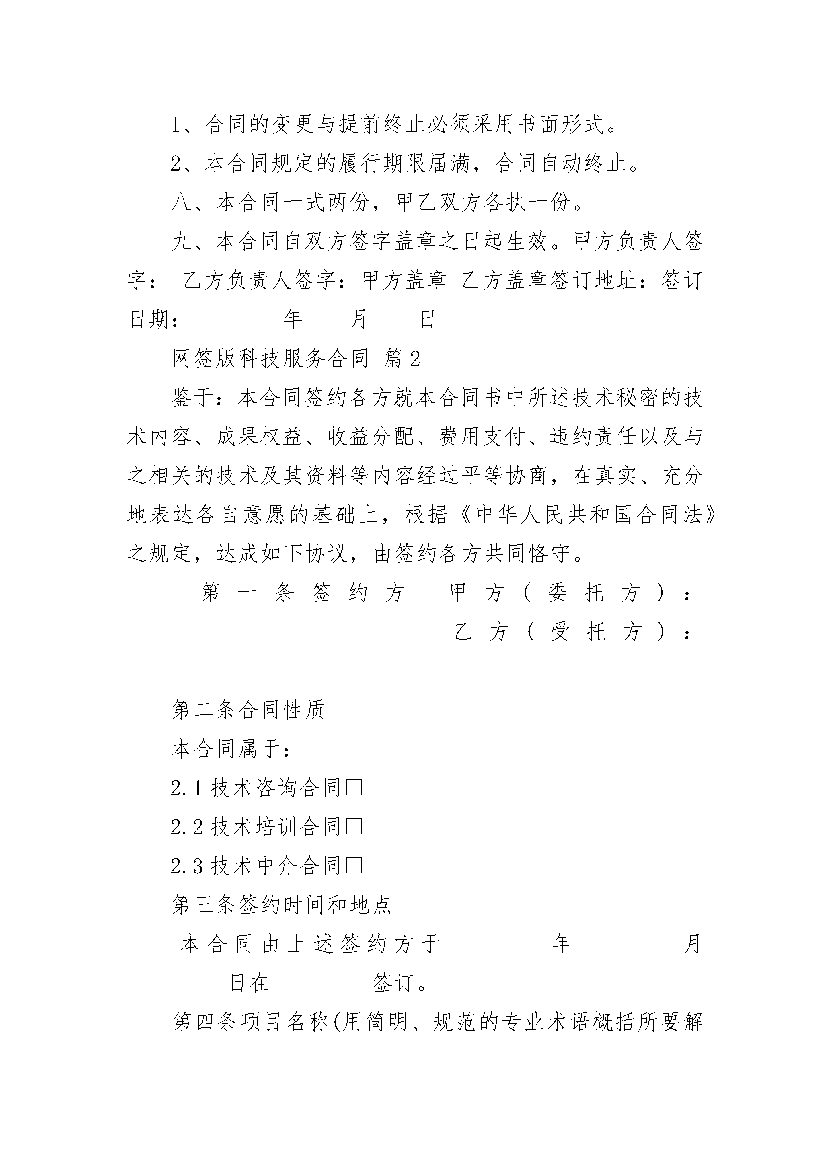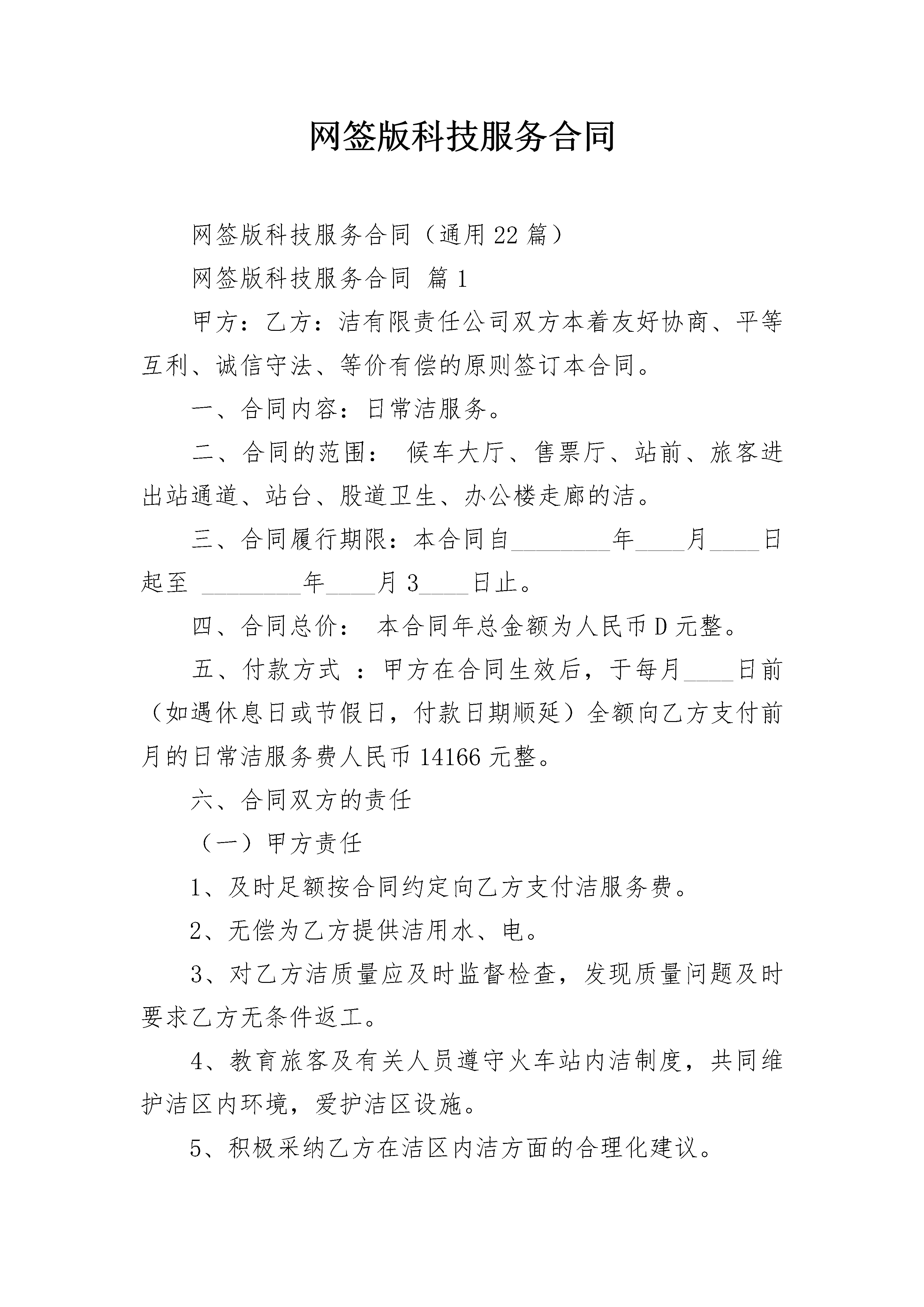 网签版科技服务合同网签版科技服务合同(通用22篇)网签版科技服务合同篇1甲方:乙方:洁有限责任公司双方本着友好协商、平等互利、诚信守法、等价有偿的原则签订本合同。一、合同内容:日常洁服务。二、合同的范围:候车大厅、售票厅、站前、旅客进出站通道、站台、股道卫生、办公楼走廊的洁。三、合同履行期限:本合同自________年____月____日起至________年____月3____日止。四、合同总价:本合同年总金额为人民币D元整。五、付款方式:甲方在合同生效后,于每月____日前(如遇休息日或节假日,付款日期顺延)全额向乙方支付前月的日常洁服务费人民币14166元整。六、合同双方的责任(一)甲方责任1、及时足额按合同约定向乙方支付洁服务费。2、无偿为乙方提供洁用水、电。3、对乙方洁质量应及时监督检查,发现质量问题及时要求乙方无条件返工。4、教育旅客及有关人员遵守火车站内洁制度,共同维护洁区内环境,爱护洁区设施。5、积极采纳乙方在洁区内洁方面的合理化建议。6、应为乙方提供临时存放垃圾的垃圾池。7、甲方应提前三天以书面形式通知乙方进驻现场。(二)乙方责任1、乙方收到甲方进驻现场的书面通知后,要积极做好准备,准时进驻现场。2、乙方洁人员在业务上受乙方和甲方双重领导。3、乙方洁人员证各项工作质量。4、乙方人员要统一着装,衣帽整洁,进入工作现场的出入证由甲方配发,遵守甲方各项内部规章制度,乙方不得在甲方服务区域内未经甲方同意擅自承揽业务。5、乙方员工在工作期间不得随意离开工作岗位,若乙方主管负责人不在作业现场,乙方临时负责人应接受甲方主管洁负责人的监督指导,并按甲方的洁工作标准进行检查。6、乙方教育员工爱护洁区内建筑物及室内外各种设施,注意节水节电。7、乙方作业应遵守甲方规定的时间要求。如有变更,双方协商解决。8、乙方在作业中应严格要求工作人员,不得擅自挪用甲方的物品。9、乙方应对工作人员进行人身安全教育,发生所有人身伤亡事故时乙方承担全部责任。乙方清理股道卫生时甲方派工作人员现场对乙方的工作人员进行人身安全防护及工作指挥。七、合同变更与终止1、合同的变更与提前终止必须采用书面形式。2、本合同规定的履行期限届满,合同自动终止。八、本合同一式两份,甲乙双方各执一份。九、本合同自双方签字盖章之日起生效。甲方负责人签字:乙方负责人签字:甲方盖章乙方盖章签订地址:签订日期:________年____月____日网签版科技服务合同篇2鉴于:本合同签约各方就本合同书中所述技术秘密的技术内容、成果权益、收益分配、费用支付、违约责任以及与之相关的技术及其资料等内容经过平等协商,在真实、充分地表达各自意愿的基础上,根据《中华人民共和国合同法》之规定,达成如下协议,由签约各方共同恪守。第一条签约方甲方(委托方):___________________________乙方(受托方):___________________________第二条合同性质本合同属于:2.1技术咨询合同□2.2技术培训合同□2.3技术中介合同□第三条签约时间和地点本合同由上述签约方于_________年_________月_________日在_________签订。第四条项目名称(用简明、规范的专业术语概括所要解决的特定技术问题):_________。第五条服务内容5.1服务的要求和方式:_______________________________5.2技术指标和参数(或考核指标):___________________5.3技术服务质量、期限保证:_________________________第六条计划安排6.1受托方提供服务的地点:___________________________6.2受托方提供服务的期限:___________________________6.3受托方提供服务的进度:___________________________第七条工作条件7.1委托方为受托方提供如下条件:(1)提供资料、数据、样品、材料等包括:________________(2)提供场地、设施和试验条件等包括:__________________7.2提供上述条件时间:_______________________________第八条培训技术合同教员、学员条件8.1教员资历和水平:_________________________________8.2学员人数和标准:_________________________________8.3教员、学员的食宿、交通、医疗费用的支付和安排:_________________第九条保密要求9.1保密范围:____________________9.2保密期限:_____________________第十条验收标准及方法10.1验收时