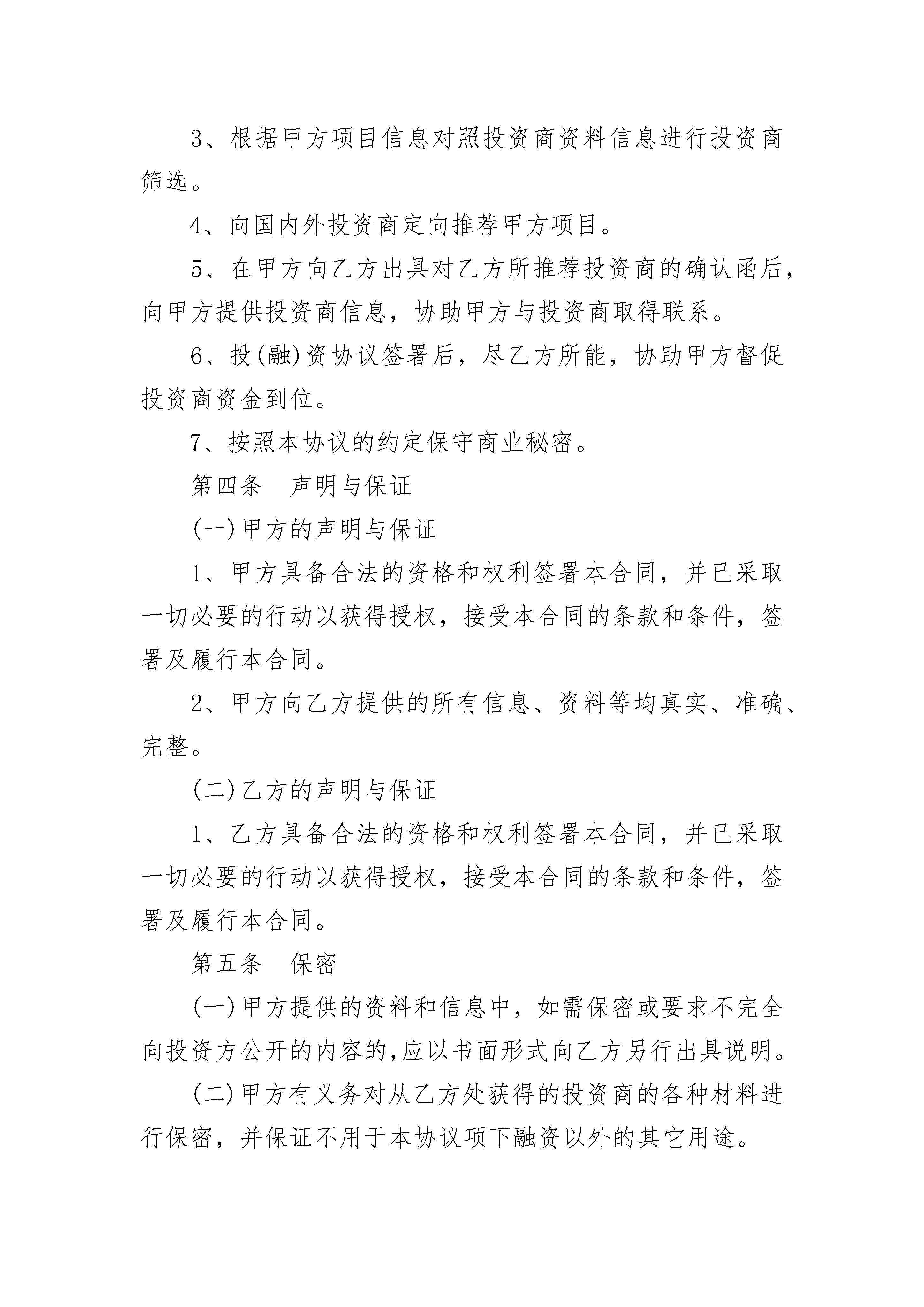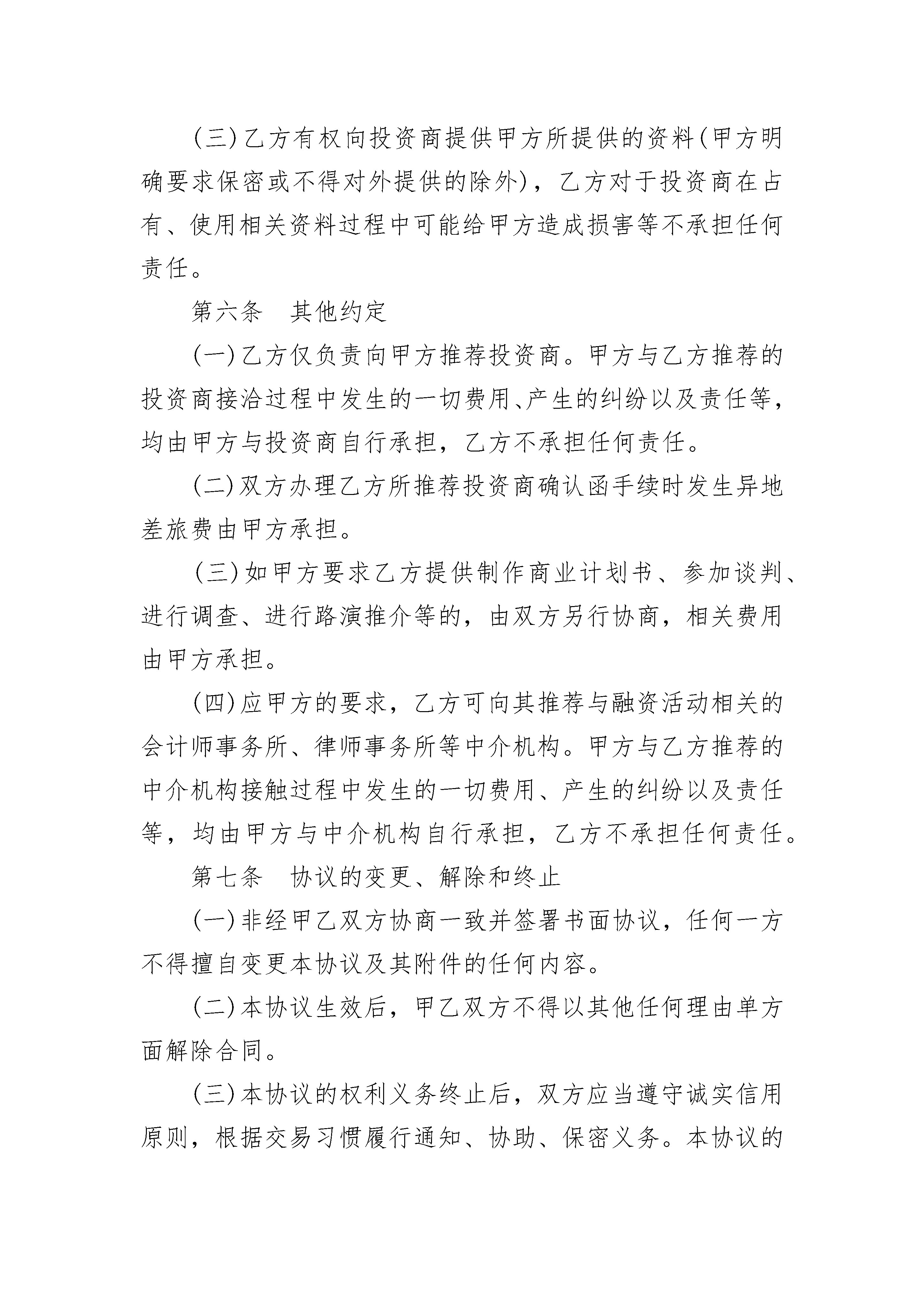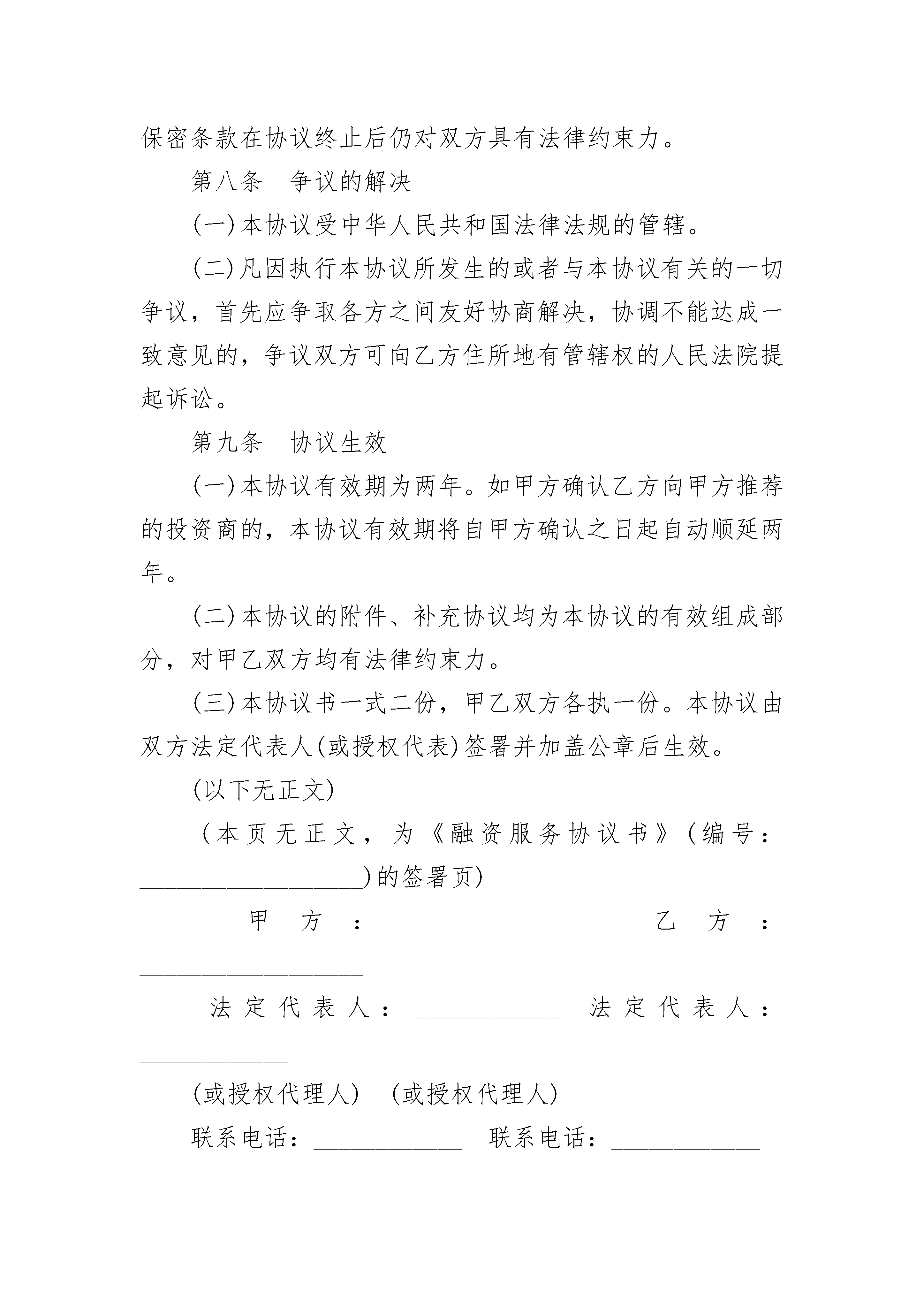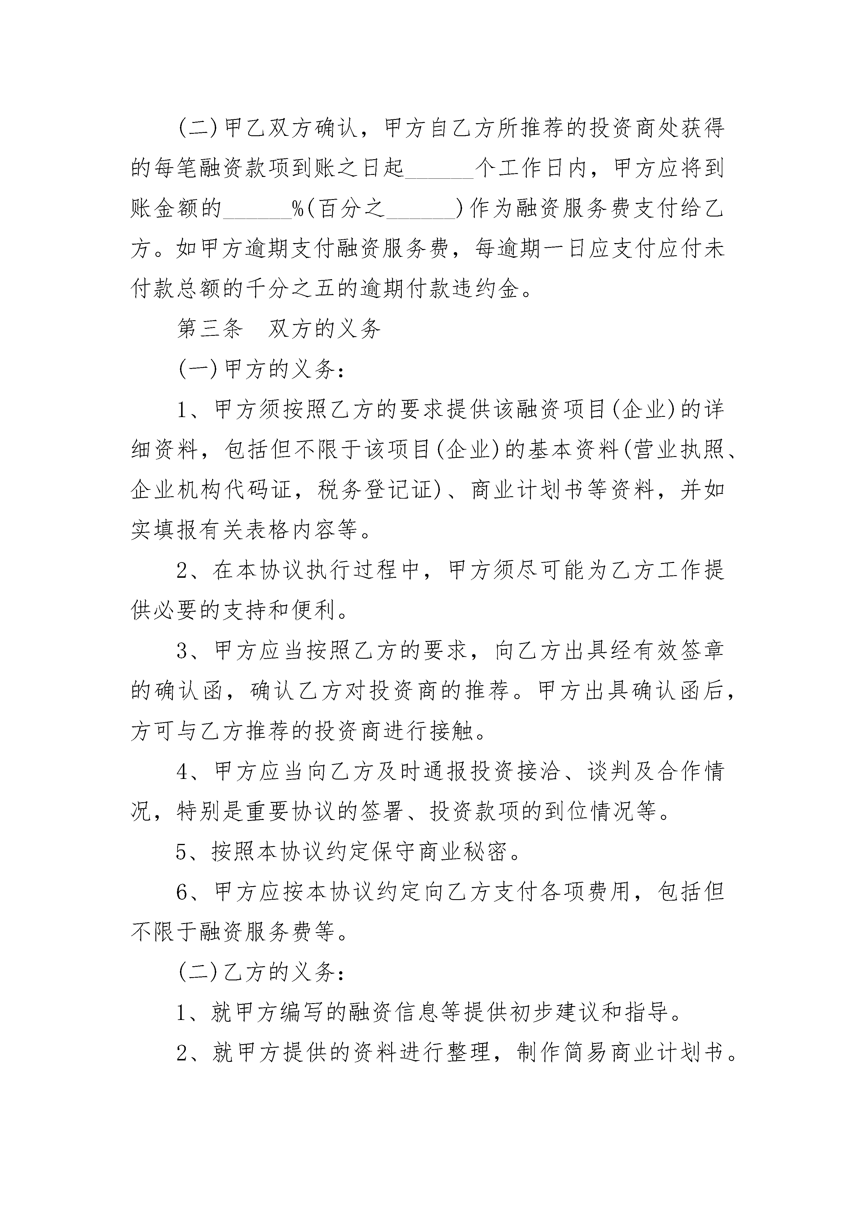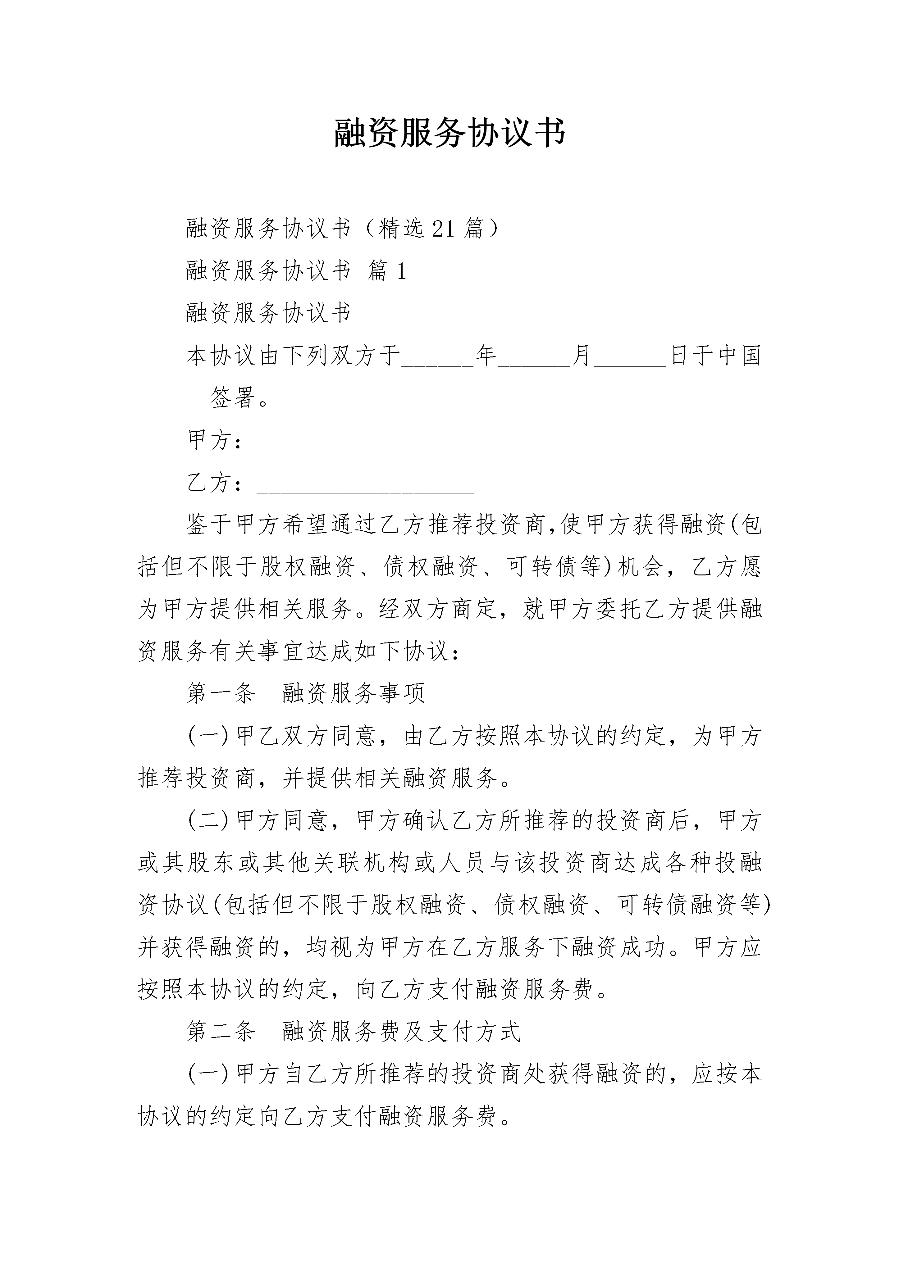融资服务协议书融资服务协议书(精选21篇)融资服务协议书篇1融资服务协议书本协议由下列双方于______年______月______日于中国______签署。甲方:__________________乙方:__________________鉴于甲方希望通过乙方推荐投资商,使甲方获得融资(包括但不限于股权融资、债权融资、可转债等)机会,乙方愿为甲方提供相关服务。经双方商定,就甲方委托乙方提供融资服务有关事宜达成如下协议:第一条融资服务事项(一)甲乙双方同意,由乙方按照本协议的约定,为甲方推荐投资商,并提供相关融资服务。(二)甲方同意,甲方确认乙方所推荐的投资商后,甲方或其股东或其他关联机构或人员与该投资商达成各种投融资协议(包括但不限于股权融资、债权融资、可转债融资等)并获得融资的,均视为甲方在乙方服务下融资成功。甲方应按照本协议的约定,向乙方支付融资服务费。第二条融资服务费及支付方式(一)甲方自乙方所推荐的投资商处获得融资的,应按本协议的约定向乙方支付融资服务费。(二)甲乙双方确认,甲方自乙方所推荐的投资商处获得的每笔融资款项到账之日起______个工作日内,甲方应将到账金额的______%(百分之______)作为融资服务费支付给乙方。如甲方逾期支付融资服务费,每逾期一日应支付应付未付款总额的千分之五的逾期付款违约金。第三条双方的义务(一)甲方的义务:1、甲方须按照乙方的要求提供该融资项目(企业)的详细资料,包括但不限于该项目(企业)的基本资料(营业执照、企业机构代码证,税务登记证)、商业计划书等资料,并如实填报有关表格内容等。2、在本协议执行过程中,甲方须尽可能为乙方工作提供必要的支持和便利。3、甲方应当按照乙方的要求,向乙方出具经有效签章的确认函,确认乙方对投资商的推荐。甲方出具确认函后,方可与乙方推荐的投资商进行接触。4、甲方应当向乙方及时通报投资接洽、谈判及合作情况,特别是重要协议的签署、投资款项的到位情况等。5、按照本协议约定保守商业秘密。6、甲方应按本协议约定向乙方支付各项费用,包括但不限于融资服务费等。(二)乙方的义务:1、就甲方编写的融资信息等提供初步建议和指导。2、就甲方提供的资料进行整理,制作简易商业计划书。3、根据甲方项目信息对照投资商资料信息进行投资商筛选。4、向国内外投资商定向推荐甲方项目。5、在甲方向乙方出具对乙方所推荐投资商的确认函后,向甲方提供投资商信息,协助甲方与投资商取得联系。6、投(融)资协议签署后,尽乙方所能,协助甲方督促投资商资金到位。7、按照本协议的约定保守商业秘密。第四条声明与保证(一)甲方的声明与保证1、甲方具备合法的资格和权利签署本合同,并已采取一切必要的行动以获得授权,接受本合同的条款和条件,签署及履行本合同。2、甲方向乙方提供的所有信息、资料等均真实、准确、完整。(二)乙方的声明与保证1、乙方具备合法的资格和权利签署本合同,并已采取一切必要的行动以获得授权,接受本合同的条款和条件,签署及履行本合同。第五条保密(一)甲方提供的资料和信息中,如需保密或要求不完全向投资方公开的内容的,应以书面形式向乙方另行出具说明。(二)甲方有义务对从乙方处获得的投资商的各种材料进行保密,并保证不用于本协议项下融资以外的其它用途。(三)乙方有权向投资商提供甲方所提供的资料(甲方明确要求保密或不得对外提供的除外),乙方对于投资商在占有、使用相关资料过程中可能给甲方造成损害等不承担任何责任。第六条其他约定(一)乙方仅负责向甲方推荐投资商。甲方与乙方推荐的投资商接洽过程中发生的一切费用、产生的纠纷以及责任等,均由甲方与投资商自行承担,乙方不承担任何责任。(二)双方办理乙方所推荐投资商确认函手续时发生异地差旅费由甲方承担。(三)如甲方要求乙方提供制作商业计划书、参加谈判、进行调查、进行路演推介等的,由双方另行协商,相关费用由甲方承担。(四)应甲方的要求,乙方可向其推荐与融资活动相关的会计师事务所、律师事务所等中介机构。甲方与乙方推荐的中介机构接触过程中发生的一切费用、产生的纠纷以及责任等,均由甲方与中介机构自行承担,乙方不承担任何责任。第七条协议的变更、解除和终止(一)非经甲乙双方协商一致并签署书面协议,任何一方不得擅自变更本协议及其附件的任何内容。(二)本协议生效后,甲乙双方不得以其他任何理由单方面解除合同。(三)本协议的权利义务终止后,双方应当遵守诚实信用原则,根据交易习惯履行通知、协助、保密义务。本协议的保密条款在协议终止后仍对双方具有法律约束力。第八条争议的解决(一)本协议受中华人民共和国法律法规的管辖。(二)凡因执行本协议所发生的或者与本协议有关的一切争议,首先应争取各方之间友好协商解决,协调不能达成一致意见的,争议双方可向乙方住所地有管辖权的人民法院提起诉讼。第九条