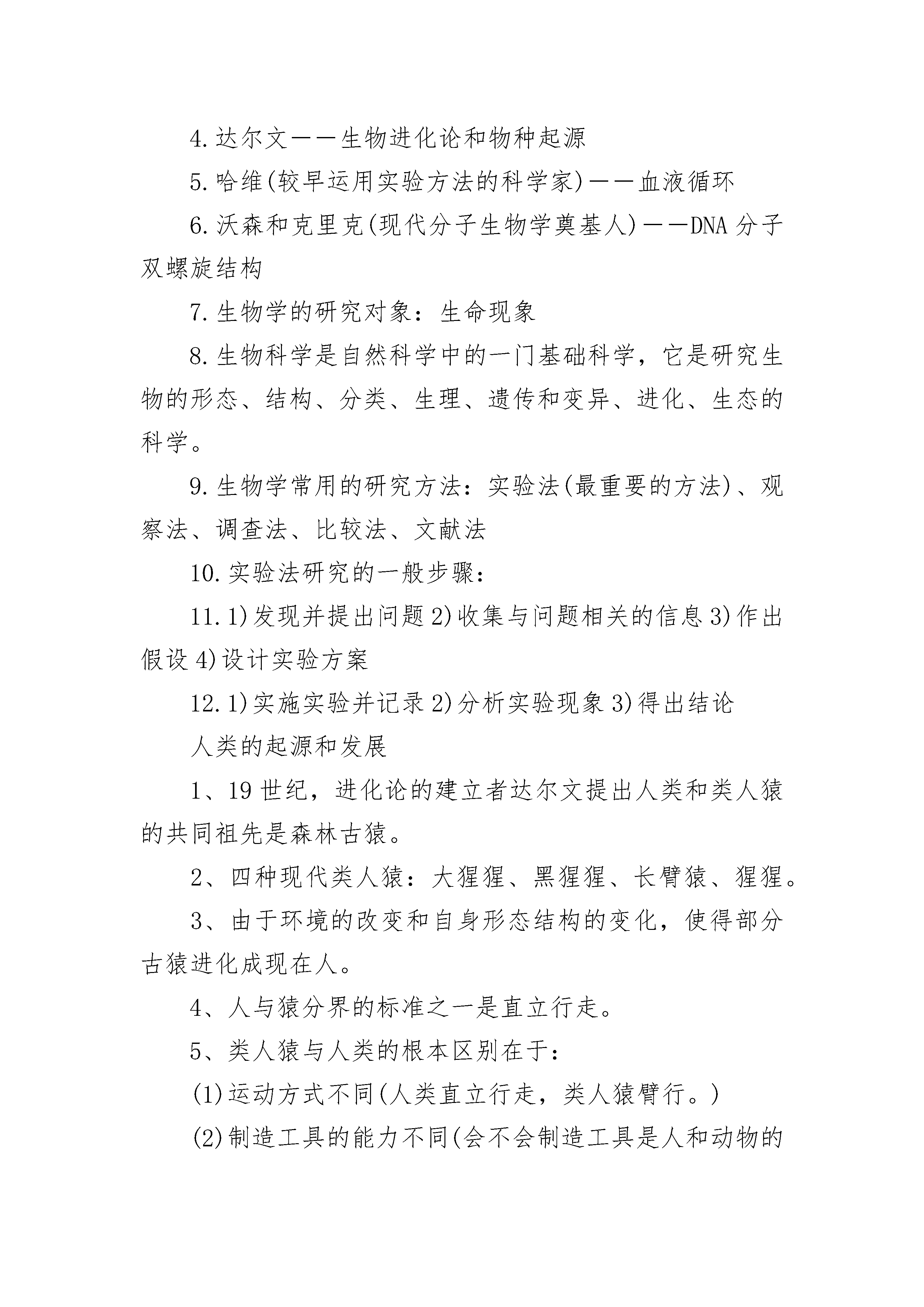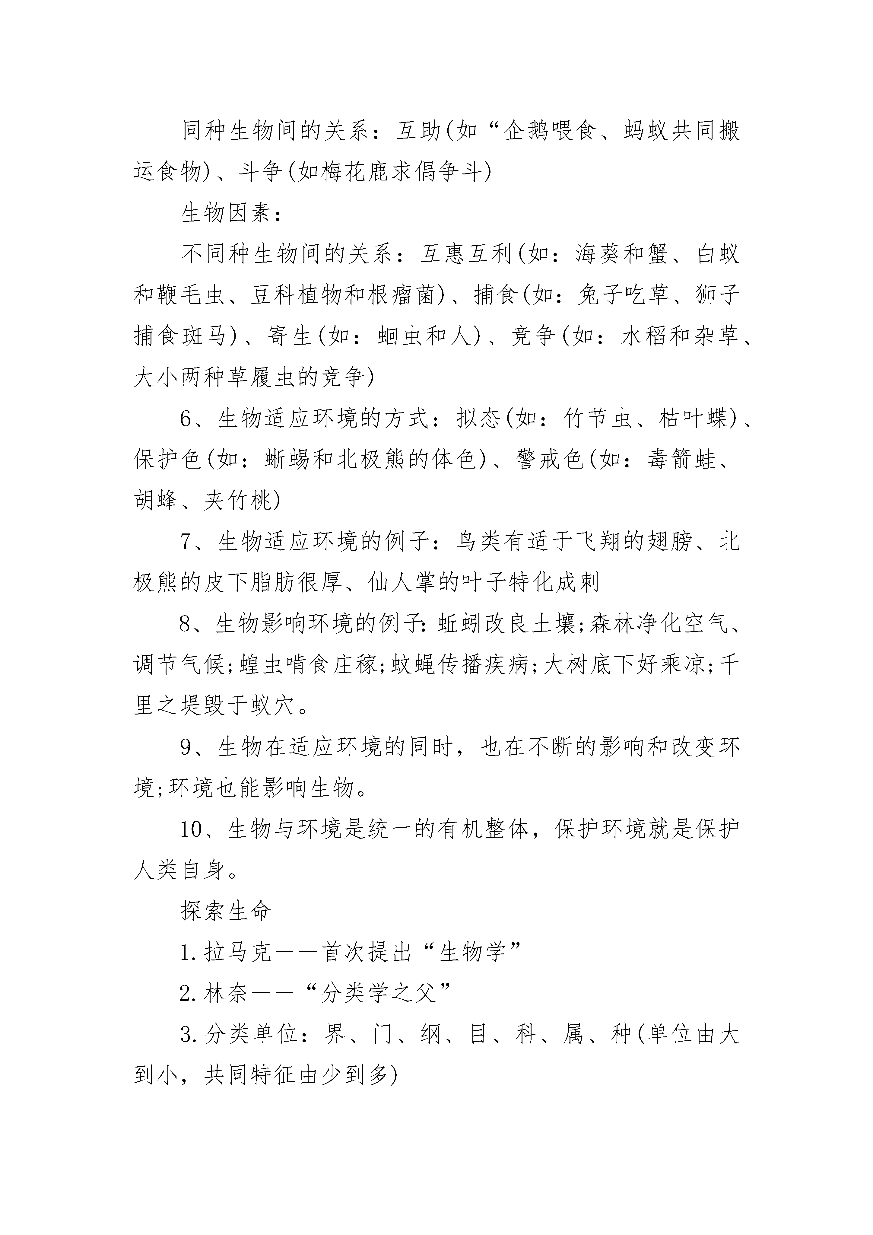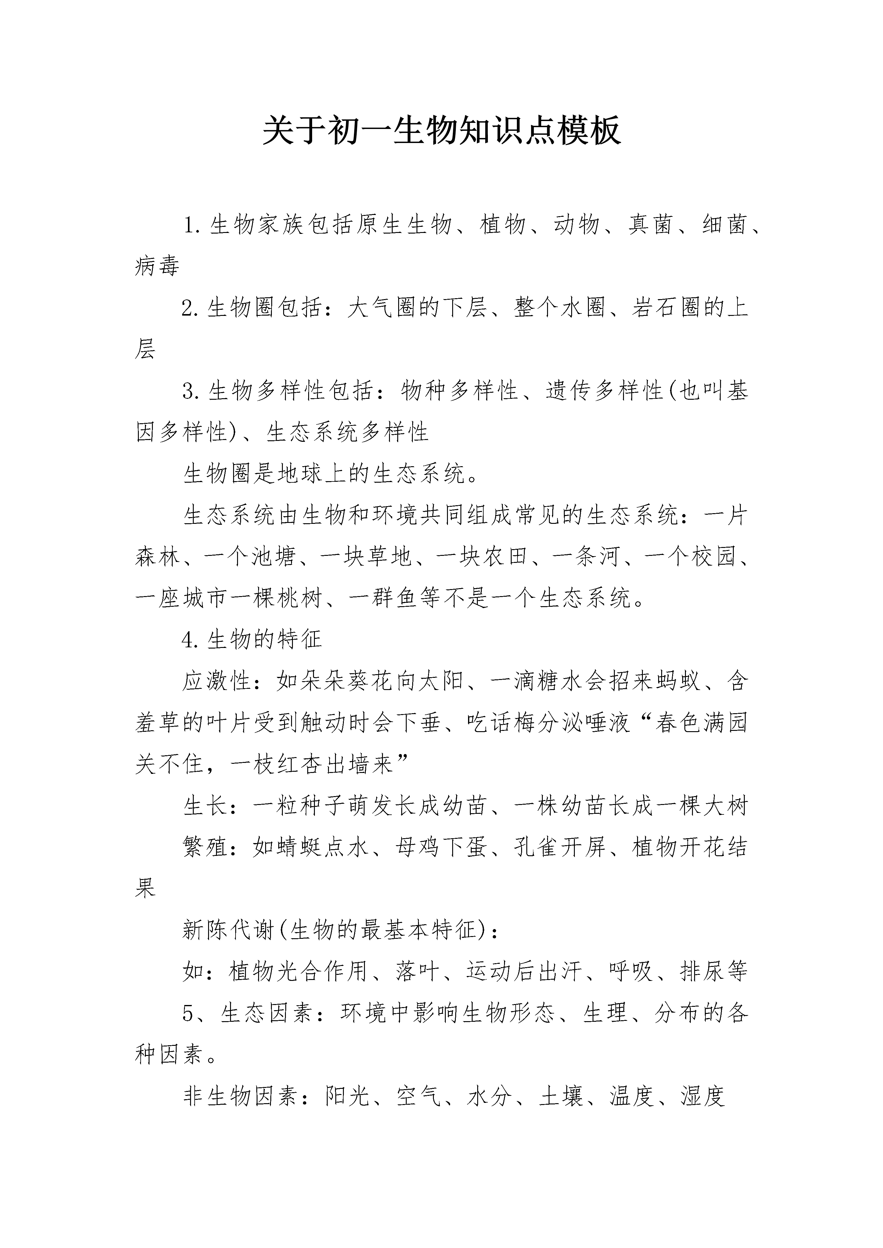 关于初一生物知识点模板1.生物家族包括原生生物、植物、动物、真菌、细菌、病毒2.生物圈包括:大气圈的下层、整个水圈、岩石圈的上层3.生物多样性包括:物种多样性、遗传多样性(也叫基因多样性)、生态系统多样性生物圈是地球上的生态系统。生态系统由生物和环境共同组成常见的生态系统:一片森林、一个池塘、一块草地、一块农田、一条河、一个校园、一座城市一棵桃树、一群鱼等不是一个生态系统。4.生物的特征应激性:如朵朵葵花向太阳、一滴糖水会招来蚂蚁、含羞草的叶片受到触动时会下垂、吃话梅分泌唾液“春色满园关不住,一枝红杏出墙来”生长:一粒种子萌发长成幼苗、一株幼苗长成一棵大树繁殖:如蜻蜓点水、母鸡下蛋、孔雀开屏、植物开花结果新陈代谢(生物的最基本特征):如:植物光合作用、落叶、运动后出汗、呼吸、排尿等5、生态因素:环境中影响生物形态、生理、分布的各种因素。非生物因素:阳光、空气、水分、土壤、温度、湿度同种生物间的关系:互助(如“企鹅喂食、蚂蚁共同搬运食物)、斗争(如梅花鹿求偶争斗)生物因素:不同种生物间的关系:互惠互利(如:海葵和蟹、白蚁和鞭毛虫、豆科植物和根瘤菌)、捕食(如:兔子吃草、狮子捕食斑马)、寄生(如:蛔虫和人)、竞争(如:水稻和杂草、大小两种草履虫的竞争)6、生物适应环境的方式:拟态(如:竹节虫、枯叶蝶)、保护色(如:蜥蜴和北极熊的体色)、警戒色(如:毒箭蛙、胡蜂、夹竹桃)7、生物适应环境的例子:鸟类有适于飞翔的翅膀、北极熊的皮下脂肪很厚、仙人掌的叶子特化成刺8、生物影响环境的例子:蚯蚓改良土壤;森林净化空气、调节气候;蝗虫啃食庄稼;蚊蝇传播疾病;大树底下好乘凉;千里之堤毁于蚁穴。9、生物在适应环境的同时,也在不断的影响和改变环境;环境也能影响生物。10、生物与环境是统一的有机整体,保护环境就是保护人类自身。探索生命1.拉马克――首次提出“生物学”2.林奈――“分类学之父”3.分类单位:界、门、纲、目、科、属、种(单位由大到小,共同特征由少到多)4.达尔文――生物进化论和物种起源5.哈维(较早运用实验方法的科学家)――血液循环6.沃森和克里克(现代分子生物学奠基人)――DNA分子双螺旋结构7.生物学的研究对象:生命现象8.生物科学是自然科学中的一门基础科学,它是研究生物的形态、结构、分类、生理、遗传和变异、进化、生态的科学。9.生物学常用的研究方法:实验法(最重要的方法)、观察法、调查法、比较法、文献法10.实验法研究的一般步骤:11.1)发现并提出问题2)收集与问题相关的信息3)作出假设4)设计实验方案12.1)实施实验并记录2)分析实验现象3)得出结论人类的起源和发展1、19世纪,进化论的建立者达尔文提出人类和类人猿的共同祖先是森林古猿。2、四种现代类人猿:大猩猩、黑猩猩、长臂猿、猩猩。3、由于环境的改变和自身形态结构的变化,使得部分古猿进化成现在人。4、人与猿分界的标准之一是直立行走。5、类人猿与人类的根本区别在于:(1)运动方式不同(人类直立行走,类人猿臂行。)(2)制造工具的能力不同(会不会制造工具是人和动物的根本区别。)(3)脑的发育程度不同(人有很强的思维能力和语言、文学交流能力。)人的生殖生殖过程1、精子和卵细胞结合形成受精卵,受精的场所是输卵管。2、每个人的生命是从受精卵开始的。3、胚胎经过8周左右形成胎儿。胎儿在38周左右发育成熟,成熟的胎儿从母体的阴道产出的过程称为分娩。4、胚胎发育的场所是子宫,通过胎盘和脐带从母体获得所需的营养物质和氧气。5、试管婴儿是指利用人工方法,让卵细胞和精子在体外受精,受精卵在体外形成早期胚胎后再植入子宫,胚胎在子宫内完成发育。