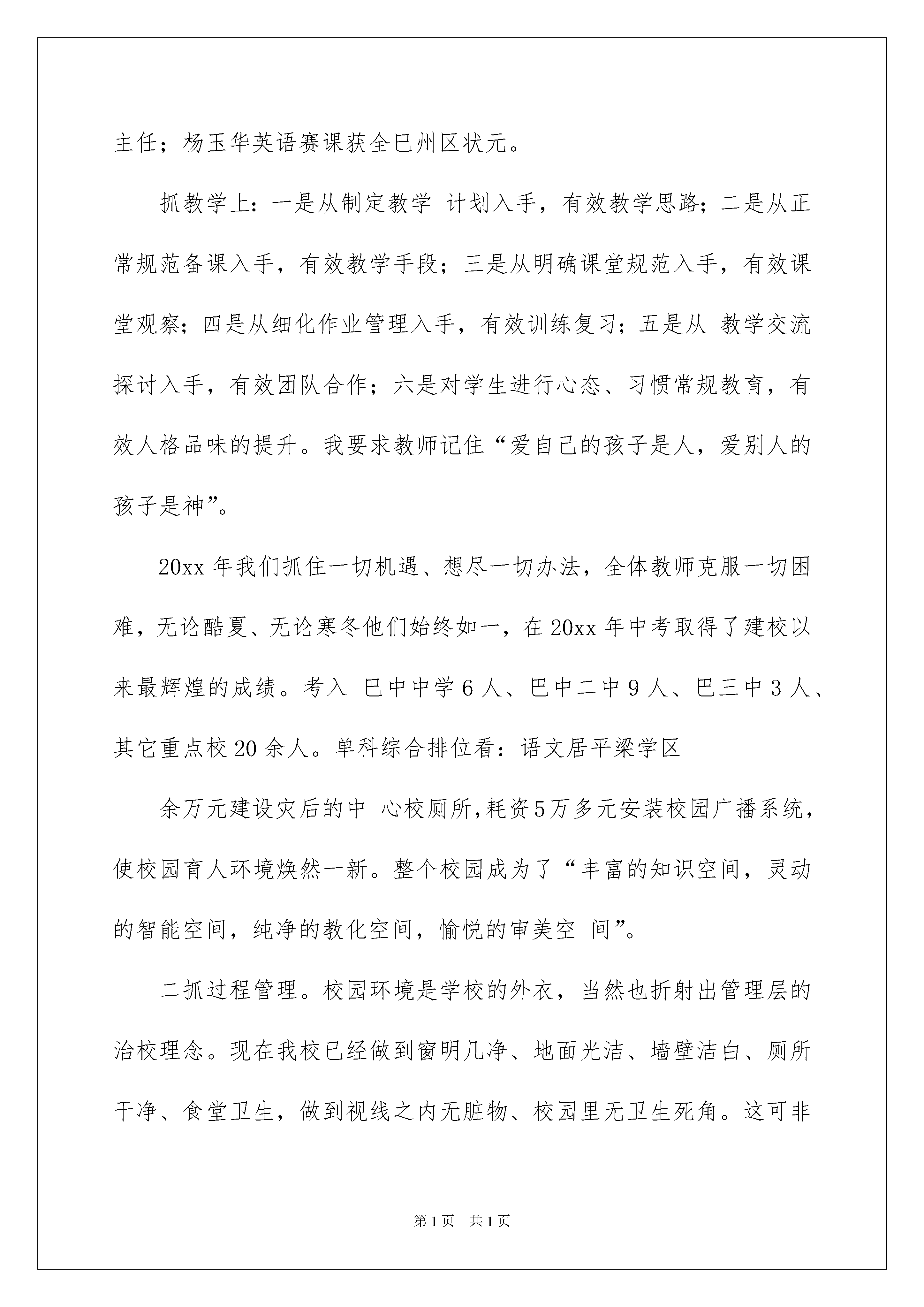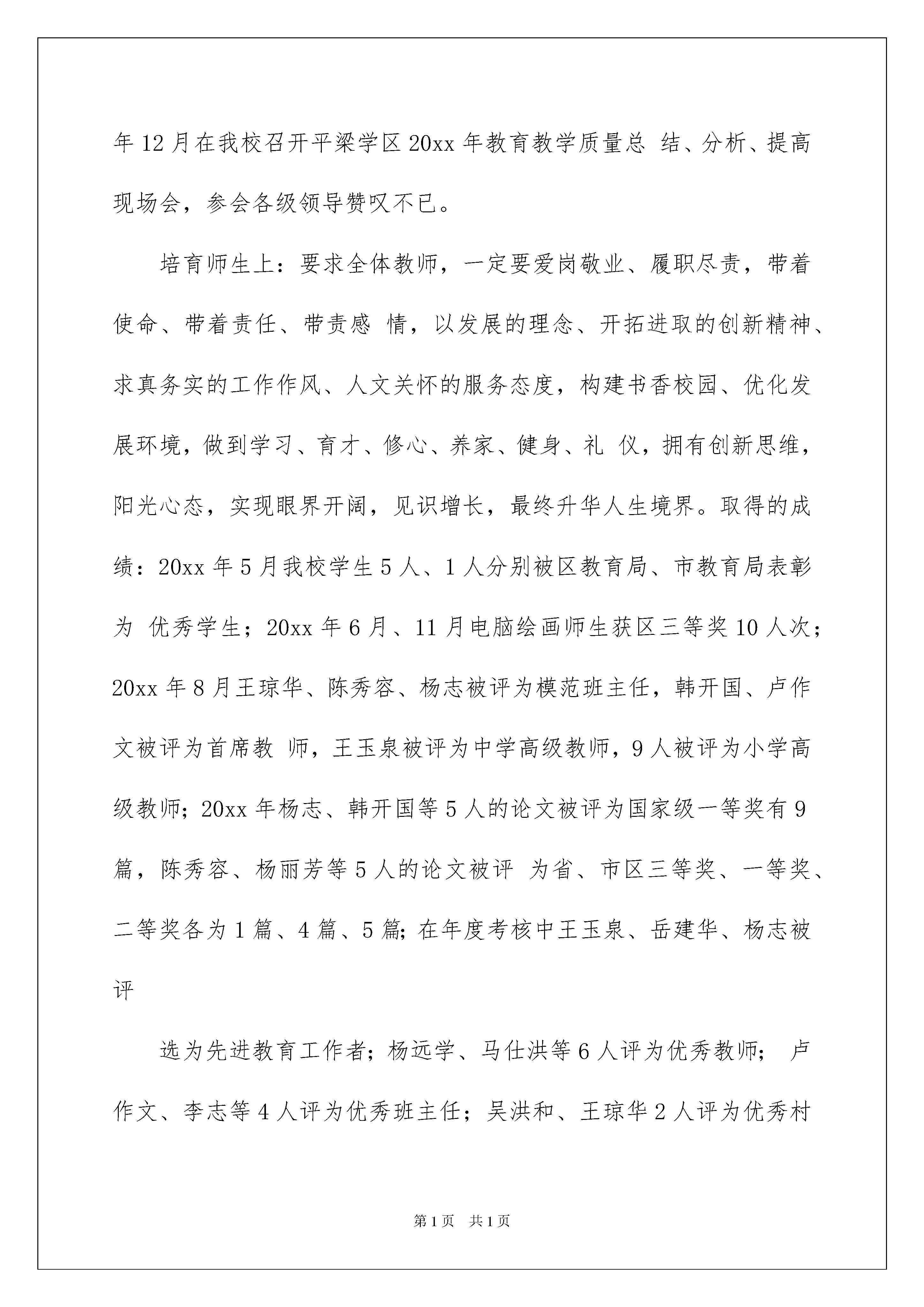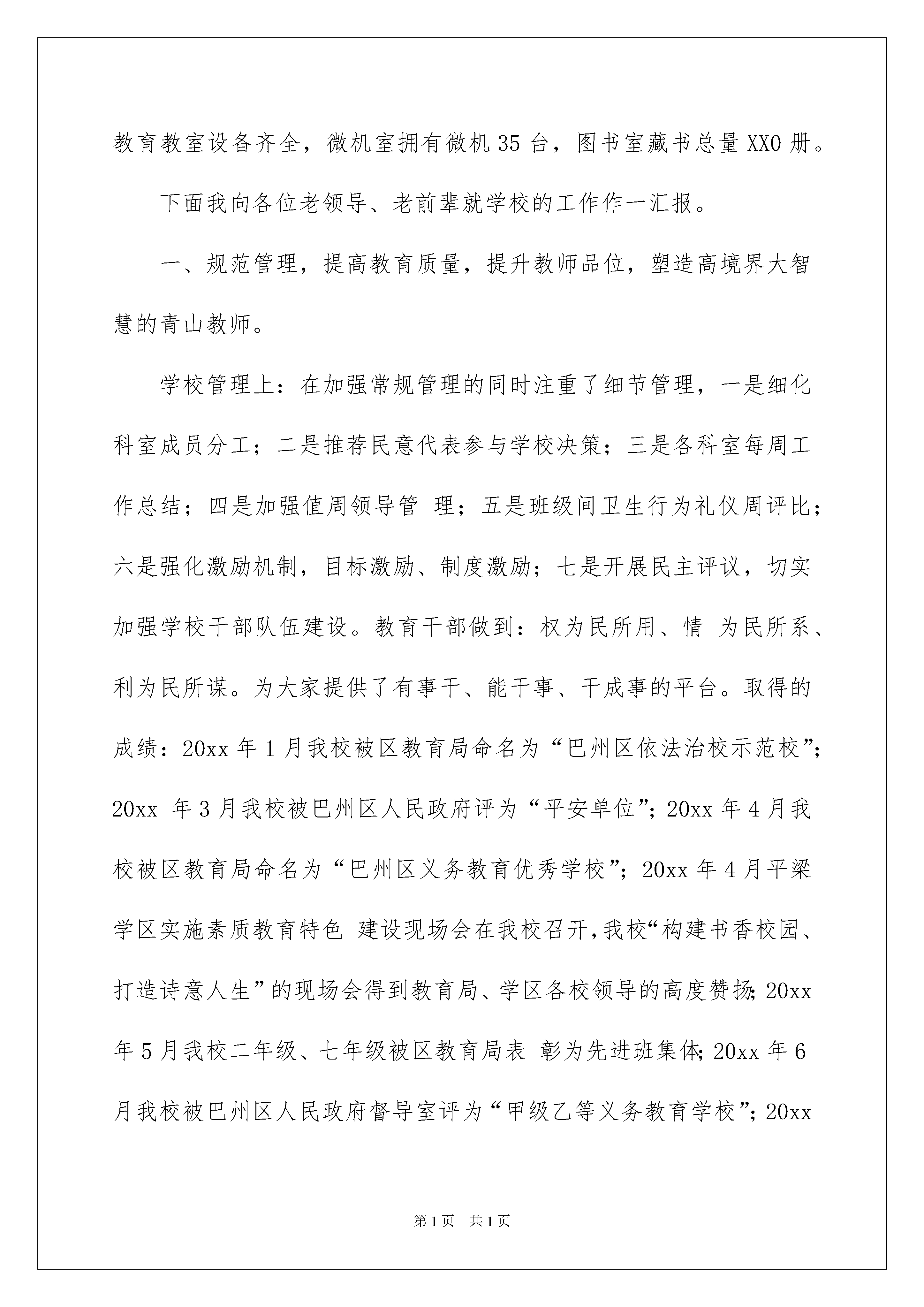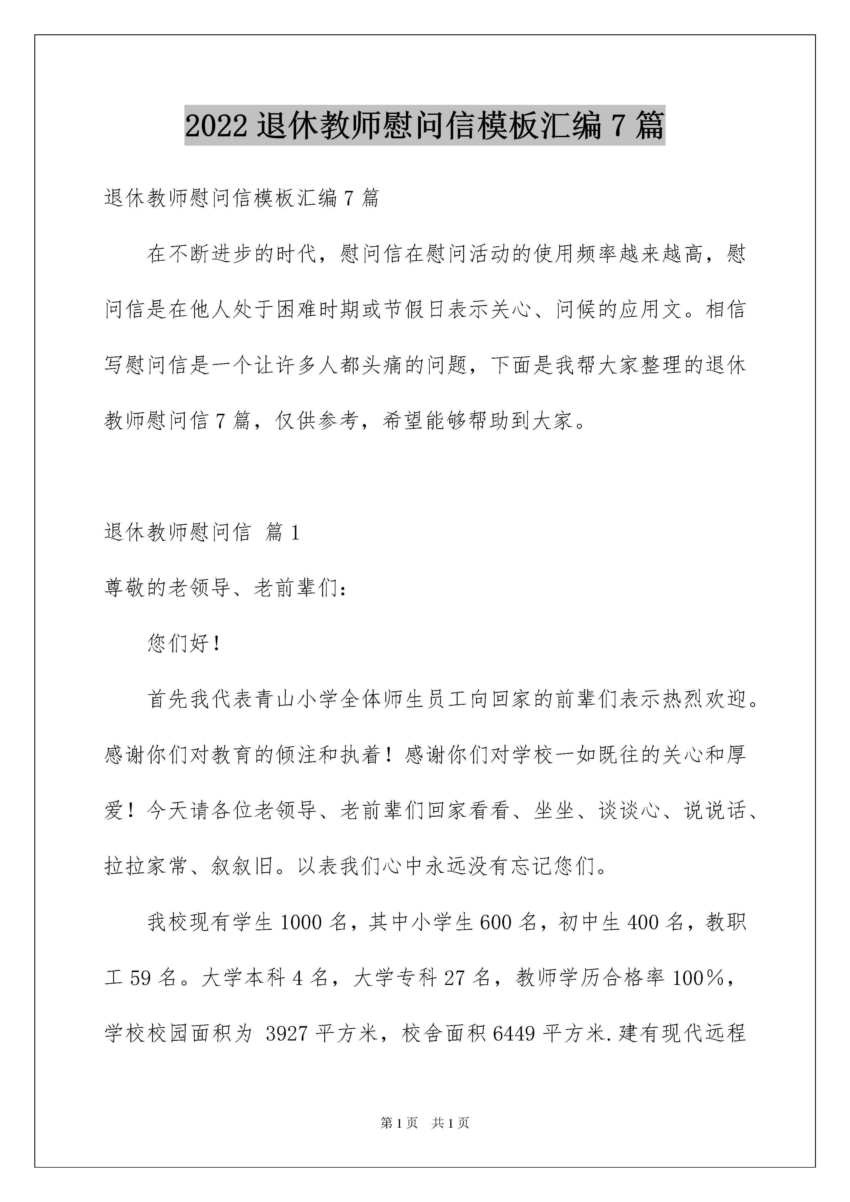 2022退休教师慰问信模板汇编7篇退休教师慰问信模板汇编7篇在不断进步的时代,慰问信在慰问活动的使用频率越来越高,慰问信是在他人处于困难时期或节假日表示关心、问候的应用文。相信写慰问信是一个让许多人都头痛的问题,下面是我帮大家整理的退休教师慰问信7篇,仅供参考,希望能够帮助到大家。退休教师慰问信篇1尊敬的老领导、老前辈们:您们好!首先我代表青山小学全体师生员工向回家的前辈们表示热烈欢迎。感谢你们对教育的倾注和执着!感谢你们对学校一如既往的关心和厚爱!今天请各位老领导、老前辈们回家看看、坐坐、谈谈心、说说话、拉拉家常、叙叙旧。以表我们心中永远没有忘记您们。我校现有学生1000名,其中小学生600名,初中生400名,教职工59名。大学本科4名,大学专科27名,教师学历合格率100%,学校校园面积为3927平方米,校舍面积6449平方米.建有现代远程教育教室设备齐全,微机室拥有微机35台,图书室藏书总量XX0册。下面我向各位老领导、老前辈就学校的工作作一汇报。一、规范管理,提高教育质量,提升教师品位,塑造高境界大智慧的青山教师。学校管理上:在加强常规管理的同时注重了细节管理,一是细化科室成员分工;二是推荐民意代表参与学校决策;三是各科室每周工作总结;四是加强值周领导管理;五是班级间卫生行为礼仪周评比;六是强化激励机制,目标激励、制度激励;七是开展民主评议,切实加强学校干部队伍建设。教育干部做到:权为民所用、情为民所系、利为民所谋。为大家提供了有事干、能干事、干成事的平台。取得的成绩:20xx年1月我校被区教育局命名为“巴州区依法治校示范校”;20xx年3月我校被巴州区人民政府评为“平安单位”;20xx年4月我校被区教育局命名为“巴州区义务教育优秀学校”;20xx年4月平梁学区实施素质教育特色建设现场会在我校召开,我校“构建书香校园、打造诗意人生”的现场会得到教育局、学区各校领导的高度赞扬;20xx年5月我校二年级、七年级被区教育局表彰为先进班集体;20xx年6月我校被巴州区人民政府督导室评为“甲级乙等义务教育学校”;20xx年12月在我校召开平梁学区20xx年教育教学质量总结、分析、提高现场会,参会各级领导赞叹不已。培育师生上:要求全体教师,一定要爱岗敬业、履职尽责,带着使命、带着责任、带责感情,以发展的理念、开拓进取的创新精神、求真务实的工作作风、人文关怀的服务态度,构建书香校园、优化发展环境,做到学习、育才、修心、养家、健身、礼仪,拥有创新思维,阳光心态,实现眼界开阔,见识增长,最终升华人生境界。取得的成绩:20xx年5月我校学生5人、1人分别被区教育局、市教育局表彰为优秀学生;20xx年6月、11月电脑绘画师生获区三等奖10人次;20xx年8月王琼华、陈秀容、杨志被评为模范班主任,韩开国、卢作文被评为首席教师,王玉泉被评为中学高级教师,9人被评为小学高级教师;20xx年杨志、韩开国等5人的论文被评为国家级一等奖有9篇,陈秀容、杨丽芳等5人的论文被评为省、市区三等奖、一等奖、二等奖各为1篇、4篇、5篇;在年度考核中王玉泉、岳建华、杨志被评选为先进教育工作者;杨远学、马仕洪等6人评为优秀教师;卢作文、李志等4人评为优秀班主任;吴洪和、王琼华2人评为优秀村主任;杨玉华英语赛课获全巴州区状元。抓教学上:一是从制定教学计划入手,有效教学思路;二是从正常规范备课入手,有效教学手段;三是从明确课堂规范入手,有效课堂观察;四是从细化作业管理入手,有效训练复习;五是从教学交流探讨入手,有效团队合作;六是对学生进行心态、习惯常规教育,有效人格品味的提升。我要求教师记住“爱自己的孩子是人,爱别人的孩子是神”。20xx年我们抓住一切机遇、想尽一切办法,全体教师克服一切困难,无论酷夏、无论寒冬他们始终如一,在20xx年中考取得了建校以来最辉煌的成绩。考入巴中中学6人、巴中二中9人、巴三中3人、其它重点校20余人。单科综合排位看:语文居平梁学区余万元建设灾后的中心校厕所,耗资5万多元安装校园广播系统,使校园育人环境焕然一新。整个校园成为了“丰富的知识空间,灵动的智能空间,纯净的教化空间,愉悦的审美空间”。二抓过程管理。校园环境是学校的外衣,当然也折射出管理层的治校理念。现在我校已经做到窗明几净、地面光洁、墙壁洁白、厕所干净、食堂卫生,做到视线之内无脏物、校园里无卫生死角。这可非一日之功全靠领导重视,师生动手,值周监督。我们主要做了以下几项工作:抓教师。首先要求教师起好带头、表率、榜样作用。提倡“弯腰精神”,随时拾起地面上的点滴垃圾,扔进垃圾筒里,确保地面的干净,管住自己的嘴,不说粗话脏话,不随地吐痰