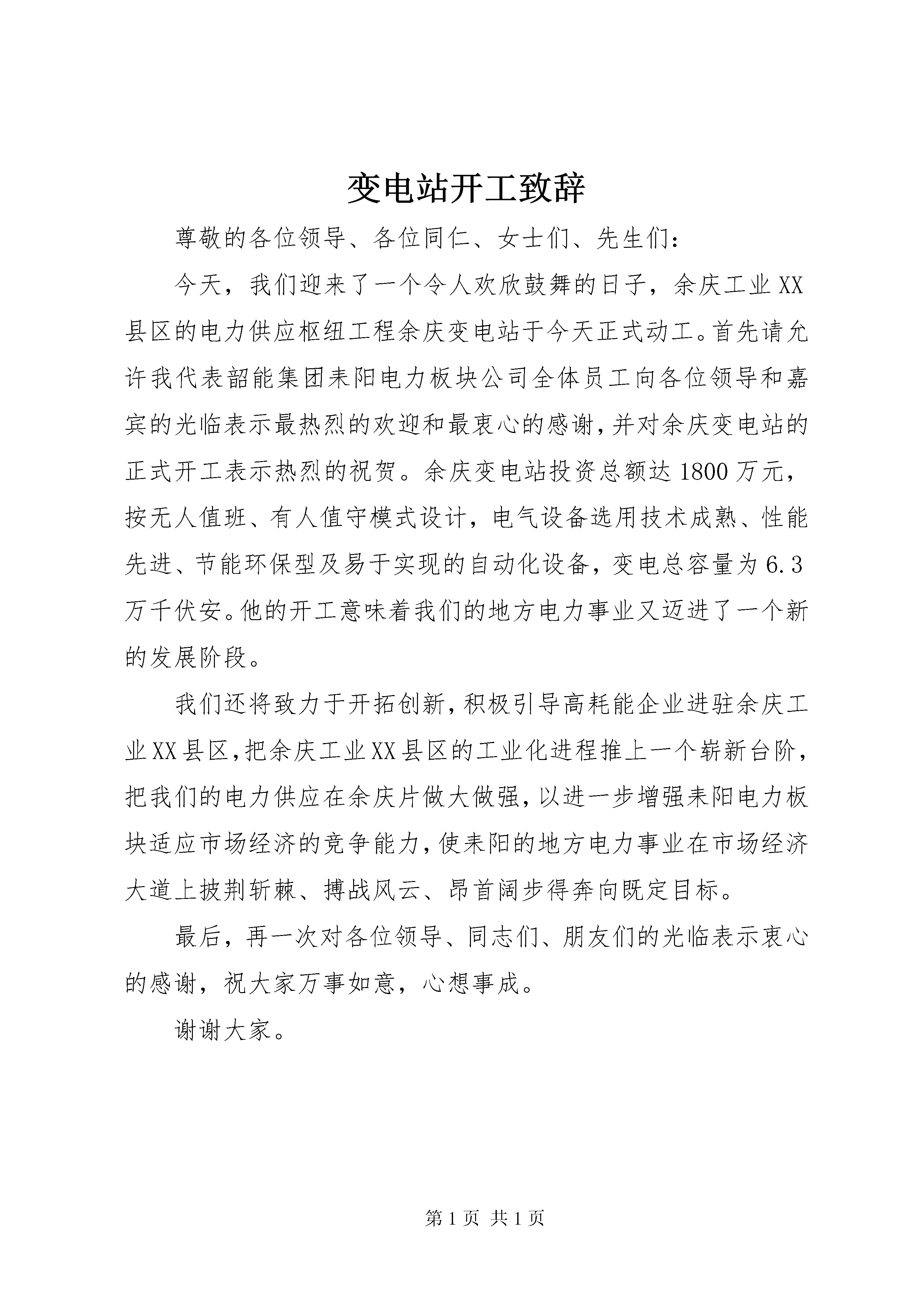变电站开工致辞尊敬的各位领导、各位同仁、女士们、先生们:今天,我们迎来了一个令人欢欣鼓舞的日子,余庆工业XX县区的电力供应枢纽工程余庆变电站于今天正式动工。首先请允许我代表韶能集团耒阳电力板块公司全体员工向各位领导和嘉宾的光临表示最热烈的欢迎和最衷心的感谢,并对余庆变电站的正式开工表示热烈的祝贺。余庆变电站投资总额达1800万元,按无人值班、有人值守模式设计,电气设备选用技术成熟、性能先进、节能环保型及易于实现的自动化设备,变电总容量为6.3万千伏安。他的开工意味着我们的地方电力事业又迈进了一个新的发展阶段。我们还将致力于开拓创新,积极引导高耗能企业进驻余庆工业XX县区,把余庆工业XX县区的工业化进程推上一个崭新台阶,把我们的电力供应在余庆片做大做强,以进一步增强耒阳电力板块适应市场经济的竞争能力,使耒阳的地方电力事业在市场经济大道上披荆斩棘、搏战风云、昂首阔步得奔向既定目标。最后,再一次对各位领导、同志们、朋友们的光临表示衷心的感谢,祝大家万事如意,心想事成。谢谢大家。