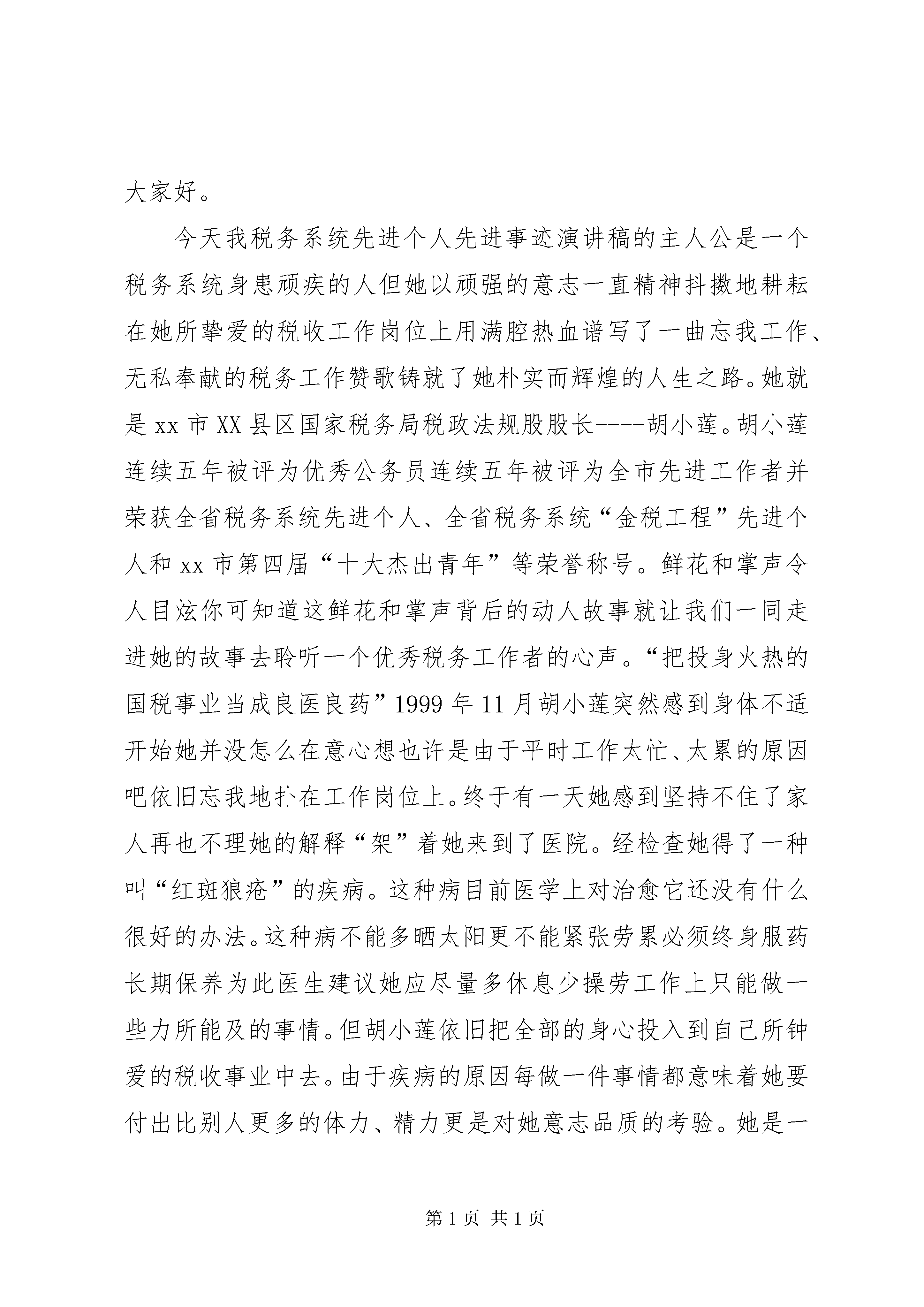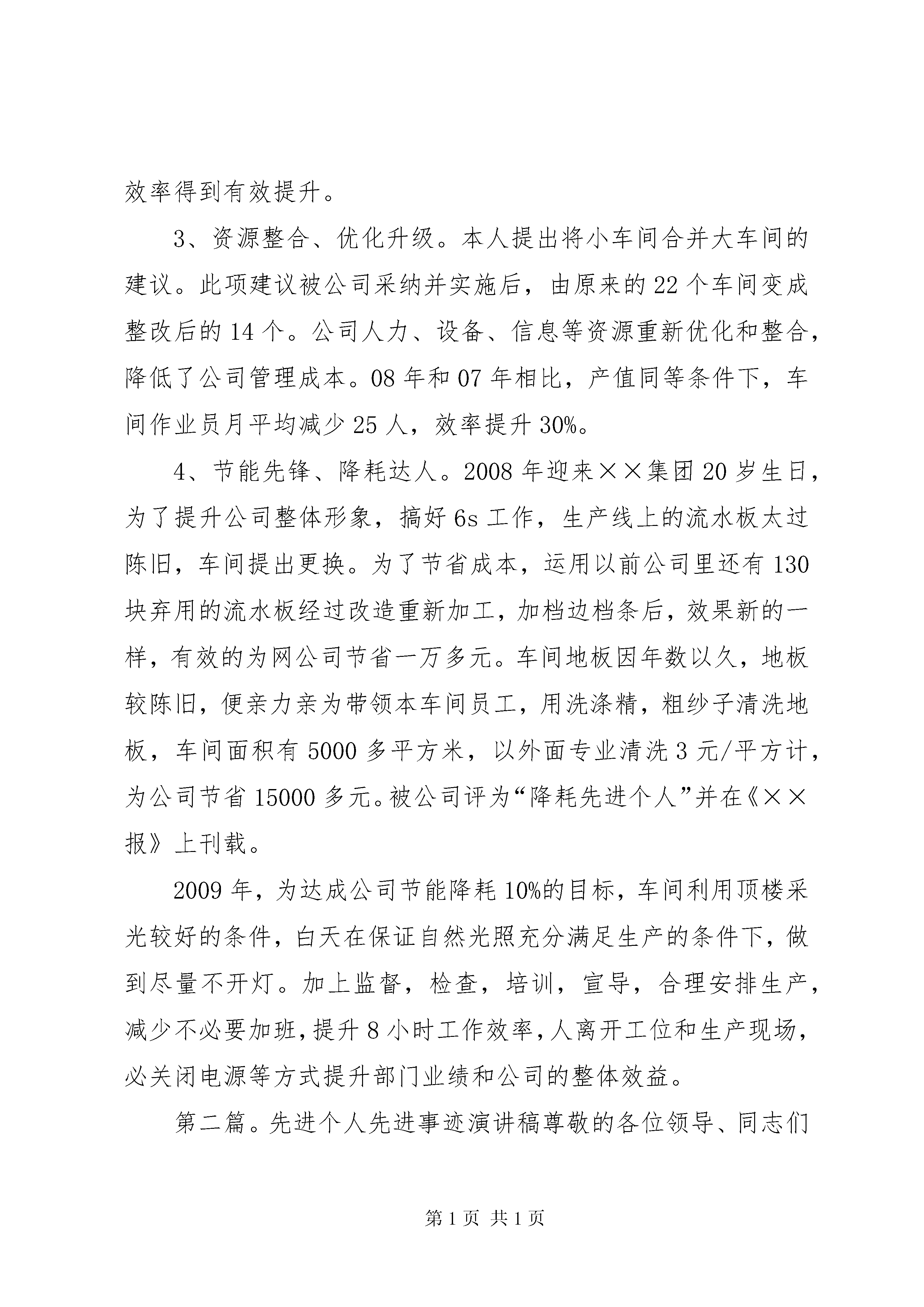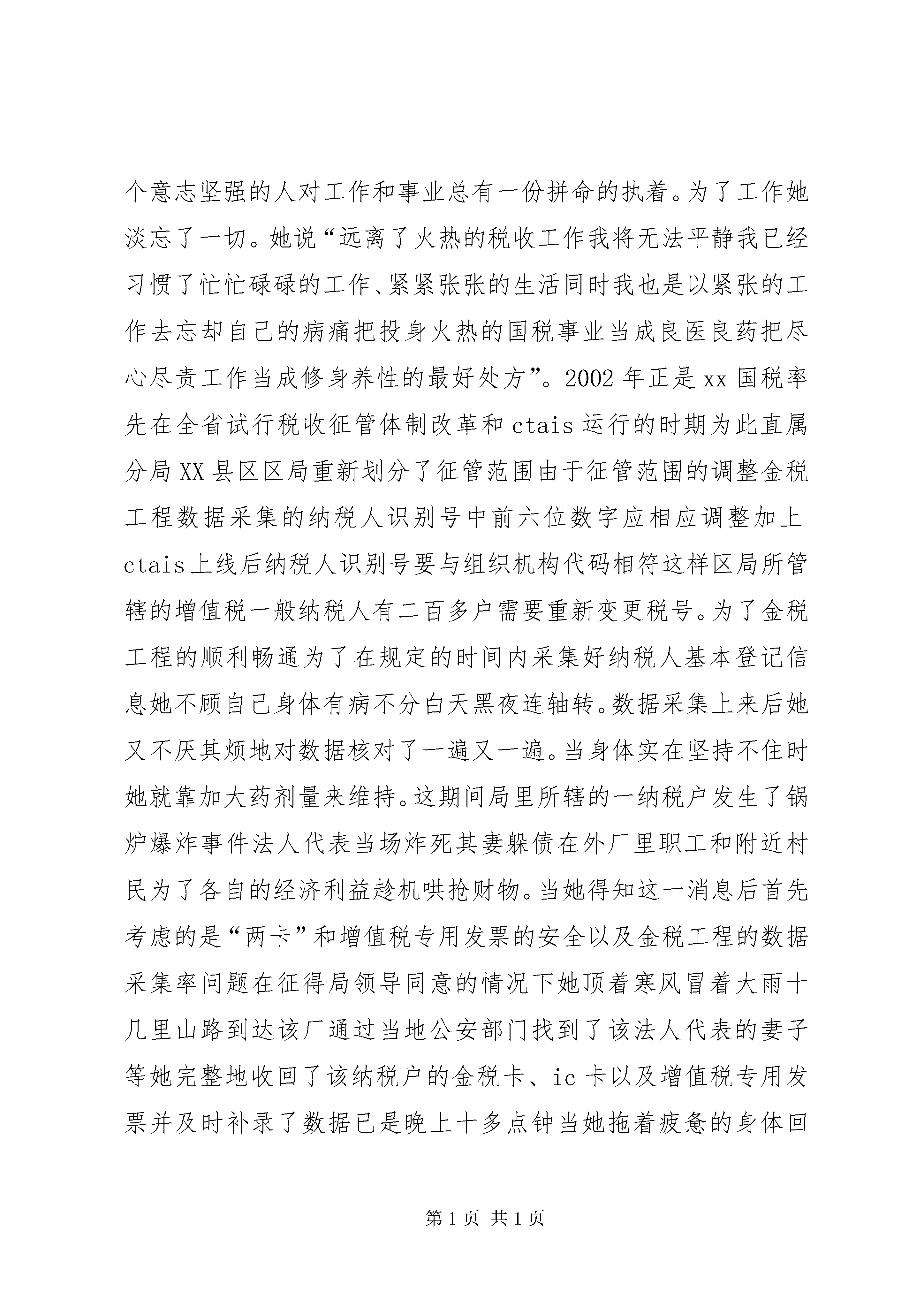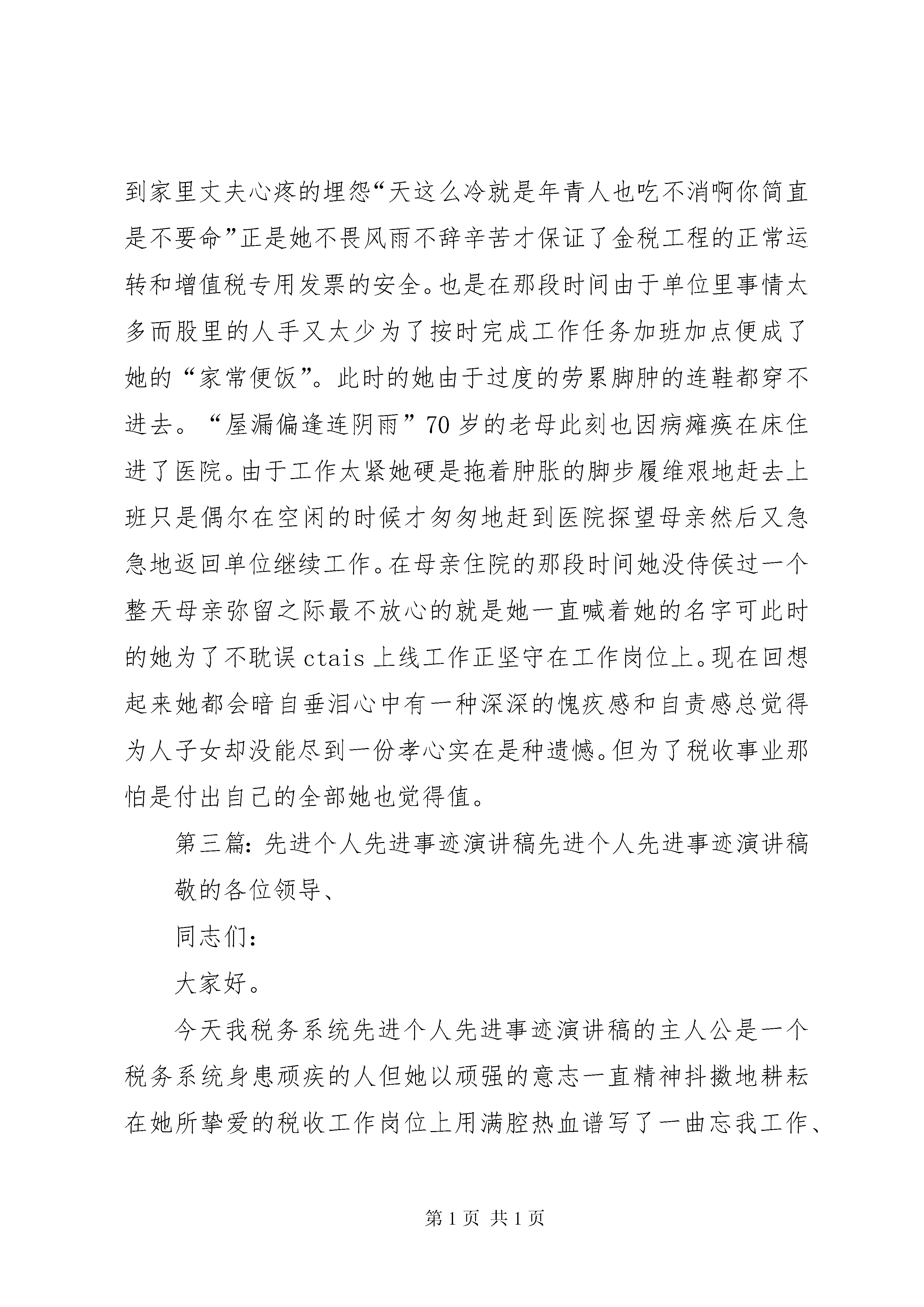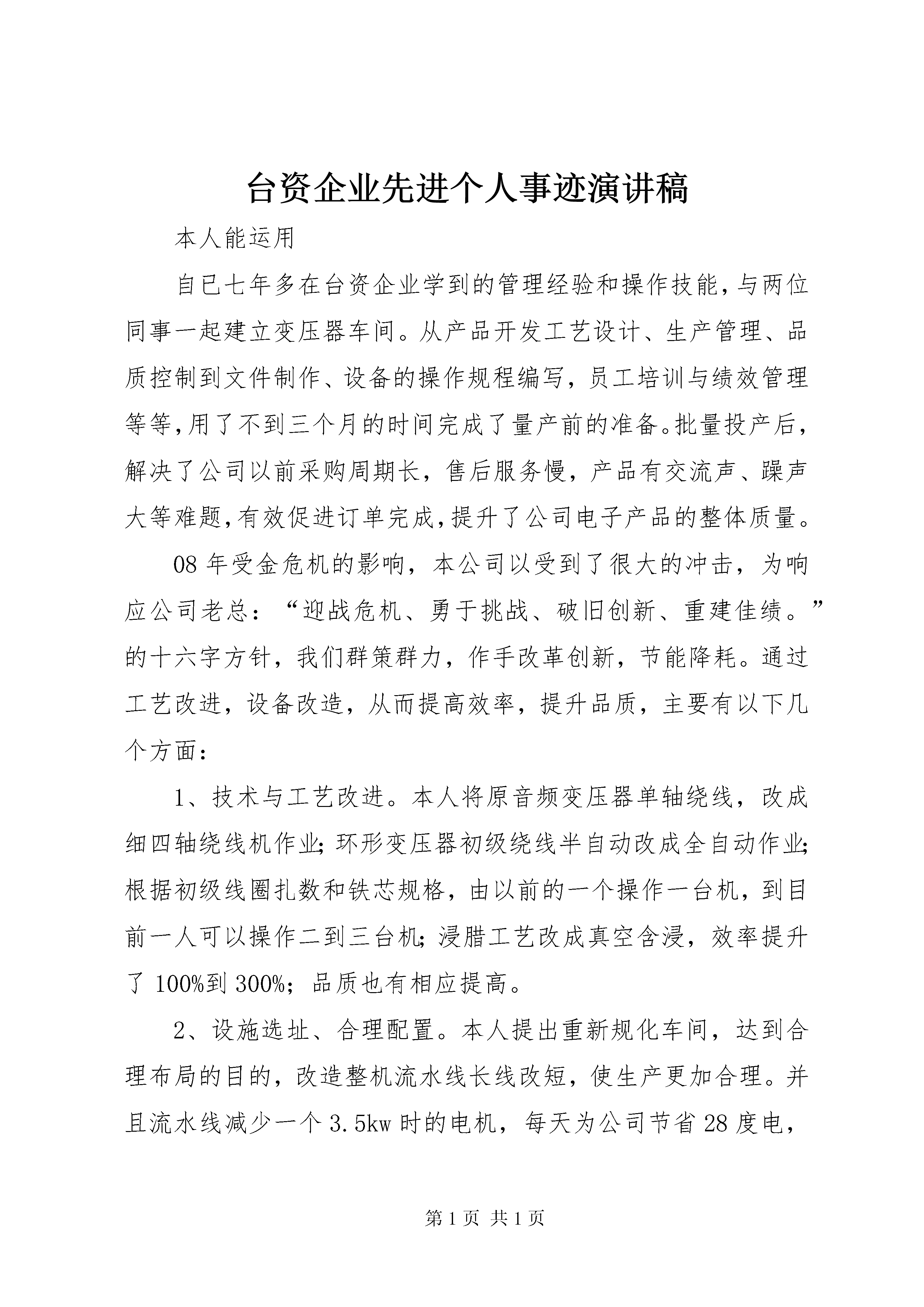 台资企业先进个人事迹演讲稿本人能运用自已七年多在台资企业学到的管理经验和操作技能,与两位同事一起建立变压器车间。从产品开发工艺设计、生产管理、品质控制到文件制作、设备的操作规程编写,员工培训与绩效管理等等,用了不到三个月的时间完成了量产前的准备。批量投产后,解决了公司以前采购周期长,售后服务慢,产品有交流声、躁声大等难题,有效促进订单完成,提升了公司电子产品的整体质量。08年受金危机的影响,本公司以受到了很大的冲击,为响应公司老总:“迎战危机、勇于挑战、破旧创新、重建佳绩。”的十六字方针,我们群策群力,作手改革创新,节能降耗。通过工艺改进,设备改造,从而提高效率,提升品质,主要有以下几个方面:1、技术与工艺改进。本人将原音频变压器单轴绕线,改成细四轴绕线机作业;环形变压器初级绕线半自动改成全自动作业;根据初级线圈扎数和铁芯规格,由以前的一个操作一台机,到目前一人可以操作二到三台机;浸腊工艺改成真空含浸,效率提升了100%到300%;品质也有相应提高。2、设施选址、合理配置。本人提出重新规化车间,达到合理布局的目的,改造整机流水线长线改短,使生产更加合理。并且流水线减少一个3.5kw时的电机,每天为公司节省28度电,效率得到有效提升。3、资源整合、优化升级。本人提出将小车间合并大车间的建议。此项建议被公司采纳并实施后,由原来的22个车间变成整改后的14个。公司人力、设备、信息等资源重新优化和整合,降低了公司管理成本。08年和07年相比,产值同等条件下,车间作业员月平均减少25人,效率提升30%。4、节能先锋、降耗达人。2008年迎来××集团20岁生日,为了提升公司整体形象,搞好6s工作,生产线上的流水板太过陈旧,车间提出更换。为了节省成本,运用以前公司里还有130块弃用的流水板经过改造重新加工,加档边档条后,效果新的一样,有效的为网公司节省一万多元。车间地板因年数以久,地板较陈旧,便亲力亲为带领本车间员工,用洗涤精,粗纱子清洗地板,车间面积有5000多平方米,以外面专业清洗3元/平方计,为公司节省15000多元。被公司评为“降耗先进个人”并在《××报》上刊载。2009年,为达成公司节能降耗10%的目标,车间利用顶楼采光较好的条件,白天在保证自然光照充分满足生产的条件下,做到尽量不开灯。加上监督,检查,培训,宣导,合理安排生产,减少不必要加班,提升8小时工作效率,人离开工位和生产现场,必关闭电源等方式提升部门业绩和公司的整体效益。第二篇。先进个人先进事迹演讲稿尊敬的各位领导、同志们大家好。今天我税务系统先进个人先进事迹演讲稿的主人公是一个税务系统身患顽疾的人但她以顽强的意志一直精神抖擞地耕耘在她所挚爱的税收工作岗位上用满腔热血谱写了一曲忘我工作、无私奉献的税务工作赞歌铸就了她朴实而辉煌的人生之路。她就是xx市XX县区国家税务局税政法规股股长----胡小莲。胡小莲连续五年被评为优秀公务员连续五年被评为全市先进工作者并荣获全省税务系统先进个人、全省税务系统“金税工程”先进个人和xx市第四届“十大杰出青年”等荣誉称号。鲜花和掌声令人目炫你可知道这鲜花和掌声背后的动人故事就让我们一同走进她的故事去聆听一个优秀税务工作者的心声。“把投身火热的国税事业当成良医良药”1999年11月胡小莲突然感到身体不适开始她并没怎么在意心想也许是由于平时工作太忙、太累的原因吧依旧忘我地扑在工作岗位上。终于有一天她感到坚持不住了家人再也不理她的解释“架”着她来到了医院。经检查她得了一种叫“红斑狼疮”的疾病。这种病目前医学上对治愈它还没有什么很好的办法。这种病不能多晒太阳更不能紧张劳累必须终身服药长期保养为此医生建议她应尽量多休息少操劳工作上只能做一些力所能及的事情。但胡小莲依旧把全部的身心投入到自己所钟爱的税收事业中去。由于疾病的原因每做一件事情都意味着她要付出比别人更多的体力、精力更是对她意志品质的考验。她是一个意志坚强的人对工作和事业总有一份拼命的执着。为了工作她淡忘了一切。她说“远离了火热的税收工作我将无法平静我已经习惯了忙忙碌碌的工作、紧紧张张的生活同时我也是以紧张的工作去忘却自己的病痛把投身火热的国税事业当成良医良药把尽心尽责工作当成修身养性的最好处方”。2002年正是xx国税率先在全省试行税收征管体制改革和ctais运行的时期为此直属分局XX县区区局重新划分了征管范围由于征管范围的调整金税工程数据采集的纳税人识别号中前六位数字应相应调整加上ctais上线后纳税人识别号要与组织机构代码相符这样区局所管辖的增值税一般纳税人有二百多户需要重新变更税号。为了金税工程的顺利畅通为了在规定的时间内采集好纳税人基本登记信息她不顾自己身体有病不分白天黑夜连轴转。数据采集上来后她又不厌其烦地对数据核对了一遍又一遍。当身体实在坚持不住时她就靠