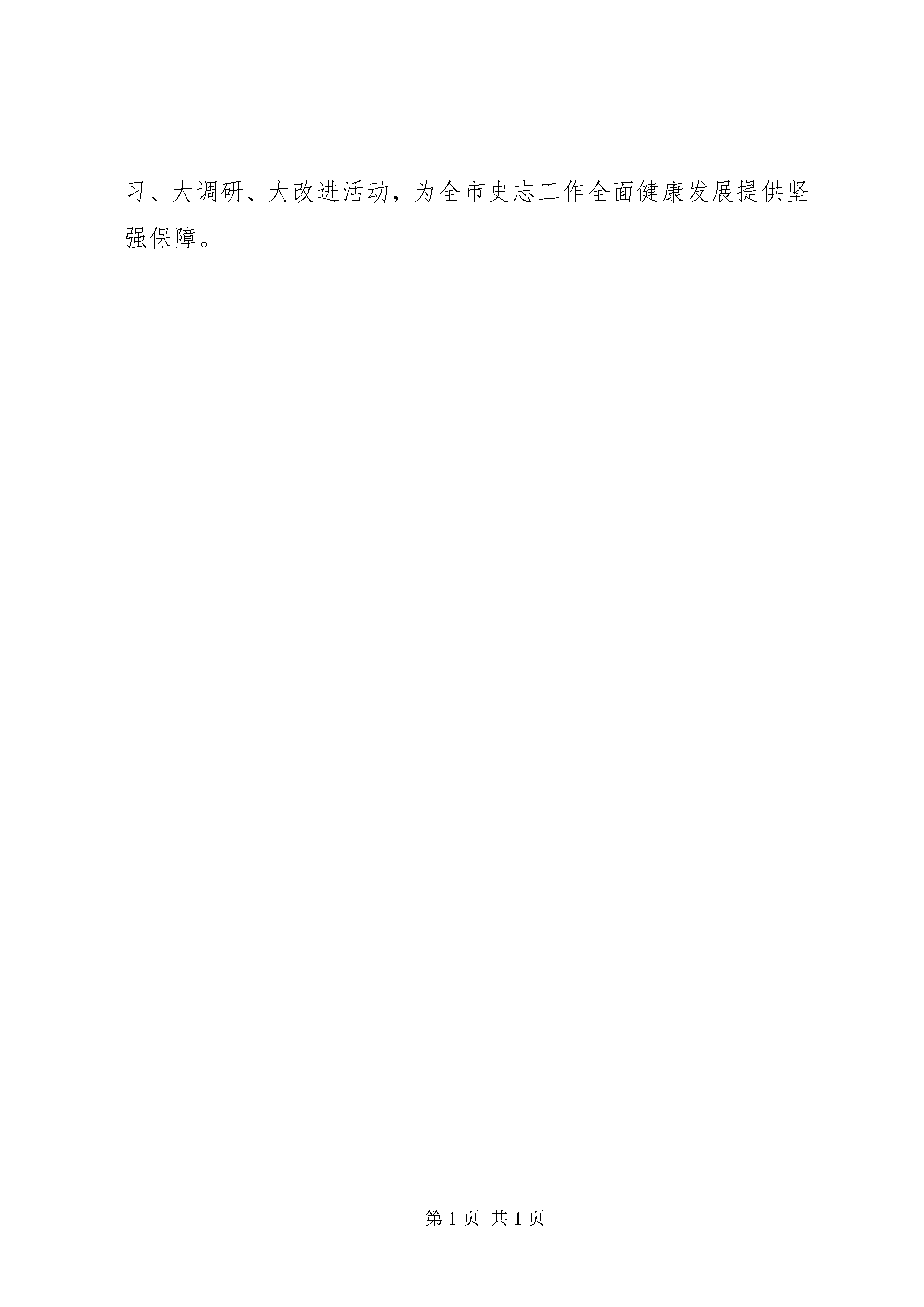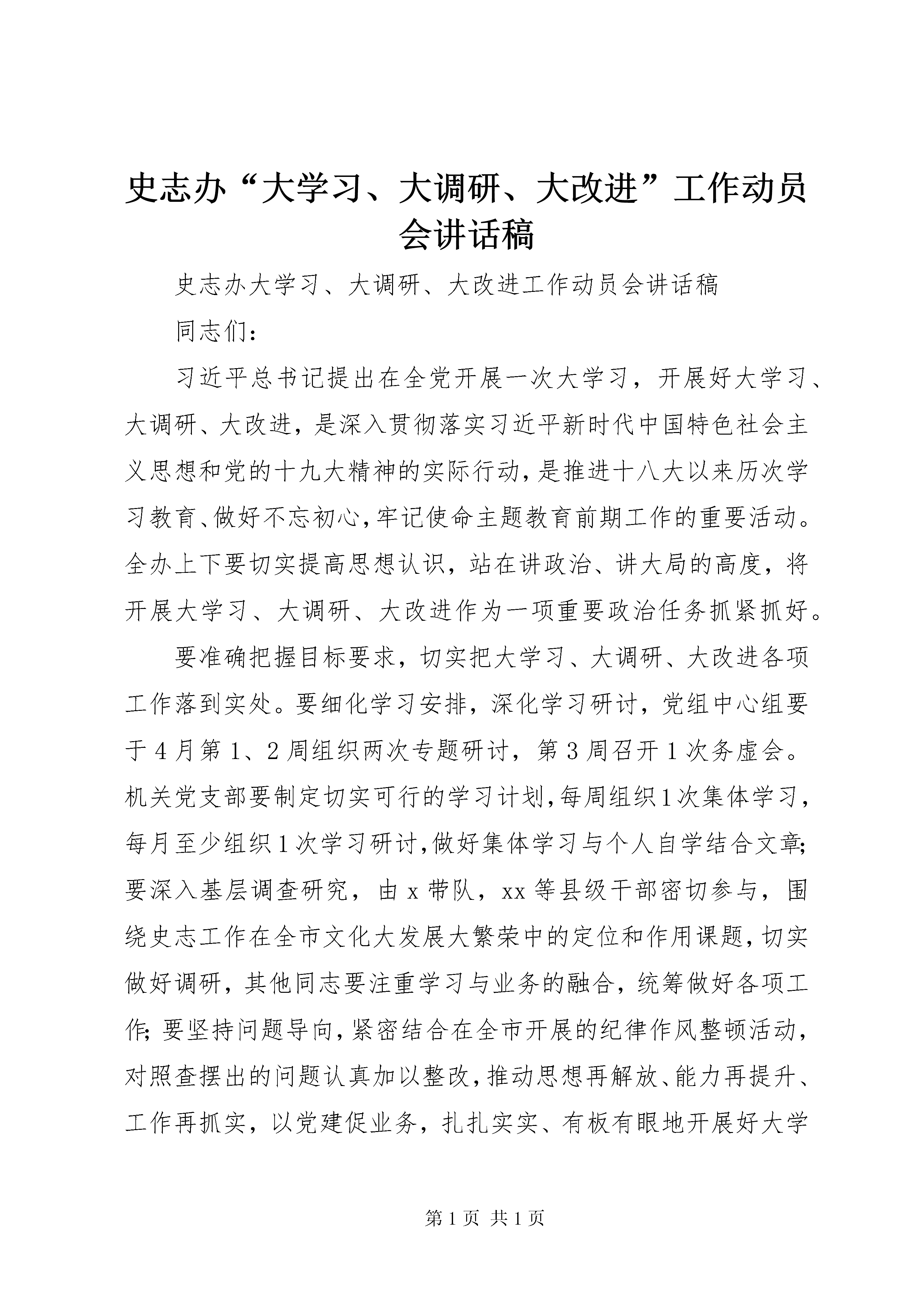 史志办“大学习、大调研、大改进”工作动员会讲话稿史志办大学习、大调研、大改进工作动员会讲话稿同志们:习近平总书记提出在全党开展一次大学习,开展好大学习、大调研、大改进,是深入贯彻落实习近平新时代中国特色社会主义思想和党的十九大精神的实际行动,是推进十八大以来历次学习教育、做好不忘初心,牢记使命主题教育前期工作的重要活动。全办上下要切实提高思想认识,站在讲政治、讲大局的高度,将开展大学习、大调研、大改进作为一项重要政治任务抓紧抓好。要准确把握目标要求,切实把大学习、大调研、大改进各项工作落到实处。要细化学习安排,深化学习研讨,党组中心组要于4月第1、2周组织两次专题研讨,第3周召开1次务虚会。机关党支部要制定切实可行的学习计划,每周组织1次集体学习,每月至少组织1次学习研讨,做好集体学习与个人自学结合文章;要深入基层调查研究,由x带队,xx等县级干部密切参与,围绕史志工作在全市文化大发展大繁荣中的定位和作用课题,切实做好调研,其他同志要注重学习与业务的融合,统筹做好各项工作;要坚持问题导向,紧密结合在全市开展的纪律作风整顿活动,对照查摆出的问题认真加以整改,推动思想再解放、能力再提升、工作再抓实,以党建促业务,扎扎实实、有板有眼地开展好大学习、大调研、大改进活动,为全市史志工作全面健康发展提供坚强保障。