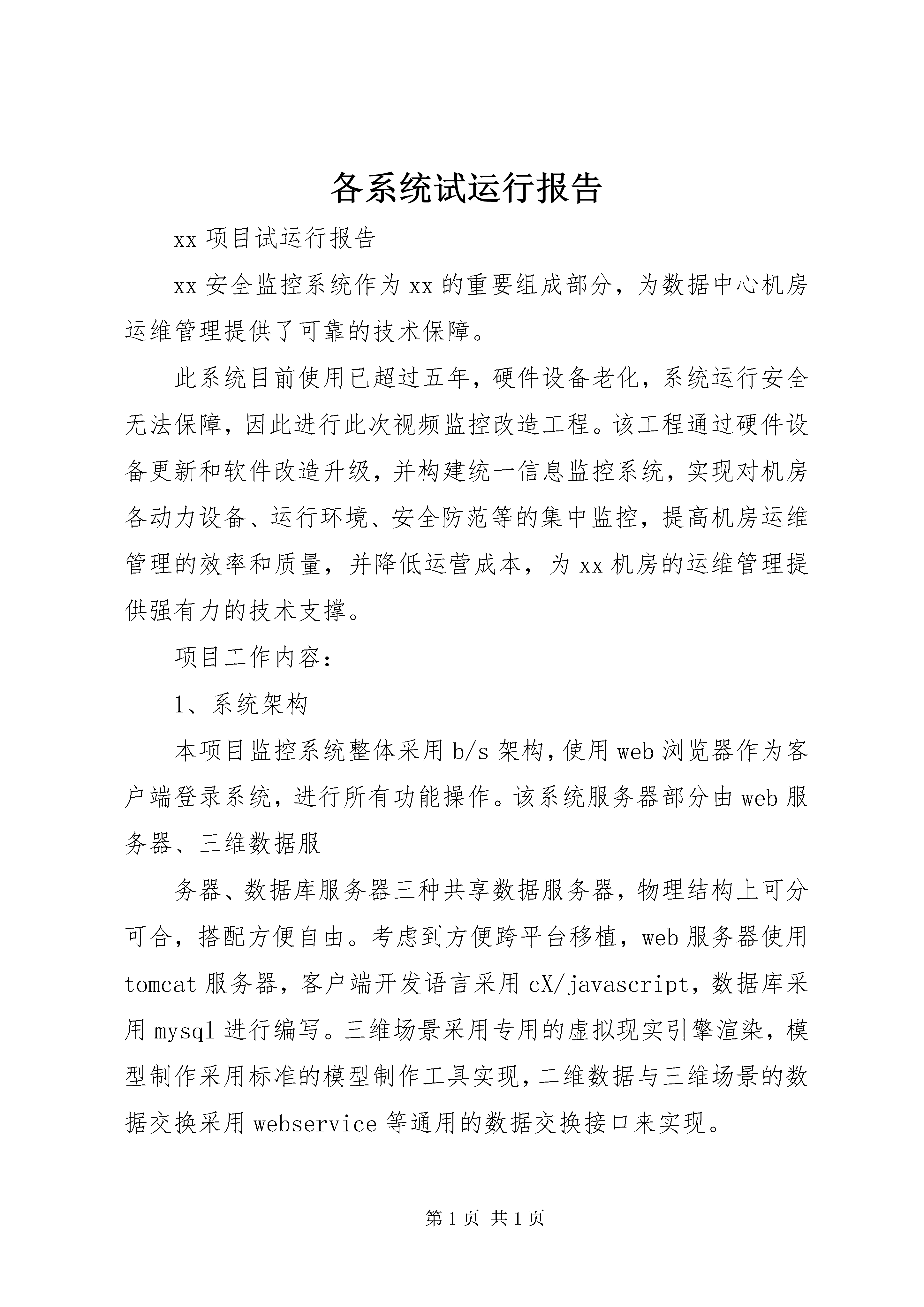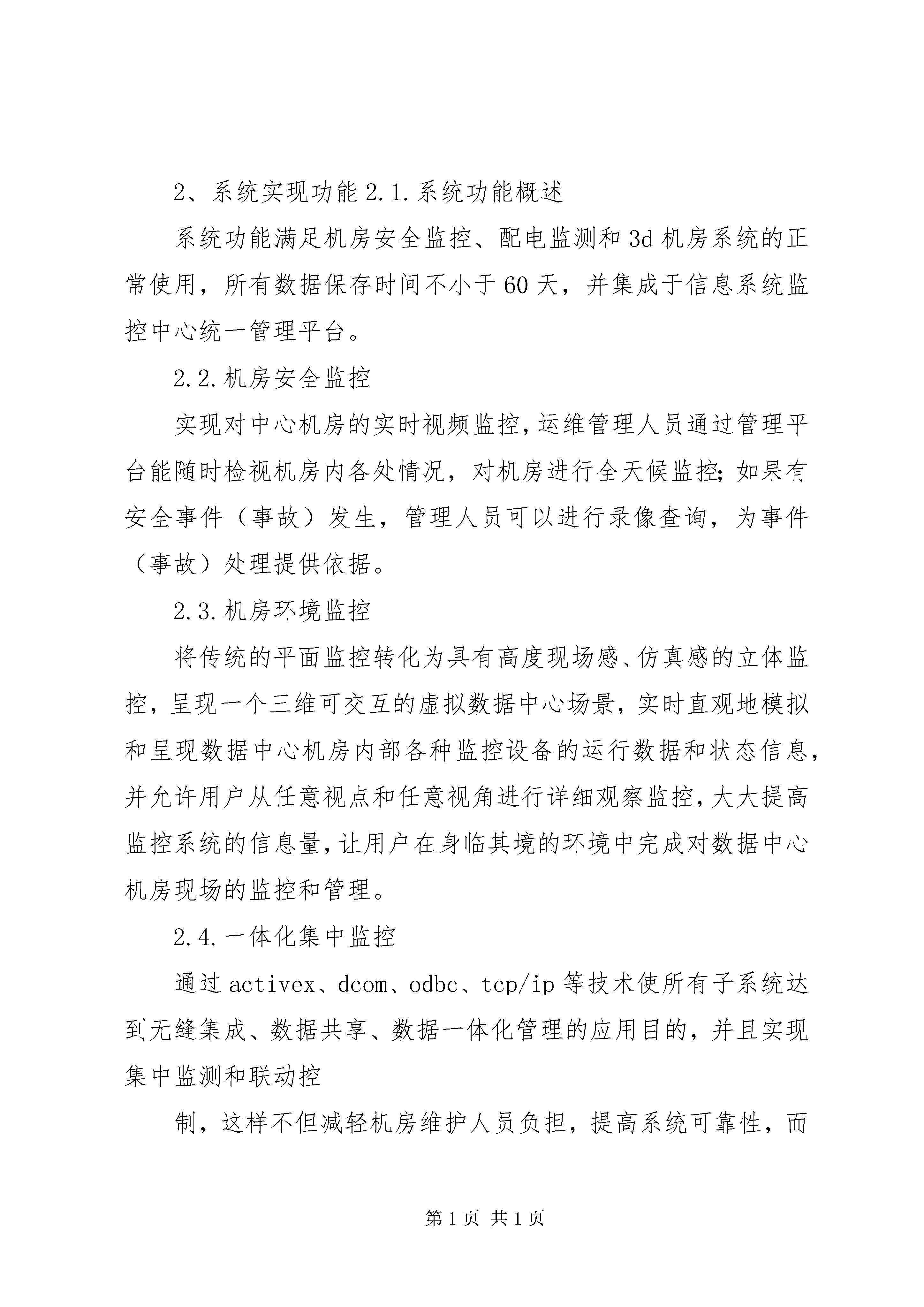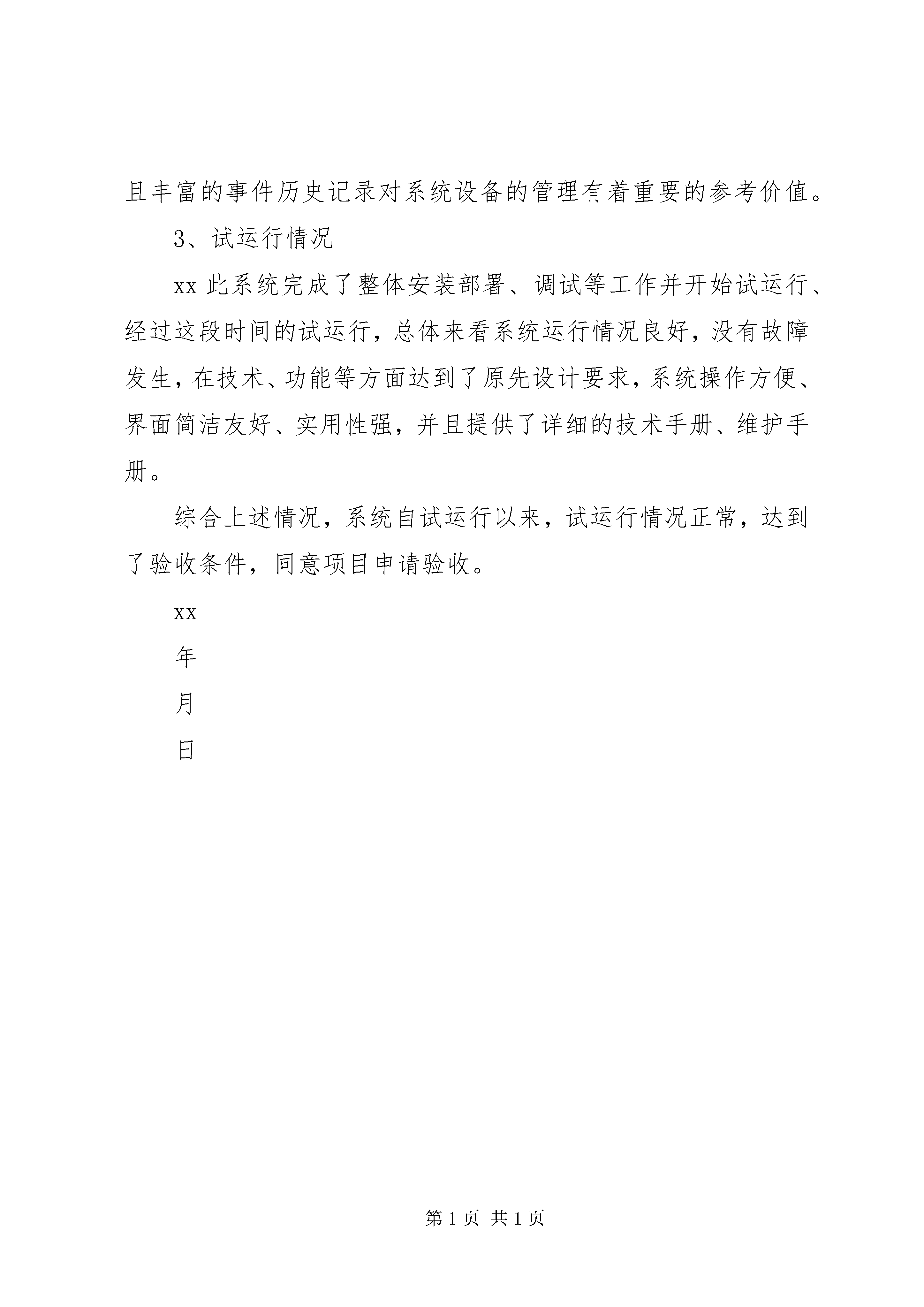 各系统试运行报告xx项目试运行报告xx安全监控系统作为xx的重要组成部分,为数据中心机房运维管理提供了可靠的技术保障。此系统目前使用已超过五年,硬件设备老化,系统运行安全无法保障,因此进行此次视频监控改造工程。该工程通过硬件设备更新和软件改造升级,并构建统一信息监控系统,实现对机房各动力设备、运行环境、安全防范等的集中监控,提高机房运维管理的效率和质量,并降低运营成本,为xx机房的运维管理提供强有力的技术支撑。项目工作内容:1、系统架构本项目监控系统整体采用b/s架构,使用web浏览器作为客户端登录系统,进行所有功能操作。该系统服务器部分由web服务器、三维数据服务器、数据库服务器三种共享数据服务器,物理结构上可分可合,搭配方便自由。考虑到方便跨平台移植,web服务器使用tomcat服务器,客户端开发语言采用cX/javascript,数据库采用mysql进行编写。三维场景采用专用的虚拟现实引擎渲染,模型制作采用标准的模型制作工具实现,二维数据与三维场景的数据交换采用webservice等通用的数据交换接口来实现。2、系统实现功能2.1.系统功能概述系统功能满足机房安全监控、配电监测和3d机房系统的正常使用,所有数据保存时间不小于60天,并集成于信息系统监控中心统一管理平台。2.2.机房安全监控实现对中心机房的实时视频监控,运维管理人员通过管理平台能随时检视机房内各处情况,对机房进行全天候监控;如果有安全事件(事故)发生,管理人员可以进行录像查询,为事件(事故)处理提供依据。2.3.机房环境监控将传统的平面监控转化为具有高度现场感、仿真感的立体监控,呈现一个三维可交互的虚拟数据中心场景,实时直观地模拟和呈现数据中心机房内部各种监控设备的运行数据和状态信息,并允许用户从任意视点和任意视角进行详细观察监控,大大提高监控系统的信息量,让用户在身临其境的环境中完成对数据中心机房现场的监控和管理。2.4.一体化集中监控通过activex、dcom、odbc、tcp/ip等技术使所有子系统达到无缝集成、数据共享、数据一体化管理的应用目的,并且实现集中监测和联动控制,这样不但减轻机房维护人员负担,提高系统可靠性,而且丰富的事件历史记录对系统设备的管理有着重要的参考价值。3、试运行情况xx此系统完成了整体安装部署、调试等工作并开始试运行、经过这段时间的试运行,总体来看系统运行情况良好,没有故障发生,在技术、功能等方面达到了原先设计要求,系统操作方便、界面简洁友好、实用性强,并且提供了详细的技术手册、维护手册。综合上述情况,系统自试运行以来,试运行情况正常,达到了验收条件,同意项目申请验收。xx年月日