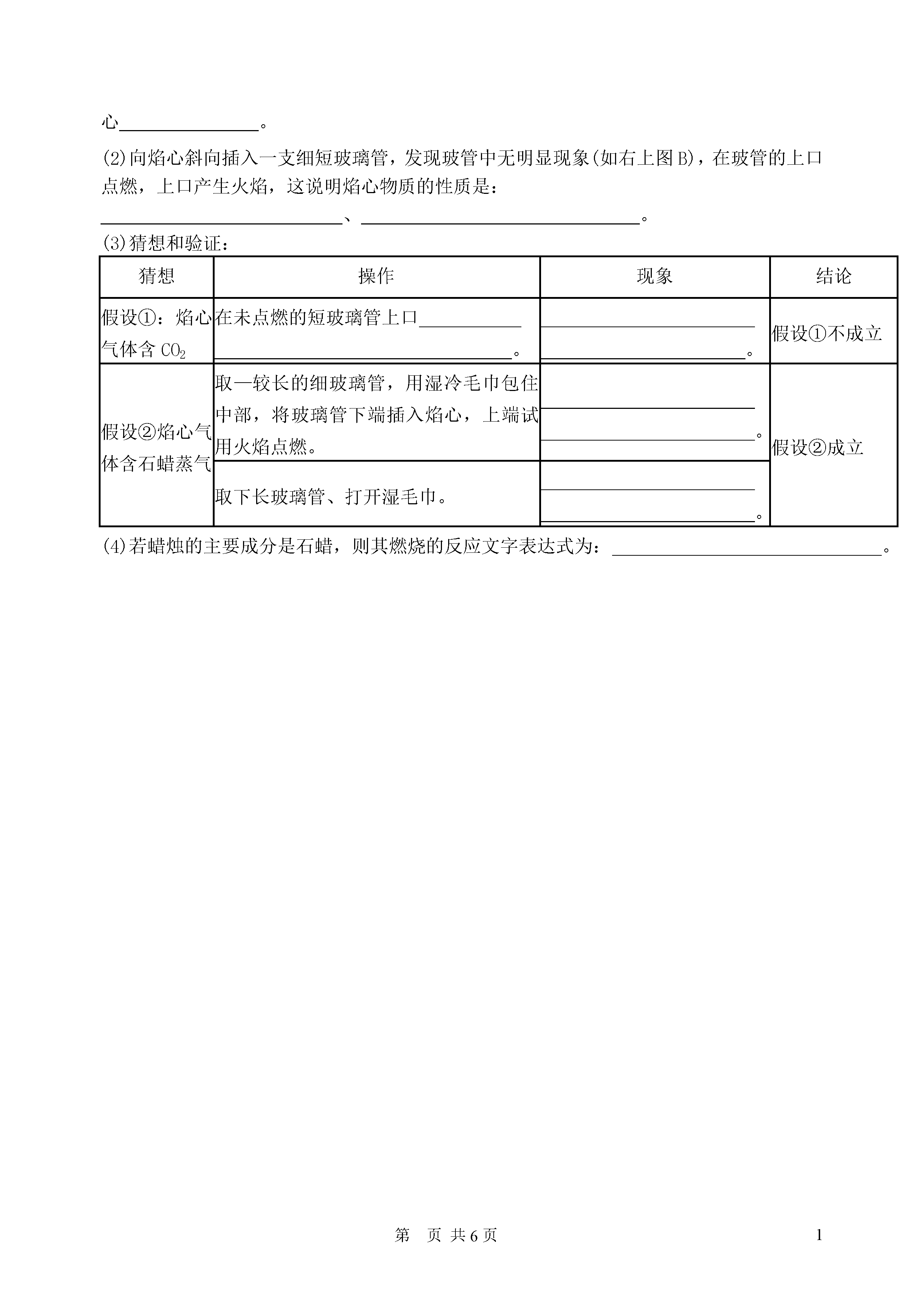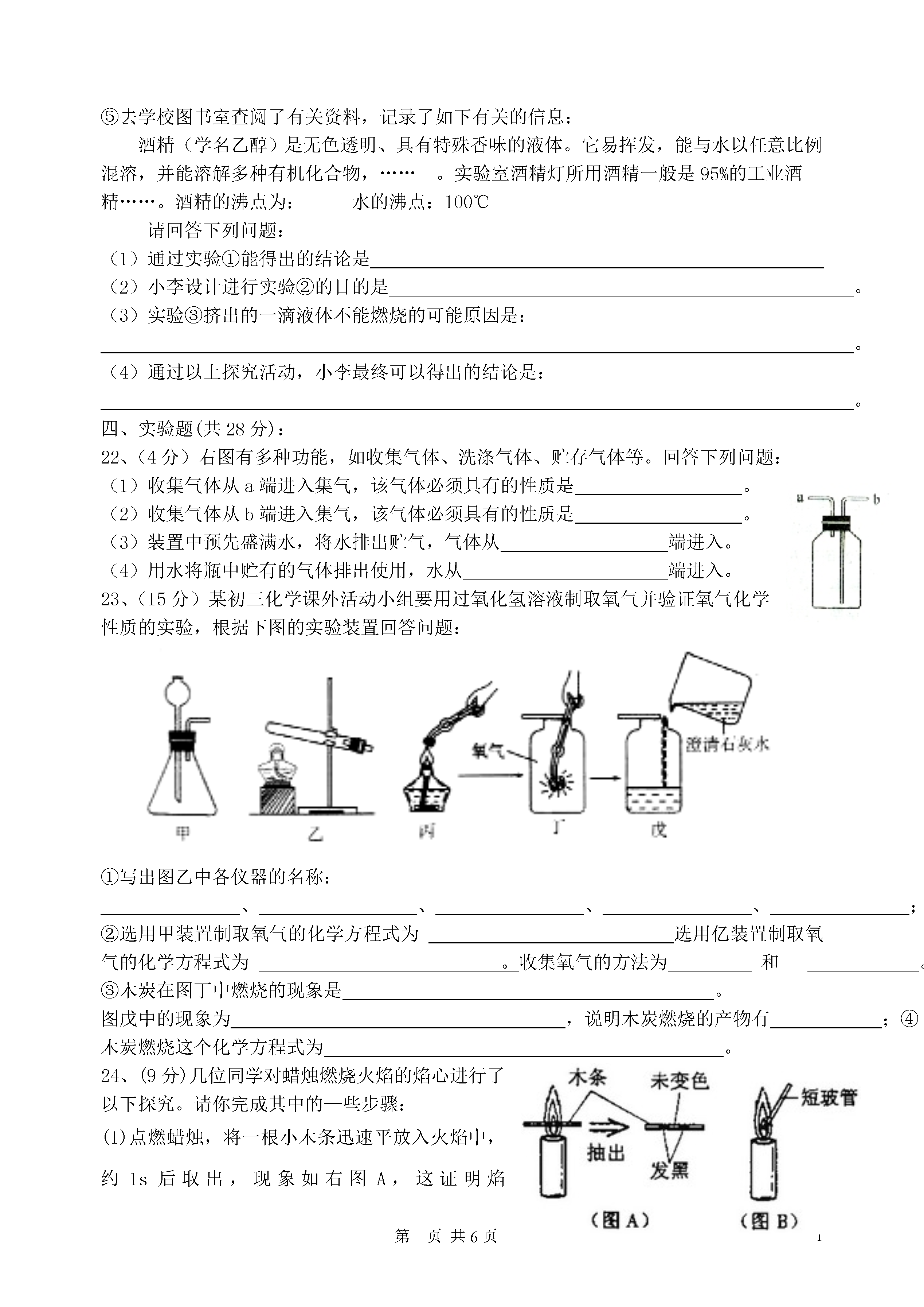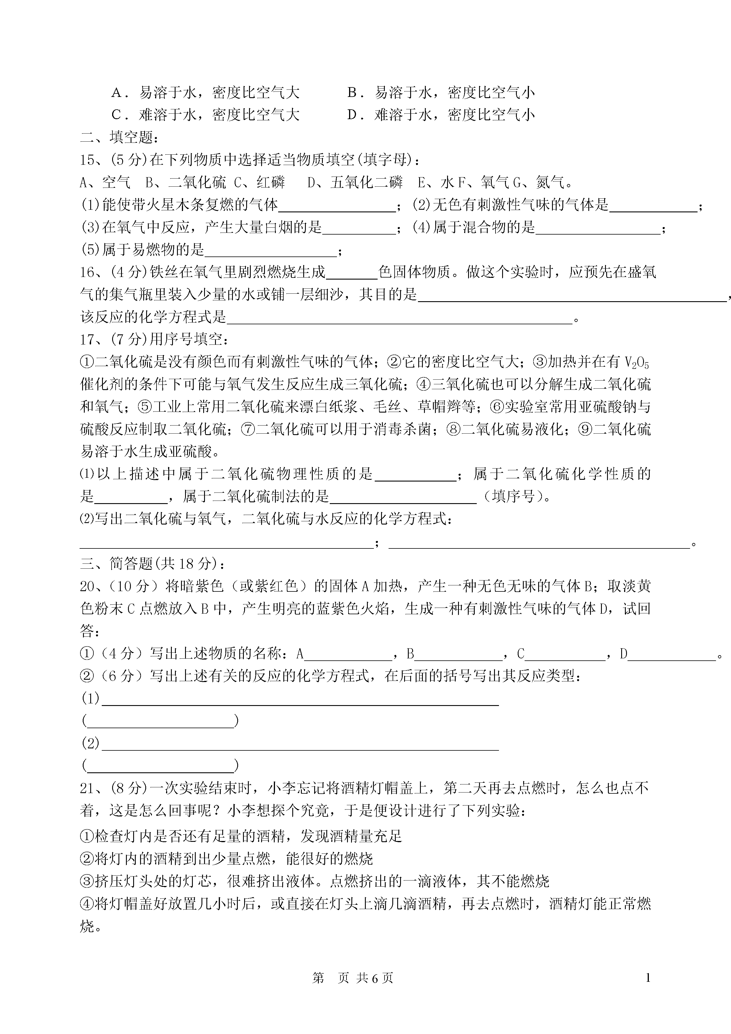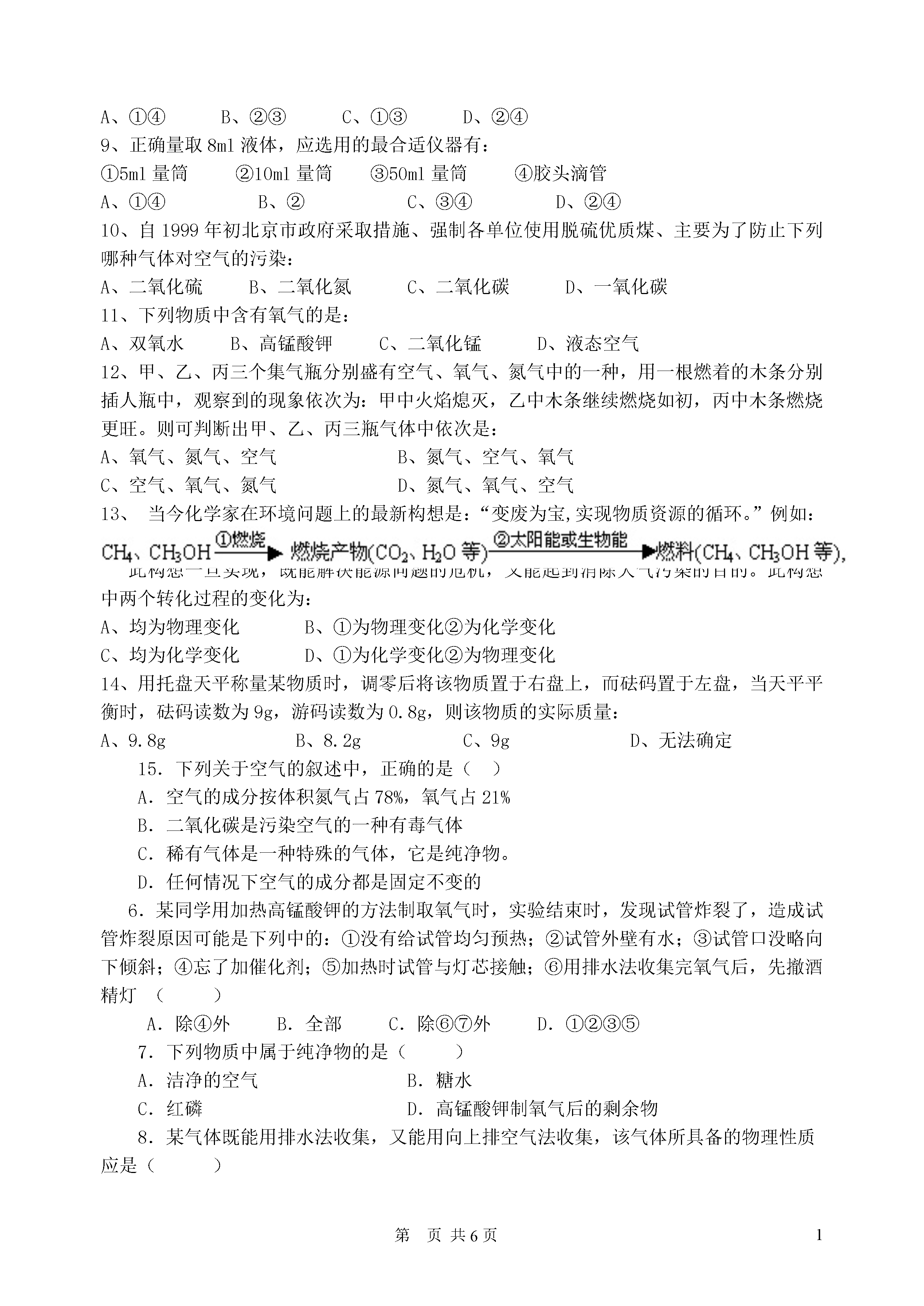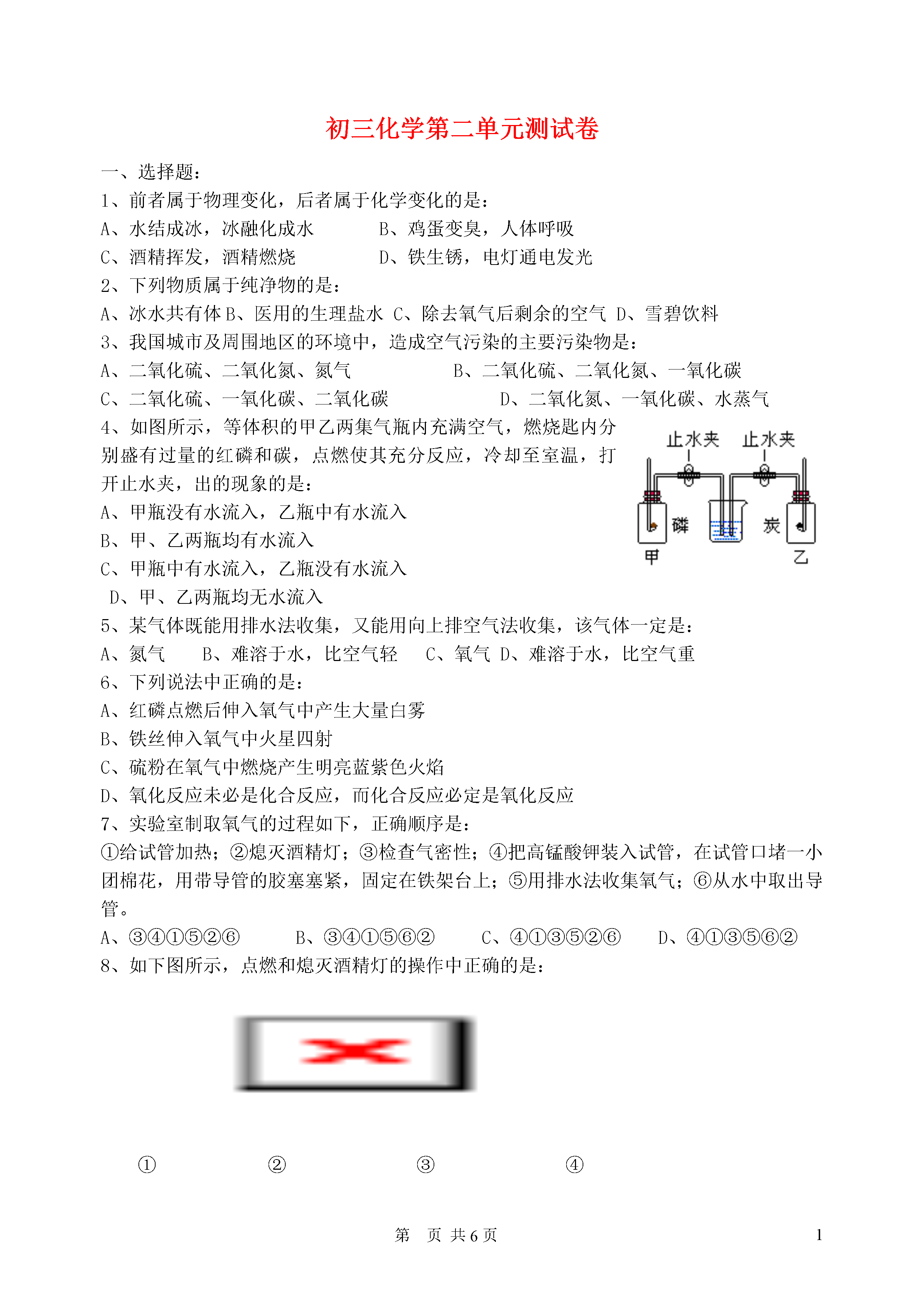 1第页初三化学第二单元测试卷一、选择题:1、前者属于物理变化,后者属于化学变化的是:A、水结成冰,冰融化成水B、鸡蛋变臭,人体呼吸C、酒精挥发,酒精燃烧D、铁生锈,电灯通电发光2、下列物质属于纯净物的是:A、冰水共有体B、医用的生理盐水C、除去氧气后剩余的空气D、雪碧饮料3、我国城市及周围地区的环境中,造成空气污染的主要污染物是:A、二氧化硫、二氧化氮、氮气B、二氧化硫、二氧化氮、一氧化碳C、二氧化硫、一氧化碳、二氧化碳D、二氧化氮、一氧化碳、水蒸气4、如图所示,等体积的甲乙两集气瓶内充满空气,燃烧匙内分别盛有过量的红磷和碳,点燃使其充分反应,冷却至室温,打开止水夹,出的现象的是:A、甲瓶没有水流入,乙瓶中有水流入B、甲、乙两瓶均有水流入C、甲瓶中有水流入,乙瓶没有水流入D、甲、乙两瓶均无水流入5、某气体既能用排水法收集,又能用向上排空气法收集,该气体一定是:A、氮气B、难溶于水,比空气轻C、氧气D、难溶于水,比空气重6、下列说法中正确的是:A、红磷点燃后伸入氧气中产生大量白雾B、铁丝伸入氧气中火星四射C、硫粉在氧气中燃烧产生明亮蓝紫色火焰D、氧化反应未必是化合反应,而化合反应必定是氧化反应7、实验室制取氧气的过程如下,正确顺序是:①给试管加热;②熄灭酒精灯;③检查气密性;④把高锰酸钾装入试管,在试管口堵一小团棉花,用带导管的胶塞塞紧,固定在铁架台上;⑤用排水法收集氧气;⑥从水中取出导管。A、③④①⑤②⑥B、③④①⑤⑥②C、④①③⑤②⑥D、④①③⑤⑥②8、如下图所示,点燃和熄灭酒精灯的操作中正确的是:①②③④A、①④B、②③C、①③D、②④9、正确量取8ml液体,应选用的最合适仪器有:①5ml量筒②10ml量筒③50ml量筒④胶头滴管A、①④B、②C、③④D、②④10、自1999年初北京市政府采取措施、强制各单位使用脱硫优质煤、主要为了防止下列哪种气体对空气的污染:A、二氧化硫B、二氧化氮C、二氧化碳D、一氧化碳11、下列物质中含有氧气的是:A、双氧水B、高锰酸钾C、二氧化锰D、液态空气12、甲、乙、丙三个集气瓶分别盛有空气、氧气、氮气中的一种,用一根燃着的木条分别插人瓶中,观察到的现象依次为:甲中火焰熄灭,乙中木条继续燃烧如初,丙中木条燃烧更旺。则可判断出甲、乙、丙三瓶气体中依次是:A、氧气、氮气、空气B、氮气、空气、氧气C、空气、氧气、氮气D、氮气、氧气、空气13、当今化学家在环境问题上的最新构想是:“变废为宝,实现物质资源的循环。”例如:此构想一旦实现,既能解决能源问题的危机,又能起到消除大气污染的目的。此构想中两个转化过程的变化为:A、均为物理变化B、①为物理变化②为化学变化C、均为化学变化D、①为化学变化②为物理变化14、用托盘天平称量某物质时,调零后将该物质置于右盘上,而砝码置于左盘,当天平平衡时,砝码读数为9g,游码读数为0.8g,则该物质的实际质量:A、9.8gB、8.2gC、9gD、无法确定15.下列关于空气的叙述中,正确的是()A.空气的成分按体积氮气占78%,氧气占21%B.二氧化碳是污染空气的一种有毒气体C.稀有气体是一种特殊的气体,它是纯净物。D.任何情况下空气的成分都是固定不变的6.某同学用加热高锰酸钾的方法制取氧气时,实验结束时,发现试管炸裂了,造成试管炸裂原因可能是下列中的:①没有给试管均匀预热;②试管外壁有水;③试管口没略向下倾斜;④忘了加催化剂;⑤加热时试管与灯芯接触;⑥用排水法收集完氧气后,先撤酒精灯()A.除④外B.全部C.除⑥⑦外D.①②③⑤7.下列物质中属于纯净物的是()A.洁净的空气B.糖水C.红磷D.高锰酸钾制氧气后的剩余物8.某气体既能用排水法收集,又能用向上排空气法收集,该气体所具备的物理性质应是()A.易溶于水,密度比空气大B.易溶于水,密度比空气小C.难溶于水,密度比空气大D.难溶于水,密度比空气小二、填空题:15、(5分)在下列物质中选择适当物质填空(填字母):A、空气B、二氧化硫C、红磷D、五氧化二磷E、水F、氧气G、氮气。(1)能使带火星木条复燃的气体;(2)无色有刺激性气味的气体是;(3)在氧气中反应,产生大量白烟的是;(4)属于混合物的是;(5)属于易燃物的是;16、(4分)铁丝在氧气里剧烈燃烧生成色固体物质。做这个实验时,应预先在盛氧气的集气瓶里装入少量的水或铺一层细沙,其目的是,该反应的化学方程式是。17、(7分)用序号填空:①二氧化硫是没有颜色而有刺激性气味的气体;②它的密度比空气大;③加热并在有V2O5催化剂的条件下可能与氧气发生反应生成三氧化硫;④三氧化硫也可以分解生成二氧化硫和氧气;⑤工业上