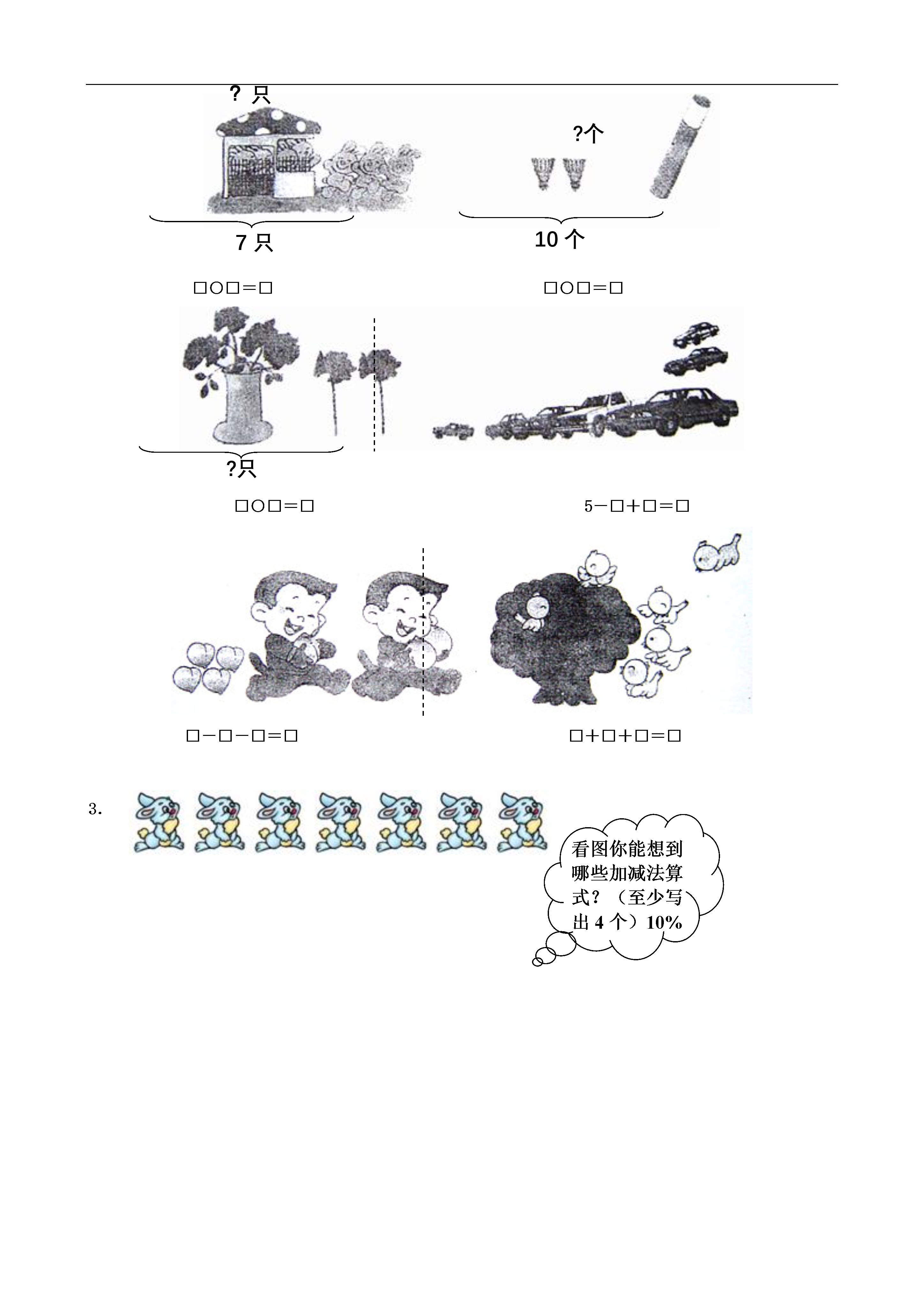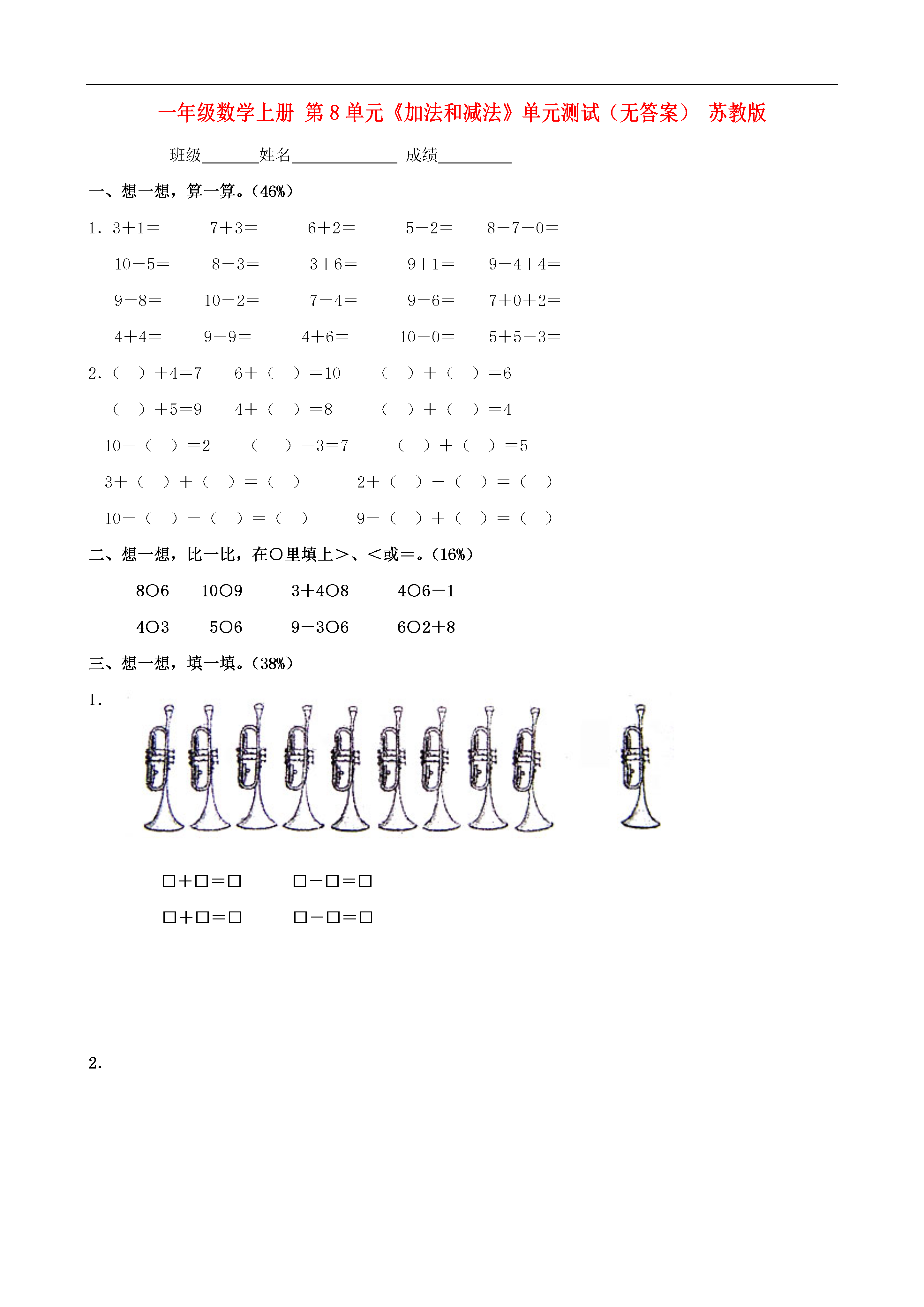 一年级数学上册第8单元《加法和减法》单元测试(无答案)苏教版班级姓名成绩一、想一想,算一算。(46%)1.3+1=7+3=6+2=5-2=8-7-0=10-5=8-3=3+6=9+1=9-4+4=9-8=10-2=7-4=9-6=7+0+2=4+4=9-9=4+6=10-0=5+5-3=2.()+4=76+()=10()+()=6()+5=94+()=8()+()=410-()=2()-3=7()+()=53+()+()=()2+()-()=()10-()-()=()9-()+()=()二、想一想,比一比,在○里填上>、<或=。(16%)8○610○93+4○84○6-14○35○69-3○66○2+8三、想一想,填一填。(38%)1.□+□=□□-□=□□+□=□□-□=□2.?只10个?个7只□○□=□□○□=□?只□○□=□5-□+□=□□-□-□=□□+□+□=□看图你能想到哪些加减法算式?(至少写出4个)10%3.