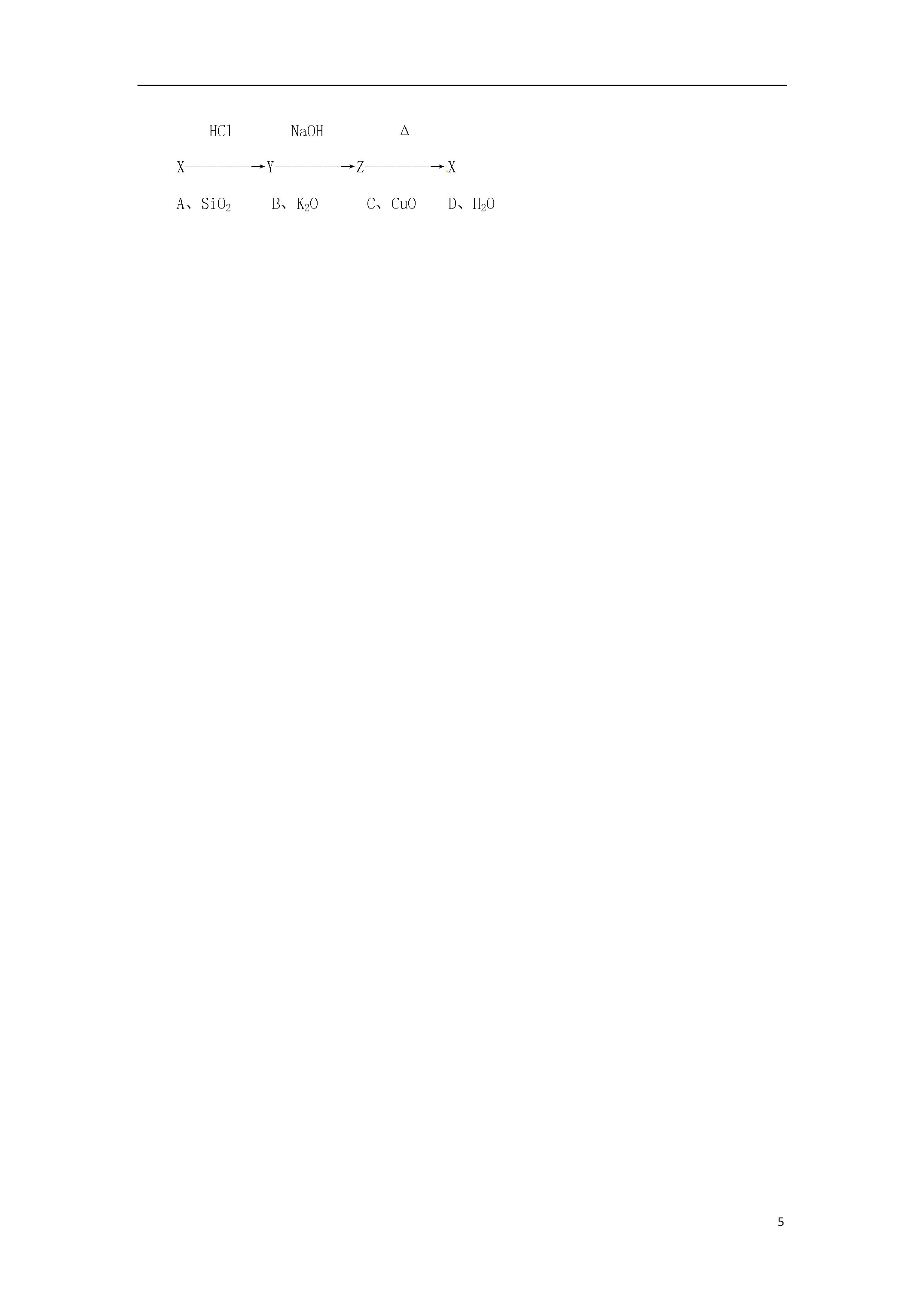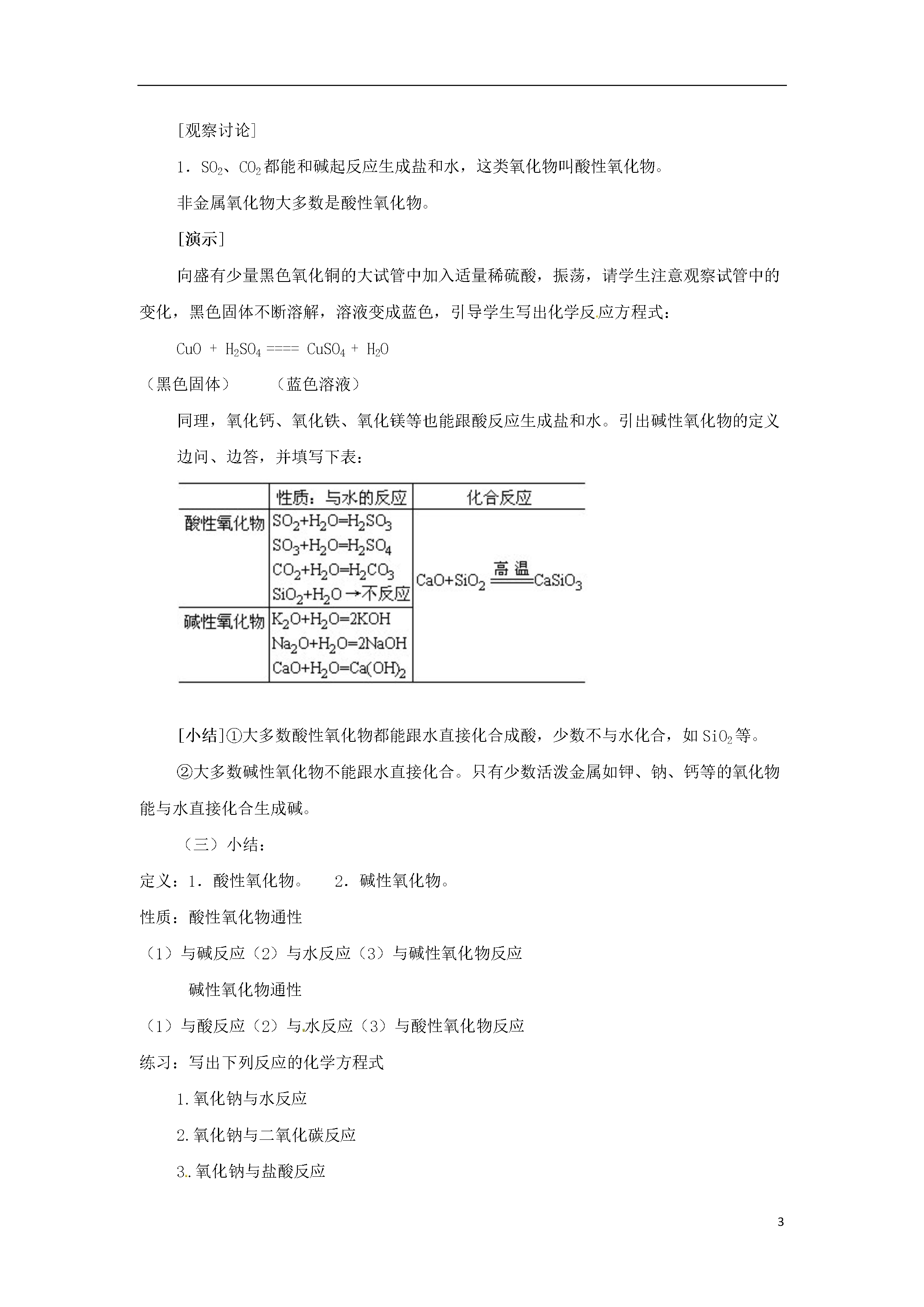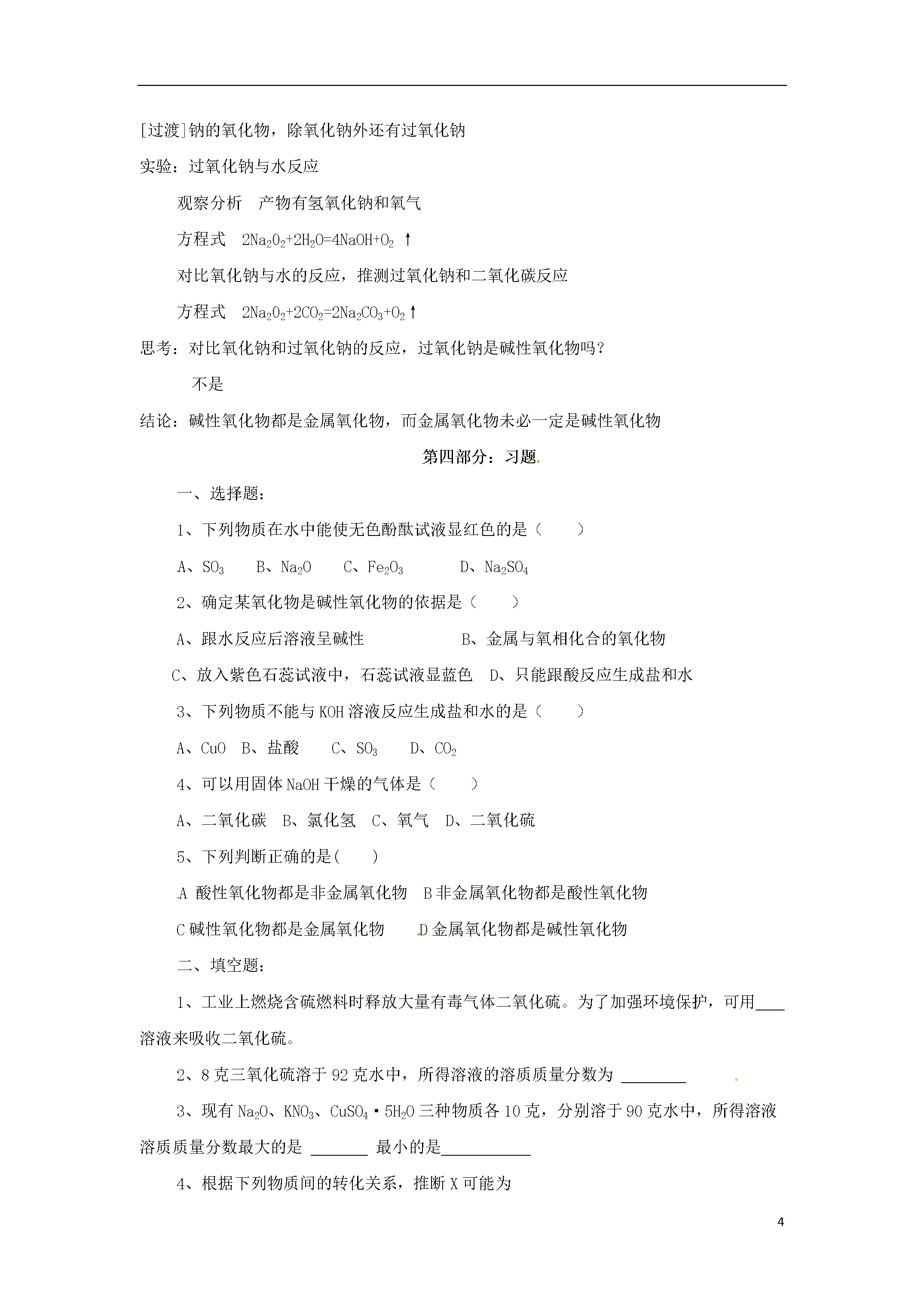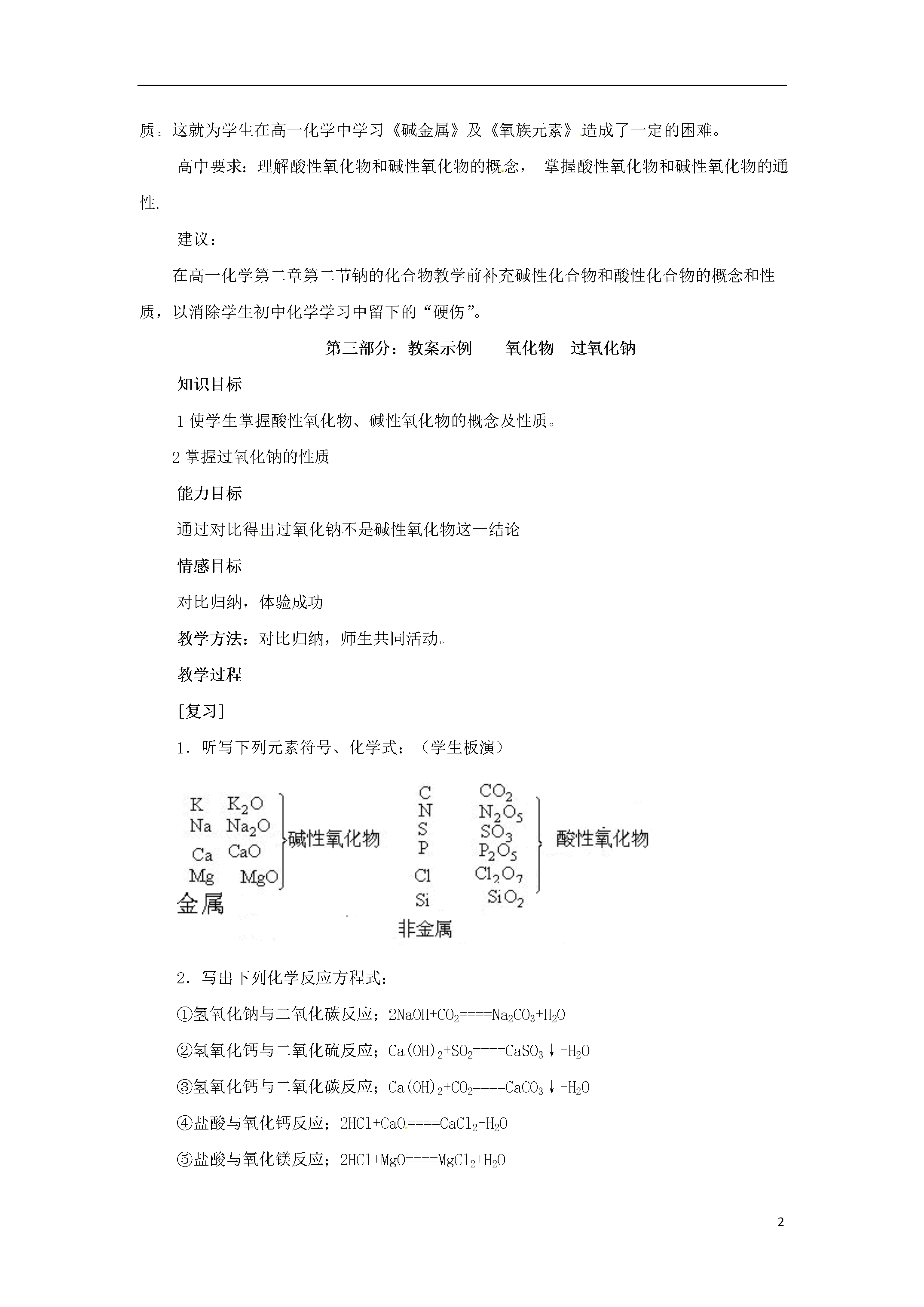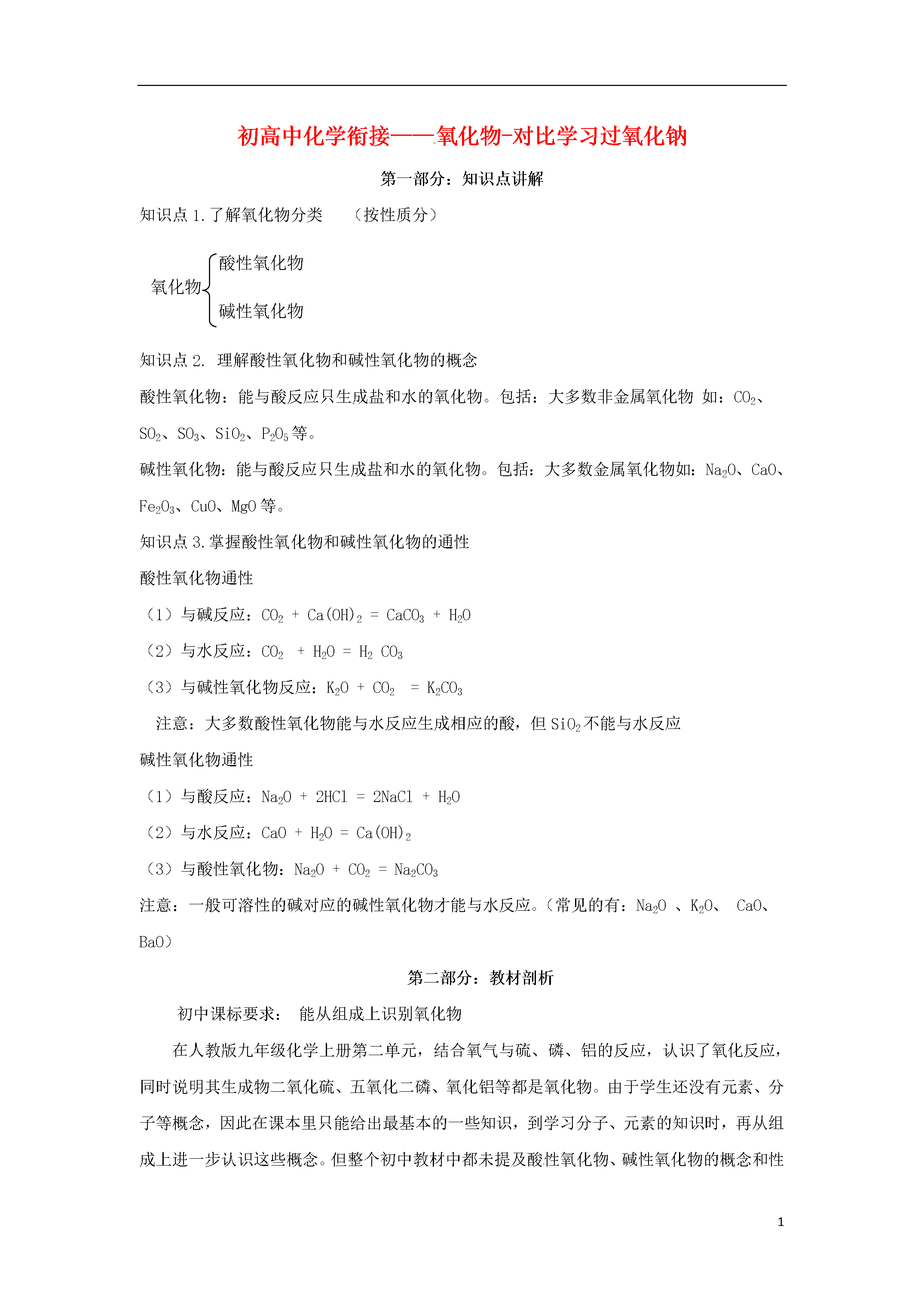 5初高中化学衔接——氧化物-对比学习过氧化钠第一部分:知识点讲解知识点1.了解氧化物分类(按性质分)酸性氧化物氧化物碱性氧化物知识点2.理解酸性氧化物和碱性氧化物的概念酸性氧化物:能与酸反应只生成盐和水的氧化物。包括:大多数非金属氧化物如:CO2、SO2、SO3、SiO2、P2O5等。碱性氧化物:能与酸反应只生成盐和水的氧化物。包括:大多数金属氧化物如:Na2O、CaO、Fe2O3、CuO、MgO等。知识点3.掌握酸性氧化物和碱性氧化物的通性酸性氧化物通性(1)与碱反应:CO2+Ca(OH)2=CaCO3+H2O(2)与水反应:CO2+H2O=H2CO3(3)与碱性氧化物反应:K2O+CO2=K2CO3注意:大多数酸性氧化物能与水反应生成相应的酸,但SiO2不能与水反应碱性氧化物通性(1)与酸反应:Na2O+2HCl=2NaCl+H2O(2)与水反应:CaO+H2O=Ca(OH)2(3)与酸性氧化物:Na2O+CO2=Na2CO3注意:一般可溶性的碱对应的碱性氧化物才能与水反应。(常见的有:Na2O、K2O、CaO、BaO)第二部分:教材剖析初中课标要求:能从组成上识别氧化物在人教版九年级化学上册第二单元,结合氧气与硫、磷、铝的反应,认识了氧化反应,同时说明其生成物二氧化硫、五氧化二磷、氧化铝等都是氧化物。由于学生还没有元素、分子等概念,因此在课本里只能给出最基本的一些知识,到学习分子、元素的知识时,再从组成上进一步认识这些概念。但整个初中教材中都未提及酸性氧化物、碱性氧化物的概念和性质。这就为学生在高一化学中学习《碱金属》及《氧族元素》造成了一定的困难。高中要求:理解酸性氧化物和碱性氧化物的概念,掌握酸性氧化物和碱性氧化物的通性.建议:在高一化学第二章第二节钠的化合物教学前补充碱性化合物和酸性化合物的概念和性质,以消除学生初中化学学习中留下的“硬伤”。第三部分:教案示例氧化物过氧化钠知识目标1使学生掌握酸性氧化物、碱性氧化物的概念及性质。2掌握过氧化钠的性质能力目标通过对比得出过氧化钠不是碱性氧化物这一结论情感目标对比归纳,体验成功教学方法:对比归纳,师生共同活动。教学过程[复习]1.听写下列元素符号、化学式:(学生板演)2.写出下列化学反应方程式:①氢氧化钠与二氧化碳反应;2NaOH+CO2====Na2CO3+H2O②氢氧化钙与二氧化硫反应;Ca(OH)2+SO2====CaSO3↓+H2O③氢氧化钙与二氧化碳反应;Ca(OH)2+CO2====CaCO3↓+H2O④盐酸与氧化钙反应;2HCl+CaO====CaCl2+H2O⑤盐酸与氧化镁反应;2HCl+MgO====MgCl2+H2O[观察讨论]1.SO2、CO2都能和碱起反应生成盐和水,这类氧化物叫酸性氧化物。非金属氧化物大多数是酸性氧化物。[演示]向盛有少量黑色氧化铜的大试管中加入适量稀硫酸,振荡,请学生注意观察试管中的变化,黑色固体不断溶解,溶液变成蓝色,引导学生写出化学反应方程式:CuO+H2SO4====CuSO4+H2O(黑色固体)(蓝色溶液)同理,氧化钙、氧化铁、氧化镁等也能跟酸反应生成盐和水。引出碱性氧化物的定义边问、边答,并填写下表:[小结]①大多数酸性氧化物都能跟水直接化合成酸,少数不与水化合,如SiO2等。②大多数碱性氧化物不能跟水直接化合。只有少数活泼金属如钾、钠、钙等的氧化物能与水直接化合生成碱。(三)小结:定义:1.酸性氧化物。2.碱性氧化物。性质:酸性氧化物通性(1)与碱反应(2)与水反应(3)与碱性氧化物反应碱性氧化物通性(1)与酸反应(2)与水反应(3)与酸性氧化物反应练习:写出下列反应的化学方程式1.氧化钠与水反应2.氧化钠与二氧化碳反应3.氧化钠与盐酸反应[过渡]钠的氧化物,除氧化钠外还有过氧化钠实验:过氧化钠与水反应观察分析产物有氢氧化钠和氧气方程式2Na202+2H2O=4NaOH+O2↑对比氧化钠与水的反应,推测过氧化钠和二氧化碳反应方程式2Na202+2CO2=2Na2CO3+O2↑思考:对比氧化钠和过氧化钠的反应,过氧化钠是碱性氧化物吗?不是结论:碱性氧化物都是金属氧化物,而金属氧化物未必一定是碱性氧化物第四部分:习题一、选择题:1、下列物质在水中能使无色酚酞试液显红色的是()A、SO3B、Na2OC、Fe2O3D、Na2SO42、确定某氧化物是碱性氧化物的依据是()A、跟水反应后溶液呈碱性B、金属与氧相化合的氧化物C、放入紫色石蕊试液中,石蕊试液显蓝色D、只能跟酸反应生成盐和水3、下列物质不能与KOH溶液反应生成盐和水的是()A、CuOB、盐酸C、SO3D、CO24、可以用固体NaOH干燥的气体是()A、二氧化碳B、氯化氢C、氧气D、二氧化硫5、下列判断正确的是()A酸性氧化物都是非金属氧化物B非金属氧化物都是酸性氧化