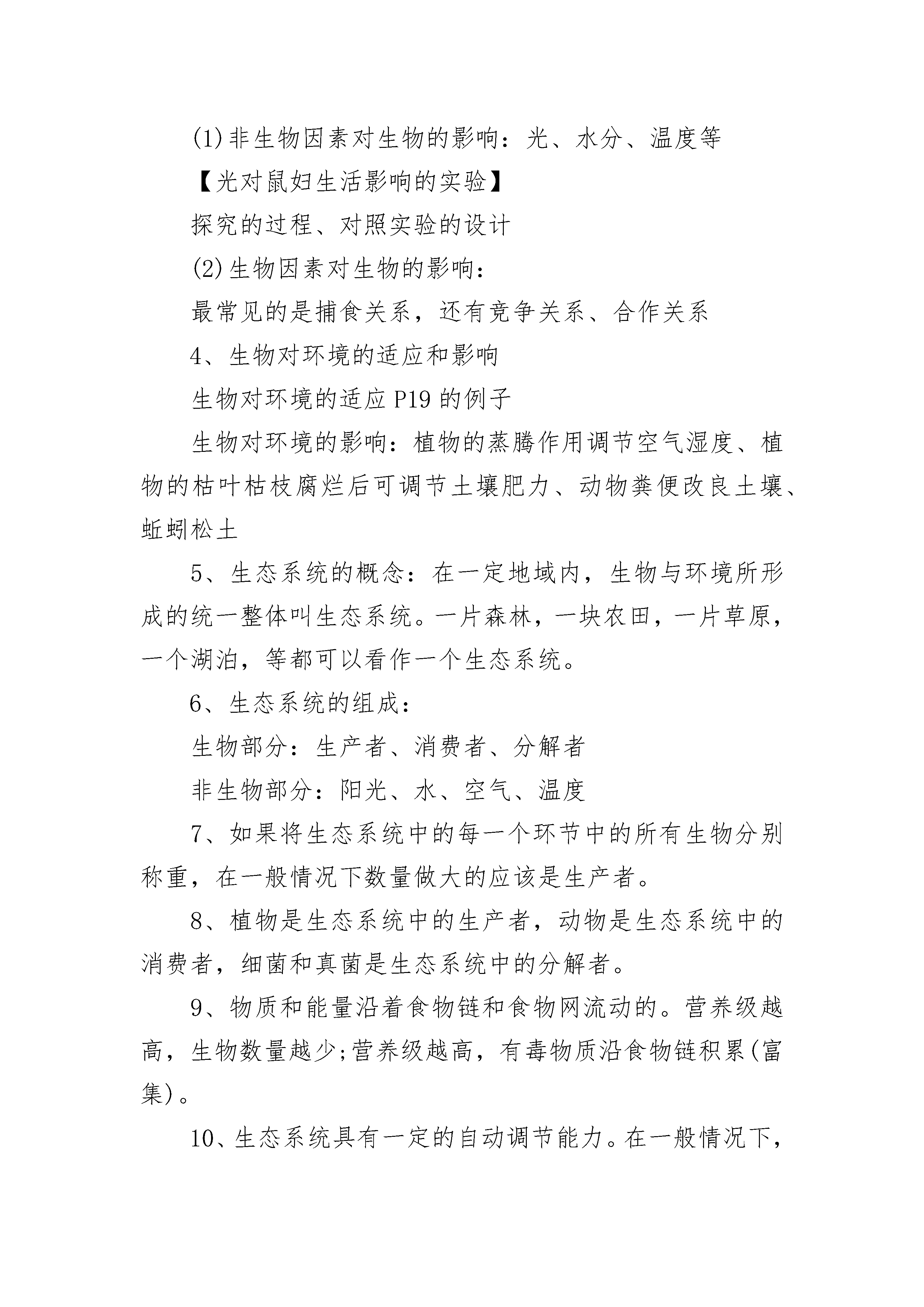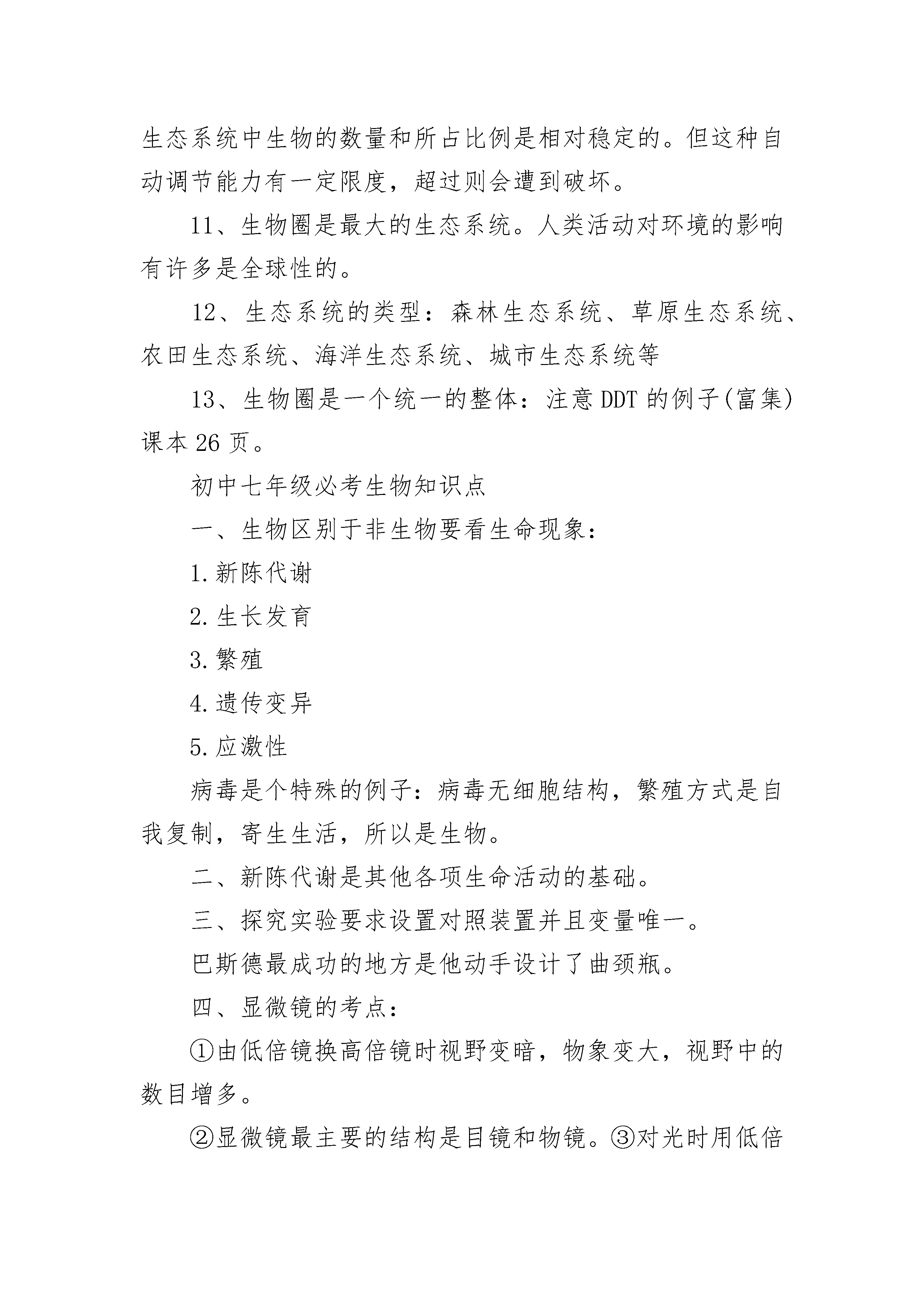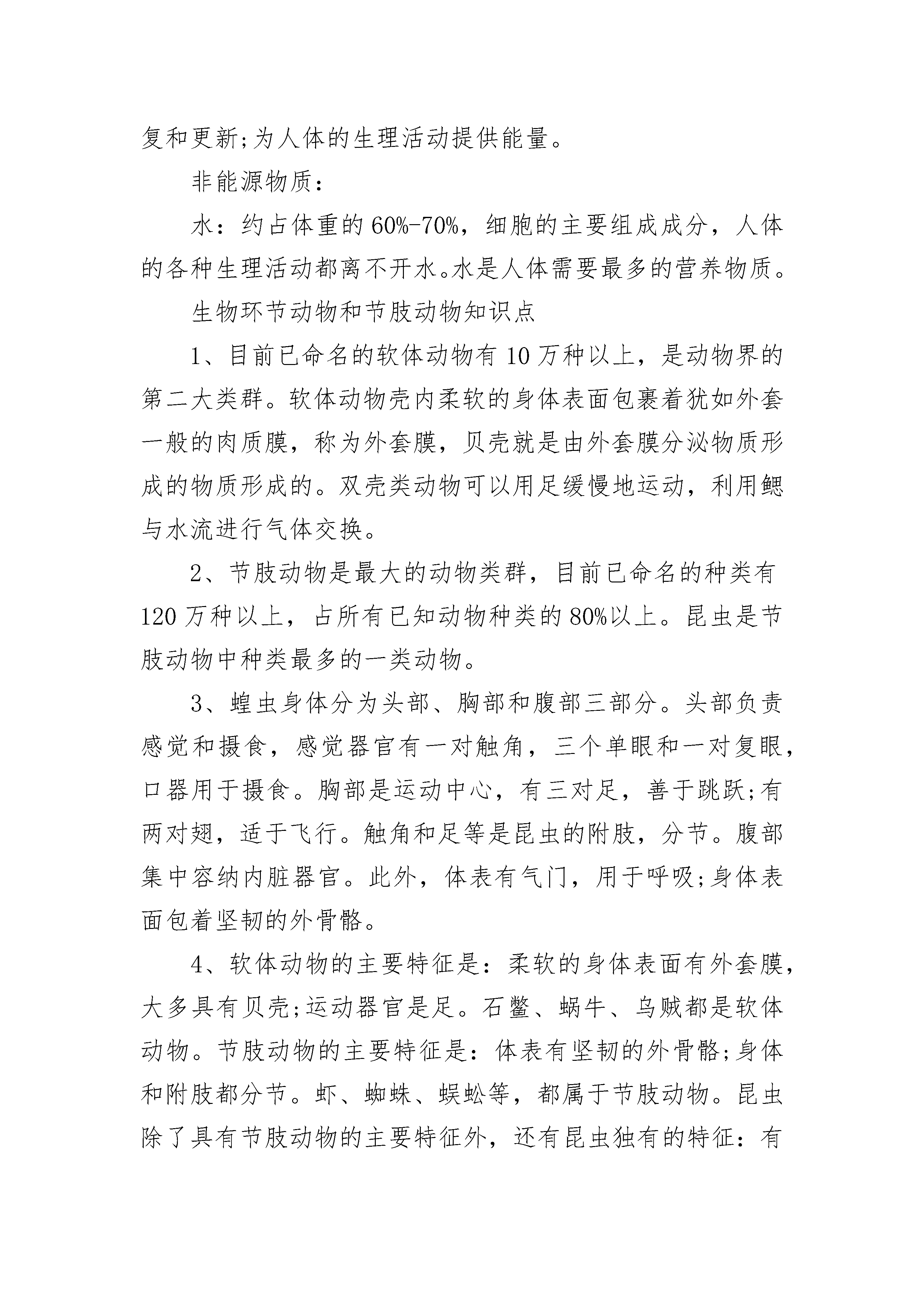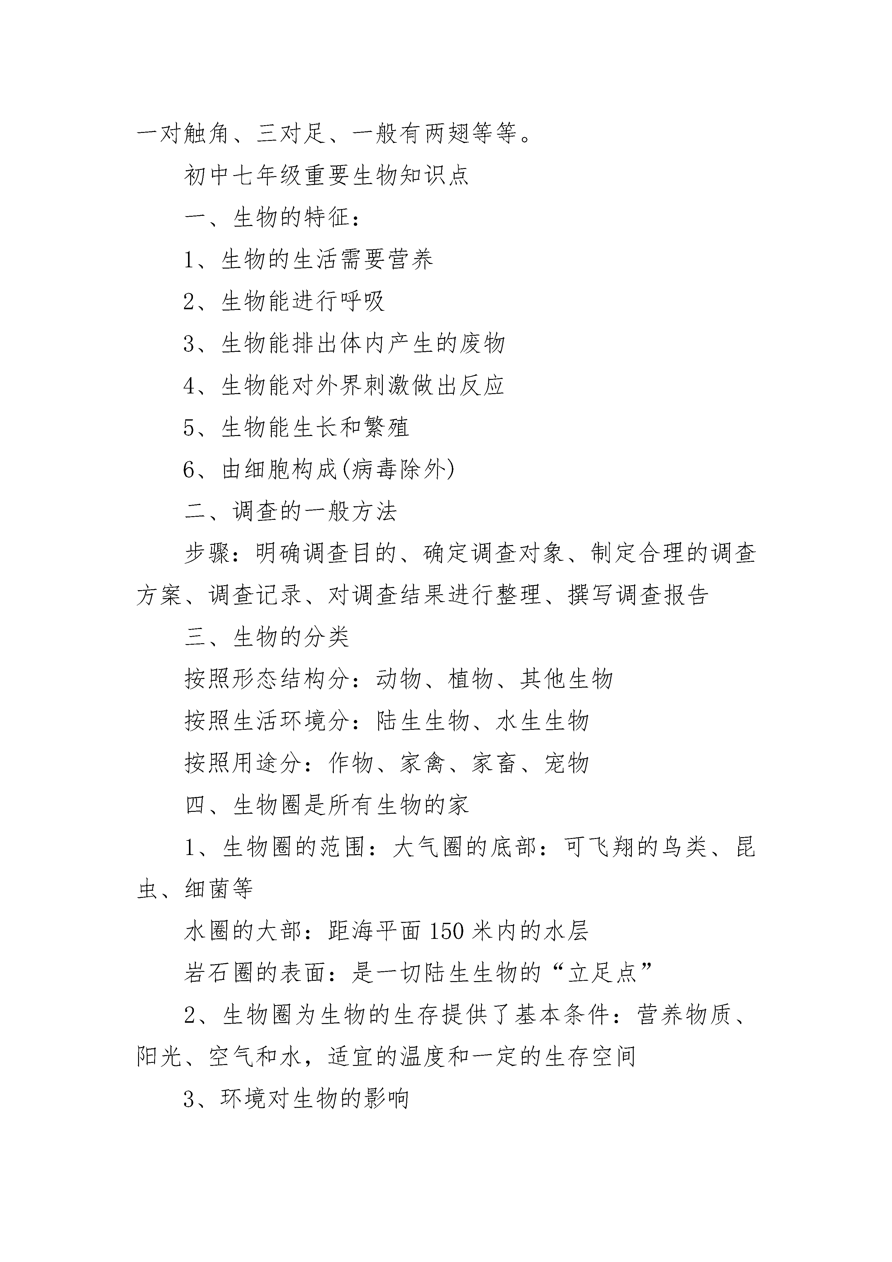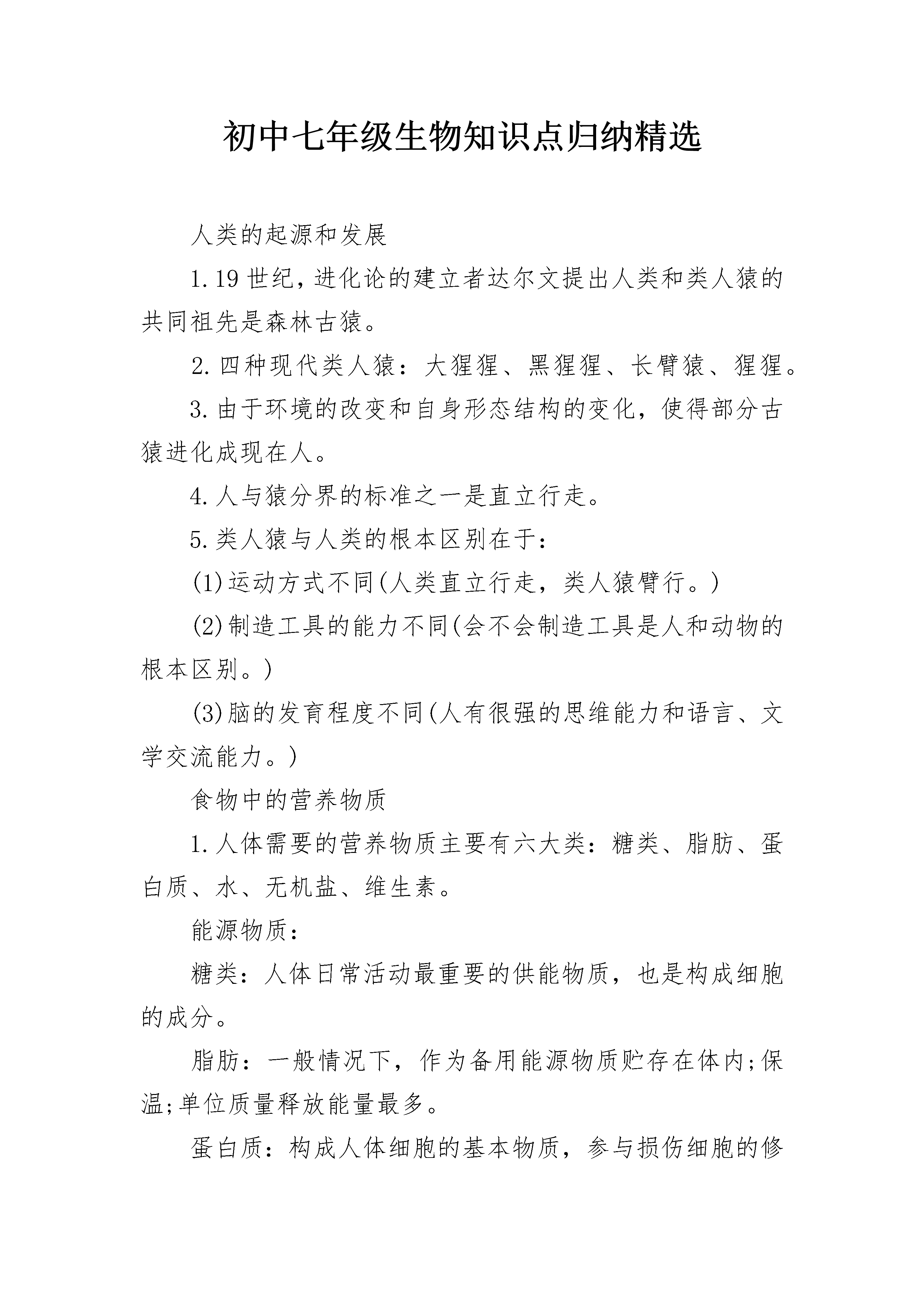 初中七年级生物知识点归纳精选人类的起源和发展1.19世纪,进化论的建立者达尔文提出人类和类人猿的共同祖先是森林古猿。2.四种现代类人猿:大猩猩、黑猩猩、长臂猿、猩猩。3.由于环境的改变和自身形态结构的变化,使得部分古猿进化成现在人。4.人与猿分界的标准之一是直立行走。5.类人猿与人类的根本区别在于:(1)运动方式不同(人类直立行走,类人猿臂行。)(2)制造工具的能力不同(会不会制造工具是人和动物的根本区别。)(3)脑的发育程度不同(人有很强的思维能力和语言、文学交流能力。)食物中的营养物质1.人体需要的营养物质主要有六大类:糖类、脂肪、蛋白质、水、无机盐、维生素。能源物质:糖类:人体日常活动最重要的供能物质,也是构成细胞的成分。脂肪:一般情况下,作为备用能源物质贮存在体内;保温;单位质量释放能量最多。蛋白质:构成人体细胞的基本物质,参与损伤细胞的修复和更新;为人体的生理活动提供能量。非能源物质:水:约占体重的60%-70%,细胞的主要组成成分,人体的各种生理活动都离不开水。水是人体需要最多的营养物质。生物环节动物和节肢动物知识点1、目前已命名的软体动物有10万种以上,是动物界的第二大类群。软体动物壳内柔软的身体表面包裹着犹如外套一般的肉质膜,称为外套膜,贝壳就是由外套膜分泌物质形成的物质形成的。双壳类动物可以用足缓慢地运动,利用鳃与水流进行气体交换。2、节肢动物是最大的动物类群,目前已命名的种类有120万种以上,占所有已知动物种类的80%以上。昆虫是节肢动物中种类最多的一类动物。3、蝗虫身体分为头部、胸部和腹部三部分。头部负责感觉和摄食,感觉器官有一对触角,三个单眼和一对复眼,口器用于摄食。胸部是运动中心,有三对足,善于跳跃;有两对翅,适于飞行。触角和足等是昆虫的附肢,分节。腹部集中容纳内脏器官。此外,体表有气门,用于呼吸;身体表面包着坚韧的外骨骼。4、软体动物的主要特征是:柔软的身体表面有外套膜,大多具有贝壳;运动器官是足。石鳖、蜗牛、乌贼都是软体动物。节肢动物的主要特征是:体表有坚韧的外骨骼;身体和附肢都分节。虾、蜘蛛、蜈蚣等,都属于节肢动物。昆虫除了具有节肢动物的主要特征外,还有昆虫独有的特征:有一对触角、三对足、一般有两翅等等。初中七年级重要生物知识点一、生物的特征:1、生物的生活需要营养2、生物能进行呼吸3、生物能排出体内产生的废物4、生物能对外界刺激做出反应5、生物能生长和繁殖6、由细胞构成(病毒除外)二、调查的一般方法步骤:明确调查目的、确定调查对象、制定合理的调查方案、调查记录、对调查结果进行整理、撰写调查报告三、生物的分类按照形态结构分:动物、植物、其他生物按照生活环境分:陆生生物、水生生物按照用途分:作物、家禽、家畜、宠物四、生物圈是所有生物的家1、生物圈的范围:大气圈的底部:可飞翔的鸟类、昆虫、细菌等水圈的大部:距海平面150米内的水层岩石圈的表面:是一切陆生生物的“立足点”2、生物圈为生物的生存提供了基本条件:营养物质、阳光、空气和水,适宜的温度和一定的生存空间3、环境对生物的影响(1)非生物因素对生物的影响:光、水分、温度等【光对鼠妇生活影响的实验】探究的过程、对照实验的设计(2)生物因素对生物的影响:最常见的是捕食关系,还有竞争关系、合作关系4、生物对环境的适应和影响生物对环境的适应P19的例子生物对环境的影响:植物的蒸腾作用调节空气湿度、植物的枯叶枯枝腐烂后可调节土壤肥力、动物粪便改良土壤、蚯蚓松土5、生态系统的概念:在一定地域内,生物与环境所形成的统一整体叫生态系统。一片森林,一块农田,一片草原,一个湖泊,等都可以看作一个生态系统。6、生态系统的组成:生物部分:生产者、消费者、分解者非生物部分:阳光、水、空气、温度7、如果将生态系统中的每一个环节中的所有生物分别称重,在一般情况下数量做大的应该是生产者。8、植物是生态系统中的生产者,动物是生态系统中的消费者,细菌和真菌是生态系统中的分解者。9、物质和能量沿着食物链和食物网流动的。营养级越高,生物数量越少;营养级越高,有毒物质沿食物链积累(富集)。10、生态系统具有一定的自动调节能力。在一般情况下,生态系统中生物的数量和所占比例是相对稳定的。但这种自动调节能力有一定限度,超过则会遭到破坏。11、生物圈是最大的生态系统。人类活动对环境的影响有许多是全球性的。12、生态系统的类型:森林生态系统、草原生态系统、农田生态系统、海洋生态系统、城市生态系统等13、生物圈是一个统一的整体:注意DDT的例子(富集)课本26页。初中七年级必考生物知识点一、生物区别于非生物要看生命现象:1.新陈代谢2.生长发育3.繁殖4.遗传变异5.应激性病毒是个特殊的例子:病毒无细胞结构,繁殖方式是自我复制,寄生生活,所以是生物。二、新陈代谢是其他各项生命活动的基础。三、探究实