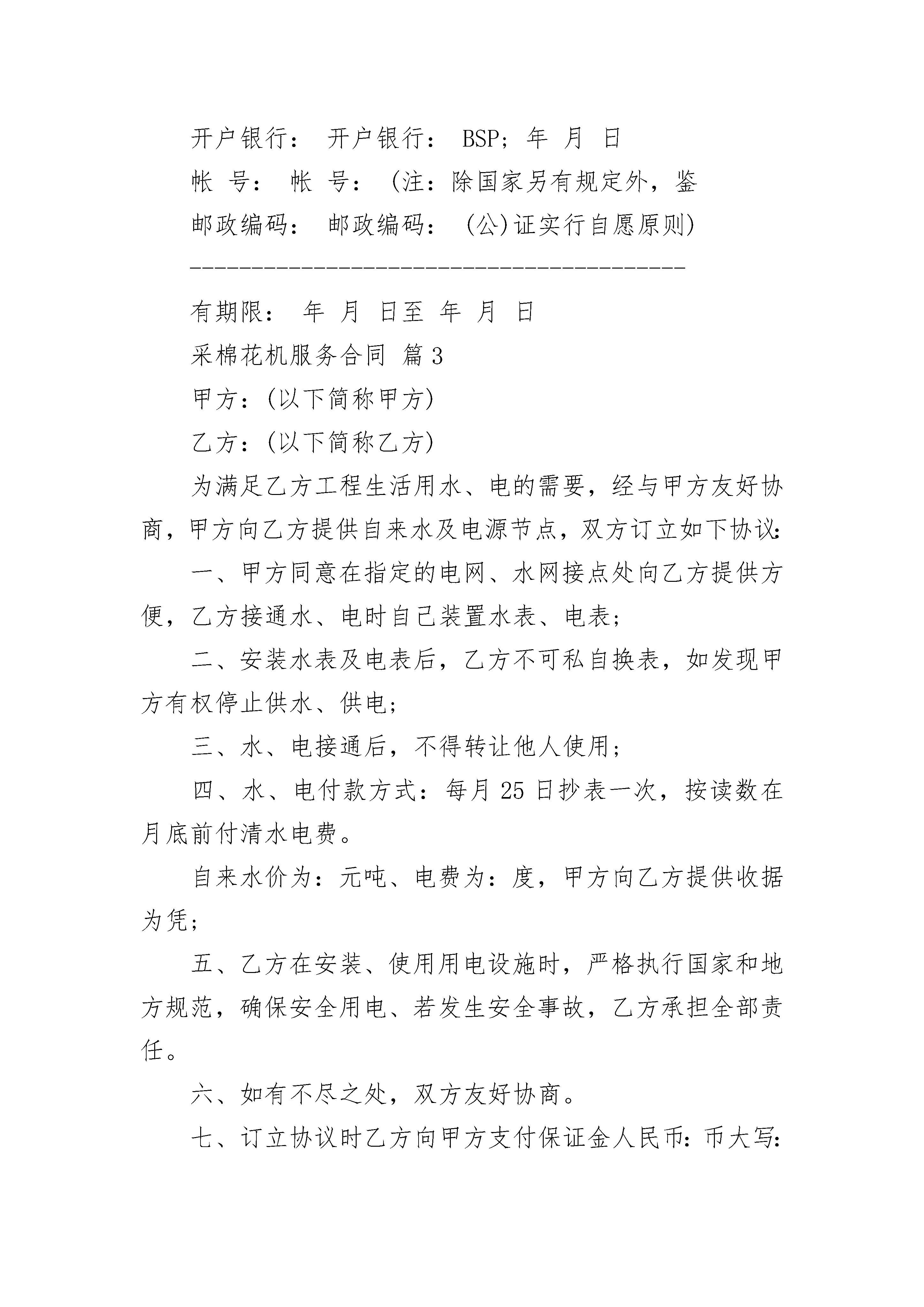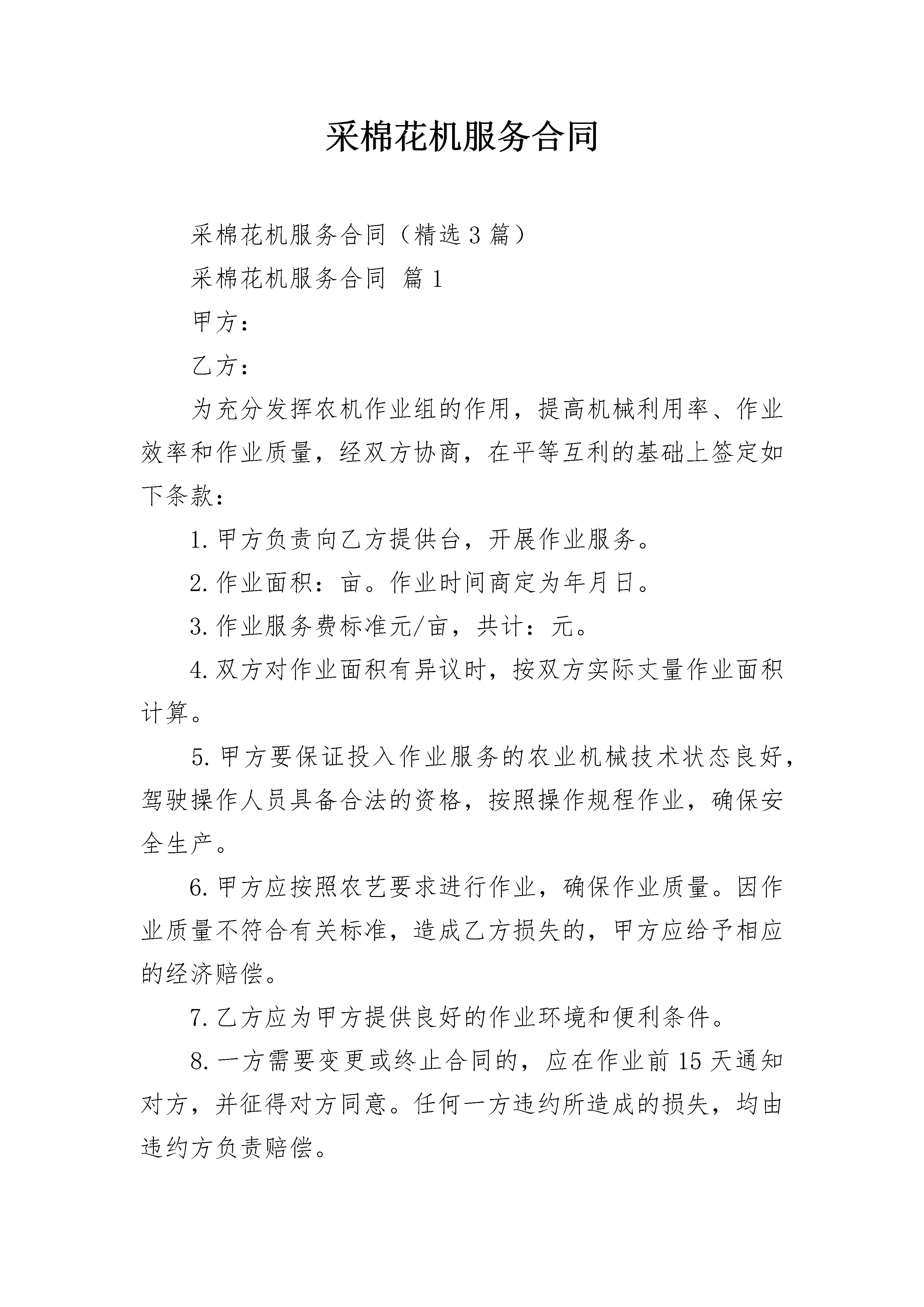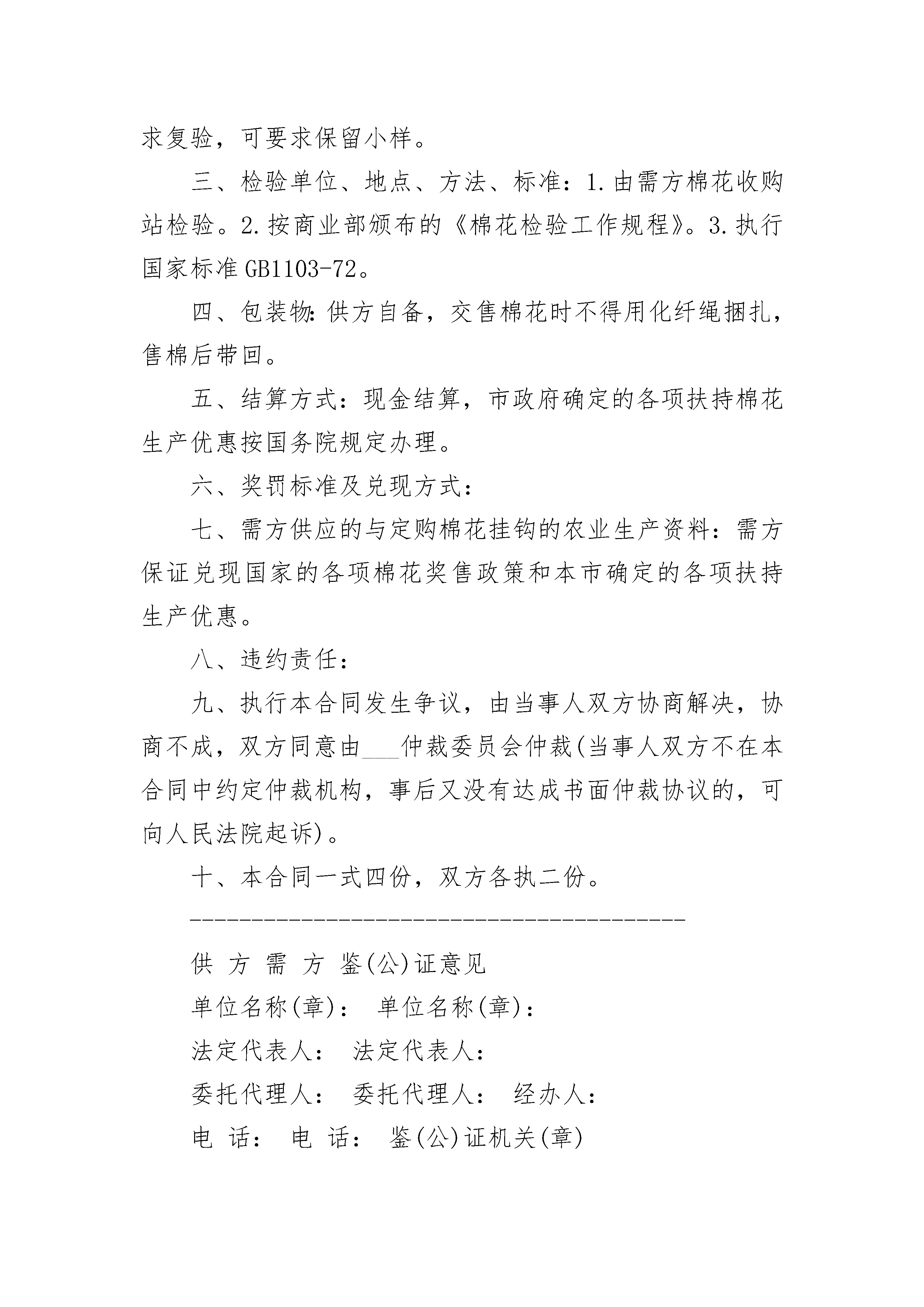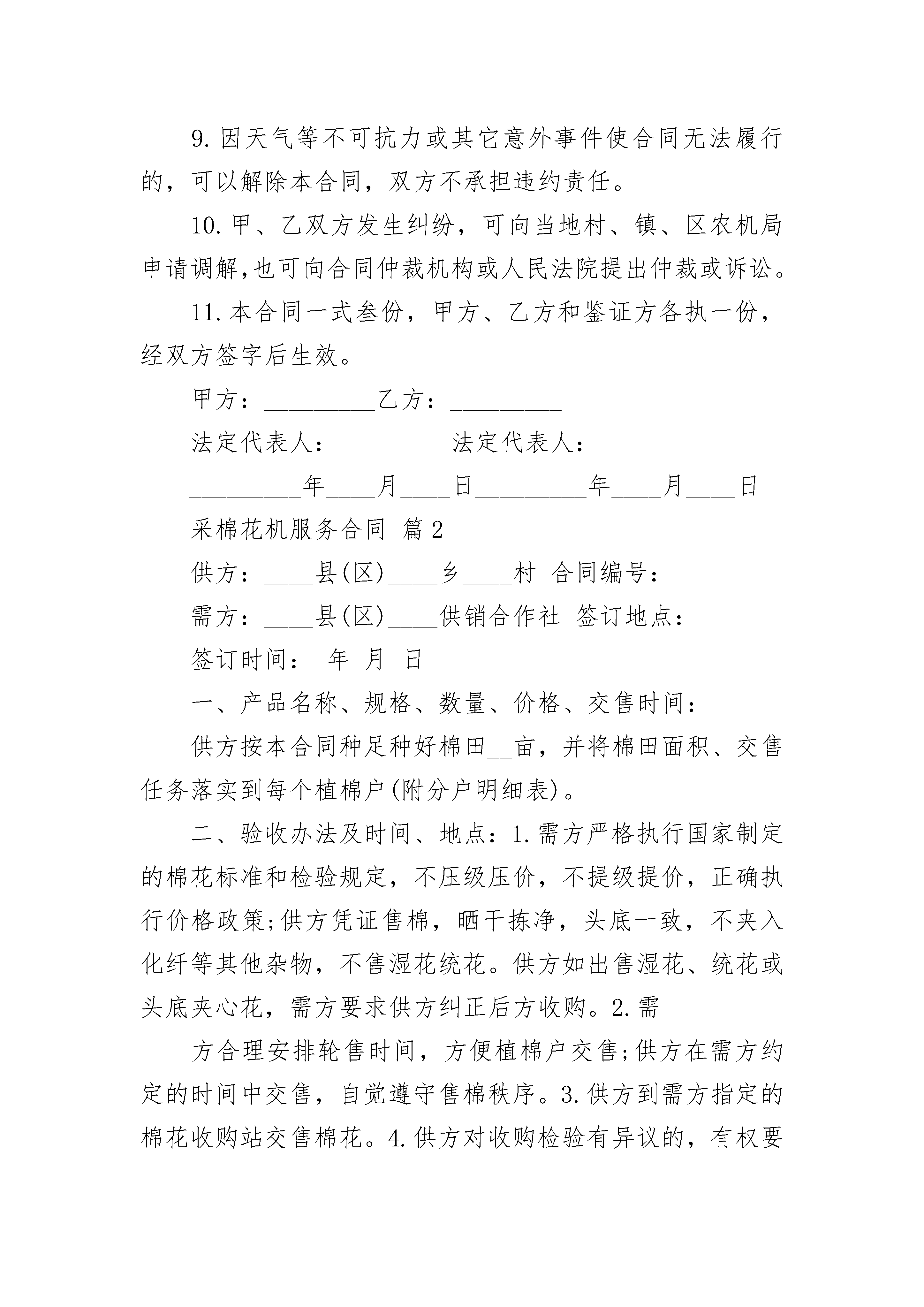 采棉花机服务合同采棉花机服务合同(精选3篇)采棉花机服务合同篇1甲方:乙方:为充分发挥农机作业组的作用,提高机械利用率、作业效率和作业质量,经双方协商,在平等互利的基础上签定如下条款:1.甲方负责向乙方提供台,开展作业服务。2.作业面积:亩。作业时间商定为年月日。3.作业服务费标准元/亩,共计:元。4.双方对作业面积有异议时,按双方实际丈量作业面积计算。5.甲方要保证投入作业服务的农业机械技术状态良好,驾驶操作人员具备合法的资格,按照操作规程作业,确保安全生产。6.甲方应按照农艺要求进行作业,确保作业质量。因作业质量不符合有关标准,造成乙方损失的,甲方应给予相应的经济赔偿。7.乙方应为甲方提供良好的作业环境和便利条件。8.一方需要变更或终止合同的,应在作业前15天通知对方,并征得对方同意。任何一方违约所造成的损失,均由违约方负责赔偿。9.因天气等不可抗力或其它意外事件使合同无法履行的,可以解除本合同,双方不承担违约责任。10.甲、乙双方发生纠纷,可向当地村、镇、区农机局申请调解,也可向合同仲裁机构或人民法院提出仲裁或诉讼。11.本合同一式叁份,甲方、乙方和鉴证方各执一份,经双方签字后生效。甲方:_________乙方:_________法定代表人:_________法定代表人:__________________年____月____日_________年____月____日采棉花机服务合同篇2供方:____县(区)____乡____村合同编号:需方:____县(区)____供销合作社签订地点:签订时间:年月日一、产品名称、规格、数量、价格、交售时间:供方按本合同种足种好棉田__亩,并将棉田面积、交售任务落实到每个植棉户(附分户明细表)。二、验收办法及时间、地点:1.需方严格执行国家制定的棉花标准和检验规定,不压级压价,不提级提价,正确执行价格政策;供方凭证售棉,晒干拣净,头底一致,不夹入化纤等其他杂物,不售湿花统花。供方如出售湿花、统花或头底夹心花,需方要求供方纠正后方收购。2.需方合理安排轮售时间,方便植棉户交售;供方在需方约定的时间中交售,自觉遵守售棉秩序。3.供方到需方指定的棉花收购站交售棉花。4.供方对收购检验有异议的,有权要求复验,可要求保留小样。三、检验单位、地点、方法、标准:1.由需方棉花收购站检验。2.按商业部颁布的《棉花检验工作规程》。3.执行国家标准GB1103-72。四、包装物:供方自备,交售棉花时不得用化纤绳捆扎,售棉后带回。五、结算方式:现金结算,市政府确定的各项扶持棉花生产优惠按国务院规定办理。六、奖罚标准及兑现方式:七、需方供应的与定购棉花挂钩的农业生产资料:需方保证兑现国家的各项棉花奖售政策和本市确定的各项扶持生产优惠。八、违约责任:九、执行本合同发生争议,由当事人双方协商解决,协商不成,双方同意由___仲裁委员会仲裁(当事人双方不在本合同中约定仲裁机构,事后又没有达成书面仲裁协议的,可向人民法院起诉)。十、本合同一式四份,双方各执二份。----------------------------------------供方需方鉴(公)证意见单位名称(章):单位名称(章):法定代表人:法定代表人:委托代理人:委托代理人:经办人:电话:电话:鉴(公)证机关(章)开户银行:开户银行:BSP;年月日帐号:帐号:(注:除国家另有规定外,鉴邮政编码:邮政编码:(公)证实行自愿原则)----------------------------------------有期限:年月日至年月日采棉花机服务合同篇3甲方:(以下简称甲方)乙方:(以下简称乙方)为满足乙方工程生活用水、电的需要,经与甲方友好协商,甲方向乙方提供自来水及电源节点,双方订立如下协议:一、甲方同意在指定的电网、水网接点处向乙方提供方便,乙方接通水、电时自己装置水表、电表;二、安装水表及电表后,乙方不可私自换表,如发现甲方有权停止供水、供电;三、水、电接通后,不得转让他人使用;四、水、电付款方式:每月25日抄表一次,按读数在月底前付清水电费。自来水价为:元吨、电费为:度,甲方向乙方提供收据为凭;五、乙方在安装、使用用电设施时,严格执行国家和地方规范,确保安全用电、若发生安全事故,乙方承担全部责任。六、如有不尽之处,双方友好协商。七、订立协议时乙方向甲方支付保证金人民币:币大写:伍仟元整),工程完工后,乙方承担全部应付款项后,甲方一次性退付押金。如乙方在施工中用电用水有违规行为,甲方一旦查到,按已用读数双倍补偿并拒退押金,八、以上协议一式二份,双方共同遵守。甲方:无锡阳光置业有限公司乙方:电话:电话:日期:日期: