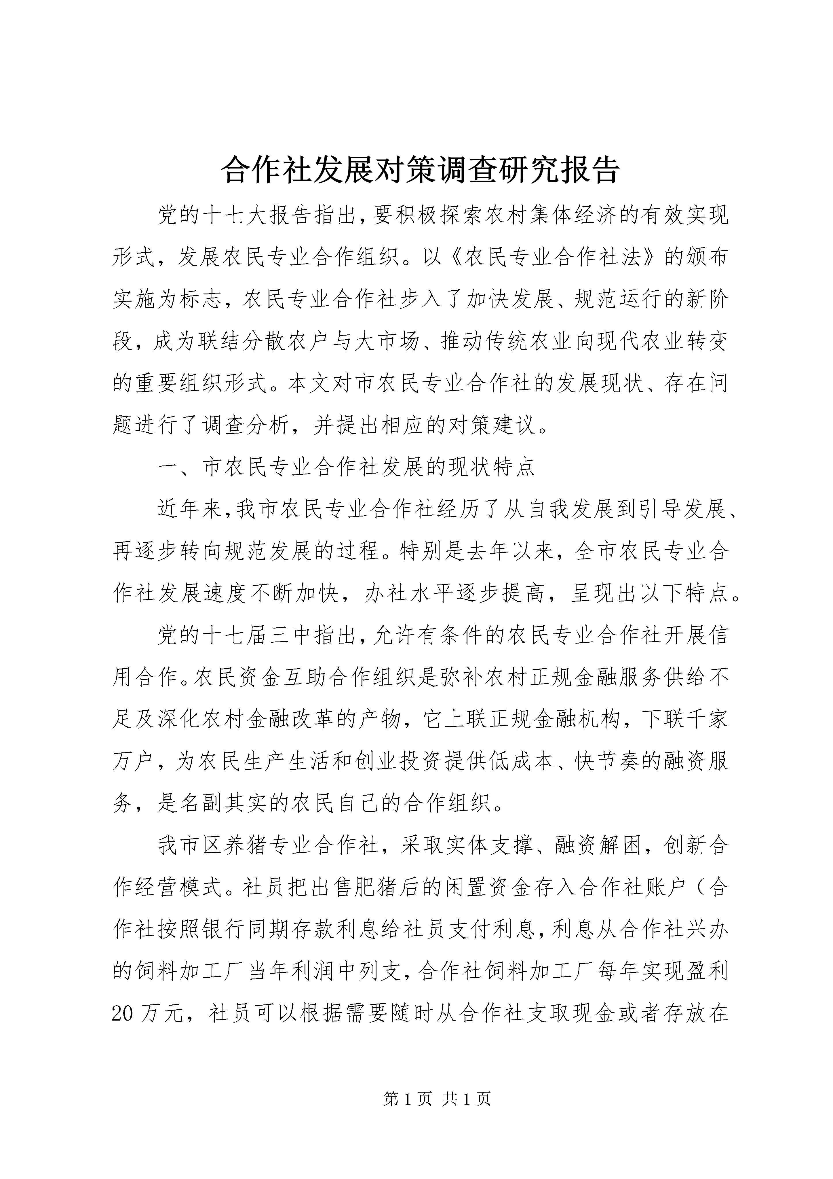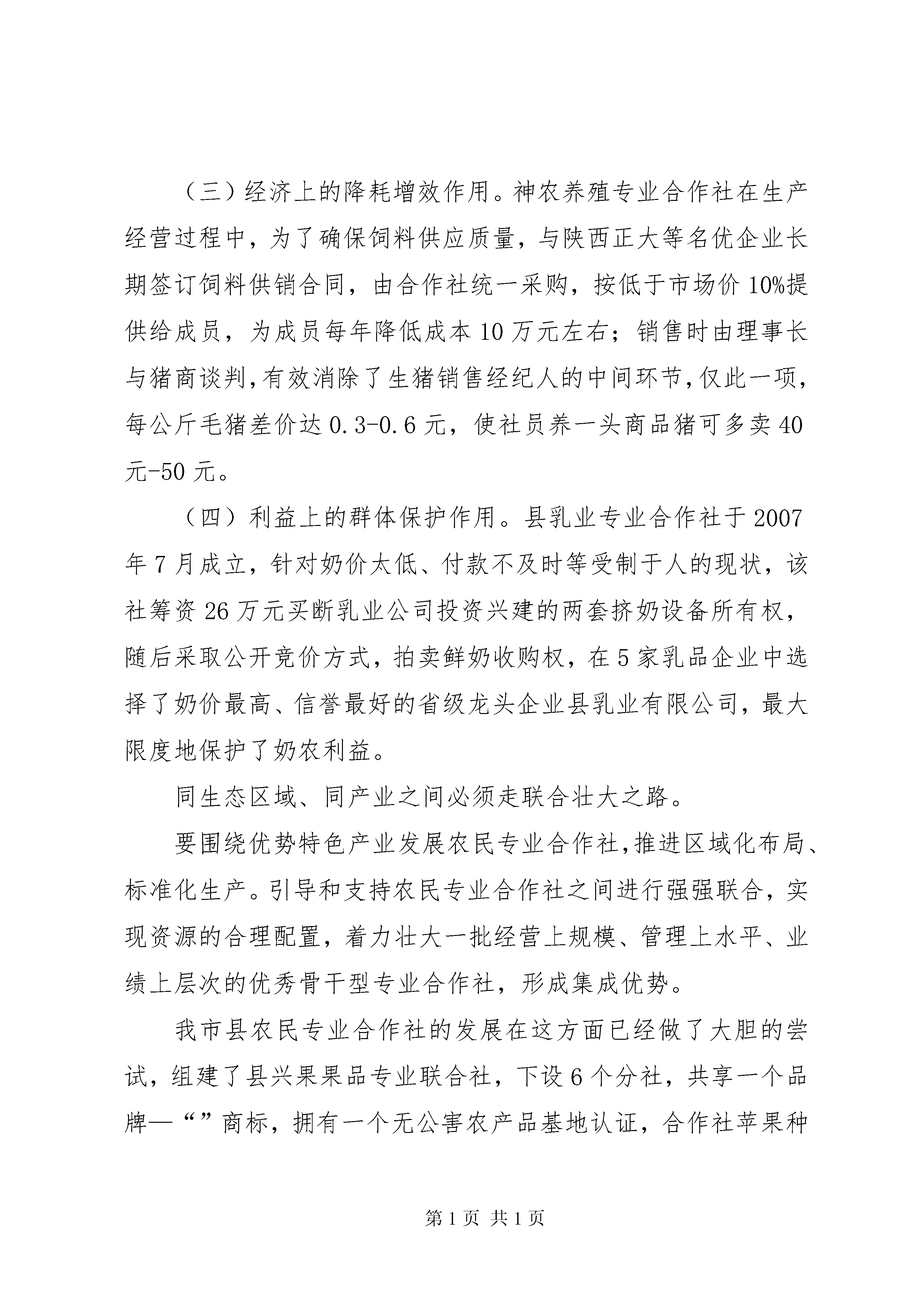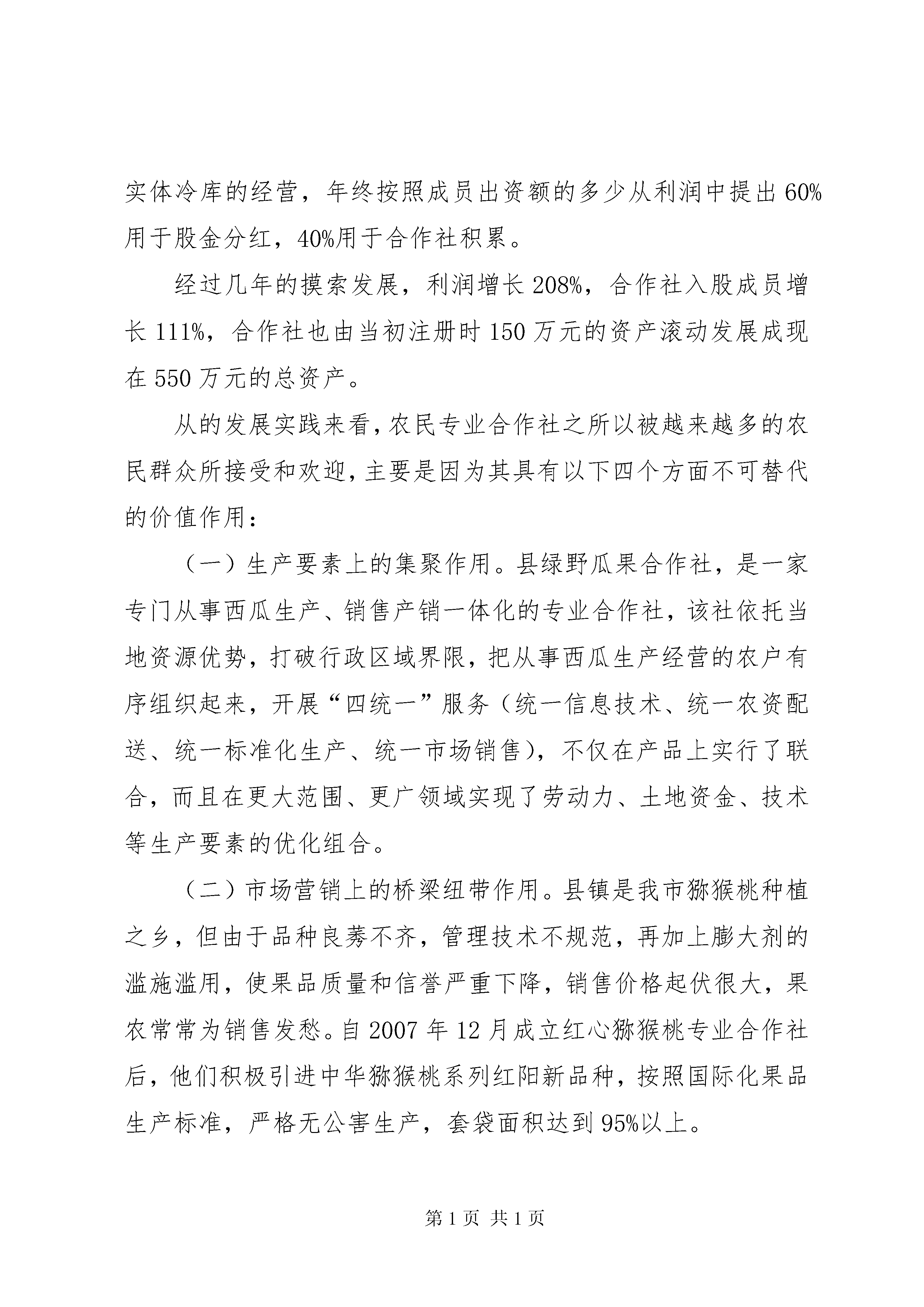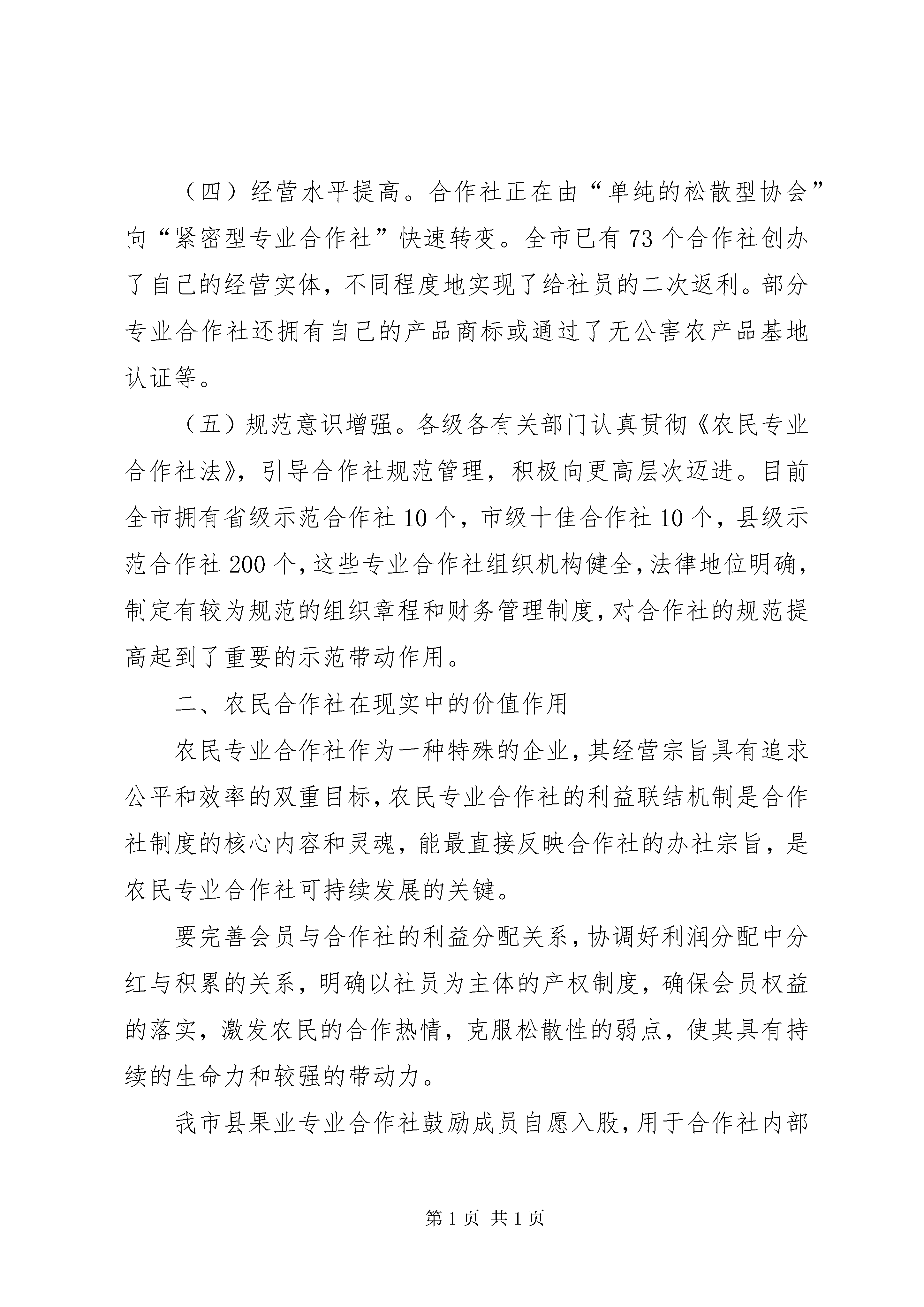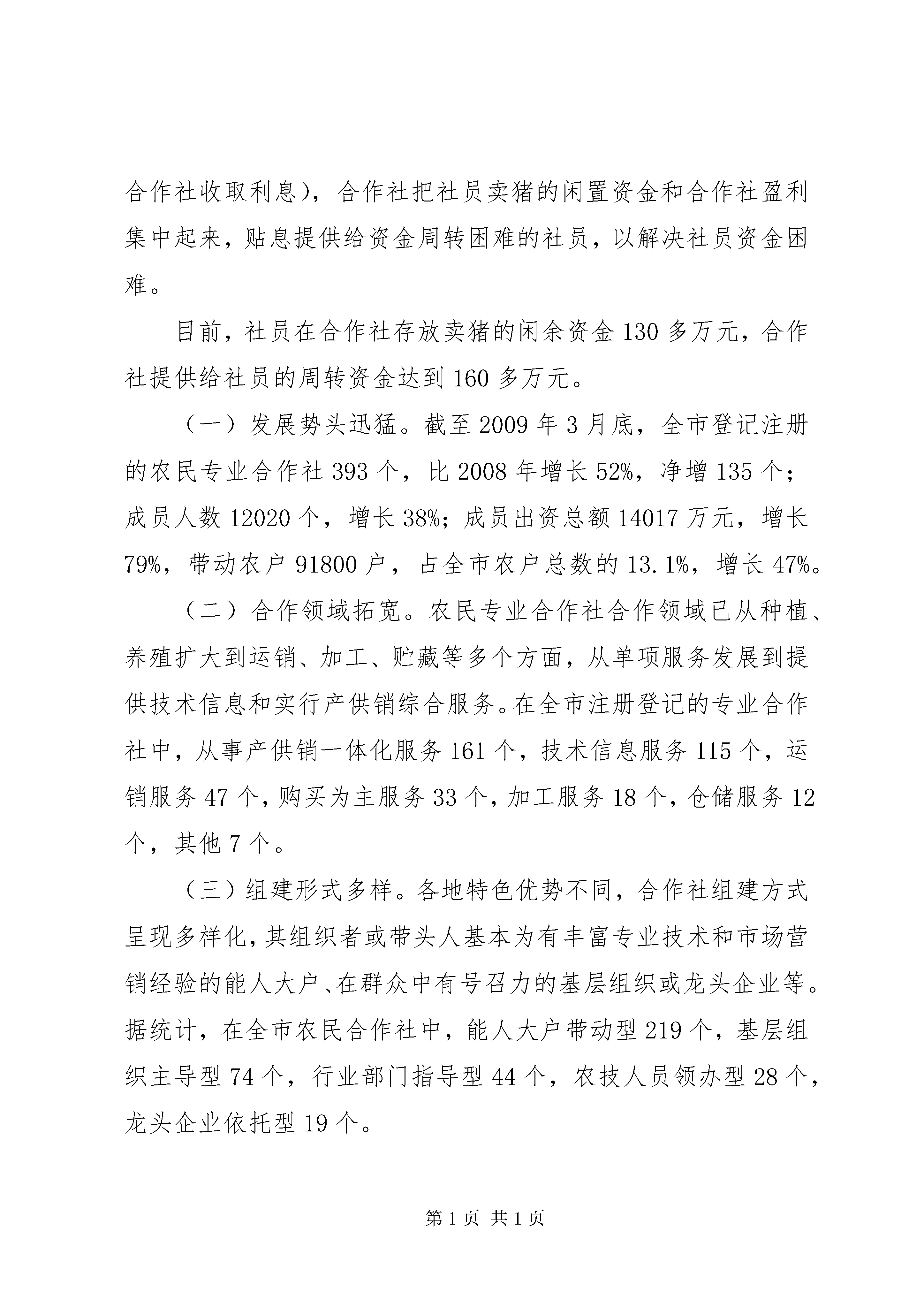 合作社发展对策调查研究报告党的十七大报告指出,要积极探索农村集体经济的有效实现形式,发展农民专业合作组织。以《农民专业合作社法》的颁布实施为标志,农民专业合作社步入了加快发展、规范运行的新阶段,成为联结分散农户与大市场、推动传统农业向现代农业转变的重要组织形式。本文对市农民专业合作社的发展现状、存在问题进行了调查分析,并提出相应的对策建议。一、市农民专业合作社发展的现状特点近年来,我市农民专业合作社经历了从自我发展到引导发展、再逐步转向规范发展的过程。特别是去年以来,全市农民专业合作社发展速度不断加快,办社水平逐步提高,呈现出以下特点。党的十七届三中指出,允许有条件的农民专业合作社开展信用合作。农民资金互助合作组织是弥补农村正规金融服务供给不足及深化农村金融改革的产物,它上联正规金融机构,下联千家万户,为农民生产生活和创业投资提供低成本、快节奏的融资服务,是名副其实的农民自己的合作组织。我市区养猪专业合作社,采取实体支撑、融资解困,创新合作经营模式。社员把出售肥猪后的闲置资金存入合作社账户(合作社按照银行同期存款利息给社员支付利息,利息从合作社兴办的饲料加工厂当年利润中列支,合作社饲料加工厂每年实现盈利20万元,社员可以根据需要随时从合作社支取现金或者存放在合作社收取利息),合作社把社员卖猪的闲置资金和合作社盈利集中起来,贴息提供给资金周转困难的社员,以解决社员资金困难。目前,社员在合作社存放卖猪的闲余资金130多万元,合作社提供给社员的周转资金达到160多万元。(一)发展势头迅猛。截至2009年3月底,全市登记注册的农民专业合作社393个,比2008年增长52%,净增135个;成员人数12020个,增长38%;成员出资总额14017万元,增长79%,带动农户91800户,占全市农户总数的13.1%,增长47%。(二)合作领域拓宽。农民专业合作社合作领域已从种植、养殖扩大到运销、加工、贮藏等多个方面,从单项服务发展到提供技术信息和实行产供销综合服务。在全市注册登记的专业合作社中,从事产供销一体化服务161个,技术信息服务115个,运销服务47个,购买为主服务33个,加工服务18个,仓储服务12个,其他7个。(三)组建形式多样。各地特色优势不同,合作社组建方式呈现多样化,其组织者或带头人基本为有丰富专业技术和市场营销经验的能人大户、在群众中有号召力的基层组织或龙头企业等。据统计,在全市农民合作社中,能人大户带动型219个,基层组织主导型74个,行业部门指导型44个,农技人员领办型28个,龙头企业依托型19个。(四)经营水平提高。合作社正在由“单纯的松散型协会”向“紧密型专业合作社”快速转变。全市已有73个合作社创办了自己的经营实体,不同程度地实现了给社员的二次返利。部分专业合作社还拥有自己的产品商标或通过了无公害农产品基地认证等。(五)规范意识增强。各级各有关部门认真贯彻《农民专业合作社法》,引导合作社规范管理,积极向更高层次迈进。目前全市拥有省级示范合作社10个,市级十佳合作社10个,县级示范合作社200个,这些专业合作社组织机构健全,法律地位明确,制定有较为规范的组织章程和财务管理制度,对合作社的规范提高起到了重要的示范带动作用。二、农民合作社在现实中的价值作用农民专业合作社作为一种特殊的企业,其经营宗旨具有追求公平和效率的双重目标,农民专业合作社的利益联结机制是合作社制度的核心内容和灵魂,能最直接反映合作社的办社宗旨,是农民专业合作社可持续发展的关键。要完善会员与合作社的利益分配关系,协调好利润分配中分红与积累的关系,明确以社员为主体的产权制度,确保会员权益的落实,激发农民的合作热情,克服松散性的弱点,使其具有持续的生命力和较强的带动力。我市县果业专业合作社鼓励成员自愿入股,用于合作社内部实体冷库的经营,年终按照成员出资额的多少从利润中提出60%用于股金分红,40%用于合作社积累。经过几年的摸索发展,利润增长208%,合作社入股成员增长111%,合作社也由当初注册时150万元的资产滚动发展成现在550万元的总资产。从的发展实践来看,农民专业合作社之所以被越来越多的农民群众所接受和欢迎,主要是因为其具有以下四个方面不可替代的价值作用:(一)生产要素上的集聚作用。县绿野瓜果合作社,是一家专门从事西瓜生产、销售产销一体化的专业合作社,该社依托当地资源优势,打破行政区域界限,把从事西瓜生产经营的农户有序组织起来,开展“四统一”服务(统一信息技术、统一农资配送、统一标准化生产、统一市场销售),不仅在产品上实行了联合,而且在更大范围、更广领域实现了劳动力、土地资金、技术等生产要素的优化组合。(二)市场营销上的桥梁纽带作用。县镇是我市猕猴桃种植之乡,但由于品种良莠不齐,管理技术不规范,再加上膨大剂的滥施滥用,使