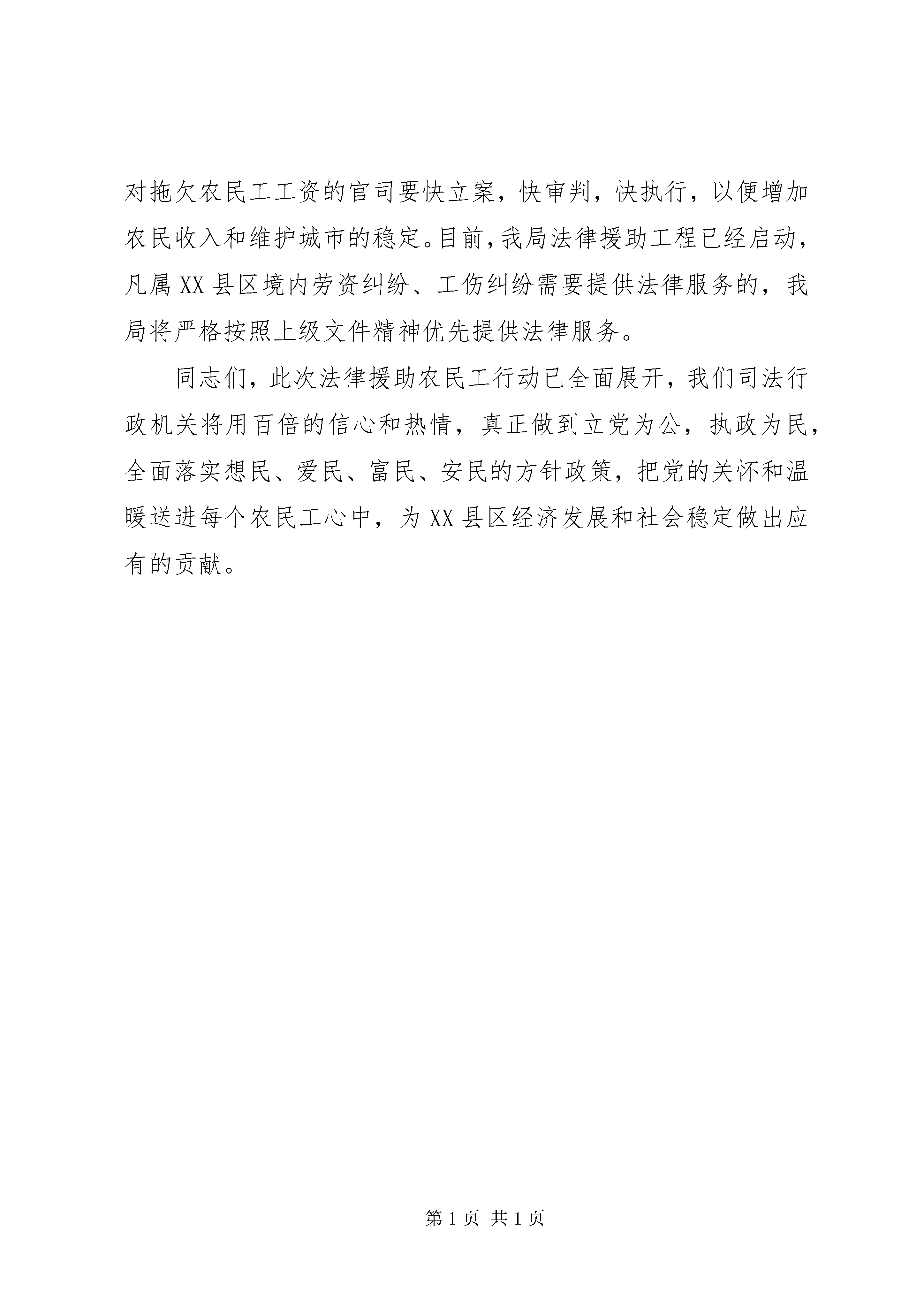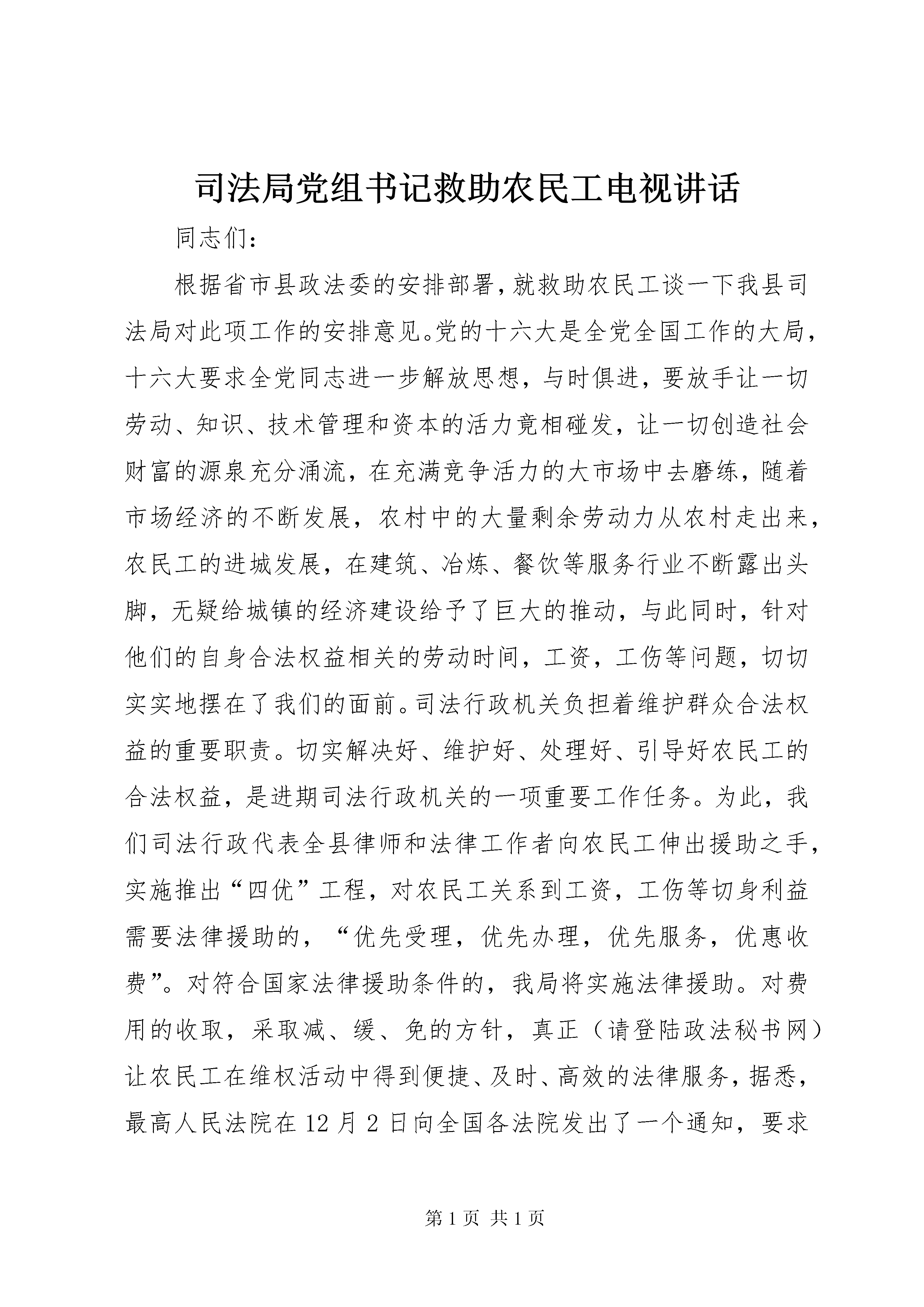司法局党组书记救助农民工电视讲话同志们:根据省市县政法委的安排部署,就救助农民工谈一下我县司法局对此项工作的安排意见。党的十六大是全党全国工作的大局,十六大要求全党同志进一步解放思想,与时俱进,要放手让一切劳动、知识、技术管理和资本的活力竟相碰发,让一切创造社会财富的源泉充分涌流,在充满竞争活力的大市场中去磨练,随着市场经济的不断发展,农村中的大量剩余劳动力从农村走出来,农民工的进城发展,在建筑、冶炼、餐饮等服务行业不断露出头脚,无疑给城镇的经济建设给予了巨大的推动,与此同时,针对他们的自身合法权益相关的劳动时间,工资,工伤等问题,切切实实地摆在了我们的面前。司法行政机关负担着维护群众合法权益的重要职责。切实解决好、维护好、处理好、引导好农民工的合法权益,是进期司法行政机关的一项重要工作任务。为此,我们司法行政代表全县律师和法律工作者向农民工伸出援助之手,实施推出“四优”工程,对农民工关系到工资,工伤等切身利益需要法律援助的,“优先受理,优先办理,优先服务,优惠收费”。对符合国家法律援助条件的,我局将实施法律援助。对费用的收取,采取减、缓、免的方针,真正(请登陆政法秘书网)让农民工在维权活动中得到便捷、及时、高效的法律服务,据悉,最高人民法院在12月2日向全国各法院发出了一个通知,要求对拖欠农民工工资的官司要快立案,快审判,快执行,以便增加农民收入和维护城市的稳定。目前,我局法律援助工程已经启动,凡属XX县区境内劳资纠纷、工伤纠纷需要提供法律服务的,我局将严格按照上级文件精神优先提供法律服务。同志们,此次法律援助农民工行动已全面展开,我们司法行政机关将用百倍的信心和热情,真正做到立党为公,执政为民,全面落实想民、爱民、富民、安民的方针政策,把党的关怀和温暖送进每个农民工心中,为XX县区经济发展和社会稳定做出应有的贡献。