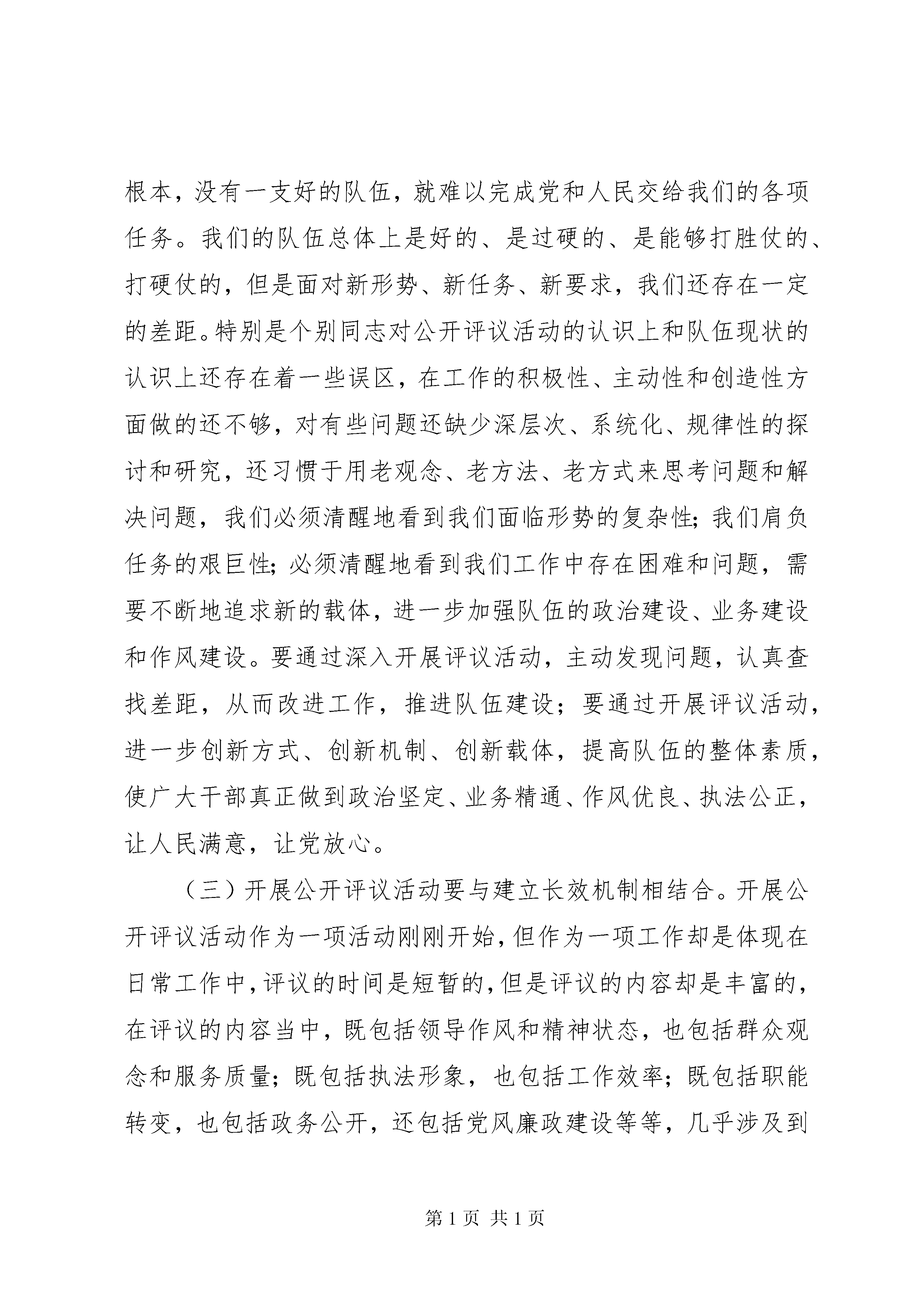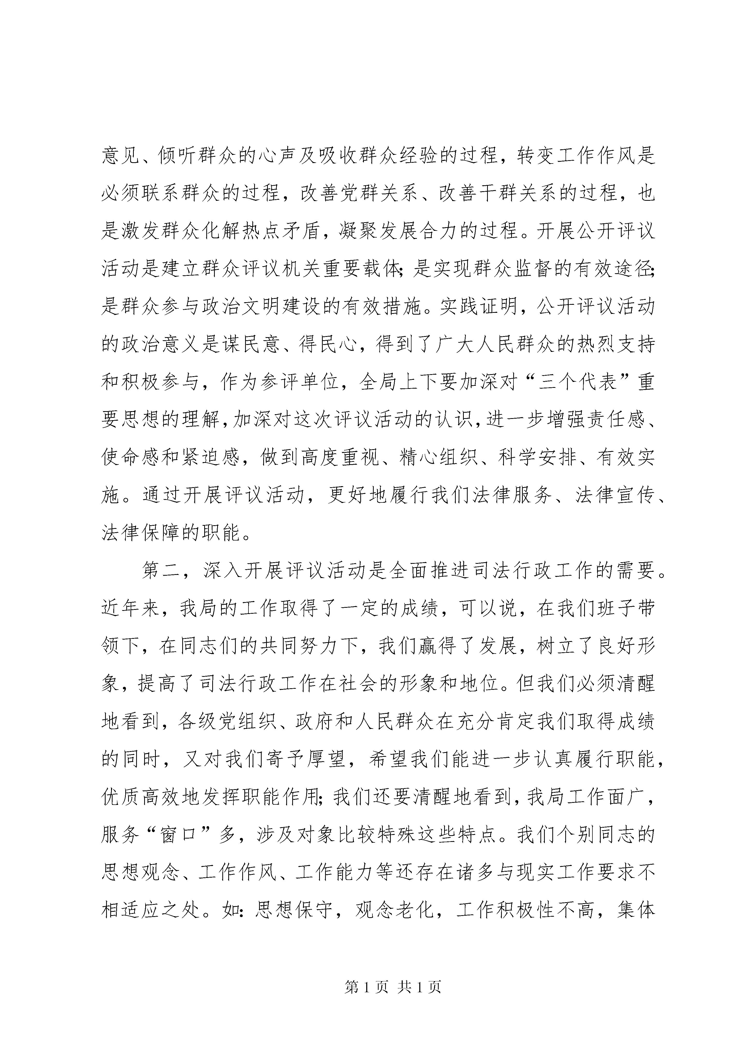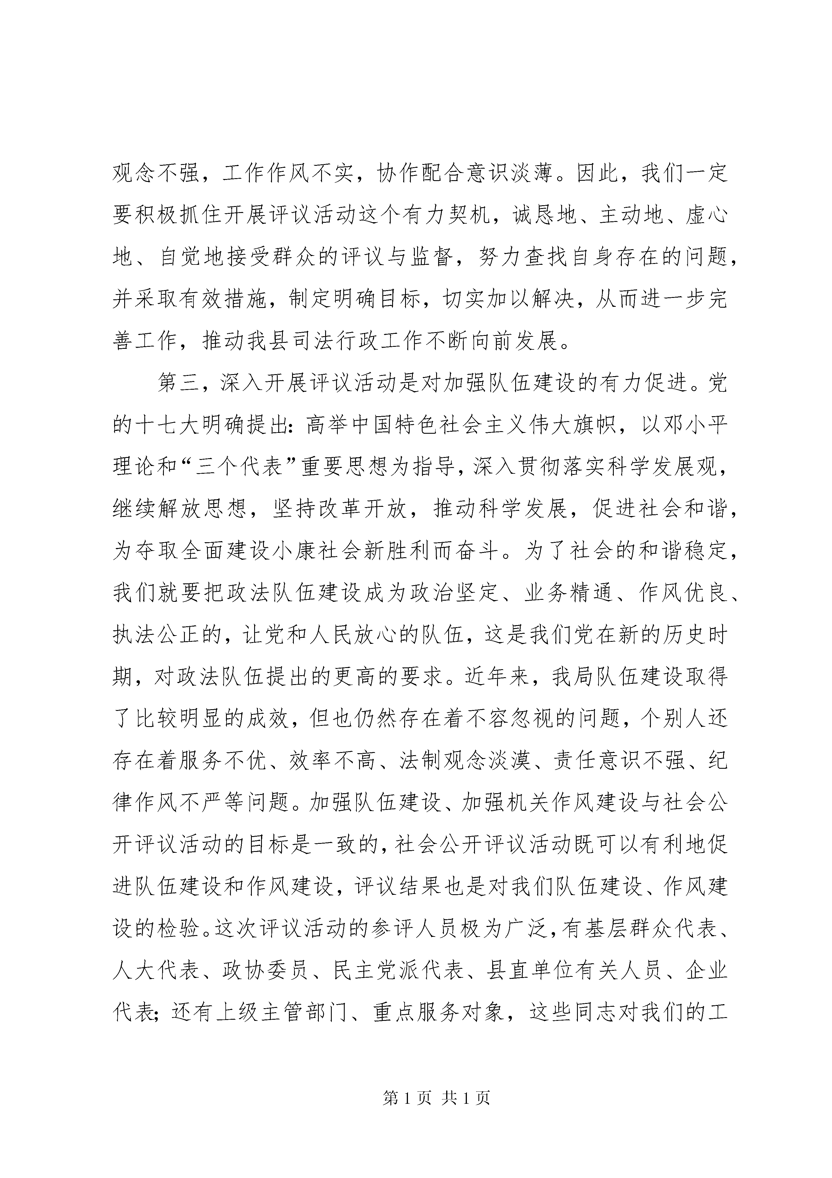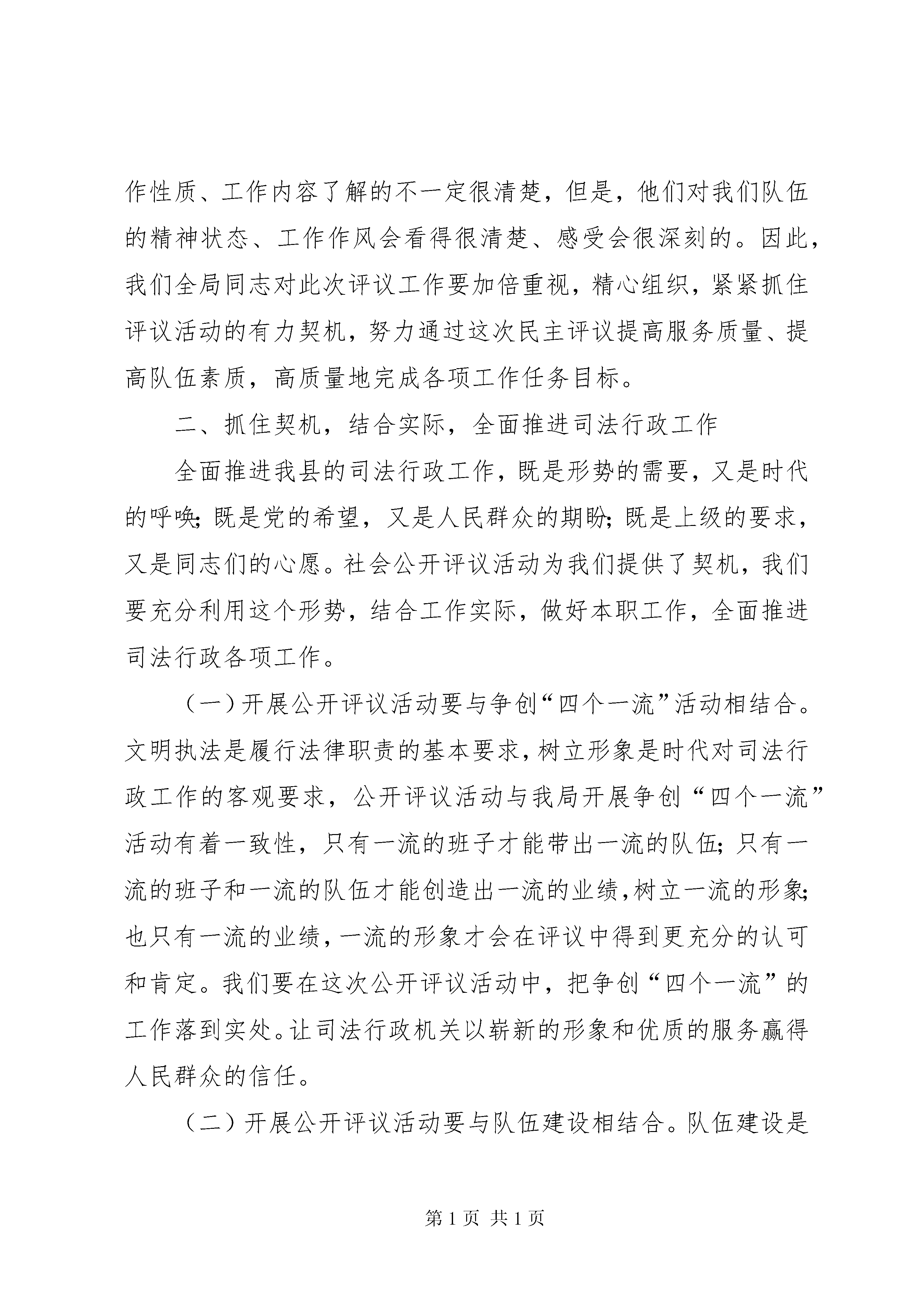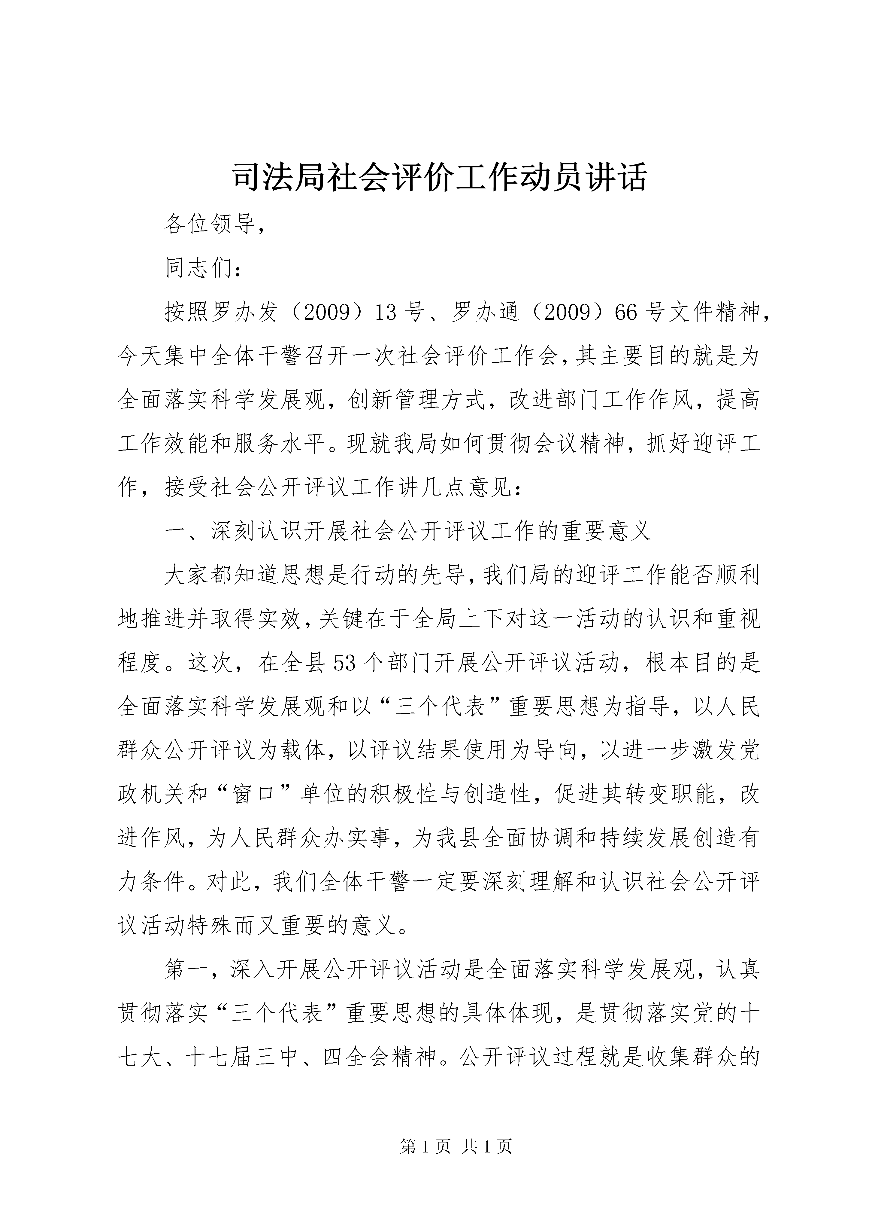 司法局社会评价工作动员讲话各位领导,同志们:按照罗办发(2009)13号、罗办通(2009)66号文件精神,今天集中全体干警召开一次社会评价工作会,其主要目的就是为全面落实科学发展观,创新管理方式,改进部门工作作风,提高工作效能和服务水平。现就我局如何贯彻会议精神,抓好迎评工作,接受社会公开评议工作讲几点意见:一、深刻认识开展社会公开评议工作的重要意义大家都知道思想是行动的先导,我们局的迎评工作能否顺利地推进并取得实效,关键在于全局上下对这一活动的认识和重视程度。这次,在全县53个部门开展公开评议活动,根本目的是全面落实科学发展观和以“三个代表”重要思想为指导,以人民群众公开评议为载体,以评议结果使用为导向,以进一步激发党政机关和“窗口”单位的积极性与创造性,促进其转变职能,改进作风,为人民群众办实事,为我县全面协调和持续发展创造有力条件。对此,我们全体干警一定要深刻理解和认识社会公开评议活动特殊而又重要的意义。第一,深入开展公开评议活动是全面落实科学发展观,认真贯彻落实“三个代表”重要思想的具体体现,是贯彻落实党的十七大、十七届三中、四全会精神。公开评议过程就是收集群众的意见、倾听群众的心声及吸收群众经验的过程,转变工作作风是必须联系群众的过程,改善党群关系、改善干群关系的过程,也是激发群众化解热点矛盾,凝聚发展合力的过程。开展公开评议活动是建立群众评议机关重要载体;是实现群众监督的有效途径;是群众参与政治文明建设的有效措施。实践证明,公开评议活动的政治意义是谋民意、得民心,得到了广大人民群众的热烈支持和积极参与,作为参评单位,全局上下要加深对“三个代表”重要思想的理解,加深对这次评议活动的认识,进一步增强责任感、使命感和紧迫感,做到高度重视、精心组织、科学安排、有效实施。通过开展评议活动,更好地履行我们法律服务、法律宣传、法律保障的职能。第二,深入开展评议活动是全面推进司法行政工作的需要。近年来,我局的工作取得了一定的成绩,可以说,在我们班子带领下,在同志们的共同努力下,我们赢得了发展,树立了良好形象,提高了司法行政工作在社会的形象和地位。但我们必须清醒地看到,各级党组织、政府和人民群众在充分肯定我们取得成绩的同时,又对我们寄予厚望,希望我们能进一步认真履行职能,优质高效地发挥职能作用;我们还要清醒地看到,我局工作面广,服务“窗口”多,涉及对象比较特殊这些特点。我们个别同志的思想观念、工作作风、工作能力等还存在诸多与现实工作要求不相适应之处。如:思想保守,观念老化,工作积极性不高,集体观念不强,工作作风不实,协作配合意识淡薄。因此,我们一定要积极抓住开展评议活动这个有力契机,诚恳地、主动地、虚心地、自觉地接受群众的评议与监督,努力查找自身存在的问题,并采取有效措施,制定明确目标,切实加以解决,从而进一步完善工作,推动我县司法行政工作不断向前发展。第三,深入开展评议活动是对加强队伍建设的有力促进。党的十七大明确提出:高举中国特色社会主义伟大旗帜,以邓小平理论和“三个代表”重要思想为指导,深入贯彻落实科学发展观,继续解放思想,坚持改革开放,推动科学发展,促进社会和谐,为夺取全面建设小康社会新胜利而奋斗。为了社会的和谐稳定,我们就要把政法队伍建设成为政治坚定、业务精通、作风优良、执法公正的,让党和人民放心的队伍,这是我们党在新的历史时期,对政法队伍提出的更高的要求。近年来,我局队伍建设取得了比较明显的成效,但也仍然存在着不容忽视的问题,个别人还存在着服务不优、效率不高、法制观念淡漠、责任意识不强、纪律作风不严等问题。加强队伍建设、加强机关作风建设与社会公开评议活动的目标是一致的,社会公开评议活动既可以有利地促进队伍建设和作风建设,评议结果也是对我们队伍建设、作风建设的检验。这次评议活动的参评人员极为广泛,有基层群众代表、人大代表、政协委员、民主党派代表、县直单位有关人员、企业代表;还有上级主管部门、重点服务对象,这些同志对我们的工作性质、工作内容了解的不一定很清楚,但是,他们对我们队伍的精神状态、工作作风会看得很清楚、感受会很深刻的。因此,我们全局同志对此次评议工作要加倍重视,精心组织,紧紧抓住评议活动的有力契机,努力通过这次民主评议提高服务质量、提高队伍素质,高质量地完成各项工作任务目标。二、抓住契机,结合实际,全面推进司法行政工作全面推进我县的司法行政工作,既是形势的需要,又是时代的呼唤;既是党的希望,又是人民群众的期盼;既是上级的要求,又是同志们的心愿。社会公开评议活动为我们提供了契机,我们要充分利用这个形势,结合工作实际,做好本职工作,全面推进司法行政各项工作。(一)开展公开评议活动要与争创“四个一流”活动相结合。文明执法是履行法律职责的基本要求,树立形象是时代对司法行政工作的客观要求,公开评议