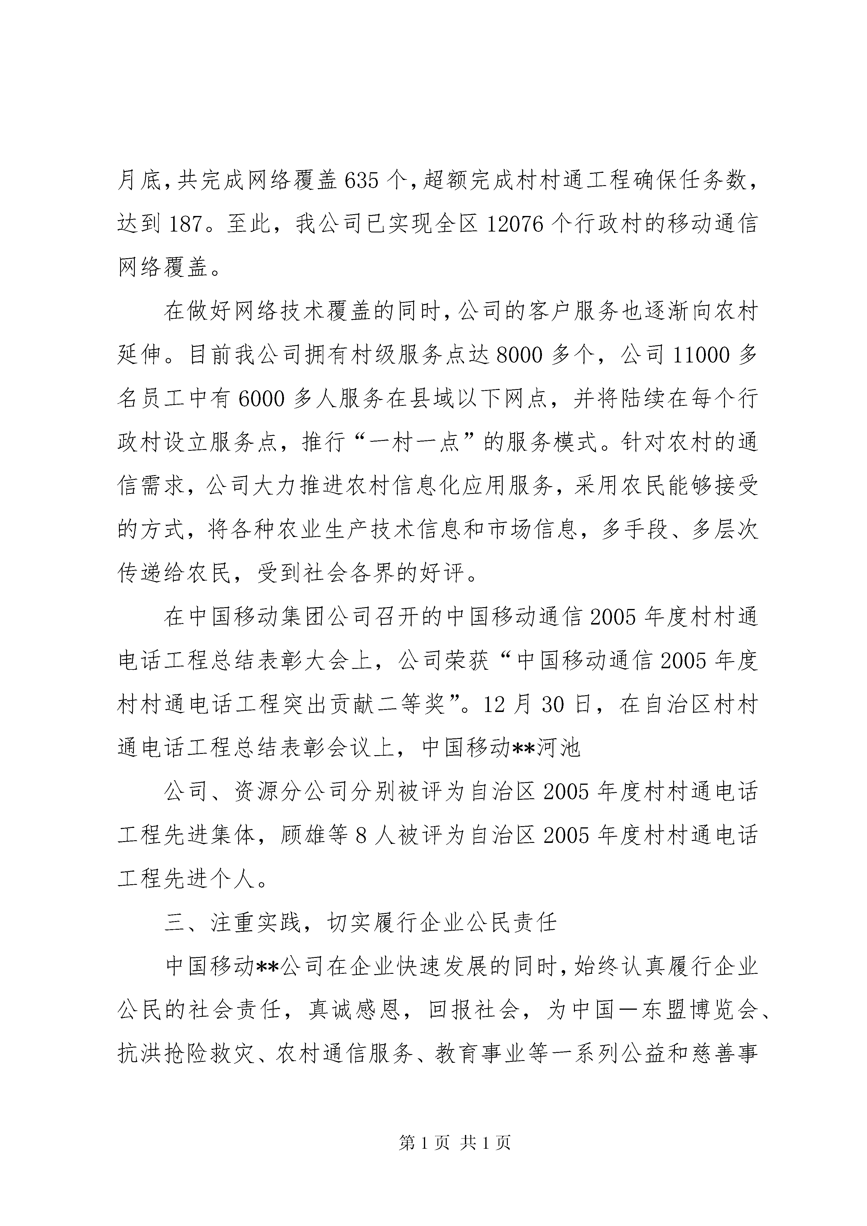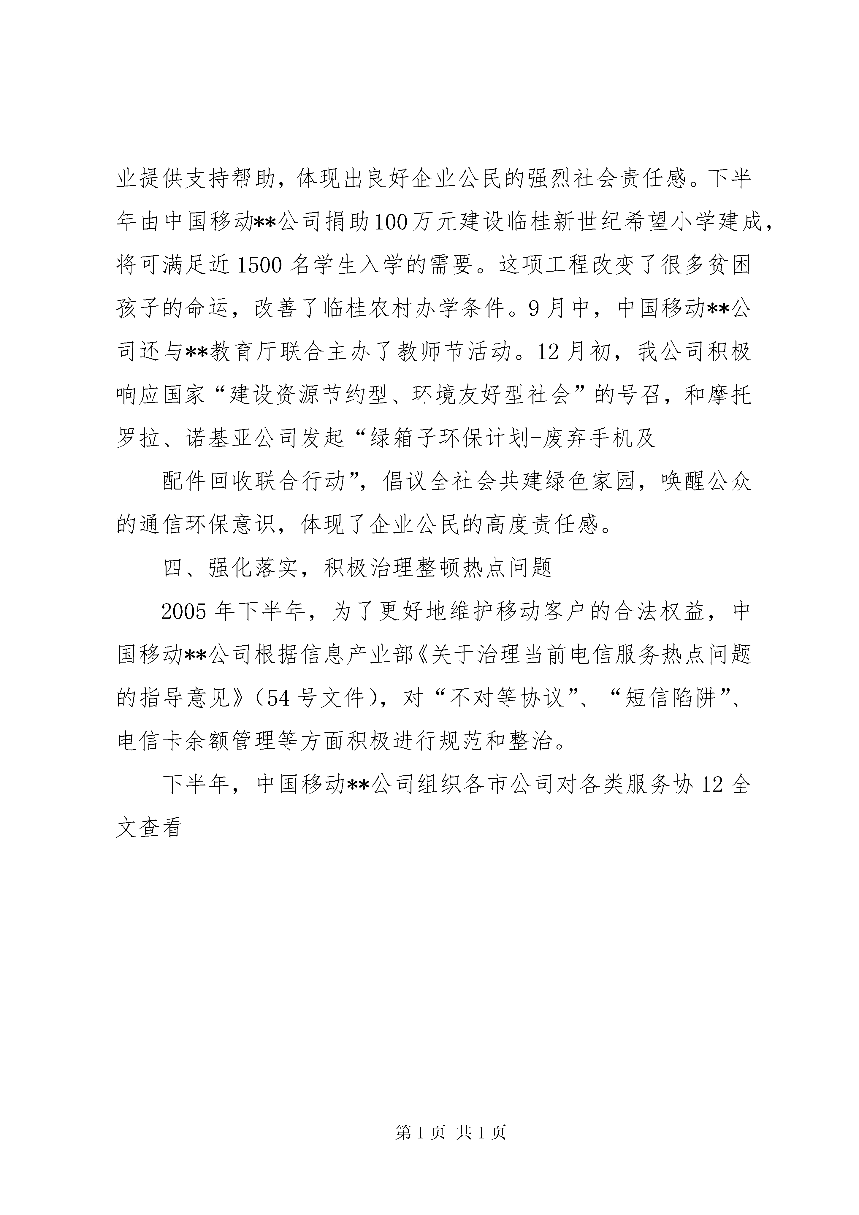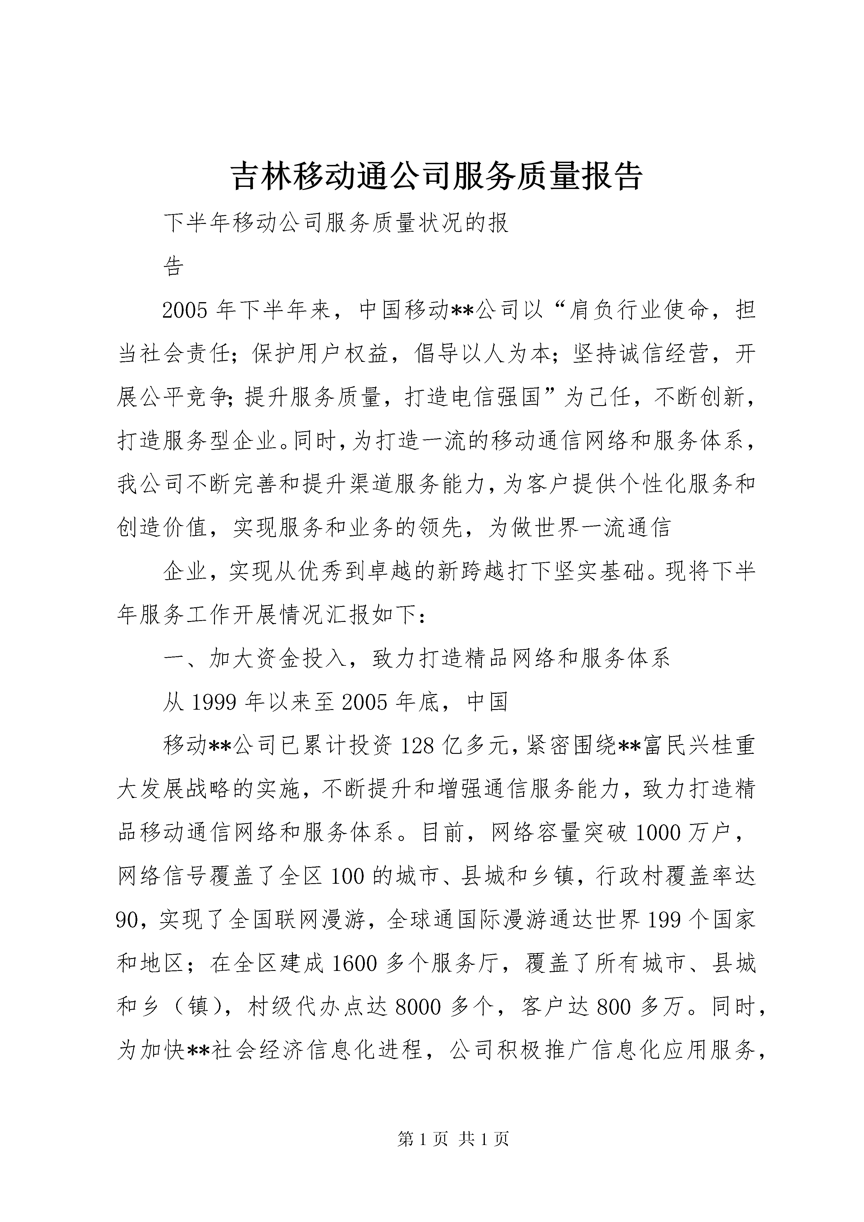 吉林移动通公司服务质量报告下半年移动公司服务质量状况的报告2005年下半年来,中国移动**公司以“肩负行业使命,担当社会责任;保护用户权益,倡导以人为本;坚持诚信经营,开展公平竞争;提升服务质量,打造电信强国”为己任,不断创新,打造服务型企业。同时,为打造一流的移动通信网络和服务体系,我公司不断完善和提升渠道服务能力,为客户提供个性化服务和创造价值,实现服务和业务的领先,为做世界一流通信企业,实现从优秀到卓越的新跨越打下坚实基础。现将下半年服务工作开展情况汇报如下:一、加大资金投入,致力打造精品网络和服务体系从1999年以来至2005年底,中国移动**公司已累计投资128亿多元,紧密围绕**富民兴桂重大发展战略的实施,不断提升和增强通信服务能力,致力打造精品移动通信网络和服务体系。目前,网络容量突破1000万户,网络信号覆盖了全区100的城市、县城和乡镇,行政村覆盖率达90,实现了全国联网漫游,全球通国际漫游通达世界199个国家和地区;在全区建成1600多个服务厅,覆盖了所有城市、县城和乡(镇),村级代办点达8000多个,客户达800多万。同时,为加快**社会经济信息化进程,公司积极推广信息化应用服务,为**经济发展和社会进步做出了重要贡献。为更好地满足**社会经济快速发展的需要,增强通信能力和服务能力,我公司在10月份启动了通信枢纽楼建设项目,12月启动了南宁公司综合楼、**公司客户呼叫中心生产楼建设项目,两项目将于2007年建成投产。届时,公司的通信服务能力将得到大幅提升和增强。二、致力“村村通”工程,助推农村信息化农民“信息贫困”导致的城乡“数字鸿沟”,是造成城乡贫富差距拉大、社会不稳定因素增加的重要原因之一。作为**通信业的领跑者,中国移动**公司响应党中央和区党委的号召,始终把维护广大农民利益放在公司各项工作的重要地位,紧紧围绕“三农”问题,致力于“村村通”电话工程,加大了在农村地区、边境地区、边远山区及沿海区域的通信建设和信息服务力度,有效地提高了农村的综合生产能力。2005年,在各级党委、政府和区通信管理局的大力支持帮助下,公司克服了在经济落后区域和条件恶劣山区建设基站的巨大困难,投入了3亿多元进行县域以下农村通信网络建设,其中仅河池地区农村通信建设投入就达近亿元。2005年上级主管部门下达我公司的“村村通工程”基本任务是通信覆盖339个行政村,挑战任务是470个。到7月底公司就已完成覆盖470多个,完成挑战任务的。截至12月底,共完成网络覆盖635个,超额完成村村通工程确保任务数,达到187。至此,我公司已实现全区12076个行政村的移动通信网络覆盖。在做好网络技术覆盖的同时,公司的客户服务也逐渐向农村延伸。目前我公司拥有村级服务点达8000多个,公司11000多名员工中有6000多人服务在县域以下网点,并将陆续在每个行政村设立服务点,推行“一村一点”的服务模式。针对农村的通信需求,公司大力推进农村信息化应用服务,采用农民能够接受的方式,将各种农业生产技术信息和市场信息,多手段、多层次传递给农民,受到社会各界的好评。在中国移动集团公司召开的中国移动通信2005年度村村通电话工程总结表彰大会上,公司荣获“中国移动通信2005年度村村通电话工程突出贡献二等奖”。12月30日,在自治区村村通电话工程总结表彰会议上,中国移动**河池公司、资源分公司分别被评为自治区2005年度村村通电话工程先进集体,顾雄等8人被评为自治区2005年度村村通电话工程先进个人。三、注重实践,切实履行企业公民责任中国移动**公司在企业快速发展的同时,始终认真履行企业公民的社会责任,真诚感恩,回报社会,为中国-东盟博览会、抗洪抢险救灾、农村通信服务、教育事业等一系列公益和慈善事业提供支持帮助,体现出良好企业公民的强烈社会责任感。下半年由中国移动**公司捐助100万元建设临桂新世纪希望小学建成,将可满足近1500名学生入学的需要。这项工程改变了很多贫困孩子的命运,改善了临桂农村办学条件。9月中,中国移动**公司还与**教育厅联合主办了教师节活动。12月初,我公司积极响应国家“建设资源节约型、环境友好型社会”的号召,和摩托罗拉、诺基亚公司发起“绿箱子环保计划-废弃手机及配件回收联合行动”,倡议全社会共建绿色家园,唤醒公众的通信环保意识,体现了企业公民的高度责任感。四、强化落实,积极治理整顿热点问题2005年下半年,为了更好地维护移动客户的合法权益,中国移动**公司根据信息产业部《关于治理当前电信服务热点问题的指导意见》(54号文件),对“不对等协议”、“短信陷阱”、电信卡余额管理等方面积极进行规范和整治。下半年,中国移动**公司组织各市公司对各类服务协12全文查看