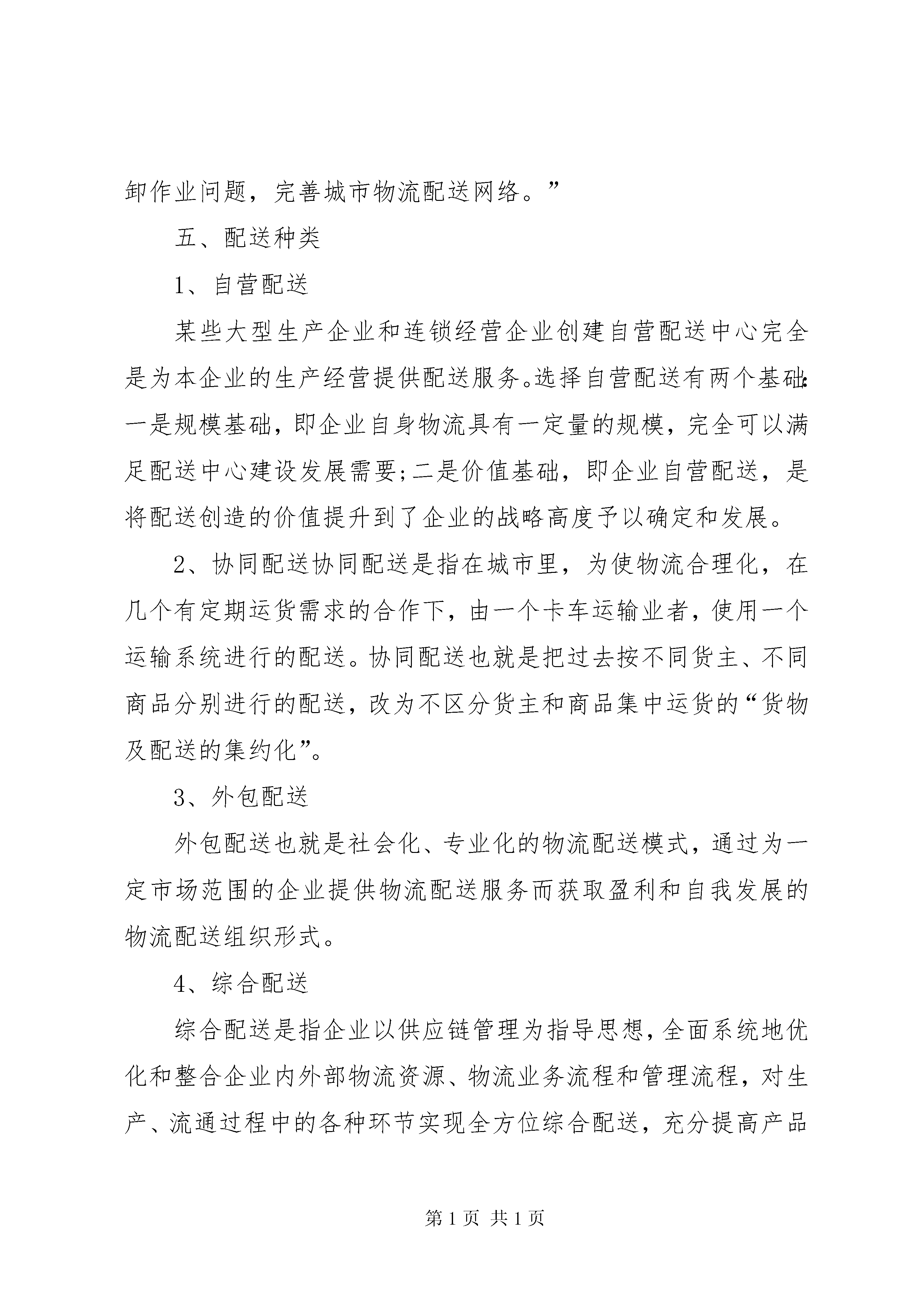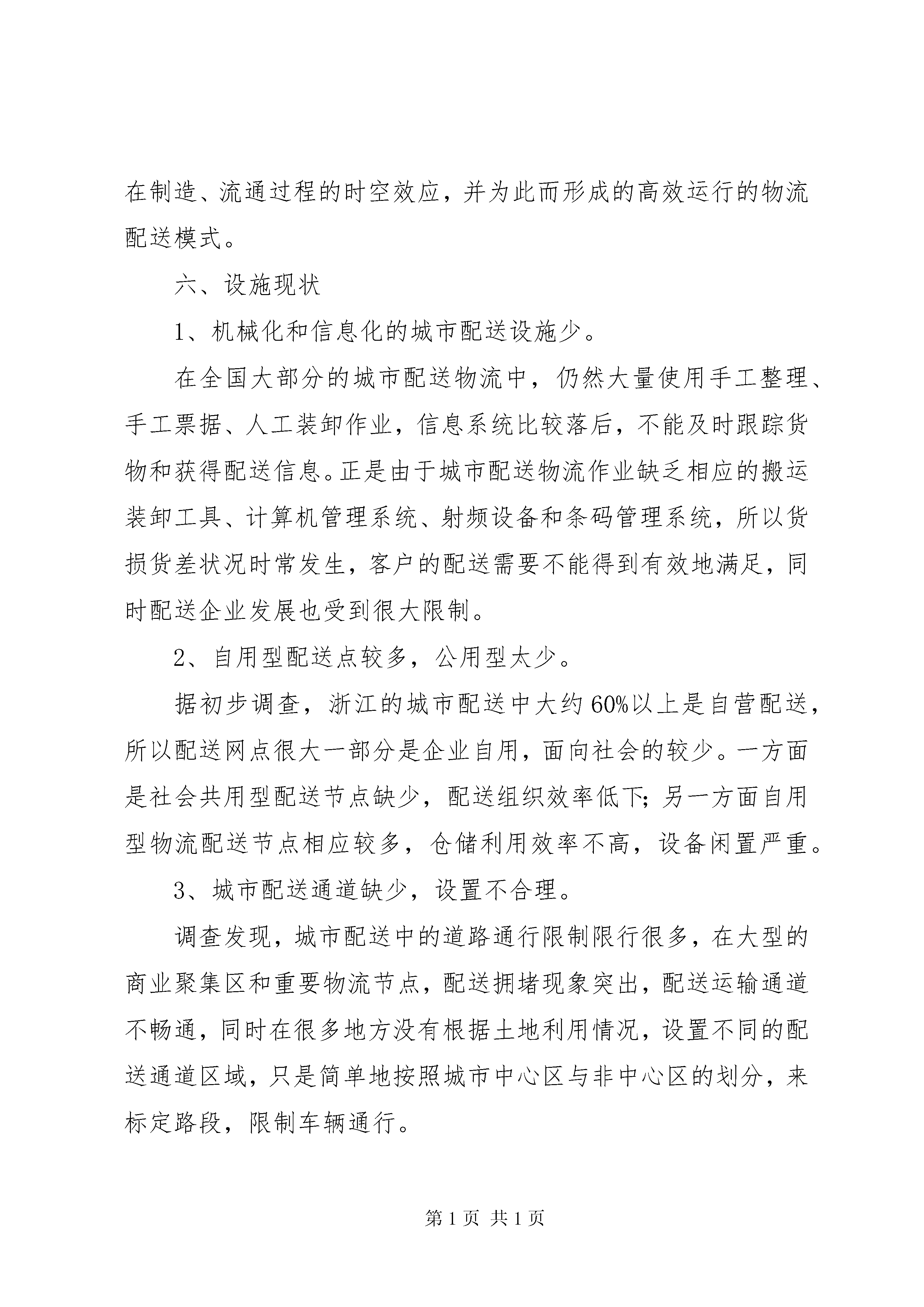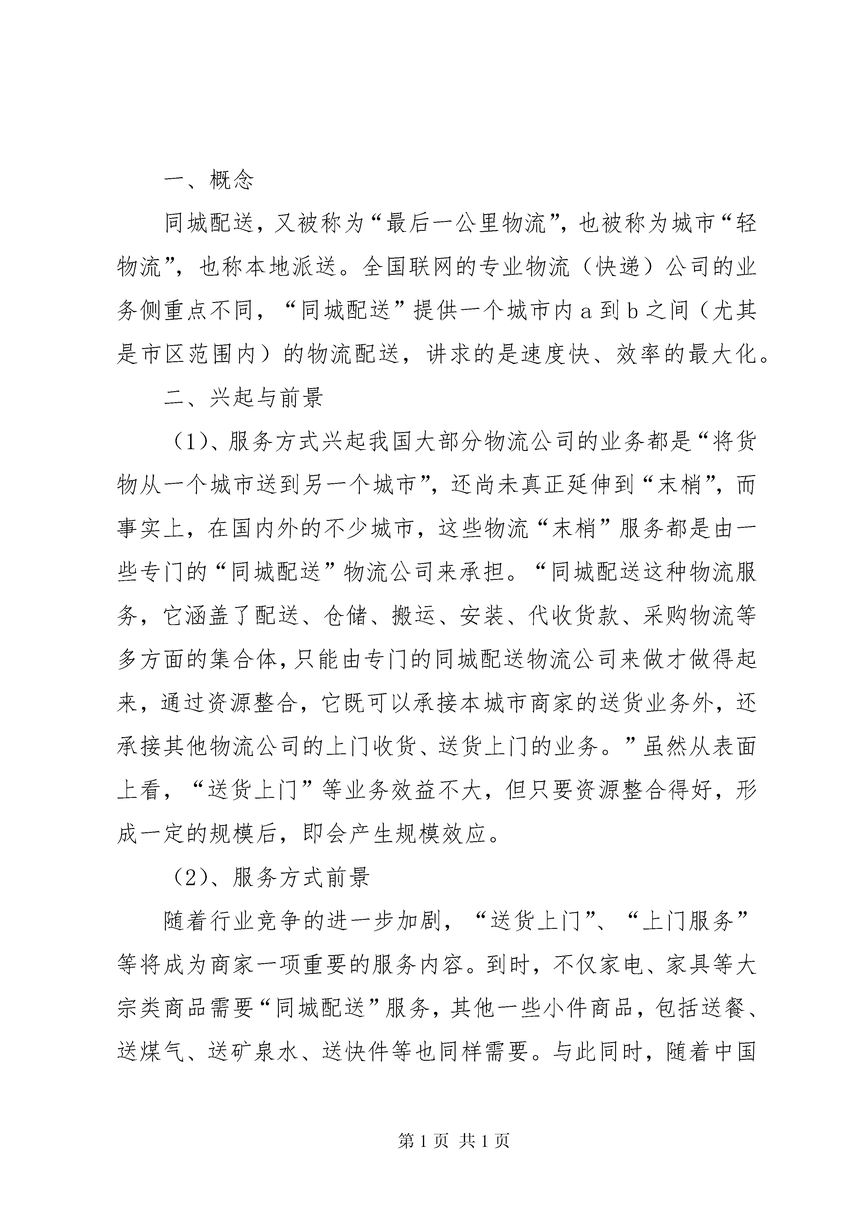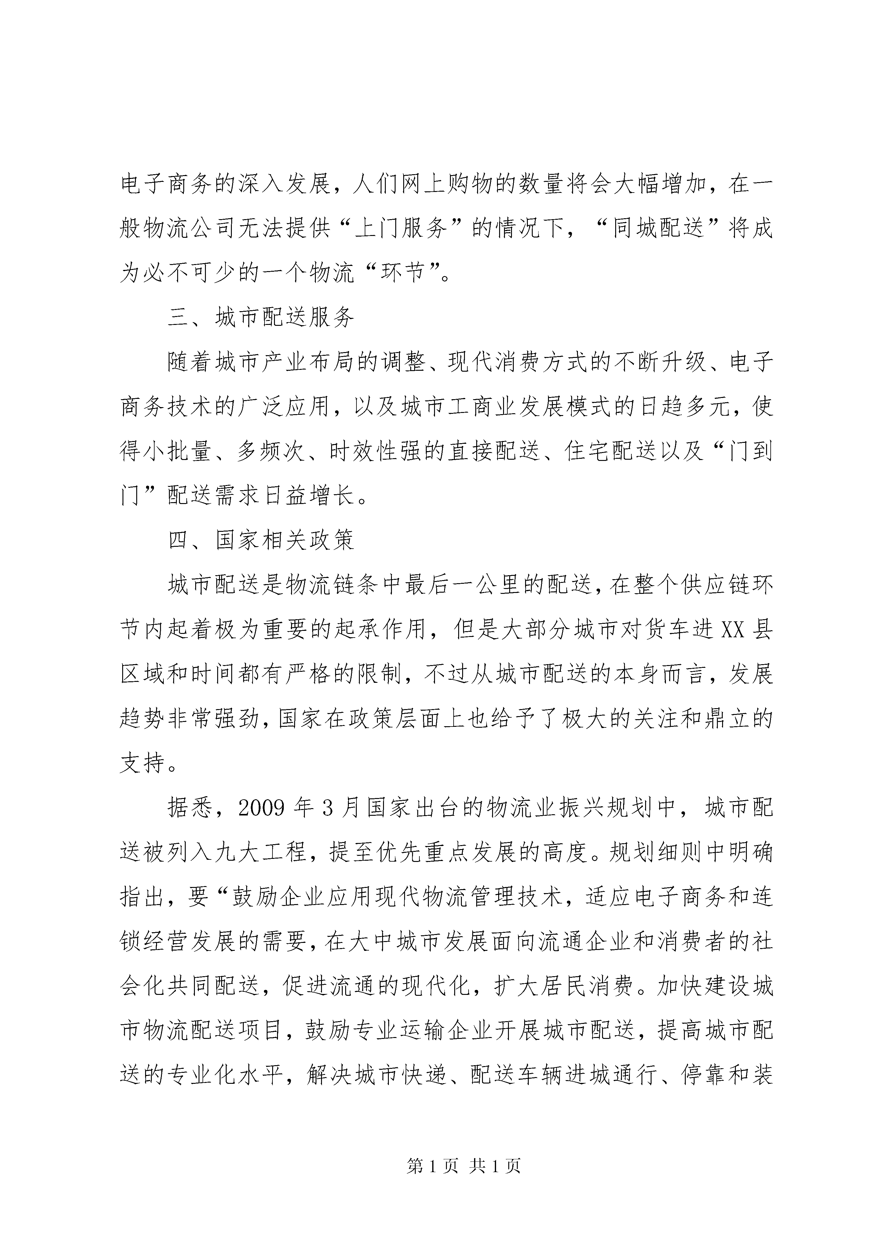 同城应用级灾备建设项目可行性报告20XX年425同城配送项目可行性报告城市配送服务2018-6-6天晖城目录一、同城配送概念二、兴起与前景三、城市配送服务四、国家相关政策五、配送种类六、设施现状七、面临问题八、管理现状九、赢利模式十、“天晖城”模式的城市配送十一、质量保障体系十二、人员分工及部门配合十三、市场拓展及展望同城配送项目可行性报告一、概念同城配送,又被称为“最后一公里物流”,也被称为城市“轻物流”,也称本地派送。全国联网的专业物流(快递)公司的业务侧重点不同,“同城配送”提供一个城市内a到b之间(尤其是市区范围内)的物流配送,讲求的是速度快、效率的最大化。二、兴起与前景(1)、服务方式兴起我国大部分物流公司的业务都是“将货物从一个城市送到另一个城市”,还尚未真正延伸到“末梢”,而事实上,在国内外的不少城市,这些物流“末梢”服务都是由一些专门的“同城配送”物流公司来承担。“同城配送这种物流服务,它涵盖了配送、仓储、搬运、安装、代收货款、采购物流等多方面的集合体,只能由专门的同城配送物流公司来做才做得起来,通过资源整合,它既可以承接本城市商家的送货业务外,还承接其他物流公司的上门收货、送货上门的业务。”虽然从表面上看,“送货上门”等业务效益不大,但只要资源整合得好,形成一定的规模后,即会产生规模效应。(2)、服务方式前景随着行业竞争的进一步加剧,“送货上门”、“上门服务”等将成为商家一项重要的服务内容。到时,不仅家电、家具等大宗类商品需要“同城配送”服务,其他一些小件商品,包括送餐、送煤气、送矿泉水、送快件等也同样需要。与此同时,随着中国电子商务的深入发展,人们网上购物的数量将会大幅增加,在一般物流公司无法提供“上门服务”的情况下,“同城配送”将成为必不可少的一个物流“环节”。三、城市配送服务随着城市产业布局的调整、现代消费方式的不断升级、电子商务技术的广泛应用,以及城市工商业发展模式的日趋多元,使得小批量、多频次、时效性强的直接配送、住宅配送以及“门到门”配送需求日益增长。四、国家相关政策城市配送是物流链条中最后一公里的配送,在整个供应链环节内起着极为重要的起承作用,但是大部分城市对货车进XX县区域和时间都有严格的限制,不过从城市配送的本身而言,发展趋势非常强劲,国家在政策层面上也给予了极大的关注和鼎立的支持。据悉,2009年3月国家出台的物流业振兴规划中,城市配送被列入九大工程,提至优先重点发展的高度。规划细则中明确指出,要“鼓励企业应用现代物流管理技术,适应电子商务和连锁经营发展的需要,在大中城市发展面向流通企业和消费者的社会化共同配送,促进流通的现代化,扩大居民消费。加快建设城市物流配送项目,鼓励专业运输企业开展城市配送,提高城市配送的专业化水平,解决城市快递、配送车辆进城通行、停靠和装卸作业问题,完善城市物流配送网络。”五、配送种类1、自营配送某些大型生产企业和连锁经营企业创建自营配送中心完全是为本企业的生产经营提供配送服务。选择自营配送有两个基础:一是规模基础,即企业自身物流具有一定量的规模,完全可以满足配送中心建设发展需要;二是价值基础,即企业自营配送,是将配送创造的价值提升到了企业的战略高度予以确定和发展。2、协同配送协同配送是指在城市里,为使物流合理化,在几个有定期运货需求的合作下,由一个卡车运输业者,使用一个运输系统进行的配送。协同配送也就是把过去按不同货主、不同商品分别进行的配送,改为不区分货主和商品集中运货的“货物及配送的集约化”。3、外包配送外包配送也就是社会化、专业化的物流配送模式,通过为一定市场范围的企业提供物流配送服务而获取盈利和自我发展的物流配送组织形式。4、综合配送综合配送是指企业以供应链管理为指导思想,全面系统地优化和整合企业内外部物流资源、物流业务流程和管理流程,对生产、流通过程中的各种环节实现全方位综合配送,充分提高产品在制造、流通过程的时空效应,并为此而形成的高效运行的物流配送模式。六、设施现状1、机械化和信息化的城市配送设施少。在全国大部分的城市配送物流中,仍然大量使用手工整理、手工票据、人工装卸作业,信息系统比较落后,不能及时跟踪货物和获得配送信息。正是由于城市配送物流作业缺乏相应的搬运装卸工具、计算机管理系统、射频设备和条码管理系统,所以货损货差状况时常发生,客户的配送需要不能得到有效地满足,同时配送企业发展也受到很大限制。2、自用型配送点较多,公用型太少。据初步调查,浙江的城市配送中大约60%以上是自营配送,所以配送网点很大一部分是企业自用,面向社会的较少。一方面是社会共用型配送节点缺少,配送组织效率低下;另一方面自用型物流配送节点相应较多,仓储利用效率不高,设备闲置严重。3、城市配送通道缺少,设置不合理。调查发现,城市配送中的道路通行限制限行