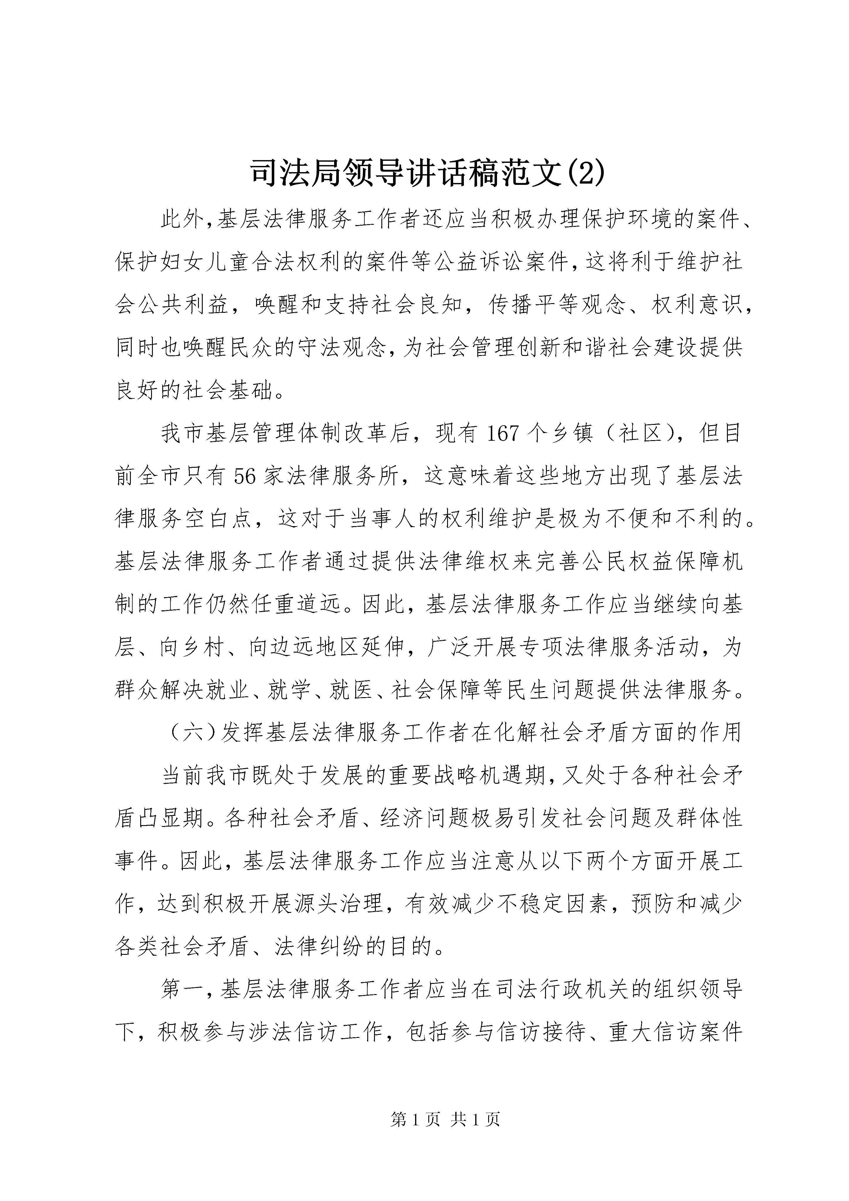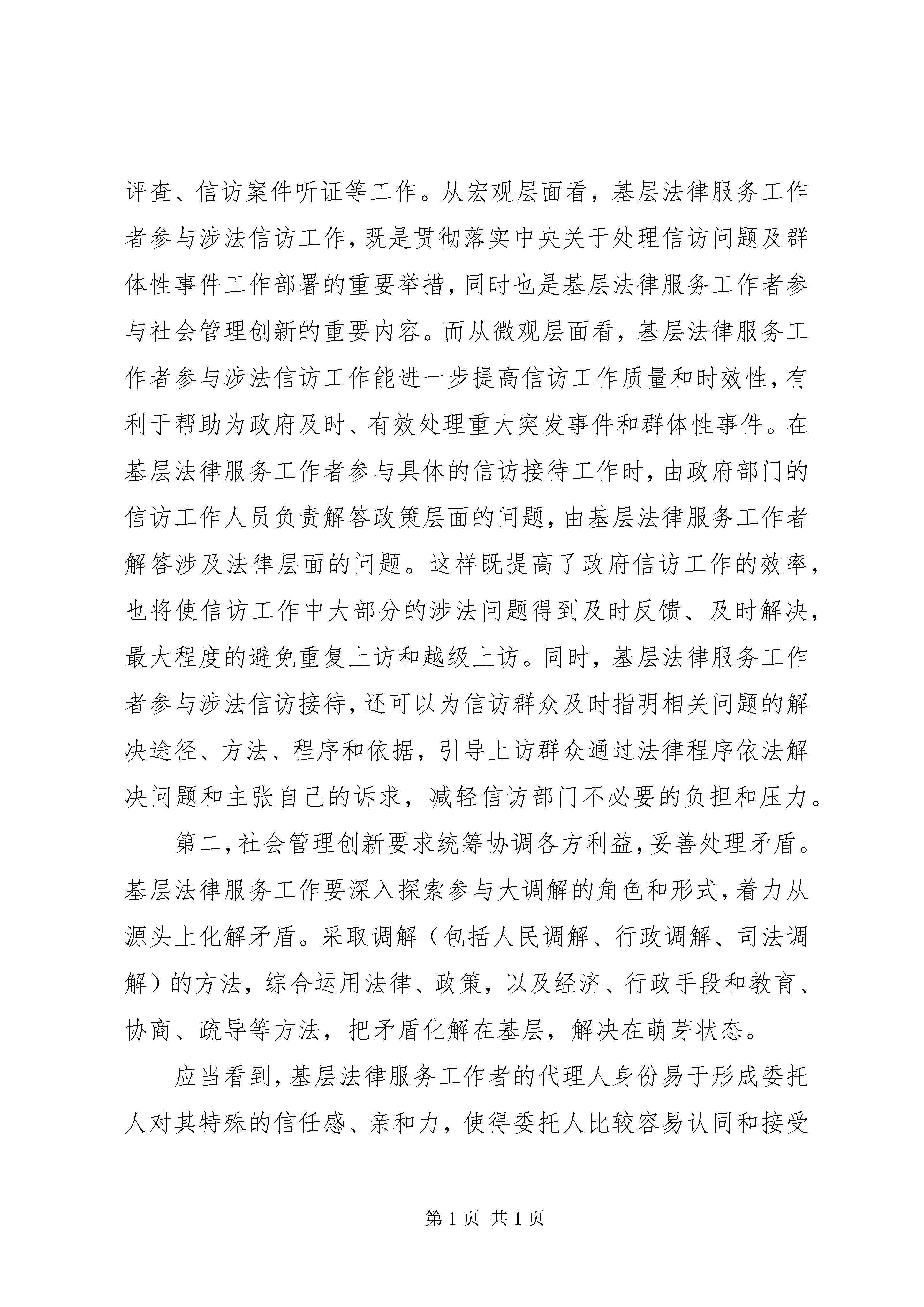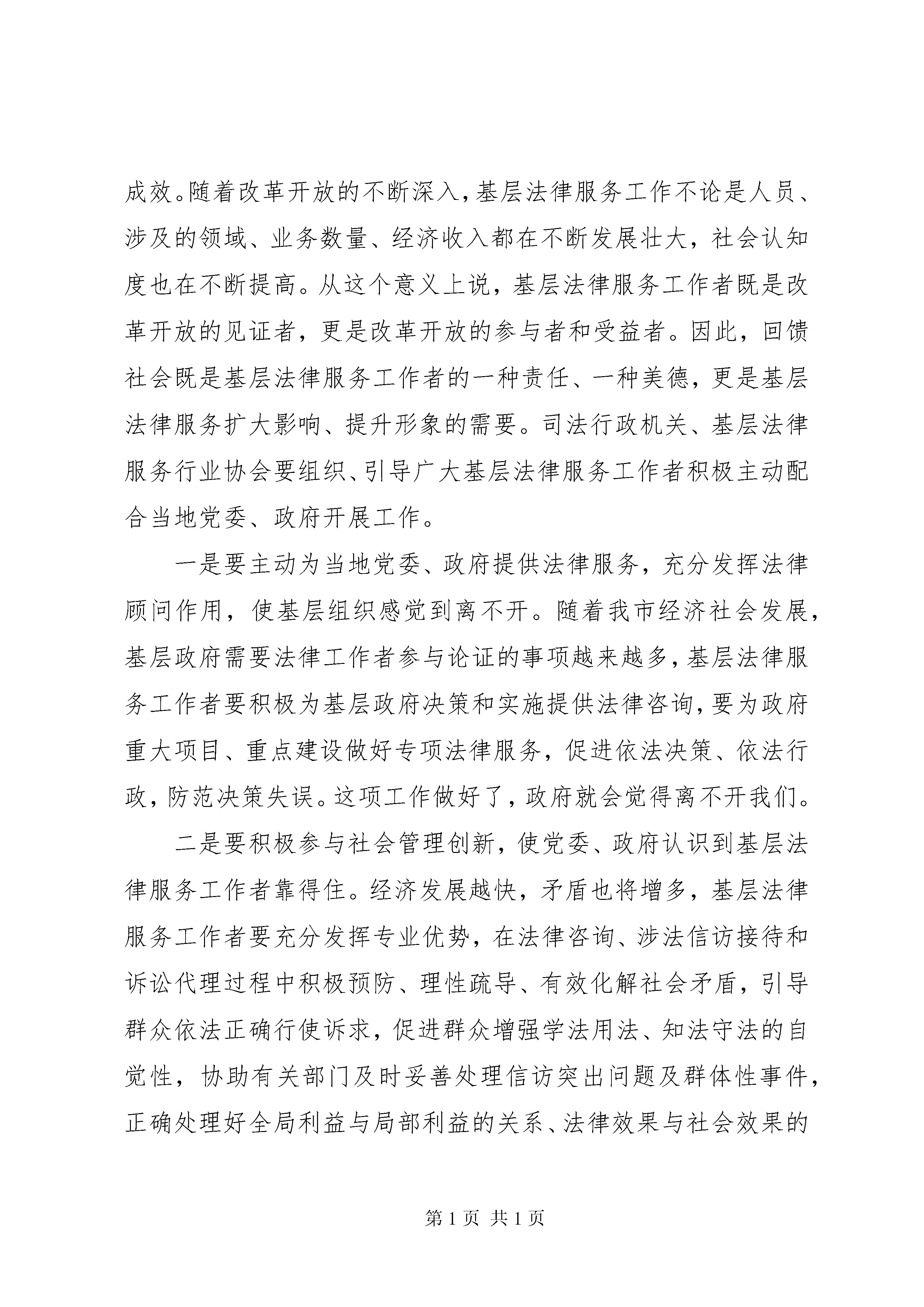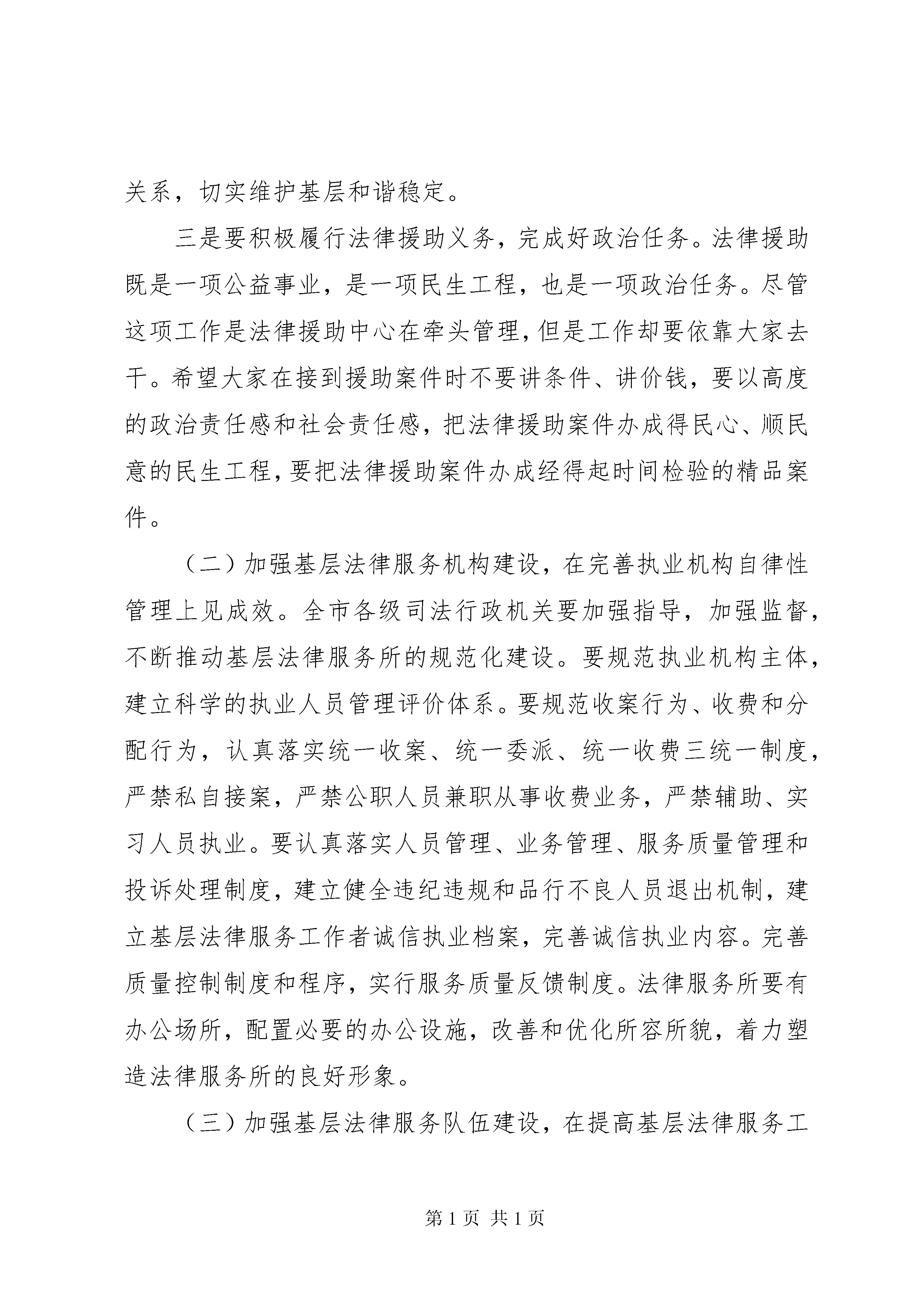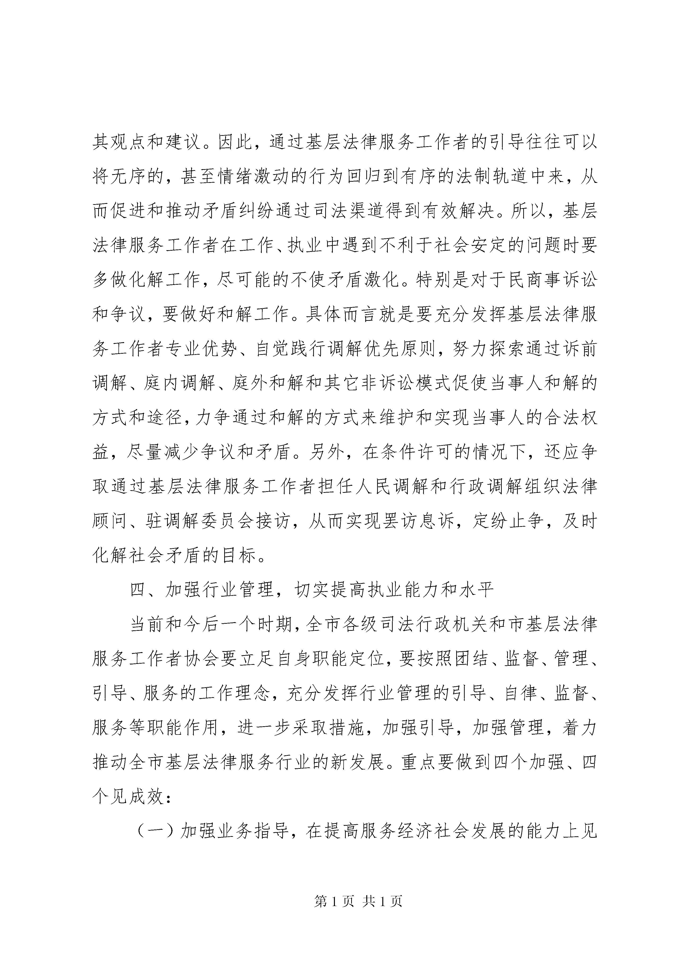司法局领导讲话稿范文(2)此外,基层法律服务工作者还应当积极办理保护环境的案件、保护妇女儿童合法权利的案件等公益诉讼案件,这将利于维护社会公共利益,唤醒和支持社会良知,传播平等观念、权利意识,同时也唤醒民众的守法观念,为社会管理创新和谐社会建设提供良好的社会基础。我市基层管理体制改革后,现有167个乡镇(社区),但目前全市只有56家法律服务所,这意味着这些地方出现了基层法律服务空白点,这对于当事人的权利维护是极为不便和不利的。基层法律服务工作者通过提供法律维权来完善公民权益保障机制的工作仍然任重道远。因此,基层法律服务工作应当继续向基层、向乡村、向边远地区延伸,广泛开展专项法律服务活动,为群众解决就业、就学、就医、社会保障等民生问题提供法律服务。(六)发挥基层法律服务工作者在化解社会矛盾方面的作用当前我市既处于发展的重要战略机遇期,又处于各种社会矛盾凸显期。各种社会矛盾、经济问题极易引发社会问题及群体性事件。因此,基层法律服务工作应当注意从以下两个方面开展工作,达到积极开展源头治理,有效减少不稳定因素,预防和减少各类社会矛盾、法律纠纷的目的。第一,基层法律服务工作者应当在司法行政机关的组织领导下,积极参与涉法信访工作,包括参与信访接待、重大信访案件评查、信访案件听证等工作。从宏观层面看,基层法律服务工作者参与涉法信访工作,既是贯彻落实中央关于处理信访问题及群体性事件工作部署的重要举措,同时也是基层法律服务工作者参与社会管理创新的重要内容。而从微观层面看,基层法律服务工作者参与涉法信访工作能进一步提高信访工作质量和时效性,有利于帮助为政府及时、有效处理重大突发事件和群体性事件。在基层法律服务工作者参与具体的信访接待工作时,由政府部门的信访工作人员负责解答政策层面的问题,由基层法律服务工作者解答涉及法律层面的问题。这样既提高了政府信访工作的效率,也将使信访工作中大部分的涉法问题得到及时反馈、及时解决,最大程度的避免重复上访和越级上访。同时,基层法律服务工作者参与涉法信访接待,还可以为信访群众及时指明相关问题的解决途径、方法、程序和依据,引导上访群众通过法律程序依法解决问题和主张自己的诉求,减轻信访部门不必要的负担和压力。第二,社会管理创新要求统筹协调各方利益,妥善处理矛盾。基层法律服务工作要深入探索参与大调解的角色和形式,着力从源头上化解矛盾。采取调解(包括人民调解、行政调解、司法调解)的方法,综合运用法律、政策,以及经济、行政手段和教育、协商、疏导等方法,把矛盾化解在基层,解决在萌芽状态。应当看到,基层法律服务工作者的代理人身份易于形成委托人对其特殊的信任感、亲和力,使得委托人比较容易认同和接受其观点和建议。因此,通过基层法律服务工作者的引导往往可以将无序的,甚至情绪激动的行为回归到有序的法制轨道中来,从而促进和推动矛盾纠纷通过司法渠道得到有效解决。所以,基层法律服务工作者在工作、执业中遇到不利于社会安定的问题时要多做化解工作,尽可能的不使矛盾激化。特别是对于民商事诉讼和争议,要做好和解工作。具体而言就是要充分发挥基层法律服务工作者专业优势、自觉践行调解优先原则,努力探索通过诉前调解、庭内调解、庭外和解和其它非诉讼模式促使当事人和解的方式和途径,力争通过和解的方式来维护和实现当事人的合法权益,尽量减少争议和矛盾。另外,在条件许可的情况下,还应争取通过基层法律服务工作者担任人民调解和行政调解组织法律顾问、驻调解委员会接访,从而实现罢访息诉,定纷止争,及时化解社会矛盾的目标。四、加强行业管理,切实提高执业能力和水平当前和今后一个时期,全市各级司法行政机关和市基层法律服务工作者协会要立足自身职能定位,要按照团结、监督、管理、引导、服务的工作理念,充分发挥行业管理的引导、自律、监督、服务等职能作用,进一步采取措施,加强引导,加强管理,着力推动全市基层法律服务行业的新发展。重点要做到四个加强、四个见成效:(一)加强业务指导,在提高服务经济社会发展的能力上见成效。随着改革开放的不断深入,基层法律服务工作不论是人员、涉及的领域、业务数量、经济收入都在不断发展壮大,社会认知度也在不断提高。从这个意义上说,基层法律服务工作者既是改革开放的见证者,更是改革开放的参与者和受益者。因此,回馈社会既是基层法律服务工作者的一种责任、一种美德,更是基层法律服务扩大影响、提升形象的需要。司法行政机关、基层法律服务行业协会要组织、引导广大基层法律服务工作者积极主动配合当地党委、政府开展工作。一是要主动为当地党委、政府提供法律服务,充分发挥法律顾问作用,使基层组织感觉到离不开。随着我市经济社会发展,基层政府需要法律工作者参与论证的事项越来越多,基层法律服务工作者要积极为基层政府决策和实施提供法律咨询,要为政府重大项目、重点建设做好专项法律