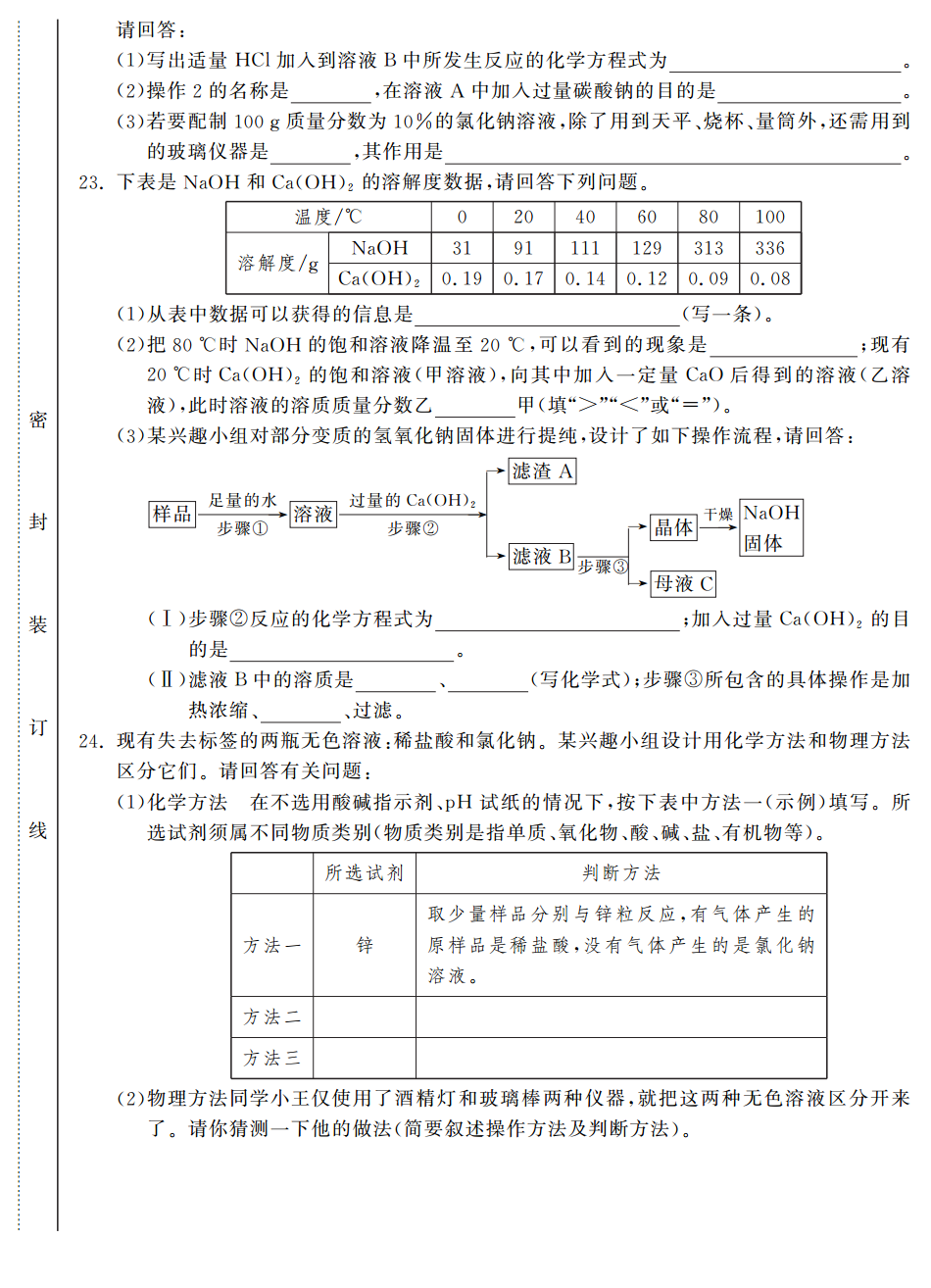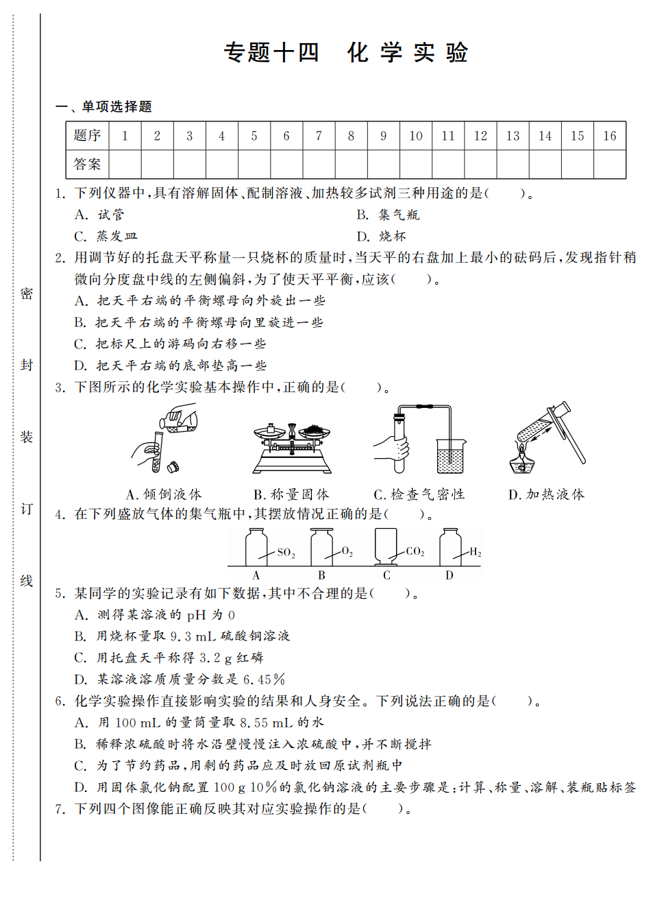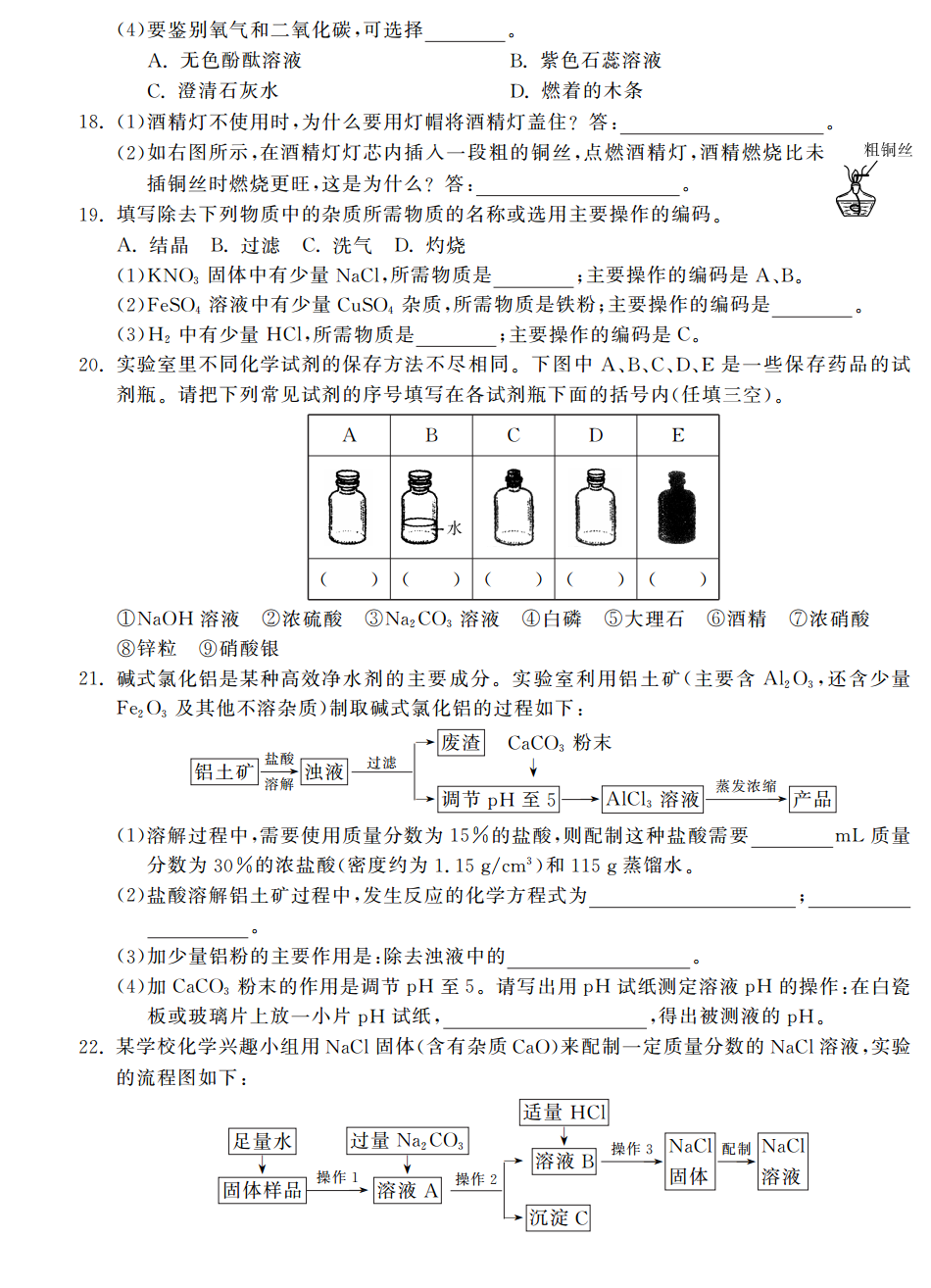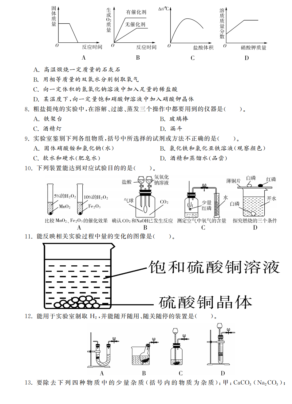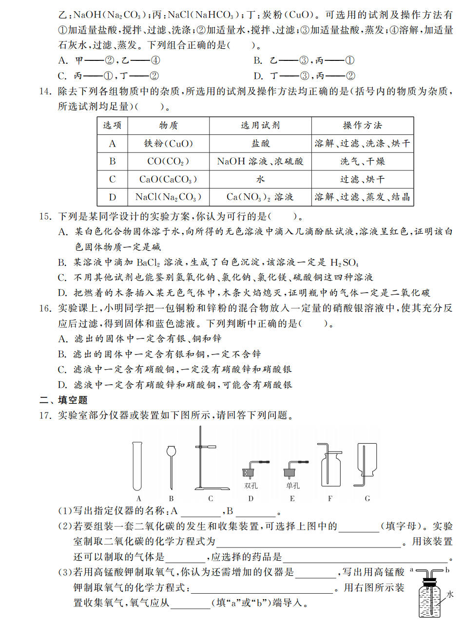 专题十四化学实验一单项选择题、题序12345678910111213141516答案下列仪器中具有溶解固体配制溶液加热较多试剂三种用途的是,、、().1.试管集气瓶A.B.蒸发皿烧杯C.D.用调节好的托盘天平称量一只烧杯的质量时当天平的右盘加上最小的砝码后发现指针稍2.,,微向分度盘中线的左侧偏斜为了使天平平衡应该密,,().把天平右端的平衡螺母向外旋出一些A.把天平右端的平衡螺母向里旋进一些B.把标尺上的游码向右移一些C.封把天平右端的底部垫高一些D.下图所示的化学实验基本操作中正确的是3.,().装订在下列盛放气体的集气瓶中其摆放情况正确的是4.,().线某同学的实验记录有如下数据其中不合理的是5.,().测得某溶液的为A.pH0用烧杯量取硫酸铜溶液B.9.3mL用托盘天平称得红磷C.3.2g某溶液溶质质量分数是D.6.45%化学实验操作直接影响实验的结果和人身安全下列说法正确的是6..().用的量筒量取的水A.100mL8.55mL稀释浓硫酸时将水沿壁慢慢注入浓硫酸中并不断搅拌B.,为了节约药品用剩的药品应及时放回原试剂瓶中C.,用固体氯化钠配置的氯化钠溶液的主要步骤是计算称量溶解装瓶贴标签D.100g10%:、、、下列四个图像能正确反映其对应实验操作的是7.().高温煅烧一定质量的石灰石A.用相等质量的双氧水分别制取氧气B.向一定体积的氢氧化钠溶液中加入足量的稀盐酸C.某温度下向一定量饱和硝酸钾溶液中加入硝酸钾晶体D.,粗盐提纯的实验中在溶解过滤蒸发三个操作中都要用到的仪器是8.,、、().铁架台玻璃棒A.B.酒精灯漏斗C.D.实验室鉴别下列各组物质括号中所选择的试剂或方法不正确的是9.,().固体硝酸铵和氯化钠水氯化铁和氯化亚铁溶液观察颜色A.()B.()软水和硬水肥皂水酒精和蒸馏水品尝C.()D.()下列装置能达到对应试验目的的是10.().能反映相关实验过程中量的变化的图像是11.().能用于实验室制取并能随开随用随关随停的装置是12.H2,、().要除去下列四种物质中的少量杂质括号内的物质为杂质甲13.()::CaCO3(Na2CO3);乙丙丁炭粉可选用的试剂及操作方法有:NaOH(Na2CO3);:NaCl(NaHCO3);:(CuO).加适量盐酸搅拌过滤洗涤加适量水搅拌过滤加适量盐酸蒸发溶解加适量①,、、;②,、;③,;④,石灰水过滤蒸发下列组合正确的是,、.().甲———乙———乙———丙———A.②,④B.③,①丙———丁———丁———丙———C.①,②D.③,②除去下列各组物质中的杂质所选用的试剂及操作方法均正确的是括号内的物质为杂质14.,(,所选试剂均足量)().选项物质选用试剂操作方法铁粉盐酸溶解过滤洗涤烘干A(CuO)、、、溶液浓硫酸洗气干燥BCO(CO2)NaOH、、水过滤烘干CCaO(CaCO3)、溶液溶解过滤蒸发结晶DNaCl(Na2CO3)Ca(NO3)2、、、下列是某同学设计的实验方案你认为可行的是15.,().某白色化合物固体溶于水向所得的无色溶液中滴入几滴酚酞试液溶液呈红色证明该白A.,,,色固体物质一定是碱某溶液中滴加溶液生成了白色沉淀该溶液一定是B.BaCl2,,H2SO4不用其他试剂也能鉴别氢氧化钠氯化钠氯化镁硫酸铜这四种溶液C.、、、把燃着的木条插入某无色气体中木条火焰熄灭证明瓶中的气体一定是二氧化碳D.,,实验课上小明同学把一包铜粉和锌粉的混合物放入一定量的硝酸银溶液中使其充分反16.,,应后过滤得到固体和蓝色滤液下列判断中正确的是,.().滤出的固体中一定含有银铜和锌A.、滤出的固体中一定含有银和铜一定不含锌B.,滤液中一定含有硝酸铜一定没有硝酸锌和硝酸银C.,滤液中一定含有硝酸锌和硝酸铜可能含有硝酸银D.,二填空题、实验室部分仪器或装置如下图所示请回答下列问题17.,.写出指定仪器的名称(1):A,B.若要组装一套二氧化碳的发生和收集装置可选择上图中的填字母实验(2),().室制取二氧化碳的化学方程式为用该装置.还可以制取的气体是应选择的药品是,.若用高锰酸钾制取氧气你认为还需增加的仪器是写出用高锰酸(3),,钾制取氧气的化学方程式用右图所示装:.置收集氧气氧气应从填或端导入,(“a”“b”).要鉴别氧气和二氧化碳可选择(4),.无色酚酞溶液紫色石蕊溶液A.B.澄清石灰水燃着的木条C.D.酒精灯不使用时为什么要用灯帽将酒精灯盖住答18.(1),?:.如右图所示在酒精灯灯芯内插入一段粗的铜丝点燃酒精灯酒精燃烧比未(2),,,插铜丝时燃烧更旺这是为什么答,?:.填写除去下列物质中的杂质所需物质的名称或选用主要操作的编码19..结晶过滤洗气灼烧A