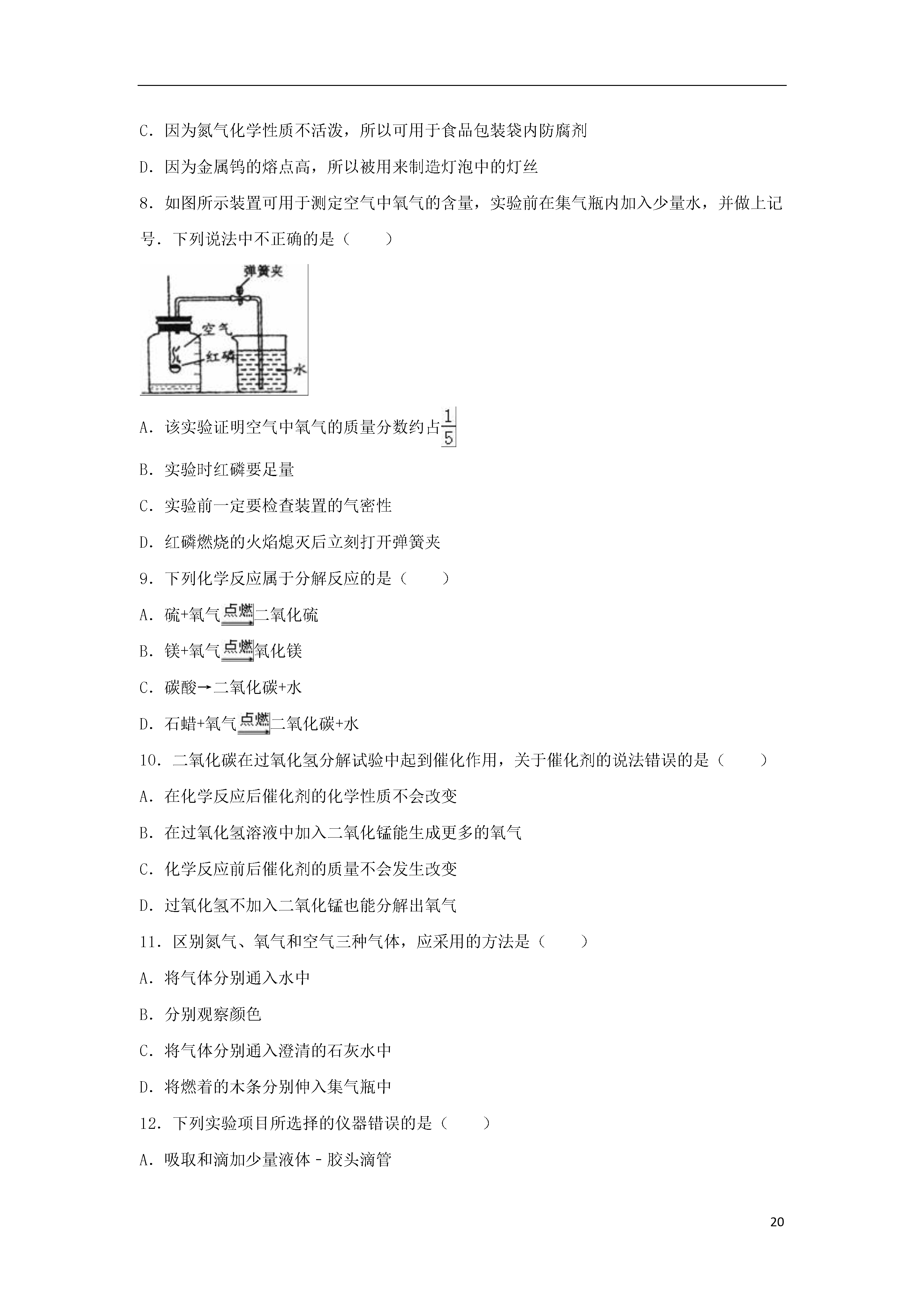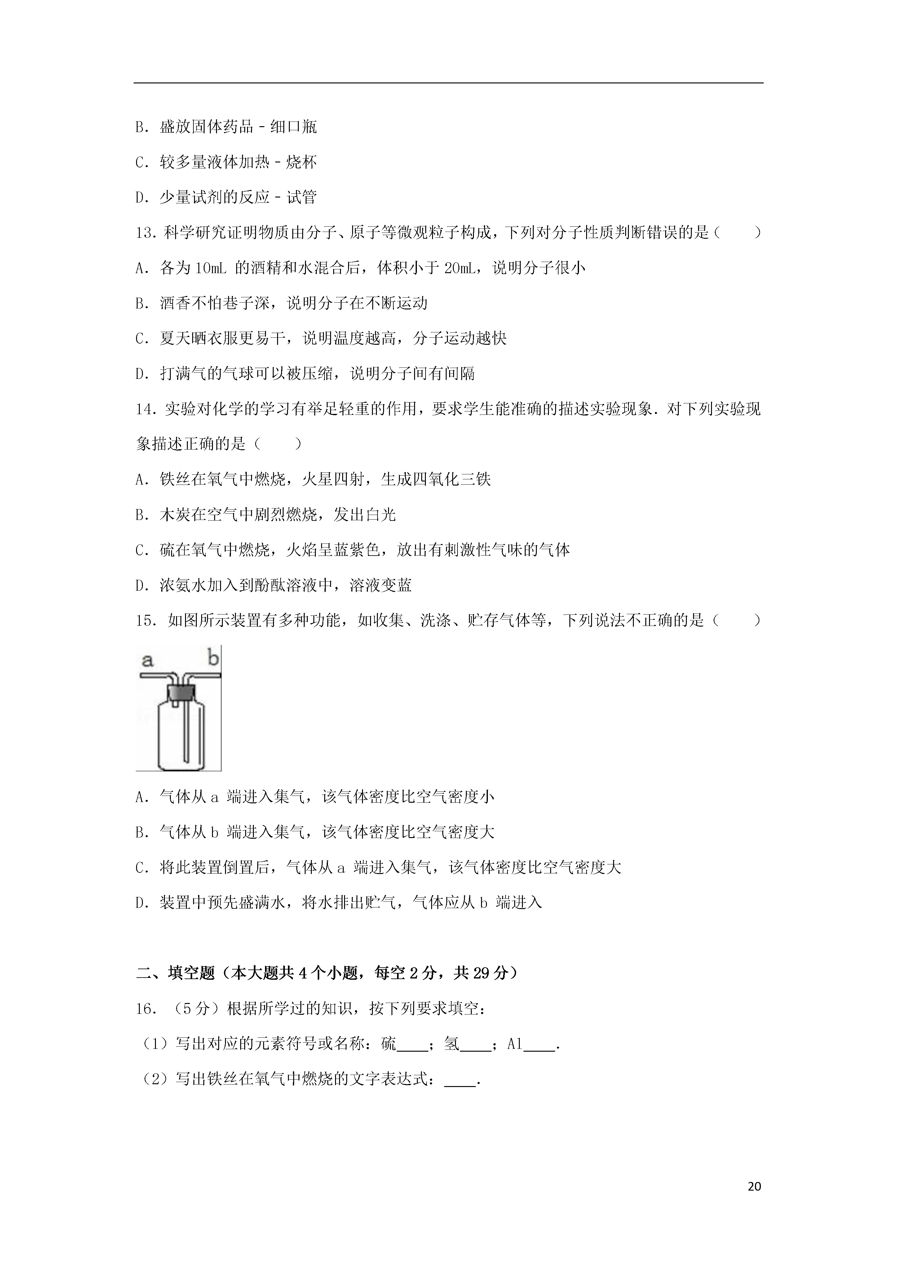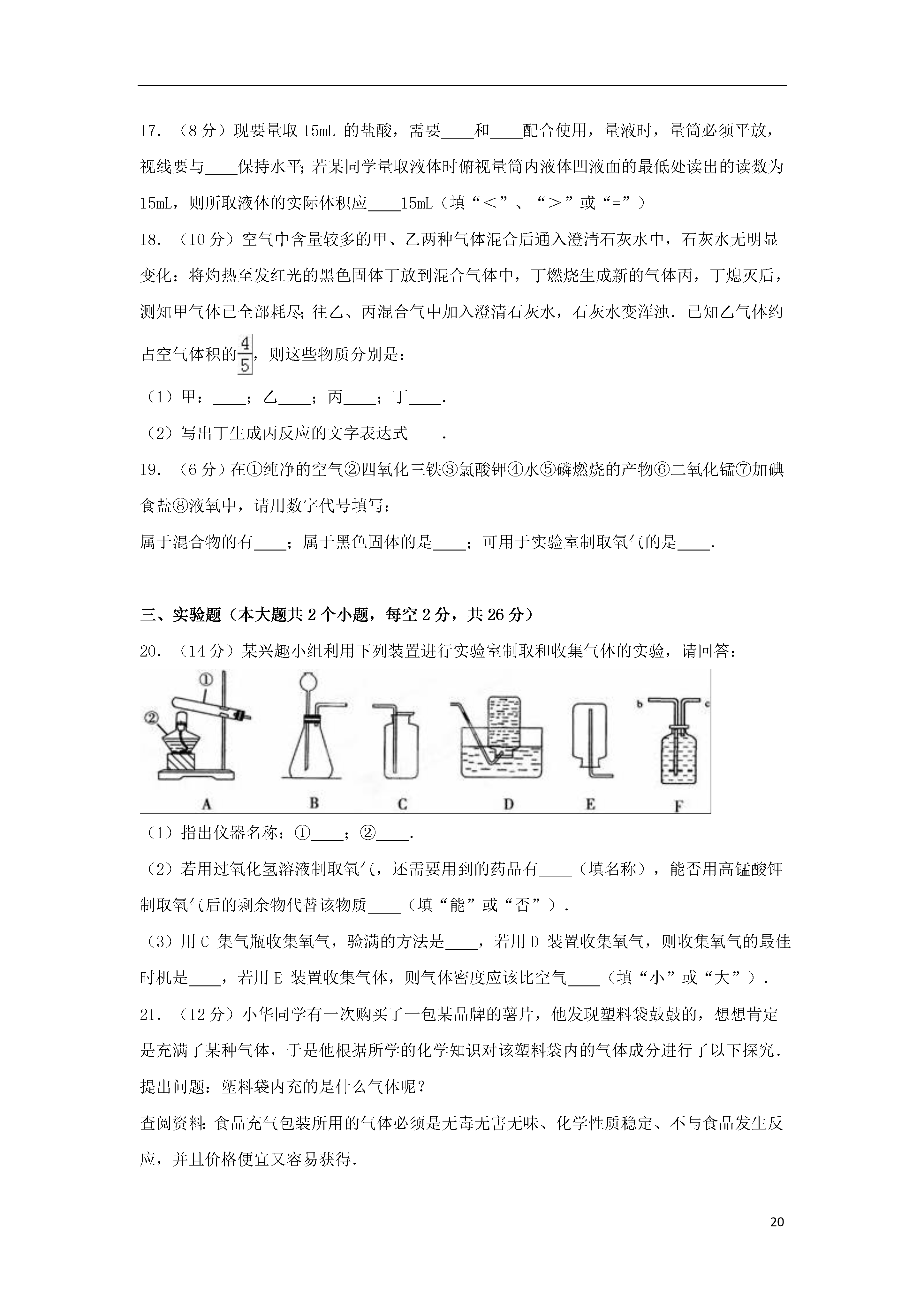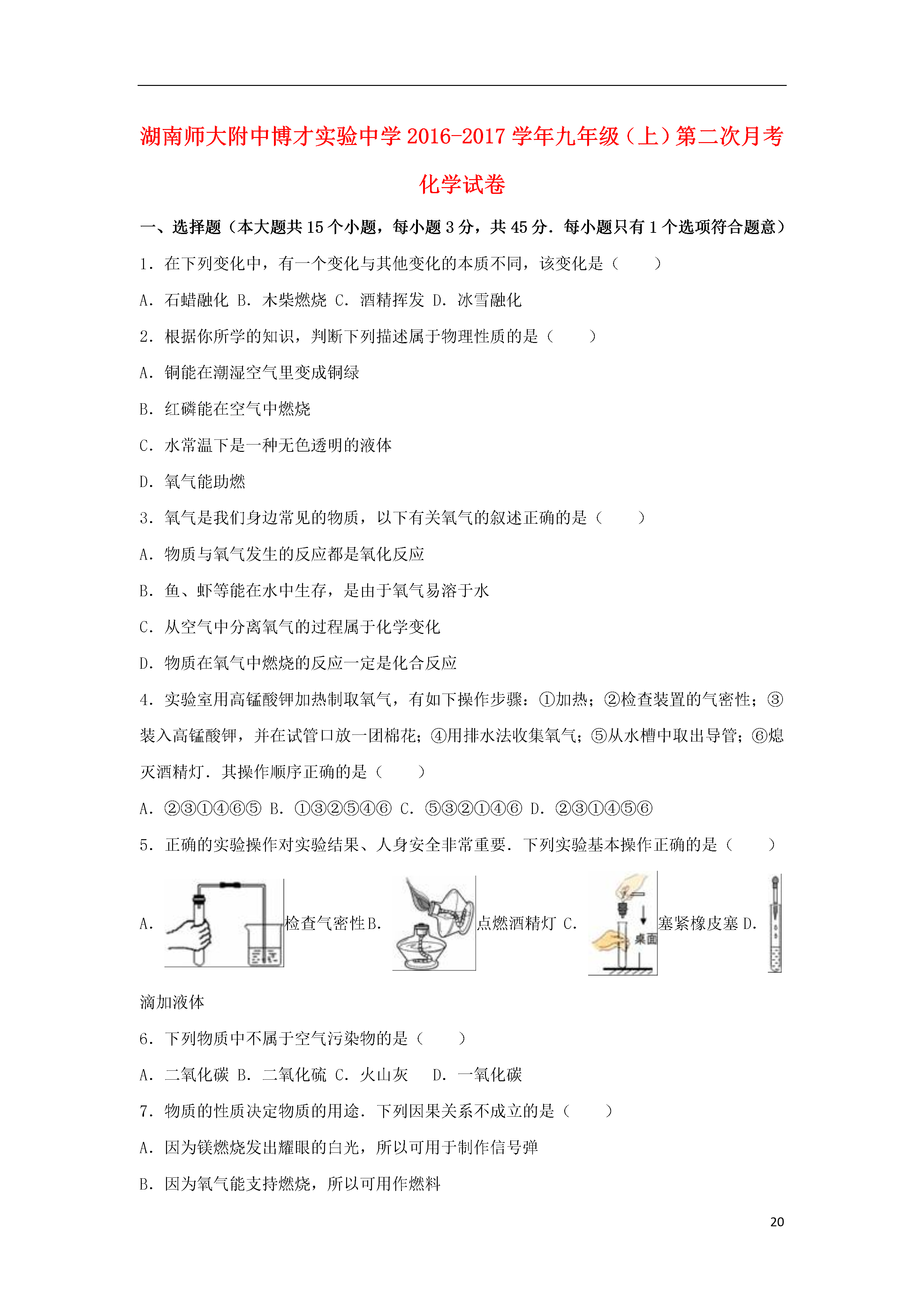20湖南师大附中博才实验中学2016-2017学年九年级(上)第二次月考化学试卷一、选择题(本大题共15个小题,每小题3分,共45分.每小题只有1个选项符合题意)1.在下列变化中,有一个变化与其他变化的本质不同,该变化是()A.石蜡融化B.木柴燃烧C.酒精挥发D.冰雪融化2.根据你所学的知识,判断下列描述属于物理性质的是()A.铜能在潮湿空气里变成铜绿B.红磷能在空气中燃烧C.水常温下是一种无色透明的液体D.氧气能助燃3.氧气是我们身边常见的物质,以下有关氧气的叙述正确的是()A.物质与氧气发生的反应都是氧化反应B.鱼、虾等能在水中生存,是由于氧气易溶于水C.从空气中分离氧气的过程属于化学变化D.物质在氧气中燃烧的反应一定是化合反应4.实验室用高锰酸钾加热制取氧气,有如下操作步骤:①加热;②检查装置的气密性;③装入高锰酸钾,并在试管口放一团棉花;④用排水法收集氧气;⑤从水槽中取出导管;⑥熄灭酒精灯.其操作顺序正确的是()A.②③①④⑥⑤B.①③②⑤④⑥C.⑤③②①④⑥D.②③①④⑤⑥5.正确的实验操作对实验结果、人身安全非常重要.下列实验基本操作正确的是()A.检查气密性B.点燃酒精灯C.塞紧橡皮塞D.滴加液体6.下列物质中不属于空气污染物的是()A.二氧化碳B.二氧化硫C.火山灰D.一氧化碳7.物质的性质决定物质的用途.下列因果关系不成立的是()A.因为镁燃烧发出耀眼的白光,所以可用于制作信号弹B.因为氧气能支持燃烧,所以可用作燃料C.因为氮气化学性质不活泼,所以可用于食品包装袋内防腐剂D.因为金属钨的熔点高,所以被用来制造灯泡中的灯丝8.如图所示装置可用于测定空气中氧气的含量,实验前在集气瓶内加入少量水,并做上记号.下列说法中不正确的是()A.该实验证明空气中氧气的质量分数约占B.实验时红磷要足量C.实验前一定要检查装置的气密性D.红磷燃烧的火焰熄灭后立刻打开弹簧夹9.下列化学反应属于分解反应的是()A.硫+氧气二氧化硫B.镁+氧气氧化镁C.碳酸→二氧化碳+水D.石蜡+氧气二氧化碳+水10.二氧化碳在过氧化氢分解试验中起到催化作用,关于催化剂的说法错误的是()A.在化学反应后催化剂的化学性质不会改变B.在过氧化氢溶液中加入二氧化锰能生成更多的氧气C.化学反应前后催化剂的质量不会发生改变D.过氧化氢不加入二氧化锰也能分解出氧气11.区别氮气、氧气和空气三种气体,应采用的方法是()A.将气体分别通入水中B.分别观察颜色C.将气体分别通入澄清的石灰水中D.将燃着的木条分别伸入集气瓶中12.下列实验项目所选择的仪器错误的是()A.吸取和滴加少量液体﹣胶头滴管B.盛放固体药品﹣细口瓶C.较多量液体加热﹣烧杯D.少量试剂的反应﹣试管13.科学研究证明物质由分子、原子等微观粒子构成,下列对分子性质判断错误的是()A.各为10mL的酒精和水混合后,体积小于20mL,说明分子很小B.酒香不怕巷子深,说明分子在不断运动C.夏天晒衣服更易干,说明温度越高,分子运动越快D.打满气的气球可以被压缩,说明分子间有间隔14.实验对化学的学习有举足轻重的作用,要求学生能准确的描述实验现象.对下列实验现象描述正确的是()A.铁丝在氧气中燃烧,火星四射,生成四氧化三铁B.木炭在空气中剧烈燃烧,发出白光C.硫在氧气中燃烧,火焰呈蓝紫色,放出有刺激性气味的气体D.浓氨水加入到酚酞溶液中,溶液变蓝15.如图所示装置有多种功能,如收集、洗涤、贮存气体等,下列说法不正确的是()A.气体从a端进入集气,该气体密度比空气密度小B.气体从b端进入集气,该气体密度比空气密度大C.将此装置倒置后,气体从a端进入集气,该气体密度比空气密度大D.装置中预先盛满水,将水排出贮气,气体应从b端进入二、填空题(本大题共4个小题,每空2分,共29分)16.(5分)根据所学过的知识,按下列要求填空:(1)写出对应的元素符号或名称:硫;氢;Al.(2)写出铁丝在氧气中燃烧的文字表达式:.17.(8分)现要量取15mL的盐酸,需要和配合使用,量液时,量筒必须平放,视线要与保持水平;若某同学量取液体时俯视量筒内液体凹液面的最低处读出的读数为15mL,则所取液体的实际体积应15mL(填“<”、“>”或“=”)18.(10分)空气中含量较多的甲、乙两种气体混合后通入澄清石灰水中,石灰水无明显变化;将灼热至发红光的黑色固体丁放到混合气体中,丁燃烧生成新的气体丙,丁熄灭后,测知甲气体已全部耗尽;往乙、丙混合气中加入澄清石灰水,石灰水变浑浊.已知乙气体约占空气体积的,则这些物质分别是:(1)甲:;乙;丙;丁.(2)写出丁生成丙反应的文字表达式.