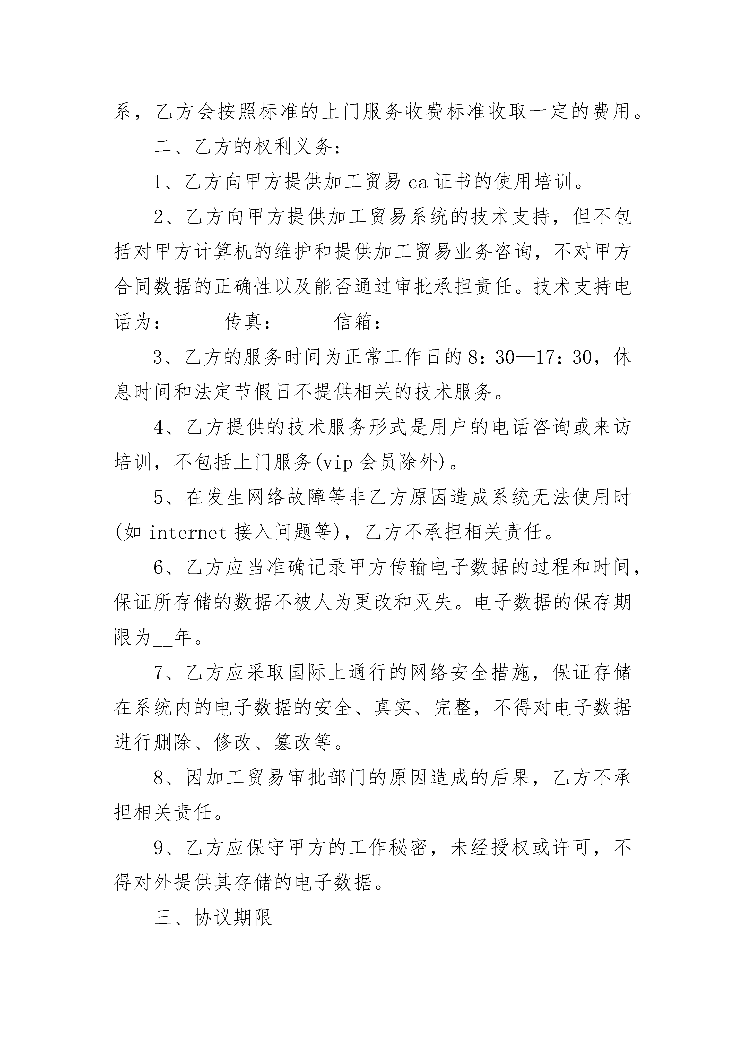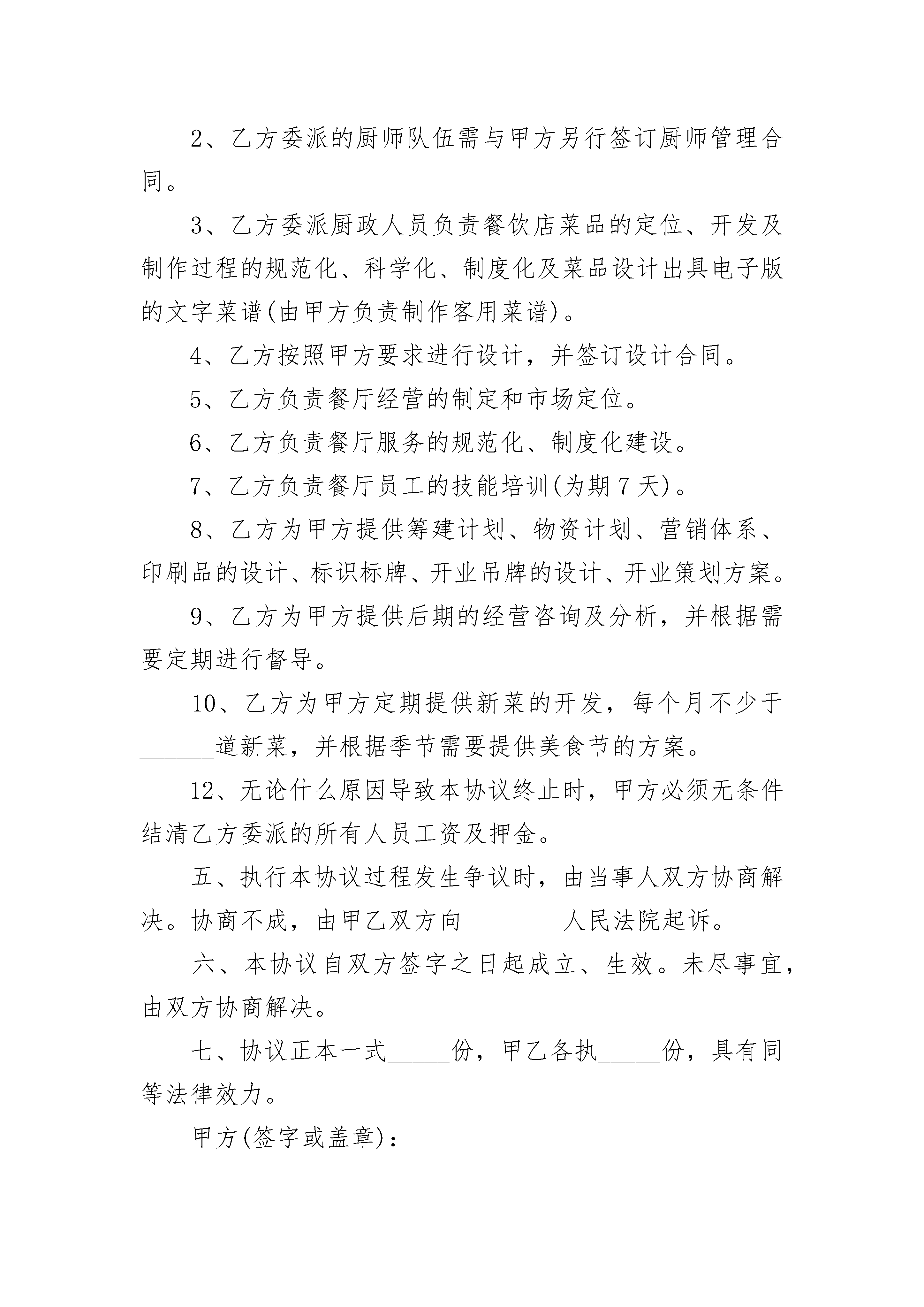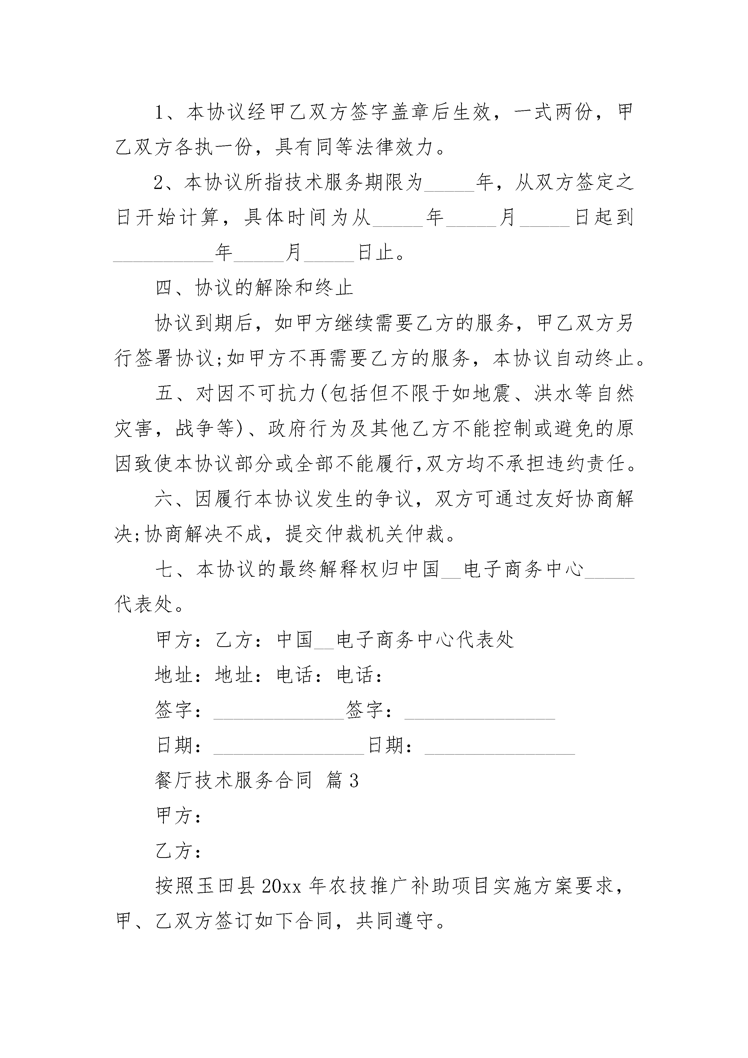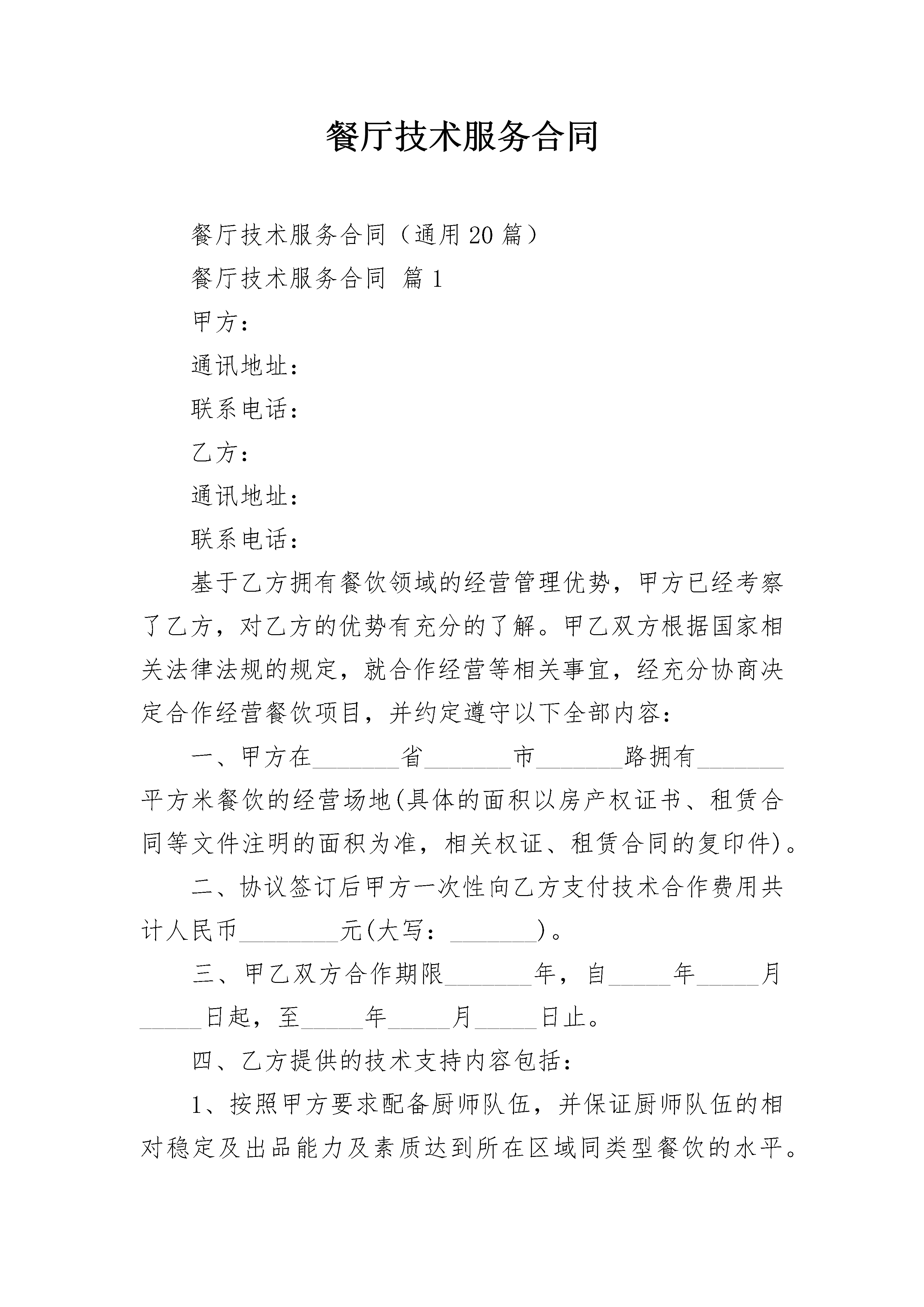 餐厅技术服务合同餐厅技术服务合同(通用20篇)餐厅技术服务合同篇1甲方:通讯地址:联系电话:乙方:通讯地址:联系电话:基于乙方拥有餐饮领域的经营管理优势,甲方已经考察了乙方,对乙方的优势有充分的了解。甲乙双方根据国家相关法律法规的规定,就合作经营等相关事宜,经充分协商决定合作经营餐饮项目,并约定遵守以下全部内容:一、甲方在_______省_______市_______路拥有_______平方米餐饮的经营场地(具体的面积以房产权证书、租赁合同等文件注明的面积为准,相关权证、租赁合同的复印件)。二、协议签订后甲方一次性向乙方支付技术合作费用共计人民币________元(大写:_______)。三、甲乙双方合作期限_______年,自_____年_____月_____日起,至_____年_____月_____日止。四、乙方提供的技术支持内容包括:1、按照甲方要求配备厨师队伍,并保证厨师队伍的相对稳定及出品能力及素质达到所在区域同类型餐饮的水平。2、乙方委派的厨师队伍需与甲方另行签订厨师管理合同。3、乙方委派厨政人员负责餐饮店菜品的定位、开发及制作过程的规范化、科学化、制度化及菜品设计出具电子版的文字菜谱(由甲方负责制作客用菜谱)。4、乙方按照甲方要求进行设计,并签订设计合同。5、乙方负责餐厅经营的制定和市场定位。6、乙方负责餐厅服务的规范化、制度化建设。7、乙方负责餐厅员工的技能培训(为期7天)。8、乙方为甲方提供筹建计划、物资计划、营销体系、印刷品的设计、标识标牌、开业吊牌的设计、开业策划方案。9、乙方为甲方提供后期的经营咨询及分析,并根据需要定期进行督导。10、乙方为甲方定期提供新菜的开发,每个月不少于______道新菜,并根据季节需要提供美食节的方案。12、无论什么原因导致本协议终止时,甲方必须无条件结清乙方委派的所有人员工资及押金。五、执行本协议过程发生争议时,由当事人双方协商解决。协商不成,由甲乙双方向________人民法院起诉。六、本协议自双方签字之日起成立、生效。未尽事宜,由双方协商解决。七、协议正本一式_____份,甲乙各执_____份,具有同等法律效力。甲方(签字或盖章):签订日期:_____年_____月_____日签订地点:乙方(签字或盖章):签订日期:_____年_____月_____日签订地点:餐厅技术服务合同篇2甲方:乙方:中国__电子商务中心代表处甲乙双方经过友好协商,本着平等、自愿、互惠互利的原则,现就乙方向甲方提供有关电子政务系统的技术支持和数据保存等服务,达成如下协议:一、甲方的权利义务:1、甲方应在本协议签署后_____日内向乙方支付_____元/年的技术服务费,2、甲方使用乙方提供的加工贸易申报系统,以电子数据的形式向加工贸易审批部门申报加工贸易合同。3、甲方应确保计算机系统和ie浏览器能正常工作,自行解决网络接入问题。4、甲方应指定专人(该人员应具备一定的加工贸易业务知识)负责系统的操作,甲方指定人员发生变动时,应及时通知乙方。指定联系人:__________电话:__________传真:__________信箱:_____5、甲方在遇到技术问题时,应及时跟乙方联系,如实向乙方描述故障现象,积极协助乙方解决问题。6、甲方如需乙方提供上门技术服务,应及时跟乙方联系,乙方会按照标准的上门服务收费标准收取一定的费用。二、乙方的权利义务:1、乙方向甲方提供加工贸易ca证书的使用培训。2、乙方向甲方提供加工贸易系统的技术支持,但不包括对甲方计算机的维护和提供加工贸易业务咨询,不对甲方合同数据的正确性以及能否通过审批承担责任。技术支持电话为:_____传真:_____信箱:_______________3、乙方的服务时间为正常工作日的8:30—17:30,休息时间和法定节假日不提供相关的技术服务。4、乙方提供的技术服务形式是用户的电话咨询或来访培训,不包括上门服务(vip会员除外)。5、在发生网络故障等非乙方原因造成系统无法使用时(如internet接入问题等),乙方不承担相关责任。6、乙方应当准确记录甲方传输电子数据的过程和时间,保证所存储的数据不被人为更改和灭失。电子数据的保存期限为__年。7、乙方应采取国际上通行的网络安全措施,保证存储在系统内的电子数据的安全、真实、完整,不得对电子数据进行删除、修改、篡改等。8、因加工贸易审批部门的原因造成的后果,乙方不承担相关责任。9、乙方应保守甲方的工作秘密,未经授权或许可,不得对外提供其存储的电子数据。三、协议期限1、本协议经甲乙双方签字盖章后生效,一式两份,甲乙双方各执一份,具有同等法律效力。2、本协议所指技术服务期限为_____年,从双方签定之日开始计算,具体时间为从_____年_____月_____日起到__________年_____月__