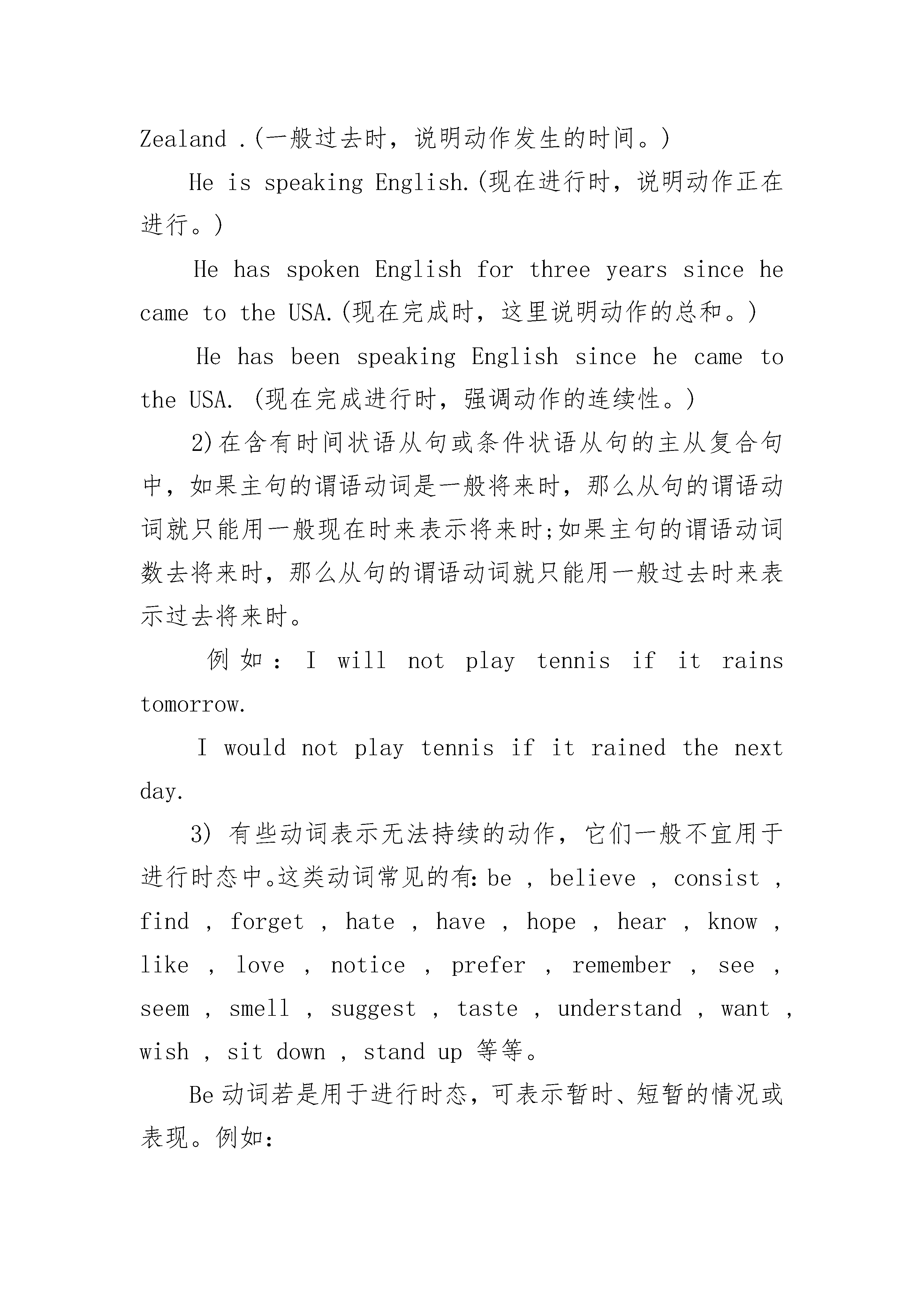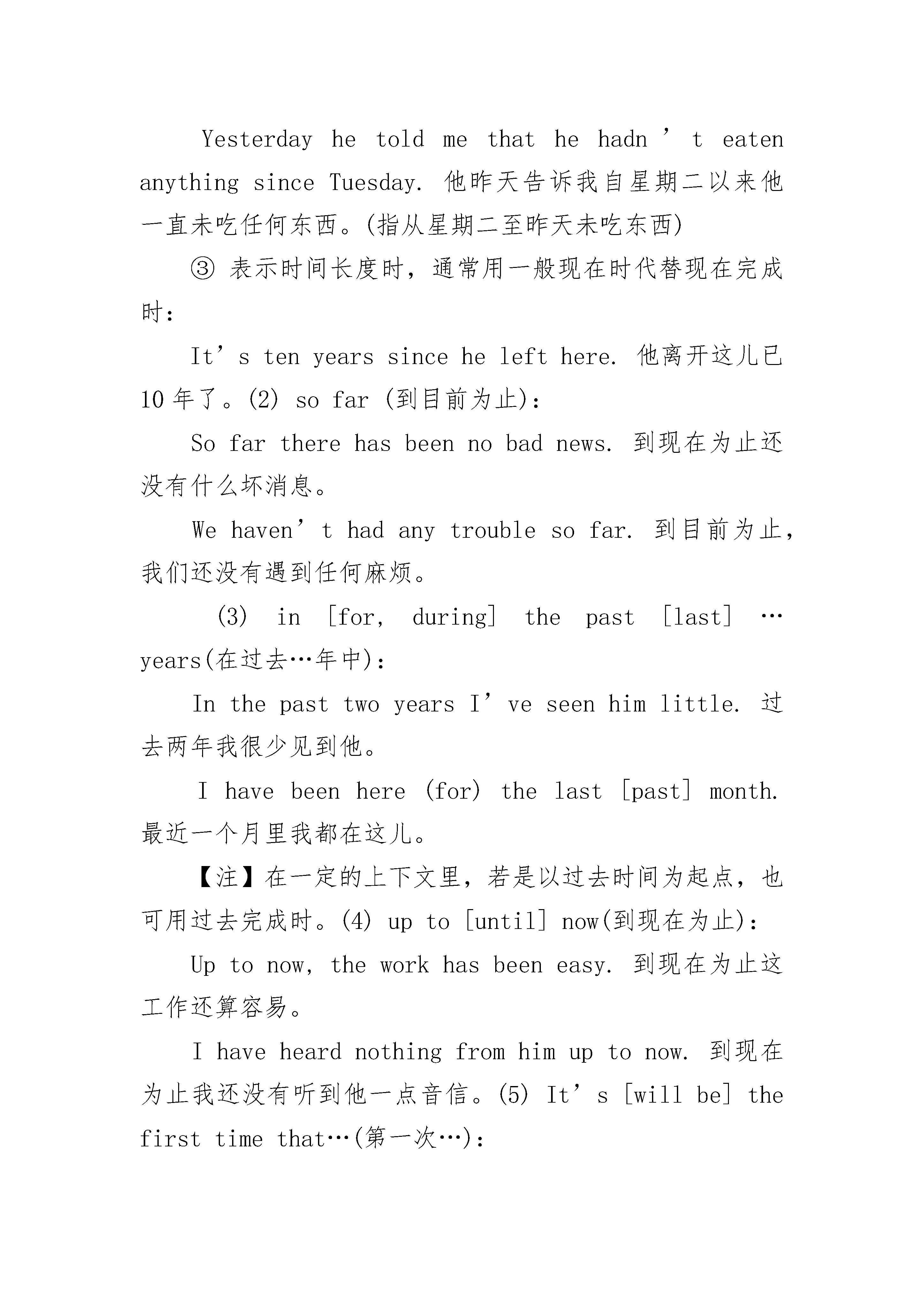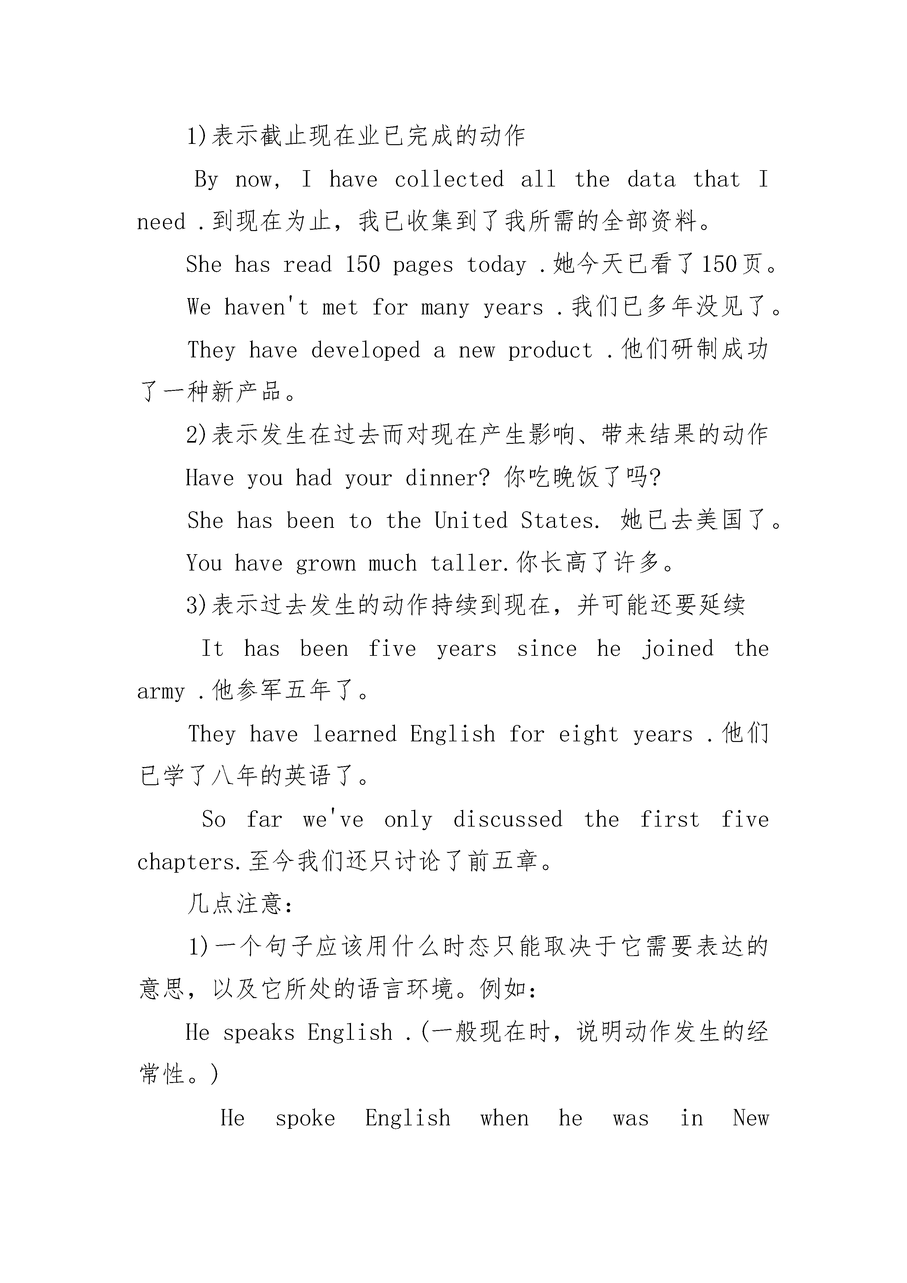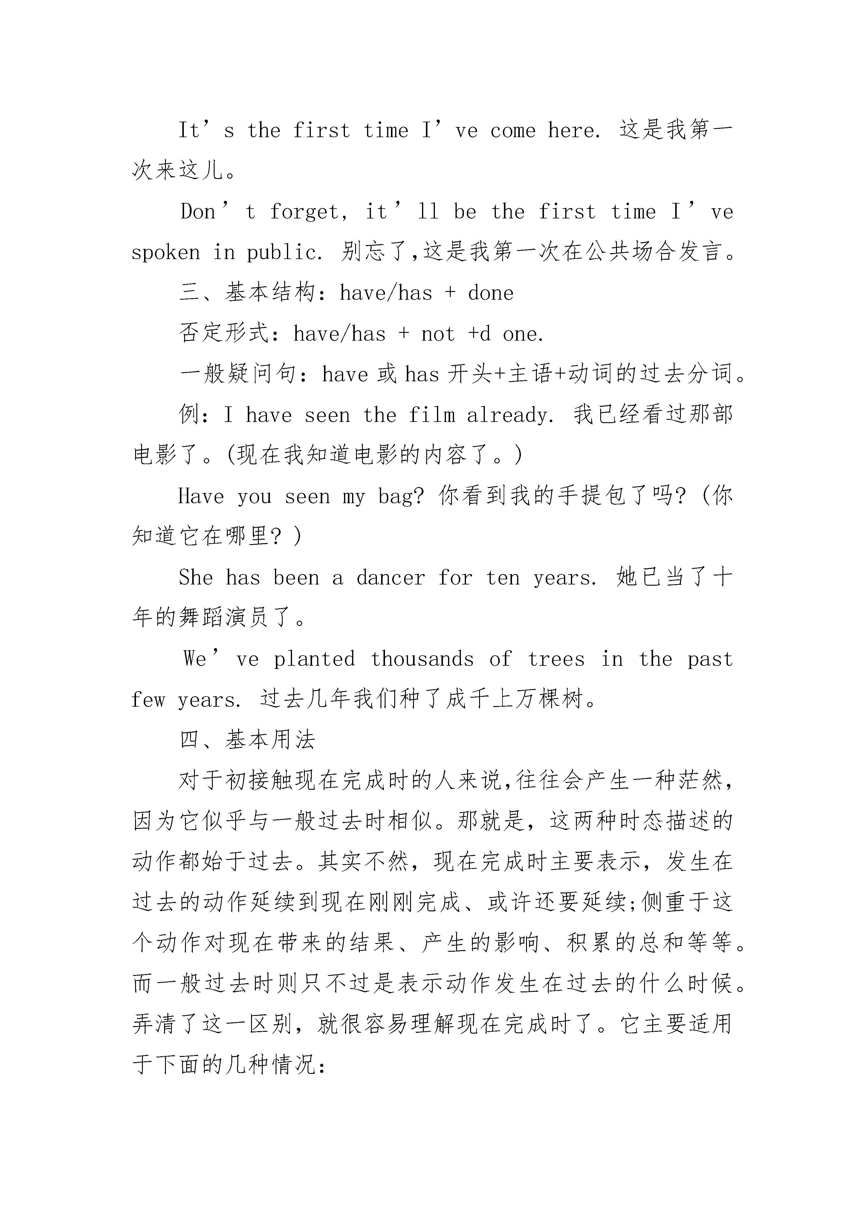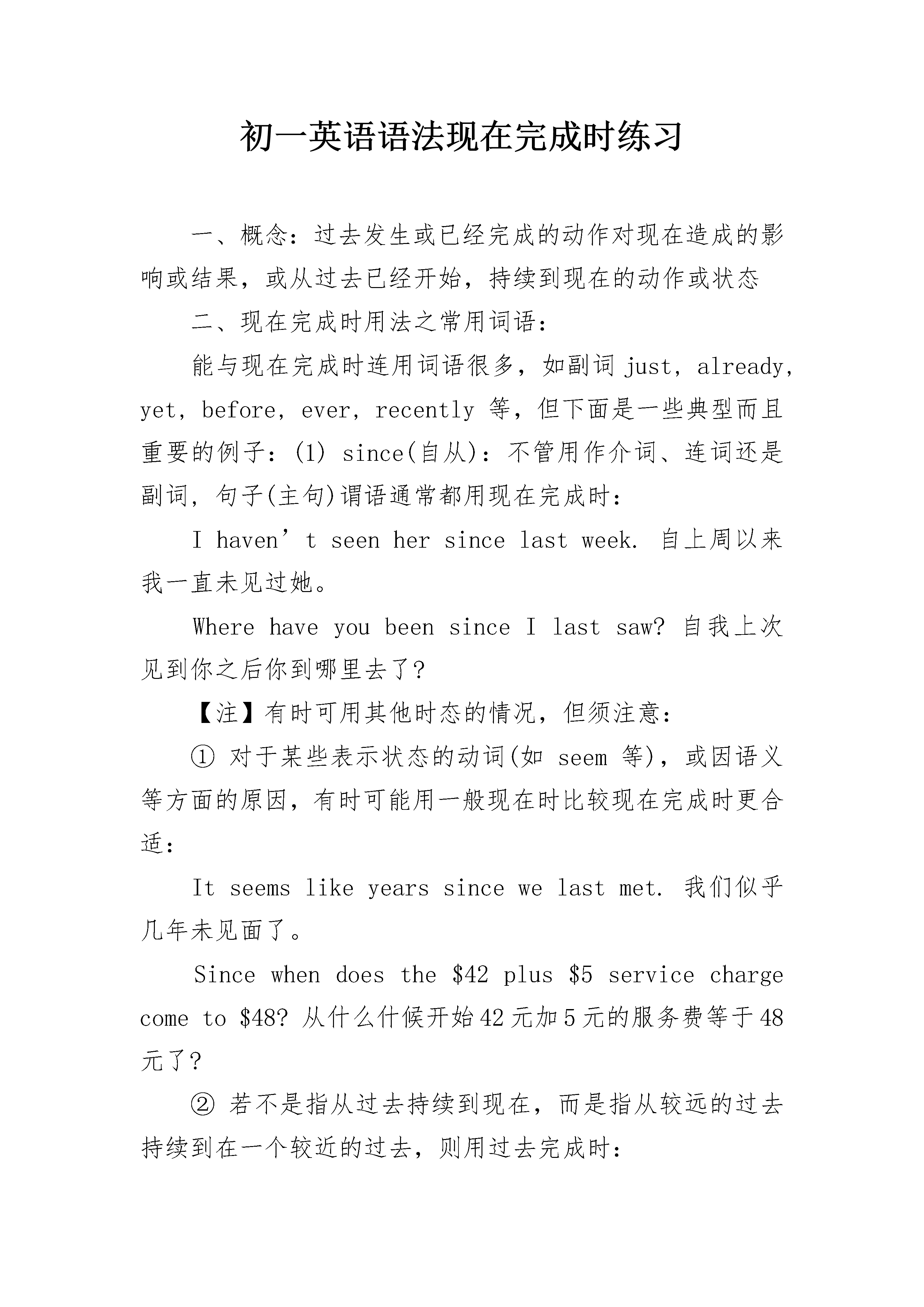 初一英语语法现在完成时练习一、概念:过去发生或已经完成的动作对现在造成的影响或结果,或从过去已经开始,持续到现在的动作或状态二、现在完成时用法之常用词语:能与现在完成时连用词语很多,如副词just,already,yet,before,ever,recently等,但下面是一些典型而且重要的例子:(1)since(自从):不管用作介词、连词还是副词,句子(主句)谓语通常都用现在完成时:Ihaven’tseenhersincelastweek.自上周以来我一直未见过她。WherehaveyoubeensinceIlastsaw?自我上次见到你之后你到哪里去了?【注】有时可用其他时态的情况,但须注意:①对于某些表示状态的动词(如seem等),或因语义等方面的原因,有时可能用一般现在时比较现在完成时更合适:Itseemslikeyearssincewelastmet.我们似乎几年未见面了。Sincewhendoesthe$42plus$5servicechargecometo$48?从什么什候开始42元加5元的服务费等于48元了?②若不是指从过去持续到现在,而是指从较远的过去持续到在一个较近的过去,则用过去完成时:Yesterdayhetoldmethathehadn’teatenanythingsinceTuesday.他昨天告诉我自星期二以来他一直未吃任何东西。(指从星期二至昨天未吃东西)③表示时间长度时,通常用一般现在时代替现在完成时:It’stenyearssincehelefthere.他离开这儿已10年了。(2)sofar(到目前为止):Sofartherehasbeennobadnews.到现在为止还没有什么坏消息。Wehaven’thadanytroublesofar.到目前为止,我们还没有遇到任何麻烦。(3)in[for,during]thepast[last]…years(在过去…年中):InthepasttwoyearsI’veseenhimlittle.过去两年我很少见到他。Ihavebeenhere(for)thelast[past]month.最近一个月里我都在这儿。【注】在一定的上下文里,若是以过去时间为起点,也可用过去完成时。(4)upto[until]now(到现在为止):Uptonow,theworkhasbeeneasy.到现在为止这工作还算容易。Ihaveheardnothingfromhimuptonow.到现在为止我还没有听到他一点音信。(5)It’s[willbe]thefirsttimethat…(第一次…):It’sthefirsttimeI’vecomehere.这是我第一次来这儿。Don’tforget,it’llbethefirsttimeI’vespokeninpublic.别忘了,这是我第一次在公共场合发言。三、基本结构:have/has+done否定形式:have/has+not+done.一般疑问句:have或has开头+主语+动词的过去分词。例:Ihaveseenthefilmalready.我已经看过那部电影了。(现在我知道电影的内容了。)Haveyouseenmybag?你看到我的手提包了吗?(你知道它在哪里?)Shehasbeenadancerfortenyears.她已当了十年的舞蹈演员了。We’veplantedthousandsoftreesinthepastfewyears.过去几年我们种了成千上万棵树。四、基本用法对于初接触现在完成时的人来说,往往会产生一种茫然,因为它似乎与一般过去时相似。那就是,这两种时态描述的动作都始于过去。其实不然,现在完成时主要表示,发生在过去的动作延续到现在刚刚完成、或许还要延续;侧重于这个动作对现在带来的结果、产生的影响、积累的总和等等。而一般过去时则只不过是表示动作发生在过去的什么时候。弄清了这一区别,就很容易理解现在完成时了。它主要适用于下面的几种情况:1)表示截止现在业已完成的动作Bynow,IhavecollectedallthedatathatIneed.到现在为止,我已收集到了我所需的全部资料。Shehasread150pagestoday.她今天已看了150页。Wehaven'tmetformanyyears.我们已多年没见了。Theyhavedevelopedanewproduct.他们研制成功了一种新产品。2)表示发生在过去而对现在产生影响、带来结果的动作Haveyouhadyourdinner?你吃晚饭了吗?ShehasbeentotheUnitedStates.她已去美国了。Youhavegrownmuchtaller.你长高了许多。3)表示过去发生的动作持续到现在,并可能还要延续Ithasbee