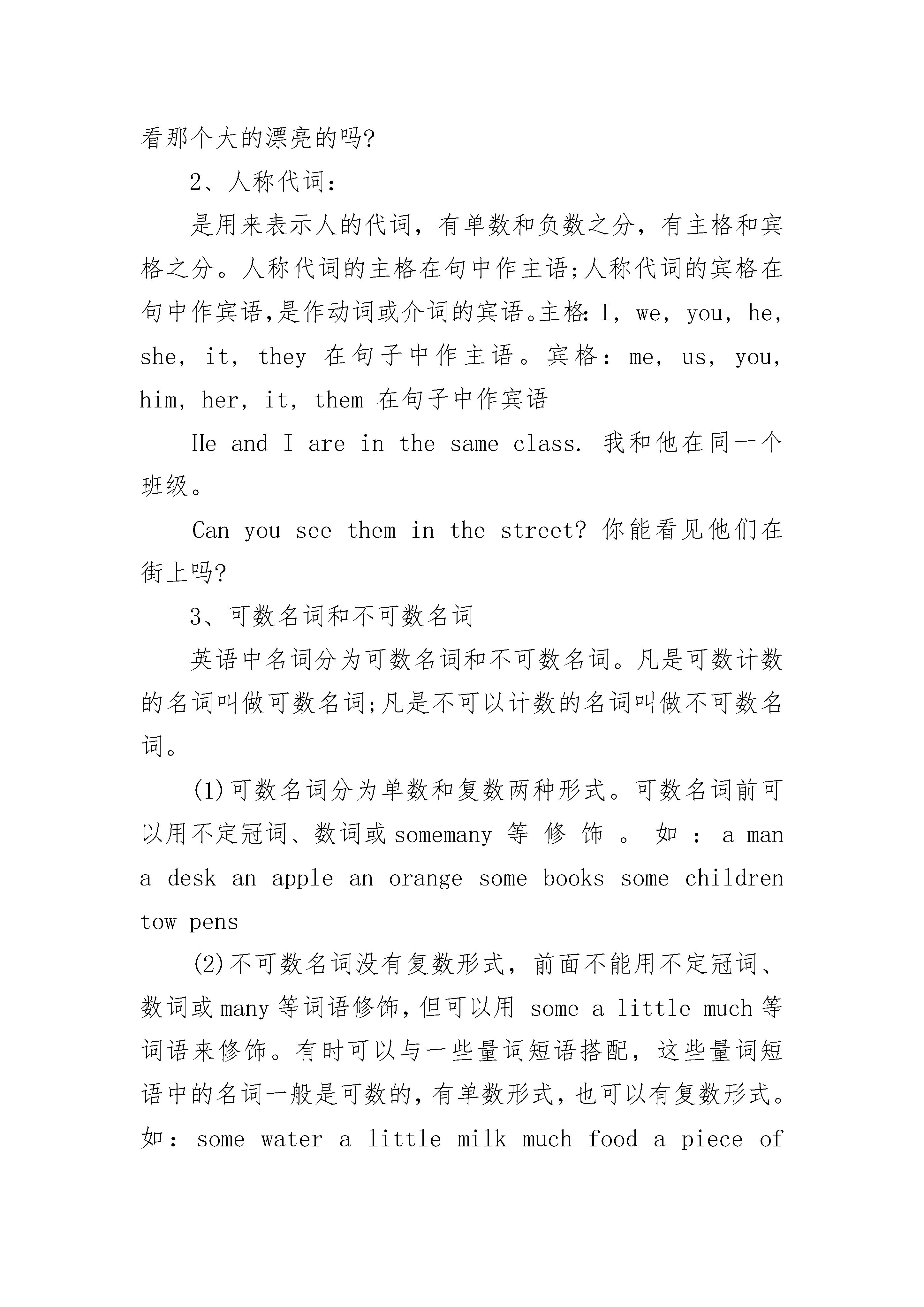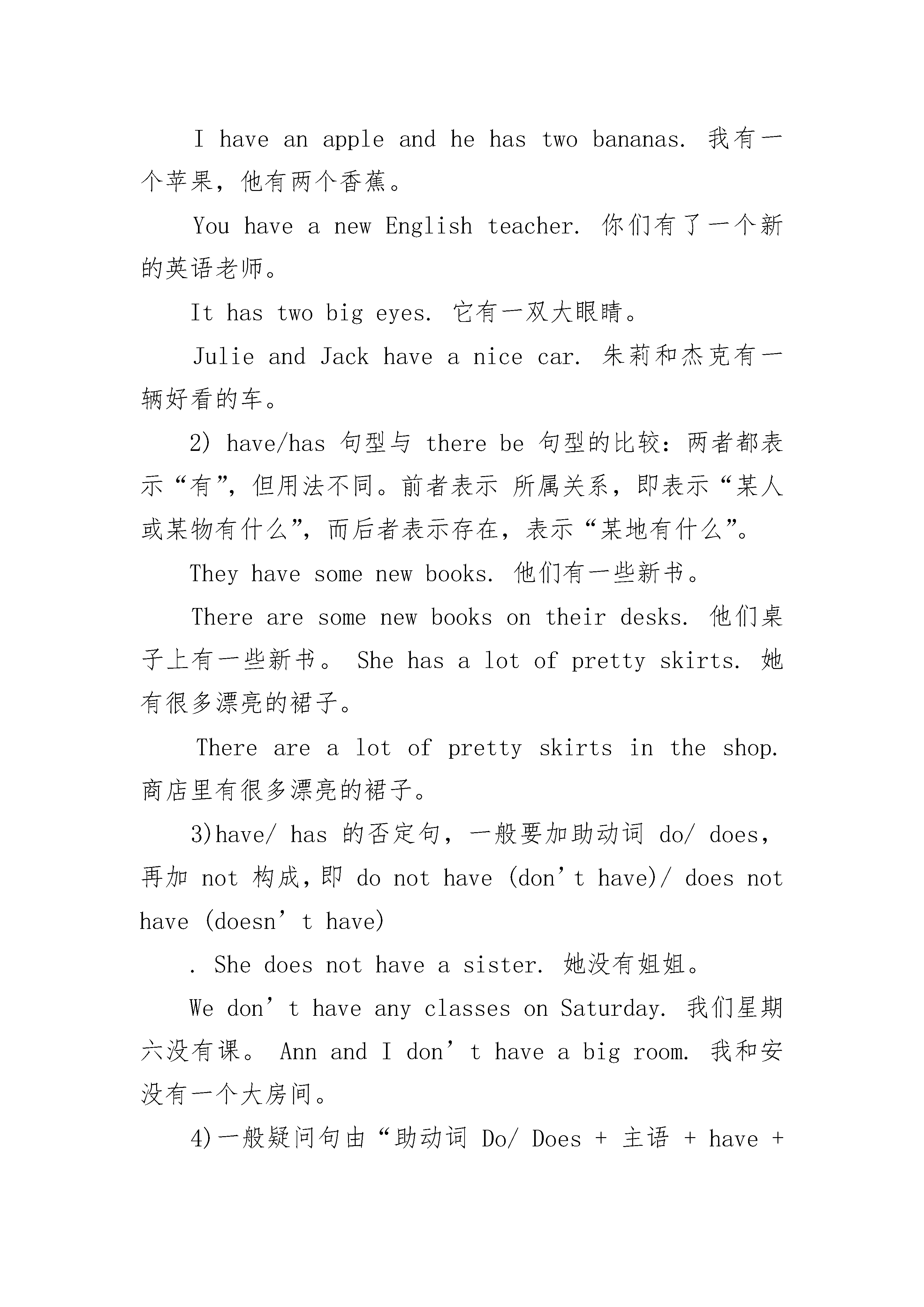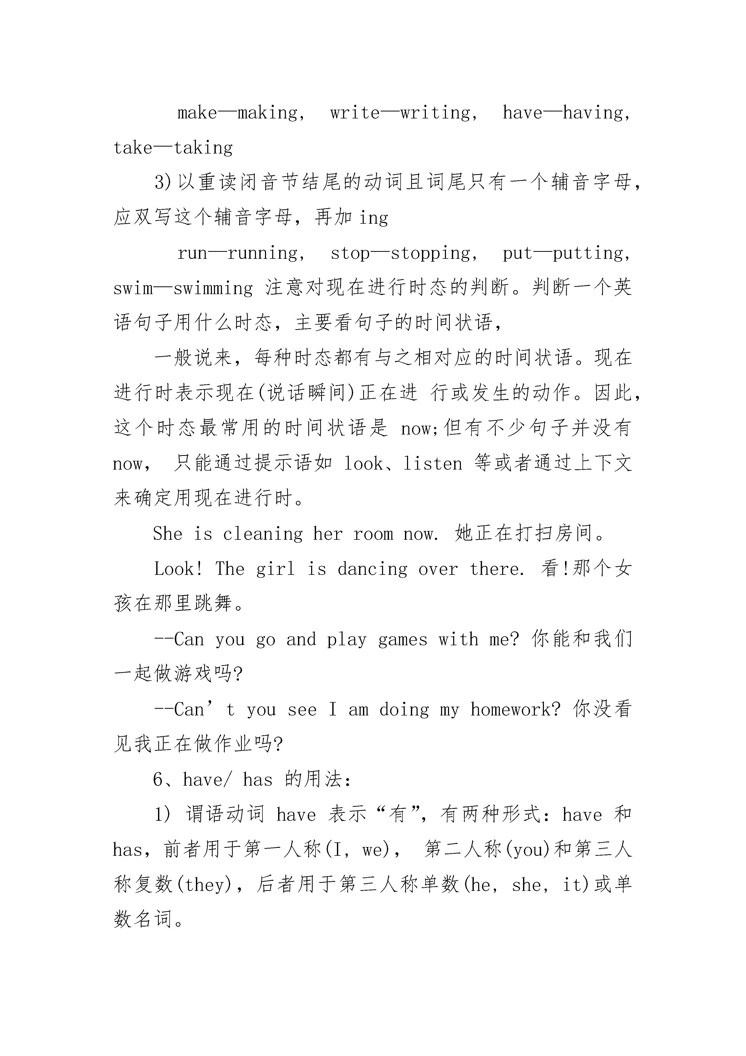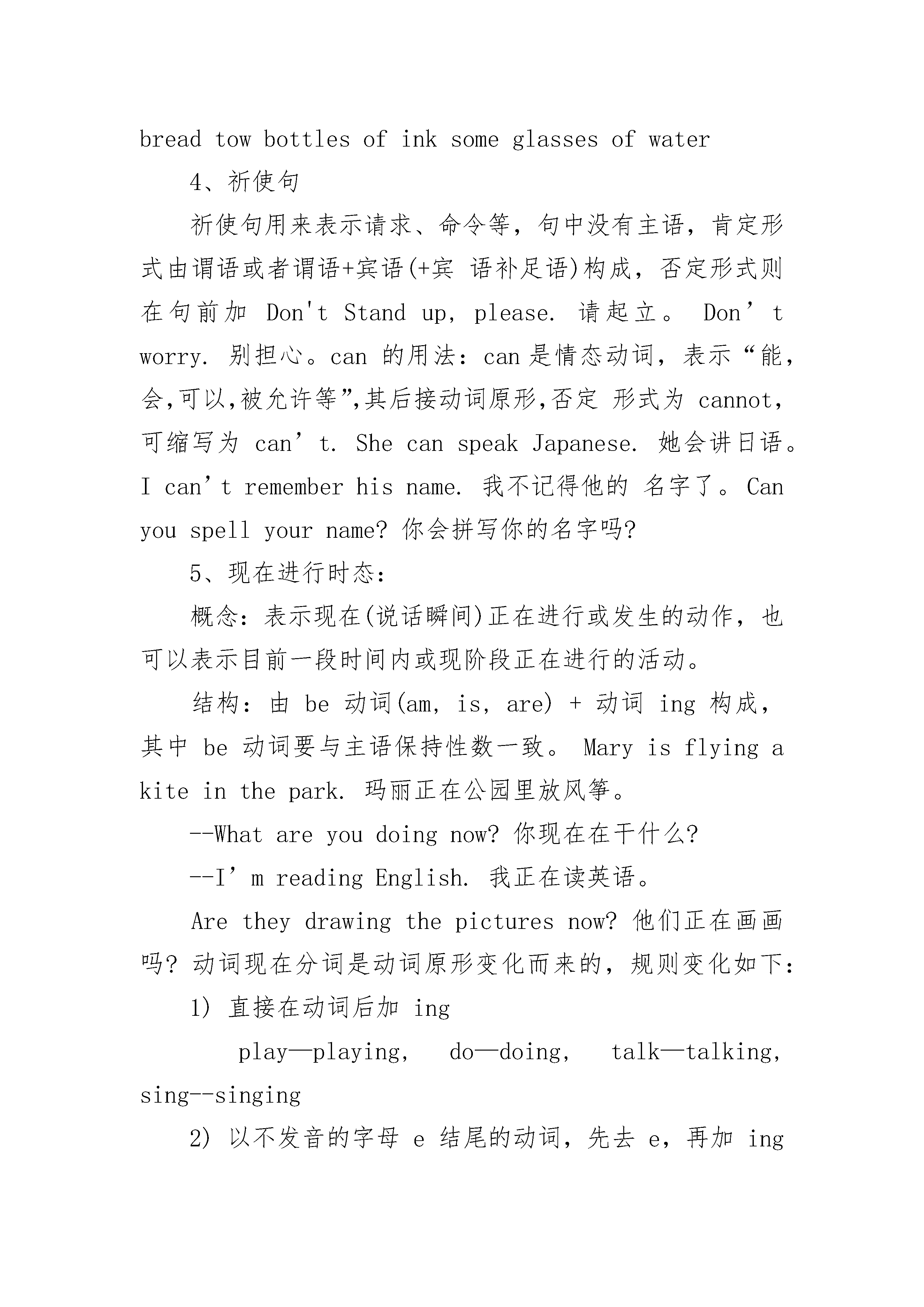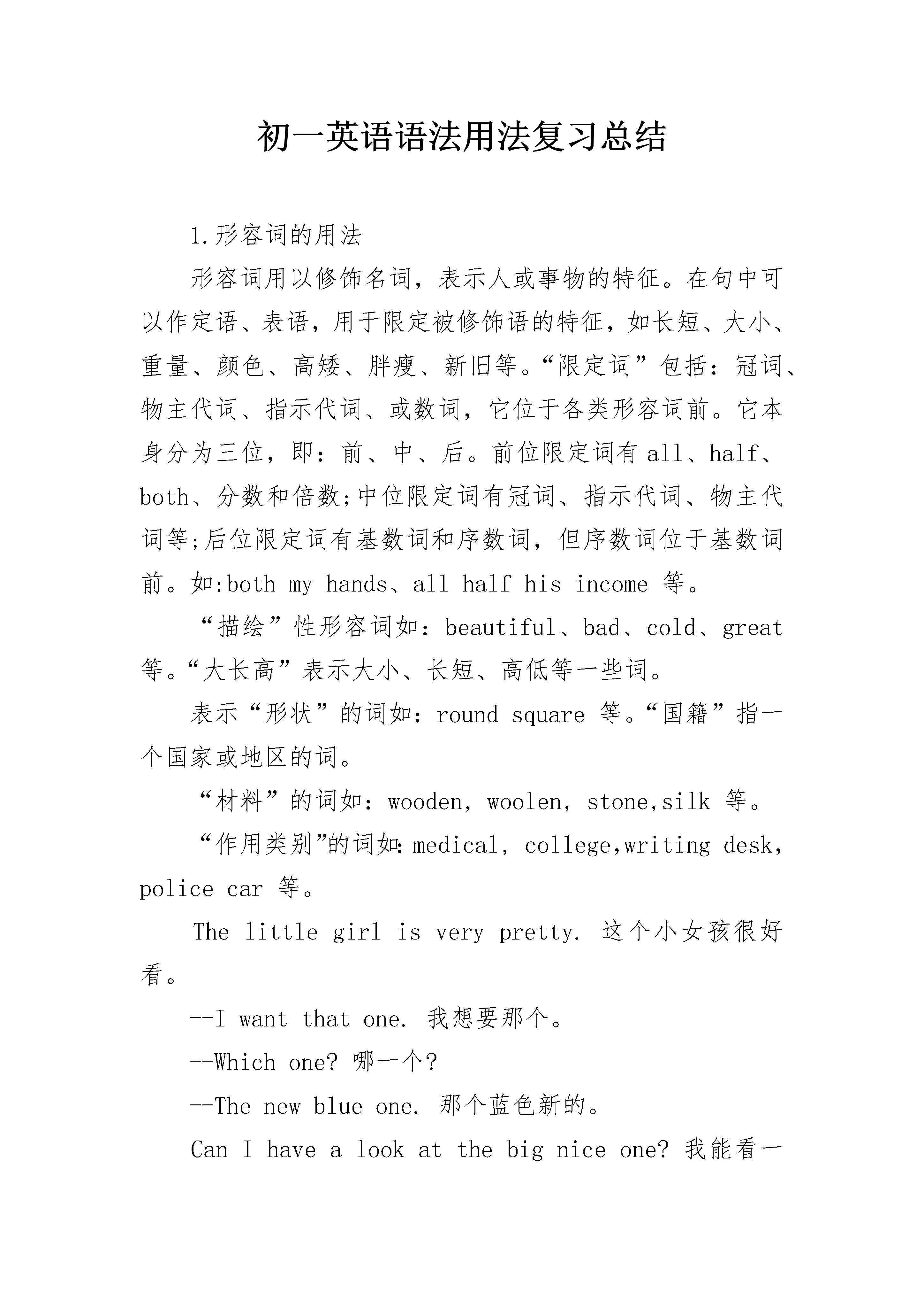 初一英语语法用法复习总结1.形容词的用法形容词用以修饰名词,表示人或事物的特征。在句中可以作定语、表语,用于限定被修饰语的特征,如长短、大小、重量、颜色、高矮、胖瘦、新旧等。“限定词”包括:冠词、物主代词、指示代词、或数词,它位于各类形容词前。它本身分为三位,即:前、中、后。前位限定词有all、half、both、分数和倍数;中位限定词有冠词、指示代词、物主代词等;后位限定词有基数词和序数词,但序数词位于基数词前。如:bothmyhands、allhalfhisincome等。“描绘”性形容词如:beautiful、bad、cold、great等。“大长高”表示大小、长短、高低等一些词。表示“形状”的词如:roundsquare等。“国籍”指一个国家或地区的词。“材料”的词如:wooden,woolen,stone,silk等。“作用类别”的词如:medical,college,writingdesk,policecar等。Thelittlegirlisverypretty.这个小女孩很好看。--Iwantthatone.我想要那个。--Whichone?哪一个?--Thenewblueone.那个蓝色新的。CanIhavealookatthebigniceone?我能看一看那个大的漂亮的吗?2、人称代词:是用来表示人的代词,有单数和负数之分,有主格和宾格之分。人称代词的主格在句中作主语;人称代词的宾格在句中作宾语,是作动词或介词的宾语。主格:I,we,you,he,she,it,they在句子中作主语。宾格:me,us,you,him,her,it,them在句子中作宾语HeandIareinthesameclass.我和他在同一个班级。Canyouseetheminthestreet?你能看见他们在街上吗?3、可数名词和不可数名词英语中名词分为可数名词和不可数名词。凡是可数计数的名词叫做可数名词;凡是不可以计数的名词叫做不可数名词。(1)可数名词分为单数和复数两种形式。可数名词前可以用不定冠词、数词或somemany等修饰。如:amanadeskanappleanorangesomebookssomechildrentowpens(2)不可数名词没有复数形式,前面不能用不定冠词、数词或many等词语修饰,但可以用somealittlemuch等词语来修饰。有时可以与一些量词短语搭配,这些量词短语中的名词一般是可数的,有单数形式,也可以有复数形式。如:somewateralittlemilkmuchfoodapieceofbreadtowbottlesofinksomeglassesofwater4、祈使句祈使句用来表示请求、命令等,句中没有主语,肯定形式由谓语或者谓语+宾语(+宾语补足语)构成,否定形式则在句前加Don'tStandup,please.请起立。Don’tworry.别担心。can的用法:can是情态动词,表示“能,会,可以,被允许等”,其后接动词原形,否定形式为cannot,可缩写为can’t.ShecanspeakJapanese.她会讲日语。Ican’trememberhisname.我不记得他的名字了。Canyouspellyourname?你会拼写你的名字吗?5、现在进行时态:概念:表示现在(说话瞬间)正在进行或发生的动作,也可以表示目前一段时间内或现阶段正在进行的活动。结构:由be动词(am,is,are)+动词ing构成,其中be动词要与主语保持性数一致。Maryisflyingakiteinthepark.玛丽正在公园里放风筝。--Whatareyoudoingnow?你现在在干什么?--I’mreadingEnglish.我正在读英语。Aretheydrawingthepicturesnow?他们正在画画吗?动词现在分词是动词原形变化而来的,规则变化如下:1)直接在动词后加ingplay—playing,do—doing,talk—talking,sing--singing2)以不发音的字母e结尾的动词,先去e,再加ingmake—making,write—writing,have—having,take—taking3)以重读闭音节结尾的动词且词尾只有一个辅音字母,应双写这个辅音字母,再加ingrun—running,stop—stopping,put—putting,swim—swimming注意对现在进行时态的判断。判断一个英语句子用什么时态,主要看句子的时间状语,一般说来,每种时态都有与之相对应的时间状语。现在进行时表示现在(说话瞬间)正在进行或发生的动作。因此,这个时态最常用的时间状语是now;但有不少句子并没有now,只能通过提示语如look、listen等或者通过上下文来确