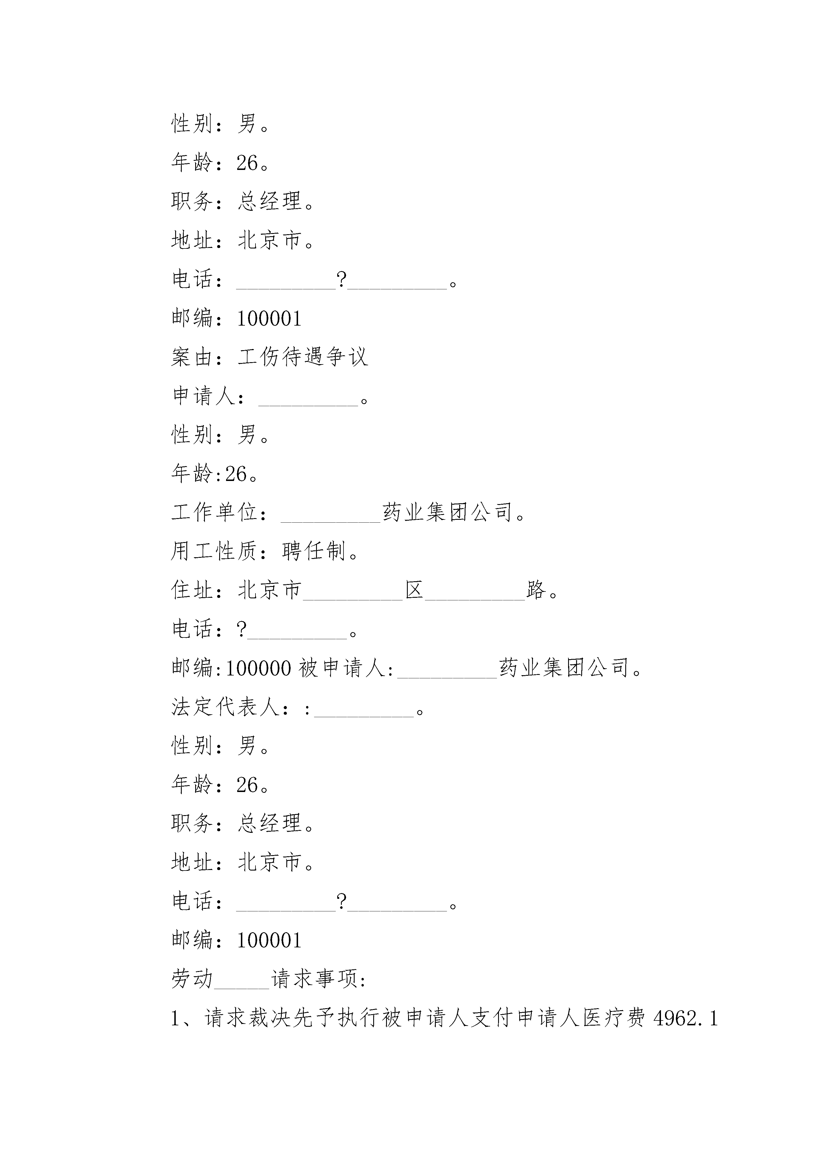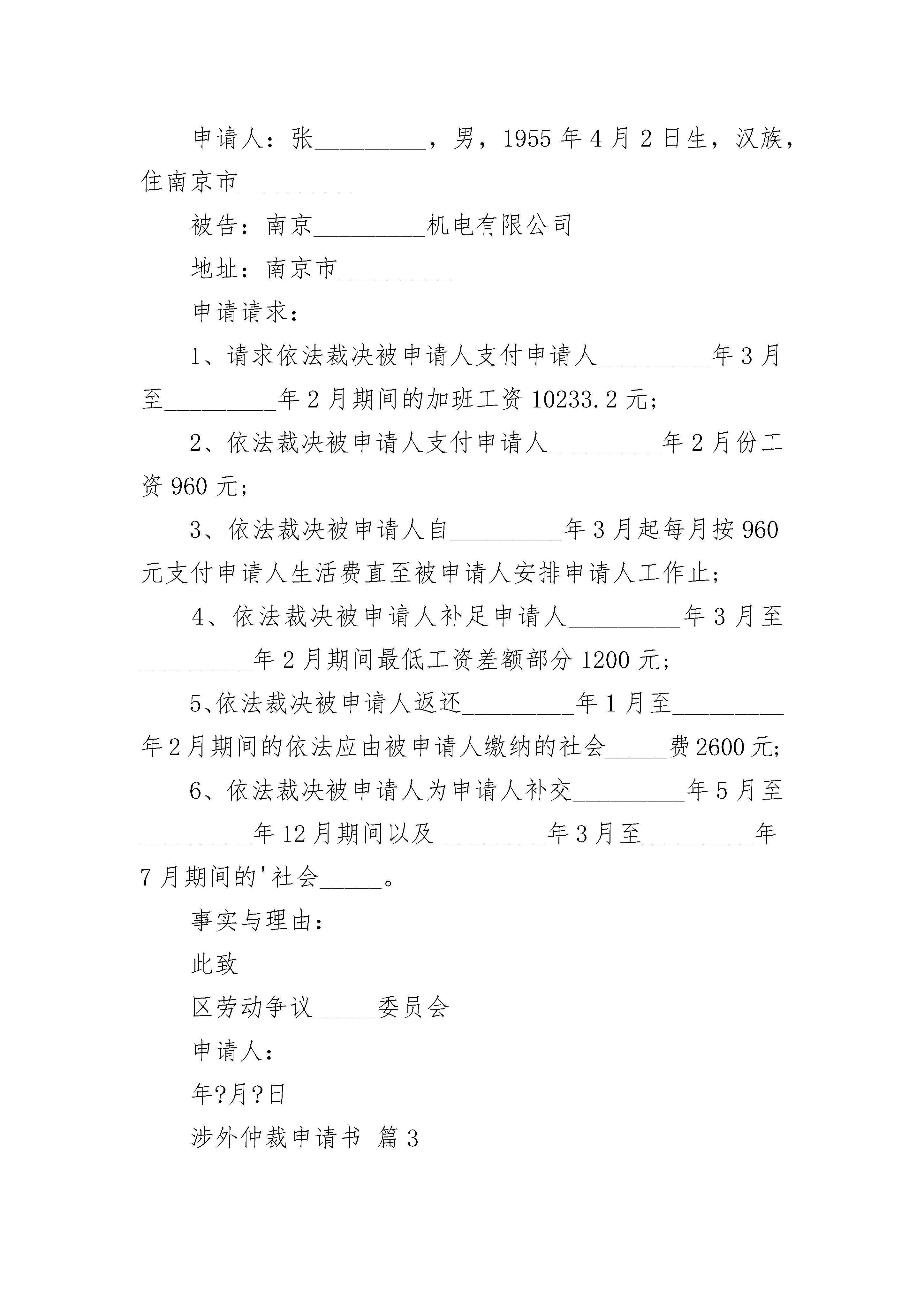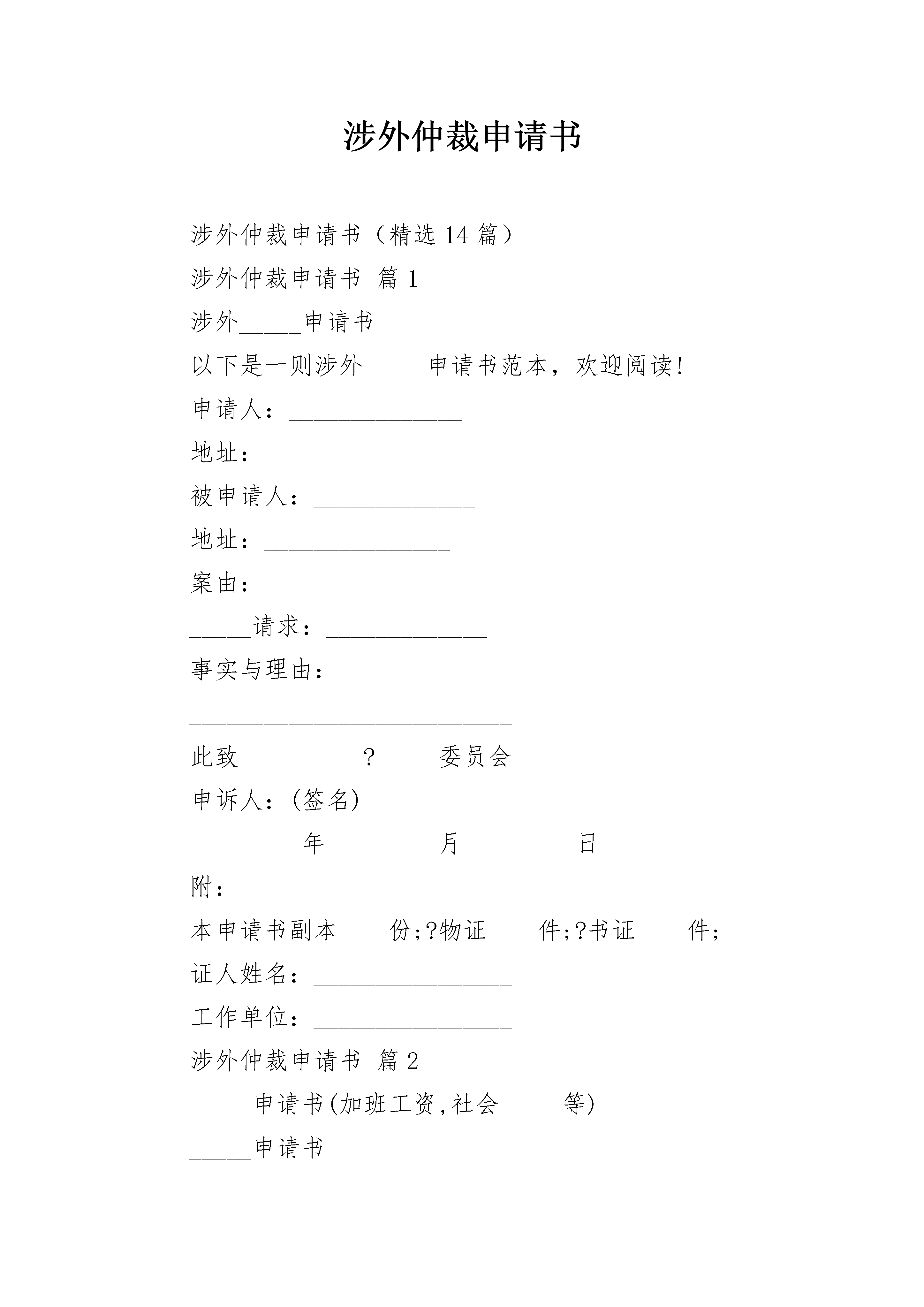 涉外仲裁申请书涉外仲裁申请书(精选14篇)涉外仲裁申请书篇1涉外_____申请书以下是一则涉外_____申请书范本,欢迎阅读!申请人:______________地址:_______________被申请人:_____________地址:_______________案由:____________________请求:_____________事实与理由:___________________________________________________此致__________?_____委员会申诉人:(签名)_________年_________月_________日附:本申请书副本____份;?物证____件;?书证____件;证人姓名:________________工作单位:________________涉外仲裁申请书篇2_____申请书(加班工资,社会_____等)_____申请书申请人:张_________,男,1955年4月2日生,汉族,住南京市_________被告:南京_________机电有限公司地址:南京市_________申请请求:1、请求依法裁决被申请人支付申请人_________年3月至_________年2月期间的加班工资10233.2元;2、依法裁决被申请人支付申请人_________年2月份工资960元;3、依法裁决被申请人自_________年3月起每月按960元支付申请人生活费直至被申请人安排申请人工作止;4、依法裁决被申请人补足申请人_________年3月至_________年2月期间最低工资差额部分1200元;5、依法裁决被申请人返还_________年1月至_________年2月期间的依法应由被申请人缴纳的社会_____费2600元;6、依法裁决被申请人为申请人补交_________年5月至_________年12月期间以及_________年3月至_________年7月期间的'社会_____。事实与理由:此致区劳动争议_____委员会申请人:年?月?日涉外仲裁申请书篇3工伤劳动书面_____申请书申请人申请_____应当提交书面_____申请,那么作为申请人的我们怎么样写工伤劳动书面_____申请书请看下面:工伤赔偿劳动_____申请书【1】申请人:杨某,男,汉族,_____1年2月2日出生,驾驶员,身份证号:_____10202_________,住连云区宿城乡宝山村宝山_________号,被申请人:连云港XX公司,住连云港市宋跳工业区振兴_________号?。法定代表人:徐_________。请求事项:1、请求被申请人为申请人补办_________年3月至劳动终止日的社会_____。2、请求被申请人立即支付给申请人一次性伤残补助金、一次性医疗补助金、一次性伤残就业补助金、医疗费、鉴定费、护理费、营养费、住院伙食补助费、交通费、停工留薪工资、欠发工资、二次手术等费用共计338187元。事实与理由:申请人于_________年3月1日到被申请人处从事驾驶员工作,并于上班当天双方签订了劳动合同,但两份合同都被被申请人拿走,工作至合同解除,被申请人都没按法律规定为申请人办理社会_____事宜,20_________年4月10日中午时分,申请人在驾驶被申请人的苏G号货车往开发区中粮直属库送货途中,行至黄海大道与242省道路交叉路口处时,被一辆苏G号重型自卸货车撞到,并经交通巡逻支队开发区大队作出了道路交通事故证明。致申请人受伤,后申请人被送到解放军一四九医院治疗,期间花费医疗费等费用近60000元,被一四九医院诊断为:右股骨干骨折,右胫骨开放性粉碎性骨折。导致申请人不能_____正常生活,需要专人照料日常生活,至今腿脚还行动不便,病情稳定后申请人到市人力资源和社会保障局工伤认定处申请了工伤认定,市人力资源和社会保障局工伤认定处依法作出了连人社工认字[20_________]第499号工伤认定决定书,认定申请人受伤部位及伤情为工伤,20_________年5月17日连云港市劳动能力鉴定委员会作出连劳鉴通【20_________】578号劳动能力鉴定结论通知书,认定申请人为八级伤残。由于被申请人没有为申请人办理社会_____事宜,致使申请人在受伤后不能得到相关_____待遇,为此申请人找被申请人多次协商具体赔偿事宜,可惜至今申请人仍没有得到被申请人一点应有的赔偿。此致连云港市劳动人事争议_____委员会申请人:杨某20_________年?9月?12日工伤劳动_____申请书【2】被申请人:_________药业集团公司。法定代表人::_________。性别:男。年龄:26。职务:总经理。地址:北京市。电话:_________?_________。邮编:100001案由