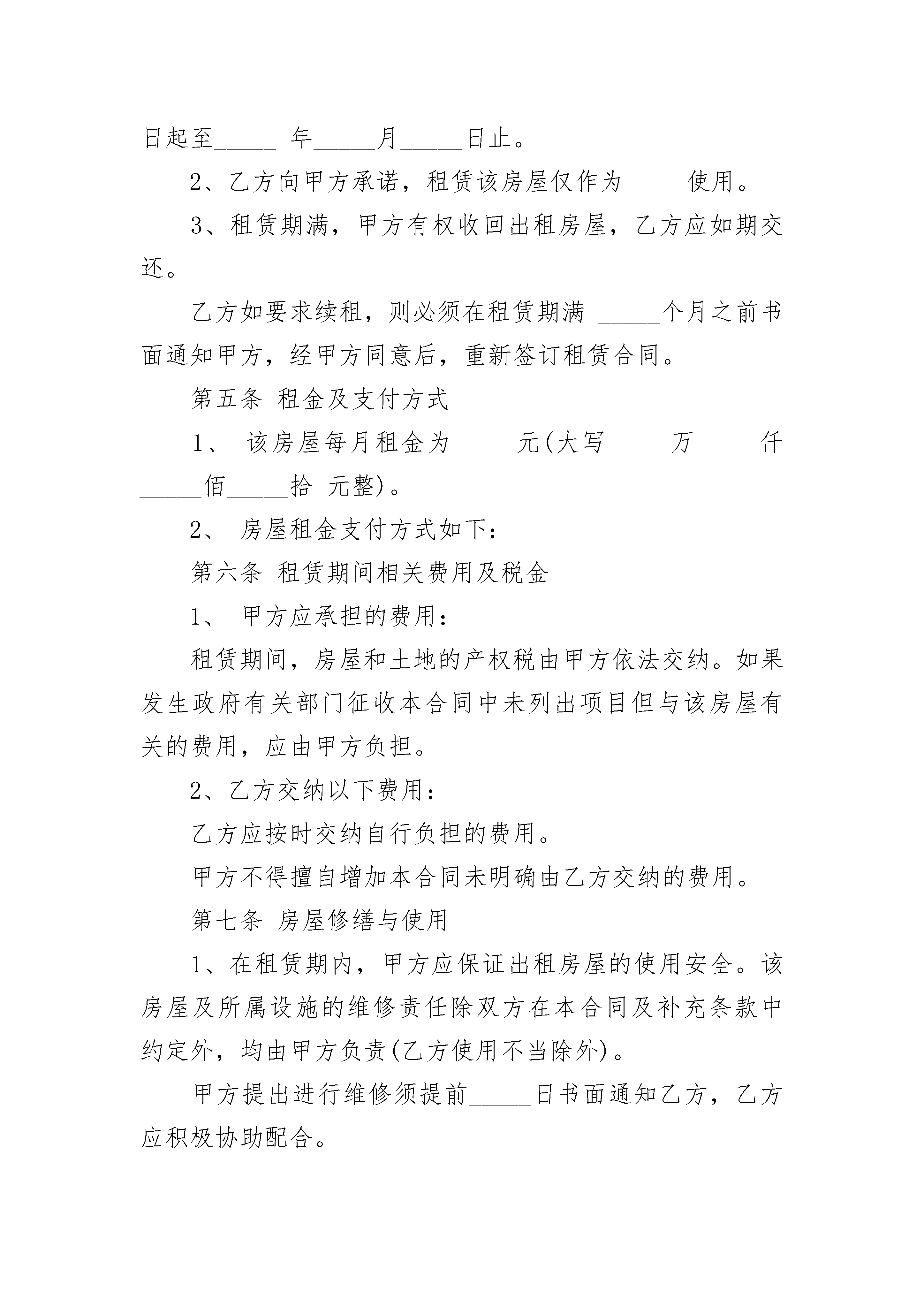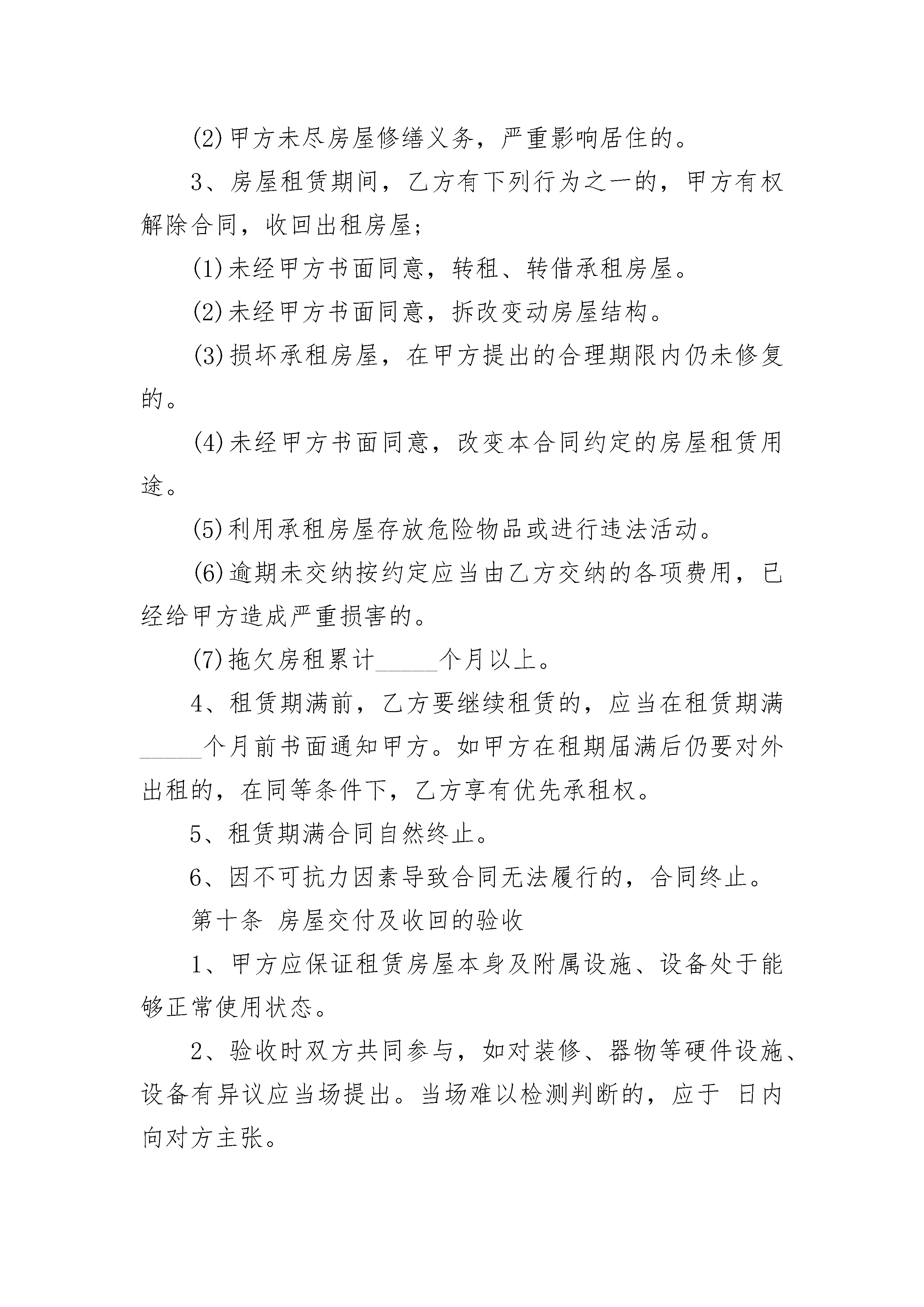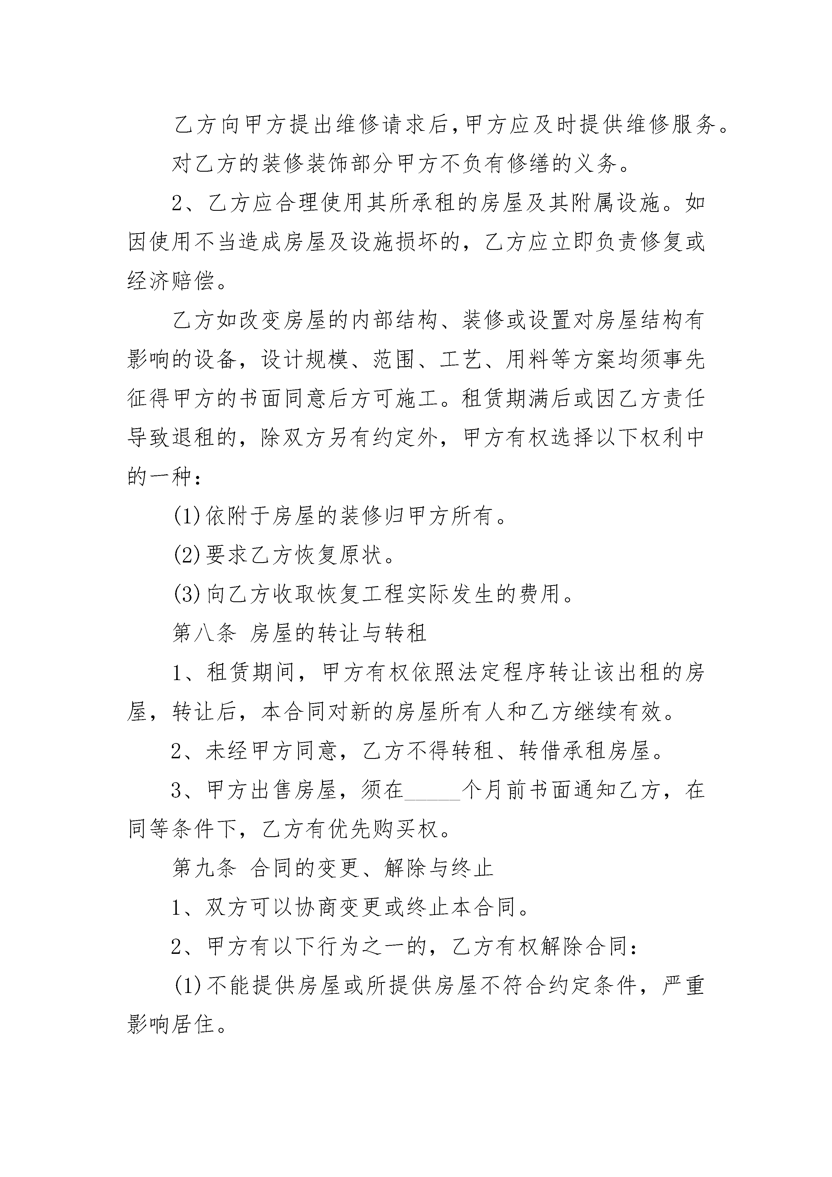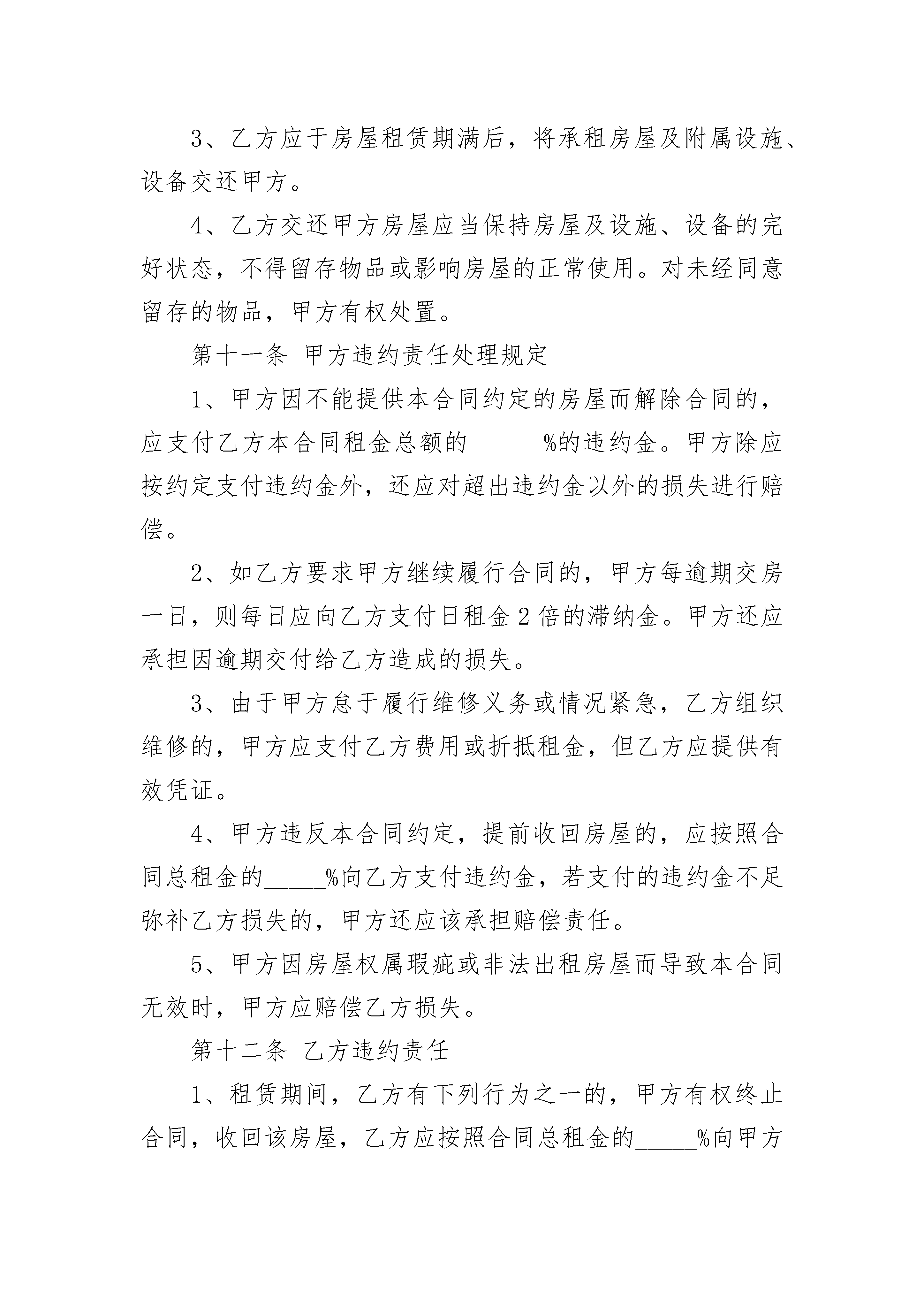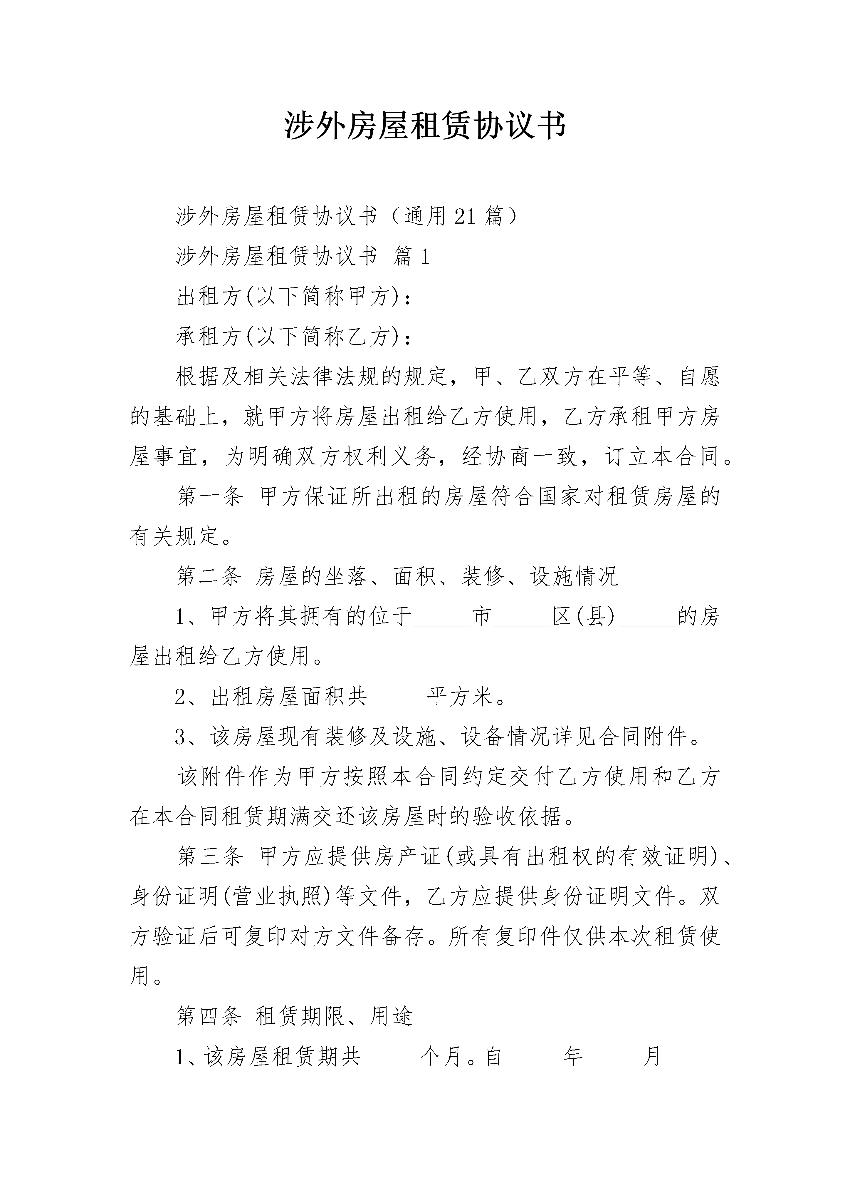 涉外房屋租赁协议书涉外房屋租赁协议书(通用21篇)涉外房屋租赁协议书篇1出租方(以下简称甲方):_____承租方(以下简称乙方):_____根据及相关法律法规的规定,甲、乙双方在平等、自愿的基础上,就甲方将房屋出租给乙方使用,乙方承租甲方房屋事宜,为明确双方权利义务,经协商一致,订立本合同。第一条甲方保证所出租的房屋符合国家对租赁房屋的有关规定。第二条房屋的坐落、面积、装修、设施情况1、甲方将其拥有的位于_____市_____区(县)_____的房屋出租给乙方使用。2、出租房屋面积共_____平方米。3、该房屋现有装修及设施、设备情况详见合同附件。该附件作为甲方按照本合同约定交付乙方使用和乙方在本合同租赁期满交还该房屋时的验收依据。第三条甲方应提供房产证(或具有出租权的有效证明)、身份证明(营业执照)等文件,乙方应提供身份证明文件。双方验证后可复印对方文件备存。所有复印件仅供本次租赁使用。第四条租赁期限、用途1、该房屋租赁期共_____个月。自_____年_____月_____日起至_____年_____月_____日止。2、乙方向甲方承诺,租赁该房屋仅作为_____使用。3、租赁期满,甲方有权收回出租房屋,乙方应如期交还。乙方如要求续租,则必须在租赁期满_____个月之前书面通知甲方,经甲方同意后,重新签订租赁合同。第五条租金及支付方式1、该房屋每月租金为_____元(大写_____万_____仟_____佰_____拾元整)。2、房屋租金支付方式如下:第六条租赁期间相关费用及税金1、甲方应承担的费用:租赁期间,房屋和土地的产权税由甲方依法交纳。如果发生政府有关部门征收本合同中未列出项目但与该房屋有关的费用,应由甲方负担。2、乙方交纳以下费用:乙方应按时交纳自行负担的费用。甲方不得擅自增加本合同未明确由乙方交纳的费用。第七条房屋修缮与使用1、在租赁期内,甲方应保证出租房屋的使用安全。该房屋及所属设施的维修责任除双方在本合同及补充条款中约定外,均由甲方负责(乙方使用不当除外)。甲方提出进行维修须提前_____日书面通知乙方,乙方应积极协助配合。乙方向甲方提出维修请求后,甲方应及时提供维修服务。对乙方的装修装饰部分甲方不负有修缮的义务。2、乙方应合理使用其所承租的房屋及其附属设施。如因使用不当造成房屋及设施损坏的,乙方应立即负责修复或经济赔偿。乙方如改变房屋的内部结构、装修或设置对房屋结构有影响的设备,设计规模、范围、工艺、用料等方案均须事先征得甲方的书面同意后方可施工。租赁期满后或因乙方责任导致退租的,除双方另有约定外,甲方有权选择以下权利中的一种:(1)依附于房屋的装修归甲方所有。(2)要求乙方恢复原状。(3)向乙方收取恢复工程实际发生的费用。第八条房屋的转让与转租1、租赁期间,甲方有权依照法定程序转让该出租的房屋,转让后,本合同对新的房屋所有人和乙方继续有效。2、未经甲方同意,乙方不得转租、转借承租房屋。3、甲方出售房屋,须在_____个月前书面通知乙方,在同等条件下,乙方有优先购买权。第九条合同的变更、解除与终止1、双方可以协商变更或终止本合同。2、甲方有以下行为之一的,乙方有权解除合同:(1)不能提供房屋或所提供房屋不符合约定条件,严重影响居住。(2)甲方未尽房屋修缮义务,严重影响居住的。3、房屋租赁期间,乙方有下列行为之一的,甲方有权解除合同,收回出租房屋;(1)未经甲方书面同意,转租、转借承租房屋。(2)未经甲方书面同意,拆改变动房屋结构。(3)损坏承租房屋,在甲方提出的合理期限内仍未修复的。(4)未经甲方书面同意,改变本合同约定的房屋租赁用途。(5)利用承租房屋存放危险物品或进行违法活动。(6)逾期未交纳按约定应当由乙方交纳的各项费用,已经给甲方造成严重损害的。(7)拖欠房租累计_____个月以上。4、租赁期满前,乙方要继续租赁的,应当在租赁期满_____个月前书面通知甲方。如甲方在租期届满后仍要对外出租的,在同等条件下,乙方享有优先承租权。5、租赁期满合同自然终止。6、因不可抗力因素导致合同无法履行的,合同终止。第十条房屋交付及收回的验收1、甲方应保证租赁房屋本身及附属设施、设备处于能够正常使用状态。2、验收时双方共同参与,如对装修、器物等硬件设施、设备有异议应当场提出。当场难以检测判断的,应于日内向对方主张。3、乙方应于房屋租赁期满后,将承租房屋及附属设施、设备交还甲方。4、乙方交还甲方房屋应当保持房屋及设施、设备的完好状态,不得留存物品或影响房屋的正常使用。对未经同意留存的物品,甲方有权处置。第十一条甲方违约责任处理规定1、甲方因不能提供本合同约定的房屋而解除合同的,应支付乙方本合同租金总额的_____%的违约金。甲方除应按约定支付违约金外,还应对超出违约金以外的损失进行赔偿。2、如乙方要求甲方继续履行