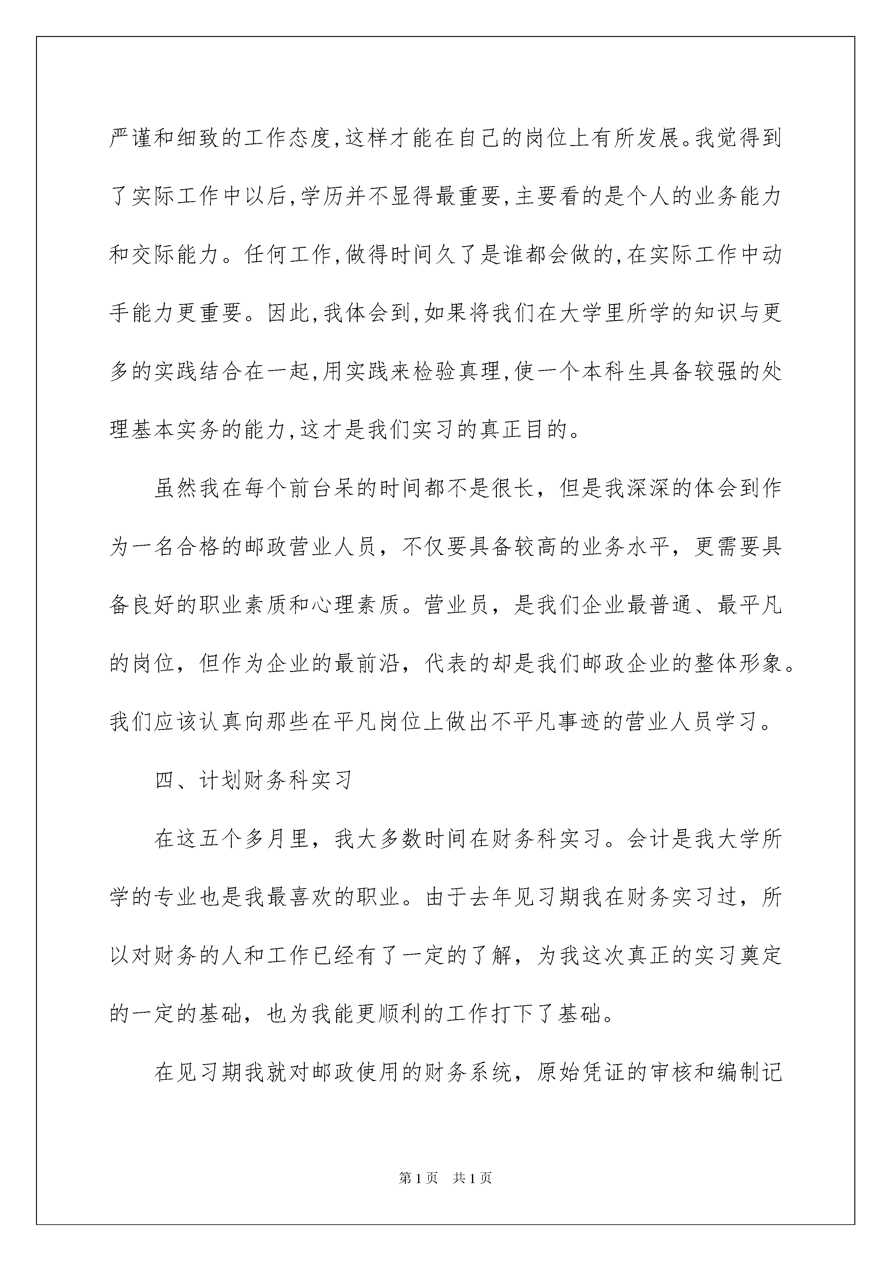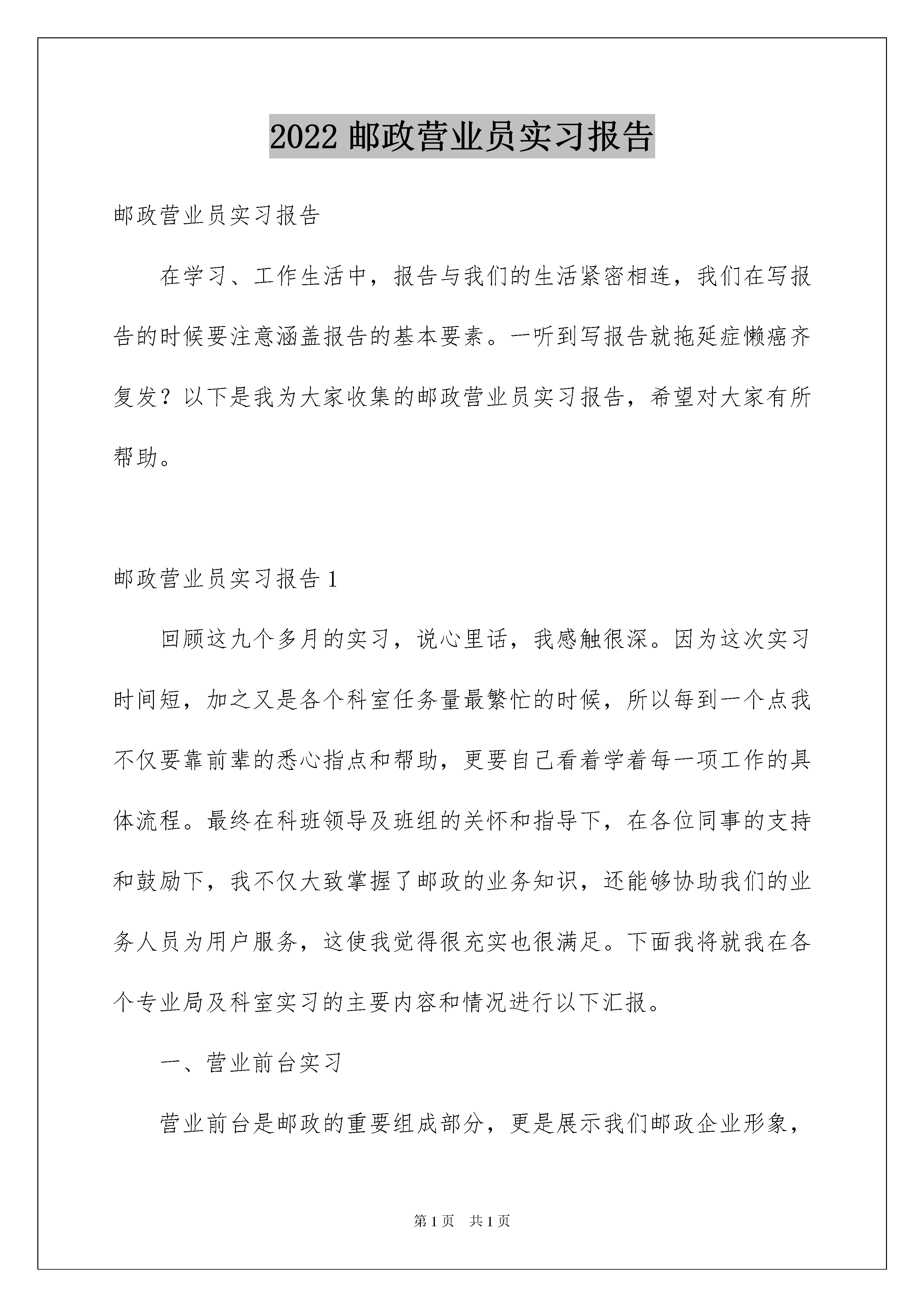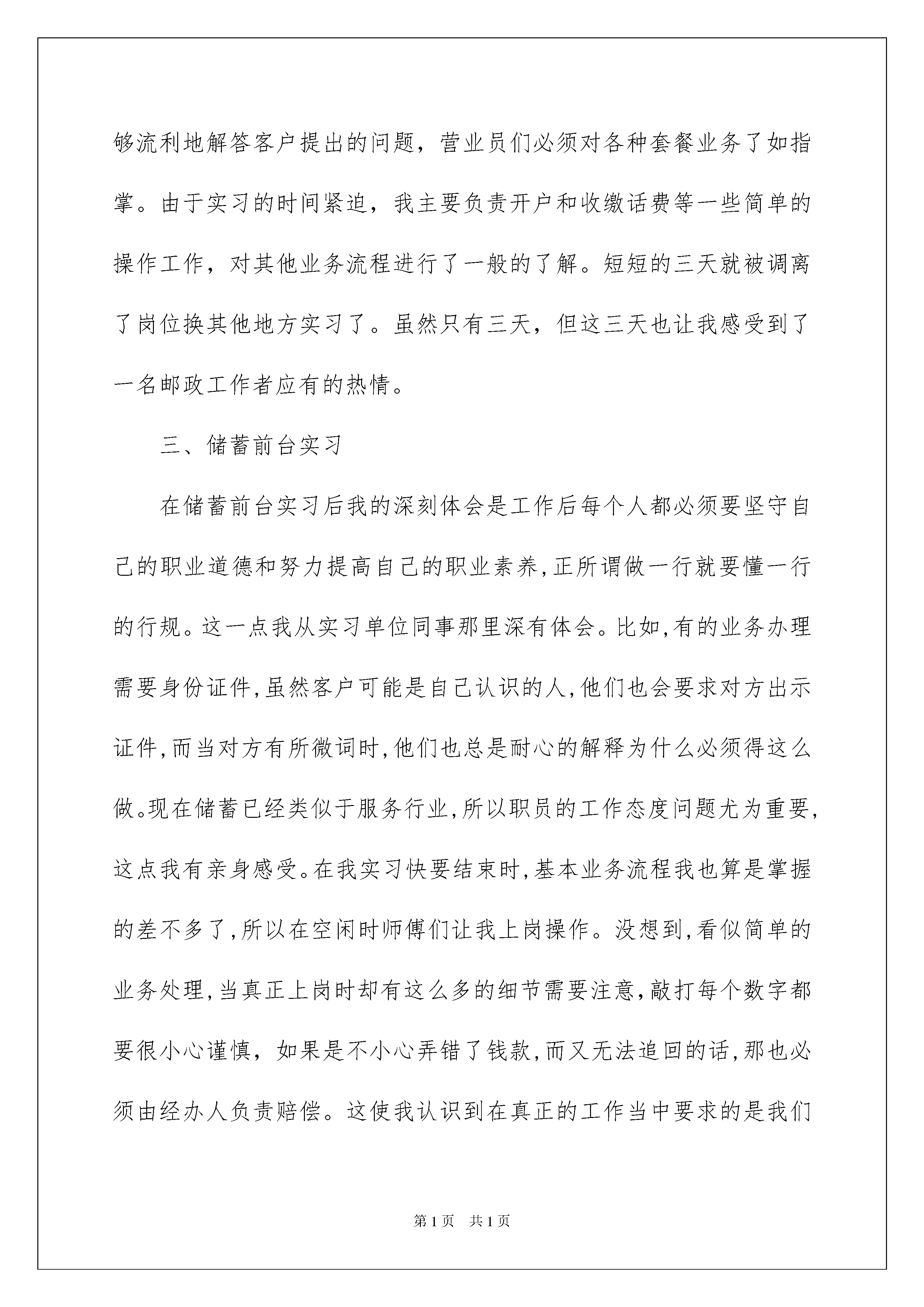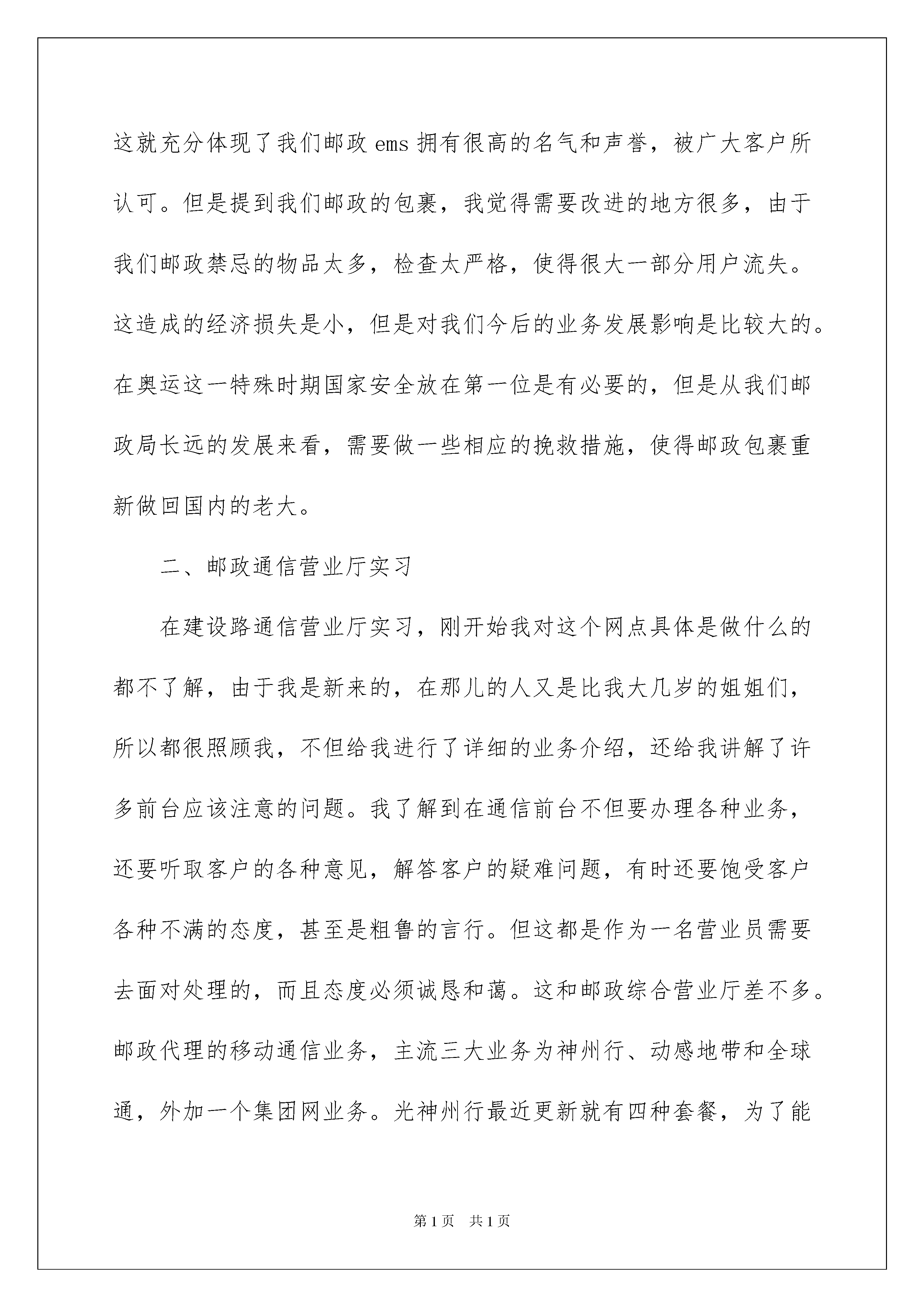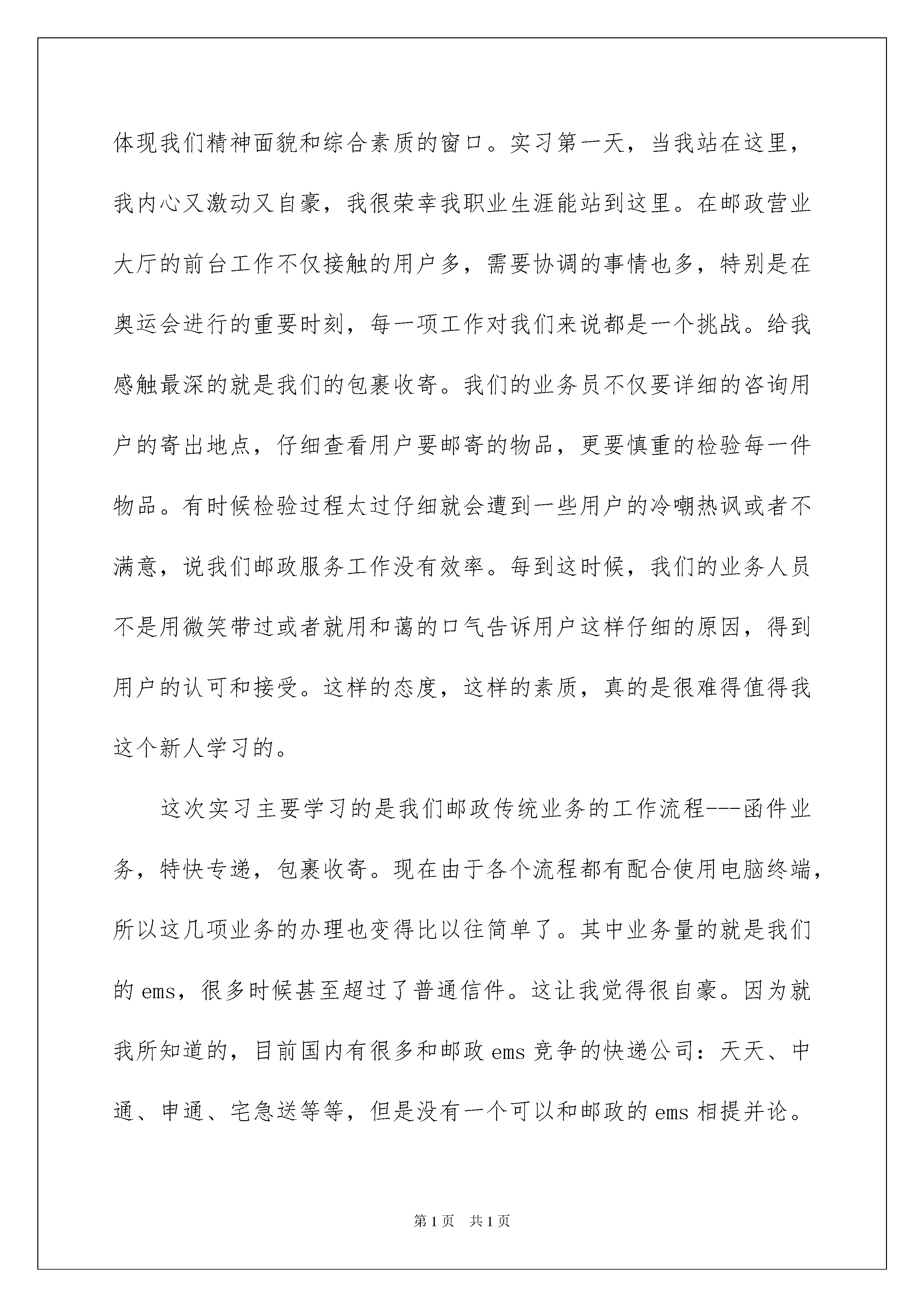 2022邮政营业员实习报告邮政营业员实习报告在学习、工作生活中,报告与我们的生活紧密相连,我们在写报告的时候要注意涵盖报告的基本要素。一听到写报告就拖延症懒癌齐复发?以下是我为大家收集的邮政营业员实习报告,希望对大家有所帮助。邮政营业员实习报告1回顾这九个多月的实习,说心里话,我感触很深。因为这次实习时间短,加之又是各个科室任务量最繁忙的时候,所以每到一个点我不仅要靠前辈的悉心指点和帮助,更要自己看着学着每一项工作的具体流程。最终在科班领导及班组的关怀和指导下,在各位同事的支持和鼓励下,我不仅大致掌握了邮政的业务知识,还能够协助我们的业务人员为用户服务,这使我觉得很充实也很满足。下面我将就我在各个专业局及科室实习的主要内容和情况进行以下汇报。一、营业前台实习营业前台是邮政的重要组成部分,更是展示我们邮政企业形象,体现我们精神面貌和综合素质的窗口。实习第一天,当我站在这里,我内心又激动又自豪,我很荣幸我职业生涯能站到这里。在邮政营业大厅的前台工作不仅接触的用户多,需要协调的事情也多,特别是在奥运会进行的重要时刻,每一项工作对我们来说都是一个挑战。给我感触最深的就是我们的包裹收寄。我们的业务员不仅要详细的咨询用户的寄出地点,仔细查看用户要邮寄的物品,更要慎重的检验每一件物品。有时候检验过程太过仔细就会遭到一些用户的冷嘲热讽或者不满意,说我们邮政服务工作没有效率。每到这时候,我们的业务人员不是用微笑带过或者就用和蔼的口气告诉用户这样仔细的原因,得到用户的认可和接受。这样的态度,这样的素质,真的是很难得值得我这个新人学习的。这次实习主要学习的是我们邮政传统业务的工作流程---函件业务,特快专递,包裹收寄。现在由于各个流程都有配合使用电脑终端,所以这几项业务的办理也变得比以往简单了。其中业务量的就是我们的ems,很多时候甚至超过了普通信件。这让我觉得很自豪。因为就我所知道的,目前国内有很多和邮政ems竞争的快递公司:天天、中通、申通、宅急送等等,但是没有一个可以和邮政的ems相提并论。这就充分体现了我们邮政ems拥有很高的名气和声誉,被广大客户所认可。但是提到我们邮政的包裹,我觉得需要改进的地方很多,由于我们邮政禁忌的物品太多,检查太严格,使得很大一部分用户流失。这造成的经济损失是小,但是对我们今后的业务发展影响是比较大的。在奥运这一特殊时期国家安全放在第一位是有必要的,但是从我们邮政局长远的发展来看,需要做一些相应的挽救措施,使得邮政包裹重新做回国内的老大。二、邮政通信营业厅实习在建设路通信营业厅实习,刚开始我对这个网点具体是做什么的都不了解,由于我是新来的,在那儿的人又是比我大几岁的姐姐们,所以都很照顾我,不但给我进行了详细的业务介绍,还给我讲解了许多前台应该注意的问题。我了解到在通信前台不但要办理各种业务,还要听取客户的各种意见,解答客户的疑难问题,有时还要饱受客户各种不满的态度,甚至是粗鲁的言行。但这都是作为一名营业员需要去面对处理的,而且态度必须诚恳和蔼。这和邮政综合营业厅差不多。邮政代理的移动通信业务,主流三大业务为神州行、动感地带和全球通,外加一个集团网业务。光神州行最近更新就有四种套餐,为了能够流利地解答客户提出的问题,营业员们必须对各种套餐业务了如指掌。由于实习的时间紧迫,我主要负责开户和收缴话费等一些简单的操作工作,对其他业务流程进行了一般的了解。短短的三天就被调离了岗位换其他地方实习了。虽然只有三天,但这三天也让我感受到了一名邮政工作者应有的热情。三、储蓄前台实习在储蓄前台实习后我的深刻体会是工作后每个人都必须要坚守自己的职业道德和努力提高自己的职业素养,正所谓做一行就要懂一行的行规。这一点我从实习单位同事那里深有体会。比如,有的业务办理需要身份证件,虽然客户可能是自己认识的人,他们也会要求对方出示证件,而当对方有所微词时,他们也总是耐心的解释为什么必须得这么做。现在储蓄已经类似于服务行业,所以职员的工作态度问题尤为重要,这点我有亲身感受。在我实习快要结束时,基本业务流程我也算是掌握的差不多了,所以在空闲时师傅们让我上岗操作。没想到,看似简单的业务处理,当真正上岗时却有这么多的细节需要注意,敲打每个数字都要很小心谨慎,如果是不小心弄错了钱款,而又无法追回的话,那也必须由经办人负责赔偿。这使我认识到在真正的工作当中要求的是我们严谨和细致的工作态度,这样才能在自己的岗位上有所发展。我觉得到了实际工作中以后,学历并不显得最重要,主要看的是个人的业务能力和交际能力。任何工作,做得时间久了是谁都会做的,在实际工作中动手能力更重要。因此,我体会到,如果将我们在大学里所学的