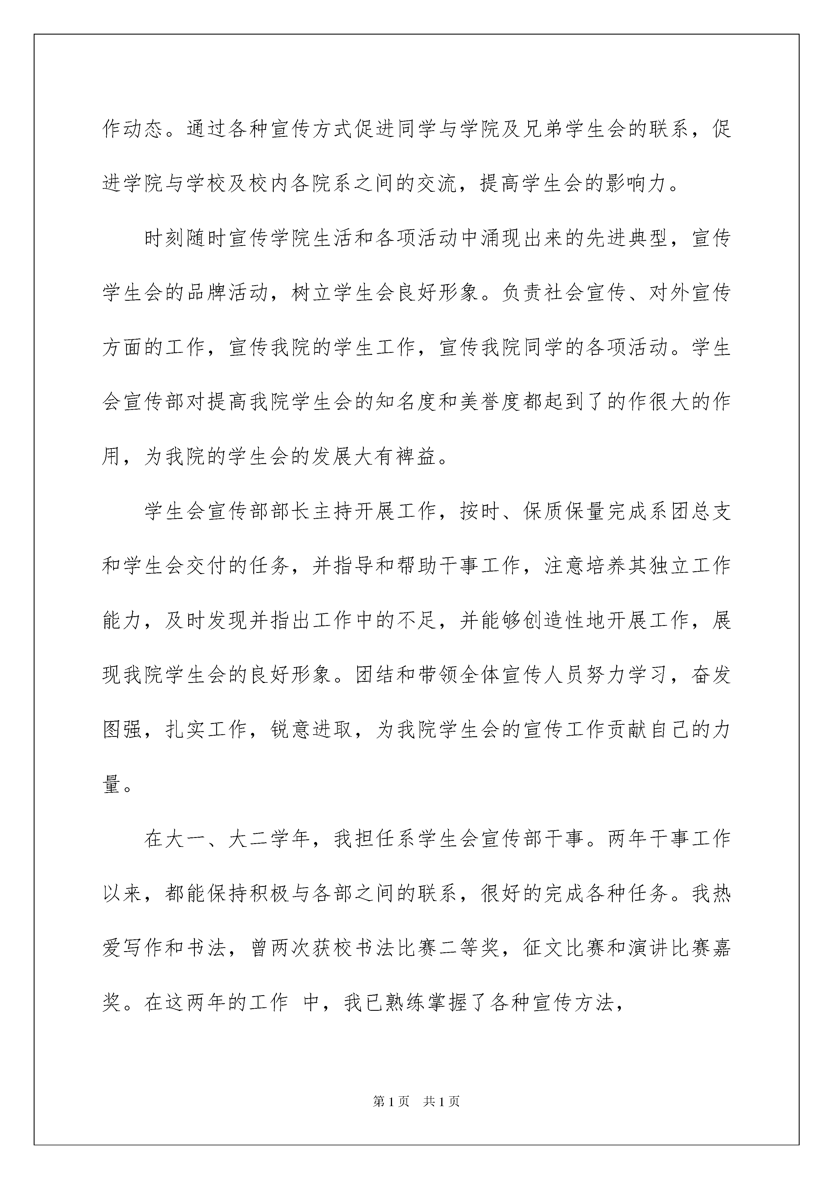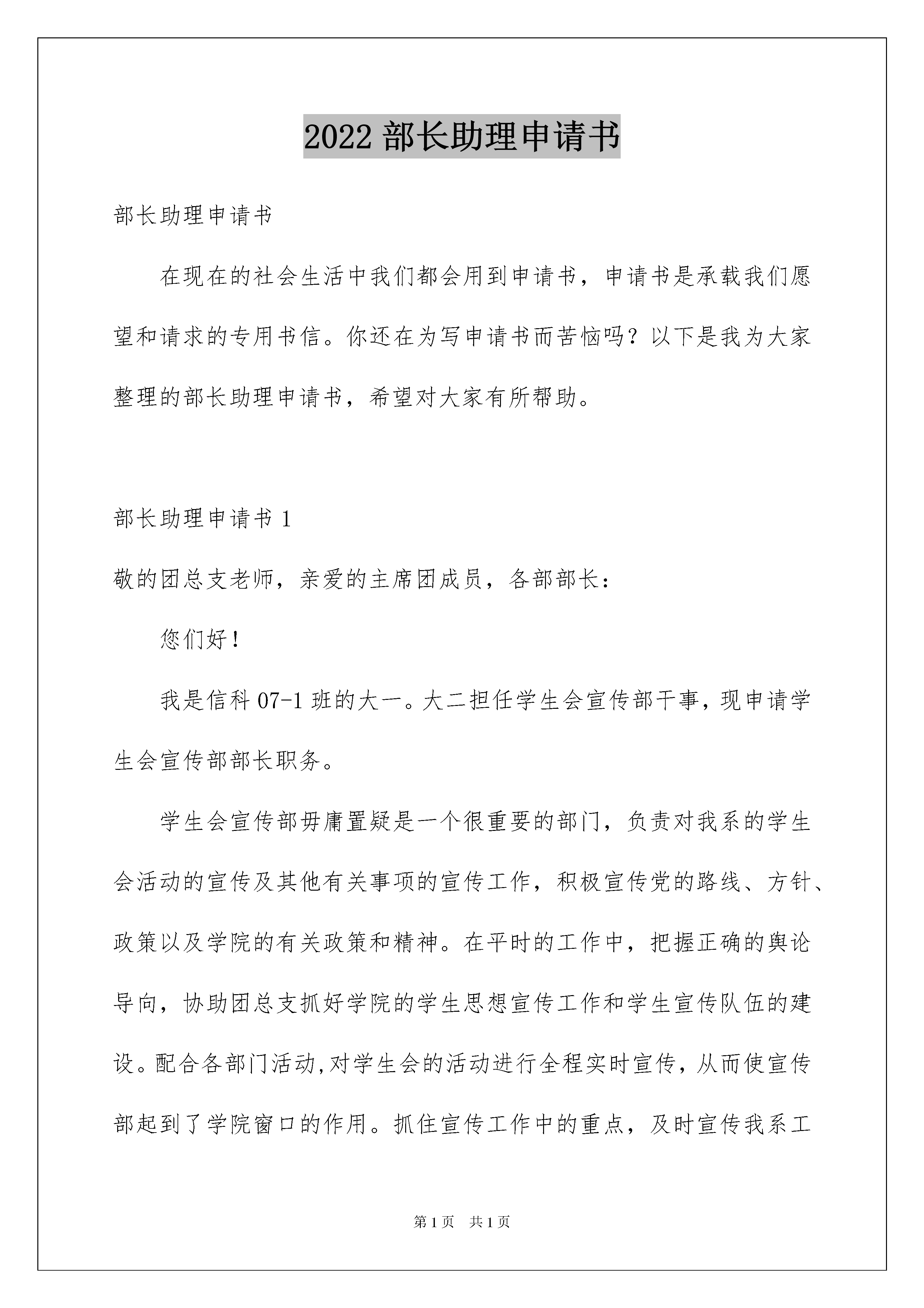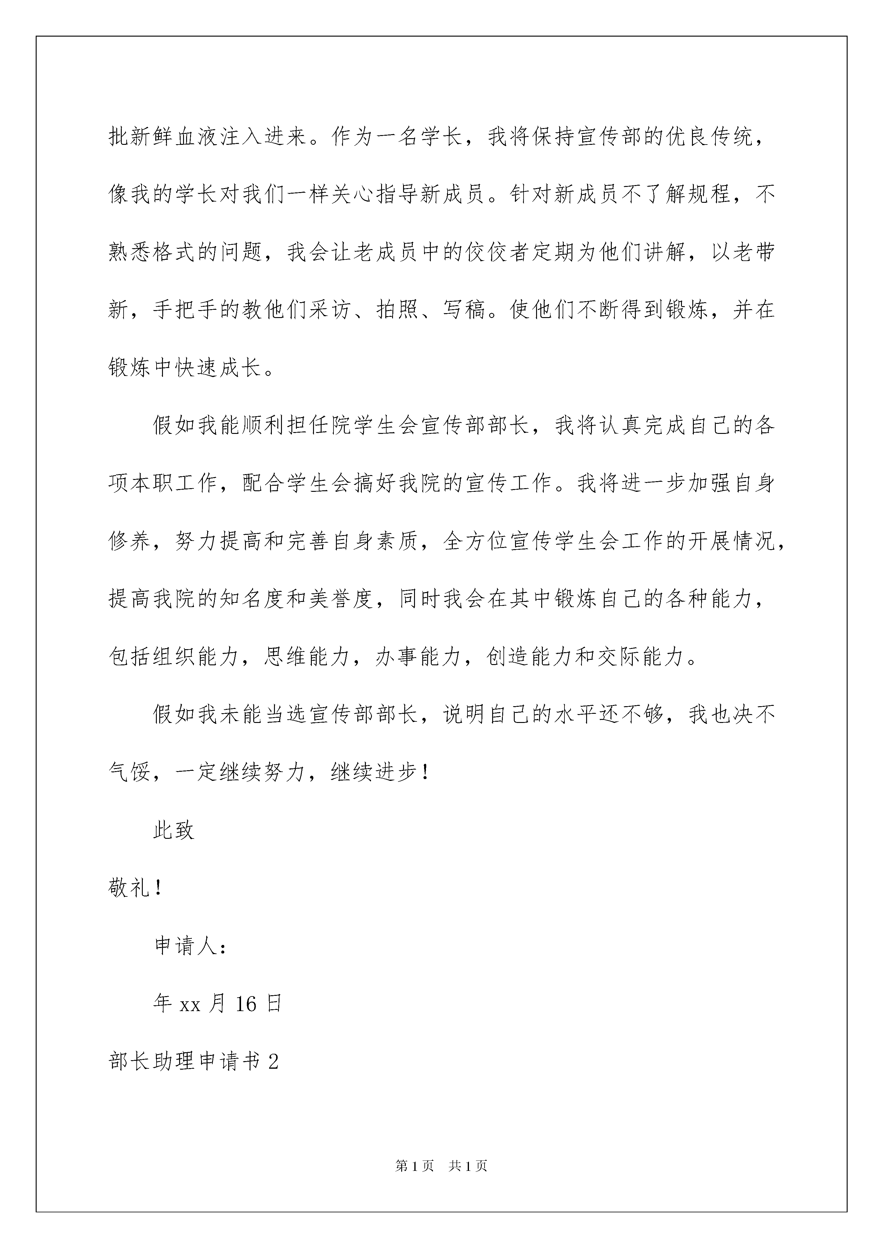 2022部长助理申请书部长助理申请书在现在的社会生活中我们都会用到申请书,申请书是承载我们愿望和请求的专用书信。你还在为写申请书而苦恼吗?以下是我为大家整理的部长助理申请书,希望对大家有所帮助。部长助理申请书1敬的团总支老师,亲爱的主席团成员,各部部长:您们好!我是信科07-1班的大一。大二担任学生会宣传部干事,现申请学生会宣传部部长职务。学生会宣传部毋庸置疑是一个很重要的部门,负责对我系的学生会活动的宣传及其他有关事项的宣传工作,积极宣传党的路线、方针、政策以及学院的有关政策和精神。在平时的工作中,把握正确的舆论导向,协助团总支抓好学院的学生思想宣传工作和学生宣传队伍的建设。配合各部门活动,对学生会的活动进行全程实时宣传,从而使宣传部起到了学院窗口的作用。抓住宣传工作中的重点,及时宣传我系工作动态。通过各种宣传方式促进同学与学院及兄弟学生会的联系,促进学院与学校及校内各院系之间的交流,提高学生会的影响力。时刻随时宣传学院生活和各项活动中涌现出来的先进典型,宣传学生会的品牌活动,树立学生会良好形象。负责社会宣传、对外宣传方面的工作,宣传我院的学生工作,宣传我院同学的各项活动。学生会宣传部对提高我院学生会的知名度和美誉度都起到了的作很大的作用,为我院的学生会的发展大有裨益。学生会宣传部部长主持开展工作,按时、保质保量完成系团总支和学生会交付的任务,并指导和帮助干事工作,注意培养其独立工作能力,及时发现并指出工作中的不足,并能够创造性地开展工作,展现我院学生会的良好形象。团结和带领全体宣传人员努力学习,奋发图强,扎实工作,锐意进取,为我院学生会的宣传工作贡献自己的力量。在大一、大二学年,我担任系学生会宣传部干事。两年干事工作以来,都能保持积极与各部之间的联系,很好的完成各种任务。我热爱写作和书法,曾两次获校书法比赛二等奖,征文比赛和演讲比赛嘉奖。在这两年的工作中,我已熟练掌握了各种宣传方法,能在物力、人力有限的情况下,最大限度的做成、做好每次宣传。如果我能够成功当选为宣传部副部长,我将遵守有关学生会的章程,履行学生会成员的相关义务,积极参加学生会组织的活动。我将听从团委安排,积极配合各部长工作,提高办事效率,争取使宣传部的工作更上一个台阶。我拟从以下几个方面开展我的工作:(一)增强宣传部内部的团队意识和凝聚力。不同与其他的部门,宣传部的工作更多的是与宣传板打交道,采访与发稿,真正需要大家聚在一起共同完成的任务并不多。因此也就造成了目前很多宣传部成员间彼此不是很熟悉,合作意识淡薄的现象。而且,团队意识的淡薄也造成了工作积极性的下降。我上任后,将加强各成员间的合作与交流。定期举行经验交流活动,交流采访经验,探讨写作技巧。定期评选优秀成员,调动大家的积极性。我想,如果能做到真正的有事可做,大家就不会觉得宣传部的工作单调和乏味了吧。(二)采取适当强制措施,增加发稿量。发稿量的减少是目前宣传部面临的一个很严峻的问题。要解决这个问题,我认为除了继续调动大家的积极性外,还应采取一定的强制措施。(四)培养新成员,使他们早日堪当大任。几个月后,又将有一批新鲜血液注入进来。作为一名学长,我将保持宣传部的优良传统,像我的学长对我们一样关心指导新成员。针对新成员不了解规程,不熟悉格式的问题,我会让老成员中的佼佼者定期为他们讲解,以老带新,手把手的教他们采访、拍照、写稿。使他们不断得到锻炼,并在锻炼中快速成长。假如我能顺利担任院学生会宣传部部长,我将认真完成自己的各项本职工作,配合学生会搞好我院的宣传工作。我将进一步加强自身修养,努力提高和完善自身素质,全方位宣传学生会工作的开展情况,提高我院的知名度和美誉度,同时我会在其中锻炼自己的各种能力,包括组织能力,思维能力,办事能力,创造能力和交际能力。假如我未能当选宣传部部长,说明自己的水平还不够,我也决不气馁,一定继续努力,继续进步!此致敬礼!申请人:年xx月16日部长助理申请书2尊敬的领导:我叫xx,于x年x月成为市场部经理助理,到今天3个月试用期已满,根据公司的规章制度,现申请转为公司正式员工。1、经过三个多月的自身努力和各位同事领导的帮助,现对工作有较强的处理能力,能独立完成本职工作,能与同事精诚合作,解决工作中的问题。2、勤恳工作,用心做事。工作中我对来访的客人以礼相待,保持着热情,耐心地帮助他们;工作中时刻想着自己代表的是公司,对处理违规违纪的事情都是做到‘礼先到’,不摆架子,耐心地和他们沟通,于他们谈心,避免和他们矛盾,影响公司形象。3、遵纪守法,严于律己。按时上班,从未迟到、早退。积极主动加班,以公司为家。在本部门的工作中,我一直严格要求自
