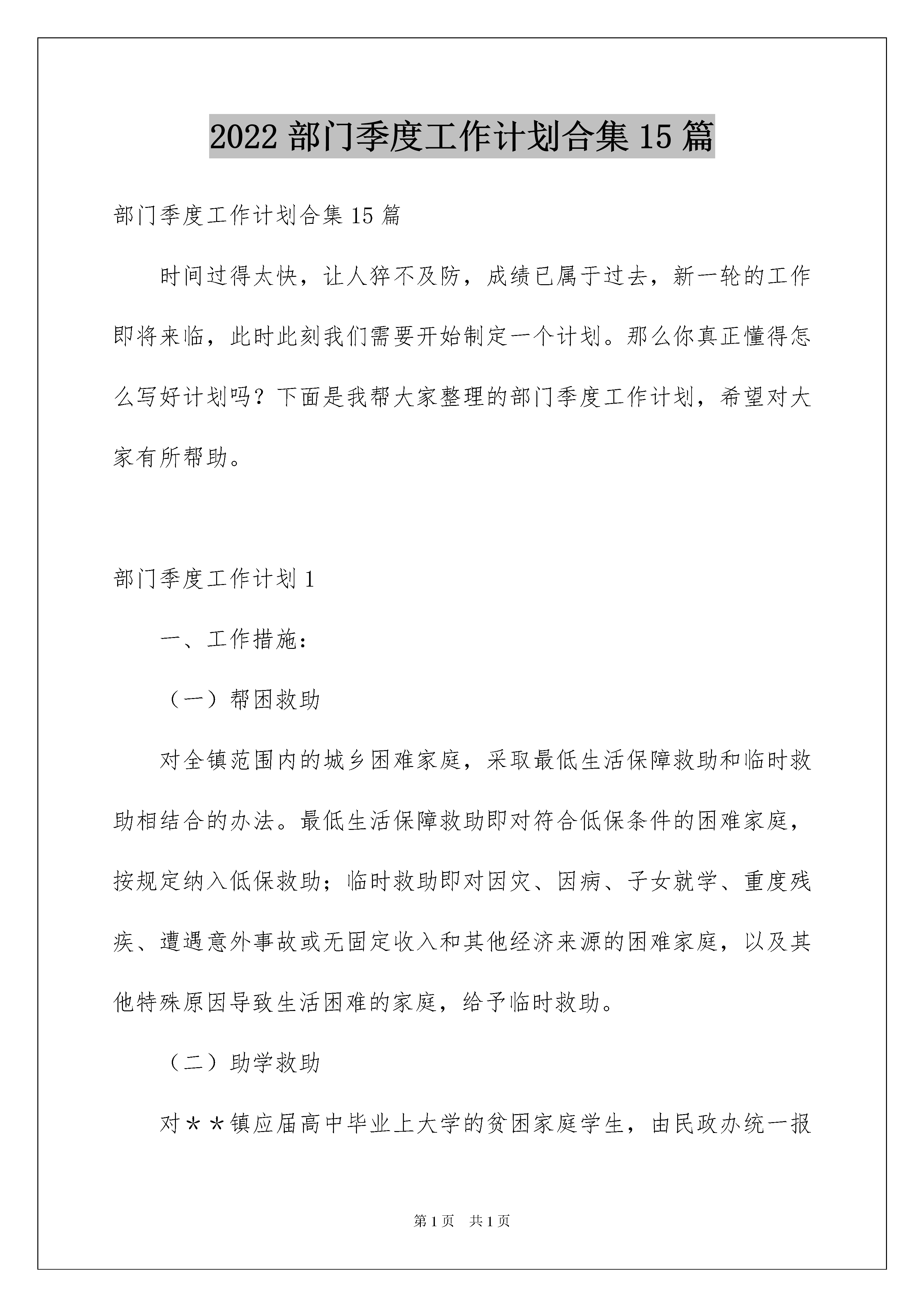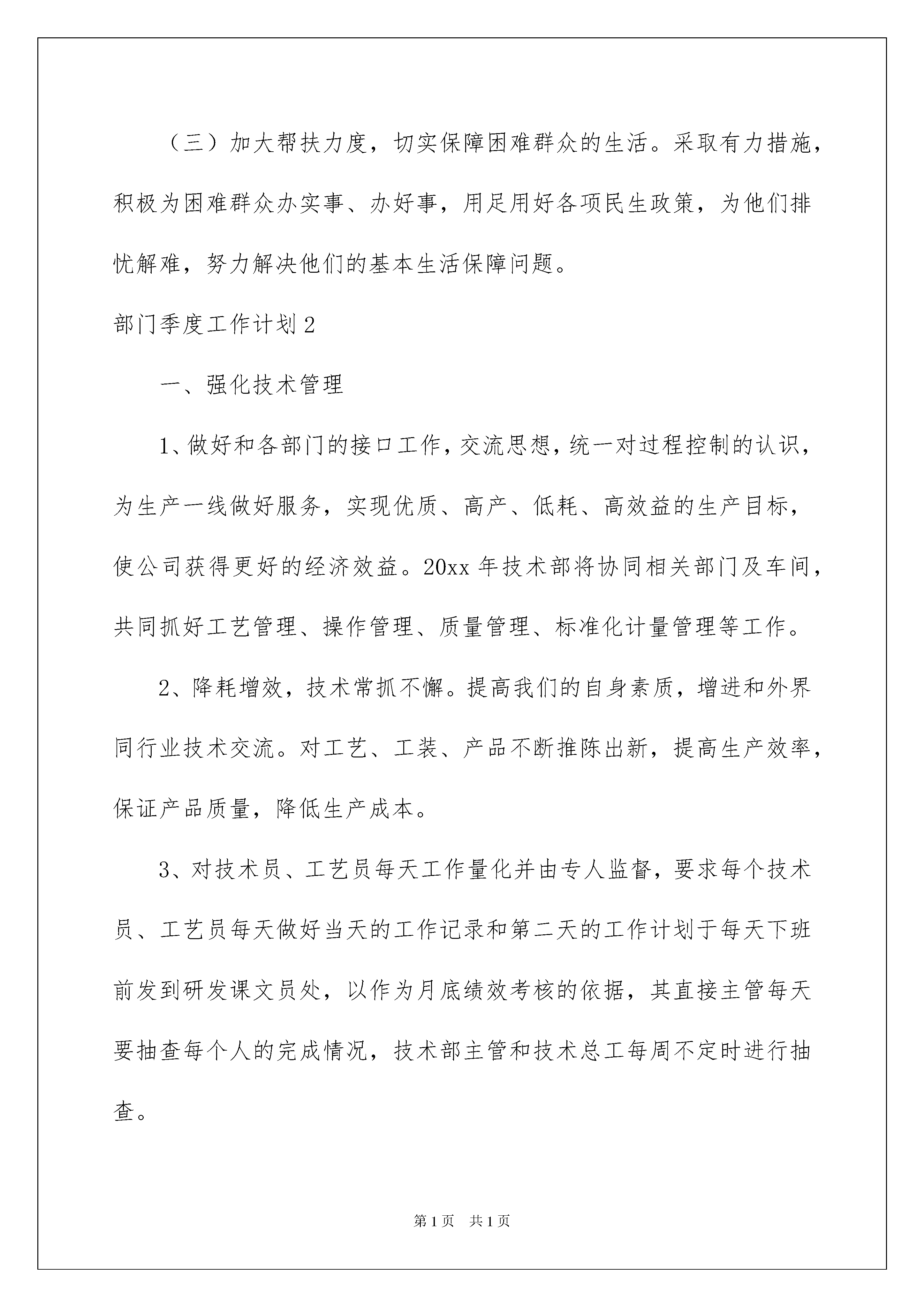 2022部门季度工作计划合集15篇部门季度工作计划合集15篇时间过得太快,让人猝不及防,成绩已属于过去,新一轮的工作即将来临,此时此刻我们需要开始制定一个计划。那么你真正懂得怎么写好计划吗?下面是我帮大家整理的部门季度工作计划,希望对大家有所帮助。部门季度工作计划1一、工作措施:(一)帮困救助对全镇范围内的城乡困难家庭,采取最低生活保障救助和临时救助相结合的办法。最低生活保障救助即对符合低保条件的困难家庭,按规定纳入低保救助;临时救助即对因灾、因病、子女就学、重度残疾、遭遇意外事故或无固定收入和其他经济来源的困难家庭,以及其他特殊原因导致生活困难的家庭,给予临时救助。(二)助学救助对**镇应届高中毕业上大学的贫困家庭学生,由民政办统一报区民政局,给予一次性4000元助学救助。(三)大病医疗救助对本镇居民患病住院治疗,经新型农村合作医疗(含城镇居民医疗保障)或各类医疗保险报销及各种互助帮困后,医疗费负担仍有较大困难的家庭,按上级规定给予医疗费救助。二、工作成效通过采取一系列帮扶救助措施,使很多困难家庭解决了生活生产困难,感受到党和政府的温暖,为全镇营造和谐稳定的大环境奠定了坚实的基础。三、下一步工作计划(一)提高认识,切实加强对城乡困难家庭帮扶救助工作。严格帮扶救助中审核、评议、公示等各环节的工作,不断完善帮扶救助办法,确保帮扶救助工作公开、公平、公正、真实、有序,维护社会和谐稳定。(二)加强帮扶救助信息的沟通衔接。密切和工会、妇联、劳动保障等部门的联系,强化信息沟通,避免重复救助、多头救助现象的发生。(三)加大帮扶力度,切实保障困难群众的生活。采取有力措施,积极为困难群众办实事、办好事,用足用好各项民生政策,为他们排忧解难,努力解决他们的基本生活保障问题。部门季度工作计划2一、强化技术管理1、做好和各部门的接口工作,交流思想,统一对过程控制的认识,为生产一线做好服务,实现优质、高产、低耗、高效益的生产目标,使公司获得更好的经济效益。20xx年技术部将协同相关部门及车间,共同抓好工艺管理、操作管理、质量管理、标准化计量管理等工作。2、降耗增效,技术常抓不懈。提高我们的自身素质,增进和外界同行业技术交流。对工艺、工装、产品不断推陈出新,提高生产效率,保证产品质量,降低生产成本。3、对技术员、工艺员每天工作量化并由专人监督,要求每个技术员、工艺员每天做好当天的工作记录和第二天的工作计划于每天下班前发到研发课文员处,以作为月底绩效考核的依据,其直接主管每天要抽查每个人的完成情况,技术部主管和技术总工每周不定时进行抽查。4、工装模具组、样品组做好当月工装模具、样品制作计划交予工程课主管处由工程课主管汇总后交予技术部经理和技术总工处,并将月计划每一周汇总核查一次及时的将进度情况反馈到技术部主管处,形成层级把关以减少由于工装模具制作不及时、样品制作不及时给生产和销售带来不便。5、加强部门内部信息的准确性,各种工艺及异常数据层级把关审核,确保管理的及时性、规范性、系统性、合理性。6、做好管理团队建设,分工不分家。做好人才储备,提升并培养优秀人才,并进行合理搭配,使技术部门工作顺畅有序,保障生产的顺利进行。二、逐步形成技术会审制度方案设计完成后要进行技术会审,通过开会的形式共同讨论方案的可行性,不签字不发放的原则,保证图纸资料的准确无误。工艺图纸完成后要进行互审,通过互审的形式来保证图纸及数据的准确性,以免造成不必要的损失。三、继续加强学习1、学习专业技术,学习ISO/TS16949体系思想,按照ISO/TS16949体系思想去做,努力使自身水平能够跟上公司发展,对新进员工加强培训,使其能够更快地适应公司发展,进行新技术交流,统一思想,提高认识。努力做好龙头的带头作用。2、要大胆创新与尝试,掌握细节,技术管理更需要潜意识的加强,但也要虚心学习同行业的技术知识。3、不能够安于现状,不思进取,不能以一街市田亩为乐,这将不利于公司技术的发展与创新。4、加强技术知识与操作注意事项的培训力度,促进生产顺利进行,减少公司整体的维护成本。四、20xx年度计划要点:1、样品合格率必须达到95%以上。2、样品计划完成率必须达到70%。3、年度改进项目必须3项以上。4、工装/设备定期维护保养完成率≥98%5、新产品过程开发完成率≥96%6、工装制造不良率≤3%7、技术降成本100万以上(详见附件一“技术降成本措施计划”)。8、生产现场出现问题第一时间必须赶到现场解决。五、20xx年具体计划如下1、新样品开发:据20xx年年度开发结果(平均56、7只/月),在20xx年新样品开发计划为平均57只/月(具体要据销