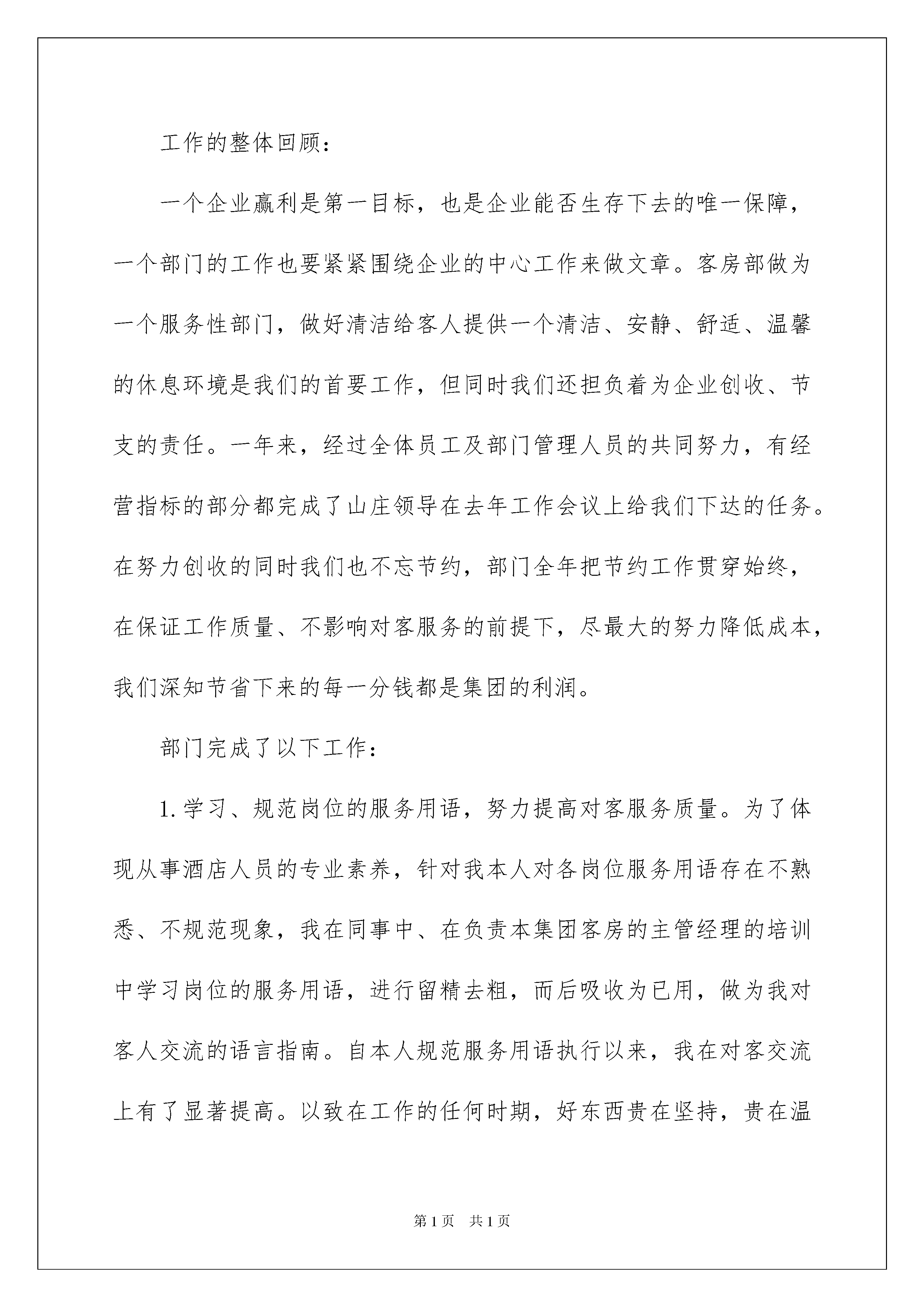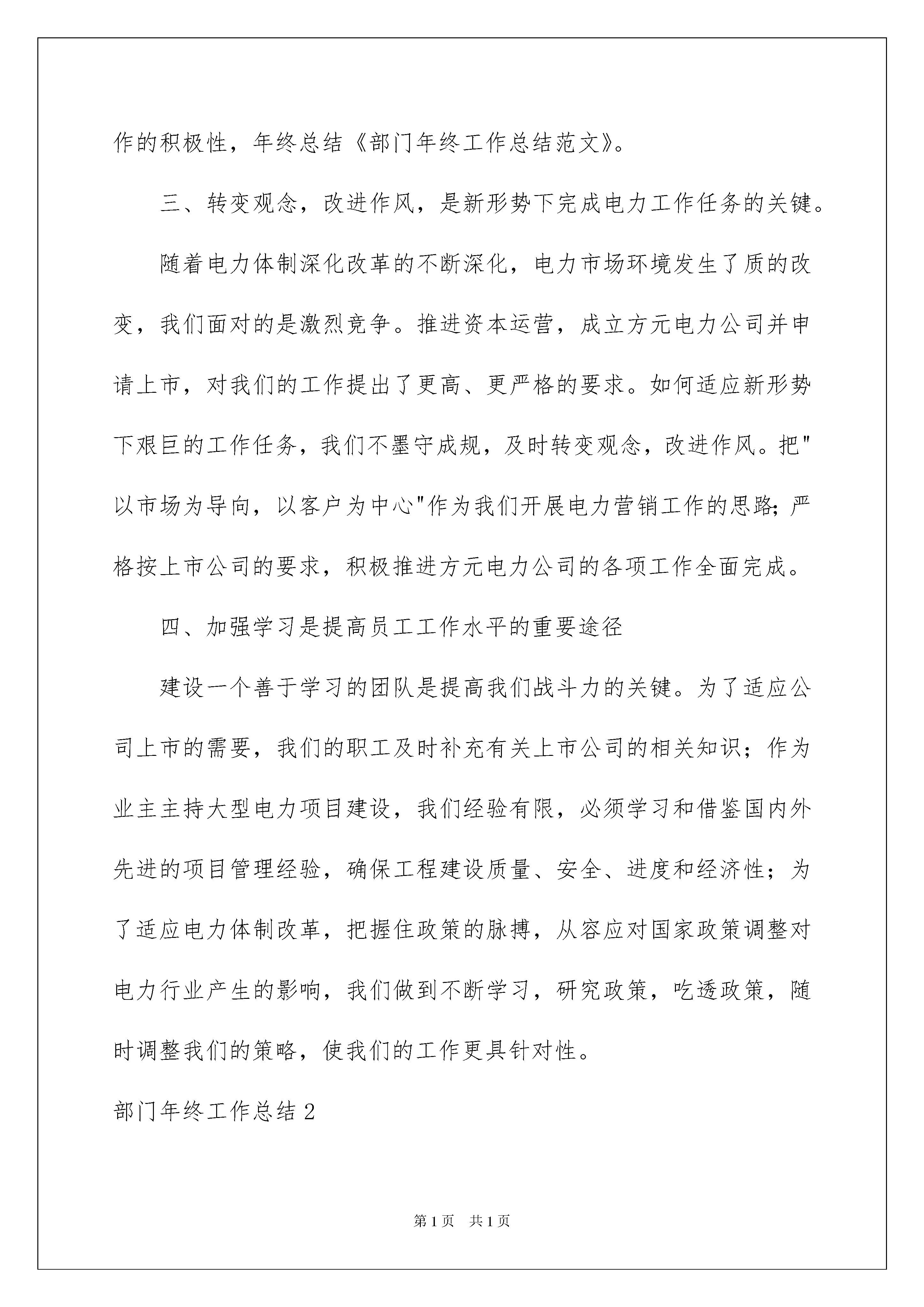 2022部门年终工作总结(15篇)部门年终工作总结(15篇)总结是对过去一定时期的工作、学习或思想情况进行回顾、分析,并做出客观评价的书面材料,它有助于我们寻找工作和事物发展的规律,从而掌握并运用这些规律,因此十分有必须要写一份总结哦。那么如何把总结写出新花样呢?以下是我精心整理的部门年终工作总结,欢迎大家借鉴与参考,希望对大家有所帮助。部门年终工作总结1***x年,公司认真贯彻集团公司优化产业结构,抢占资源的战略意图,各项工作取得了较好的成绩,部门年终工作总结范文。我们主要有以下几点体会:一、团结严谨、高效务实的领导班子是全面完成工作任务的领导基矗***x年年初,为适应方元电力公司成立、上市的需要,集团公司对电力公司及时进行了改组,对公司的领导进行了调整,领导之间做到密切配合需要有一个磨合期。一年来的运作证明,公司领导班子是一个团结严谨、高效务实的领导班子。电力公司的领导分工明确,开诚布公,团结协作,凡公司的重要决策都要集体讨论通过,领导办公会、司务会、业务例会已成制度;在爱岗敬业、不畏艰苦,不谋私利、廉政建设方面,领导始终做到以身作则;为了完成集团公司交办的任务,电力公司领导经常放弃休息时间,加班加点,为落实一些电力项目的开发,不畏艰苦,做到亲自踏堪现场进行项目调研;为解决电厂燃煤供应紧张问题,公司领导亲自到现场进行协调。领导以身作则的精神极大地激发了员工的工作热情,增强了员工凝聚力。二、建立科学合理的绩效考核机制是高效、高质量完成工作任务的保证。为提高管理效能,激发员工积极极性,我们以集团公司的考核制度为基础,结合公司实际制定了《职工考核办法》、《目标管理办法》、《部门绩效考核办法》等制度;明确了各部门的工作责任目标,我们制定了年度部门工作目标表,人手一份,各部门对工作目标责分解到个人,凡事都有责任人;我们建立了业务例会制度,把业务例会布置任务完成情况作为部门绩效考核的主要依据,提高了考核的可操作性和公平性,及时地检查了各部门工作任务完成情况,促进了各部门工作的积极性,年终总结《部门年终工作总结范文》。三、转变观念,改进作风,是新形势下完成电力工作任务的关键。随着电力体制深化改革的不断深化,电力市场环境发生了质的改变,我们面对的是激烈竞争。推进资本运营,成立方元电力公司并申请上市,对我们的工作提出了更高、更严格的要求。如何适应新形势下艰巨的工作任务,我们不墨守成规,及时转变观念,改进作风。把"以市场为导向,以客户为中心"作为我们开展电力营销工作的思路;严格按上市公司的要求,积极推进方元电力公司的各项工作全面完成。四、加强学习是提高员工工作水平的重要途径建设一个善于学习的团队是提高我们战斗力的关键。为了适应公司上市的需要,我们的职工及时补充有关上市公司的相关知识;作为业主主持大型电力项目建设,我们经验有限,必须学习和借鉴国内外先进的项目管理经验,确保工程建设质量、安全、进度和经济性;为了适应电力体制改革,把握住政策的脉搏,从容应对国家政策调整对电力行业产生的影响,我们做到不断学习,研究政策,吃透政策,随时调整我们的策略,使我们的工作更具针对性。部门年终工作总结2工作的整体回顾:一个企业赢利是第一目标,也是企业能否生存下去的唯一保障,一个部门的工作也要紧紧围绕企业的中心工作来做文章。客房部做为一个服务性部门,做好清洁给客人提供一个清洁、安静、舒适、温馨的休息环境是我们的首要工作,但同时我们还担负着为企业创收、节支的责任。一年来,经过全体员工及部门管理人员的共同努力,有经营指标的部分都完成了山庄领导在去年工作会议上给我们下达的任务。在努力创收的同时我们也不忘节约,部门全年把节约工作贯穿始终,在保证工作质量、不影响对客服务的前提下,尽最大的努力降低成本,我们深知节省下来的每一分钱都是集团的利润。部门完成了以下工作:1.学习、规范岗位的服务用语,努力提高对客服务质量。为了体现从事酒店人员的专业素养,针对我本人对各岗位服务用语存在不熟悉、不规范现象,我在同事中、在负责本集团客房的主管经理的培训中学习岗位的服务用语,进行留精去粗,而后吸收为已用,做为我对客人交流的语言指南。自本人规范服务用语执行以来,我在对客交流上有了显著提高。以致在工作的任何时期,好东西贵在坚持,贵在温故而知新,我将对此加大学习应用的力度。2.开源节流,降本增效,从点滴做起。客房部是公司的主要创收部门,它的本本本费也很高,本着节约就是创利润的思想,我和同事们本着从自我做起,从点滴做起,杜绝一切浪费现象,主要表现在:①回收客用一次性低值易耗品,如牙膏可做为清洁剂使用②每日早晨要求对退客楼层的走道灯关闭,夜班六点后